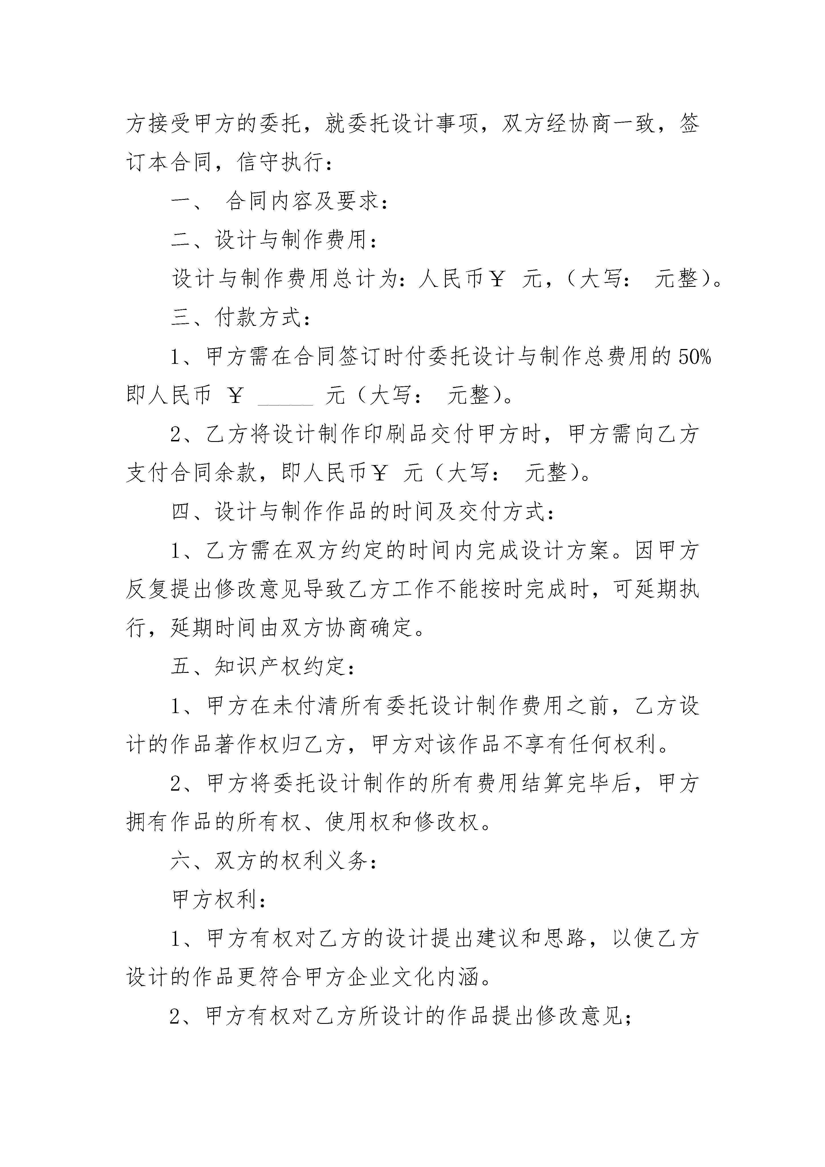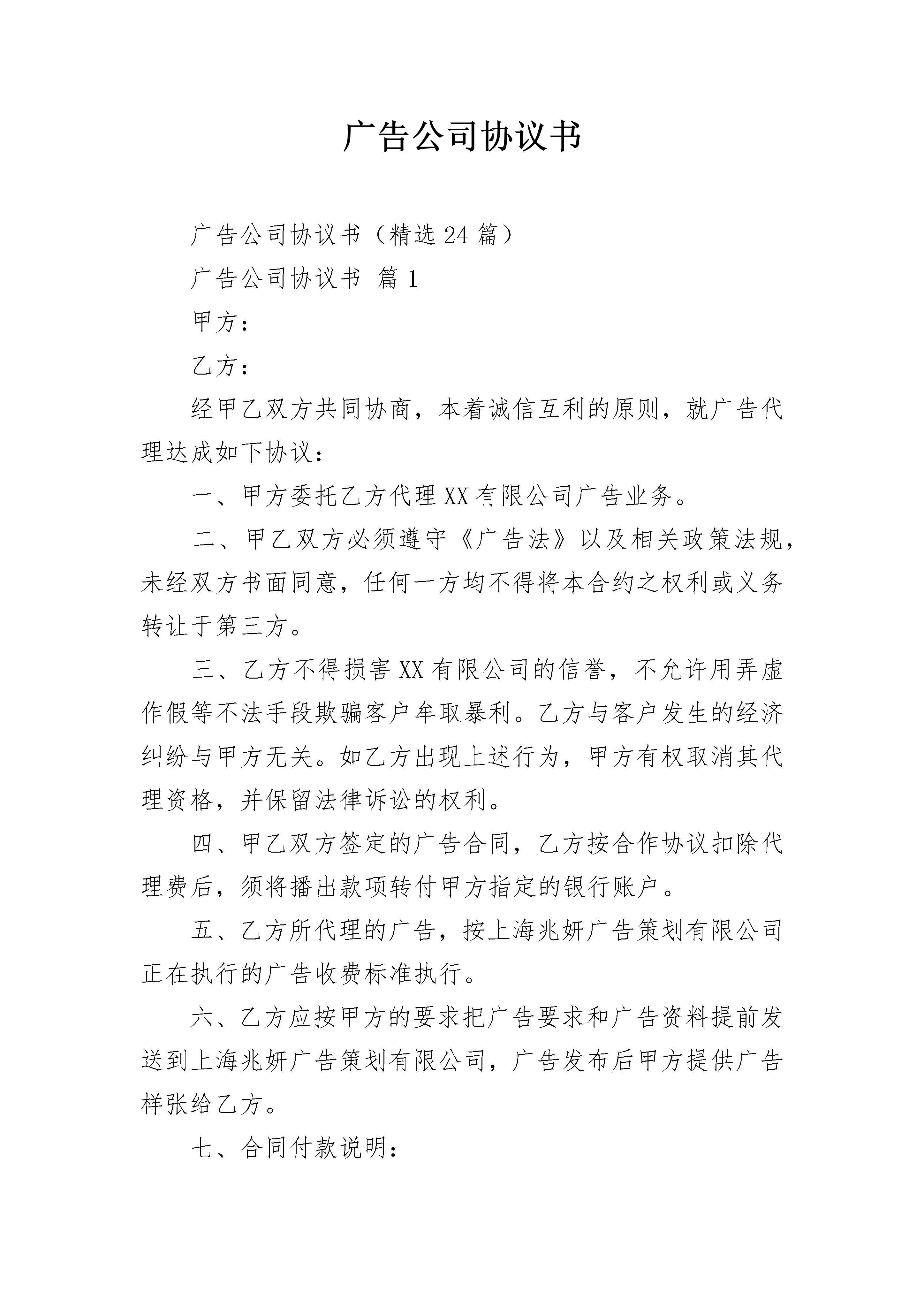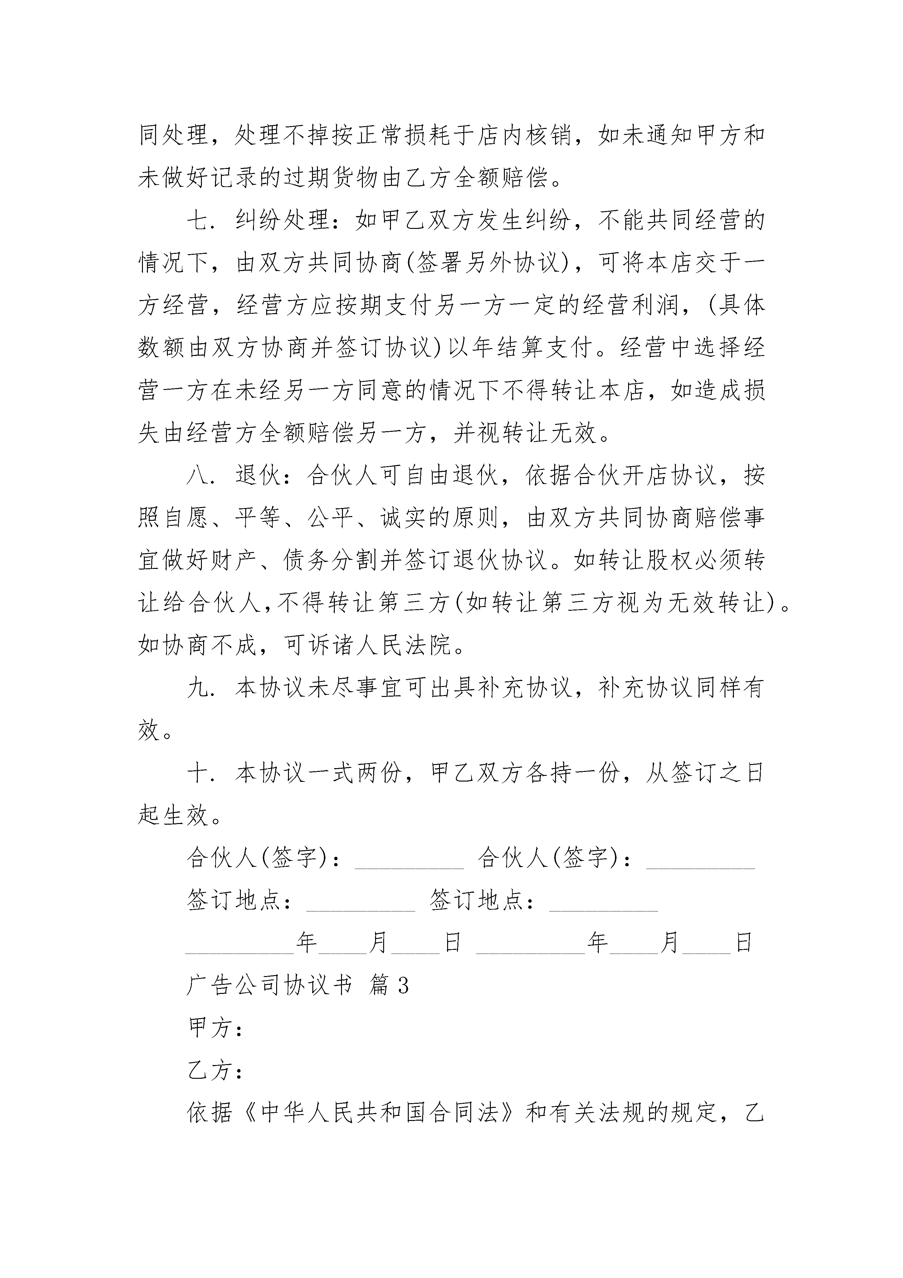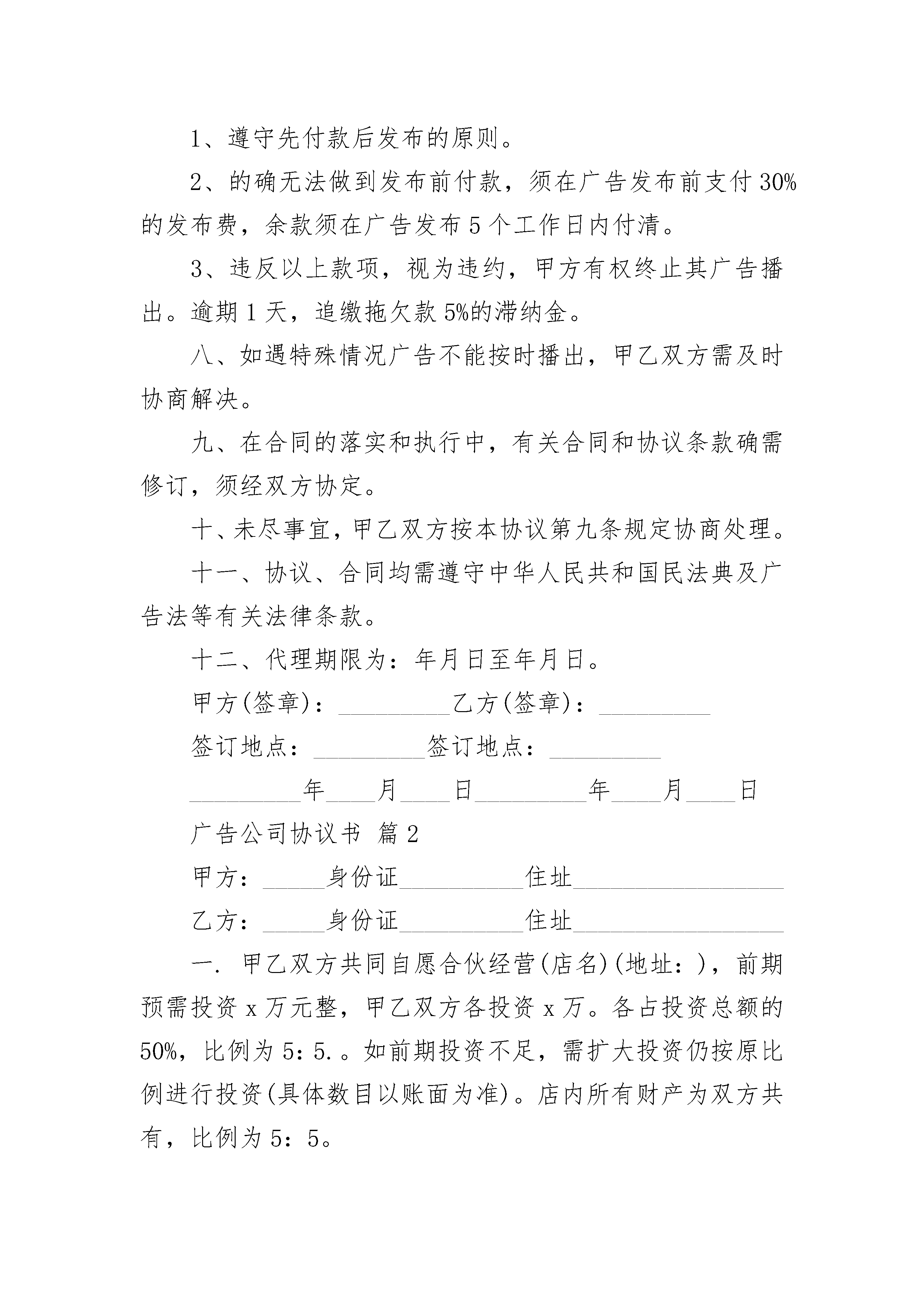 广告公司协议书广告公司协议书(精选24篇)广告公司协议书篇1甲方:乙方:经甲乙双方共同协商,本着诚信互利的原则,就广告代理达成如下协议:一、甲方委托乙方代理XX有限公司广告业务。二、甲乙双方必须遵守《广告法》以及相关政策法规,未经双方书面同意,任何一方均不得将本合约之权利或义务转让于第三方。三、乙方不得损害XX有限公司的信誉,不允许用弄虚作假等不法手段欺骗客户牟取暴利。乙方与客户发生的经济纠纷与甲方无关。如乙方出现上述行为,甲方有权取消其代理资格,并保留法律诉讼的权利。四、甲乙双方签定的广告合同,乙方按合作协议扣除代理费后,须将播出款项转付甲方指定的银行账户。五、乙方所代理的广告,按上海兆妍广告策划有限公司正在执行的广告收费标准执行。六、乙方应按甲方的要求把广告要求和广告资料提前发送到上海兆妍广告策划有限公司,广告发布后甲方提供广告样张给乙方。七、合同付款说明:1、遵守先付款后发布的原则。2、的确无法做到发布前付款,须在广告发布前支付30%的发布费,余款须在广告发布5个工作日内付清。3、违反以上款项,视为违约,甲方有权终止其广告播出。逾期1天,追缴拖欠款5%的滞纳金。八、如遇特殊情况广告不能按时播出,甲乙双方需及时协商解决。九、在合同的落实和执行中,有关合同和协议条款确需修订,须经双方协定。十、未尽事宜,甲乙双方按本协议第九条规定协商处理。十一、协议、合同均需遵守中华人民共和国民法典及广告法等有关法律条款。十二、代理期限为:年月日至年月日。甲方(签章):_________乙方(签章):_________签订地点:_________签订地点:__________________年____月____日_________年____月____日广告公司协议书篇2甲方:_____身份证__________住址_________________乙方:_____身份证__________住址_________________一.甲乙双方共同自愿合伙经营(店名)(地址:),前期预需投资x万元整,甲乙双方各投资x万。各占投资总额的50%,比例为5:5.。如前期投资不足,需扩大投资仍按原比例进行投资(具体数目以账面为准)。店内所有财产为双方共有,比例为5:5。二.本合伙依法组成合伙企业,以乙方名义办理《经营许可证》,《经营许可证》和工商登记等,并注册为企业负责人。三.合伙双方本着共同经营,共同劳动,共担风险,共负盈亏的宗旨精诚合作。店内盈余按照各自投资比例分配即5:5(除去一切费用后)。店内债务同样按照各自投资比例(5:5)负担。四.经营职责:共同经营中,由甲方负责进货支出和费用支出,(费用有:人员工资,各种招待费,房租,消耗用品等)即现金管理(建立专用账户)。任何支出由乙方确认后签字入账。由乙方负责店内经营和货物管理,即账目管理。乙方必须把当天营业额全额交予甲方用于各种开支,并结算当天的营业利润一并交予甲方入账。任何一方不得在店内取走现金和货物,如需取货必须现金结算并做好记录。经营中,甲乙双方对未经对方同意赊销出去的货物,由经手人(三个月内)负责全额收回,造成损失,由经手人全额承担赔偿。五.盈余结算:店内盈余每半年(盘货)结算一次,除去一切开支后按约定比例分配,在结算中如出现应有现金与现有现金不符,由甲方全额赔偿。如出现应有货物与现有货物不符,由乙方全额赔偿。六.过期货物处理:在经营中乙方负责盘查店内预过期货物,需提前6个月和3个月提醒甲方知晓,并作好记录共同处理,处理不掉按正常损耗于店内核销,如未通知甲方和未做好记录的过期货物由乙方全额赔偿。七.纠纷处理:如甲乙双方发生纠纷,不能共同经营的情况下,由双方共同协商(签署另外协议),可将本店交于一方经营,经营方应按期支付另一方一定的经营利润,(具体数额由双方协商并签订协议)以年结算支付。经营中选择经营一方在未经另一方同意的情况下不得转让本店,如造成损失由经营方全额赔偿另一方,并视转让无效。八.退伙:合伙人可自由退伙,依据合伙开店协议,按照自愿、平等、公平、诚实的原则,由双方共同协商赔偿事宜做好财产、债务分割并签订退伙协议。如转让股权必须转让给合伙人,不得转让第三方(如转让第三方视为无效转让)。如协商不成,可诉诸人民法院。九.本协议未尽事宜可出具补充协议,补充协议同样有效。十.本协议一式两份,甲乙双方各持一份,从签订之日起生效。合伙人(签字):_________合伙人(签字):_________签订地点:_________签订地点:__________________年____月____日_________年____月____日广告公司协议书篇3甲方:乙方:依据《中华人民共和国合同法》和有关法规的规定,乙方接受甲方的委托,就委托设计事项,双方经协商一致,签订本合同,信守执行:一、合同内容及要求: