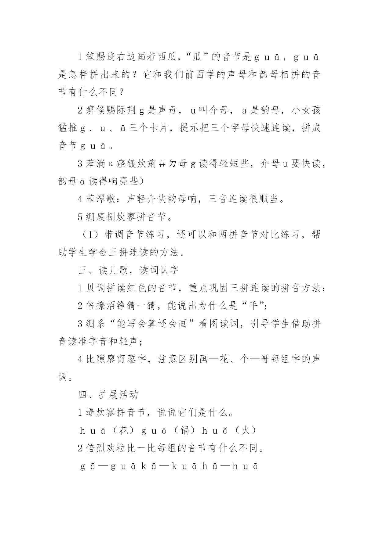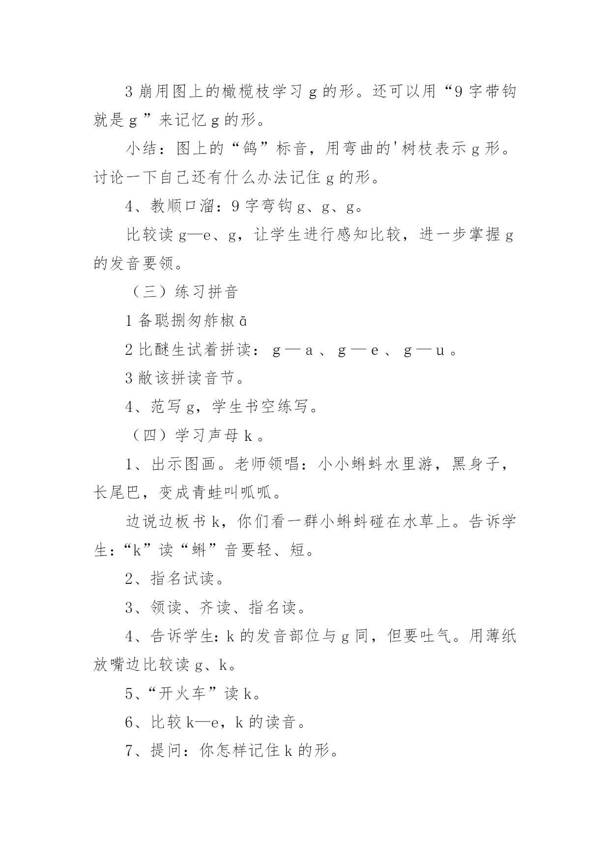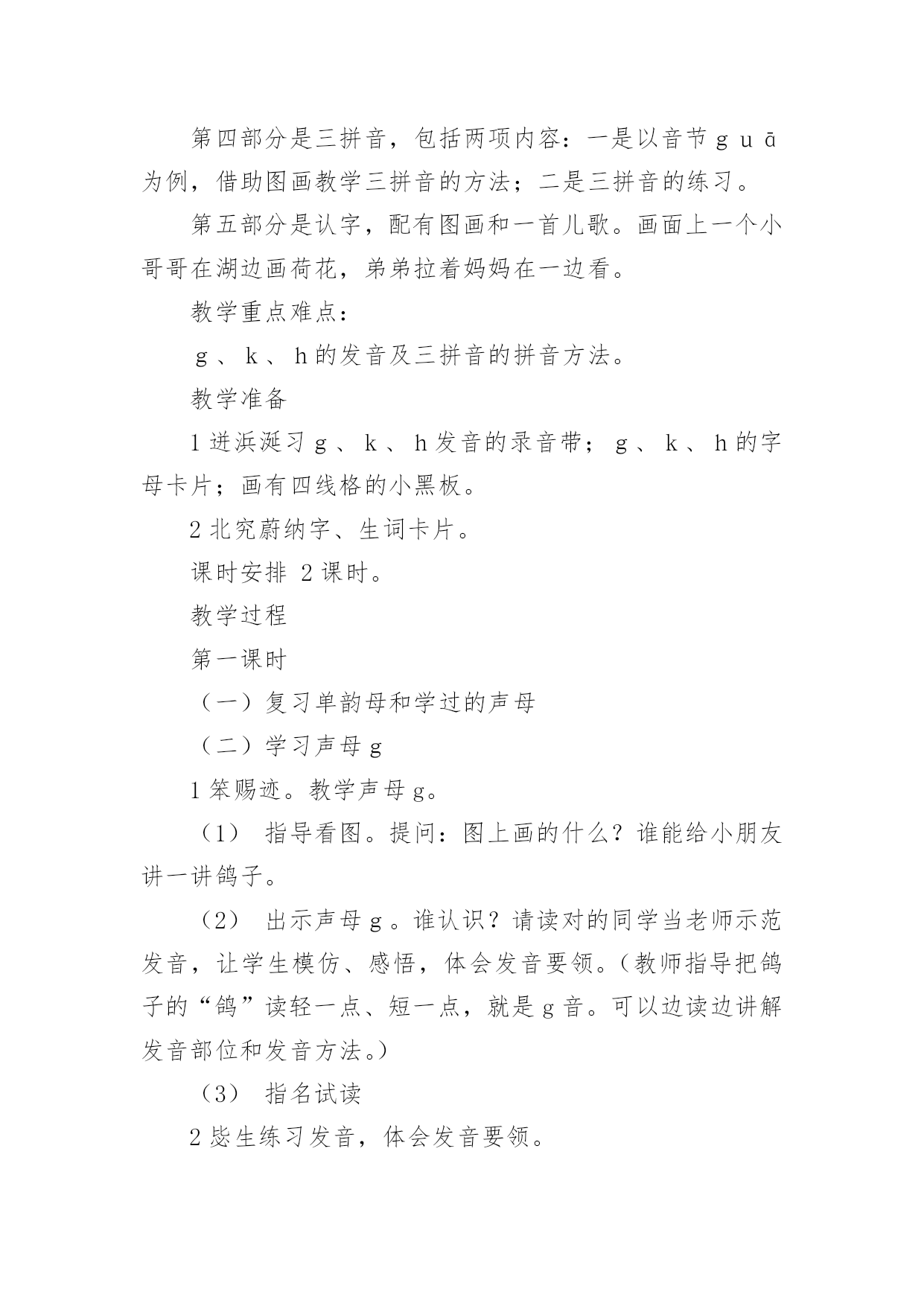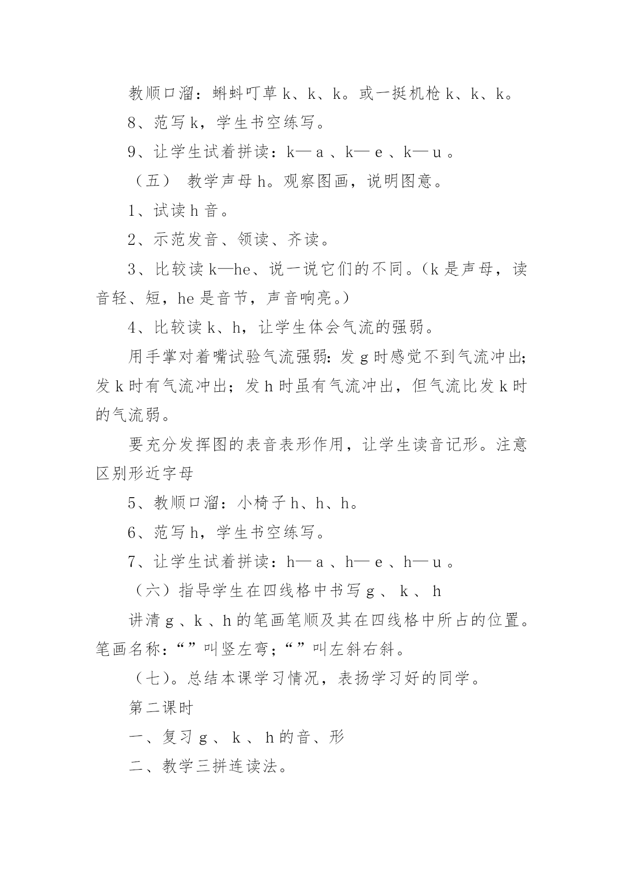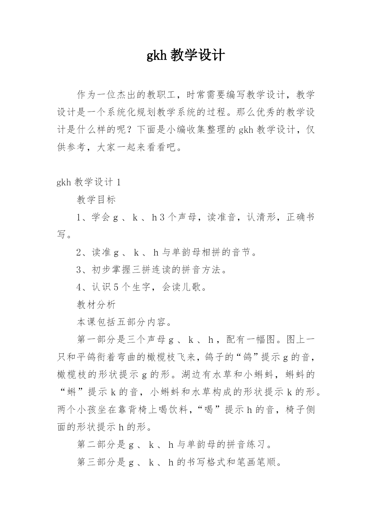 gkh教学设计 作为一位杰出的教职工,时常需要编写教学设计,教学设计是一个系统化规划教学系统的过程。那么优秀的教学设计是什么样的呢?下面是小编收集整理的gkh教学设计,仅供参考,大家一起来看看吧。gkh教学设计1教学目标1、学会g、k、h3个声母,读准音,认清形,正确书写。2、读准g、k、h与单韵母相拼的音节。3、初步掌握三拼连读的拼音方法。4、认识5个生字,会读儿歌。教材分析本课包括五部分内容。第一部分是三个声母g、k、h,配有一幅图。图上一只和平鸽衔着弯曲的橄榄枝飞来,鸽子的“鸽”提示g的音,橄榄枝的形状提示g的形。湖边有水草和小蝌蚪,蝌蚪的“蝌”提示k的音,小蝌蚪和水草构成的形状提示k的形。两个小孩坐在靠背椅上喝饮料,“喝”提示h的音,椅子侧面的形状提示h的形。第二部分是g、k、h与单韵母的拼音练习。第三部分是g、k、h的书写格式和笔画笔顺。第四部分是三拼音,包括两项内容:一是以音节guā为例,借助图画教学三拼音的方法;二是三拼音的练习。第五部分是认字,配有图画和一首儿歌。画面上一个小哥哥在湖边画荷花,弟弟拉着妈妈在一边看。教学重点难点:g、k、h的发音及三拼音的拼音方法。教学准备1迸浜涎习g、k、h发音的录音带;g、k、h的字母卡片;画有四线格的小黑板。2北究蔚纳字、生词卡片。课时安排2课时。教学过程第一课时(一)复习单韵母和学过的声母(二)学习声母g1笨赐迹。教学声母g。(1)指导看图。提问:图上画的什么?谁能给小朋友讲一讲鸽子。(2)出示声母g。谁认识?请读对的同学当老师示范发音,让学生模仿、感悟,体会发音要领。(教师指导把鸽子的“鸽”读轻一点、短一点,就是g音。可以边读边讲解发音部位和发音方法。)(3)指名试读2毖生练习发音,体会发音要领。3崩用图上的橄榄枝学习g的形。还可以用“9字带钩就是g”来记忆g的形。小结:图上的“鸽”标音,用弯曲的'树枝表示g形。讨论一下自己还有什么办法记住g的形。4、教顺口溜:9字弯钩g、g、g。比较读g—e、g,让学生进行感知比较,进一步掌握g的发音要领。(三)练习拼音1备聪捌匆舴椒ā2比醚生试着拼读:g—a、g—e、g—u。3敝该拼读音节。4、范写g,学生书空练写。(四)学习声母k。1、出示图画。老师领唱:小小蝌蚪水里游,黑身子,长尾巴,变成青蛙叫呱呱。边说边板书k,你们看一群小蝌蚪碰在水草上。告诉学生:“k”读“蝌”音要轻、短。2、指名试读。3、领读、齐读、指名读。4、告诉学生:k的发音部位与g同,但要吐气。用薄纸放嘴边比较读g、k。5、“开火车”读k。6、比较k—e,k的读音。7、提问:你怎样记住k的形。教顺口溜:蝌蚪叮草k、k、k。或一挺机枪k、k、k。8、范写k,学生书空练写。9、让学生试着拼读:k—a、k—e、k—u。(五)教学声母h。观察图画,说明图意。1、试读h音。2、示范发音、领读、齐读。3、比较读k—he、说一说它们的不同。(k是声母,读音轻、短,he是音节,声音响亮。)4、比较读k、h,让学生体会气流的强弱。用手掌对着嘴试验气流强弱:发g时感觉不到气流冲出;发k时有气流冲出;发h时虽有气流冲出,但气流比发k时的气流弱。要充分发挥图的表音表形作用,让学生读音记形。注意区别形近字母5、教顺口溜:小椅子h、h、h。6、范写h,学生书空练写。7、让学生试着拼读:h—a、h—e、h—u。(六)指导学生在四线格中书写g、k、h讲清g、k、h的笔画笔顺及其在四线格中所占的位置。笔画名称:“”叫竖左弯;“”叫左斜右斜。(七)。总结本课学习情况,表扬学习好的同学。第二课时一、复习g、k、h的音、形二、教学三拼连读法。1笨赐迹右边画着西瓜,“瓜”的音节是guā,guā是怎样拼出来的?它和我们前面学的声母和韵母相拼的音节有什么不同?2痹倏赐际荆g是声母,u叫介母,a是韵母,小女孩猛推g、u、ā三个卡片,提示把三个字母快速连读,拼成音节guā。3苯淌κ痉镀炊痢#ㄉ母g读得轻短些,介母u要快读,韵母ā读得响亮些)4苯潭歌:声轻介快韵母响,三音连读很顺当。5绷废捌炊寥拼音节。(1)带调音节练习,还可以和两拼音节对比练习,帮助学生学会三拼连读的方法。三、读儿歌,读词认字1贝调拼读红色的音节,重点巩固三拼连读的拼音方法;2倍撩沼铮猜一猜,能说出为什么是“手”;3绷系“能写会算还会画”看图读词,引导学生借助拼音读准字音和轻声;4比隙廖甯錾字,注意区别画—花、个—哥每组字的声调。四、扩展活动1逼炊寥拼音节,说说它们是什么。huā(花)guō(锅)huǒ(火)2倍烈欢粒比一比每组的音节有什么不同。gā—guākā—kuāhā—huāgū—guōhú—huókù—kuò3倍烈欢粒连一连。huāhuàgēgè画花哥个gkh教学设计2教学目标与要求:1.学会ɡ、k、h三个声母,读准音,认清形,正确书写。