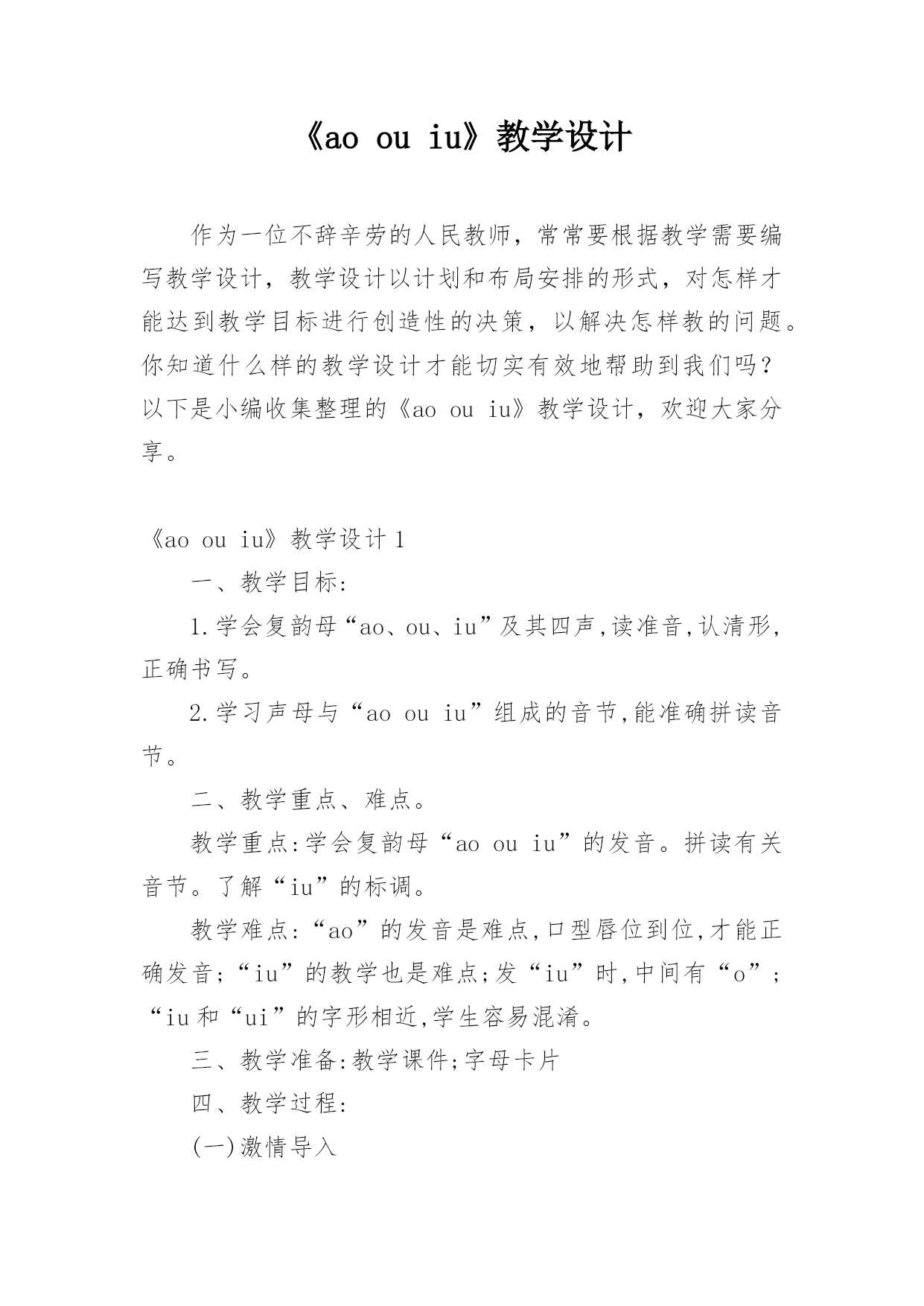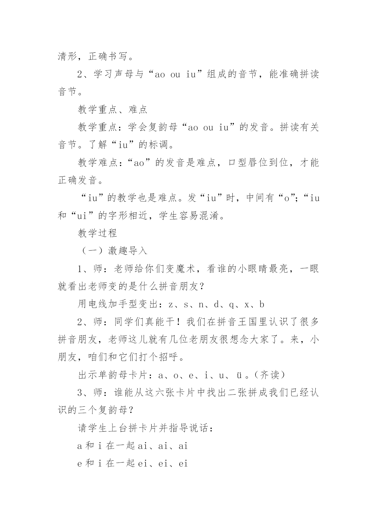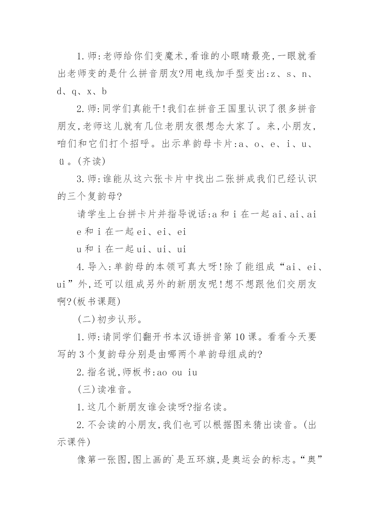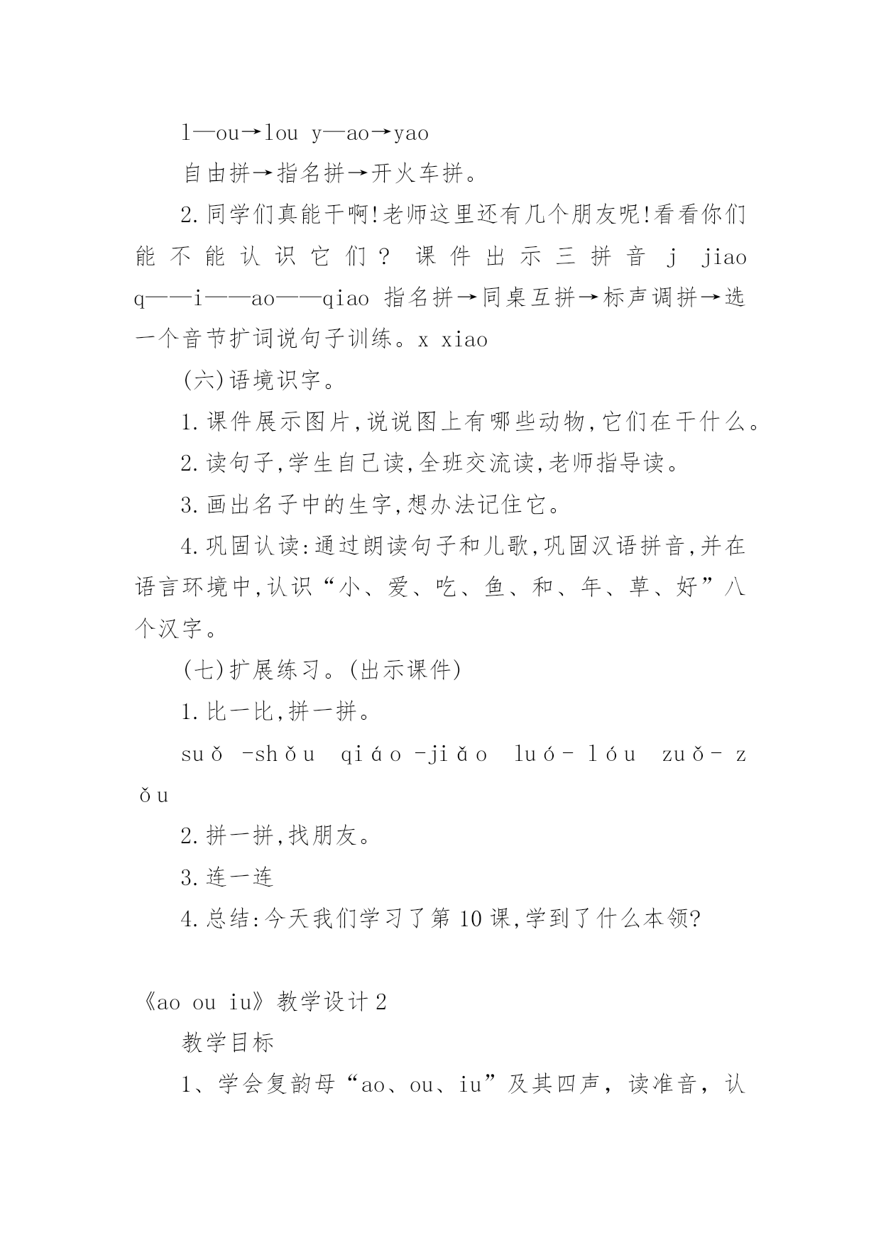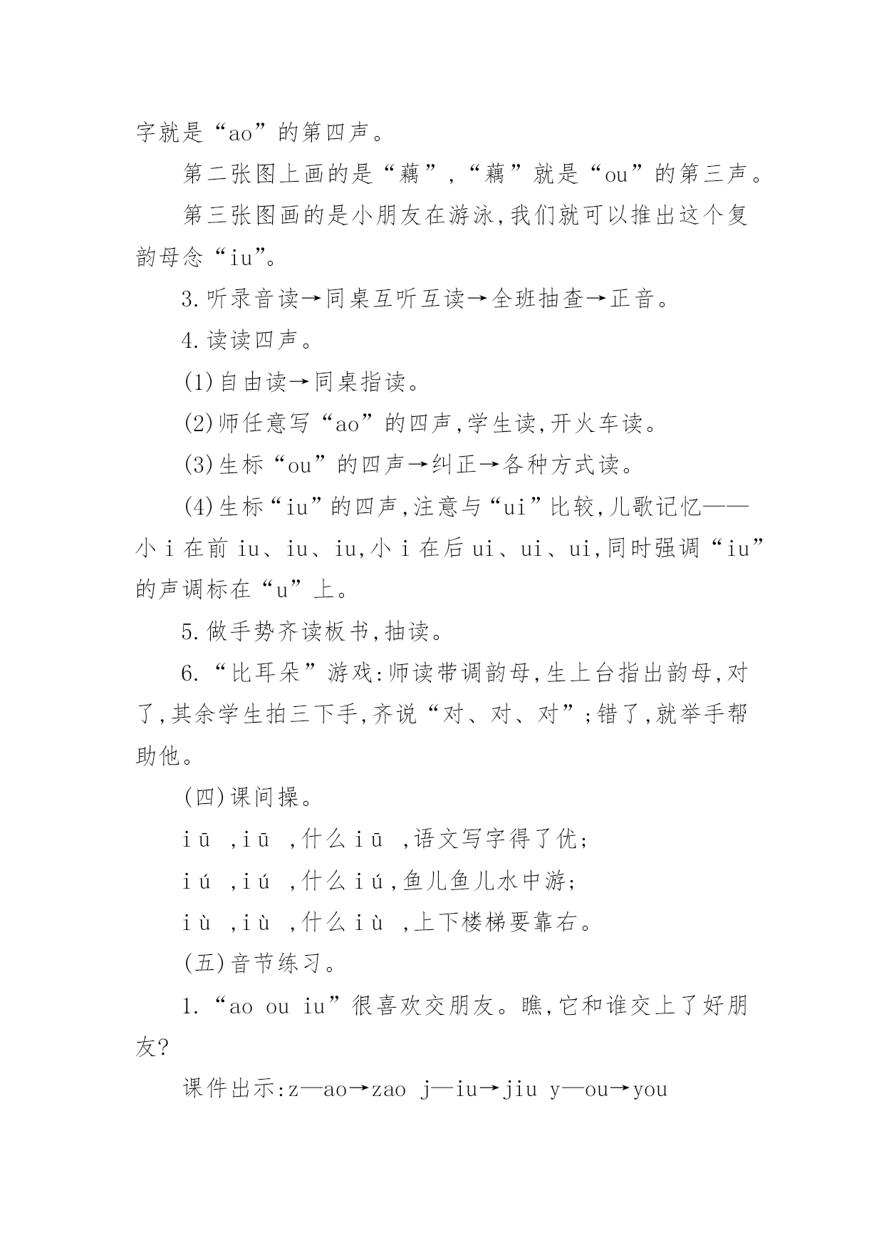 《aoouiu》教学设计 作为一位不辞辛劳的人民教师,常常要根据教学需要编写教学设计,教学设计以计划和布局安排的形式,对怎样才能达到教学目标进行创造性的决策,以解决怎样教的问题。你知道什么样的教学设计才能切实有效地帮助到我们吗?以下是小编收集整理的《aoouiu》教学设计,欢迎大家分享。《aoouiu》教学设计1一、教学目标:1.学会复韵母“ao、ou、iu”及其四声,读准音,认清形,正确书写。2.学习声母与“aoouiu”组成的音节,能准确拼读音节。二、教学重点、难点。教学重点:学会复韵母“aoouiu”的发音。拼读有关音节。了解“iu”的标调。教学难点:“ao”的发音是难点,口型唇位到位,才能正确发音;“iu”的教学也是难点;发“iu”时,中间有“o”;“iu和“ui”的字形相近,学生容易混淆。三、教学准备:教学课件;字母卡片四、教学过程:(一)激情导入1.师:老师给你们变魔术,看谁的小眼睛最亮,一眼就看出老师变的是什么拼音朋友?用电线加手型变出:z、s、n、d、q、x、b2.师:同学们真能干!我们在拼音王国里认识了很多拼音朋友,老师这儿就有几位老朋友很想念大家了。来,小朋友,咱们和它们打个招呼。出示单韵母卡片:a、o、e、i、u、ü。(齐读)3.师:谁能从这六张卡片中找出二张拼成我们已经认识的三个复韵母?请学生上台拼卡片并指导说话:a和i在一起ai、ai、aie和i在一起ei、ei、eiu和i在一起ui、ui、ui4.导入:单韵母的本领可真大呀!除了能组成“ai、ei、ui”外,还可以组成另外的新朋友呢!想不想跟他们交朋友啊?(板书课题)(二)初步认形。1.师:请同学们翻开书本汉语拼音第10课。看看今天要写的3个复韵母分别是由哪两个单韵母组成的?2.指名说,师板书:aoouiu(三)读准音。1.这几个新朋友谁会读呀?指名读。2.不会读的小朋友,我们也可以根据图来猜出读音。(出示课件)像第一张图,图上画的`是五环旗,是奥运会的标志。“奥”字就是“ao”的第四声。第二张图上画的是“藕”,“藕”就是“ou”的第三声。第三张图画的是小朋友在游泳,我们就可以推出这个复韵母念“iu”。3.听录音读→同桌互听互读→全班抽查→正音。4.读读四声。(1)自由读→同桌指读。(2)师任意写“ao”的四声,学生读,开火车读。(3)生标“ou”的四声→纠正→各种方式读。(4)生标“iu”的四声,注意与“ui”比较,儿歌记忆——小i在前iu、iu、iu,小i在后ui、ui、ui,同时强调“iu”的声调标在“u”上。5.做手势齐读板书,抽读。6.“比耳朵”游戏:师读带调韵母,生上台指出韵母,对了,其余学生拍三下手,齐说“对、对、对”;错了,就举手帮助他。(四)课间操。iū,iū,什么iū,语文写字得了优;iú,iú,什么iú,鱼儿鱼儿水中游;iù,iù,什么iù,上下楼梯要靠右。(五)音节练习。1.“aoouiu”很喜欢交朋友。瞧,它和谁交上了好朋友?课件出示:z—ao→zaoj—iu→jiuy—ou→youl—ou→louy—ao→yao自由拼→指名拼→开火车拼。2.同学们真能干啊!老师这里还有几个朋友呢!看看你们能不能认识它们?课件出示三拼音jjiaoq——i——ao——qiao指名拼→同桌互拼→标声调拼→选一个音节扩词说句子训练。xxiao(六)语境识字。1.课件展示图片,说说图上有哪些动物,它们在干什么。2.读句子,学生自己读,全班交流读,老师指导读。3.画出名子中的生字,想办法记住它。4.巩固认读:通过朗读句子和儿歌,巩固汉语拼音,并在语言环境中,认识“小、爱、吃、鱼、和、年、草、好”八个汉字。(七)扩展练习。(出示课件)1.比一比,拼一拼。suǒ-shǒuqiáo-jiǎoluó-lóuzuǒ-zǒu2.拼一拼,找朋友。3.连一连4.总结:今天我们学习了第10课,学到了什么本领?《aoouiu》教学设计2教学目标1、学会复韵母“ao、ou、iu”及其四声,读准音,认清形,正确书写。2、学习声母与“aoouiu”组成的音节,能准确拼读音节。教学重点、难点教学重点:学会复韵母“aoouiu”的发音。拼读有关音节。了解“iu”的标调。教学难点:“ao”的发音是难点,口型唇位到位,才能正确发音。“iu”的教学也是难点。发“iu”时,中间有“o”;“iu和“ui”的字形相近,学生容易混淆。教学过程(一)激趣导入1、师:老师给你们变魔术,看谁的小眼睛最亮,一眼就看出老师变的是什么拼音朋友?用电线加手型变出:z、s、n、d、q、x、b2、师:同学们真能干!我们在拼音王国里认识了很多拼音朋友,老师这儿就有几位老朋友很想念大家了。来,小朋友,咱们和它们打个招呼。出示单韵母卡片:a、o、e、i、u、ü。(齐读)3、师:谁能从这六张卡片中找出二张拼成我们已经