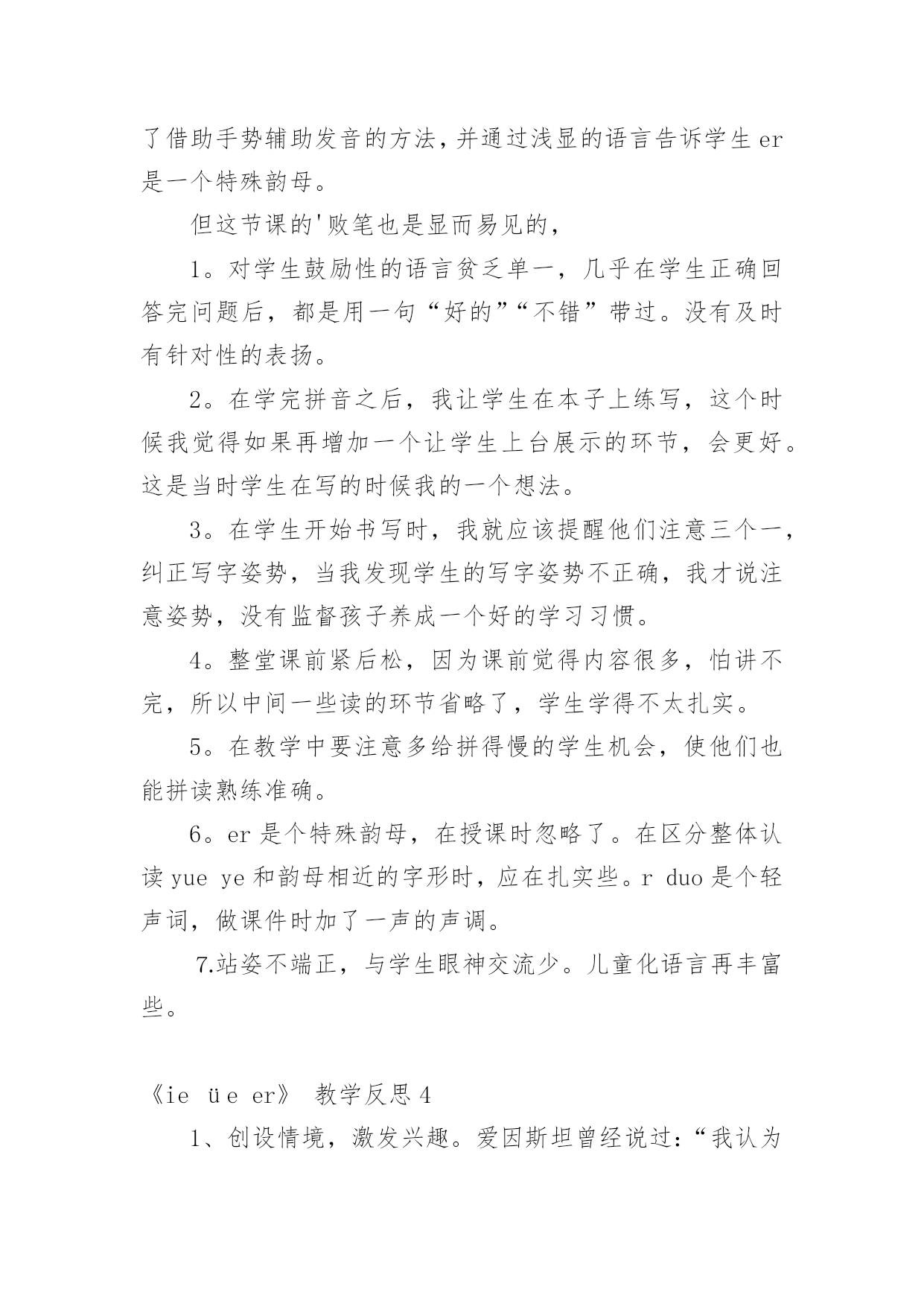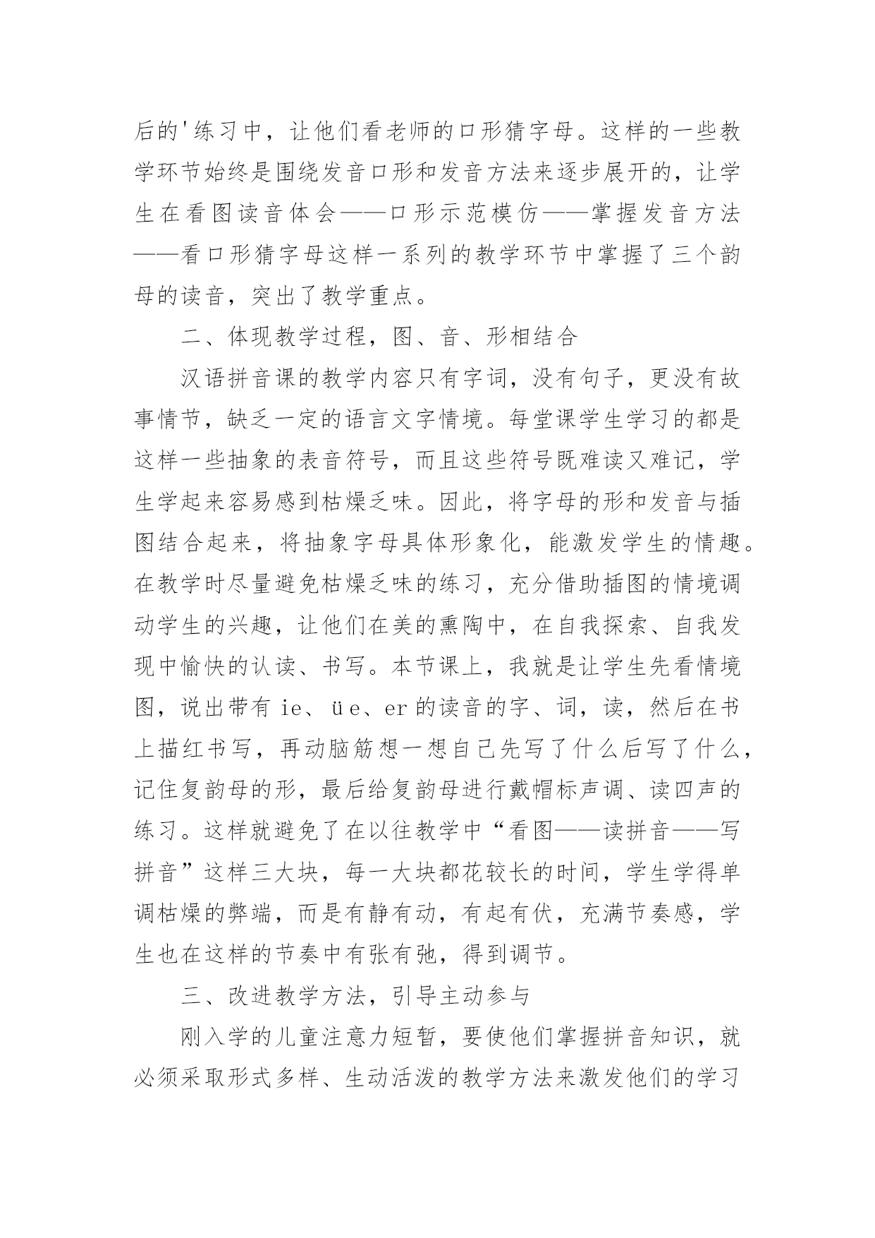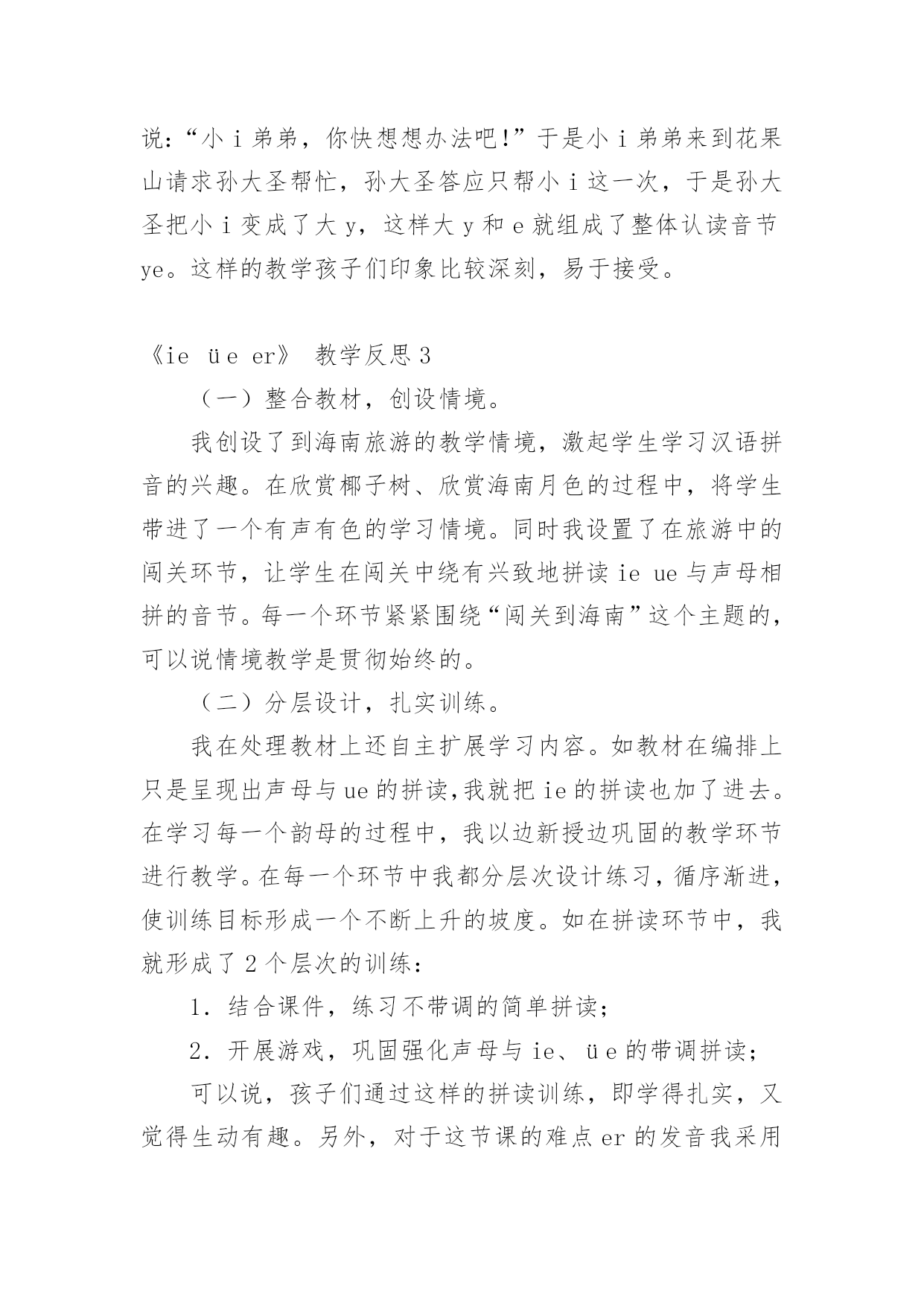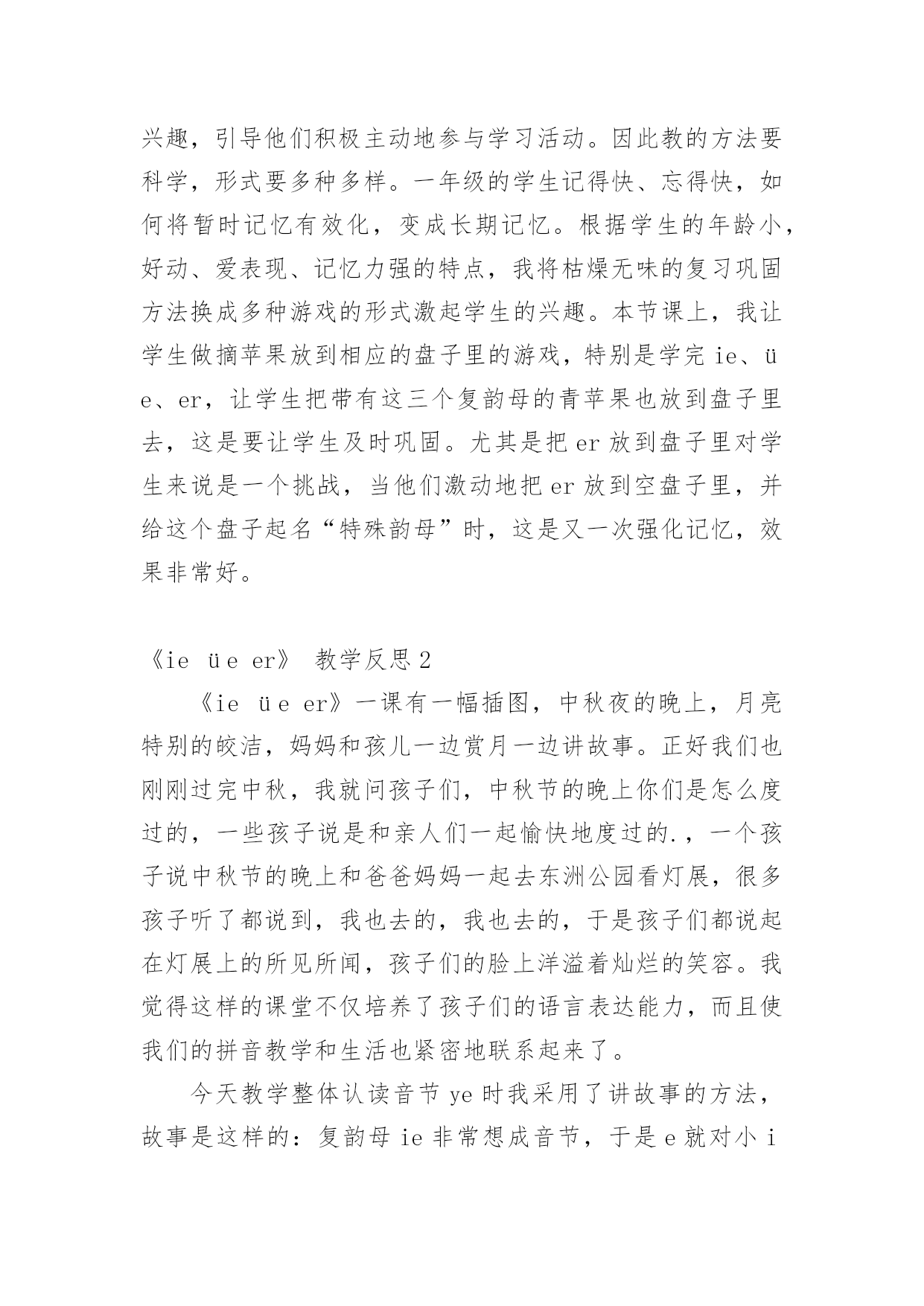 《ieüeer》教学反思 作为一名优秀的人民教师,教学是我们的工作之一,写教学反思可以快速提升我们的教学能力,教学反思我们应该怎么写呢?下面是小编为大家整理的《ieüeer》教学反思,欢迎大家分享。《ieüeer》教学反思1上了《aoouiu》那一节课以后,自我感觉非常不好,想着要教会学生如何给复韵母标声调、会读情境歌、区分ui和iu,等等,结果想抓的东西太多,把最主要的内容所需的时间给挤掉了,那就是把aoouiu三个复韵母的音读准。这正是“捡了芝麻,丢了西瓜”。鉴于《aoouiu》这一节课的教训,在《ie、üe、er》这一课的教学上,我想尽量做到以下两点。一、突出教学重点,强化读音教学重点是一堂课的中心。因此,必须集中较多时间与较多精力解决好教学重点问题。各个教学环节也都要围绕教学重点服务,并服从教学重点。本节课上,我就是紧紧围绕ie、üe、er的读音这一教学重点来展开教学的。首先,引导学生看情境图,自己说出含有ie、üe、er的读音的字、词,读一读,体会体会它们的发音方法。再请发音口形摆得好的小朋友自己上来做示范,其余小朋友观察模仿。然后请小朋友自己说出发音的方法,是摆好谁的口形向谁滑。在最后的'练习中,让他们看老师的口形猜字母。这样的一些教学环节始终是围绕发音口形和发音方法来逐步展开的,让学生在看图读音体会——口形示范模仿——掌握发音方法——看口形猜字母这样一系列的教学环节中掌握了三个韵母的读音,突出了教学重点。二、体现教学过程,图、音、形相结合汉语拼音课的教学内容只有字词,没有句子,更没有故事情节,缺乏一定的语言文字情境。每堂课学生学习的都是这样一些抽象的表音符号,而且这些符号既难读又难记,学生学起来容易感到枯燥乏味。因此,将字母的形和发音与插图结合起来,将抽象字母具体形象化,能激发学生的情趣。在教学时尽量避免枯燥乏味的练习,充分借助插图的情境调动学生的兴趣,让他们在美的熏陶中,在自我探索、自我发现中愉快的认读、书写。本节课上,我就是让学生先看情境图,说出带有ie、üe、er的读音的字、词,读,然后在书上描红书写,再动脑筋想一想自己先写了什么后写了什么,记住复韵母的形,最后给复韵母进行戴帽标声调、读四声的练习。这样就避免了在以往教学中“看图——读拼音——写拼音”这样三大块,每一大块都花较长的时间,学生学得单调枯燥的弊端,而是有静有动,有起有伏,充满节奏感,学生也在这样的节奏中有张有弛,得到调节。三、改进教学方法,引导主动参与刚入学的儿童注意力短暂,要使他们掌握拼音知识,就必须采取形式多样、生动活泼的教学方法来激发他们的学习兴趣,引导他们积极主动地参与学习活动。因此教的方法要科学,形式要多种多样。一年级的学生记得快、忘得快,如何将暂时记忆有效化,变成长期记忆。根据学生的年龄小,好动、爱表现、记忆力强的特点,我将枯燥无味的复习巩固方法换成多种游戏的形式激起学生的兴趣。本节课上,我让学生做摘苹果放到相应的盘子里的游戏,特别是学完ie、üe、er,让学生把带有这三个复韵母的青苹果也放到盘子里去,这是要让学生及时巩固。尤其是把er放到盘子里对学生来说是一个挑战,当他们激动地把er放到空盘子里,并给这个盘子起名“特殊韵母”时,这是又一次强化记忆,效果非常好。《ieüeer》教学反思2《ieüeer》一课有一幅插图,中秋夜的晚上,月亮特别的皎洁,妈妈和孩儿一边赏月一边讲故事。正好我们也刚刚过完中秋,我就问孩子们,中秋节的晚上你们是怎么度过的,一些孩子说是和亲人们一起愉快地度过的.,一个孩子说中秋节的晚上和爸爸妈妈一起去东洲公园看灯展,很多孩子听了都说到,我也去的,我也去的,于是孩子们都说起在灯展上的所见所闻,孩子们的脸上洋溢着灿烂的笑容。我觉得这样的课堂不仅培养了孩子们的语言表达能力,而且使我们的拼音教学和生活也紧密地联系起来了。今天教学整体认读音节ye时我采用了讲故事的方法,故事是这样的:复韵母ie非常想成音节,于是e就对小i说:“小i弟弟,你快想想办法吧!”于是小i弟弟来到花果山请求孙大圣帮忙,孙大圣答应只帮小i这一次,于是孙大圣把小i变成了大y,这样大y和e就组成了整体认读音节ye。这样的教学孩子们印象比较深刻,易于接受。《ieüeer》教学反思3(一)整合教材,创设情境。我创设了到海南旅游的教学情境,激起学生学习汉语拼音的兴趣。在欣赏椰子树、欣赏海南月色的过程中,将学生带进了一个有声有色的学习情境。同时我设置了在旅游中的闯关环节,让学生在闯关中绕有兴致地拼读ieue与声母相拼的音节。每一个环节紧紧围绕“闯关到海南”这个主题的,可以说情境教学是贯彻始终的。(二)分层设计,扎实训练。我在处理教材上还自主扩展学习内容。如教材在编排上只是呈现出声母与ue的拼读,我就把ie的拼读也加了进去。在学习每一个韵母的过程中,我以边新授边巩固