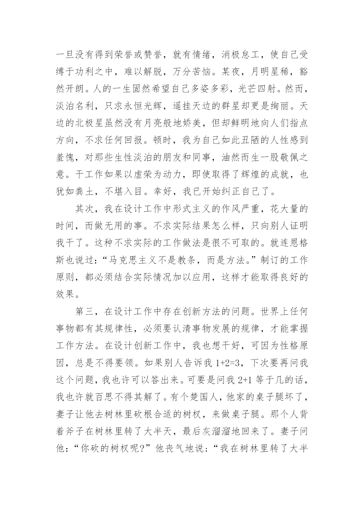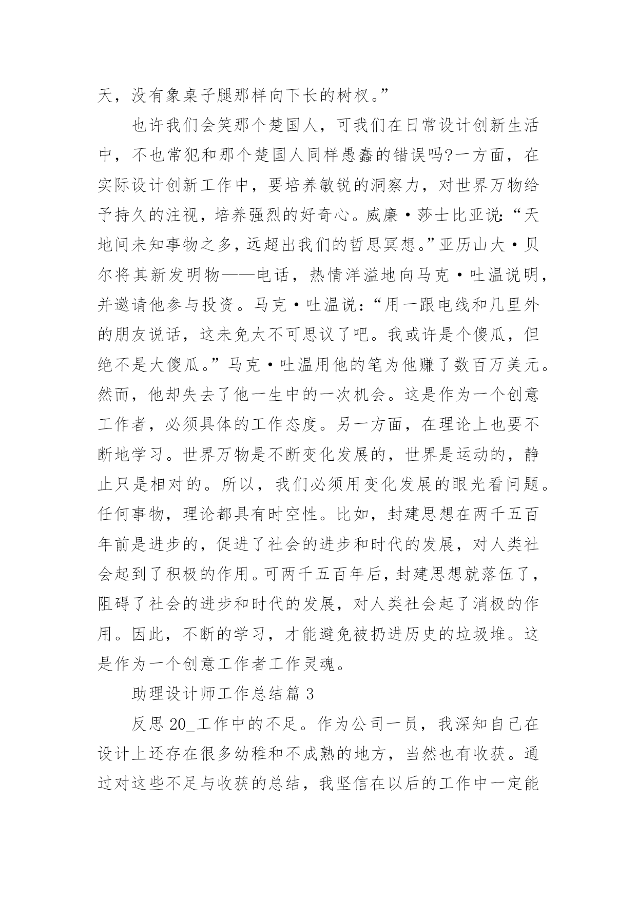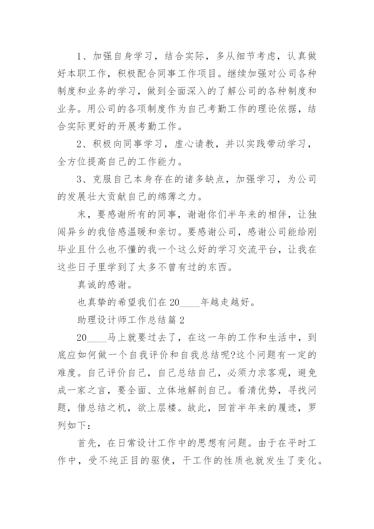 助理设计师工作总结5篇 工作总结不仅是梳理以往工作内容的文本,也是帮助我们成长进步的重要工具,通过工作总结来让领导更加全面的了解你,下面是小编为您分享的助理设计师工作总结5篇,感谢您的参阅。助理设计师工作总结篇1时光似箭,岁月如梭,转眼进入公司已经有将近半年的时间,在公司领导的强有力的领导以及关心支持下,个人在20____年度取得了不小的进步。一、年度工作情况1、熟悉了解公司各项规章制度。我于20____年8月进入公司,为了更快更好地融入公司这个团队,为以后的工作打好铺垫,我加紧对公司的各项规章制度进行了解,熟悉公司的企业文化。通过了解和熟悉,我为能进入公司这个团队感到自豪,同时也感到自身的压力。在以后的工作中,我将以公司的各项规章制度为准则,严格要求自己,更快更好地完成工作任务。2、熟悉了解工作流程作为设计师助理,我的职责是帮助设计师完成谈单过程中的各种图纸及文档,为设计师签单做好充分准备。经过一段时期的磨合,我逐渐知道自己该如何去做并做好手头工作,在设计师的指导带领下,不仅懂得了许多专业方面的知识,也懂得了许多做人处事的道理。二、存在的不足以及改进措施20____年已经随风逝去,回想自己在公司将近半年的工作,工作量并不是很大,闪光点几乎是不存在,许多工作还有不尽如意之处,总结起来存在的不足主要有以下几点:1、缺乏沟通,不能充分利用资源在工作的过程中,由于专业知识不够扎实,又存在一定惰性,遇事考虑不够周全、不够细致,不积极向其他同事求教,造成工作效率降低甚至出现错误,不能达到优势资源充分利用。俗话说的好“三人行必有我师”,在以后的工作中,我要主动加强和其他部门同事的沟通,通过公司这个平台达到资源共享,从而提高自己的工作效能。2、缺乏计划性在工作过程中,由于缺乏计划性,工作目的不够明确,主次矛盾不清,常常达到事倍功半的效果,领导不满意不说,自己还一肚子委屈。在以后的工作过程中,我要认真制订工作计划,做事加强目的认识,分清主次矛盾,争取能达到事半功倍的效果。3、专业面狭窄作为一个现代化人才,他应该是一专多能的,这样的人才才符合时代以及公司的需求。自己的专业面狭窄,对其它专业的基本认识都没有,这都限制了自身的发展。在以后的工作过程中,我将加强其他专业的学习,充分利用公司资源,提高主观能动性,争取能成为一专多能的复合型人才。三、20____年目标计划1、加强自身学习,结合实际,多从细节考虑,认真做好本职工作,积极配合同事工作项目。继续加强对公司各种制度和业务的学习,做到全面深入的了解公司的各种制度和业务。用公司的各项制度作为自己考勤工作的理论依据,结合实际更好的开展考勤工作。2、积极向同事学习,虚心请教,并以实践带动学习,全方位提高自己的工作能力。3、克服自己本身存在的诸多缺点,加强学习,为公司的发展壮大贡献自己的绵薄之力。末,要感谢所有的同事,谢谢你们半年来的相伴,让独闯异乡的我倍感温暖和亲切。要感谢公司,感谢公司能给刚毕业且什么也不懂的我一个这么好的学习交流平台,让我在这些日子里学到了太多不曾有过的东西。真诚的感谢。也真挚的希望我们在20____年越走越好。助理设计师工作总结篇220____马上就要过去了,在这一年的工作和生活中,到底应如何做一个自我评价和自我总结呢?这个问题有一定的难度。自己评价自己,自己总结自己,必须力求客观,避免成一家之言,要全面、立体地解剖自己。看清优势,寻找问题,借总结之机,欲上层楼。故此,回首半年来的履迹,罗列如下:首先,在日常设计工作中的思想有问题。由于在平时工作中,受不纯正目的驱使,干工作的性质也就发生了变化。一旦没有得到荣誉或赞誉,就有情绪,消极怠工,使自己受缚于功利之中,难以解脱,万分苦恼。某夜,月明星稀,豁然开朗。人的一生固然希望自己多姿多彩,光芒四射。然而,淡泊名利,只求永恒光辉,遥挂天边的群星却更是绚丽。天边的北极星虽然没有月亮般地娇美,但却鲜明地向人们指点方向,不求任何回报。顿时,我为自己如此丑陋的人性感到羞愧,对那些生性淡泊的朋友和同事,油然而生一股敬佩之意。干工作如果以虚荣为动力,即使取得了辉煌的成就,也犹如粪土,不堪入目。幸好,我已开始纠正自己了。其次,我在设计工作中形式主义的作风严重,花大量的时间,而做无用的事。不求实际结果怎么样,只向别人证明我干了。这种不求实际的工作做法是很不可取的。就连恩格斯也说过:“马克思主义不是教条,而是方法。”制订的工作原则,都必须结合实际情况加以应用,这样才能取得良好的效果。第三,在设计工作中存在创新方法的问题。世界上任何事物都有其规律性,必须要认清事物发展的规律,才能掌握工作方法。在设计创新工作中,我也想干好,可因为性格原因,总是不得要领。如果别人告诉我1+2=3,下次要再问我这个问题,我也许可以答出来。可要是问我2+1等于几的话,我也许就百思