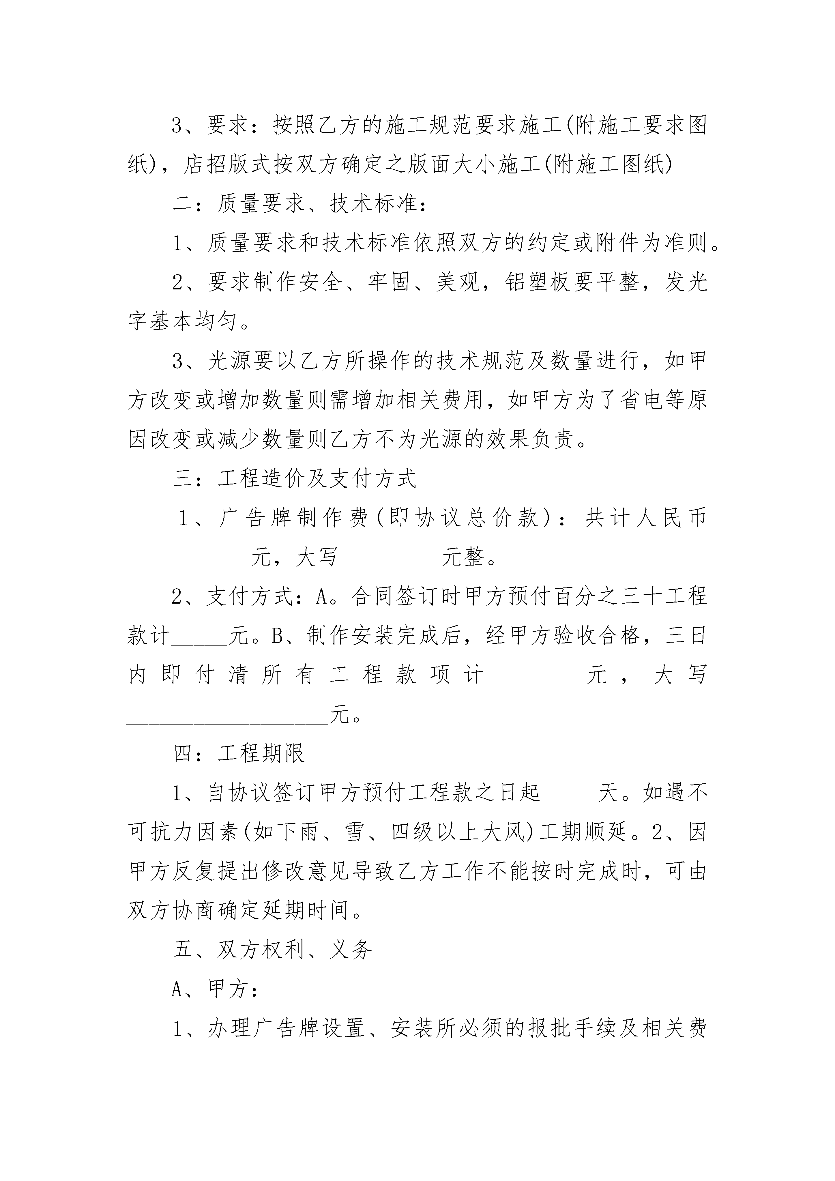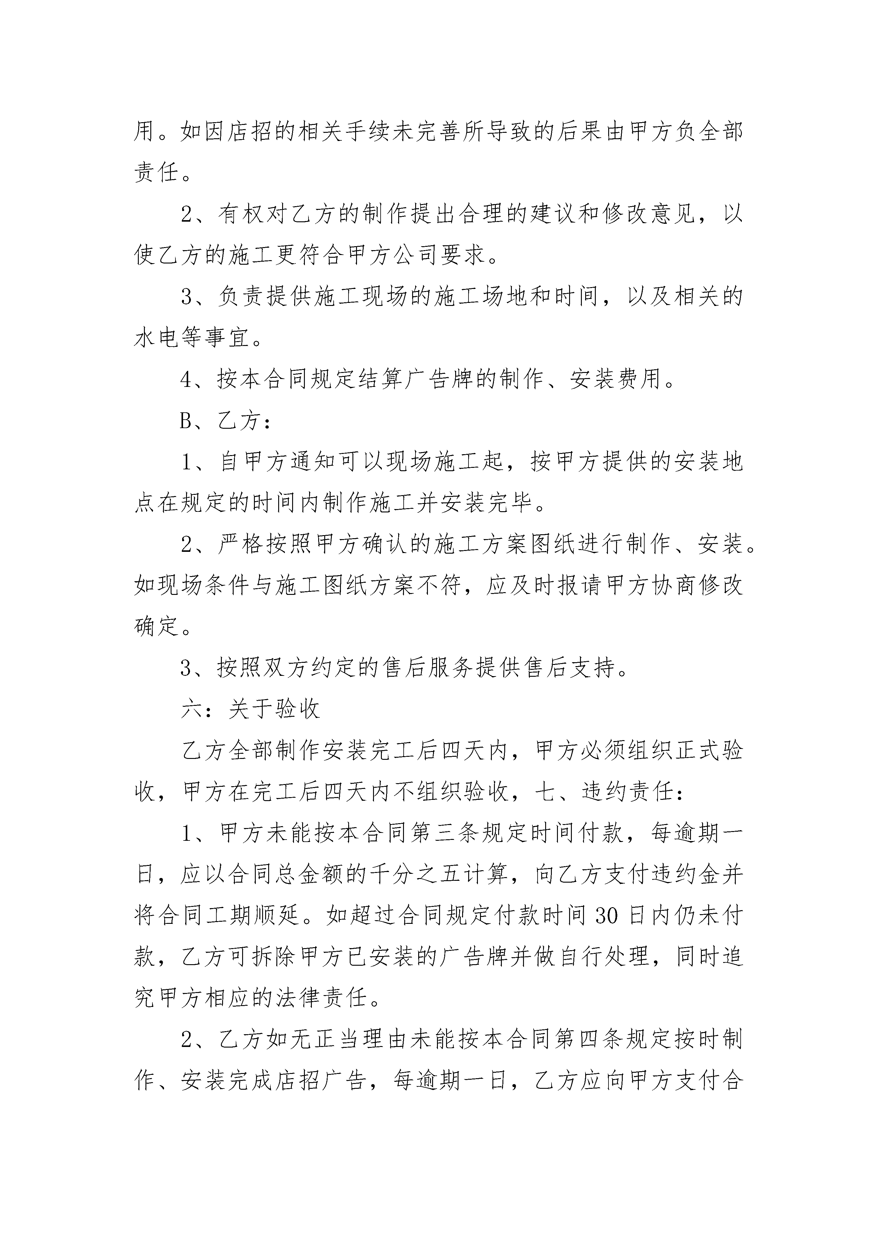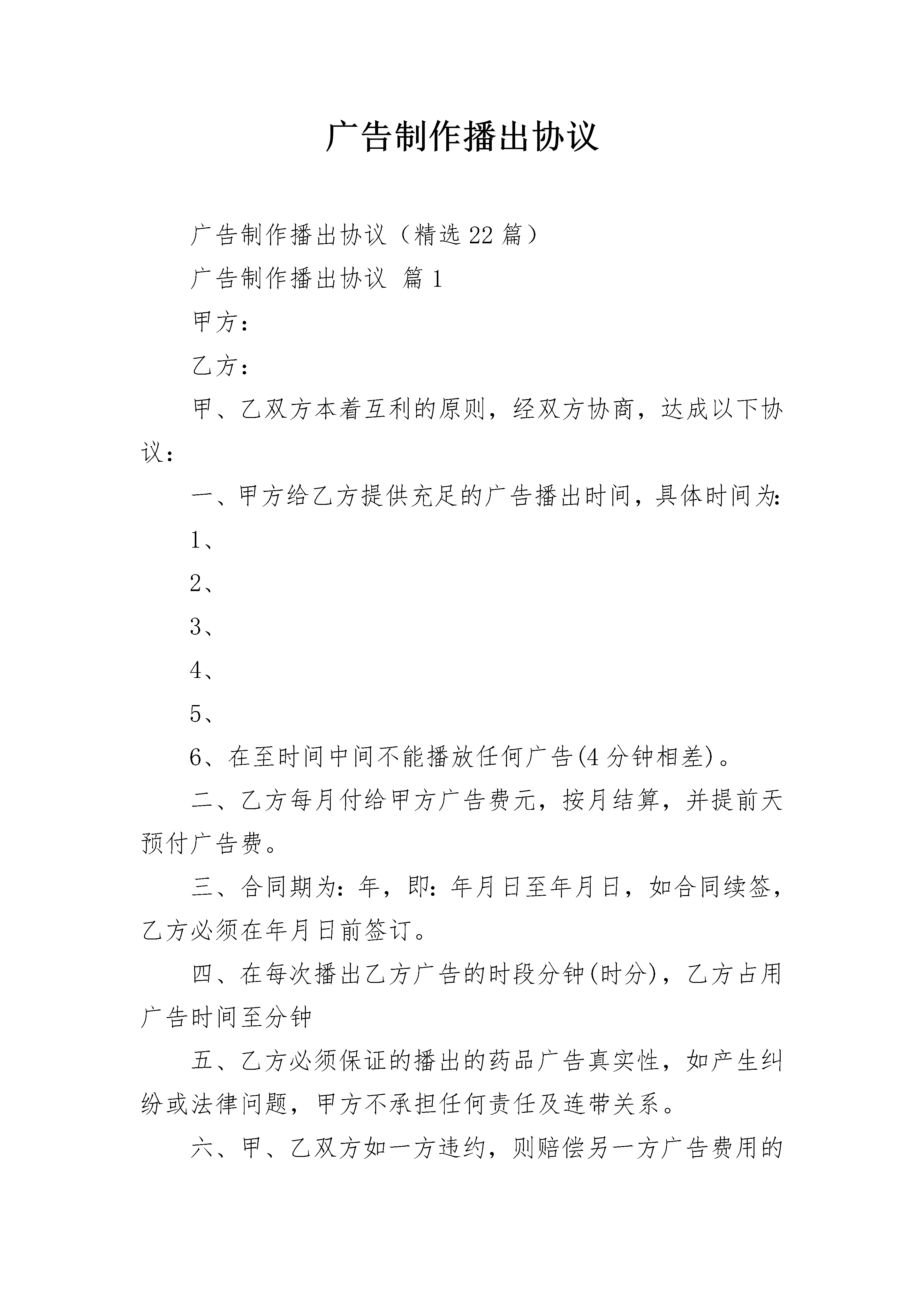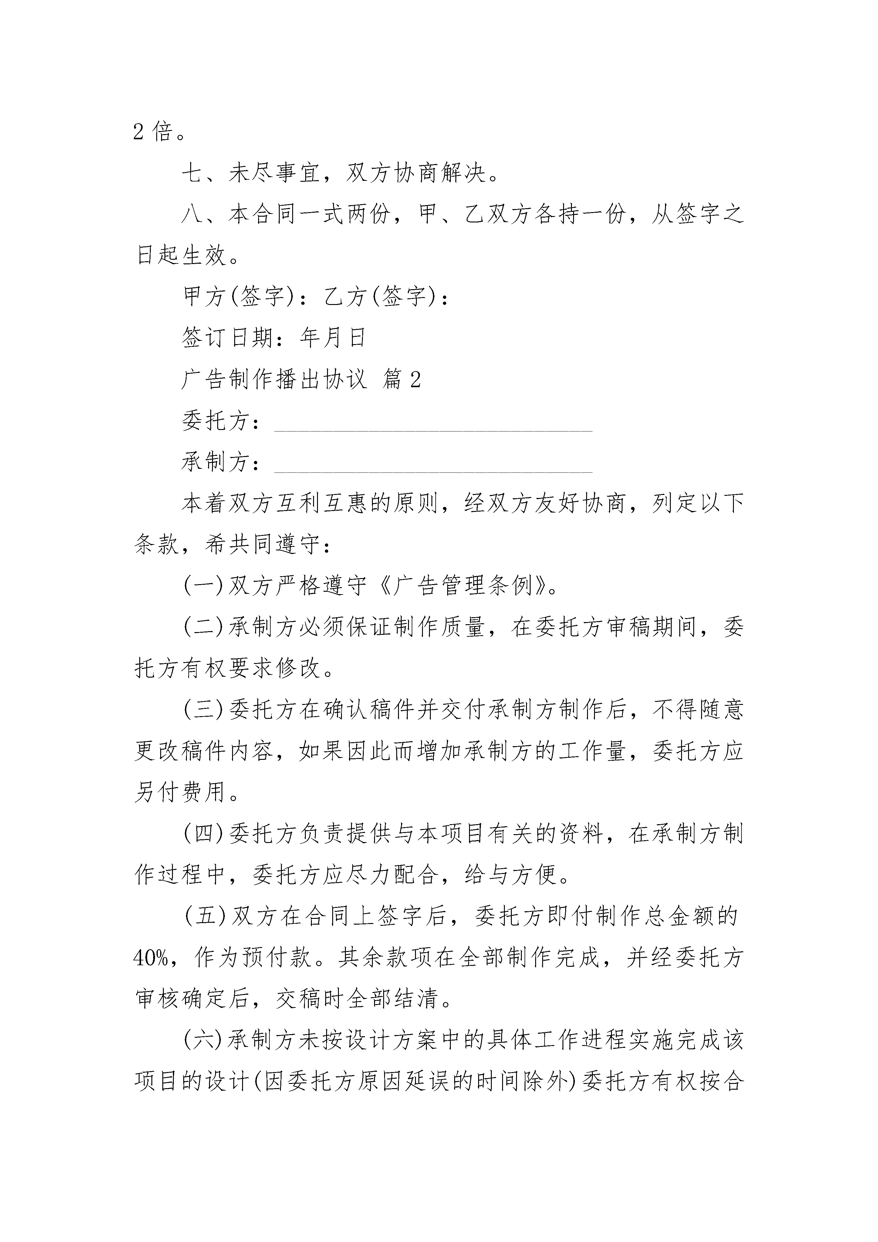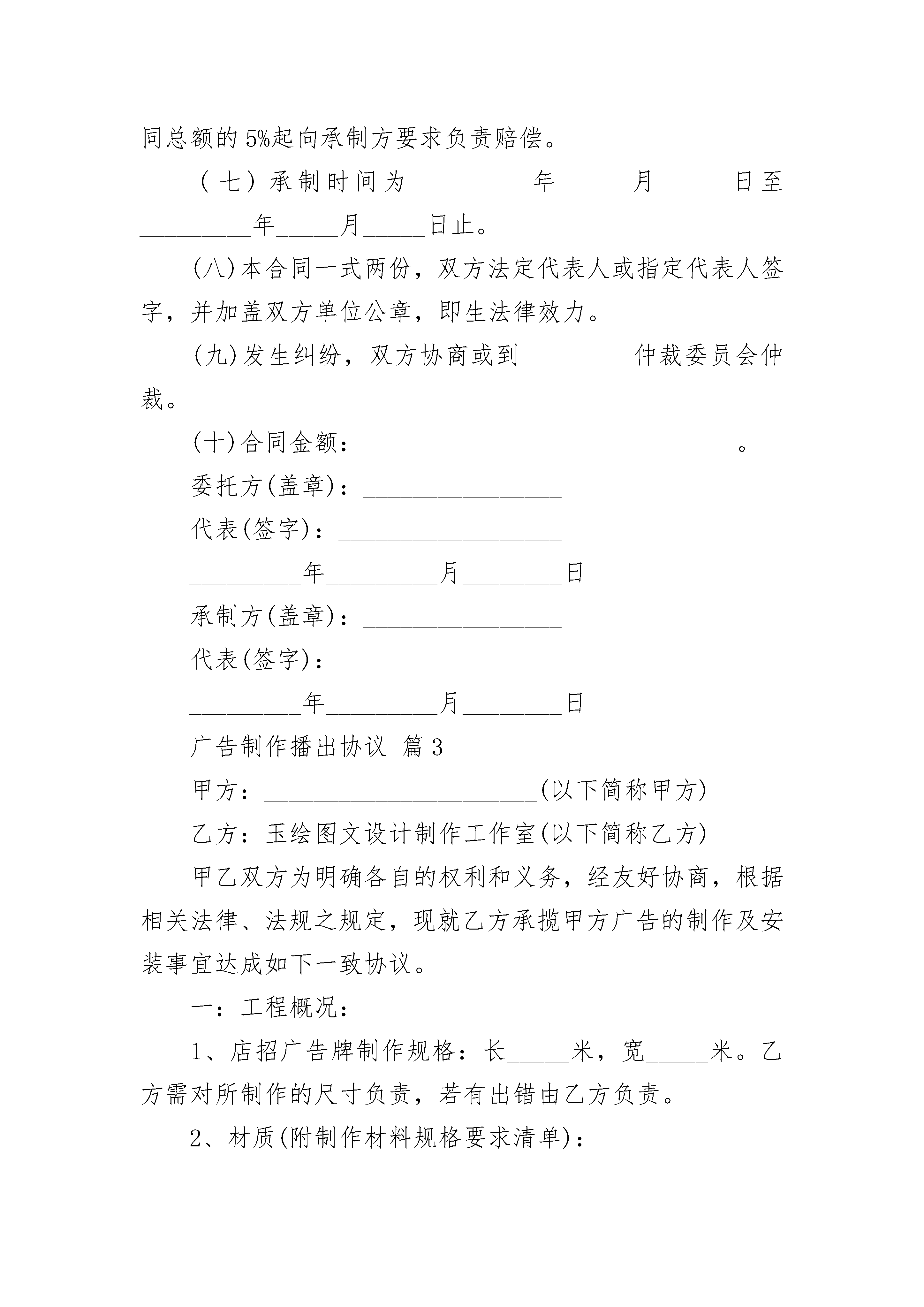 广告制作播出协议广告制作播出协议(精选22篇)广告制作播出协议篇1甲方:乙方:甲、乙双方本着互利的原则,经双方协商,达成以下协议:一、甲方给乙方提供充足的广告播出时间,具体时间为:1、2、3、4、5、6、在至时间中间不能播放任何广告(4分钟相差)。二、乙方每月付给甲方广告费元,按月结算,并提前天预付广告费。三、合同期为:年,即:年月日至年月日,如合同续签,乙方必须在年月日前签订。四、在每次播出乙方广告的时段分钟(时分),乙方占用广告时间至分钟五、乙方必须保证的播出的药品广告真实性,如产生纠纷或法律问题,甲方不承担任何责任及连带关系。六、甲、乙双方如一方违约,则赔偿另一方广告费用的2倍。七、未尽事宜,双方协商解决。八、本合同一式两份,甲、乙双方各持一份,从签字之日起生效。甲方(签字):乙方(签字):签订日期:年月日广告制作播出协议篇2委托方:___________________________承制方:___________________________本着双方互利互惠的原则,经双方友好协商,列定以下条款,希共同遵守:(一)双方严格遵守《广告管理条例》。(二)承制方必须保证制作质量,在委托方审稿期间,委托方有权要求修改。(三)委托方在确认稿件并交付承制方制作后,不得随意更改稿件内容,如果因此而增加承制方的工作量,委托方应另付费用。(四)委托方负责提供与本项目有关的资料,在承制方制作过程中,委托方应尽力配合,给与方便。(五)双方在合同上签字后,委托方即付制作总金额的40%,作为预付款。其余款项在全部制作完成,并经委托方审核确定后,交稿时全部结清。(六)承制方未按设计方案中的具体工作进程实施完成该项目的设计(因委托方原因延误的时间除外)委托方有权按合同总额的5%起向承制方要求负责赔偿。(七)承制时间为_________年_____月_____日至_________年_____月_____日止。(八)本合同一式两份,双方法定代表人或指定代表人签字,并加盖双方单位公章,即生法律效力。(九)发生纠纷,双方协商或到_________仲裁委员会仲裁。(十)合同金额:______________________________。委托方(盖章):________________代表(签字):___________________________年_________月________日承制方(盖章):________________代表(签字):___________________________年_________月________日广告制作播出协议篇3甲方:______________________(以下简称甲方)乙方:玉绘图文设计制作工作室(以下简称乙方)甲乙双方为明确各自的权利和义务,经友好协商,根据相关法律、法规之规定,现就乙方承揽甲方广告的制作及安装事宜达成如下一致协议。一:工程概况:1、店招广告牌制作规格:长_____米,宽_____米。乙方需对所制作的尺寸负责,若有出错由乙方负责。2、材质(附制作材料规格要求清单):3、要求:按照乙方的施工规范要求施工(附施工要求图纸),店招版式按双方确定之版面大小施工(附施工图纸)二:质量要求、技术标准:1、质量要求和技术标准依照双方的约定或附件为准则。2、要求制作安全、牢固、美观,铝塑板要平整,发光字基本均匀。3、光源要以乙方所操作的技术规范及数量进行,如甲方改变或增加数量则需增加相关费用,如甲方为了省电等原因改变或减少数量则乙方不为光源的效果负责。三:工程造价及支付方式1、广告牌制作费(即协议总价款):共计人民币___________元,大写_________元整。2、支付方式:A。合同签订时甲方预付百分之三十工程款计_____元。B、制作安装完成后,经甲方验收合格,三日内即付清所有工程款项计_______元,大写__________________元。四:工程期限1、自协议签订甲方预付工程款之日起_____天。如遇不可抗力因素(如下雨、雪、四级以上大风)工期顺延。2、因甲方反复提出修改意见导致乙方工作不能按时完成时,可由双方协商确定延期时间。五、双方权利、义务A、甲方:1、办理广告牌设置、安装所必须的报批手续及相关费用。如因店招的相关手续未完善所导致的后果由甲方负全部责任。2、有权对乙方的制作提出合理的建议和修改意见,以使乙方的施工更符合甲方公司要求。3、负责提供施工现场的施工场地和时间,以及相关的水电等事宜。4、按本合同规定结算广告牌的制作、安装费用。B、乙方:1、自甲方通知可以现场施工起,按甲方提供的安装地点在规定的时间内制作施工并安装完毕。2、严格按照甲方确认的施工方案图纸进行制作、安装。如现场条件与施工图纸方案不符,应及时报请甲方协商修改确定。3、按照双方约定的售后服务提供