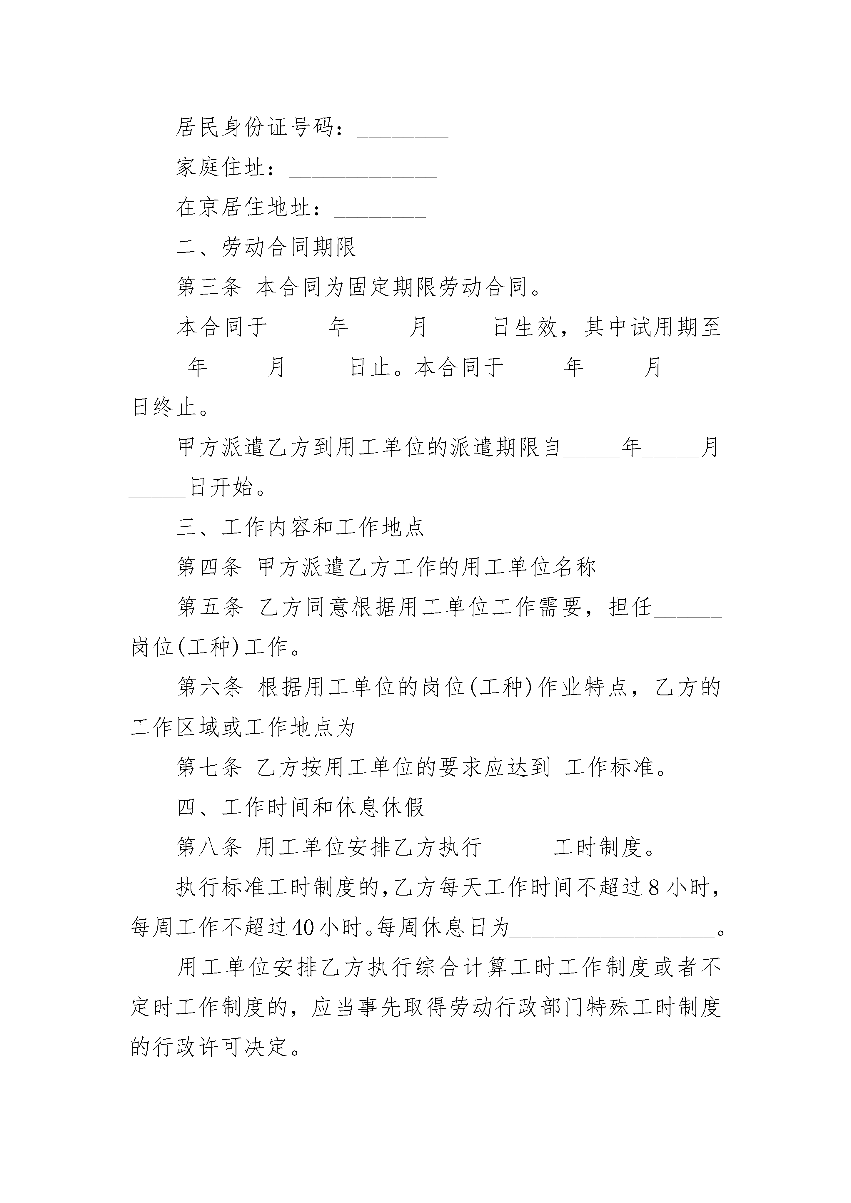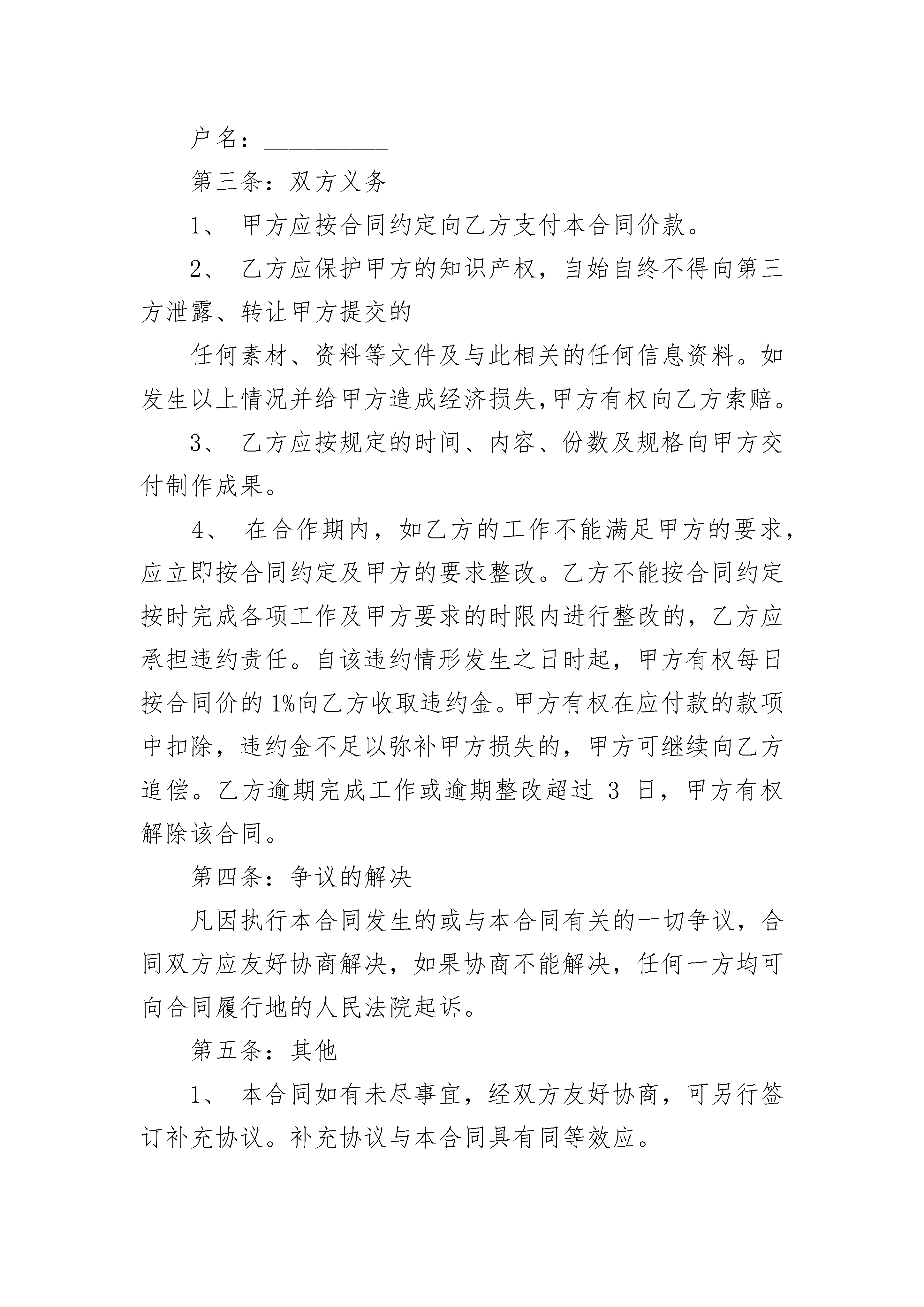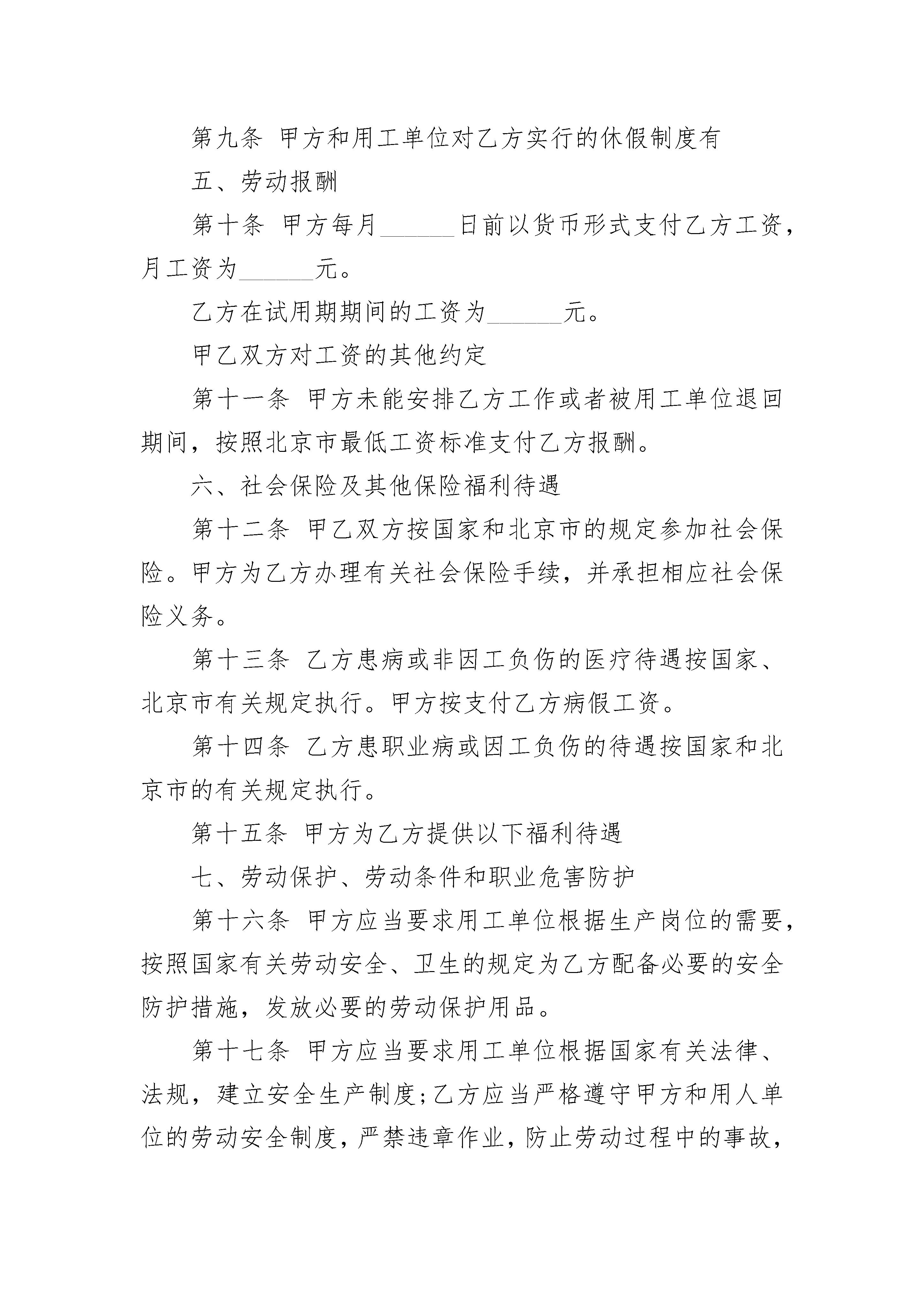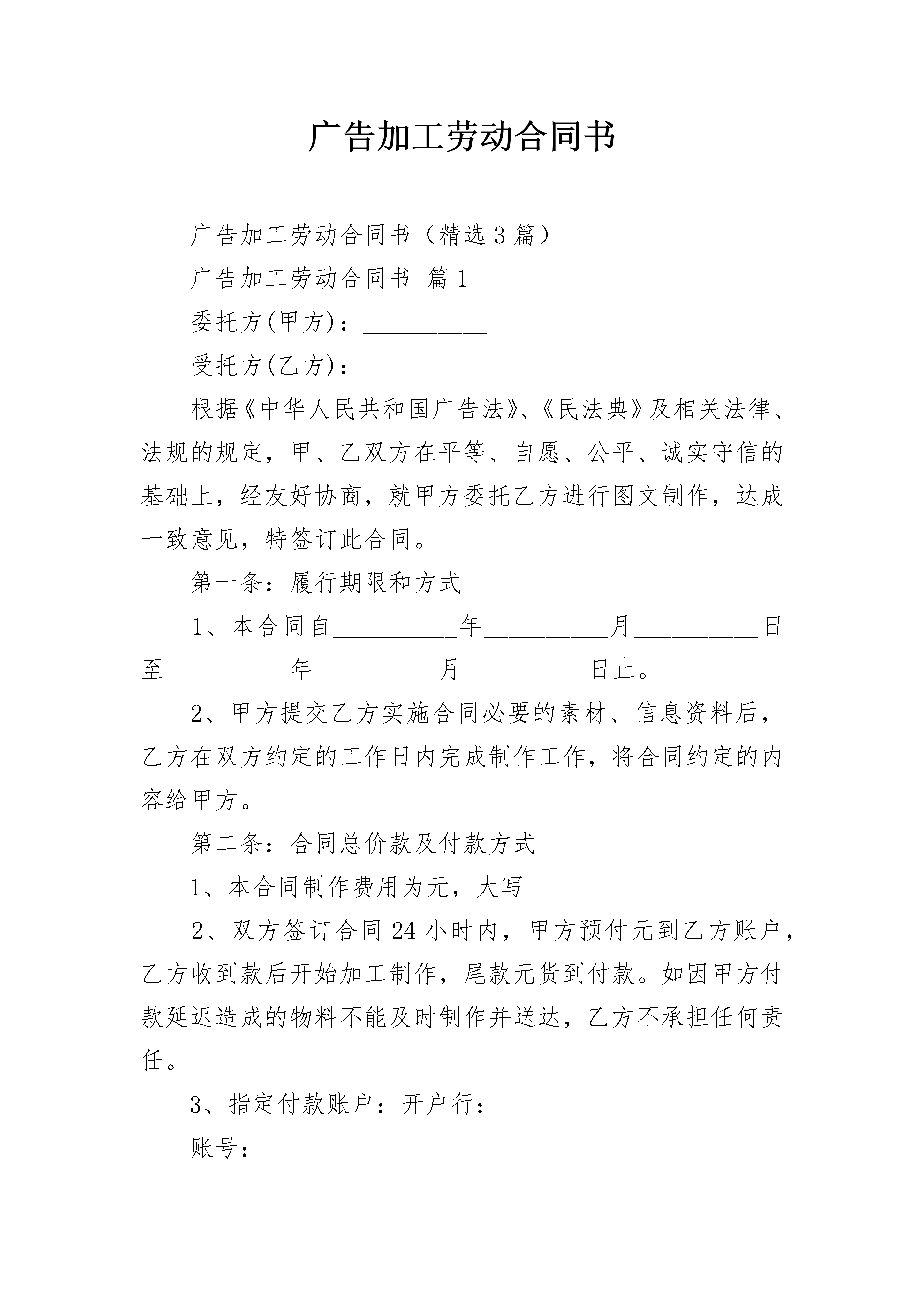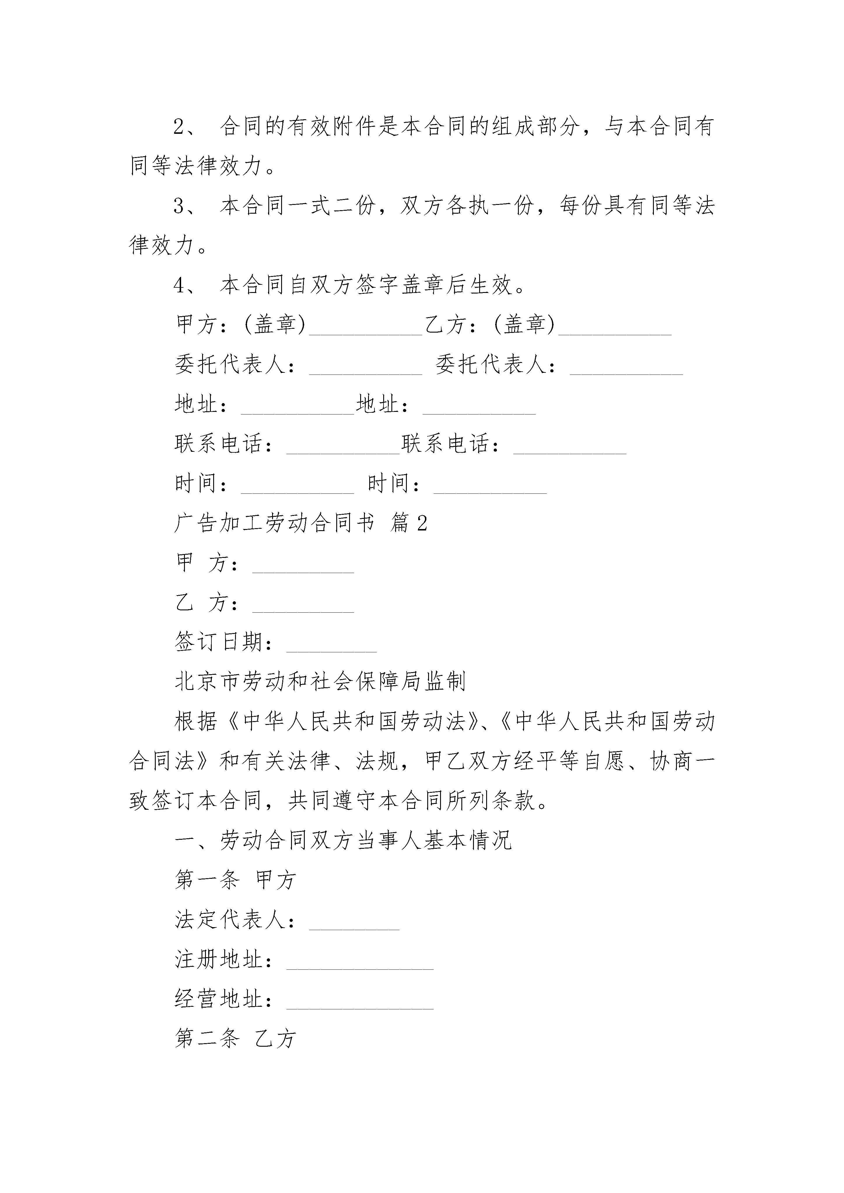 广告加工劳动合同书广告加工劳动合同书(精选3篇)广告加工劳动合同书篇1委托方(甲方):__________受托方(乙方):__________根据《中华人民共和国广告法》、《民法典》及相关法律、法规的规定,甲、乙双方在平等、自愿、公平、诚实守信的基础上,经友好协商,就甲方委托乙方进行图文制作,达成一致意见,特签订此合同。第一条:履行期限和方式1、本合同自__________年__________月__________日至__________年__________月__________日止。2、甲方提交乙方实施合同必要的素材、信息资料后,乙方在双方约定的工作日内完成制作工作,将合同约定的内容给甲方。第二条:合同总价款及付款方式1、本合同制作费用为元,大写2、双方签订合同24小时内,甲方预付元到乙方账户,乙方收到款后开始加工制作,尾款元货到付款。如因甲方付款延迟造成的物料不能及时制作并送达,乙方不承担任何责任。3、指定付款账户:开户行:账号:__________户名:__________第三条:双方义务1、甲方应按合同约定向乙方支付本合同价款。2、乙方应保护甲方的知识产权,自始自终不得向第三方泄露、转让甲方提交的任何素材、资料等文件及与此相关的任何信息资料。如发生以上情况并给甲方造成经济损失,甲方有权向乙方索赔。3、乙方应按规定的时间、内容、份数及规格向甲方交付制作成果。4、在合作期内,如乙方的工作不能满足甲方的要求,应立即按合同约定及甲方的要求整改。乙方不能按合同约定按时完成各项工作及甲方要求的时限内进行整改的,乙方应承担违约责任。自该违约情形发生之日时起,甲方有权每日按合同价的1%向乙方收取违约金。甲方有权在应付款的款项中扣除,违约金不足以弥补甲方损失的,甲方可继续向乙方追偿。乙方逾期完成工作或逾期整改超过3日,甲方有权解除该合同。第四条:争议的解决凡因执行本合同发生的或与本合同有关的一切争议,合同双方应友好协商解决,如果协商不能解决,任何一方均可向合同履行地的人民法院起诉。第五条:其他1、本合同如有未尽事宜,经双方友好协商,可另行签订补充协议。补充协议与本合同具有同等效应。2、合同的有效附件是本合同的组成部分,与本合同有同等法律效力。3、本合同一式二份,双方各执一份,每份具有同等法律效力。4、本合同自双方签字盖章后生效。甲方:(盖章)__________乙方:(盖章)__________委托代表人:__________委托代表人:__________地址:__________地址:__________联系电话:__________联系电话:__________时间:__________时间:__________广告加工劳动合同书篇2甲方:_________乙方:_________签订日期:________北京市劳动和社会保障局监制根据《中华人民共和国劳动法》、《中华人民共和国劳动合同法》和有关法律、法规,甲乙双方经平等自愿、协商一致签订本合同,共同遵守本合同所列条款。一、劳动合同双方当事人基本情况第一条甲方法定代表人:________注册地址:_____________经营地址:_____________第二条乙方居民身份证号码:________家庭住址:_____________在京居住地址:________二、劳动合同期限第三条本合同为固定期限劳动合同。本合同于_____年_____月_____日生效,其中试用期至_____年_____月_____日止。本合同于_____年_____月_____日终止。甲方派遣乙方到用工单位的派遣期限自_____年_____月_____日开始。三、工作内容和工作地点第四条甲方派遣乙方工作的用工单位名称第五条乙方同意根据用工单位工作需要,担任______岗位(工种)工作。第六条根据用工单位的岗位(工种)作业特点,乙方的工作区域或工作地点为第七条乙方按用工单位的要求应达到工作标准。四、工作时间和休息休假第八条用工单位安排乙方执行______工时制度。执行标准工时制度的,乙方每天工作时间不超过8小时,每周工作不超过40小时。每周休息日为__________________。用工单位安排乙方执行综合计算工时工作制度或者不定时工作制度的,应当事先取得劳动行政部门特殊工时制度的行政许可决定。第九条甲方和用工单位对乙方实行的休假制度有五、劳动报酬第十条甲方每月______日前以货币形式支付乙方工资,月工资为______元。乙方在试用期期间的工资为______元。甲乙双方对工资的其他约定第十一条甲方未能安排乙方工作或者被用工单位退回期间,按照北京市最低工资标准支付乙方报酬。六、社会保险及其他保险福利待遇第十二条甲乙双方按国家和北京市的规定参加社会保险。甲方为乙方办理有关社会保险手续,并承担相应社会保