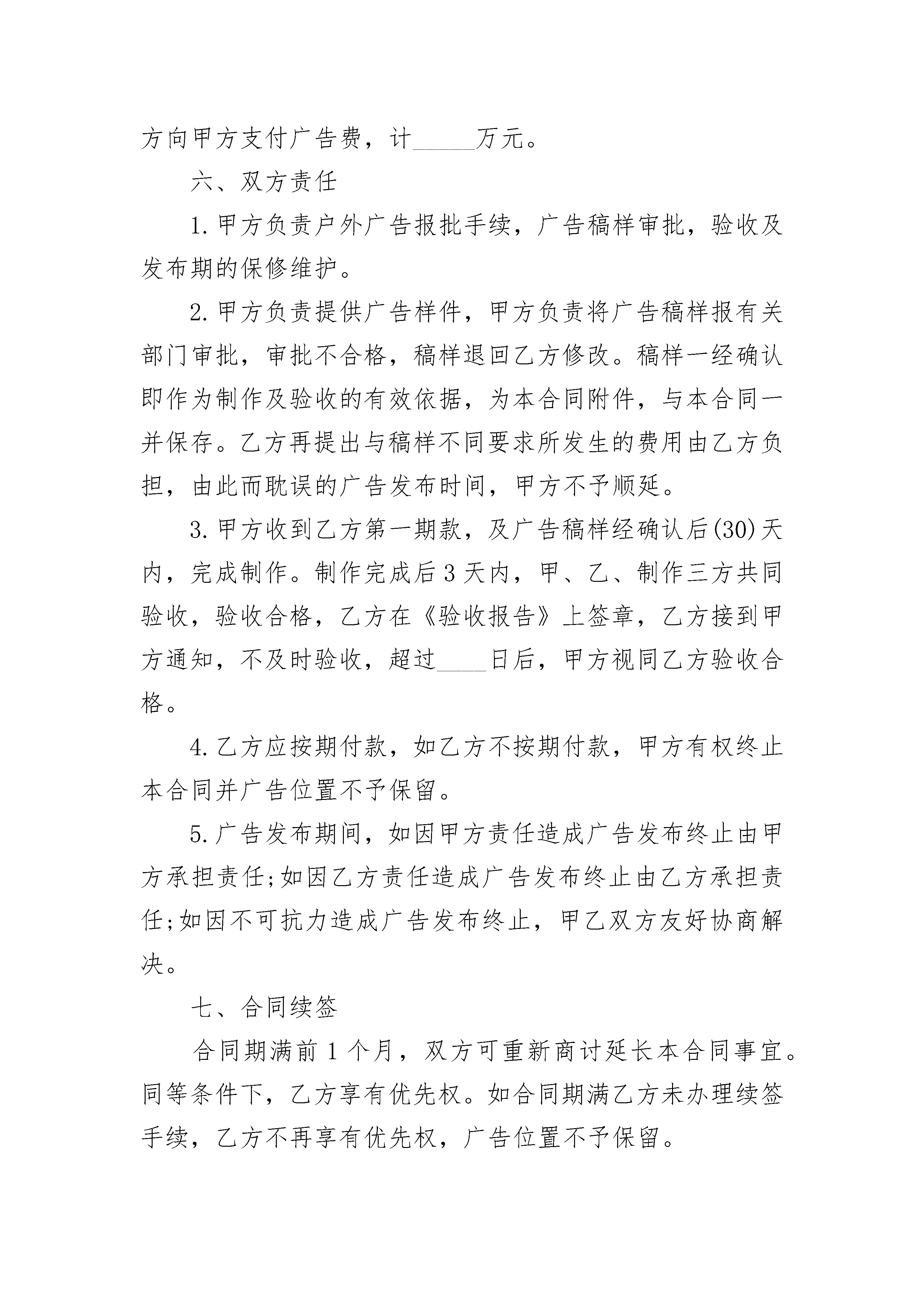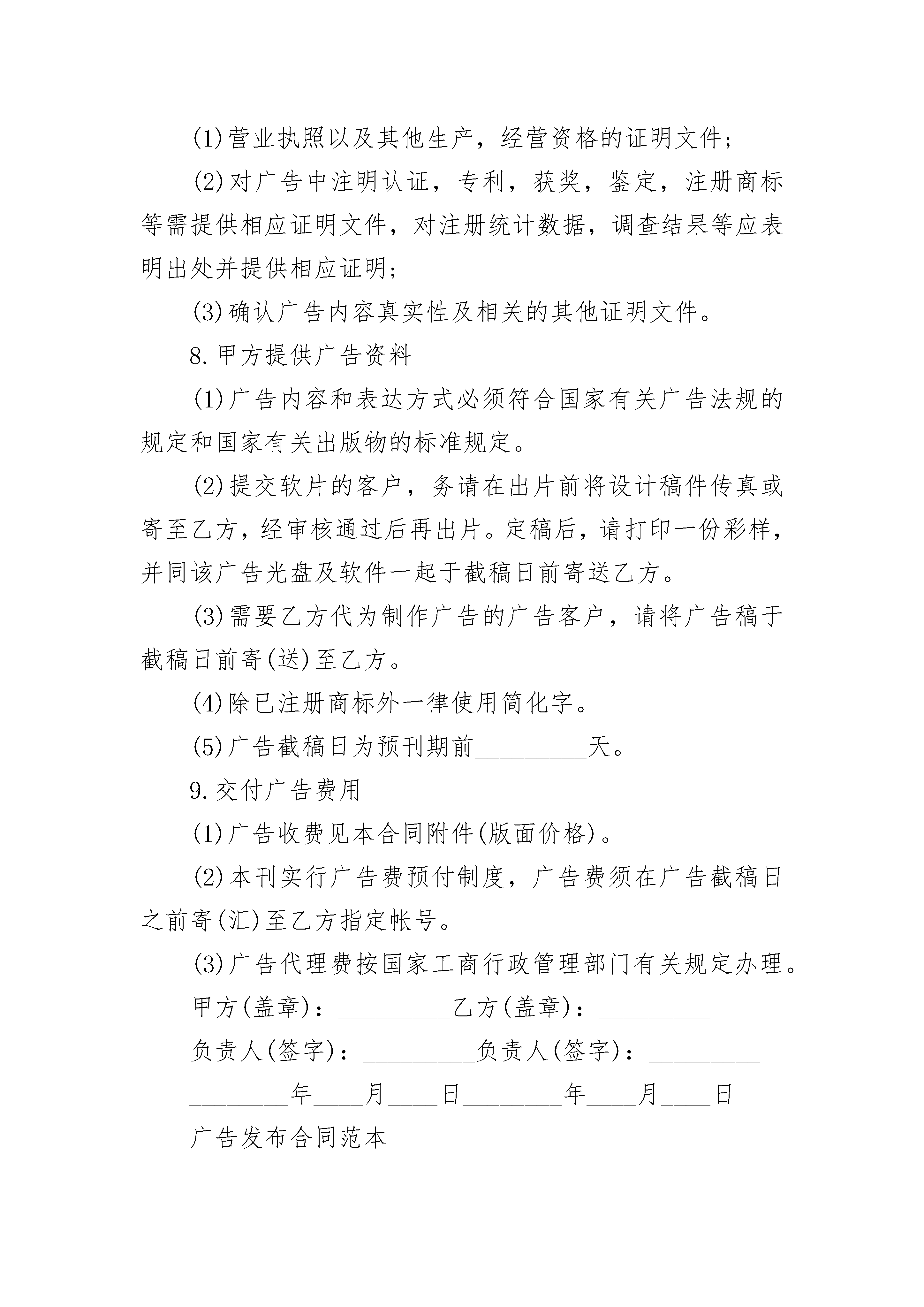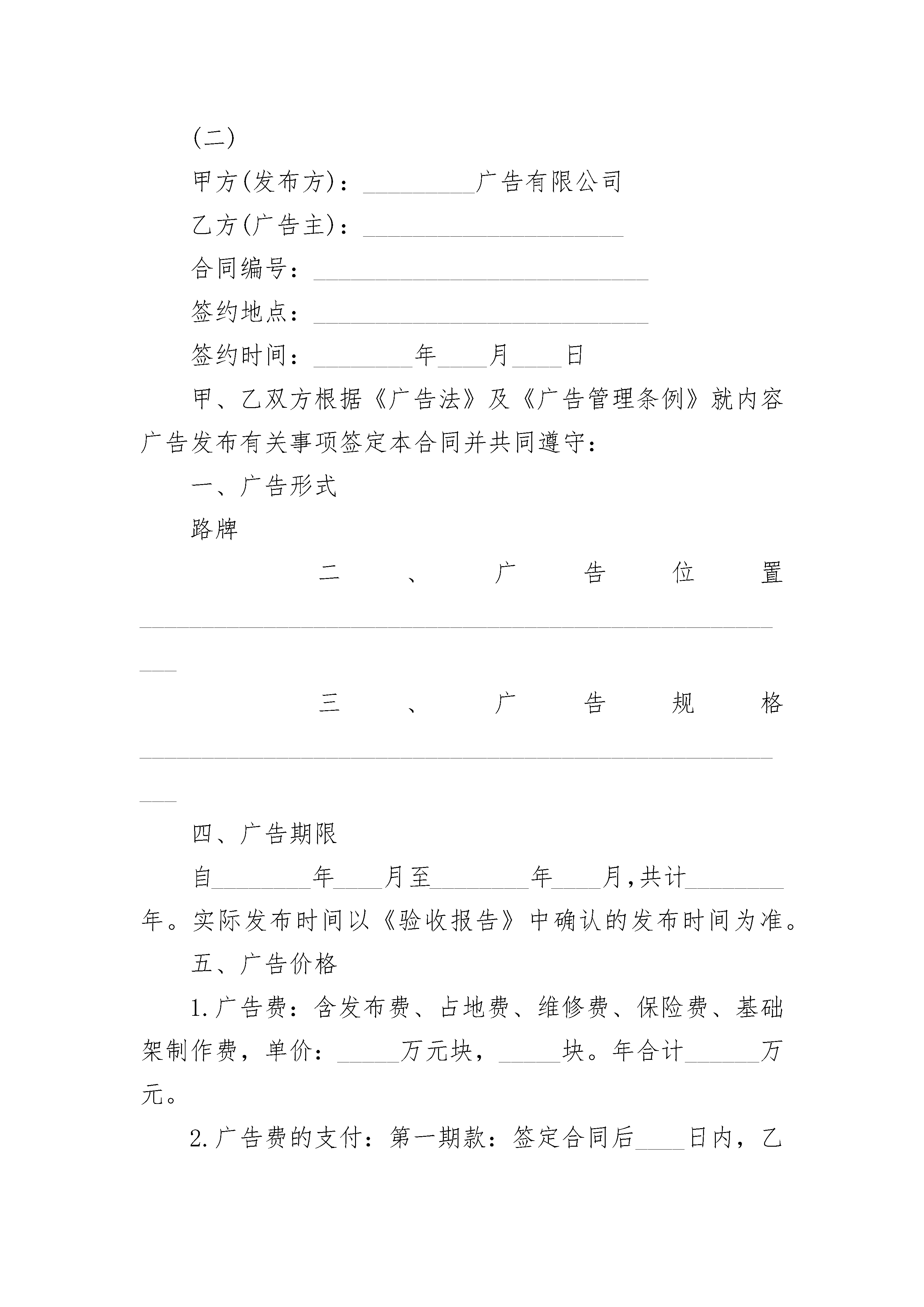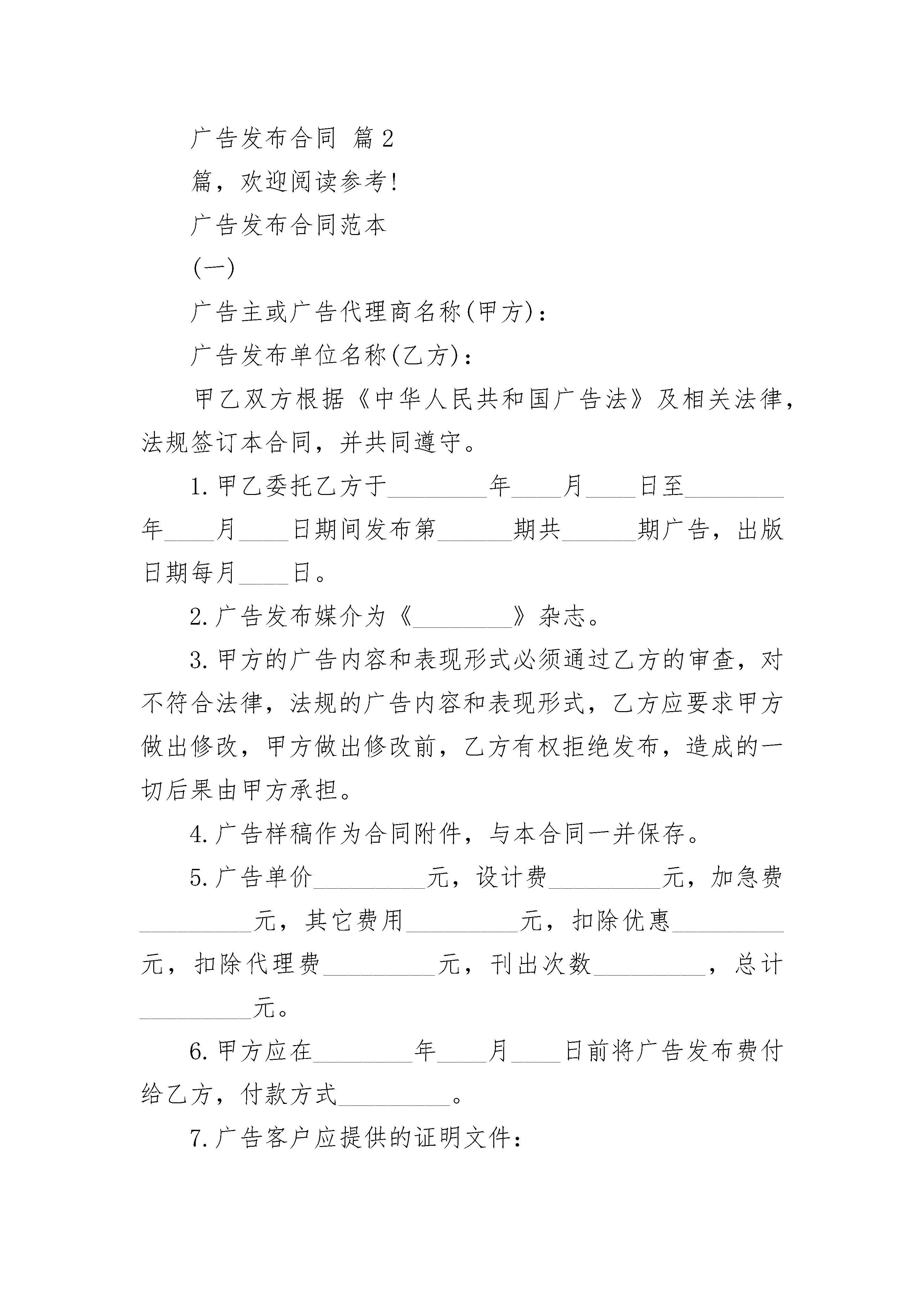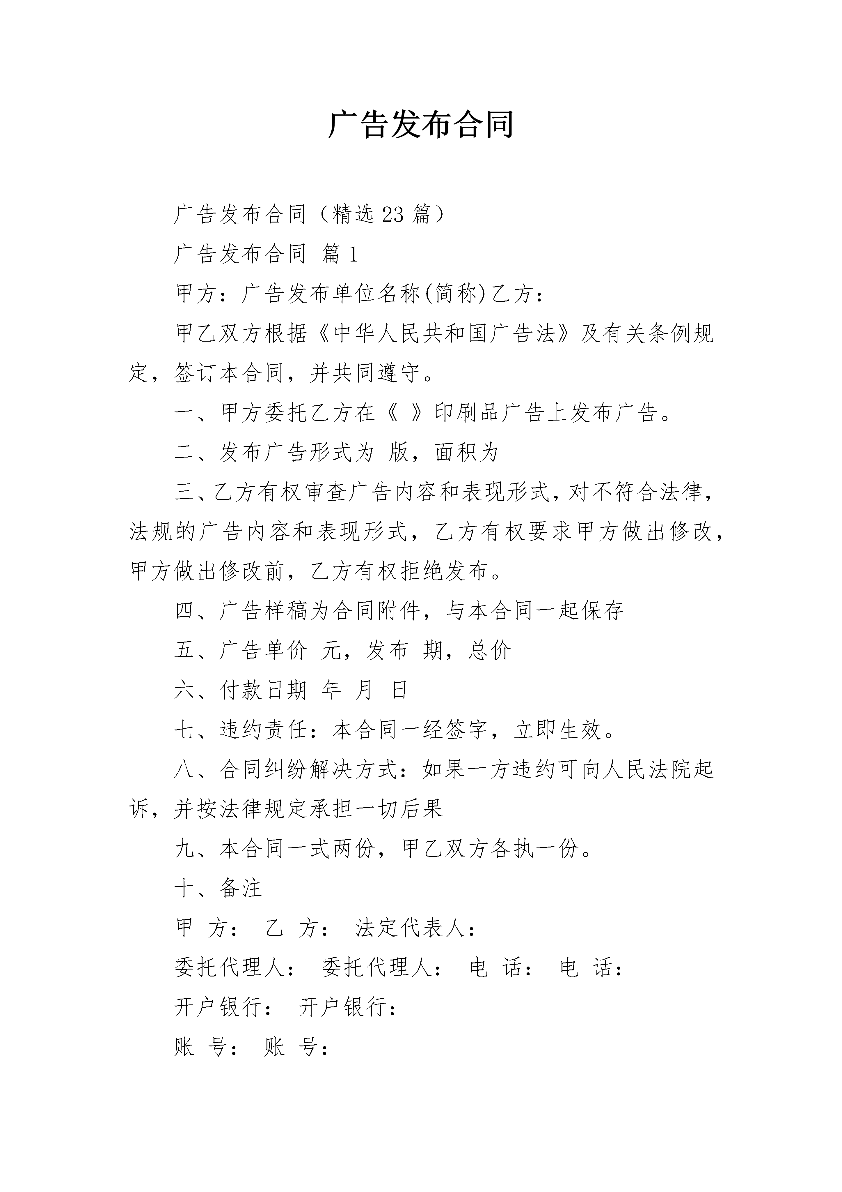 广告发布合同广告发布合同(精选23篇)广告发布合同篇1甲方:广告发布单位名称(简称)乙方:甲乙双方根据《中华人民共和国广告法》及有关条例规定,签订本合同,并共同遵守。一、甲方委托乙方在《》印刷品广告上发布广告。二、发布广告形式为版,面积为三、乙方有权审查广告内容和表现形式,对不符合法律,法规的广告内容和表现形式,乙方有权要求甲方做出修改,甲方做出修改前,乙方有权拒绝发布。四、广告样稿为合同附件,与本合同一起保存五、广告单价元,发布期,总价六、付款日期年月日七、违约责任:本合同一经签字,立即生效。八、合同纠纷解决方式:如果一方违约可向人民法院起诉,并按法律规定承担一切后果九、本合同一式两份,甲乙双方各执一份。十、备注甲方:乙方:法定代表人:委托代理人:委托代理人:电话:电话:开户银行:开户银行:账号:账号:广告发布合同篇2篇,欢迎阅读参考!广告发布合同范本(一)广告主或广告代理商名称(甲方):广告发布单位名称(乙方):甲乙双方根据《中华人民共和国广告法》及相关法律,法规签订本合同,并共同遵守。1.甲乙委托乙方于________年____月____日至________年____月____日期间发布第______期共______期广告,出版日期每月____日。2.广告发布媒介为《________》杂志。3.甲方的广告内容和表现形式必须通过乙方的审查,对不符合法律,法规的广告内容和表现形式,乙方应要求甲方做出修改,甲方做出修改前,乙方有权拒绝发布,造成的一切后果由甲方承担。4.广告样稿作为合同附件,与本合同一并保存。5.广告单价_________元,设计费_________元,加急费_________元,其它费用_________元,扣除优惠_________元,扣除代理费_________元,刊出次数_________,总计_________元。6.甲方应在________年____月____日前将广告发布费付给乙方,付款方式_________。7.广告客户应提供的证明文件:(1)营业执照以及其他生产,经营资格的证明文件;(2)对广告中注明认证,专利,获奖,鉴定,注册商标等需提供相应证明文件,对注册统计数据,调查结果等应表明出处并提供相应证明;(3)确认广告内容真实性及相关的其他证明文件。8.甲方提供广告资料(1)广告内容和表达方式必须符合国家有关广告法规的规定和国家有关出版物的标准规定。(2)提交软片的客户,务请在出片前将设计稿件传真或寄至乙方,经审核通过后再出片。定稿后,请打印一份彩样,并同该广告光盘及软件一起于截稿日前寄送乙方。(3)需要乙方代为制作广告的广告客户,请将广告稿于截稿日前寄(送)至乙方。(4)除已注册商标外一律使用简化字。(5)广告截稿日为预刊期前_________天。9.交付广告费用(1)广告收费见本合同附件(版面价格)。(2)本刊实行广告费预付制度,广告费须在广告截稿日之前寄(汇)至乙方指定帐号。(3)广告代理费按国家工商行政管理部门有关规定办理。甲方(盖章):_________乙方(盖章):_________负责人(签字):_________负责人(签字):_________________年____月____日________年____月____日广告发布合同范本(二)甲方(发布方):_________广告有限公司乙方(广告主):_____________________合同编号:___________________________签约地点:___________________________签约时间:________年____月____日甲、乙双方根据《广告法》及《广告管理条例》就内容广告发布有关事项签定本合同并共同遵守:一、广告形式路牌二、广告位置______________________________________________________三、广告规格______________________________________________________四、广告期限自________年____月至________年____月,共计________年。实际发布时间以《验收报告》中确认的发布时间为准。五、广告价格1.广告费:含发布费、占地费、维修费、保险费、基础架制作费,单价:_____万元块,_____块。年合计______万元。2.广告费的支付:第一期款:签定合同后____日内,乙方向甲方支付广告费,计_____万元。六、双方责任1.甲方负责户外广告报批手续,广告稿样审批,验收及发布期的保修维护。2.甲方负责提供广告样件,甲方负责将广告稿样报有关部门审批,审批不合格,稿样退回乙方修改。稿样一经确认即作为制作及验收的有效依据,为本合同附件,与本合同一并保存。乙方再提出与稿样不同