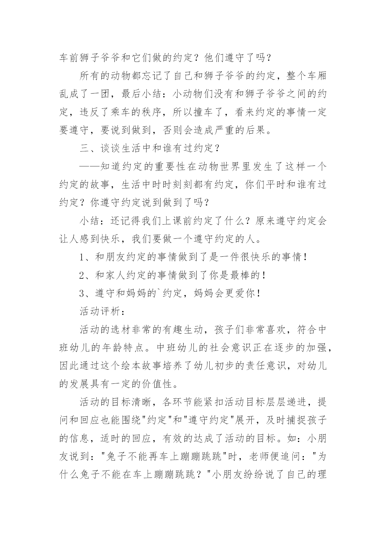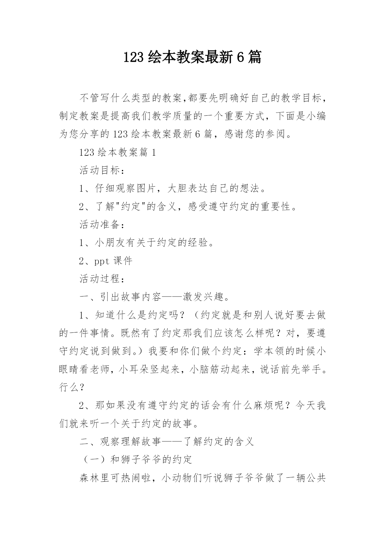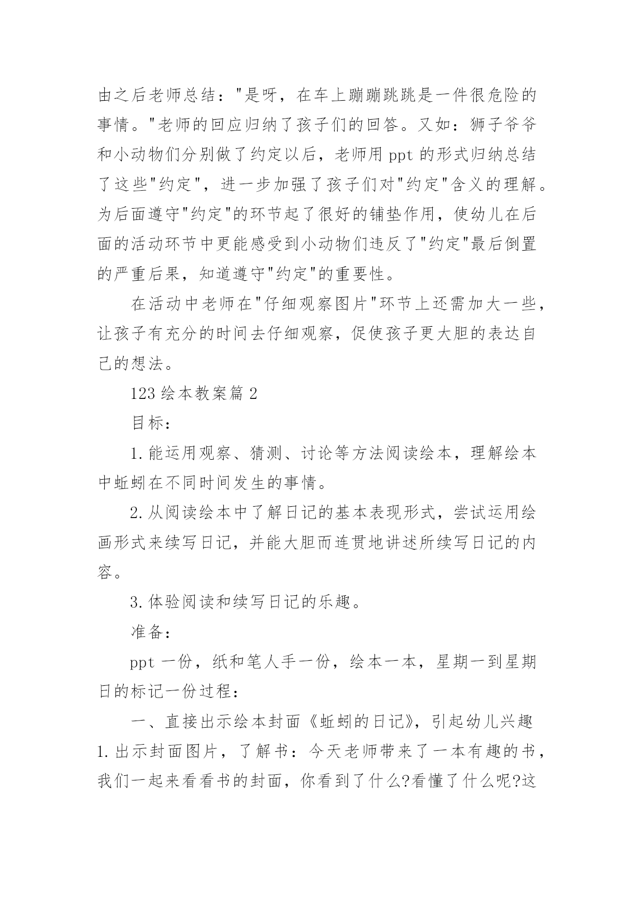 123绘本教案最新6篇 不管写什么类型的教案,都要先明确好自己的教学目标,制定教案是提高我们教学质量的一个重要方式,下面是小编为您分享的123绘本教案最新6篇,感谢您的参阅。123绘本教案篇1活动目标:1、仔细观察图片,大胆表达自己的想法。2、了解"约定"的含义,感受遵守约定的重要性。活动准备:1、小朋友有关于约定的经验。2、ppt课件活动过程:一、引出故事内容——激发兴趣。1、知道什么是约定吗?(约定就是和别人说好要去做的一件事情。既然有了约定那我们应该怎么样呢?对,要遵守约定说到做到。)我要和你们做个约定:学本领的时候小眼睛看老师,小耳朵竖起来,小脑筋动起来,说话前先举手。行么?2、那如果没有遵守约定的话会有什么麻烦呢?今天我们就来听一个关于约定的故事。二、观察理解故事——了解约定的含义(一)和狮子爷爷的约定森林里可热闹啦,小动物们听说狮子爷爷做了一辆公共汽车,都好奇极了。老远老远就听见了车轮咕噜咕噜的声音。(播放ppt+音乐)1、狮子爷爷开着自己做的公共汽车遇到了谁?它们之间说了什么?(我要和你做个约定,你上车后不能在车上蹦蹦跳跳。)为什么狮子爷爷要和小兔做这样的约定呢?小结:狮子爷爷知道兔子喜欢蹦蹦跳跳,在车上蹦蹦跳跳的话会有危险,所以狮子爷爷和兔子之间做了这样的约定。2、狮子爷爷接着又遇到了谁?小刺猬也想搭车,狮子爷爷同意了吗?它们之间会有什么约定?(我要和你做个约定,你上车后不能刺伤乘客们。)小结:小刺猬答应了和狮子爷爷的约定高高兴兴的上车了。长颈鹿和小松鼠们也想来搭车,你们觉得他们能搭车吗?为什么?(和你边上的好朋友讨论讨论)指导语:狮子爷爷和你们一样也有这样的担心,但是善良的狮子爷爷最后还是同意它们搭车了,狮子爷爷说:我要和你做个约定,它们之间会约定了什么?3、总结:狮子爷爷和小动物们做了约定,和小兔子约定不能在车上蹦蹦跳跳,和小刺猬约定不能刺伤其他小的动物,和长颈鹿约定不能把头伸出窗外,和小松鼠们约定要排好队上车,小动物们都答应了狮子爷爷要遵守这些约定说到做到,可是它们能做到吗?我们接着往下看。(二)约定后发生的事1、仔细看看发生了什么事?你看他们做到了吗?(长颈鹿把头伸出了窗外,那其它小动物呢?你们还记不记得上车前狮子爷爷和它们做的约定?他们遵守了吗?所有的动物都忘记了自己和狮子爷爷的约定,整个车厢乱成了一团,最后小结:小动物们没有和狮子爷爷之间的约定,违反了乘车的秩序,所以撞车了,看来约定的事情一定要遵守,要说到做到,否则会造成严重的后果。三、谈谈生活中和谁有过约定?——知道约定的重要性在动物世界里发生了这样一个约定的故事,生活中时时刻刻都有约定,你们平时和谁有过约定?你遵守约定说到做到了吗?小结:还记得我们上课前约定了什么?原来遵守约定会让人感到快乐,我们要做一个遵守约定的人。1、和朋友约定的事情做到了是一件很快乐的事情!2、和家人约定的事情做到了你是最棒的!3、遵守和妈妈的`约定,妈妈会更爱你!活动评析:活动的选材非常的有趣生动,孩子们非常喜欢,符合中班幼儿的年龄特点。中班幼儿的社会意识正在逐步的加强,因此通过这个绘本故事培养了幼儿初步的责任意识,对幼儿的发展具有一定的价值性。活动的目标清晰,各环节能紧扣活动目标层层递进,提问和回应也能围绕"约定"和"遵守约定"展开,及时捕捉孩子的信息,适时的回应,有效的达成了活动的目标。如:小朋友说到:"兔子不能再车上蹦蹦跳跳"时,老师便追问:"为什么兔子不能在车上蹦蹦跳跳?"小朋友纷纷说了自己的理由之后老师总结:"是呀,在车上蹦蹦跳跳是一件很危险的事情。"老师的回应归纳了孩子们的回答。又如:狮子爷爷和小动物们分别做了约定以后,老师用ppt的形式归纳总结了这些"约定",进一步加强了孩子们对"约定"含义的理解。为后面遵守"约定"的环节起了很好的铺垫作用,使幼儿在后面的活动环节中更能感受到小动物们违反了"约定"最后倒置的严重后果,知道遵守"约定"的重要性。在活动中老师在"仔细观察图片"环节上还需加大一些,让孩子有充分的时间去仔细观察,促使孩子更大胆的表达自己的想法。123绘本教案篇2目标:1.能运用观察、猜测、讨论等方法阅读绘本,理解绘本中蚯蚓在不同时间发生的事情。2.从阅读绘本中了解日记的基本表现形式,尝试运用绘画形式来续写日记,并能大胆而连贯地讲述所续写日记的内容。3.体验阅读和续写日记的乐趣。准备:ppt一份,纸和笔人手一份,绘本一本,星期一到星期日的标记一份过程:一、直接出示绘本封面《蚯蚓的日记》,引起幼儿兴趣1.出示封面图片,了解书:今天老师带来了一本有趣的书,我们一起来看看书的封面,你看到了什么?看懂了什么呢?这个蚯蚓有什么特点?(幼儿回答)(根据幼儿回答引入)“蚯蚓的日记”是这本书的什么?有几个字?前面的三个字你不认识没关系,但“日记”这两个字你一定要认