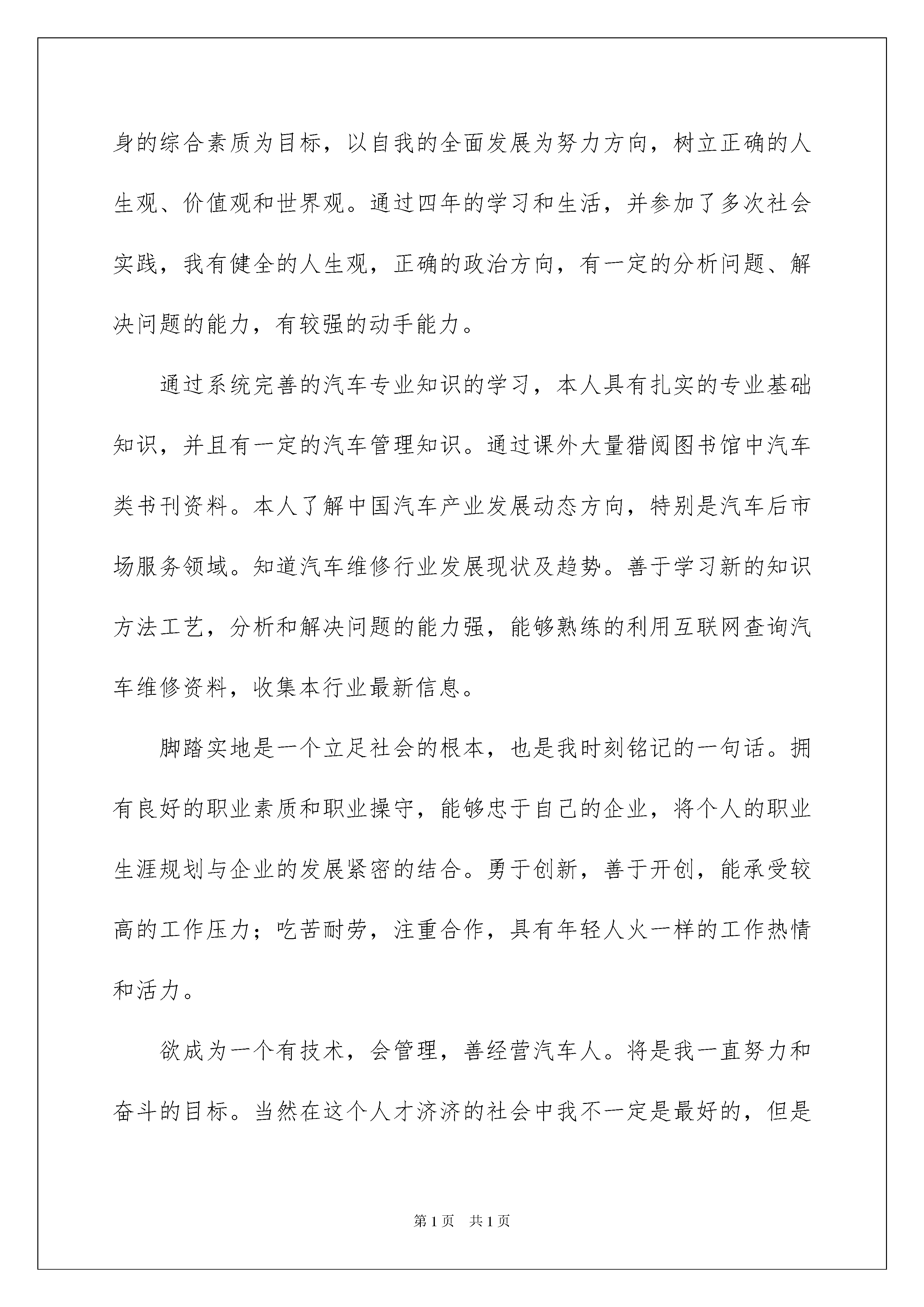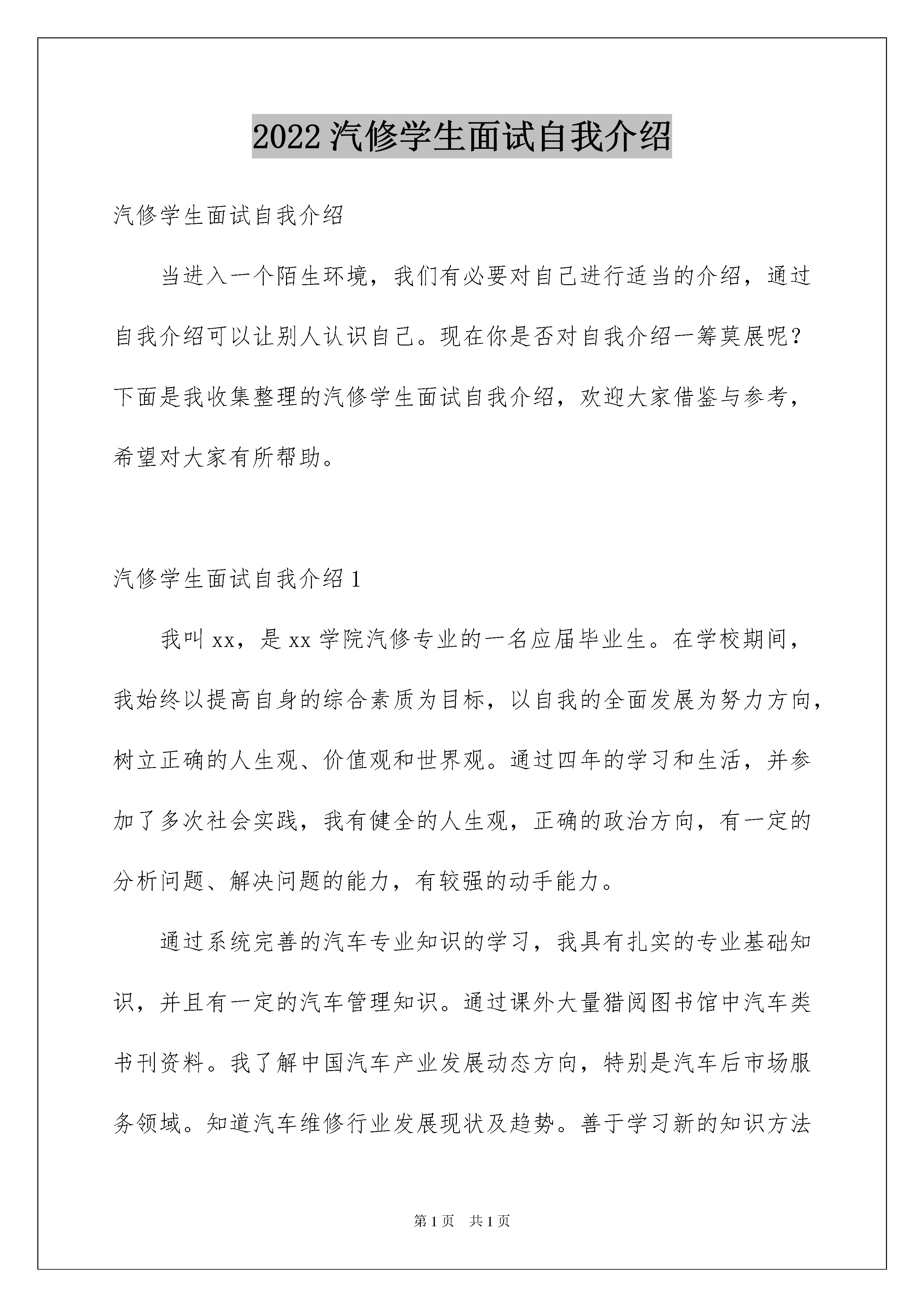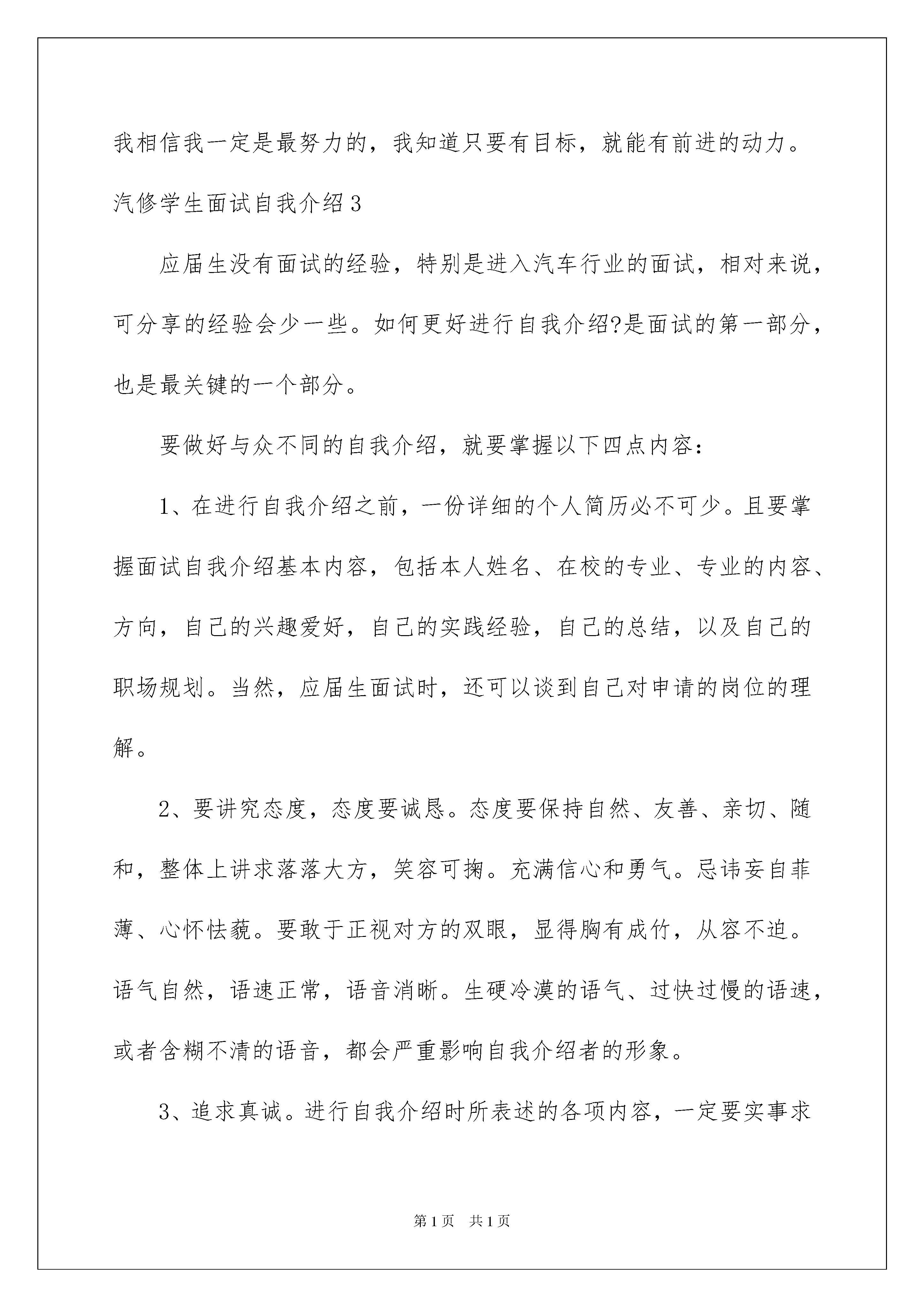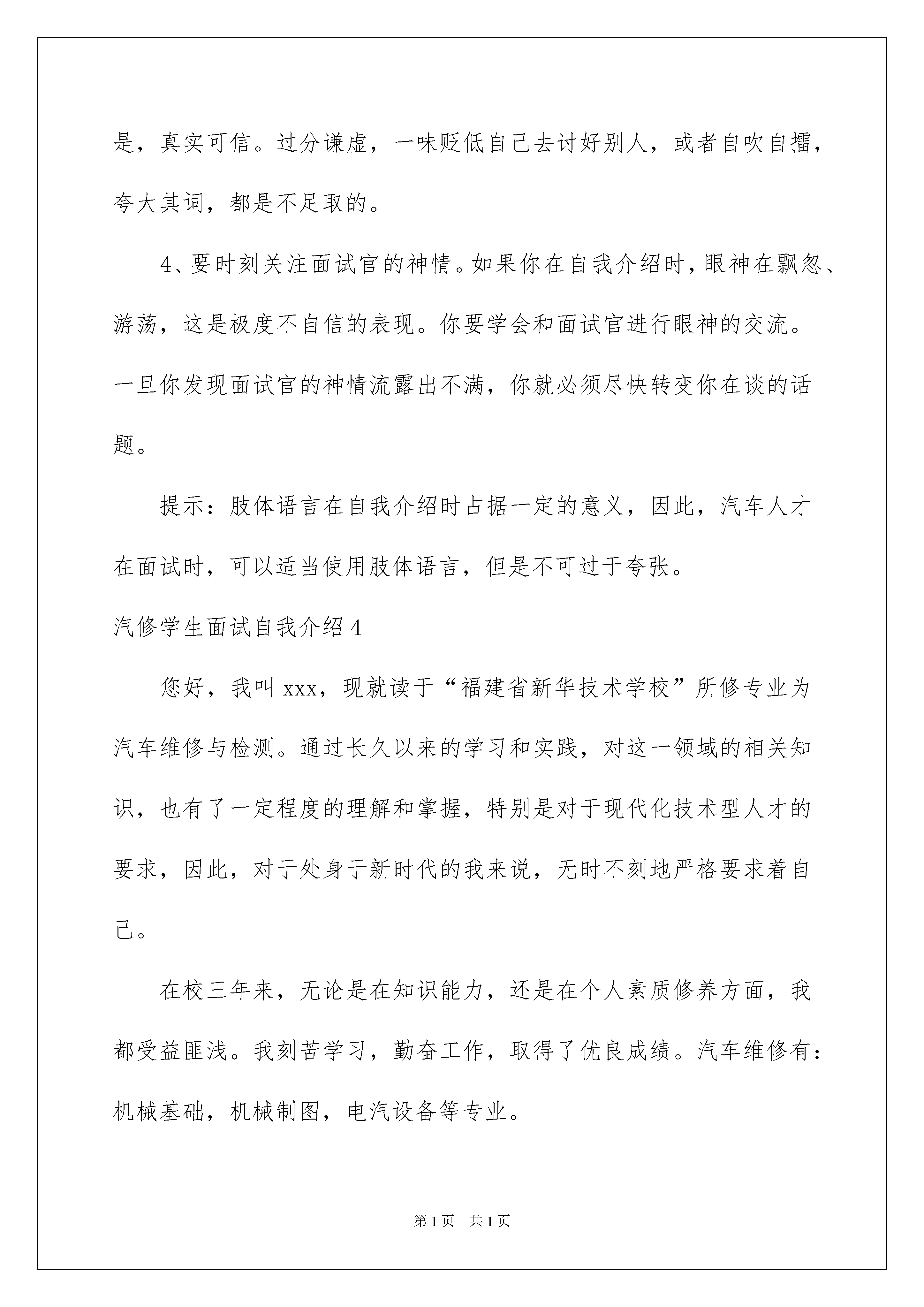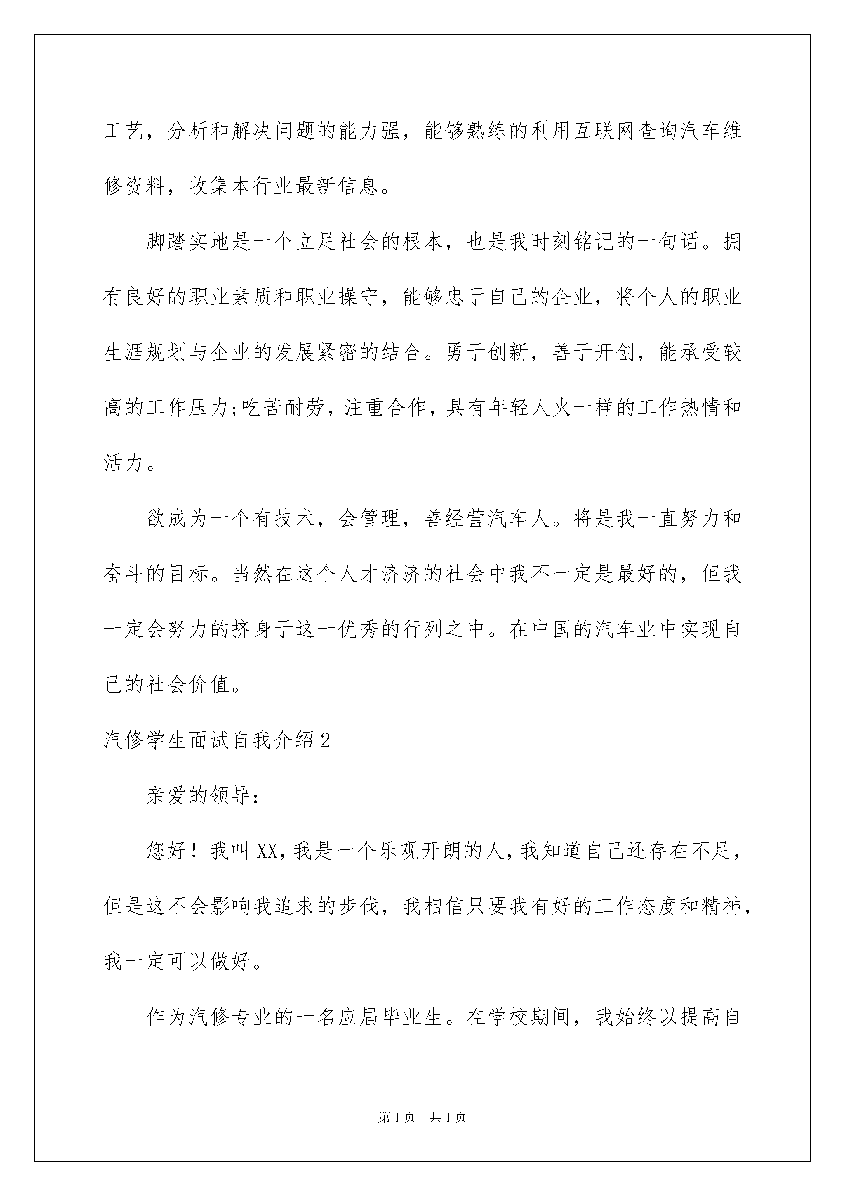 2022汽修学生面试自我介绍汽修学生面试自我介绍当进入一个陌生环境,我们有必要对自己进行适当的介绍,通过自我介绍可以让别人认识自己。现在你是否对自我介绍一筹莫展呢?下面是我收集整理的汽修学生面试自我介绍,欢迎大家借鉴与参考,希望对大家有所帮助。汽修学生面试自我介绍1我叫xx,是xx学院汽修专业的一名应届毕业生。在学校期间,我始终以提高自身的综合素质为目标,以自我的全面发展为努力方向,树立正确的人生观、价值观和世界观。通过四年的学习和生活,并参加了多次社会实践,我有健全的人生观,正确的政治方向,有一定的分析问题、解决问题的能力,有较强的动手能力。通过系统完善的汽车专业知识的学习,我具有扎实的专业基础知识,并且有一定的汽车管理知识。通过课外大量猎阅图书馆中汽车类书刊资料。我了解中国汽车产业发展动态方向,特别是汽车后市场服务领域。知道汽车维修行业发展现状及趋势。善于学习新的知识方法工艺,分析和解决问题的能力强,能够熟练的利用互联网查询汽车维修资料,收集本行业最新信息。脚踏实地是一个立足社会的根本,也是我时刻铭记的一句话。拥有良好的职业素质和职业操守,能够忠于自己的企业,将个人的职业生涯规划与企业的发展紧密的结合。勇于创新,善于开创,能承受较高的工作压力;吃苦耐劳,注重合作,具有年轻人火一样的工作热情和活力。欲成为一个有技术,会管理,善经营汽车人。将是我一直努力和奋斗的目标。当然在这个人才济济的社会中我不一定是最好的,但我一定会努力的挤身于这一优秀的行列之中。在中国的汽车业中实现自己的社会价值。汽修学生面试自我介绍2亲爱的领导:您好!我叫XX,我是一个乐观开朗的人,我知道自己还存在不足,但是这不会影响我追求的步伐,我相信只要我有好的工作态度和精神,我一定可以做好。作为汽修专业的一名应届毕业生。在学校期间,我始终以提高自身的综合素质为目标,以自我的全面发展为努力方向,树立正确的人生观、价值观和世界观。通过四年的学习和生活,并参加了多次社会实践,我有健全的人生观,正确的政治方向,有一定的分析问题、解决问题的能力,有较强的动手能力。通过系统完善的汽车专业知识的学习,本人具有扎实的专业基础知识,并且有一定的汽车管理知识。通过课外大量猎阅图书馆中汽车类书刊资料。本人了解中国汽车产业发展动态方向,特别是汽车后市场服务领域。知道汽车维修行业发展现状及趋势。善于学习新的知识方法工艺,分析和解决问题的能力强,能够熟练的利用互联网查询汽车维修资料,收集本行业最新信息。脚踏实地是一个立足社会的根本,也是我时刻铭记的一句话。拥有良好的职业素质和职业操守,能够忠于自己的企业,将个人的职业生涯规划与企业的发展紧密的结合。勇于创新,善于开创,能承受较高的工作压力;吃苦耐劳,注重合作,具有年轻人火一样的工作热情和活力。欲成为一个有技术,会管理,善经营汽车人。将是我一直努力和奋斗的目标。当然在这个人才济济的社会中我不一定是最好的,但是我相信我一定是最努力的,我知道只要有目标,就能有前进的动力。汽修学生面试自我介绍3应届生没有面试的经验,特别是进入汽车行业的面试,相对来说,可分享的经验会少一些。如何更好进行自我介绍?是面试的第一部分,也是最关键的一个部分。要做好与众不同的自我介绍,就要掌握以下四点内容:1、在进行自我介绍之前,一份详细的个人简历必不可少。且要掌握面试自我介绍基本内容,包括本人姓名、在校的专业、专业的内容、方向,自己的兴趣爱好,自己的实践经验,自己的总结,以及自己的职场规划。当然,应届生面试时,还可以谈到自己对申请的岗位的理解。2、要讲究态度,态度要诚恳。态度要保持自然、友善、亲切、随和,整体上讲求落落大方,笑容可掬。充满信心和勇气。忌讳妄自菲薄、心怀怯藐。要敢于正视对方的双眼,显得胸有成竹,从容不迫。语气自然,语速正常,语音消晰。生硬冷漠的语气、过快过慢的语速,或者含糊不清的语音,都会严重影响自我介绍者的形象。3、追求真诚。进行自我介绍时所表述的各项内容,一定要实事求是,真实可信。过分谦虚,一味贬低自己去讨好别人,或者自吹自擂,夸大其词,都是不足取的。4、要时刻关注面试官的神情。如果你在自我介绍时,眼神在飘忽、游荡,这是极度不自信的表现。你要学会和面试官进行眼神的交流。一旦你发现面试官的神情流露出不满,你就必须尽快转变你在谈的话题。提示:肢体语言在自我介绍时占据一定的意义,因此,汽车人才在面试时,可以适当使用肢体语言,但是不可过于夸张。汽修学生面试自我介绍4您好,我叫xxx,现就读于“福建省新华技术学校”所修专业为汽车维修与检测。通过长久以来的学习和实践,对这一领域的相关知识,也有了一定程度的理解和