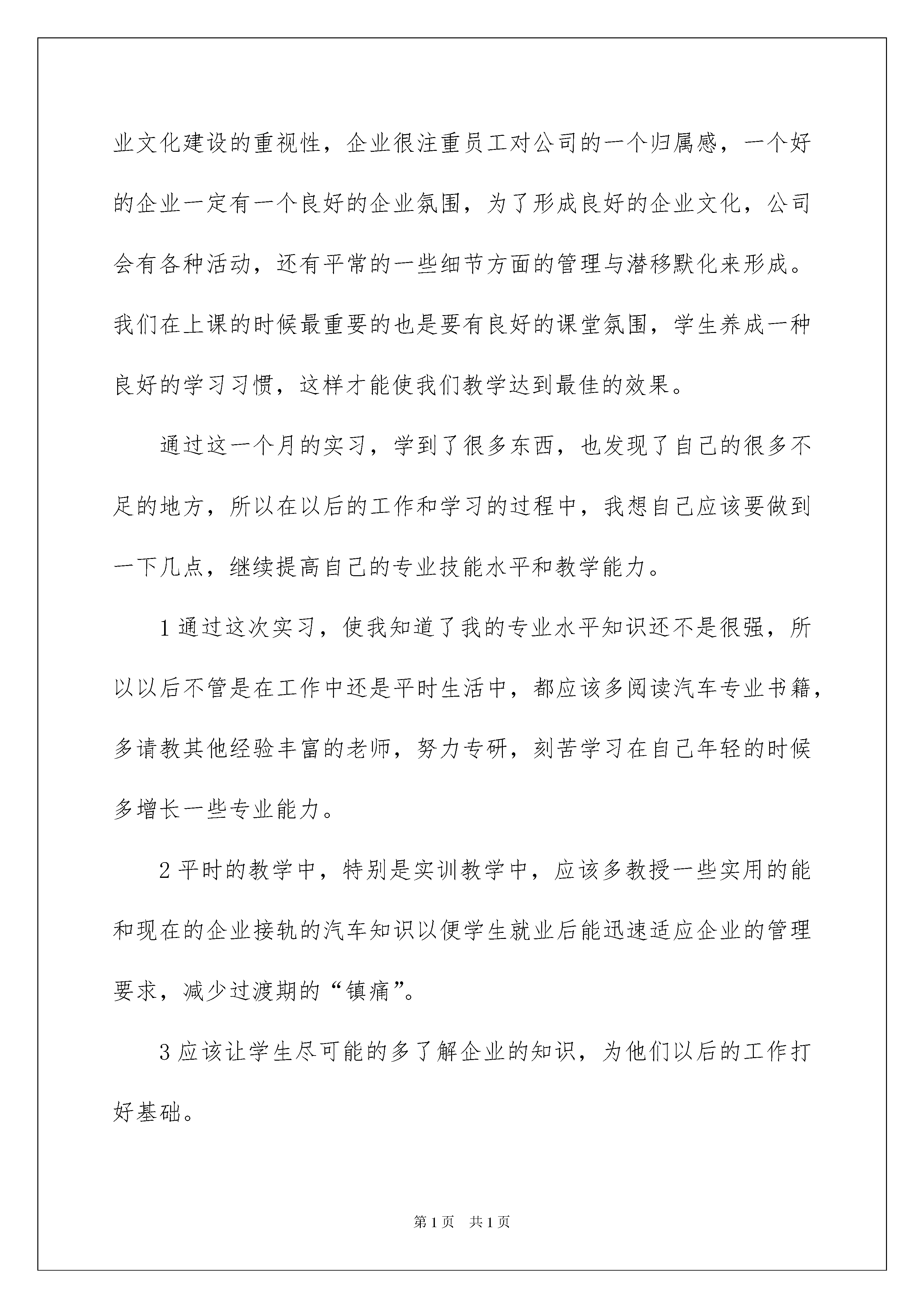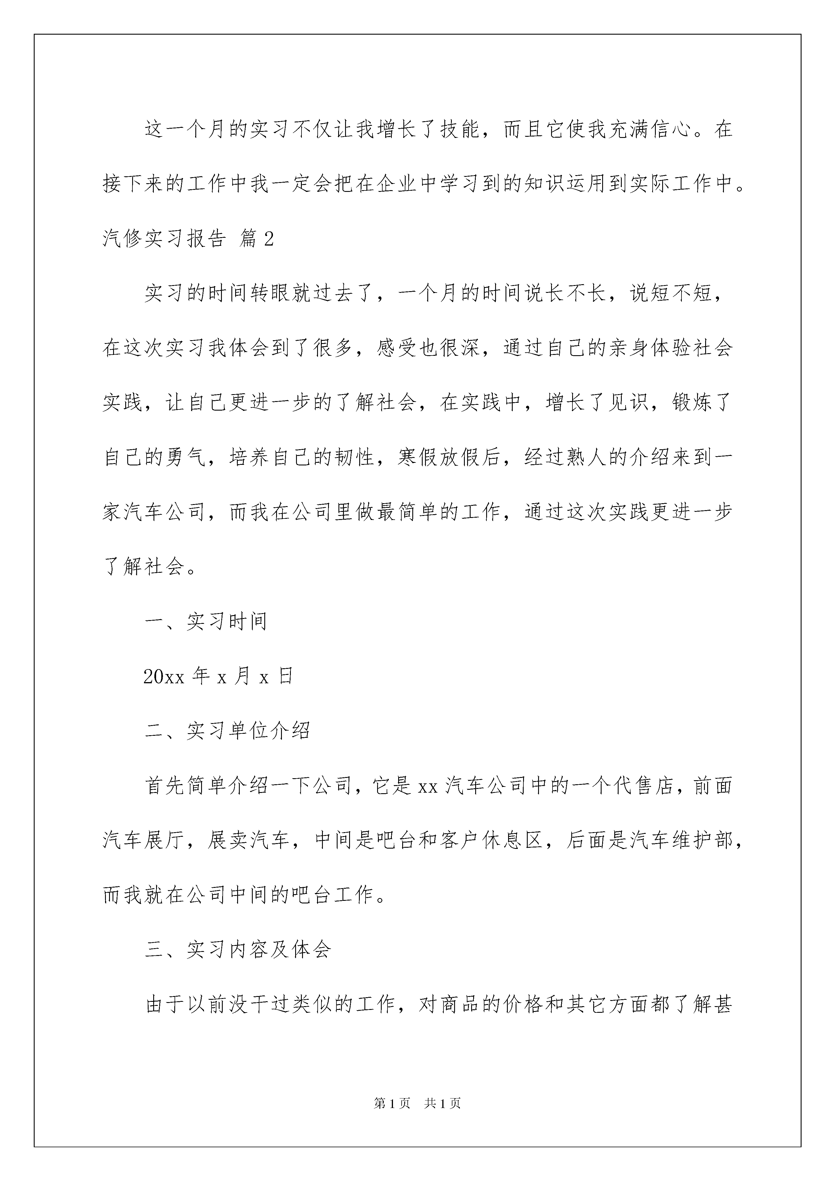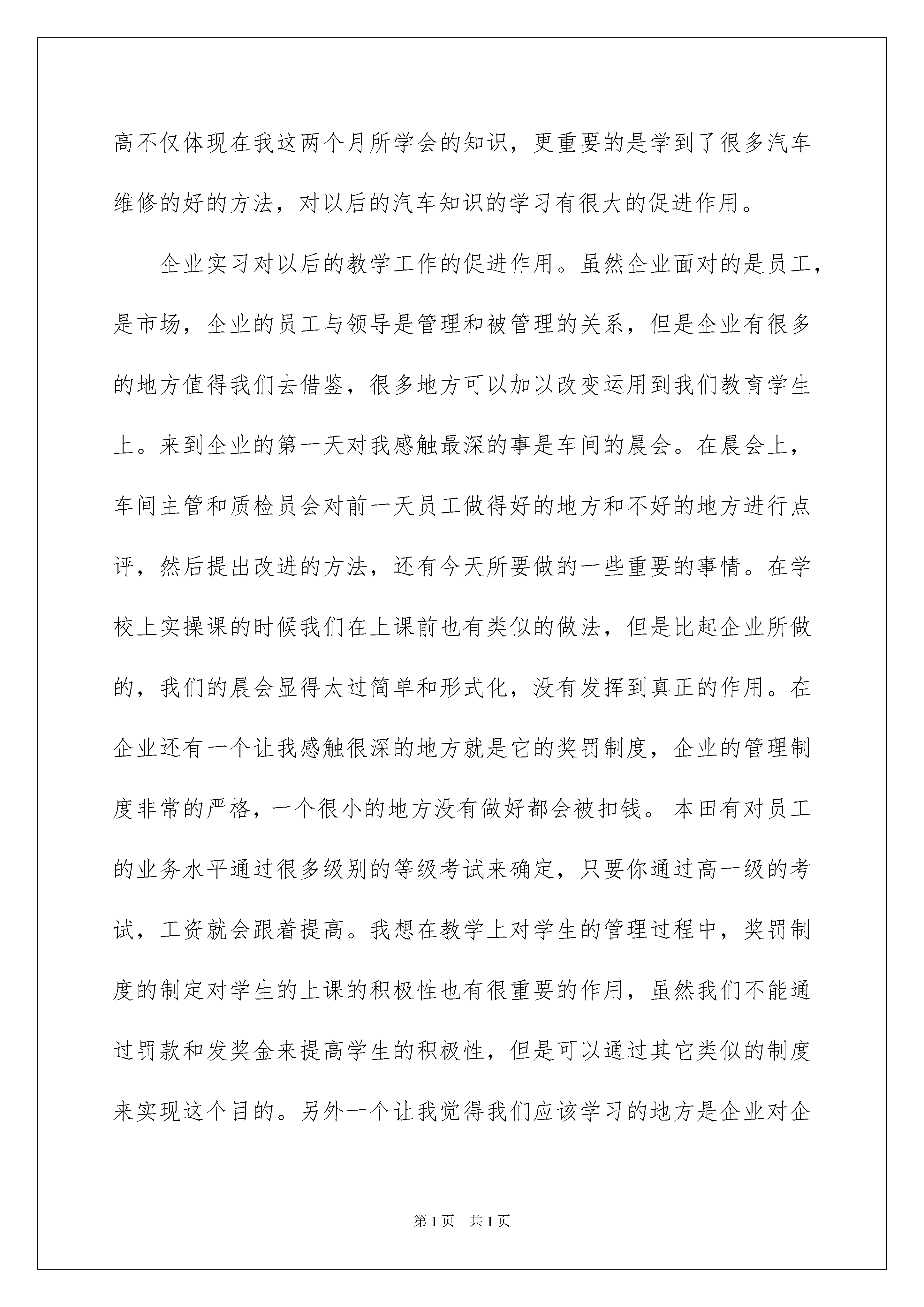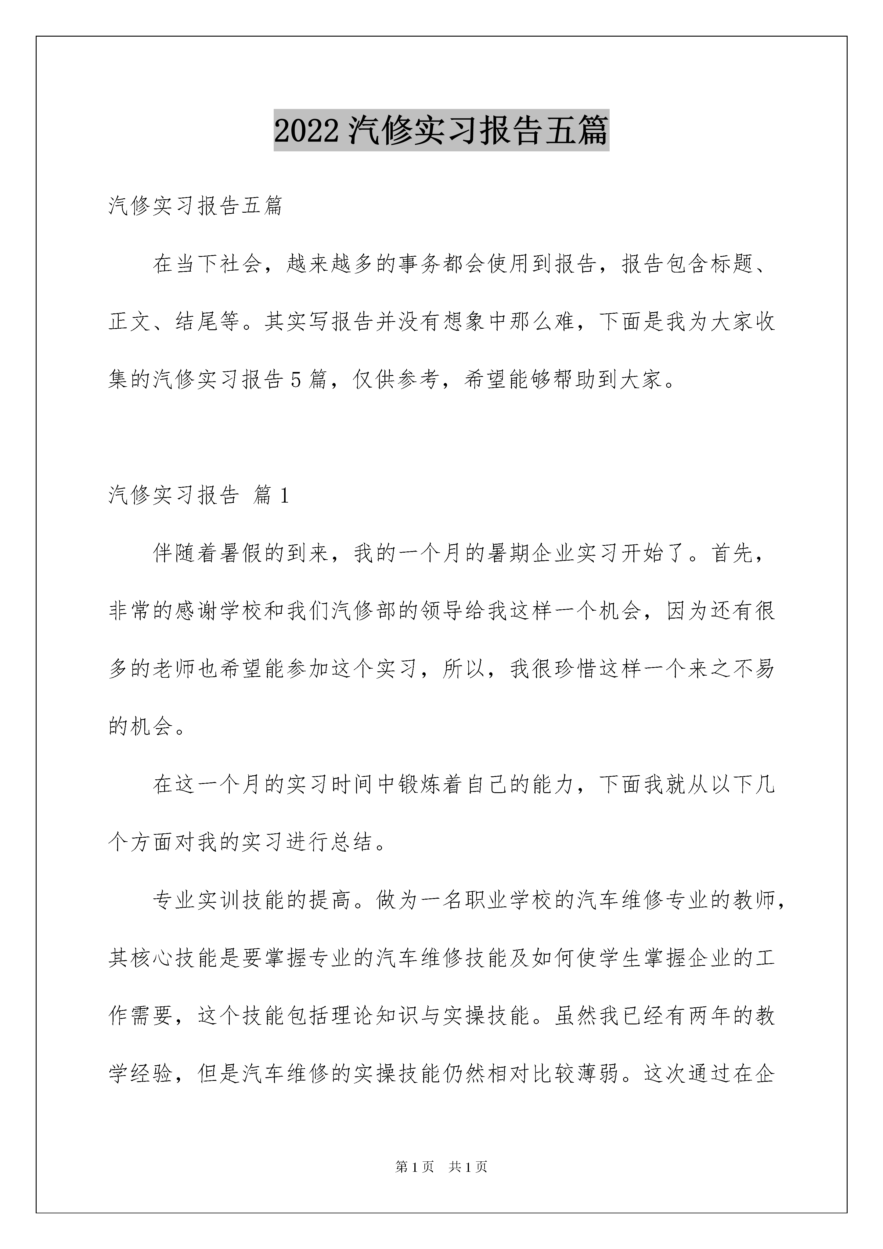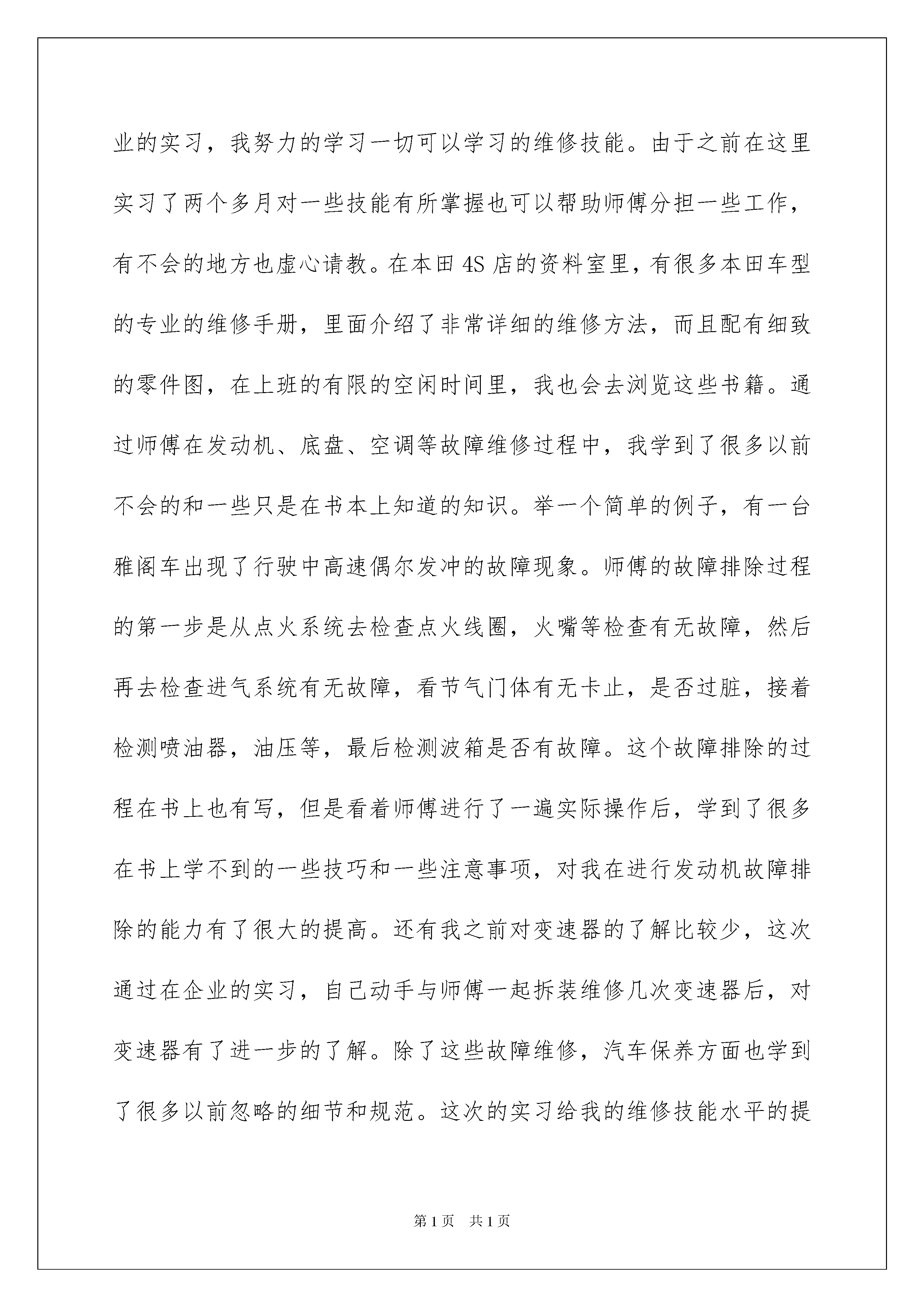 2022汽修实习报告五篇汽修实习报告五篇在当下社会,越来越多的事务都会使用到报告,报告包含标题、正文、结尾等。其实写报告并没有想象中那么难,下面是我为大家收集的汽修实习报告5篇,仅供参考,希望能够帮助到大家。汽修实习报告篇1伴随着暑假的到来,我的一个月的暑期企业实习开始了。首先,非常的感谢学校和我们汽修部的领导给我这样一个机会,因为还有很多的老师也希望能参加这个实习,所以,我很珍惜这样一个来之不易的机会。在这一个月的实习时间中锻炼着自己的能力,下面我就从以下几个方面对我的实习进行总结。专业实训技能的提高。做为一名职业学校的汽车维修专业的教师,其核心技能是要掌握专业的汽车维修技能及如何使学生掌握企业的工作需要,这个技能包括理论知识与实操技能。虽然我已经有两年的教学经验,但是汽车维修的实操技能仍然相对比较薄弱。这次通过在企业的实习,我努力的学习一切可以学习的维修技能。由于之前在这里实习了两个多月对一些技能有所掌握也可以帮助师傅分担一些工作,有不会的地方也虚心请教。在本田4S店的资料室里,有很多本田车型的专业的维修手册,里面介绍了非常详细的维修方法,而且配有细致的零件图,在上班的有限的空闲时间里,我也会去浏览这些书籍。通过师傅在发动机、底盘、空调等故障维修过程中,我学到了很多以前不会的和一些只是在书本上知道的知识。举一个简单的例子,有一台雅阁车出现了行驶中高速偶尔发冲的故障现象。师傅的故障排除过程的第一步是从点火系统去检查点火线圈,火嘴等检查有无故障,然后再去检查进气系统有无故障,看节气门体有无卡止,是否过脏,接着检测喷油器,油压等,最后检测波箱是否有故障。这个故障排除的过程在书上也有写,但是看着师傅进行了一遍实际操作后,学到了很多在书上学不到的一些技巧和一些注意事项,对我在进行发动机故障排除的能力有了很大的提高。还有我之前对变速器的了解比较少,这次通过在企业的实习,自己动手与师傅一起拆装维修几次变速器后,对变速器有了进一步的了解。除了这些故障维修,汽车保养方面也学到了很多以前忽略的细节和规范。这次的实习给我的维修技能水平的提高不仅体现在我这两个月所学会的知识,更重要的是学到了很多汽车维修的好的方法,对以后的汽车知识的学习有很大的促进作用。企业实习对以后的教学工作的促进作用。虽然企业面对的是员工,是市场,企业的员工与领导是管理和被管理的关系,但是企业有很多的地方值得我们去借鉴,很多地方可以加以改变运用到我们教育学生上。来到企业的第一天对我感触最深的事是车间的晨会。在晨会上,车间主管和质检员会对前一天员工做得好的地方和不好的地方进行点评,然后提出改进的方法,还有今天所要做的一些重要的事情。在学校上实操课的时候我们在上课前也有类似的做法,但是比起企业所做的,我们的晨会显得太过简单和形式化,没有发挥到真正的作用。在企业还有一个让我感触很深的地方就是它的奖罚制度,企业的管理制度非常的严格,一个很小的地方没有做好都会被扣钱。本田有对员工的业务水平通过很多级别的等级考试来确定,只要你通过高一级的考试,工资就会跟着提高。我想在教学上对学生的管理过程中,奖罚制度的制定对学生的上课的积极性也有很重要的作用,虽然我们不能通过罚款和发奖金来提高学生的积极性,但是可以通过其它类似的制度来实现这个目的。另外一个让我觉得我们应该学习的地方是企业对企业文化建设的重视性,企业很注重员工对公司的一个归属感,一个好的企业一定有一个良好的企业氛围,为了形成良好的企业文化,公司会有各种活动,还有平常的一些细节方面的管理与潜移默化来形成。我们在上课的时候最重要的也是要有良好的课堂氛围,学生养成一种良好的学习习惯,这样才能使我们教学达到最佳的效果。通过这一个月的实习,学到了很多东西,也发现了自己的很多不足的地方,所以在以后的工作和学习的过程中,我想自己应该要做到一下几点,继续提高自己的专业技能水平和教学能力。1通过这次实习,使我知道了我的专业水平知识还不是很强,所以以后不管是在工作中还是平时生活中,都应该多阅读汽车专业书籍,多请教其他经验丰富的老师,努力专研,刻苦学习在自己年轻的时候多增长一些专业能力。2平时的教学中,特别是实训教学中,应该多教授一些实用的能和现在的企业接轨的汽车知识以便学生就业后能迅速适应企业的管理要求,减少过渡期的“镇痛”。3应该让学生尽可能的多了解企业的知识,为他们以后的工作打好基础。这一个月的实习不仅让我增长了技能,而且它使我充满信心。在接下来的工作中我一定会把在企业中学习到的知识运用到实际工作中。汽修实习报告篇2实习的时间转眼就过去了,一个月的时间说长不长,说短不短,在这次实习我体会到了很多,感
