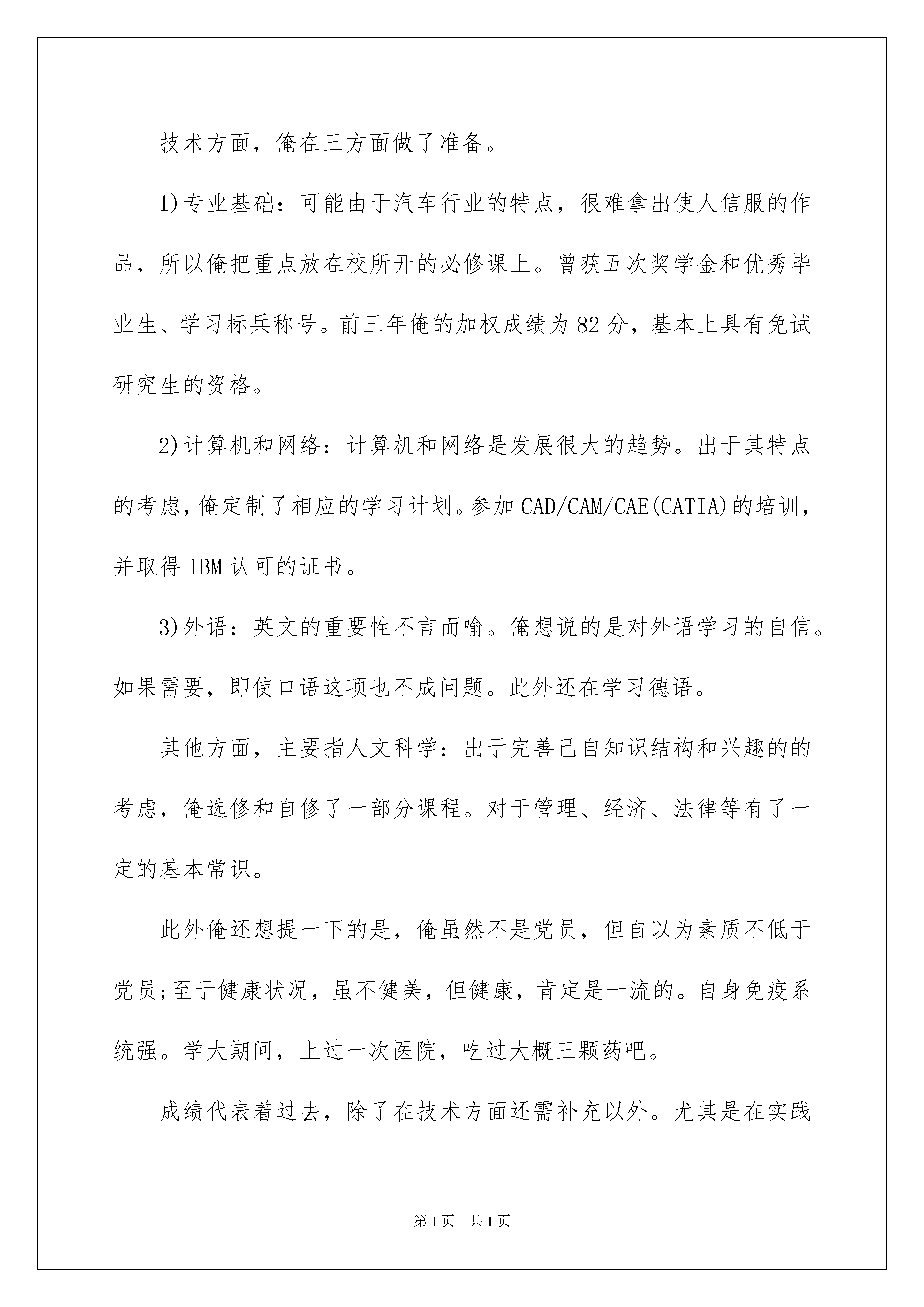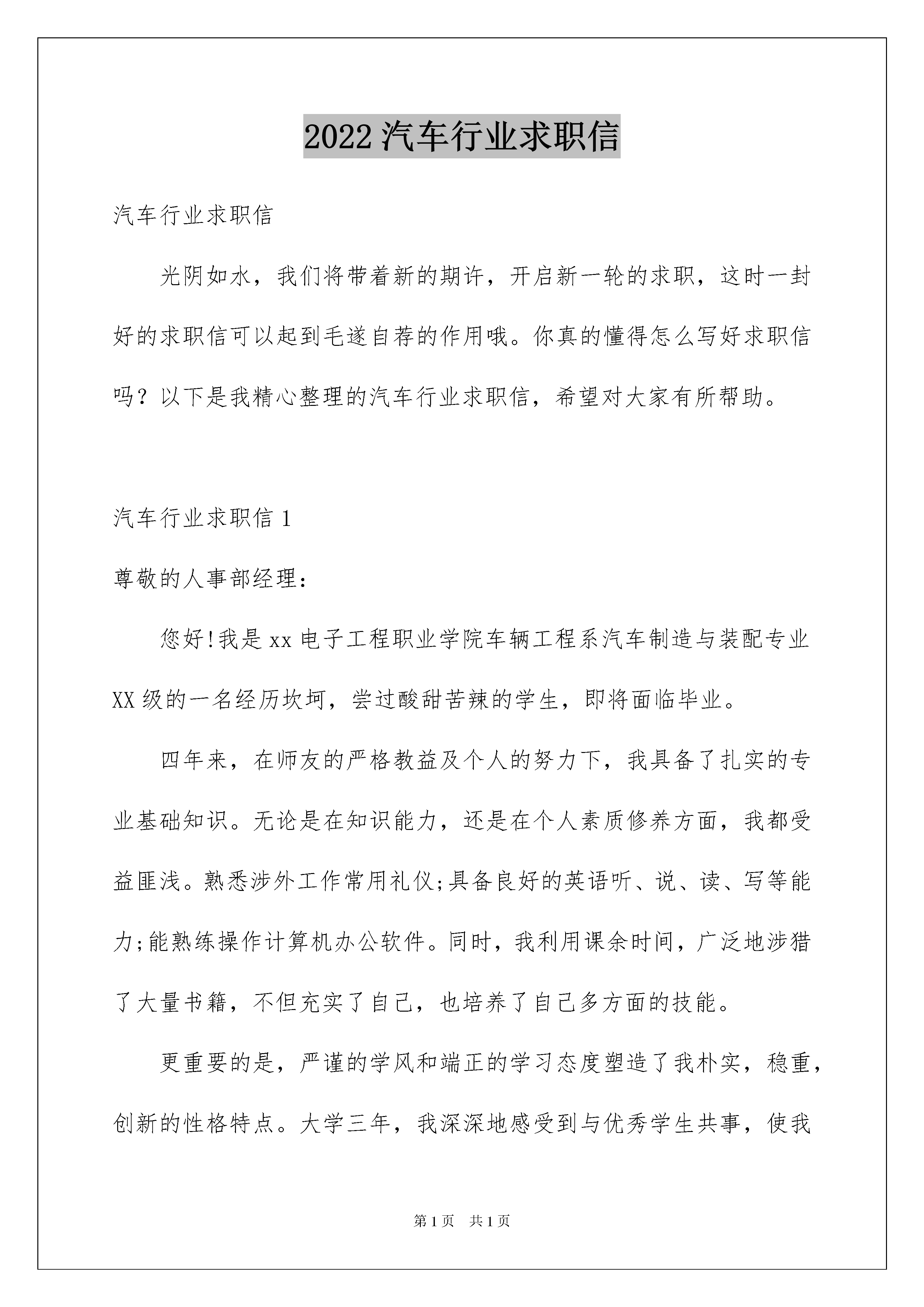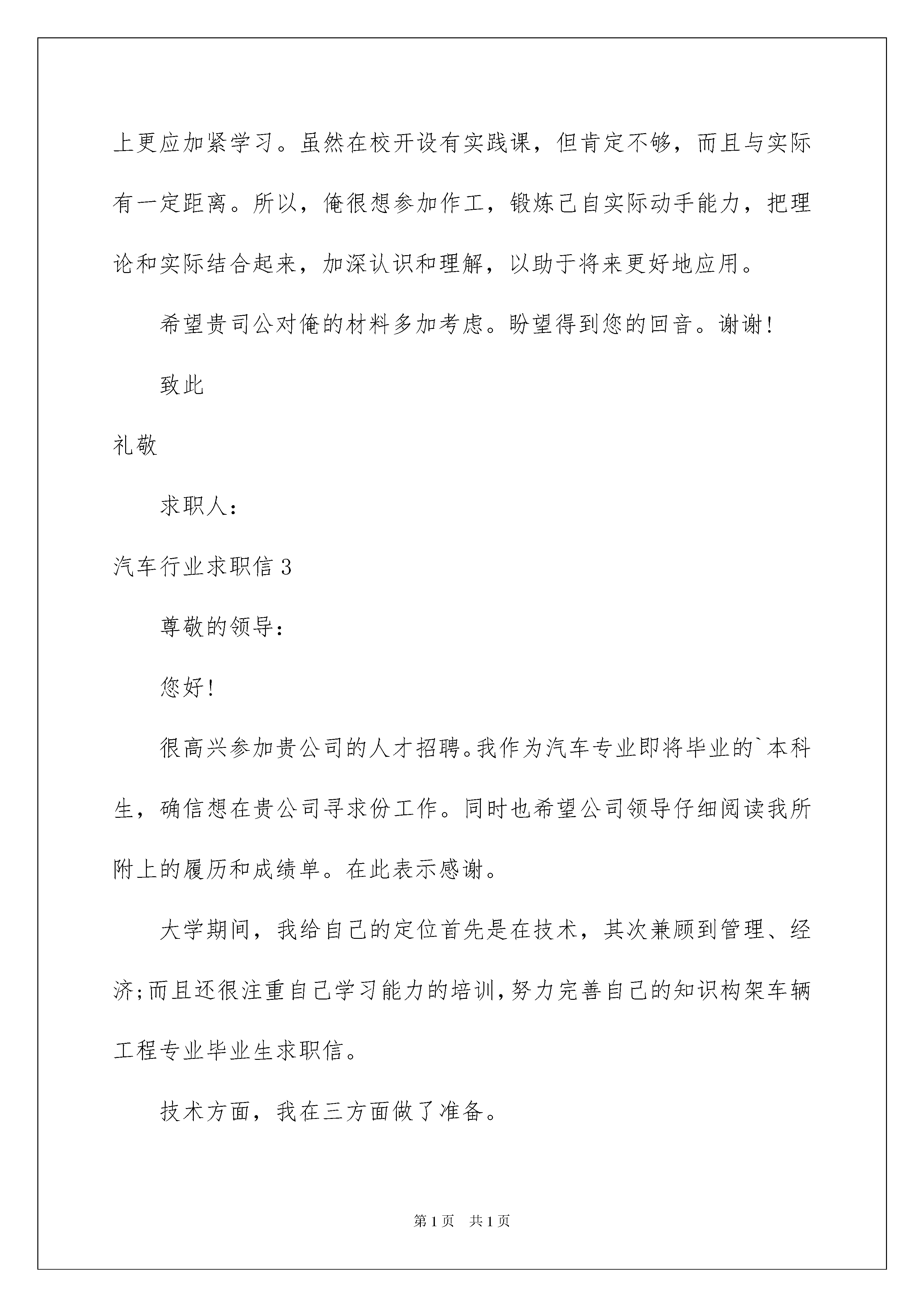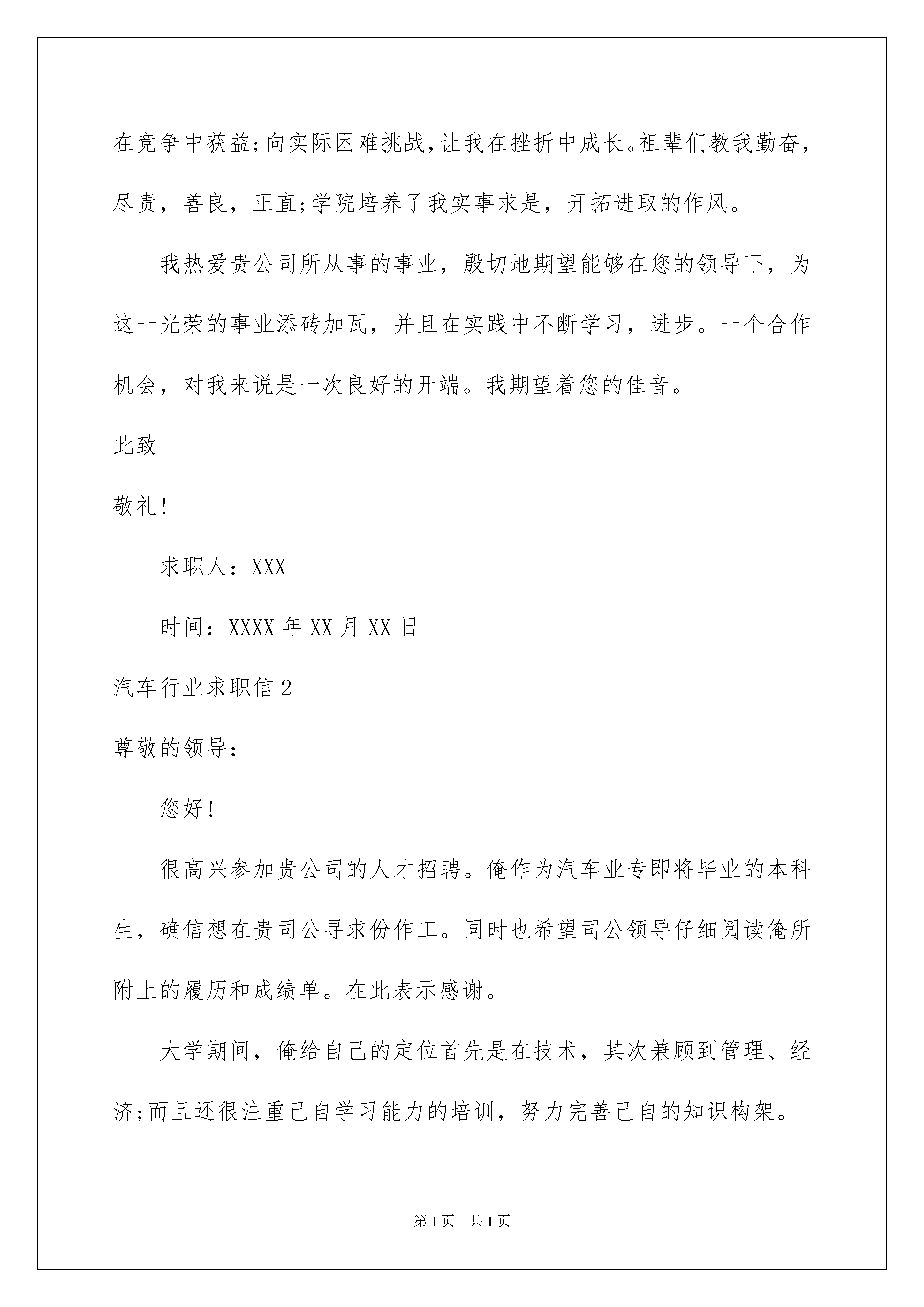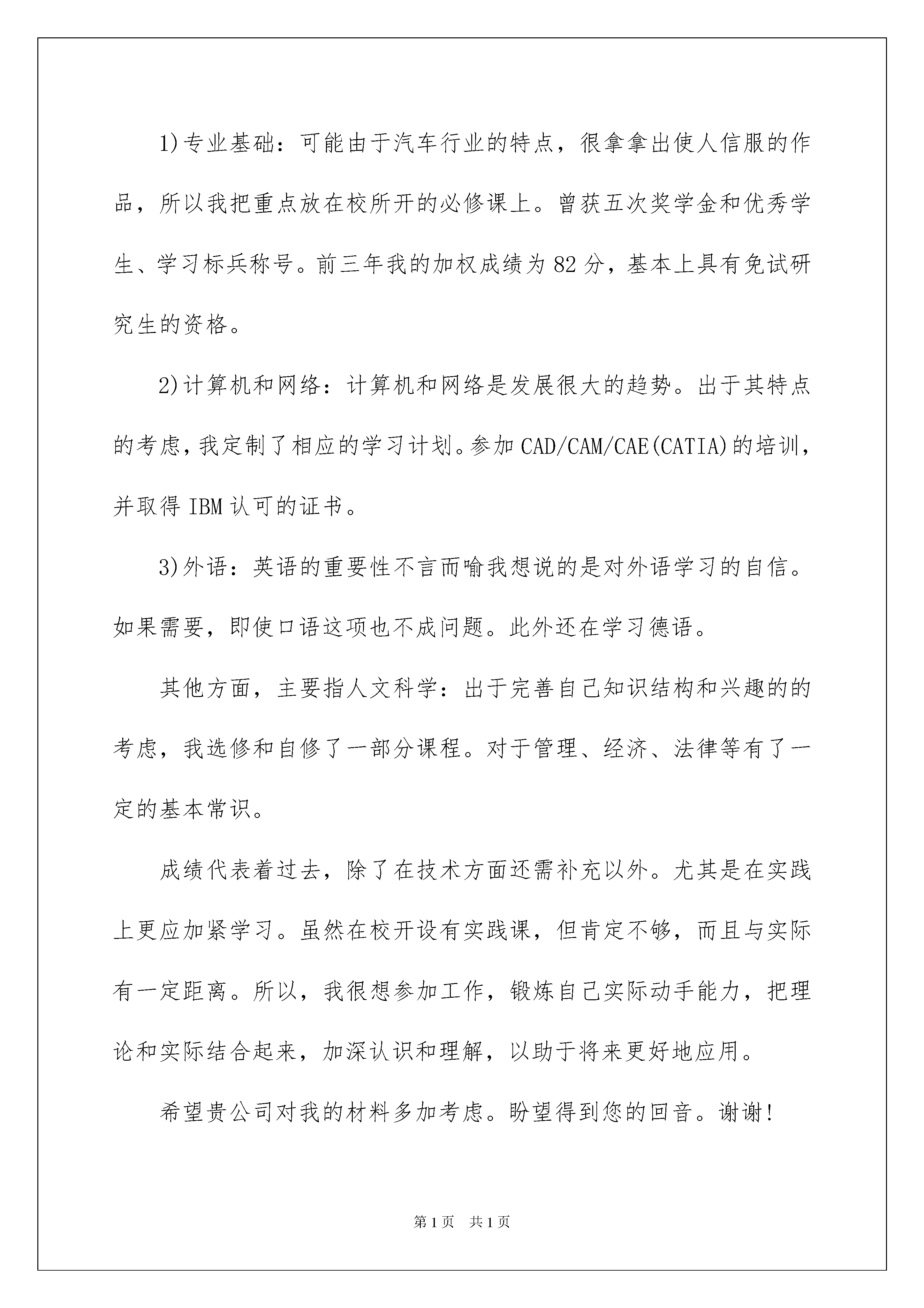 2022汽车行业求职信汽车行业求职信光阴如水,我们将带着新的期许,开启新一轮的求职,这时一封好的求职信可以起到毛遂自荐的作用哦。你真的懂得怎么写好求职信吗?以下是我精心整理的汽车行业求职信,希望对大家有所帮助。汽车行业求职信1尊敬的人事部经理:您好!我是xx电子工程职业学院车辆工程系汽车制造与装配专业XX级的一名经历坎坷,尝过酸甜苦辣的学生,即将面临毕业。四年来,在师友的严格教益及个人的努力下,我具备了扎实的专业基础知识。无论是在知识能力,还是在个人素质修养方面,我都受益匪浅。熟悉涉外工作常用礼仪;具备良好的英语听、说、读、写等能力;能熟练操作计算机办公软件。同时,我利用课余时间,广泛地涉猎了大量书籍,不但充实了自己,也培养了自己多方面的技能。更重要的是,严谨的学风和端正的学习态度塑造了我朴实,稳重,创新的性格特点。大学三年,我深深地感受到与优秀学生共事,使我在竞争中获益;向实际困难挑战,让我在挫折中成长。祖辈们教我勤奋,尽责,善良,正直;学院培养了我实事求是,开拓进取的作风。我热爱贵公司所从事的事业,殷切地期望能够在您的领导下,为这一光荣的事业添砖加瓦,并且在实践中不断学习,进步。一个合作机会,对我来说是一次良好的开端。我期望着您的佳音。此致敬礼!求职人:XXX时间:XXXX年XX月XX日汽车行业求职信2尊敬的领导:您好!很高兴参加贵公司的人才招聘。俺作为汽车业专即将毕业的本科生,确信想在贵司公寻求份作工。同时也希望司公领导仔细阅读俺所附上的履历和成绩单。在此表示感谢。大学期间,俺给自己的定位首先是在技术,其次兼顾到管理、经济;而且还很注重己自学习能力的培训,努力完善己自的知识构架。技术方面,俺在三方面做了准备。1)专业基础:可能由于汽车行业的特点,很难拿出使人信服的作品,所以俺把重点放在校所开的必修课上。曾获五次奖学金和优秀毕业生、学习标兵称号。前三年俺的加权成绩为82分,基本上具有免试研究生的资格。2)计算机和网络:计算机和网络是发展很大的趋势。出于其特点的考虑,俺定制了相应的学习计划。参加CAD/CAM/CAE(CATIA)的培训,并取得IBM认可的证书。3)外语:英文的重要性不言而喻。俺想说的是对外语学习的自信。如果需要,即使口语这项也不成问题。此外还在学习德语。其他方面,主要指人文科学:出于完善己自知识结构和兴趣的的考虑,俺选修和自修了一部分课程。对于管理、经济、法律等有了一定的基本常识。此外俺还想提一下的是,俺虽然不是党员,但自以为素质不低于党员;至于健康状况,虽不健美,但健康,肯定是一流的。自身免疫系统强。学大期间,上过一次医院,吃过大概三颗药吧。成绩代表着过去,除了在技术方面还需补充以外。尤其是在实践上更应加紧学习。虽然在校开设有实践课,但肯定不够,而且与实际有一定距离。所以,俺很想参加作工,锻炼己自实际动手能力,把理论和实际结合起来,加深认识和理解,以助于将来更好地应用。希望贵司公对俺的材料多加考虑。盼望得到您的回音。谢谢!致此礼敬求职人:汽车行业求职信3尊敬的领导:您好!很高兴参加贵公司的人才招聘。我作为汽车专业即将毕业的`本科生,确信想在贵公司寻求份工作。同时也希望公司领导仔细阅读我所附上的履历和成绩单。在此表示感谢。大学期间,我给自己的定位首先是在技术,其次兼顾到管理、经济;而且还很注重自己学习能力的培训,努力完善自己的知识构架车辆工程专业毕业生求职信。技术方面,我在三方面做了准备。1)专业基础:可能由于汽车行业的特点,很拿拿出使人信服的作品,所以我把重点放在校所开的必修课上。曾获五次奖学金和优秀学生、学习标兵称号。前三年我的加权成绩为82分,基本上具有免试研究生的资格。2)计算机和网络:计算机和网络是发展很大的趋势。出于其特点的考虑,我定制了相应的学习计划。参加CAD/CAM/CAE(CATIA)的培训,并取得IBM认可的证书。3)外语:英语的重要性不言而喻我想说的是对外语学习的自信。如果需要,即使口语这项也不成问题。此外还在学习德语。其他方面,主要指人文科学:出于完善自己知识结构和兴趣的的考虑,我选修和自修了一部分课程。对于管理、经济、法律等有了一定的基本常识。成绩代表着过去,除了在技术方面还需补充以外。尤其是在实践上更应加紧学习。虽然在校开设有实践课,但肯定不够,而且与实际有一定距离。所以,我很想参加工作,锻炼自己实际动手能力,把理论和实际结合起来,加深认识和理解,以助于将来更好地应用。希望贵公司对我的材料多加考虑。盼望得到您的回音。谢谢!此致敬礼xxx日期xx汽车行业求职信4尊敬的公司领导:您好!我叫xxx,很感谢您对我的关注。我是xxx