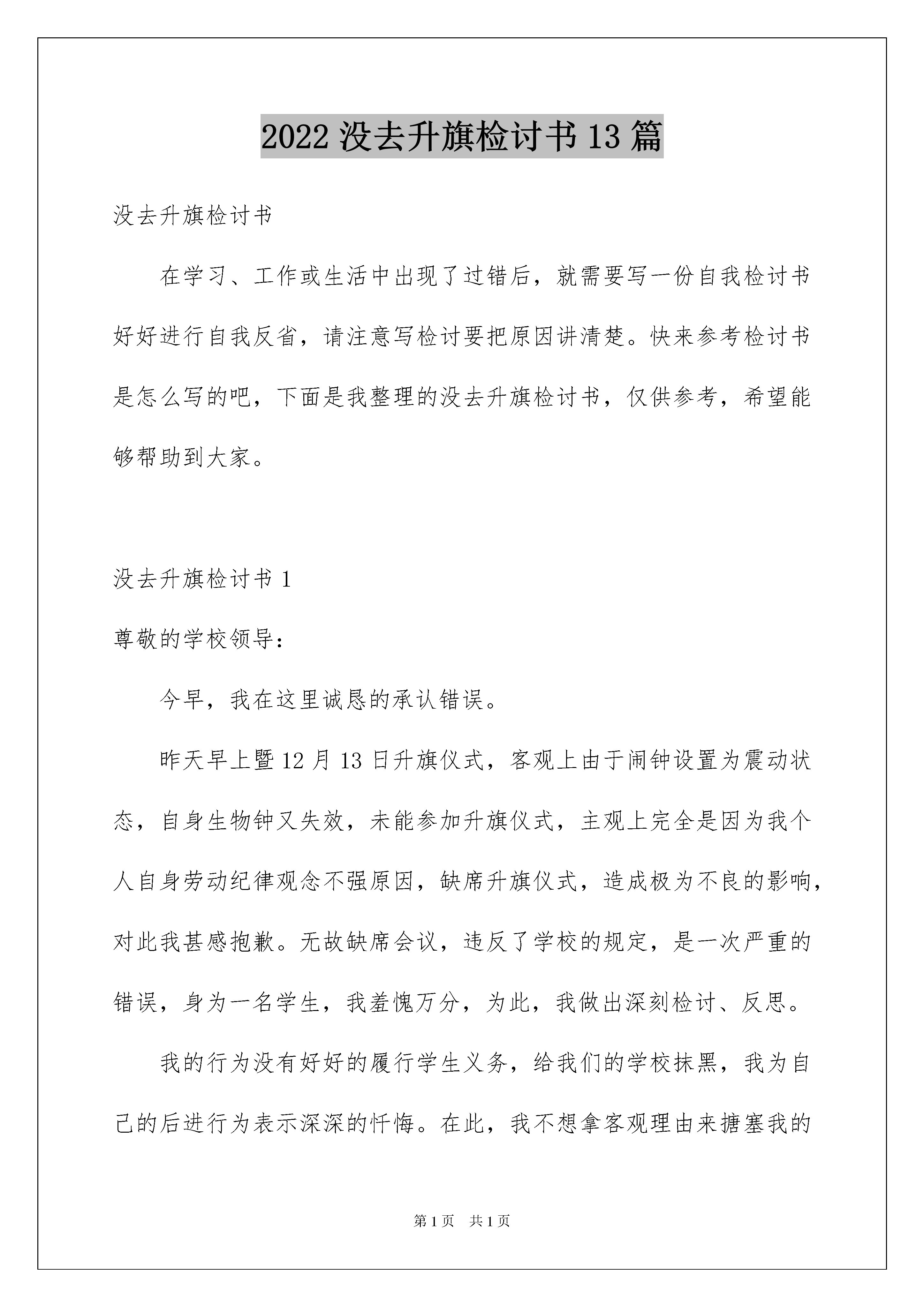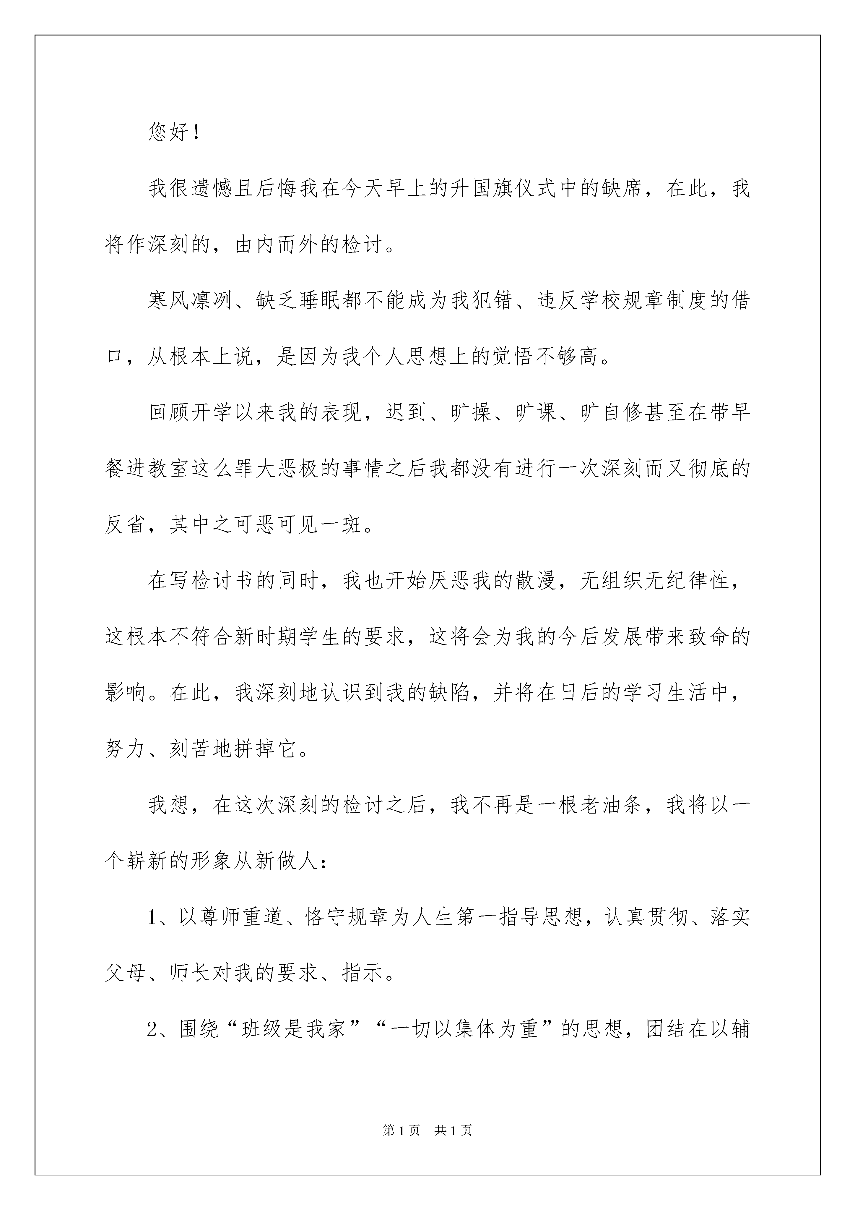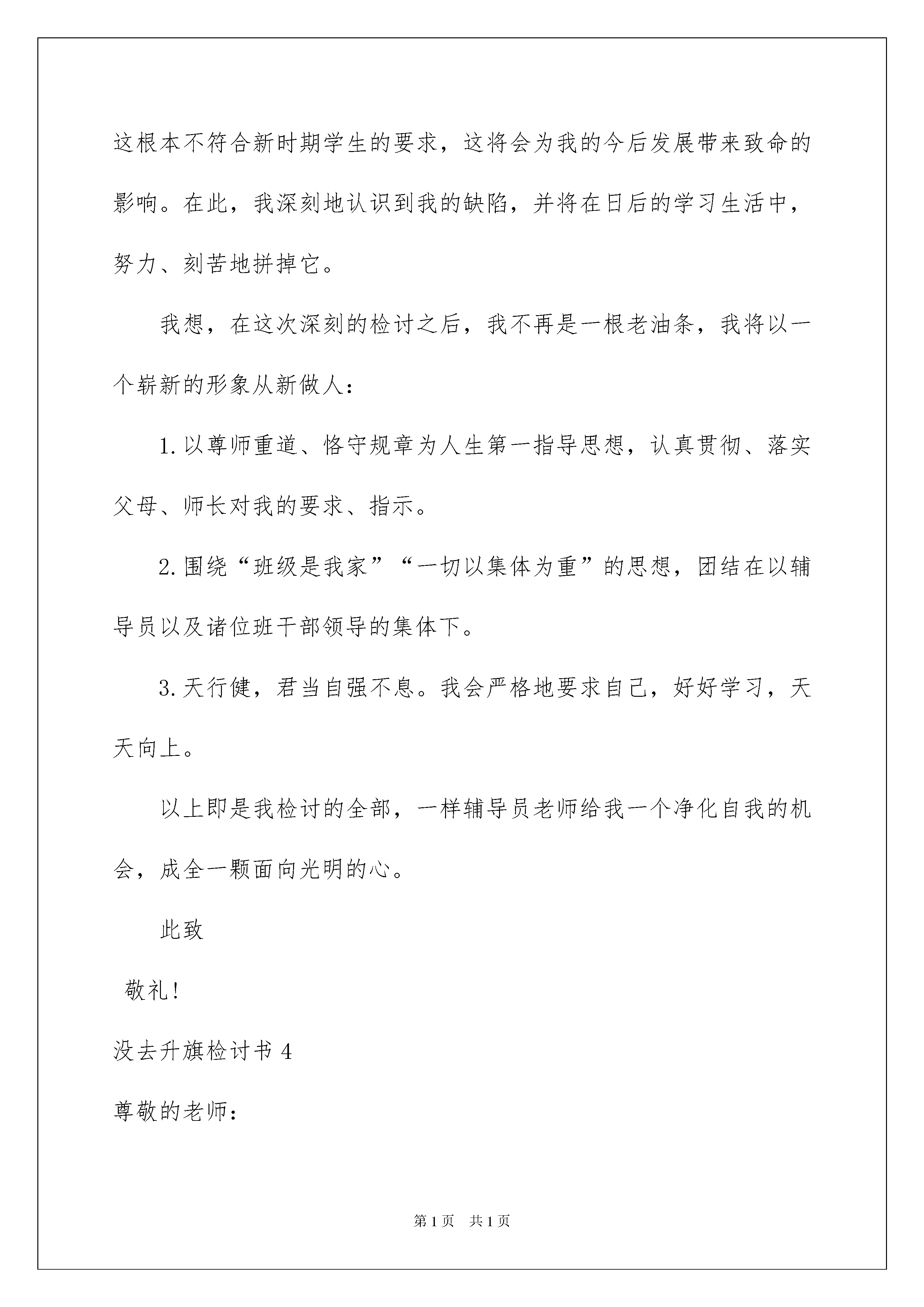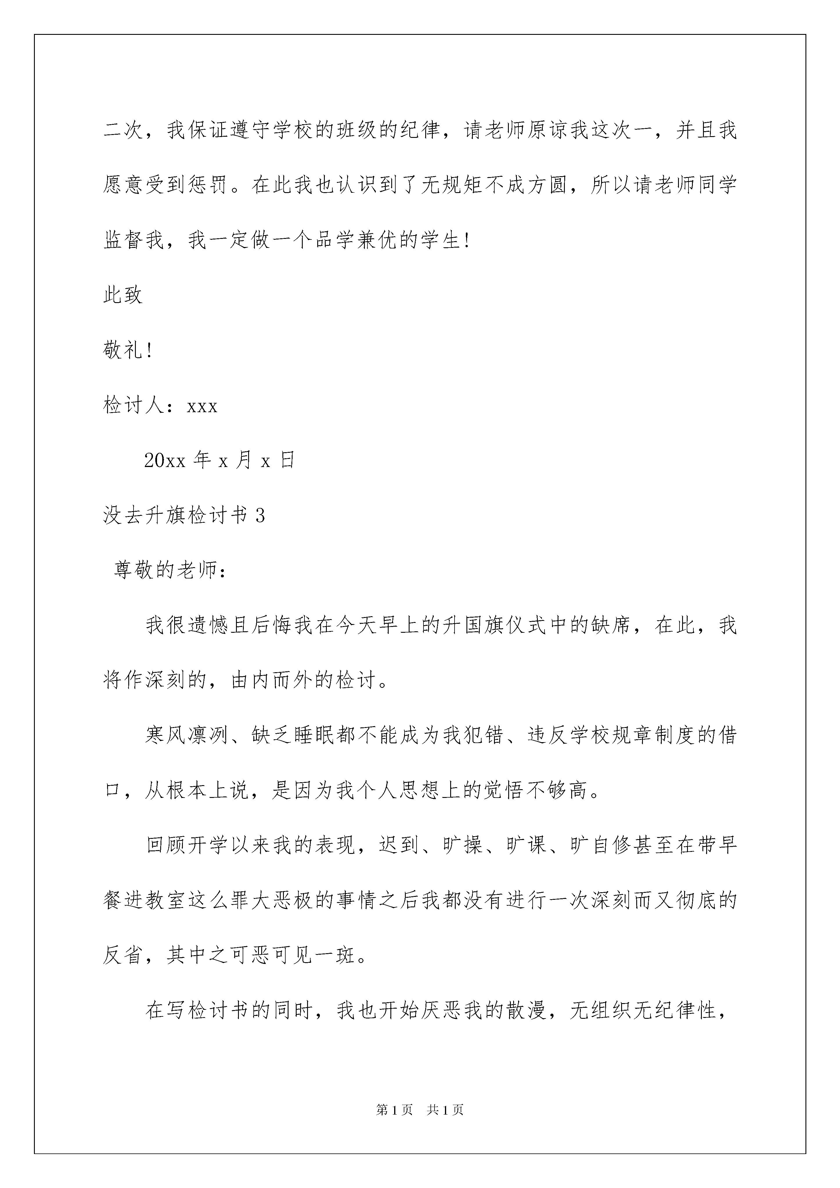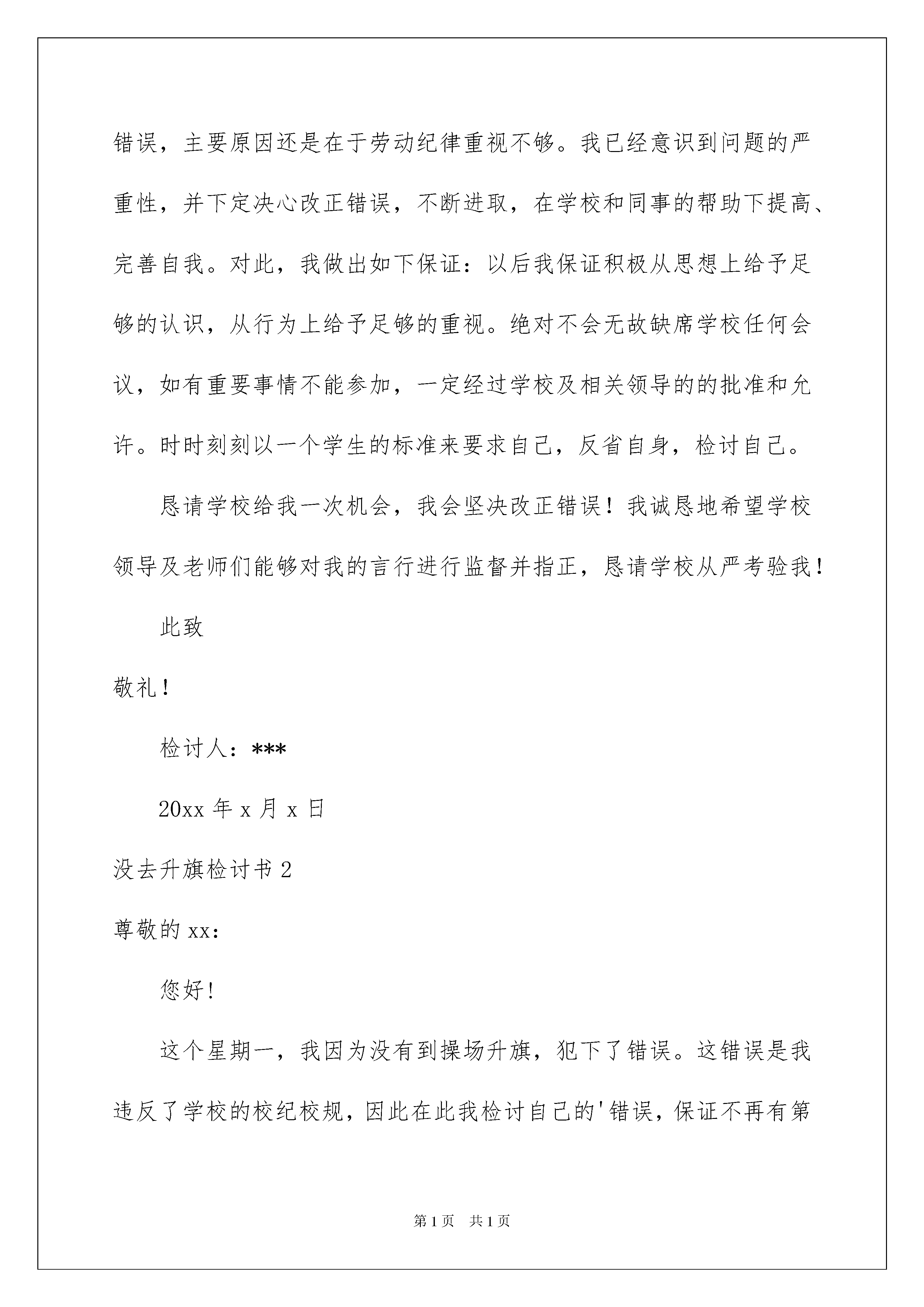 2022没去升旗检讨书13篇没去升旗检讨书在学习、工作或生活中出现了过错后,就需要写一份自我检讨书好好进行自我反省,请注意写检讨要把原因讲清楚。快来参考检讨书是怎么写的吧,下面是我整理的没去升旗检讨书,仅供参考,希望能够帮助到大家。没去升旗检讨书1尊敬的学校领导:今早,我在这里诚恳的承认错误。昨天早上暨12月13日升旗仪式,客观上由于闹钟设置为震动状态,自身生物钟又失效,未能参加升旗仪式,主观上完全是因为我个人自身劳动纪律观念不强原因,缺席升旗仪式,造成极为不良的影响,对此我甚感抱歉。无故缺席会议,违反了学校的规定,是一次严重的错误,身为一名学生,我羞愧万分,为此,我做出深刻检讨、反思。我的行为没有好好的履行学生义务,给我们的学校抹黑,我为自己的后进行为表示深深的忏悔。在此,我不想拿客观理由来搪塞我的错误,主要原因还是在于劳动纪律重视不够。我已经意识到问题的严重性,并下定决心改正错误,不断进取,在学校和同事的帮助下提高、完善自我。对此,我做出如下保证:以后我保证积极从思想上给予足够的认识,从行为上给予足够的重视。绝对不会无故缺席学校任何会议,如有重要事情不能参加,一定经过学校及相关领导的的批准和允许。时时刻刻以一个学生的标准来要求自己,反省自身,检讨自己。恳请学校给我一次机会,我会坚决改正错误!我诚恳地希望学校领导及老师们能够对我的言行进行监督并指正,恳请学校从严考验我!此致敬礼!检讨人:***20xx年x月x日没去升旗检讨书2尊敬的xx:您好!这个星期一,我因为没有到操场升旗,犯下了错误。这错误是我违反了学校的校纪校规,因此在此我检讨自己的'错误,保证不再有第二次,我保证遵守学校的班级的纪律,请老师原谅我这次一,并且我愿意受到惩罚。在此我也认识到了无规矩不成方圆,所以请老师同学监督我,我一定做一个品学兼优的学生!此致敬礼!检讨人:xxx20xx年x月x日没去升旗检讨书3尊敬的老师:我很遗憾且后悔我在今天早上的升国旗仪式中的缺席,在此,我将作深刻的,由内而外的检讨。寒风凛冽、缺乏睡眠都不能成为我犯错、违反学校规章制度的借口,从根本上说,是因为我个人思想上的觉悟不够高。回顾开学以来我的表现,迟到、旷操、旷课、旷自修甚至在带早餐进教室这么罪大恶极的事情之后我都没有进行一次深刻而又彻底的反省,其中之可恶可见一斑。在写检讨书的同时,我也开始厌恶我的散漫,无组织无纪律性,这根本不符合新时期学生的要求,这将会为我的今后发展带来致命的影响。在此,我深刻地认识到我的缺陷,并将在日后的学习生活中,努力、刻苦地拼掉它。我想,在这次深刻的检讨之后,我不再是一根老油条,我将以一个崭新的形象从新做人:1.以尊师重道、恪守规章为人生第一指导思想,认真贯彻、落实父母、师长对我的要求、指示。2.围绕“班级是我家”“一切以集体为重”的思想,团结在以辅导员以及诸位班干部领导的集体下。3.天行健,君当自强不息。我会严格地要求自己,好好学习,天天向上。以上即是我检讨的全部,一样辅导员老师给我一个净化自我的机会,成全一颗面向光明的心。此致敬礼!没去升旗检讨书4尊敬的老师:您好!我很遗憾且后悔我在今天早上的升国旗仪式中的缺席,在此,我将作深刻的,由内而外的检讨。寒风凛冽、缺乏睡眠都不能成为我犯错、违反学校规章制度的借口,从根本上说,是因为我个人思想上的觉悟不够高。回顾开学以来我的表现,迟到、旷操、旷课、旷自修甚至在带早餐进教室这么罪大恶极的事情之后我都没有进行一次深刻而又彻底的反省,其中之可恶可见一斑。在写检讨书的同时,我也开始厌恶我的散漫,无组织无纪律性,这根本不符合新时期学生的要求,这将会为我的今后发展带来致命的影响。在此,我深刻地认识到我的缺陷,并将在日后的学习生活中,努力、刻苦地拼掉它。我想,在这次深刻的检讨之后,我不再是一根老油条,我将以一个崭新的形象从新做人:1、以尊师重道、恪守规章为人生第一指导思想,认真贯彻、落实父母、师长对我的要求、指示。2、围绕“班级是我家”“一切以集体为重”的思想,团结在以辅导员以及诸位班干部领导的集体下。3、天行健,君当自强不息。我会严格地要求自己,好好学习,天天向上。以上即是我检讨的全部,一样辅导员老师给我一个净化自我的机会,成全一颗面向光明的。心。此致敬礼!检讨人:xxx20xx年x月x日没去升旗检讨书5尊敬的xx:这个星期一,我因为没有到操场升旗,犯下了错误。这错误是我违反了学校的校纪校规,因此在此我检讨自己的错误,保证不再有第二次,我保证遵守学校的班级的纪律,请老师原谅我这次一,并且我愿意受到惩罚。在此我也认识到了无规矩不成方圆,所以请老师同学监督我,我一定做一个品学