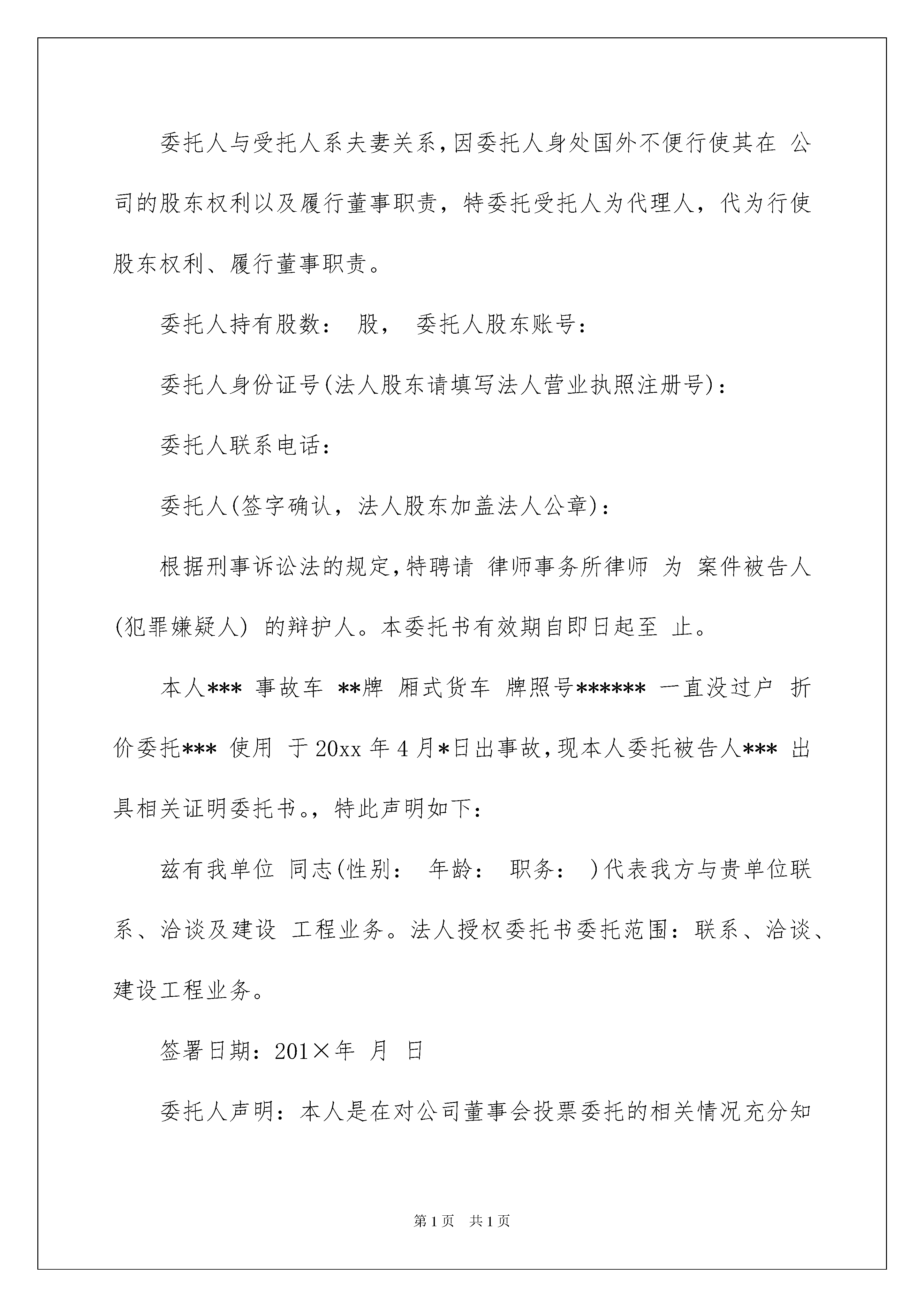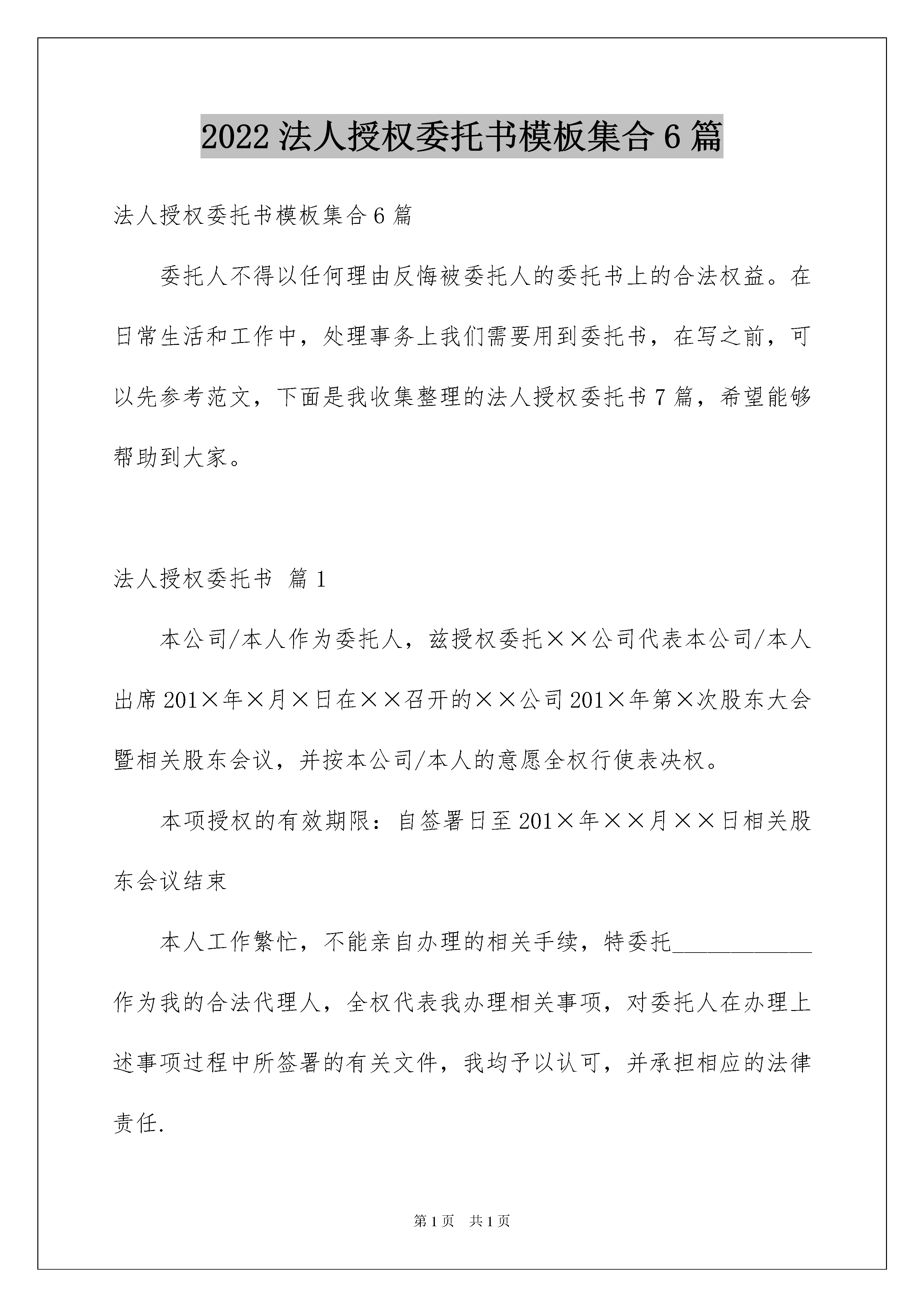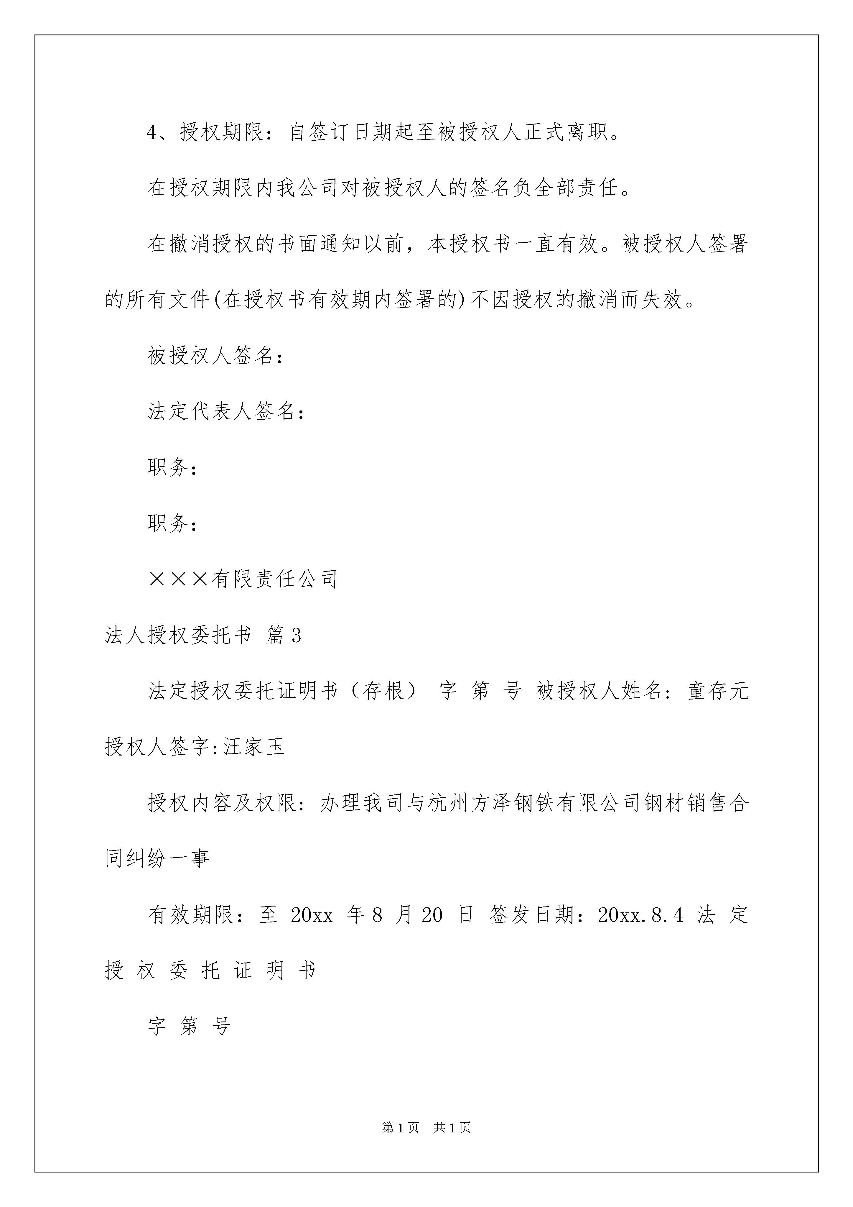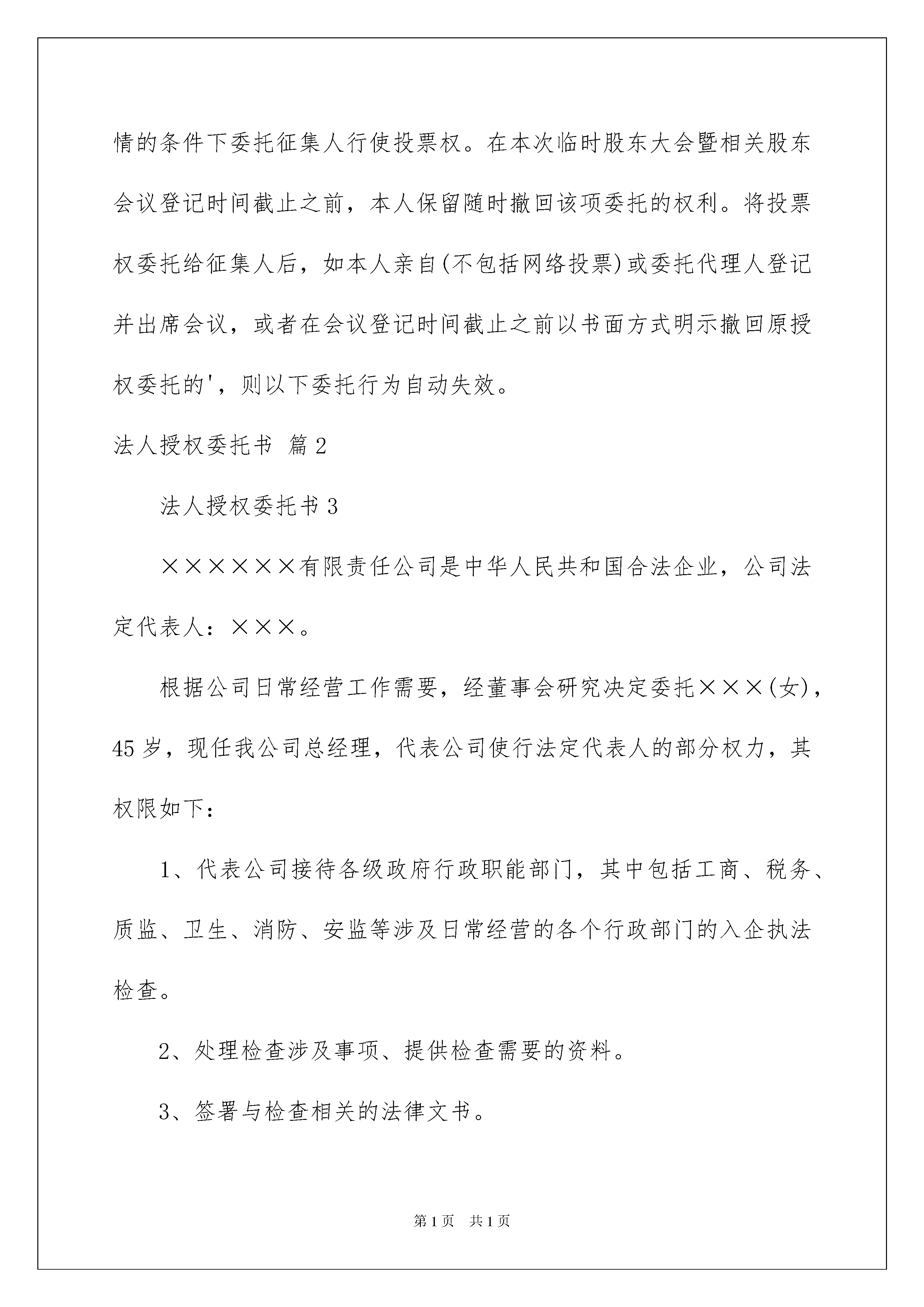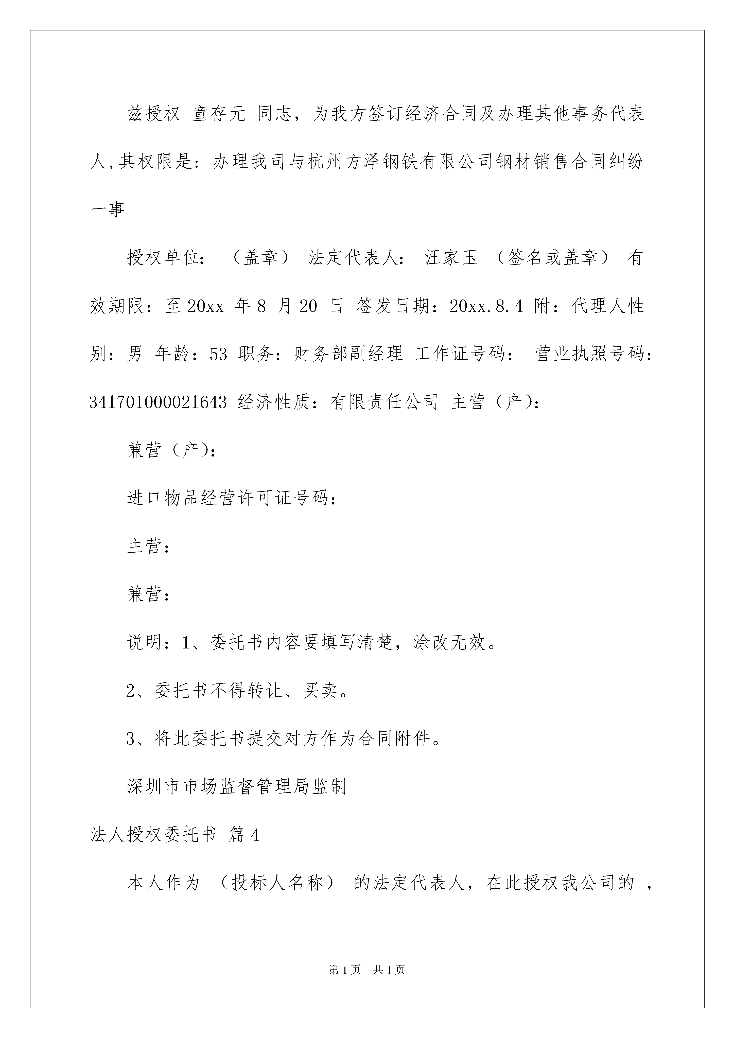 2022法人授权委托书模板集合6篇法人授权委托书模板集合6篇委托人不得以任何理由反悔被委托人的委托书上的合法权益。在日常生活和工作中,处理事务上我们需要用到委托书,在写之前,可以先参考范文,下面是我收集整理的法人授权委托书7篇,希望能够帮助到大家。法人授权委托书篇1本公司/本人作为委托人,兹授权委托××公司代表本公司/本人出席201×年×月×日在××召开的××公司201×年第×次股东大会暨相关股东会议,并按本公司/本人的意愿全权行使表决权。本项授权的有效期限:自签署日至201×年××月××日相关股东会议结束本人工作繁忙,不能亲自办理的相关手续,特委托____________作为我的合法代理人,全权代表我办理相关事项,对委托人在办理上述事项过程中所签署的有关文件,我均予以认可,并承担相应的法律责任.委托人与受托人系夫妻关系,因委托人身处国外不便行使其在公司的股东权利以及履行董事职责,特委托受托人为代理人,代为行使股东权利、履行董事职责。委托人持有股数:股,委托人股东账号:委托人身份证号(法人股东请填写法人营业执照注册号):委托人联系电话:委托人(签字确认,法人股东加盖法人公章):根据刑事诉讼法的规定,特聘请律师事务所律师为案件被告人(犯罪嫌疑人)的辩护人。本委托书有效期自即日起至止。本人***事故车**牌厢式货车牌照号******一直没过户折价委托***使用于20xx年4月*日出事故,现本人委托被告人***出具相关证明委托书。,特此声明如下:兹有我单位同志(性别:年龄:职务:)代表我方与贵单位联系、洽谈及建设工程业务。法人授权委托书委托范围:联系、洽谈、建设工程业务。签署日期:201×年月日委托人声明:本人是在对公司董事会投票委托的相关情况充分知情的条件下委托征集人行使投票权。在本次临时股东大会暨相关股东会议登记时间截止之前,本人保留随时撤回该项委托的权利。将投票权委托给征集人后,如本人亲自(不包括网络投票)或委托代理人登记并出席会议,或者在会议登记时间截止之前以书面方式明示撤回原授权委托的',则以下委托行为自动失效。法人授权委托书篇2法人授权委托书3××××××有限责任公司是中华人民共和国合法企业,公司法定代表人:×××。根据公司日常经营工作需要,经董事会研究决定委托×××(女),45岁,现任我公司总经理,代表公司使行法定代表人的部分权力,其权限如下:1、代表公司接待各级政府行政职能部门,其中包括工商、税务、质监、卫生、消防、安监等涉及日常经营的各个行政部门的入企执法检查。2、处理检查涉及事项、提供检查需要的资料。3、签署与检查相关的法律文书。4、授权期限:自签订日期起至被授权人正式离职。在授权期限内我公司对被授权人的签名负全部责任。在撤消授权的书面通知以前,本授权书一直有效。被授权人签署的所有文件(在授权书有效期内签署的)不因授权的撤消而失效。被授权人签名:法定代表人签名:职务:职务:×××有限责任公司法人授权委托书篇3法定授权委托证明书(存根)字第号被授权人姓名:童存元授权人签字:汪家玉授权内容及权限:办理我司与杭州方泽钢铁有限公司钢材销售合同纠纷一事有效期限:至20xx年8月20日签发日期:20xx.8.4法定授权委托证明书字第号兹授权童存元同志,为我方签订经济合同及办理其他事务代表人,其权限是:办理我司与杭州方泽钢铁有限公司钢材销售合同纠纷一事授权单位:(盖章)法定代表人:汪家玉(签名或盖章)有效期限:至20xx年8月20日签发日期:20xx.8.4附:代理人性别:男年龄:53职务:财务部副经理工作证号码:营业执照号码:341701000021643经济性质:有限责任公司主营(产):兼营(产):进口物品经营许可证号码:主营:兼营:说明:1、委托书内容要填写清楚,涂改无效。2、委托书不得转让、买卖。3、将此委托书提交对方作为合同附件。深圳市市场监督管理局监制法人授权委托书篇4本人作为(投标人名称)的法定代表人,在此授权我公司的,其身份证号码:,作为我的合法的授权代表,以我的名义并代表我公司全权处理项目投标的以下事宜:1、签署与本次招标过程中的所有与之有关的文件;2、作为投标人代表出现招标项目相关会议和程序;3、进行商务谈判和签署与项目有关的合同;4、作为投标人代表处理其他该招标项目相关事宜。本授权书期限自年月日起至年月日止。在此授权范围和期限内,被授权人所实施的行为具有法律效力,授权人予以认可。授权代表无权转让委托权,特此委托。授权代表:(签字或盖章)身份证号码:职务:投标人:法定代表人:(签字或盖章)授权委托日期:年月日法人授权委托书篇5我(姓名)系(投标单位名称