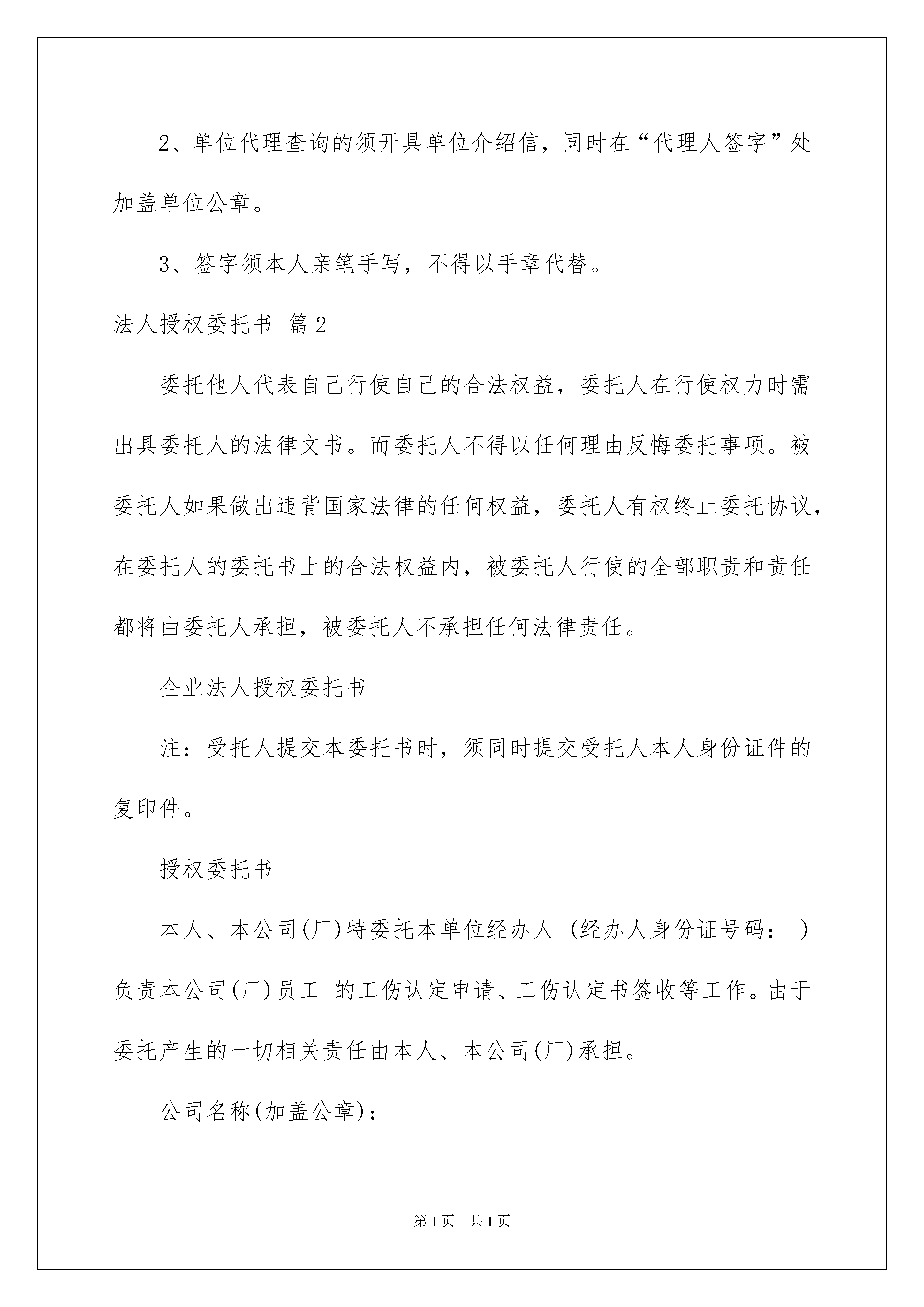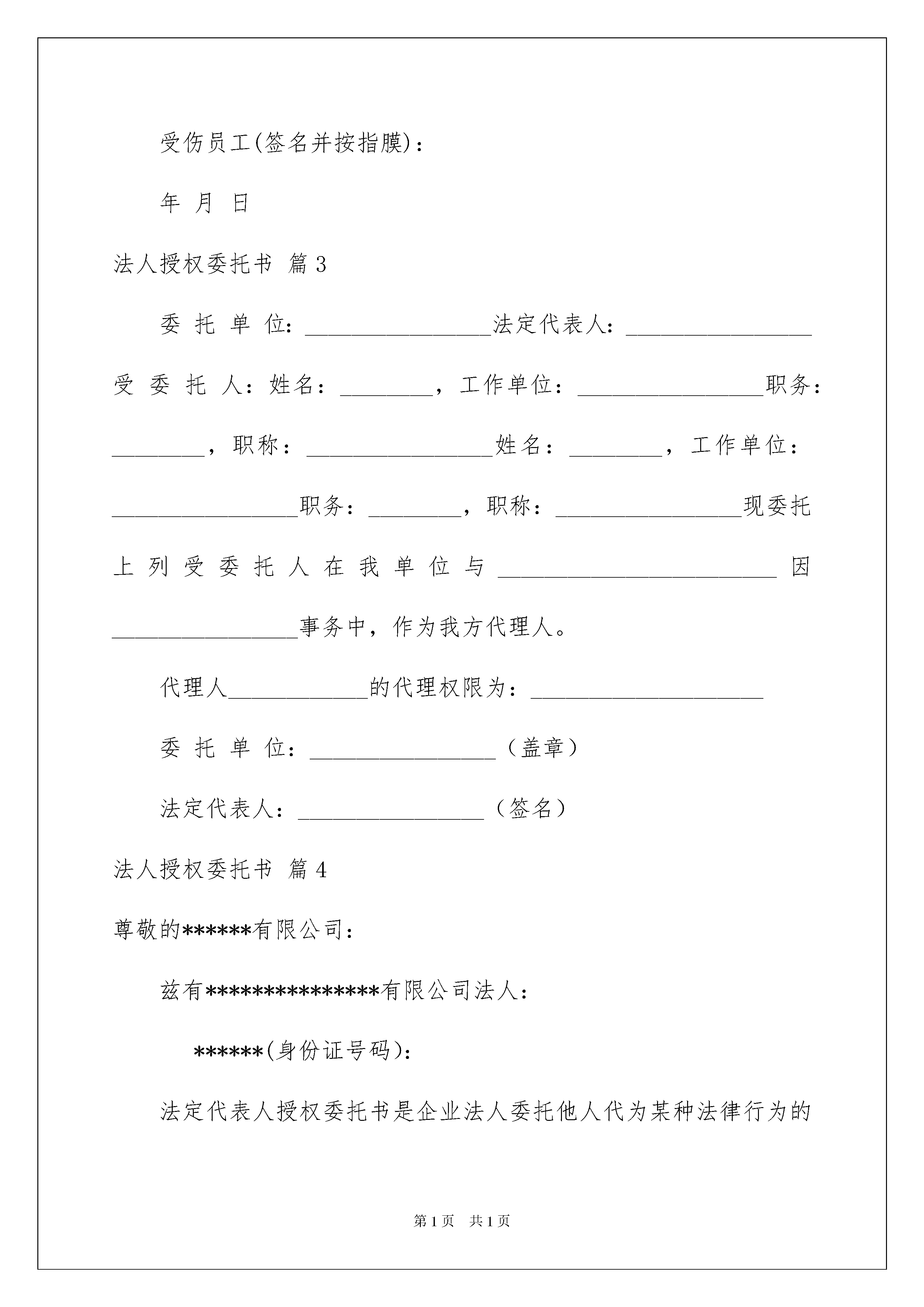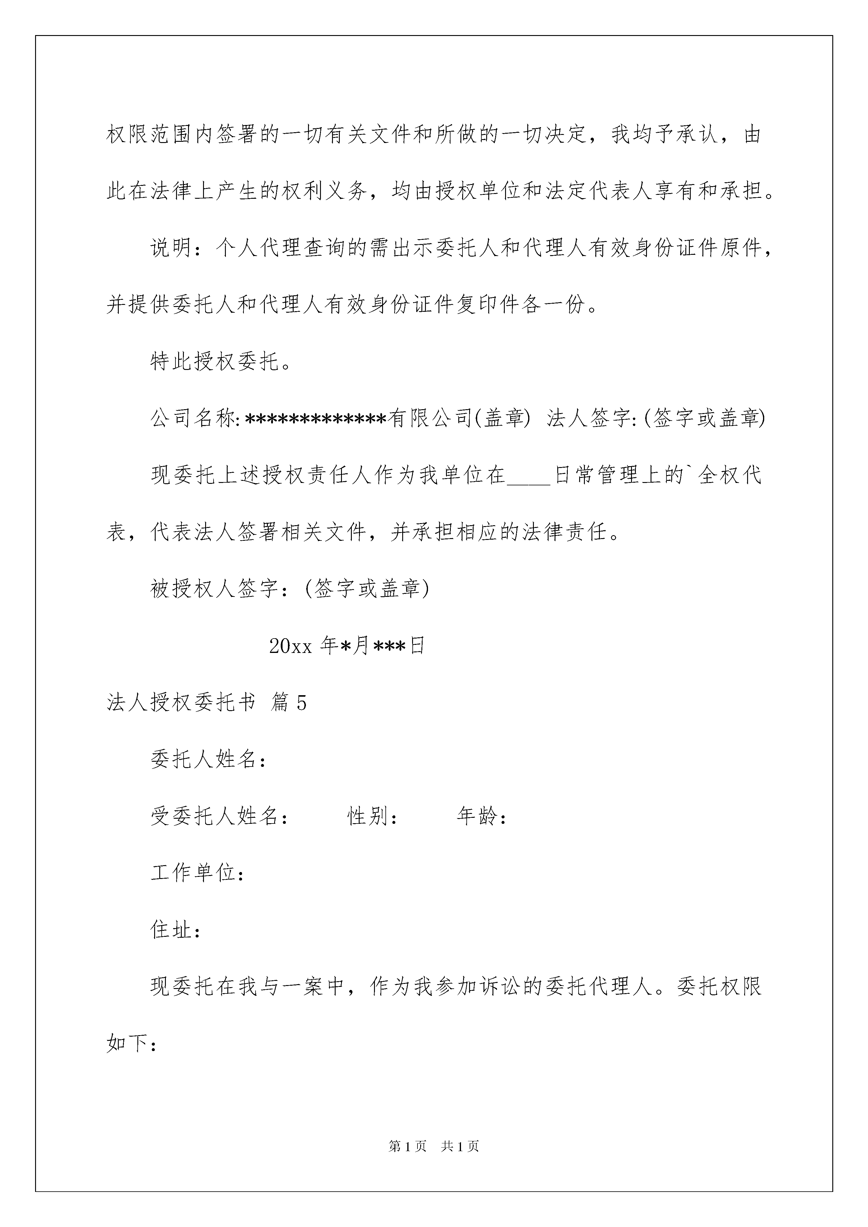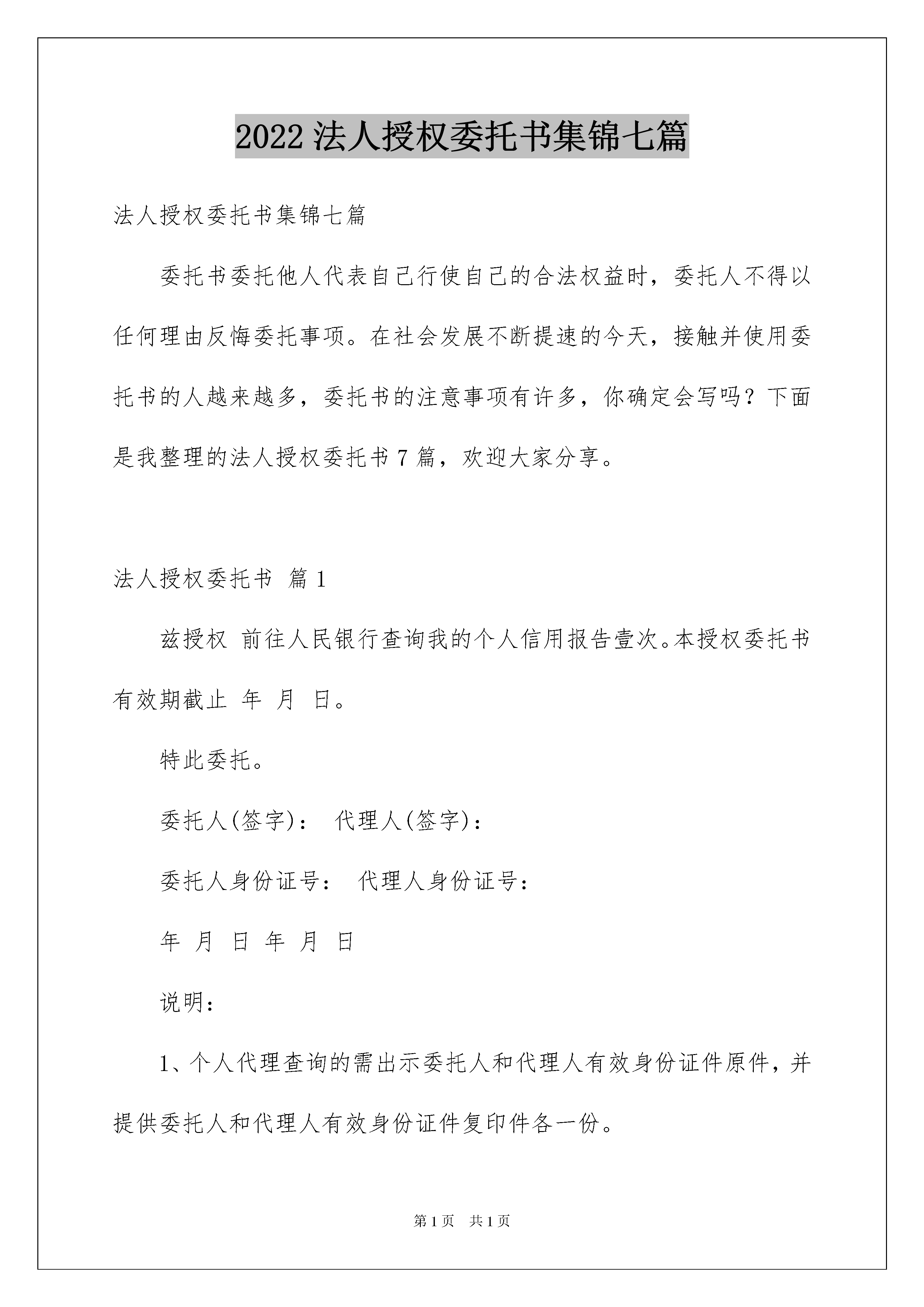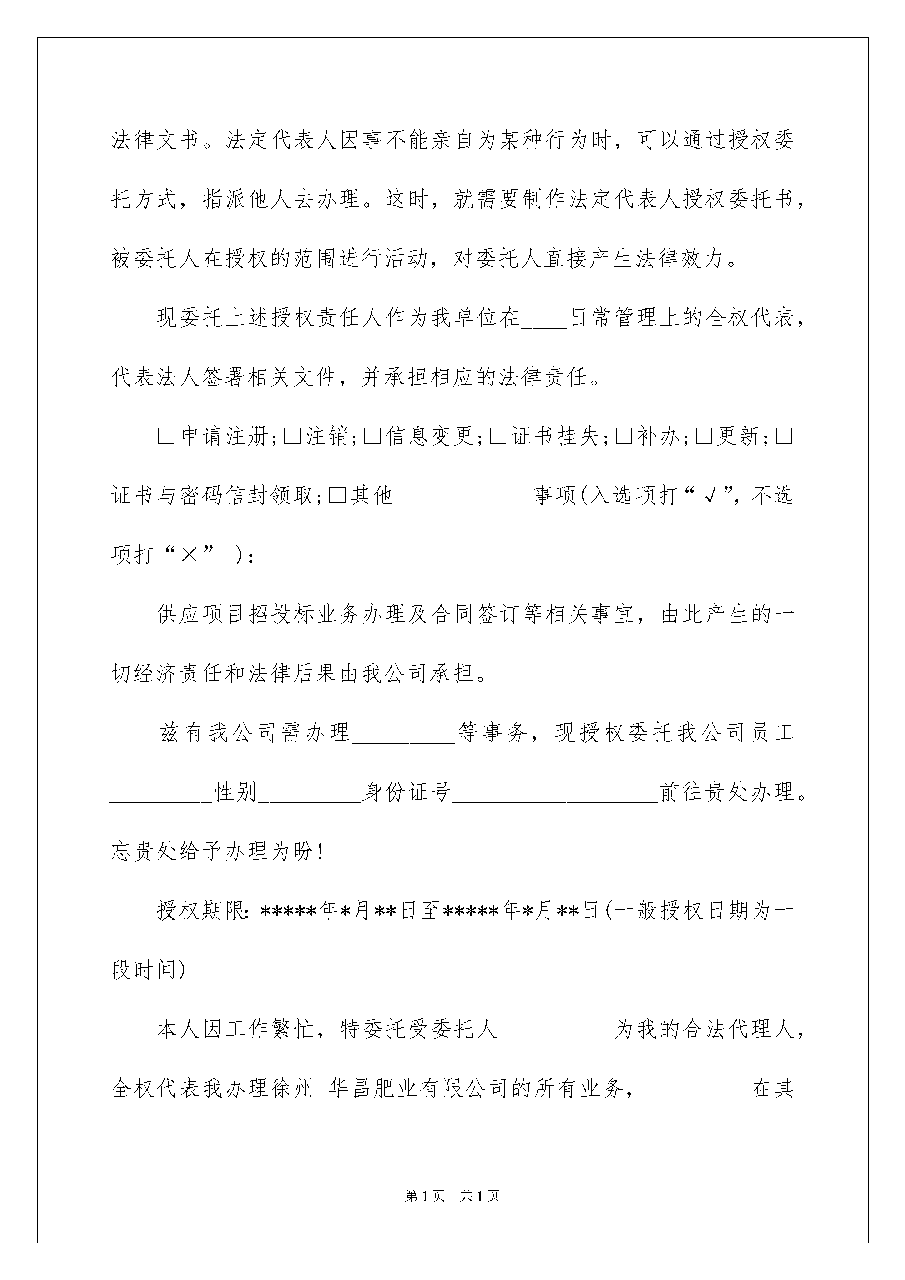 2022法人授权委托书集锦七篇法人授权委托书集锦七篇委托书委托他人代表自己行使自己的合法权益时,委托人不得以任何理由反悔委托事项。在社会发展不断提速的今天,接触并使用委托书的人越来越多,委托书的注意事项有许多,你确定会写吗?下面是我整理的法人授权委托书7篇,欢迎大家分享。法人授权委托书篇1兹授权前往人民银行查询我的个人信用报告壹次。本授权委托书有效期截止年月日。特此委托。委托人(签字):代理人(签字):委托人身份证号:代理人身份证号:年月日年月日说明:1、个人代理查询的需出示委托人和代理人有效身份证件原件,并提供委托人和代理人有效身份证件复印件各一份。2、单位代理查询的须开具单位介绍信,同时在“代理人签字”处加盖单位公章。3、签字须本人亲笔手写,不得以手章代替。法人授权委托书篇2委托他人代表自己行使自己的合法权益,委托人在行使权力时需出具委托人的法律文书。而委托人不得以任何理由反悔委托事项。被委托人如果做出违背国家法律的任何权益,委托人有权终止委托协议,在委托人的委托书上的合法权益内,被委托人行使的全部职责和责任都将由委托人承担,被委托人不承担任何法律责任。企业法人授权委托书注:受托人提交本委托书时,须同时提交受托人本人身份证件的复印件。授权委托书本人、本公司(厂)特委托本单位经办人(经办人身份证号码:)负责本公司(厂)员工的工伤认定申请、工伤认定书签收等工作。由于委托产生的一切相关责任由本人、本公司(厂)承担。公司名称(加盖公章):受伤员工(签名并按指膜):年月日法人授权委托书篇3委托单位:________________法定代表人:________________受委托人:姓名:________,工作单位:________________职务:________,职称:________________姓名:________,工作单位:________________职务:________,职称:________________现委托上列受委托人在我单位与________________________因________________事务中,作为我方代理人。代理人____________的代理权限为:____________________委托单位:________________(盖章)法定代表人:________________(签名)法人授权委托书篇4尊敬的******有限公司:兹有***************有限公司法人:******(身份证号码):法定代表人授权委托书是企业法人委托他人代为某种法律行为的法律文书。法定代表人因事不能亲自为某种行为时,可以通过授权委托方式,指派他人去办理。这时,就需要制作法定代表人授权委托书,被委托人在授权的范围进行活动,对委托人直接产生法律效力。现委托上述授权责任人作为我单位在____日常管理上的全权代表,代表法人签署相关文件,并承担相应的法律责任。□申请注册;□注销;□信息变更;□证书挂失;□补办;□更新;□证书与密码信封领取;□其他____________事项(入选项打“√”,不选项打“×”):供应项目招投标业务办理及合同签订等相关事宜,由此产生的一切经济责任和法律后果由我公司承担。兹有我公司需办理_________等事务,现授权委托我公司员工_________性别_________身份证号__________________前往贵处办理。忘贵处给予办理为盼!授权期限:*****年*月**日至*****年*月**日(一般授权日期为一段时间)本人因工作繁忙,特委托受委托人_________为我的合法代理人,全权代表我办理徐州华昌肥业有限公司的所有业务,_________在其权限范围内签署的一切有关文件和所做的一切决定,我均予承认,由此在法律上产生的权利义务,均由授权单位和法定代表人享有和承担。说明:个人代理查询的需出示委托人和代理人有效身份证件原件,并提供委托人和代理人有效身份证件复印件各一份。特此授权委托。公司名称:*************有限公司(盖章)法人签字:(签字或盖章)现委托上述授权责任人作为我单位在____日常管理上的`全权代表,代表法人签署相关文件,并承担相应的法律责任。被授权人签字:(签字或盖章)20xx年*月***日法人授权委托书篇5委托人姓名:受委托人姓名:性别:年龄:工作单位:住址:现委托在我与一案中,作为我参加诉讼的委托代理人。委托权限如下:委托人受委托人年月日填写说明:1.委托权限授权是委托书最重要的部分。一般授权委托书只授予代理人代为进行诉讼的权利,而无权处分实体权利。在委托书上只需写明“一般