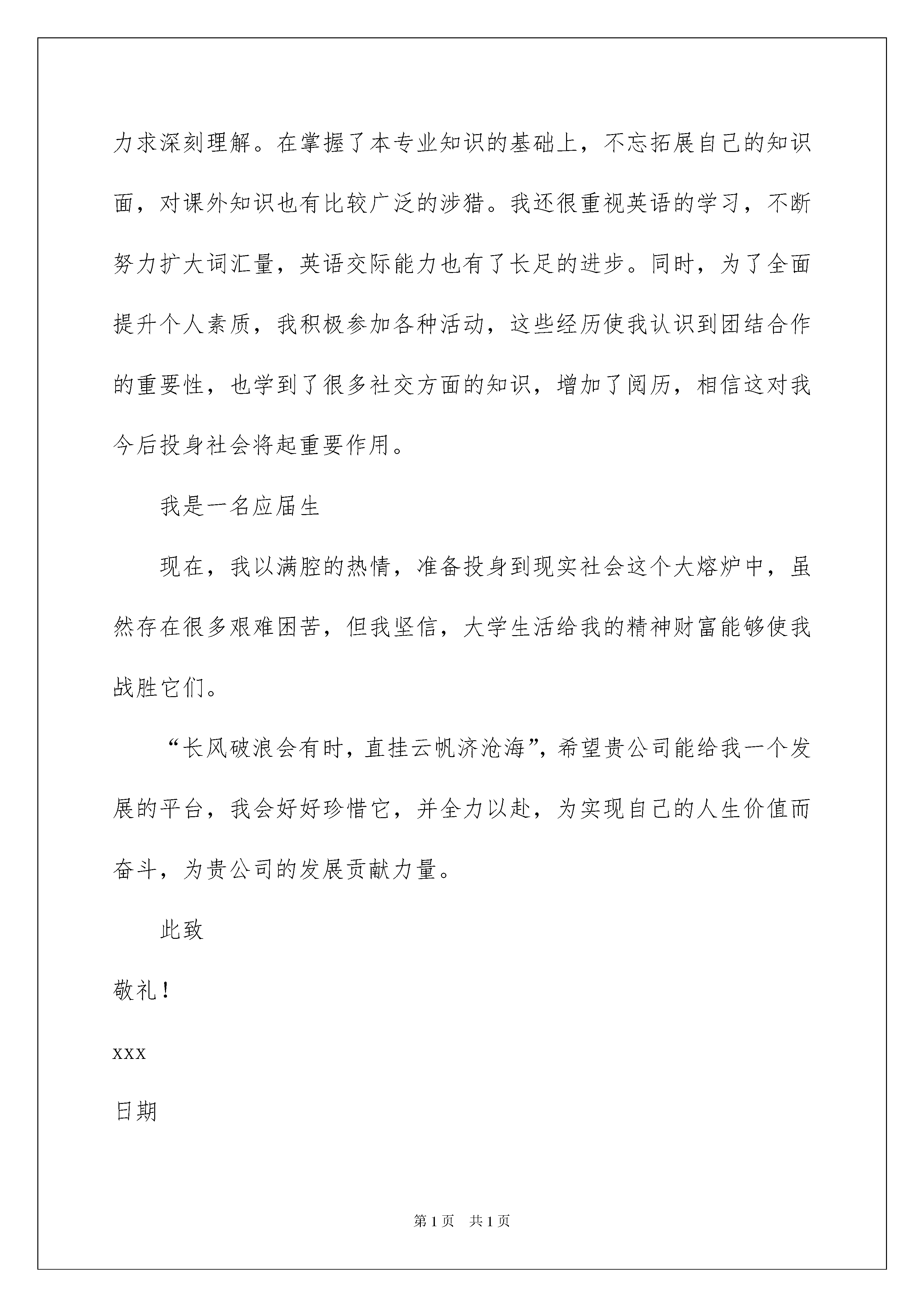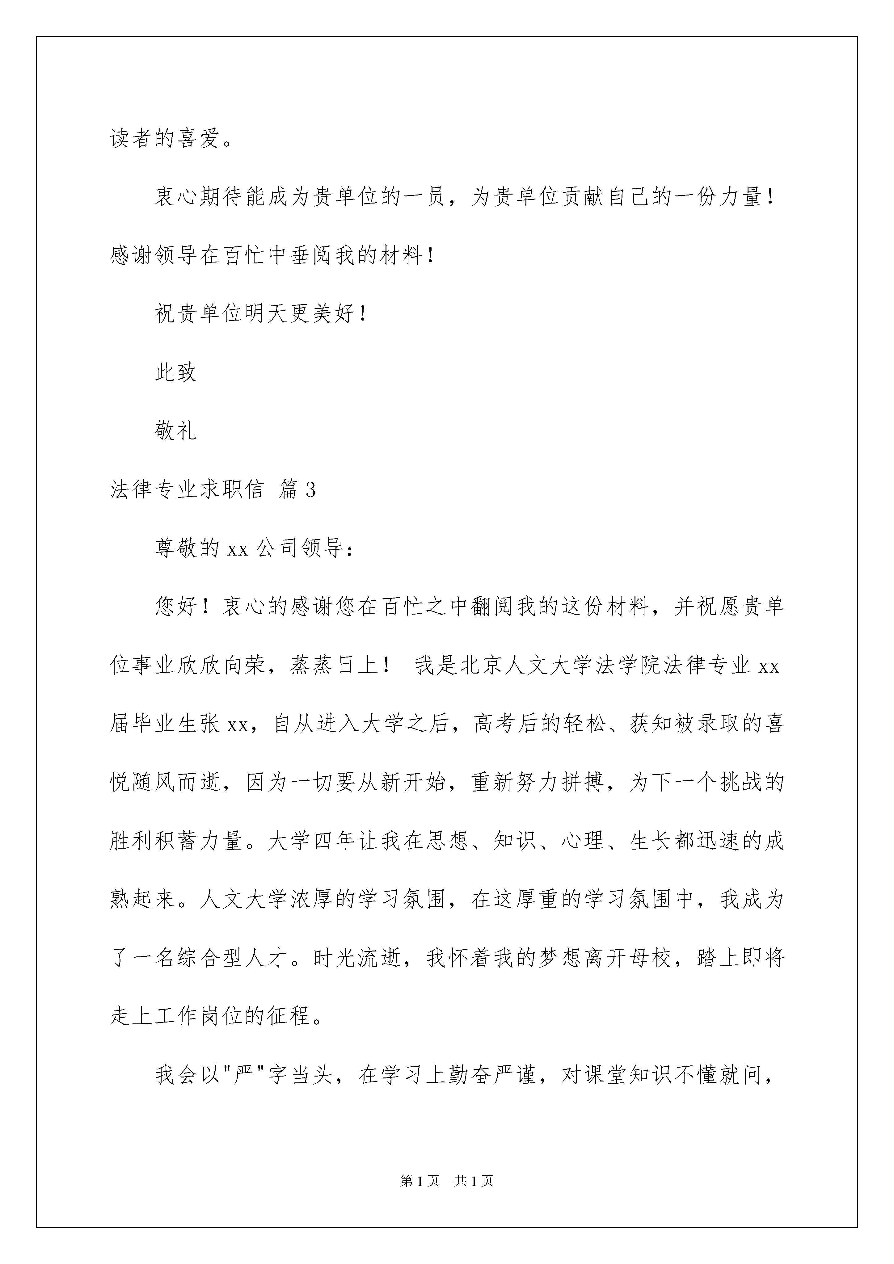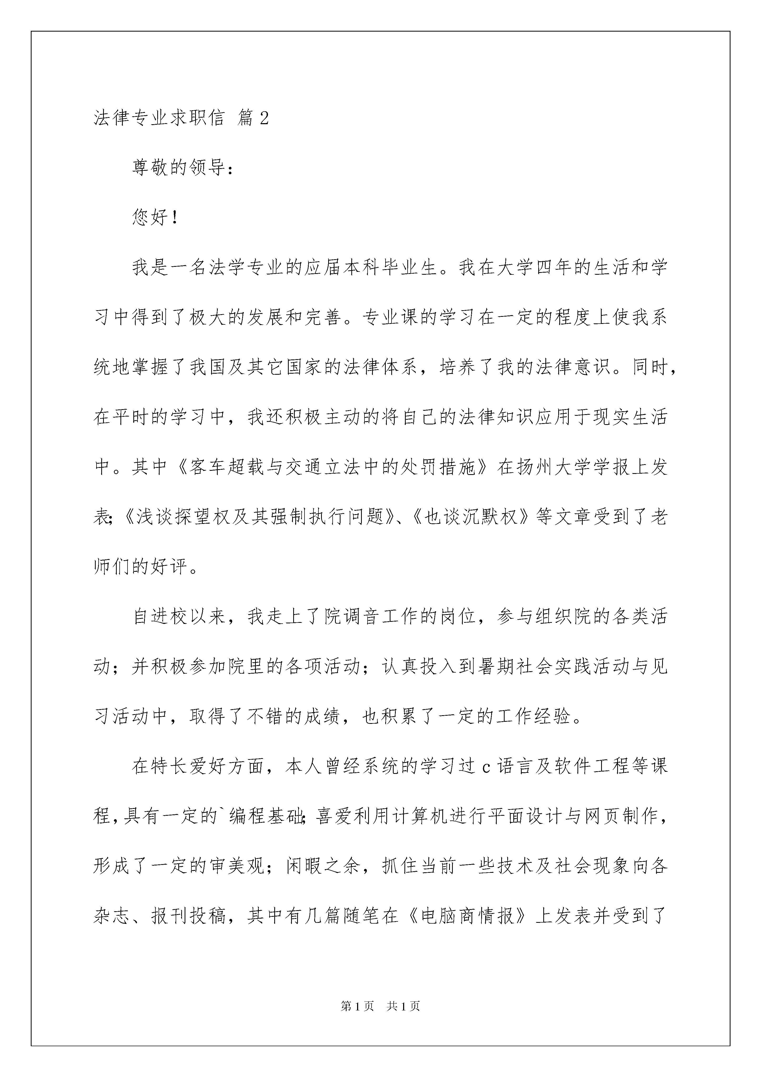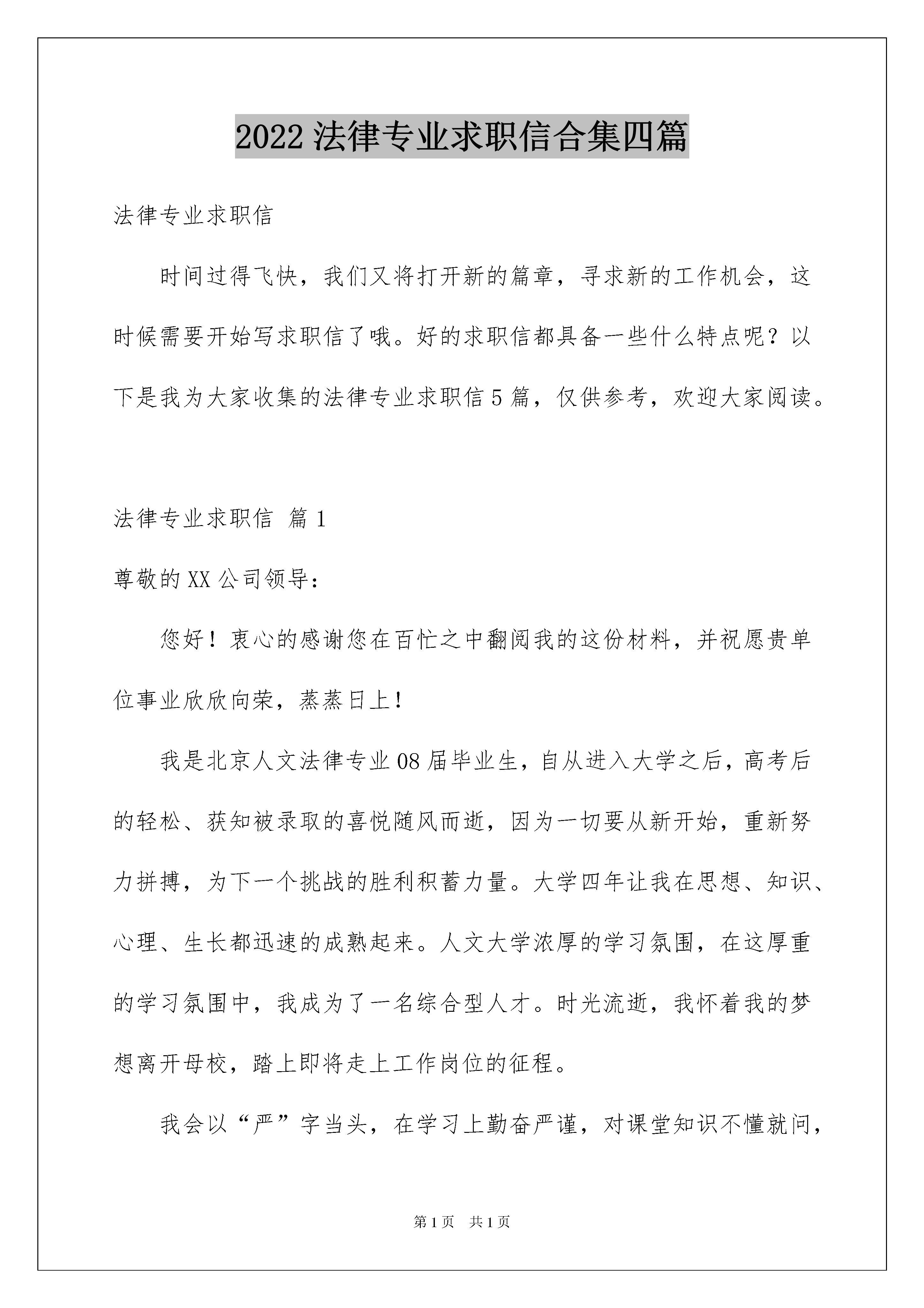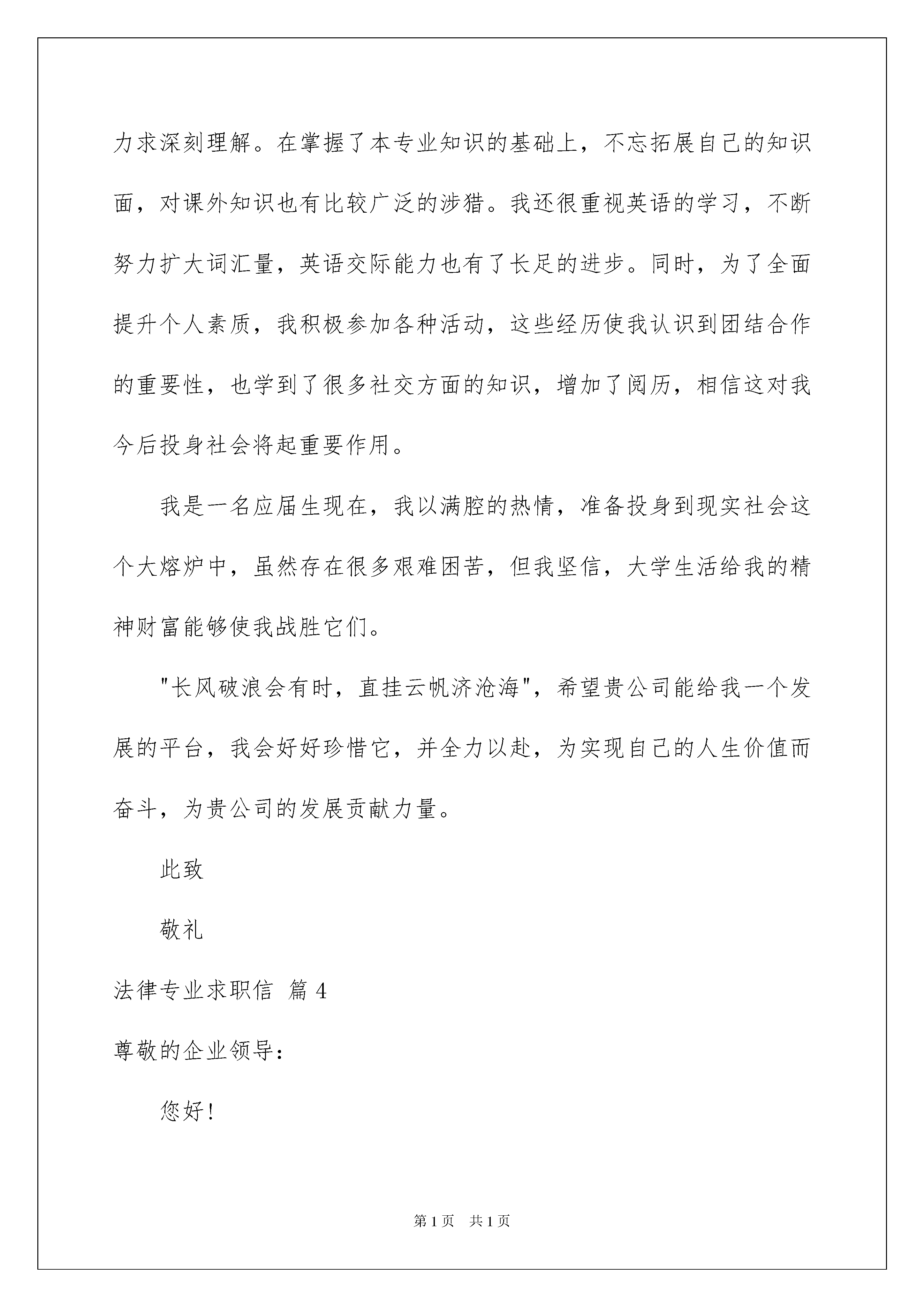 2022法律专业求职信合集四篇法律专业求职信时间过得飞快,我们又将打开新的篇章,寻求新的工作机会,这时候需要开始写求职信了哦。好的求职信都具备一些什么特点呢?以下是我为大家收集的法律专业求职信5篇,仅供参考,欢迎大家阅读。法律专业求职信篇1尊敬的XX公司领导:您好!衷心的感谢您在百忙之中翻阅我的这份材料,并祝愿贵单位事业欣欣向荣,蒸蒸日上!我是北京人文法律专业08届毕业生,自从进入大学之后,高考后的轻松、获知被录取的喜悦随风而逝,因为一切要从新开始,重新努力拼搏,为下一个挑战的胜利积蓄力量。大学四年让我在思想、知识、心理、生长都迅速的成熟起来。人文大学浓厚的学习氛围,在这厚重的学习氛围中,我成为了一名综合型人才。时光流逝,我怀着我的梦想离开母校,踏上即将走上工作岗位的征程。我会以“严”字当头,在学习上勤奋严谨,对课堂知识不懂就问,力求深刻理解。在掌握了本专业知识的基础上,不忘拓展自己的知识面,对课外知识也有比较广泛的涉猎。我还很重视英语的学习,不断努力扩大词汇量,英语交际能力也有了长足的进步。同时,为了全面提升个人素质,我积极参加各种活动,这些经历使我认识到团结合作的重要性,也学到了很多社交方面的知识,增加了阅历,相信这对我今后投身社会将起重要作用。我是一名应届生现在,我以满腔的热情,准备投身到现实社会这个大熔炉中,虽然存在很多艰难困苦,但我坚信,大学生活给我的精神财富能够使我战胜它们。“长风破浪会有时,直挂云帆济沧海”,希望贵公司能给我一个发展的平台,我会好好珍惜它,并全力以赴,为实现自己的人生价值而奋斗,为贵公司的发展贡献力量。此致敬礼!xxx日期法律专业求职信篇2尊敬的领导:您好!我是一名法学专业的应届本科毕业生。我在大学四年的生活和学习中得到了极大的发展和完善。专业课的学习在一定的程度上使我系统地掌握了我国及其它国家的法律体系,培养了我的法律意识。同时,在平时的学习中,我还积极主动的将自己的法律知识应用于现实生活中。其中《客车超载与交通立法中的处罚措施》在扬州大学学报上发表;《浅谈探望权及其强制执行问题》、《也谈沉默权》等文章受到了老师们的好评。自进校以来,我走上了院调音工作的岗位,参与组织院的各类活动;并积极参加院里的各项活动;认真投入到暑期社会实践活动与见习活动中,取得了不错的成绩,也积累了一定的工作经验。在特长爱好方面,本人曾经系统的学习过c语言及软件工程等课程,具有一定的`编程基础;喜爱利用计算机进行平面设计与网页制作,形成了一定的审美观;闲暇之余,抓住当前一些技术及社会现象向各杂志、报刊投稿,其中有几篇随笔在《电脑商情报》上发表并受到了读者的喜爱。衷心期待能成为贵单位的一员,为贵单位贡献自己的一份力量!感谢领导在百忙中垂阅我的材料!祝贵单位明天更美好!此致敬礼法律专业求职信篇3尊敬的xx公司领导:您好!衷心的感谢您在百忙之中翻阅我的这份材料,并祝愿贵单位事业欣欣向荣,蒸蒸日上!我是北京人文大学法学院法律专业xx届毕业生张xx,自从进入大学之后,高考后的轻松、获知被录取的喜悦随风而逝,因为一切要从新开始,重新努力拼搏,为下一个挑战的胜利积蓄力量。大学四年让我在思想、知识、心理、生长都迅速的成熟起来。人文大学浓厚的学习氛围,在这厚重的学习氛围中,我成为了一名综合型人才。时光流逝,我怀着我的梦想离开母校,踏上即将走上工作岗位的征程。我会以"严"字当头,在学习上勤奋严谨,对课堂知识不懂就问,力求深刻理解。在掌握了本专业知识的基础上,不忘拓展自己的知识面,对课外知识也有比较广泛的涉猎。我还很重视英语的学习,不断努力扩大词汇量,英语交际能力也有了长足的进步。同时,为了全面提升个人素质,我积极参加各种活动,这些经历使我认识到团结合作的重要性,也学到了很多社交方面的知识,增加了阅历,相信这对我今后投身社会将起重要作用。我是一名应届生现在,我以满腔的热情,准备投身到现实社会这个大熔炉中,虽然存在很多艰难困苦,但我坚信,大学生活给我的精神财富能够使我战胜它们。"长风破浪会有时,直挂云帆济沧海",希望贵公司能给我一个发展的平台,我会好好珍惜它,并全力以赴,为实现自己的人生价值而奋斗,为贵公司的发展贡献力量。此致敬礼法律专业求职信篇4尊敬的企业领导:您好!感谢您在百忙中翻阅我的求职信。据悉贵所正在招聘律师助理,特冒昧写信自荐。我是一名即将于20xx年6月毕业的大学本科毕业生,所学专业是法学。目前我的专业课程已基本完成,已获国家励志奖学金一次、专业一等奖学金两次、代表吉首大学法学院参加湘西州第六届公诉辩论赛并被评为“优秀辩手”一次、被评为法学院专业辩论赛“最佳辩手”一次。我已通过