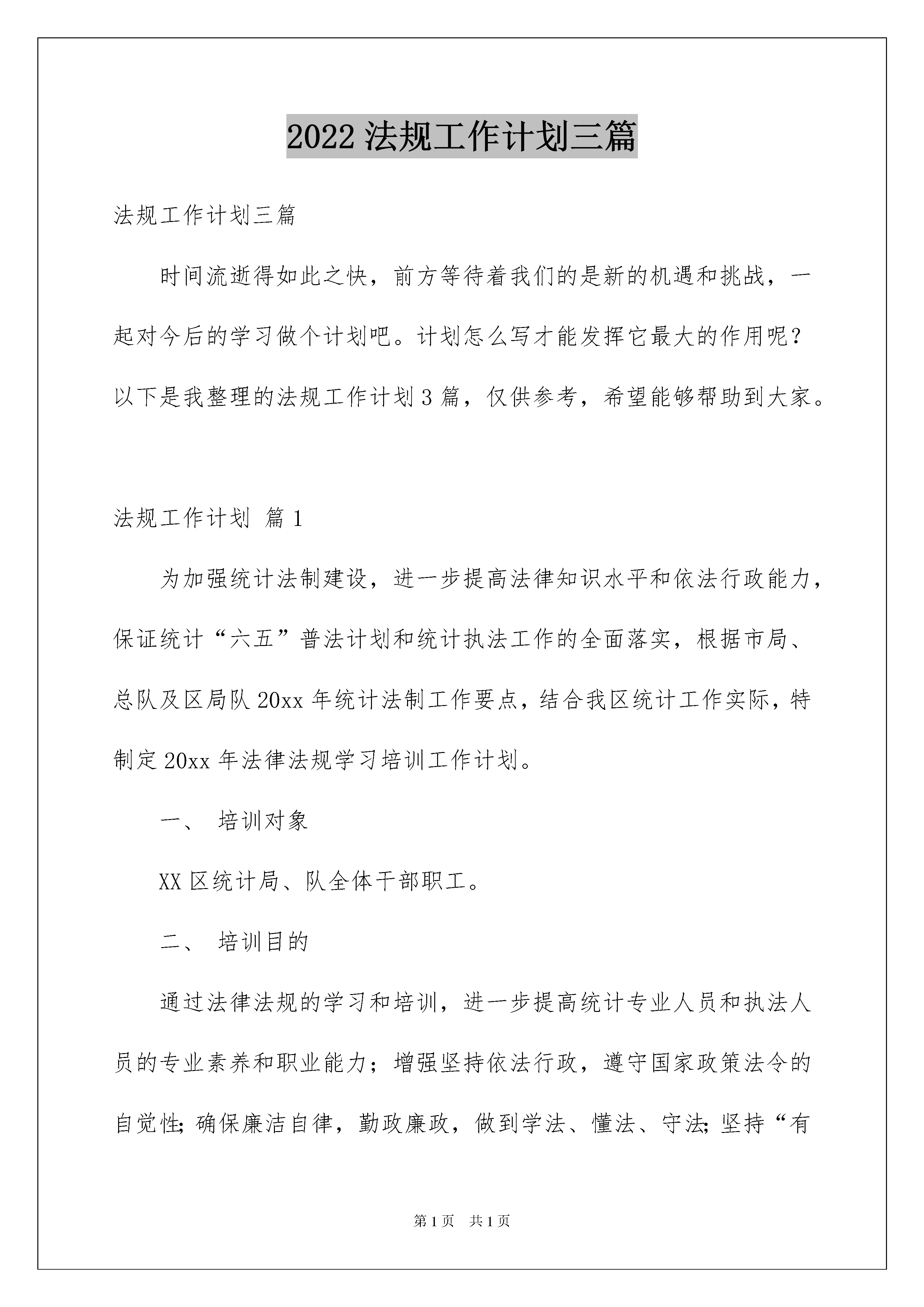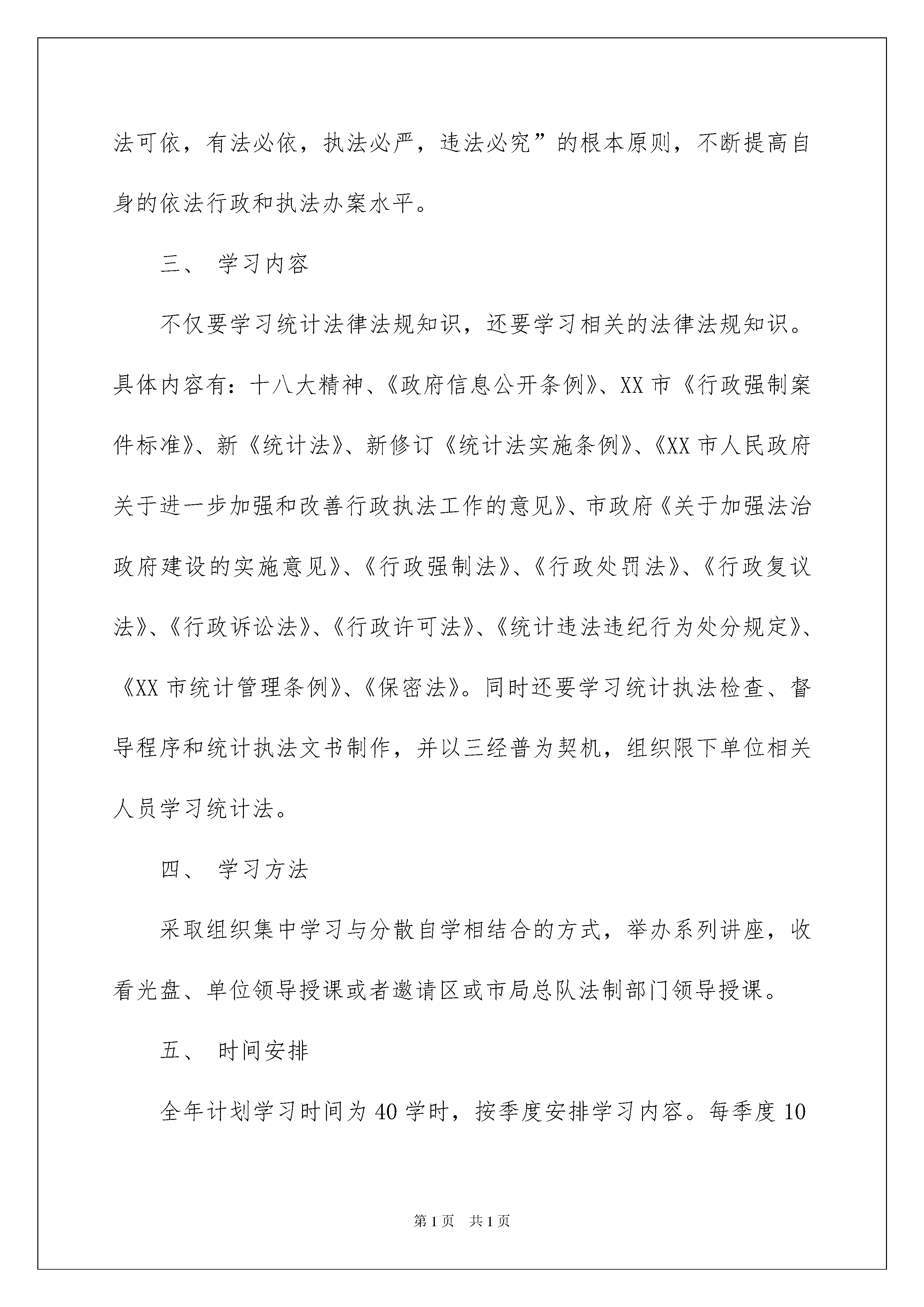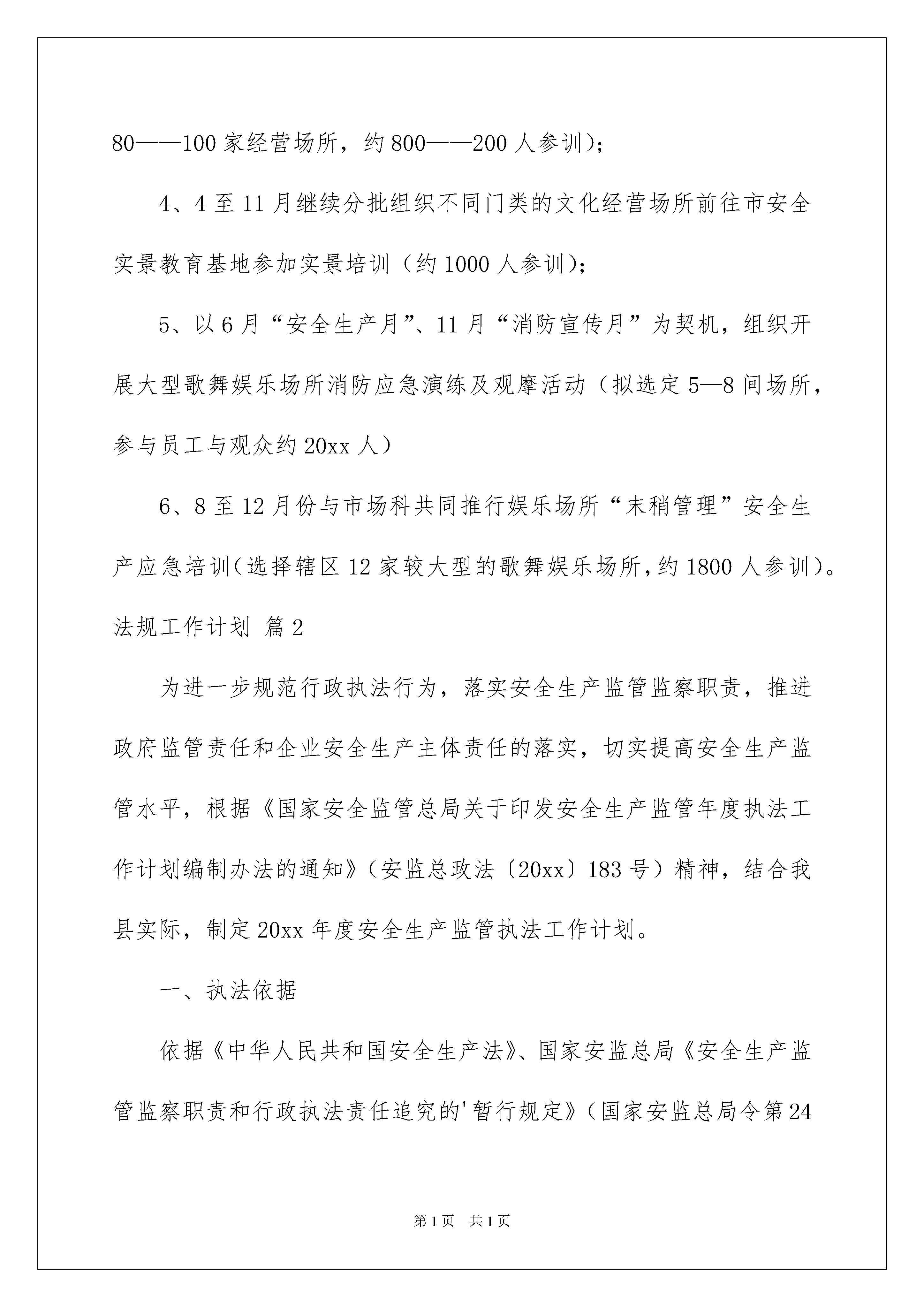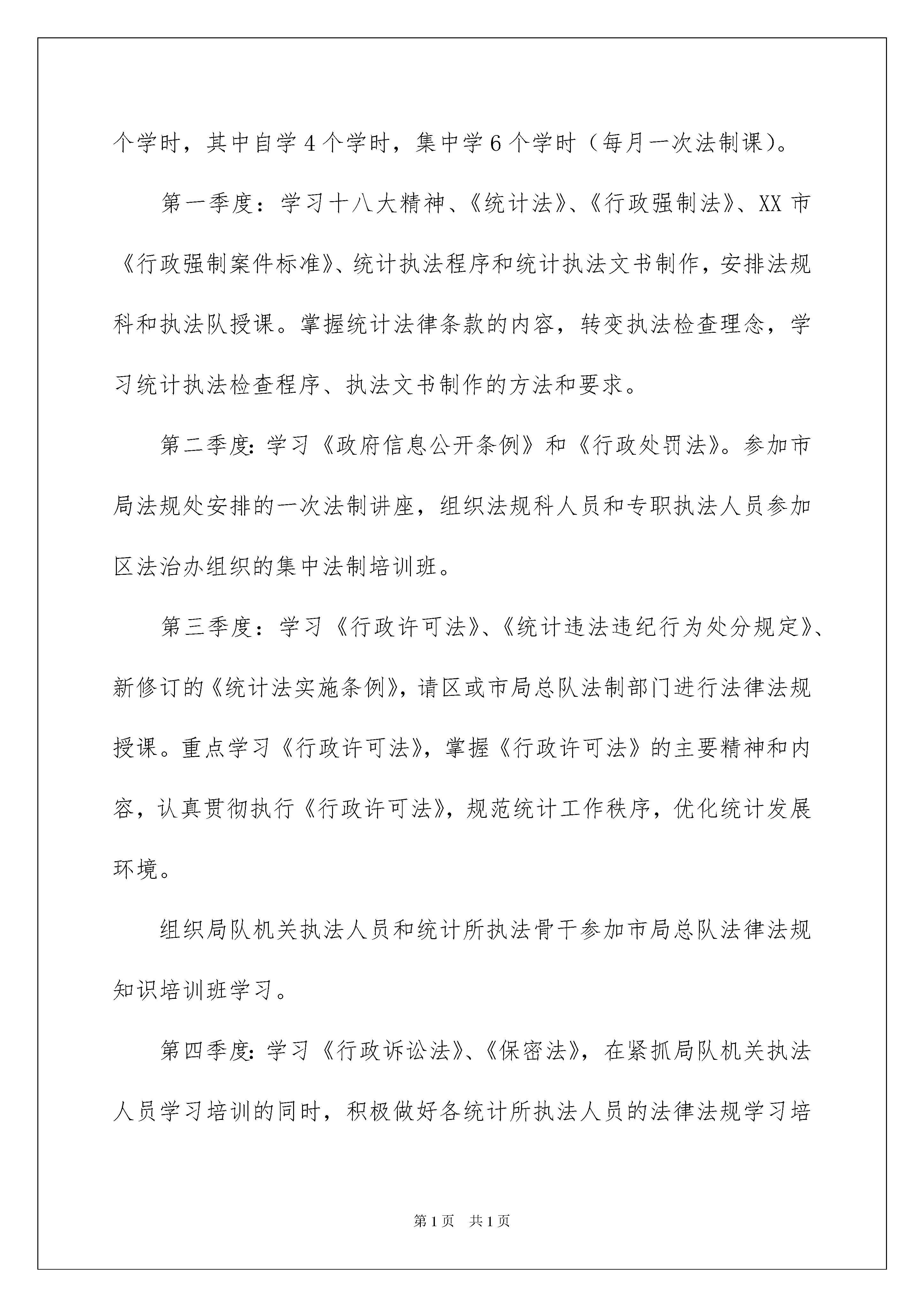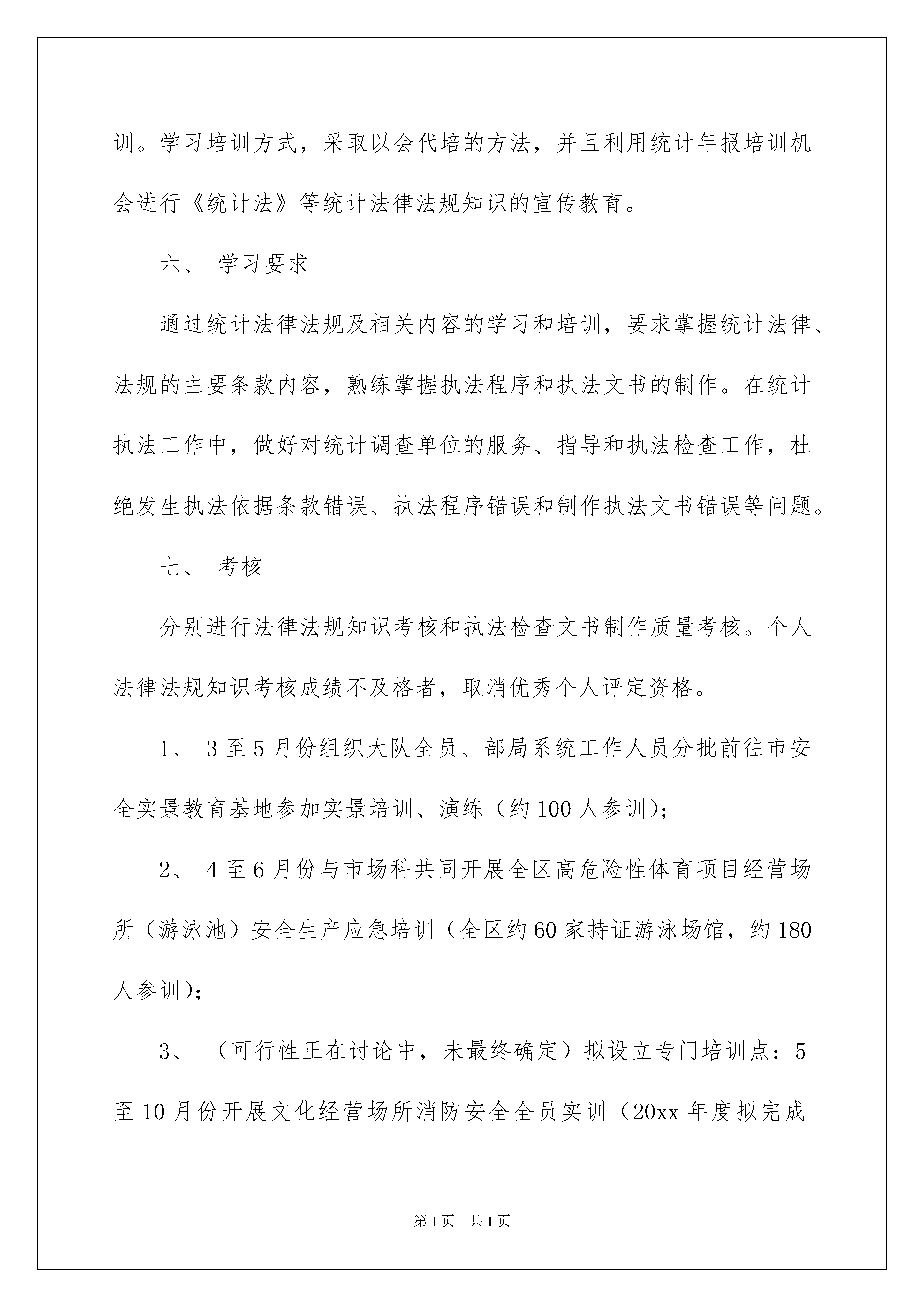 2022法规工作计划三篇法规工作计划三篇时间流逝得如此之快,前方等待着我们的是新的机遇和挑战,一起对今后的学习做个计划吧。计划怎么写才能发挥它最大的作用呢?以下是我整理的法规工作计划3篇,仅供参考,希望能够帮助到大家。法规工作计划篇1为加强统计法制建设,进一步提高法律知识水平和依法行政能力,保证统计“六五”普法计划和统计执法工作的全面落实,根据市局、总队及区局队20xx年统计法制工作要点,结合我区统计工作实际,特制定20xx年法律法规学习培训工作计划。一、培训对象XX区统计局、队全体干部职工。二、培训目的通过法律法规的学习和培训,进一步提高统计专业人员和执法人员的专业素养和职业能力;增强坚持依法行政,遵守国家政策法令的自觉性;确保廉洁自律,勤政廉政,做到学法、懂法、守法;坚持“有法可依,有法必依,执法必严,违法必究”的根本原则,不断提高自身的依法行政和执法办案水平。三、学习内容不仅要学习统计法律法规知识,还要学习相关的法律法规知识。具体内容有:十八大精神、《政府信息公开条例》、XX市《行政强制案件标准》、新《统计法》、新修订《统计法实施条例》、《XX市人民政府关于进一步加强和改善行政执法工作的意见》、市政府《关于加强法治政府建设的实施意见》、《行政强制法》、《行政处罚法》、《行政复议法》、《行政诉讼法》、《行政许可法》、《统计违法违纪行为处分规定》、《XX市统计管理条例》、《保密法》。同时还要学习统计执法检查、督导程序和统计执法文书制作,并以三经普为契机,组织限下单位相关人员学习统计法。四、学习方法采取组织集中学习与分散自学相结合的方式,举办系列讲座,收看光盘、单位领导授课或者邀请区或市局总队法制部门领导授课。五、时间安排全年计划学习时间为40学时,按季度安排学习内容。每季度10个学时,其中自学4个学时,集中学6个学时(每月一次法制课)。第一季度:学习十八大精神、《统计法》、《行政强制法》、XX市《行政强制案件标准》、统计执法程序和统计执法文书制作,安排法规科和执法队授课。掌握统计法律条款的内容,转变执法检查理念,学习统计执法检查程序、执法文书制作的方法和要求。第二季度:学习《政府信息公开条例》和《行政处罚法》。参加市局法规处安排的一次法制讲座,组织法规科人员和专职执法人员参加区法治办组织的集中法制培训班。第三季度:学习《行政许可法》、《统计违法违纪行为处分规定》、新修订的《统计法实施条例》,请区或市局总队法制部门进行法律法规授课。重点学习《行政许可法》,掌握《行政许可法》的主要精神和内容,认真贯彻执行《行政许可法》,规范统计工作秩序,优化统计发展环境。组织局队机关执法人员和统计所执法骨干参加市局总队法律法规知识培训班学习。第四季度:学习《行政诉讼法》、《保密法》,在紧抓局队机关执法人员学习培训的同时,积极做好各统计所执法人员的法律法规学习培训。学习培训方式,采取以会代培的方法,并且利用统计年报培训机会进行《统计法》等统计法律法规知识的宣传教育。六、学习要求通过统计法律法规及相关内容的学习和培训,要求掌握统计法律、法规的主要条款内容,熟练掌握执法程序和执法文书的制作。在统计执法工作中,做好对统计调查单位的服务、指导和执法检查工作,杜绝发生执法依据条款错误、执法程序错误和制作执法文书错误等问题。七、考核分别进行法律法规知识考核和执法检查文书制作质量考核。个人法律法规知识考核成绩不及格者,取消优秀个人评定资格。1、3至5月份组织大队全员、部局系统工作人员分批前往市安全实景教育基地参加实景培训、演练(约100人参训);2、4至6月份与市场科共同开展全区高危险性体育项目经营场所(游泳池)安全生产应急培训(全区约60家持证游泳场馆,约180人参训);3、(可行性正在讨论中,未最终确定)拟设立专门培训点:5至10月份开展文化经营场所消防安全全员实训(20xx年度拟完成80——100家经营场所,约800——200人参训);4、4至11月继续分批组织不同门类的文化经营场所前往市安全实景教育基地参加实景培训(约1000人参训);5、以6月“安全生产月”、11月“消防宣传月”为契机,组织开展大型歌舞娱乐场所消防应急演练及观摩活动(拟选定5—8间场所,参与员工与观众约20xx人)6、8至12月份与市场科共同推行娱乐场所“末稍管理”安全生产应急培训(选择辖区12家较大型的歌舞娱乐场所,约1800人参训)。法规工作计划篇2为进一步规范行政执法行为,落实安全生产监管监察职责,推进政府监管责任和企业安全生产主体责任的落实,切实提高安全生产监管水平,根据《国家安全监管总局关于印发安全生产监管年度执法工作