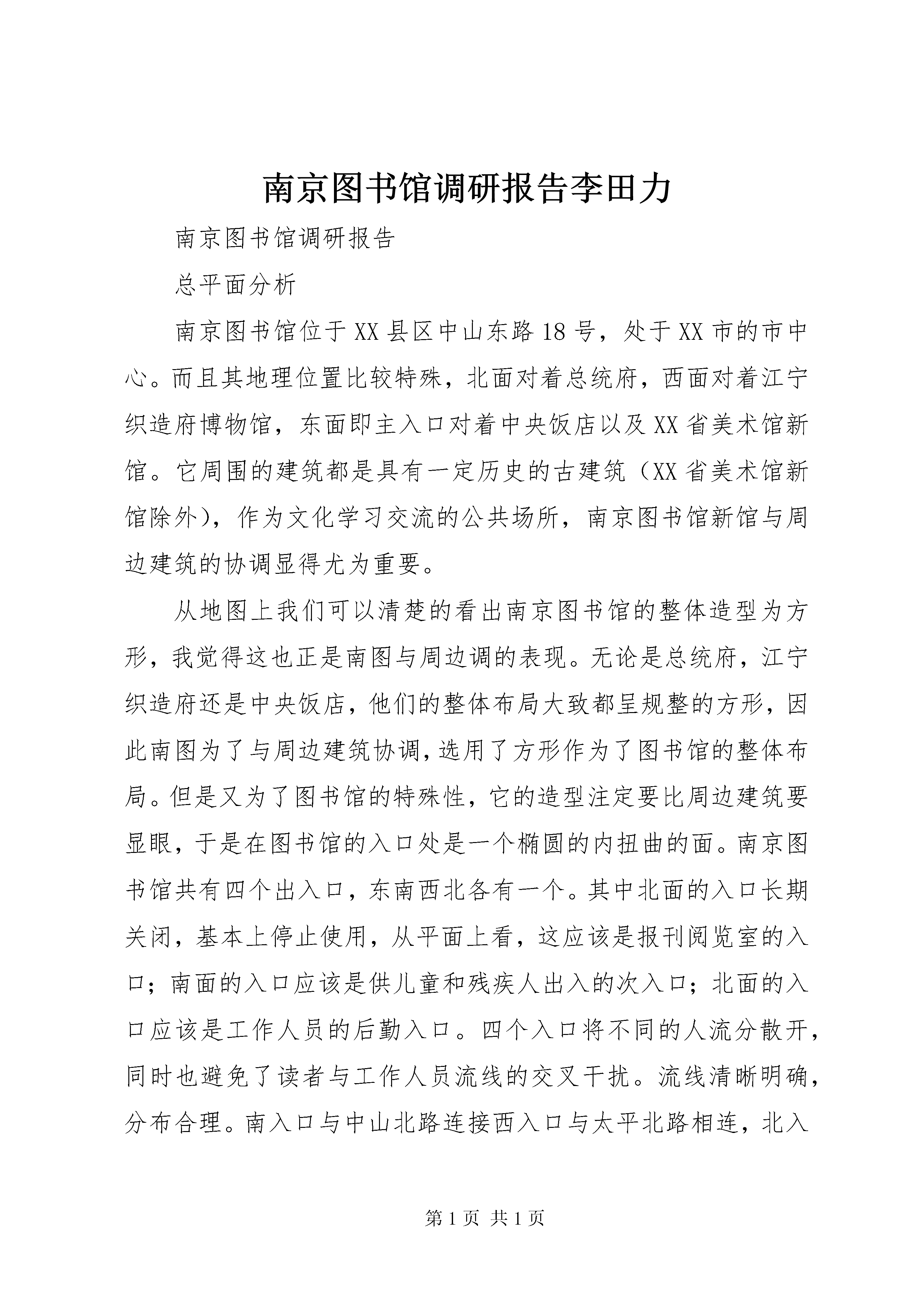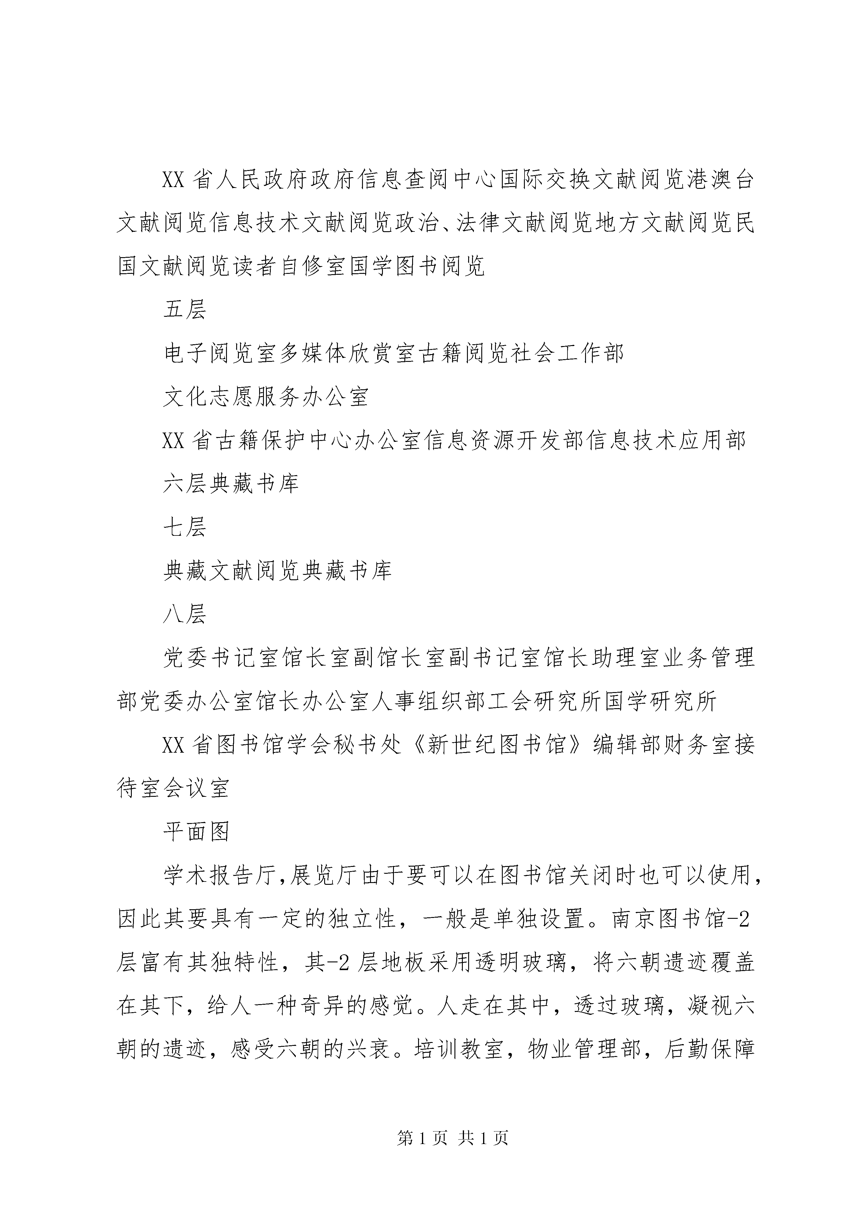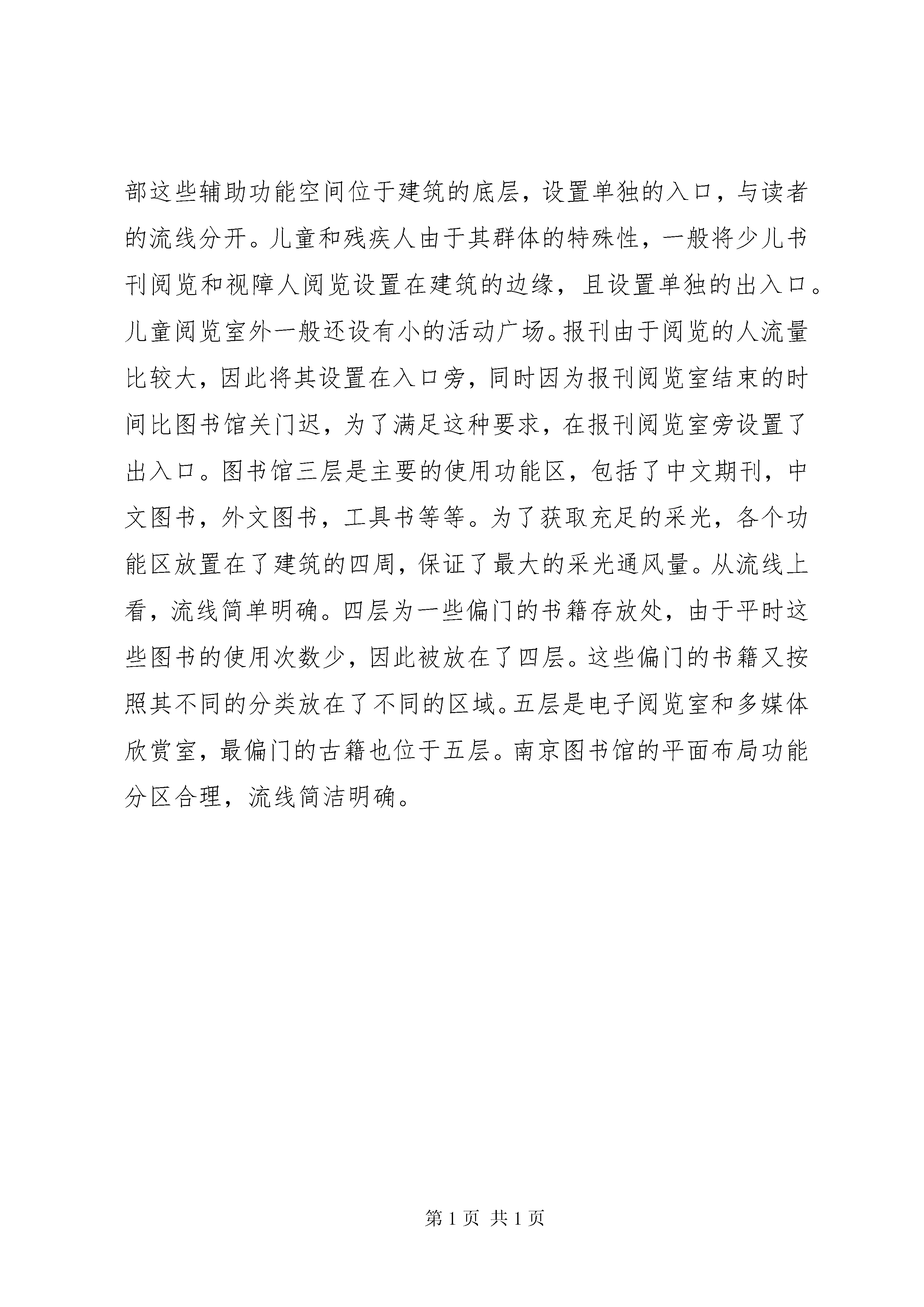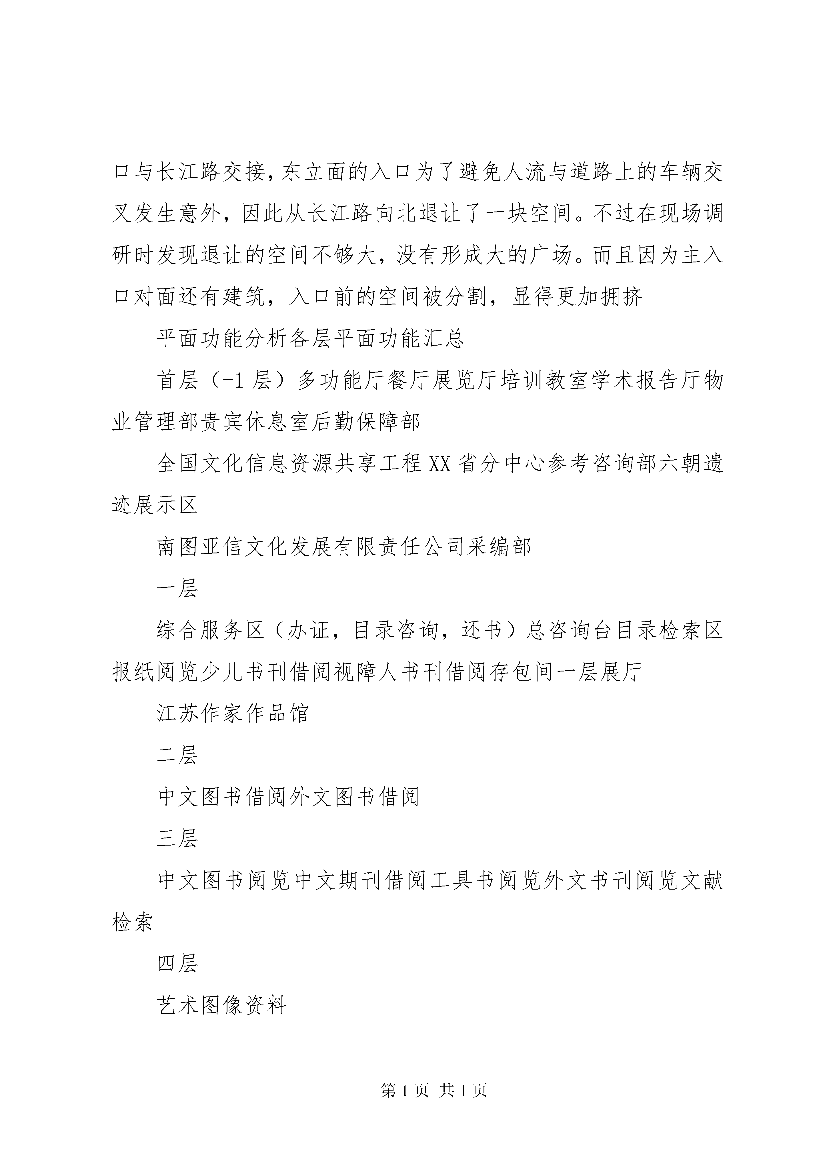 南京图书馆调研报告李田力南京图书馆调研报告总平面分析南京图书馆位于XX县区中山东路18号,处于XX市的市中心。而且其地理位置比较特殊,北面对着总统府,西面对着江宁织造府博物馆,东面即主入口对着中央饭店以及XX省美术馆新馆。它周围的建筑都是具有一定历史的古建筑(XX省美术馆新馆除外),作为文化学习交流的公共场所,南京图书馆新馆与周边建筑的协调显得尤为重要。从地图上我们可以清楚的看出南京图书馆的整体造型为方形,我觉得这也正是南图与周边调的表现。无论是总统府,江宁织造府还是中央饭店,他们的整体布局大致都呈规整的方形,因此南图为了与周边建筑协调,选用了方形作为了图书馆的整体布局。但是又为了图书馆的特殊性,它的造型注定要比周边建筑要显眼,于是在图书馆的入口处是一个椭圆的内扭曲的面。南京图书馆共有四个出入口,东南西北各有一个。其中北面的入口长期关闭,基本上停止使用,从平面上看,这应该是报刊阅览室的入口;南面的入口应该是供儿童和残疾人出入的次入口;北面的入口应该是工作人员的后勤入口。四个入口将不同的人流分散开,同时也避免了读者与工作人员流线的交叉干扰。流线清晰明确,分布合理。南入口与中山北路连接西入口与太平北路相连,北入口与长江路交接,东立面的入口为了避免人流与道路上的车辆交叉发生意外,因此从长江路向北退让了一块空间。不过在现场调研时发现退让的空间不够大,没有形成大的广场。而且因为主入口对面还有建筑,入口前的空间被分割,显得更加拥挤平面功能分析各层平面功能汇总首层(-1层)多功能厅餐厅展览厅培训教室学术报告厅物业管理部贵宾休息室后勤保障部全国文化信息资源共享工程XX省分中心参考咨询部六朝遗迹展示区南图亚信文化发展有限责任公司采编部一层综合服务区(办证,目录咨询,还书)总咨询台目录检索区报纸阅览少儿书刊借阅视障人书刊借阅存包间一层展厅江苏作家作品馆二层中文图书借阅外文图书借阅三层中文图书阅览中文期刊借阅工具书阅览外文书刊阅览文献检索四层艺术图像资料XX省人民政府政府信息查阅中心国际交换文献阅览港澳台文献阅览信息技术文献阅览政治、法律文献阅览地方文献阅览民国文献阅览读者自修室国学图书阅览五层电子阅览室多媒体欣赏室古籍阅览社会工作部文化志愿服务办公室XX省古籍保护中心办公室信息资源开发部信息技术应用部六层典藏书库七层典藏文献阅览典藏书库八层党委书记室馆长室副馆长室副书记室馆长助理室业务管理部党委办公室馆长办公室人事组织部工会研究所国学研究所XX省图书馆学会秘书处《新世纪图书馆》编辑部财务室接待室会议室平面图学术报告厅,展览厅由于要可以在图书馆关闭时也可以使用,因此其要具有一定的独立性,一般是单独设置。南京图书馆-2层富有其独特性,其-2层地板采用透明玻璃,将六朝遗迹覆盖在其下,给人一种奇异的感觉。人走在其中,透过玻璃,凝视六朝的遗迹,感受六朝的兴衰。培训教室,物业管理部,后勤保障部这些辅助功能空间位于建筑的底层,设置单独的入口,与读者的流线分开。儿童和残疾人由于其群体的特殊性,一般将少儿书刊阅览和视障人阅览设置在建筑的边缘,且设置单独的出入口。儿童阅览室外一般还设有小的活动广场。报刊由于阅览的人流量比较大,因此将其设置在入口旁,同时因为报刊阅览室结束的时间比图书馆关门迟,为了满足这种要求,在报刊阅览室旁设置了出入口。图书馆三层是主要的使用功能区,包括了中文期刊,中文图书,外文图书,工具书等等。为了获取充足的采光,各个功能区放置在了建筑的四周,保证了最大的采光通风量。从流线上看,流线简单明确。四层为一些偏门的书籍存放处,由于平时这些图书的使用次数少,因此被放在了四层。这些偏门的书籍又按照其不同的分类放在了不同的区域。五层是电子阅览室和多媒体欣赏室,最偏门的古籍也位于五层。南京图书馆的平面布局功能分区合理,流线简洁明确。