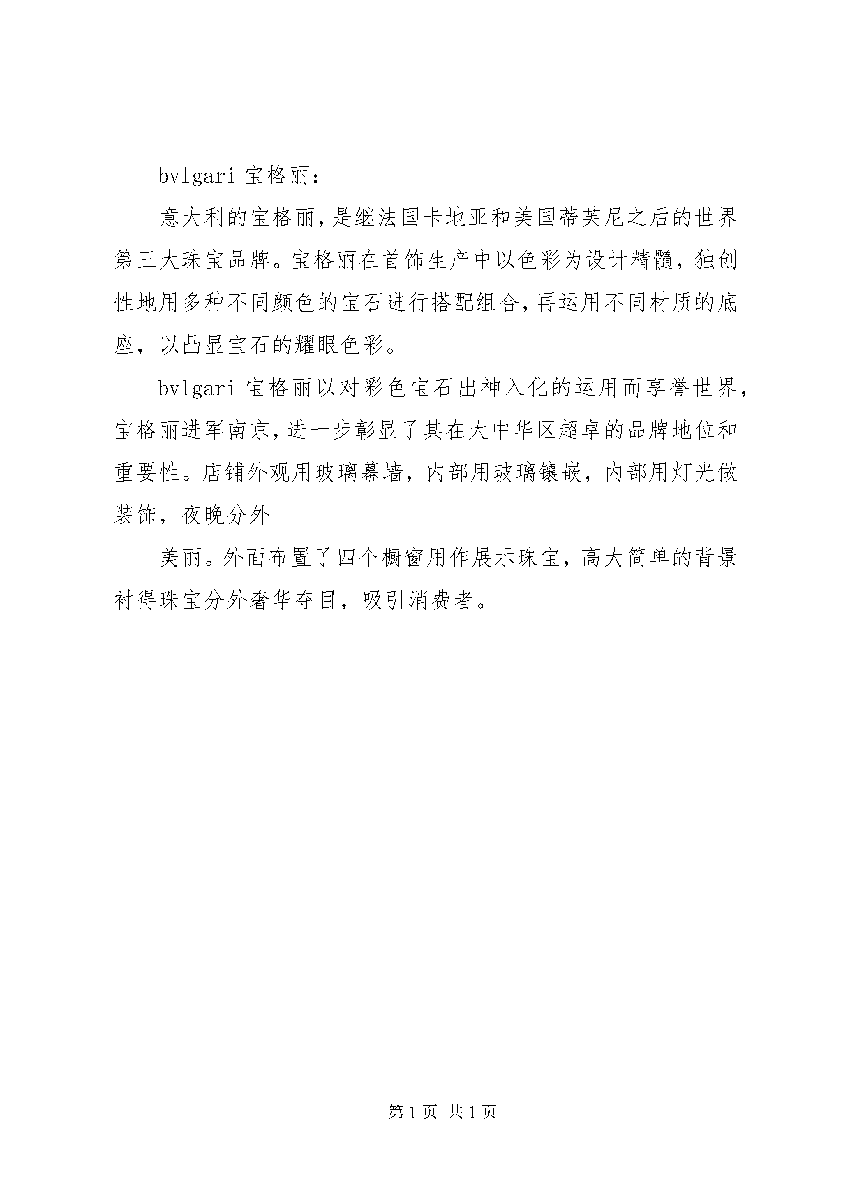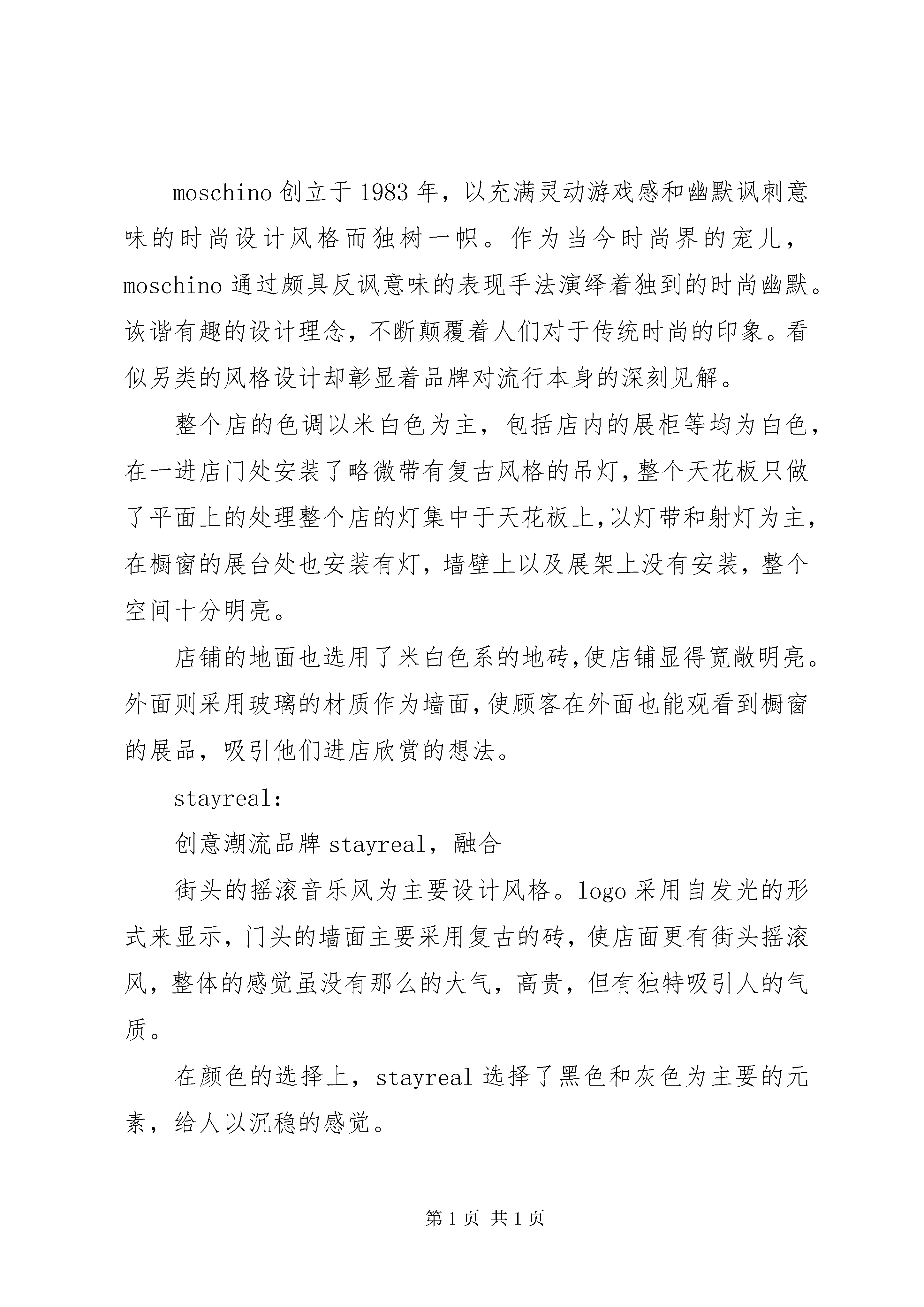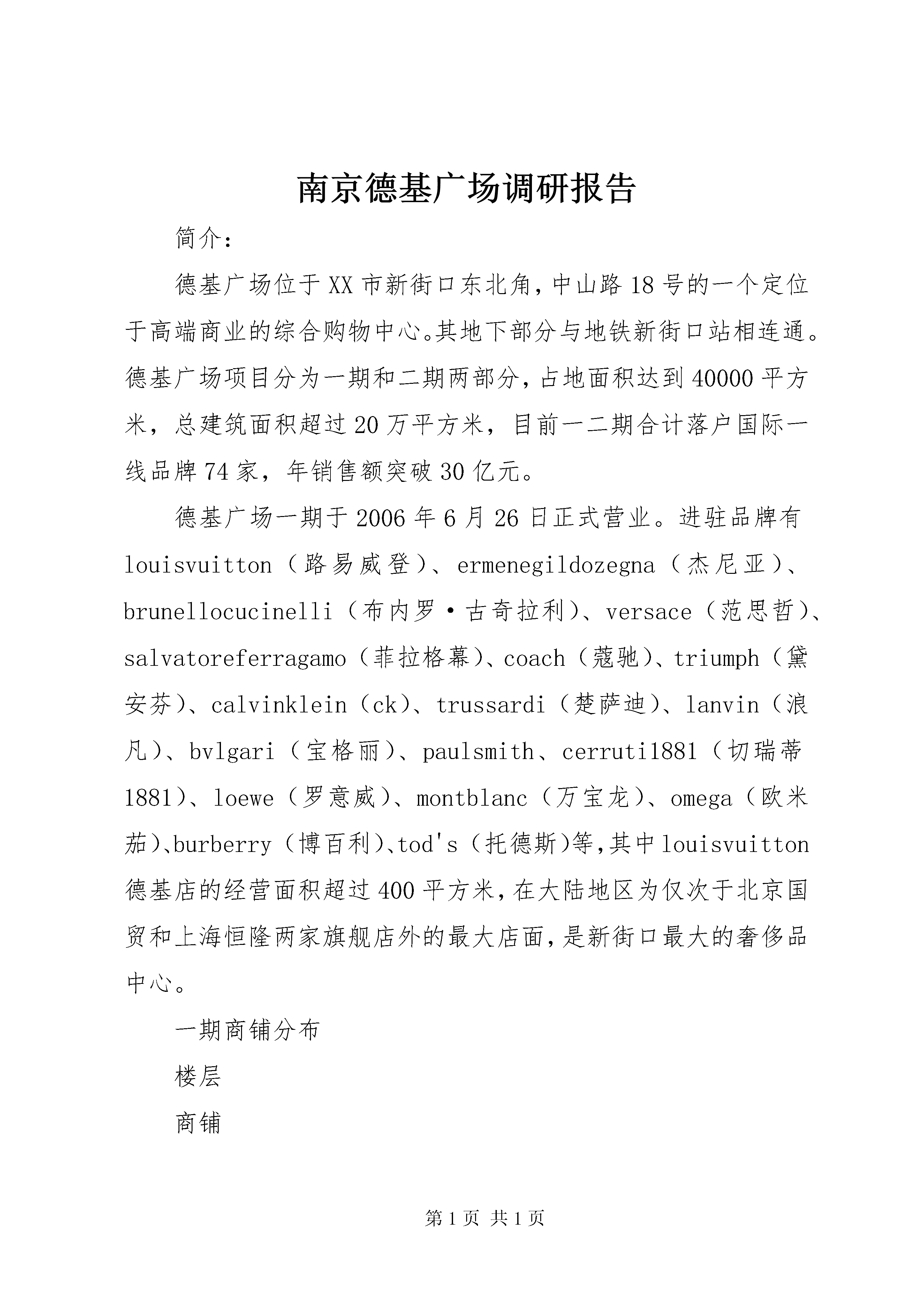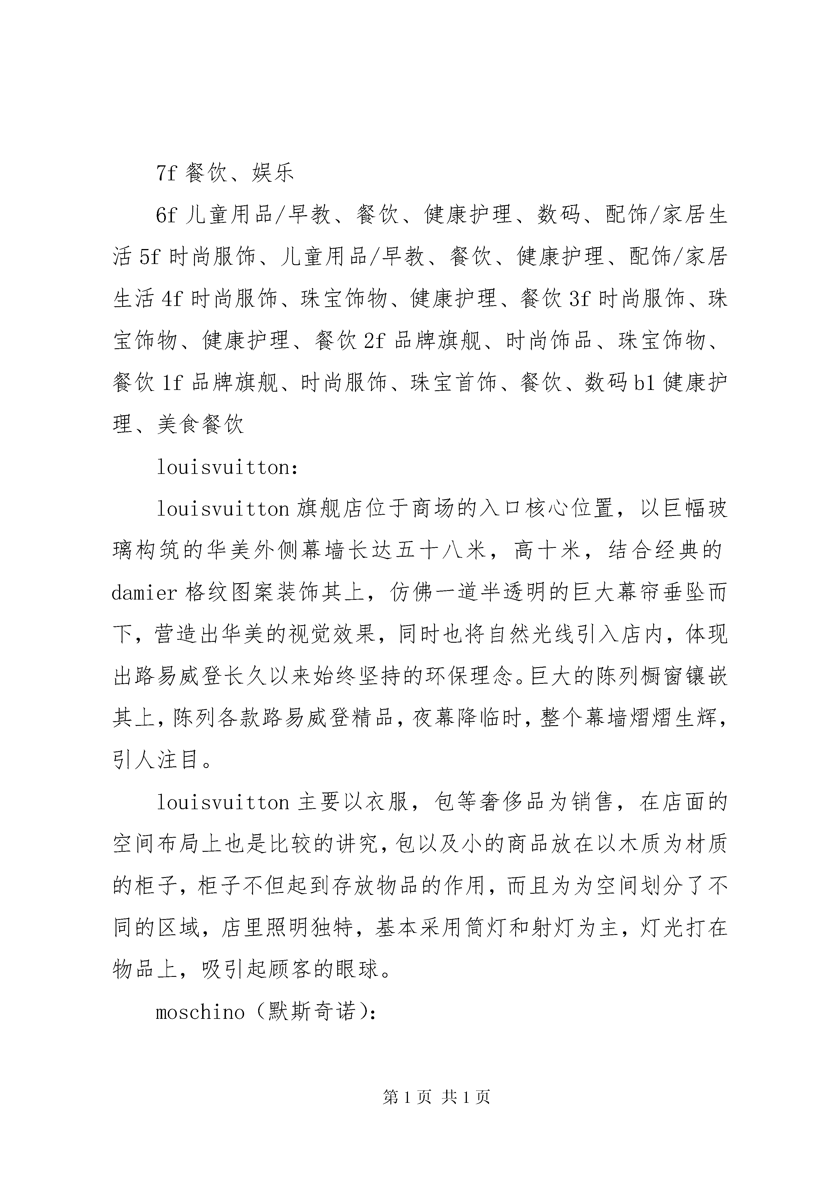 南京德基广场调研报告简介:德基广场位于XX市新街口东北角,中山路18号的一个定位于高端商业的综合购物中心。其地下部分与地铁新街口站相连通。德基广场项目分为一期和二期两部分,占地面积达到40000平方米,总建筑面积超过20万平方米,目前一二期合计落户国际一线品牌74家,年销售额突破30亿元。德基广场一期于2006年6月26日正式营业。进驻品牌有louisvuitton(路易威登)、ermenegildozegna(杰尼亚)、brunellocucinelli(布内罗·古奇拉利)、versace(范思哲)、salvatoreferragamo(菲拉格幕)、coach(蔻驰)、triumph(黛安芬)、calvinklein(ck)、trussardi(楚萨迪)、lanvin(浪凡)、bvlgari(宝格丽)、paulsmith、cerruti1881(切瑞蒂1881)、loewe(罗意威)、montblanc(万宝龙)、omega(欧米茄)、burberry(博百利)、tod's(托德斯)等,其中louisvuitton德基店的经营面积超过400平方米,在大陆地区为仅次于北京国贸和上海恒隆两家旗舰店外的最大店面,是新街口最大的奢侈品中心。一期商铺分布楼层商铺7f餐饮、娱乐6f儿童用品/早教、餐饮、健康护理、数码、配饰/家居生活5f时尚服饰、儿童用品/早教、餐饮、健康护理、配饰/家居生活4f时尚服饰、珠宝饰物、健康护理、餐饮3f时尚服饰、珠宝饰物、健康护理、餐饮2f品牌旗舰、时尚饰品、珠宝饰物、餐饮1f品牌旗舰、时尚服饰、珠宝首饰、餐饮、数码b1健康护理、美食餐饮louisvuitton:louisvuitton旗舰店位于商场的入口核心位置,以巨幅玻璃构筑的华美外侧幕墙长达五十八米,高十米,结合经典的damier格纹图案装饰其上,仿佛一道半透明的巨大幕帘垂坠而下,营造出华美的视觉效果,同时也将自然光线引入店内,体现出路易威登长久以来始终坚持的环保理念。巨大的陈列橱窗镶嵌其上,陈列各款路易威登精品,夜幕降临时,整个幕墙熠熠生辉,引人注目。louisvuitton主要以衣服,包等奢侈品为销售,在店面的空间布局上也是比较的讲究,包以及小的商品放在以木质为材质的柜子,柜子不但起到存放物品的作用,而且为为空间划分了不同的区域,店里照明独特,基本采用筒灯和射灯为主,灯光打在物品上,吸引起顾客的眼球。moschino(默斯奇诺):moschino创立于1983年,以充满灵动游戏感和幽默讽刺意味的时尚设计风格而独树一帜。作为当今时尚界的宠儿,moschino通过颇具反讽意味的表现手法演绎着独到的时尚幽默。诙谐有趣的设计理念,不断颠覆着人们对于传统时尚的印象。看似另类的风格设计却彰显着品牌对流行本身的深刻见解。整个店的色调以米白色为主,包括店内的展柜等均为白色,在一进店门处安装了略微带有复古风格的吊灯,整个天花板只做了平面上的处理整个店的灯集中于天花板上,以灯带和射灯为主,在橱窗的展台处也安装有灯,墙壁上以及展架上没有安装,整个空间十分明亮。店铺的地面也选用了米白色系的地砖,使店铺显得宽敞明亮。外面则采用玻璃的材质作为墙面,使顾客在外面也能观看到橱窗的展品,吸引他们进店欣赏的想法。stayreal:创意潮流品牌stayreal,融合街头的摇滚音乐风为主要设计风格。logo采用自发光的形式来显示,门头的墙面主要采用复古的砖,使店面更有街头摇滚风,整体的感觉虽没有那么的大气,高贵,但有独特吸引人的气质。在颜色的选择上,stayreal选择了黑色和灰色为主要的元素,给人以沉稳的感觉。bvlgari宝格丽:意大利的宝格丽,是继法国卡地亚和美国蒂芙尼之后的世界第三大珠宝品牌。宝格丽在首饰生产中以色彩为设计精髓,独创性地用多种不同颜色的宝石进行搭配组合,再运用不同材质的底座,以凸显宝石的耀眼色彩。bvlgari宝格丽以对彩色宝石出神入化的运用而享誉世界,宝格丽进军南京,进一步彰显了其在大中华区超卓的品牌地位和重要性。店铺外观用玻璃幕墙,内部用玻璃镶嵌,内部用灯光做装饰,夜晚分外美丽。外面布置了四个橱窗用作展示珠宝,高大简单的背景衬得珠宝分外奢华夺目,吸引消费者。