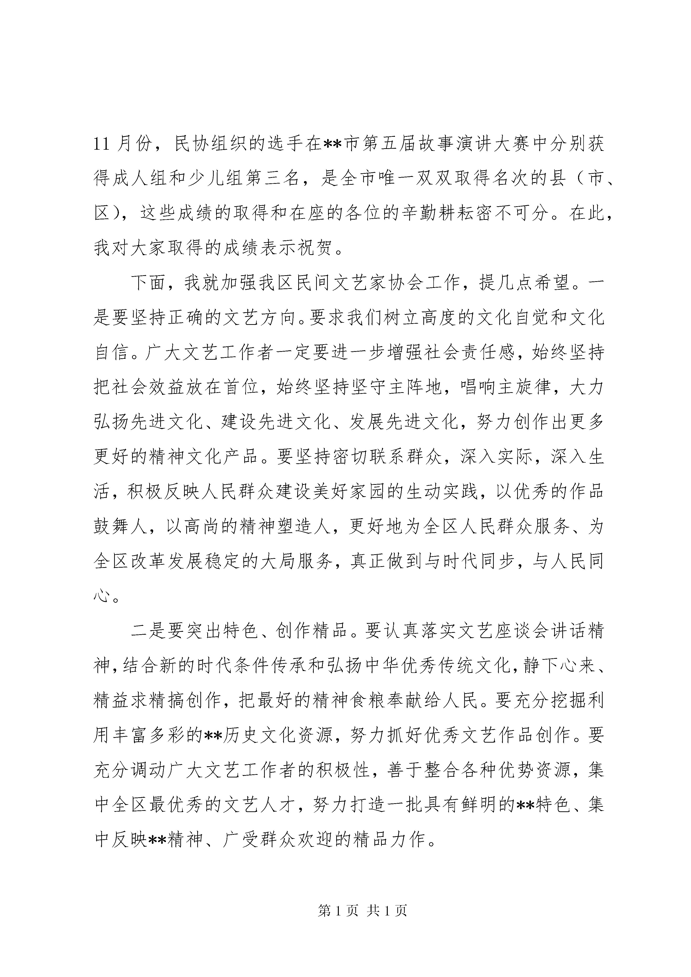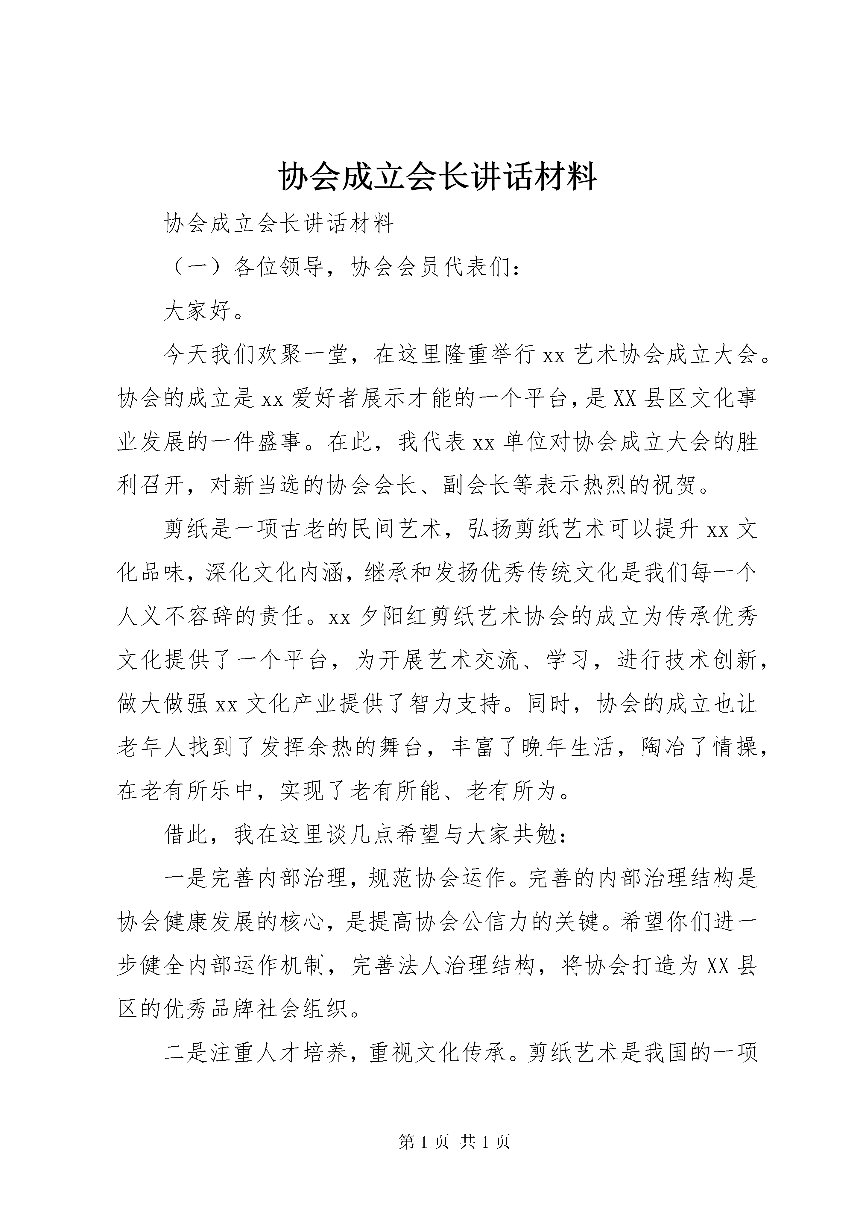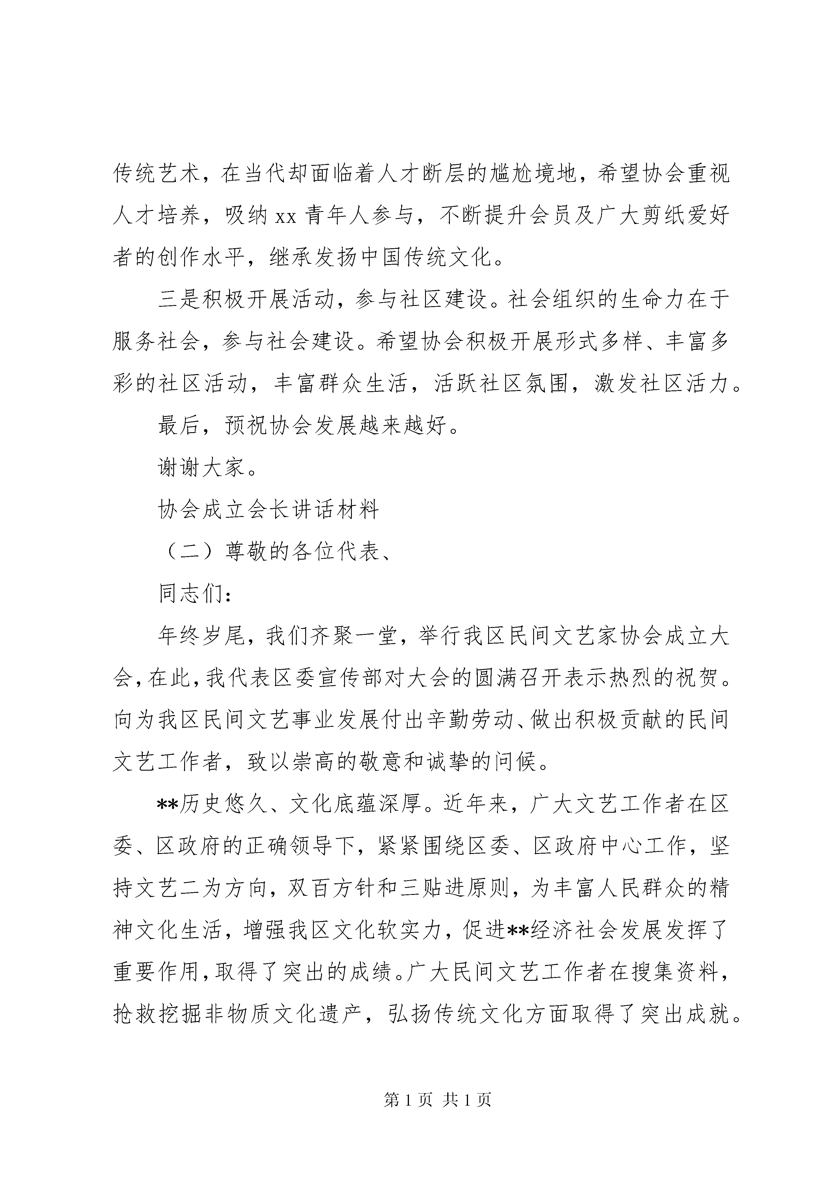 协会成立会长讲话材料协会成立会长讲话材料(一)各位领导,协会会员代表们:大家好。今天我们欢聚一堂,在这里隆重举行xx艺术协会成立大会。协会的成立是xx爱好者展示才能的一个平台,是XX县区文化事业发展的一件盛事。在此,我代表xx单位对协会成立大会的胜利召开,对新当选的协会会长、副会长等表示热烈的祝贺。剪纸是一项古老的民间艺术,弘扬剪纸艺术可以提升xx文化品味,深化文化内涵,继承和发扬优秀传统文化是我们每一个人义不容辞的责任。xx夕阳红剪纸艺术协会的成立为传承优秀文化提供了一个平台,为开展艺术交流、学习,进行技术创新,做大做强xx文化产业提供了智力支持。同时,协会的成立也让老年人找到了发挥余热的舞台,丰富了晚年生活,陶冶了情操,在老有所乐中,实现了老有所能、老有所为。借此,我在这里谈几点希望与大家共勉:一是完善内部治理,规范协会运作。完善的内部治理结构是协会健康发展的核心,是提高协会公信力的关键。希望你们进一步健全内部运作机制,完善法人治理结构,将协会打造为XX县区的优秀品牌社会组织。二是注重人才培养,重视文化传承。剪纸艺术是我国的一项传统艺术,在当代却面临着人才断层的尴尬境地,希望协会重视人才培养,吸纳xx青年人参与,不断提升会员及广大剪纸爱好者的创作水平,继承发扬中国传统文化。三是积极开展活动,参与社区建设。社会组织的生命力在于服务社会,参与社会建设。希望协会积极开展形式多样、丰富多彩的社区活动,丰富群众生活,活跃社区氛围,激发社区活力。最后,预祝协会发展越来越好。谢谢大家。协会成立会长讲话材料(二)尊敬的各位代表、同志们:年终岁尾,我们齐聚一堂,举行我区民间文艺家协会成立大会,在此,我代表区委宣传部对大会的圆满召开表示热烈的祝贺。向为我区民间文艺事业发展付出辛勤劳动、做出积极贡献的民间文艺工作者,致以崇高的敬意和诚挚的问候。**历史悠久、文化底蕴深厚。近年来,广大文艺工作者在区委、区政府的正确领导下,紧紧围绕区委、区政府中心工作,坚持文艺二为方向,双百方针和三贴进原则,为丰富人民群众的精神文化生活,增强我区文化软实力,促进**经济社会发展发挥了重要作用,取得了突出的成绩。广大民间文艺工作者在搜集资料,抢救挖掘非物质文化遗产,弘扬传统文化方面取得了突出成就。11月份,民协组织的选手在**市第五届故事演讲大赛中分别获得成人组和少儿组第三名,是全市唯一双双取得名次的县(市、区),这些成绩的取得和在座的各位的辛勤耕耘密不可分。在此,我对大家取得的成绩表示祝贺。下面,我就加强我区民间文艺家协会工作,提几点希望。一是要坚持正确的文艺方向。要求我们树立高度的文化自觉和文化自信。广大文艺工作者一定要进一步增强社会责任感,始终坚持把社会效益放在首位,始终坚持坚守主阵地,唱响主旋律,大力弘扬先进文化、建设先进文化、发展先进文化,努力创作出更多更好的精神文化产品。要坚持密切联系群众,深入实际,深入生活,积极反映人民群众建设美好家园的生动实践,以优秀的作品鼓舞人,以高尚的精神塑造人,更好地为全区人民群众服务、为全区改革发展稳定的大局服务,真正做到与时代同步,与人民同心。二是要突出特色、创作精品。要认真落实文艺座谈会讲话精神,结合新的时代条件传承和弘扬中华优秀传统文化,静下心来、精益求精搞创作,把最好的精神食粮奉献给人民。要充分挖掘利用丰富多彩的**历史文化资源,努力抓好优秀文艺作品创作。要充分调动广大文艺工作者的积极性,善于整合各种优势资源,集中全区最优秀的文艺人才,努力打造一批具有鲜明的**特色、集中反映**精神、广受群众欢迎的精品力作。三是要抓好队伍建设、注重人才培养。建设文化强区,关键在于队伍和人才。我们要加强文艺队伍的建设和文艺人才的培养,不断发展和壮大会员队伍。按照德艺双馨的要求和文艺发展的规律,要充分发挥民间文艺大师的作用,着力培养造就一批文学艺术领域的领军人物和专业人才。要善于在干事创业中发现培养人才,为人才提供机会;善于在干事创业中选拔使用人才,为人才提供舞台;善于在干事创业中肯定激励人才,让他们的贡献得到社会的尊重和承认。在全社会形成尊重文艺规律、尊重文艺创造、尊重文艺人才的良好氛围。同志们:文艺座谈会讲话,对推动社会主义文化大繁荣大发展提出了新的要求,这既是机遇,也是挑战,希望全区广大文艺工作者,切实担负起时代和历史赋予的神圣使命,进一步解放思想,开拓创新,以坚定的信念、饱满的热情、实干的精神,为推动**文化大繁荣大发展,做出新的更大的贡献。最后,提前祝大家新年快乐、万事如意。谢谢大家。协会成立会长讲话材料(三)各位来宾、同志们:在全市上下深入学习实践科学发展观,紧扣率先基本实现现代化目标努力奋斗,以优异成绩迎接胜利召开的重要时刻,今天,XX县区互联网协会隆重成立了。这是我市信息化产业发展中的一件大好事