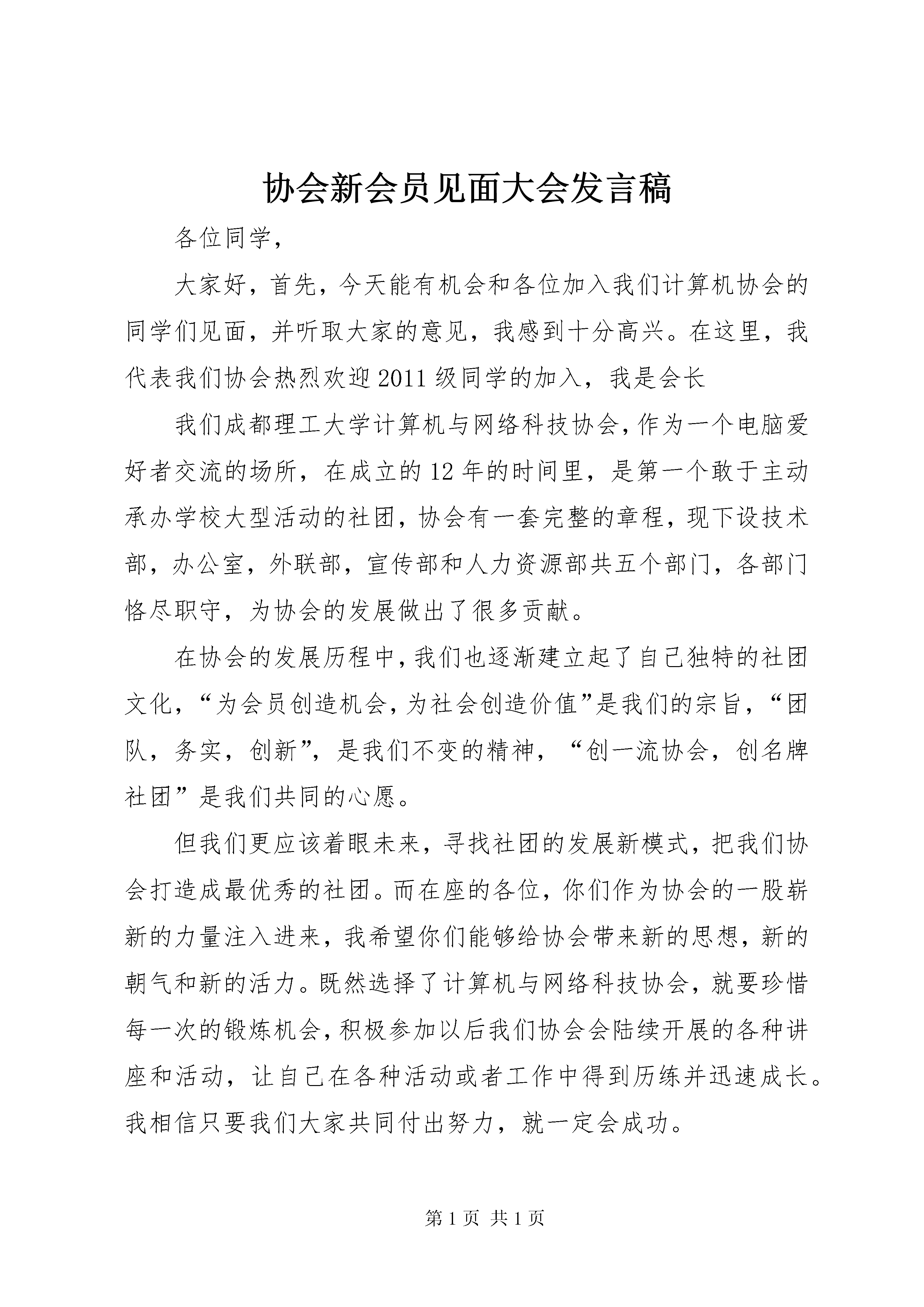 协会新会员见面大会发言稿各位同学,大家好,首先,今天能有机会和各位加入我们计算机协会的同学们见面,并听取大家的意见,我感到十分高兴。在这里,我代表我们协会热烈欢迎2011级同学的加入,我是会长我们成都理工大学计算机与网络科技协会,作为一个电脑爱好者交流的场所,在成立的12年的时间里,是第一个敢于主动承办学校大型活动的社团,协会有一套完整的章程,现下设技术部,办公室,外联部,宣传部和人力资源部共五个部门,各部门恪尽职守,为协会的发展做出了很多贡献。在协会的发展历程中,我们也逐渐建立起了自己独特的社团文化,“为会员创造机会,为社会创造价值”是我们的宗旨,“团队,务实,创新”,是我们不变的精神,“创一流协会,创名牌社团”是我们共同的心愿。但我们更应该着眼未来,寻找社团的发展新模式,把我们协会打造成最优秀的社团。而在座的各位,你们作为协会的一股崭新的力量注入进来,我希望你们能够给协会带来新的思想,新的朝气和新的活力。既然选择了计算机与网络科技协会,就要珍惜每一次的锻炼机会,积极参加以后我们协会会陆续开展的各种讲座和活动,让自己在各种活动或者工作中得到历练并迅速成长。我相信只要我们大家共同付出努力,就一定会成功。谢谢大家。