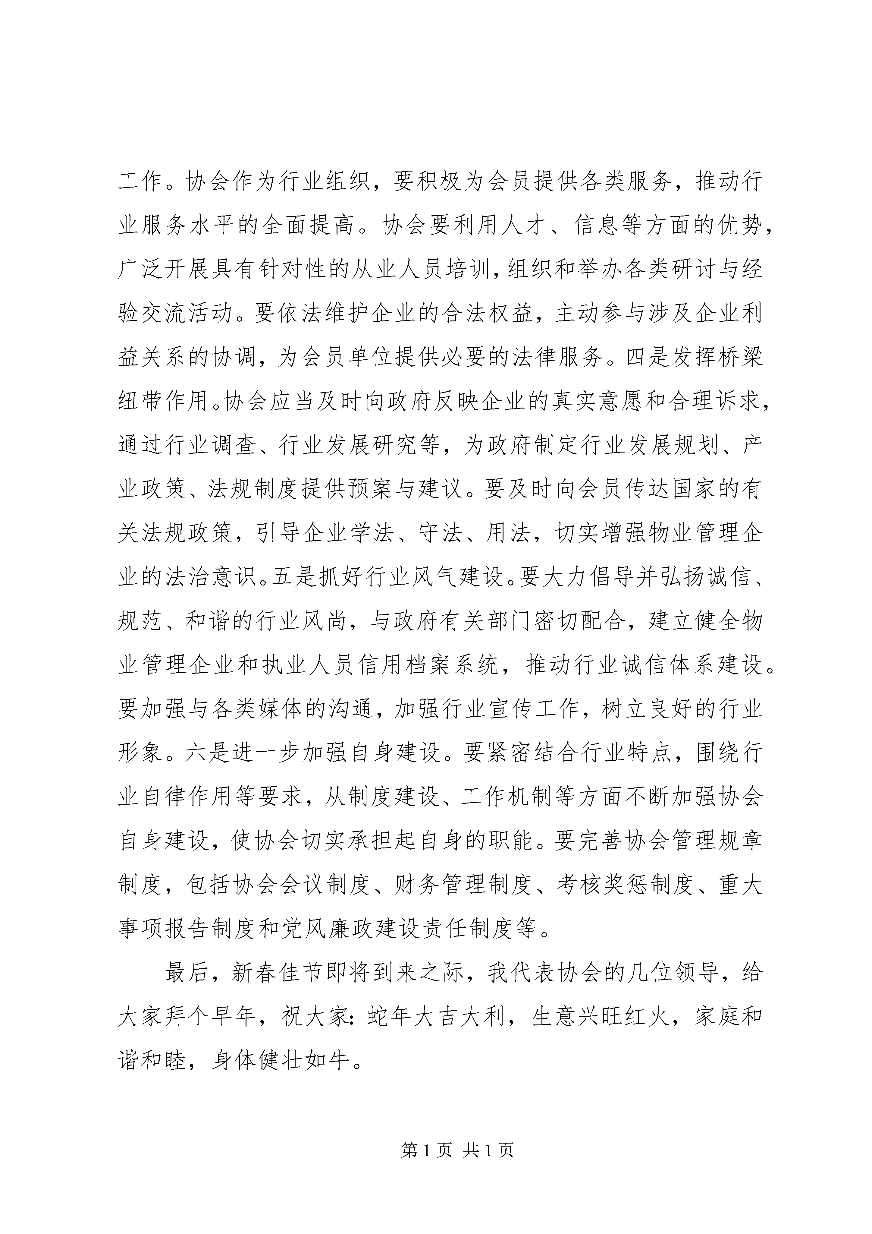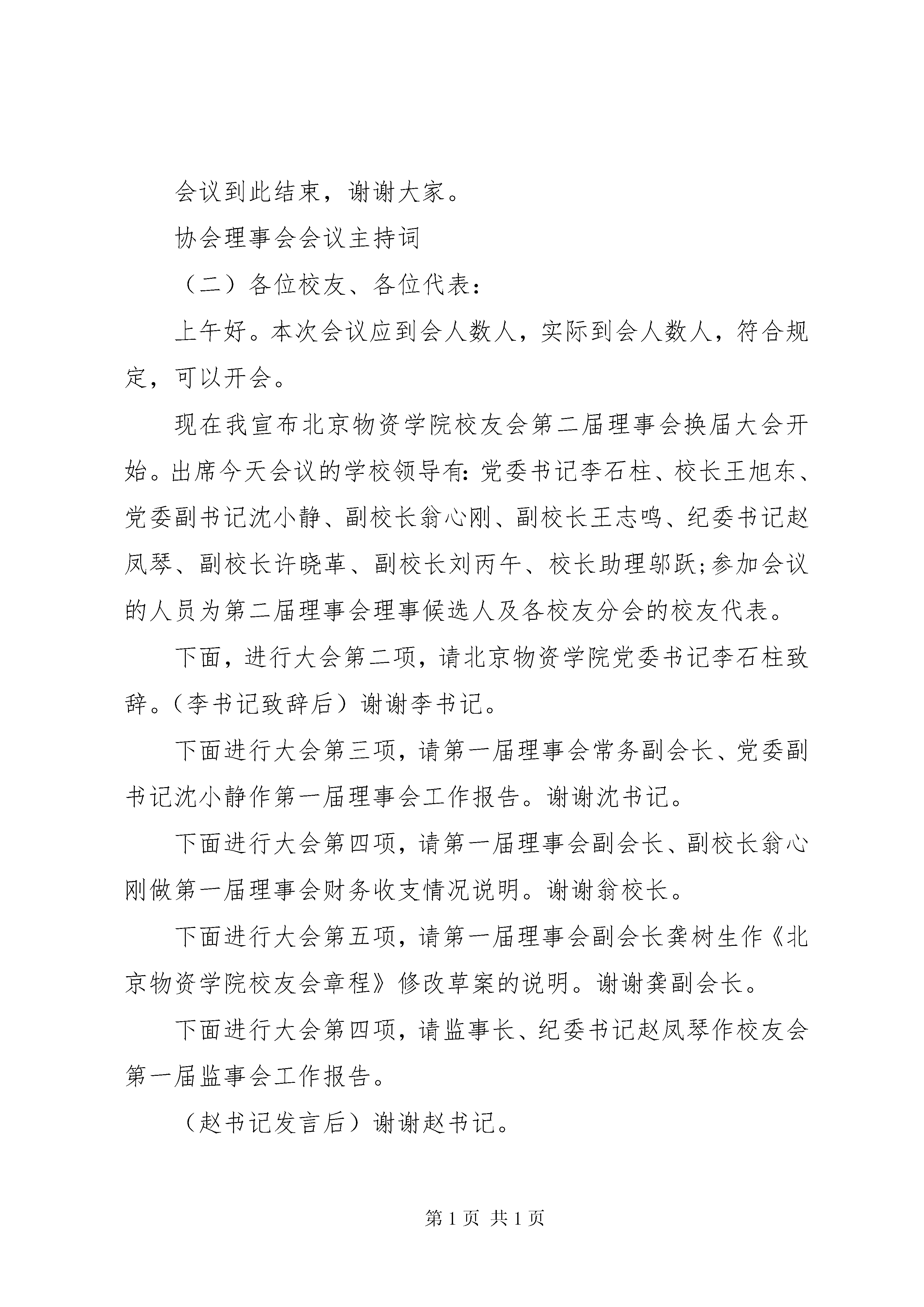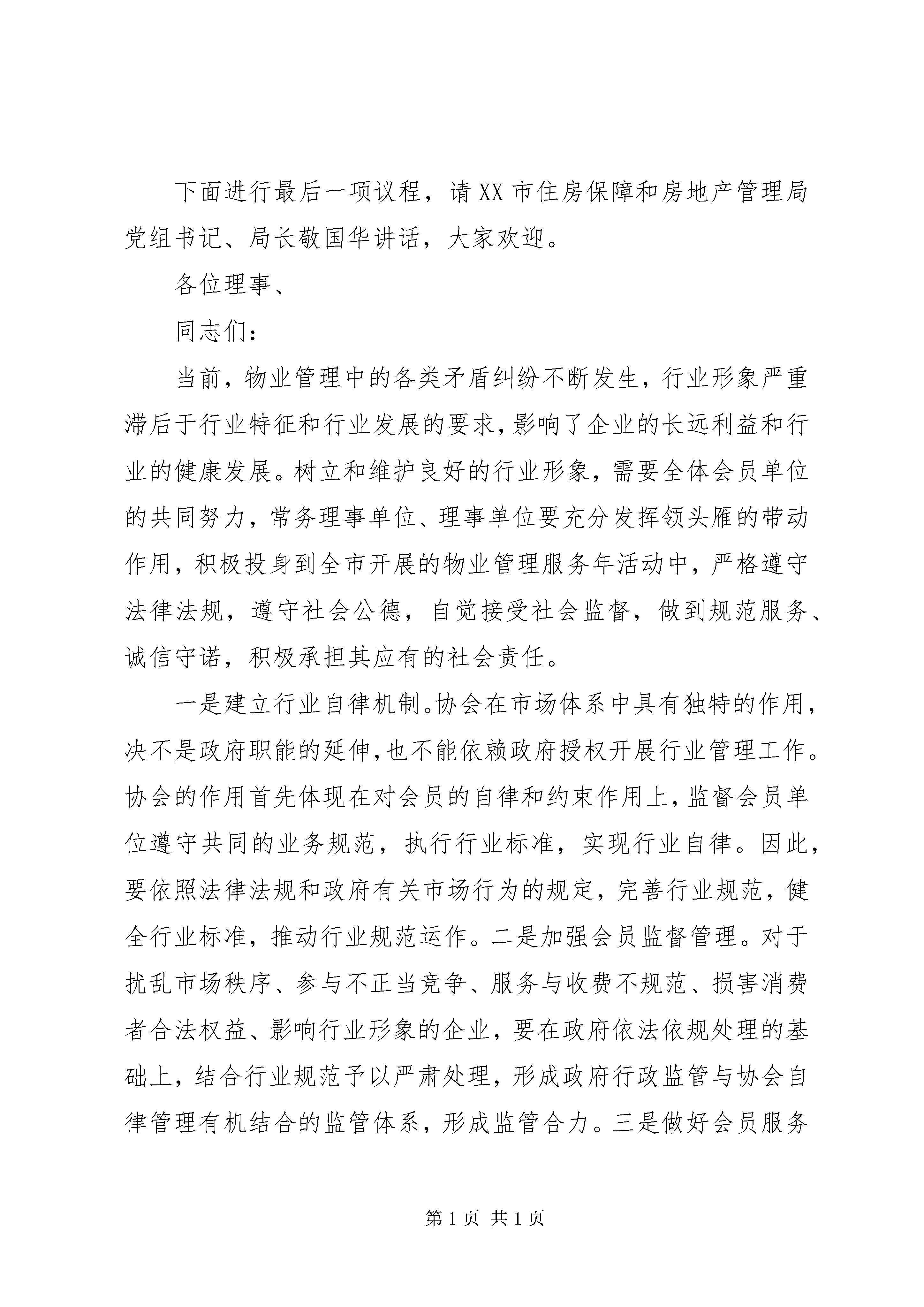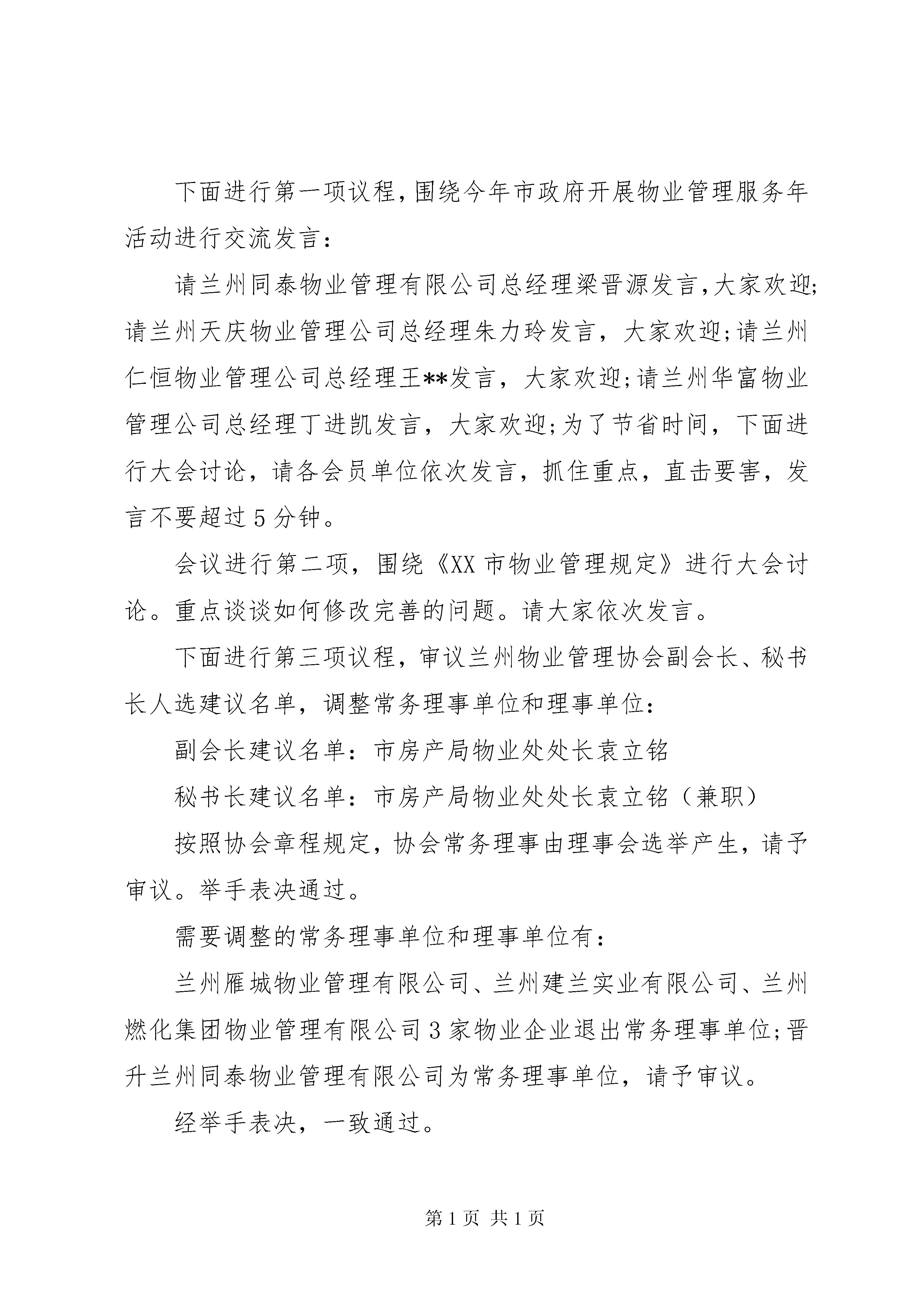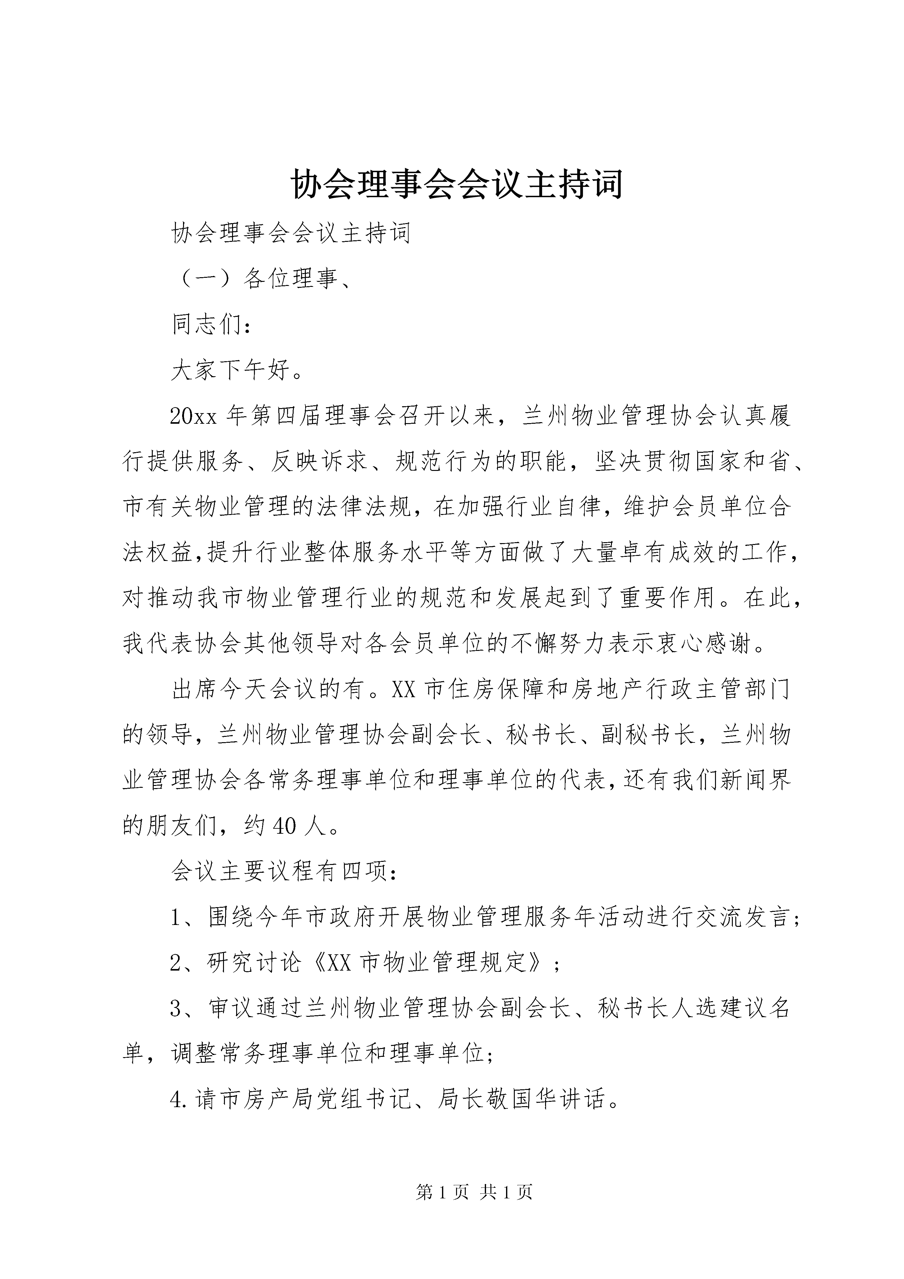 协会理事会会议主持词协会理事会会议主持词(一)各位理事、同志们:大家下午好。20xx年第四届理事会召开以来,兰州物业管理协会认真履行提供服务、反映诉求、规范行为的职能,坚决贯彻国家和省、市有关物业管理的法律法规,在加强行业自律,维护会员单位合法权益,提升行业整体服务水平等方面做了大量卓有成效的工作,对推动我市物业管理行业的规范和发展起到了重要作用。在此,我代表协会其他领导对各会员单位的不懈努力表示衷心感谢。出席今天会议的有。XX市住房保障和房地产行政主管部门的领导,兰州物业管理协会副会长、秘书长、副秘书长,兰州物业管理协会各常务理事单位和理事单位的代表,还有我们新闻界的朋友们,约40人。会议主要议程有四项:1、围绕今年市政府开展物业管理服务年活动进行交流发言;2、研究讨论《XX市物业管理规定》;3、审议通过兰州物业管理协会副会长、秘书长人选建议名单,调整常务理事单位和理事单位;4.请市房产局党组书记、局长敬国华讲话。下面进行第一项议程,围绕今年市政府开展物业管理服务年活动进行交流发言:请兰州同泰物业管理有限公司总经理梁晋源发言,大家欢迎;请兰州天庆物业管理公司总经理朱力玲发言,大家欢迎;请兰州仁恒物业管理公司总经理王**发言,大家欢迎;请兰州华富物业管理公司总经理丁进凯发言,大家欢迎;为了节省时间,下面进行大会讨论,请各会员单位依次发言,抓住重点,直击要害,发言不要超过5分钟。会议进行第二项,围绕《XX市物业管理规定》进行大会讨论。重点谈谈如何修改完善的问题。请大家依次发言。下面进行第三项议程,审议兰州物业管理协会副会长、秘书长人选建议名单,调整常务理事单位和理事单位:副会长建议名单:市房产局物业处处长袁立铭秘书长建议名单:市房产局物业处处长袁立铭(兼职)按照协会章程规定,协会常务理事由理事会选举产生,请予审议。举手表决通过。需要调整的常务理事单位和理事单位有:兰州雁城物业管理有限公司、兰州建兰实业有限公司、兰州燃化集团物业管理有限公司3家物业企业退出常务理事单位;晋升兰州同泰物业管理有限公司为常务理事单位,请予审议。经举手表决,一致通过。下面进行最后一项议程,请XX市住房保障和房地产管理局党组书记、局长敬国华讲话,大家欢迎。各位理事、同志们:当前,物业管理中的各类矛盾纠纷不断发生,行业形象严重滞后于行业特征和行业发展的要求,影响了企业的长远利益和行业的健康发展。树立和维护良好的行业形象,需要全体会员单位的共同努力,常务理事单位、理事单位要充分发挥领头雁的带动作用,积极投身到全市开展的物业管理服务年活动中,严格遵守法律法规,遵守社会公德,自觉接受社会监督,做到规范服务、诚信守诺,积极承担其应有的社会责任。一是建立行业自律机制。协会在市场体系中具有独特的作用,决不是政府职能的延伸,也不能依赖政府授权开展行业管理工作。协会的作用首先体现在对会员的自律和约束作用上,监督会员单位遵守共同的业务规范,执行行业标准,实现行业自律。因此,要依照法律法规和政府有关市场行为的规定,完善行业规范,健全行业标准,推动行业规范运作。二是加强会员监督管理。对于扰乱市场秩序、参与不正当竞争、服务与收费不规范、损害消费者合法权益、影响行业形象的企业,要在政府依法依规处理的基础上,结合行业规范予以严肃处理,形成政府行政监管与协会自律管理有机结合的监管体系,形成监管合力。三是做好会员服务工作。协会作为行业组织,要积极为会员提供各类服务,推动行业服务水平的全面提高。协会要利用人才、信息等方面的优势,广泛开展具有针对性的从业人员培训,组织和举办各类研讨与经验交流活动。要依法维护企业的合法权益,主动参与涉及企业利益关系的协调,为会员单位提供必要的法律服务。四是发挥桥梁纽带作用。协会应当及时向政府反映企业的真实意愿和合理诉求,通过行业调查、行业发展研究等,为政府制定行业发展规划、产业政策、法规制度提供预案与建议。要及时向会员传达国家的有关法规政策,引导企业学法、守法、用法,切实增强物业管理企业的法治意识。五是抓好行业风气建设。要大力倡导并弘扬诚信、规范、和谐的行业风尚,与政府有关部门密切配合,建立健全物业管理企业和执业人员信用档案系统,推动行业诚信体系建设。要加强与各类媒体的沟通,加强行业宣传工作,树立良好的行业形象。六是进一步加强自身建设。要紧密结合行业特点,围绕行业自律作用等要求,从制度建设、工作机制等方面不断加强协会自身建设,使协会切实承担起自身的职能。要完善协会管理规章制度,包括协会会议制度、财务管理制度、考核奖惩制度、重大事项报告制度和党风廉政建设责任制度等。最后,新春佳节即将到来之际,我代表协会的几位领导,给大家拜个早年,祝大家:蛇年大吉大利,生意兴旺红火,家庭和谐和睦,身体健壮如牛。会议到此结束,谢谢大家。协会理事会会议主持词(