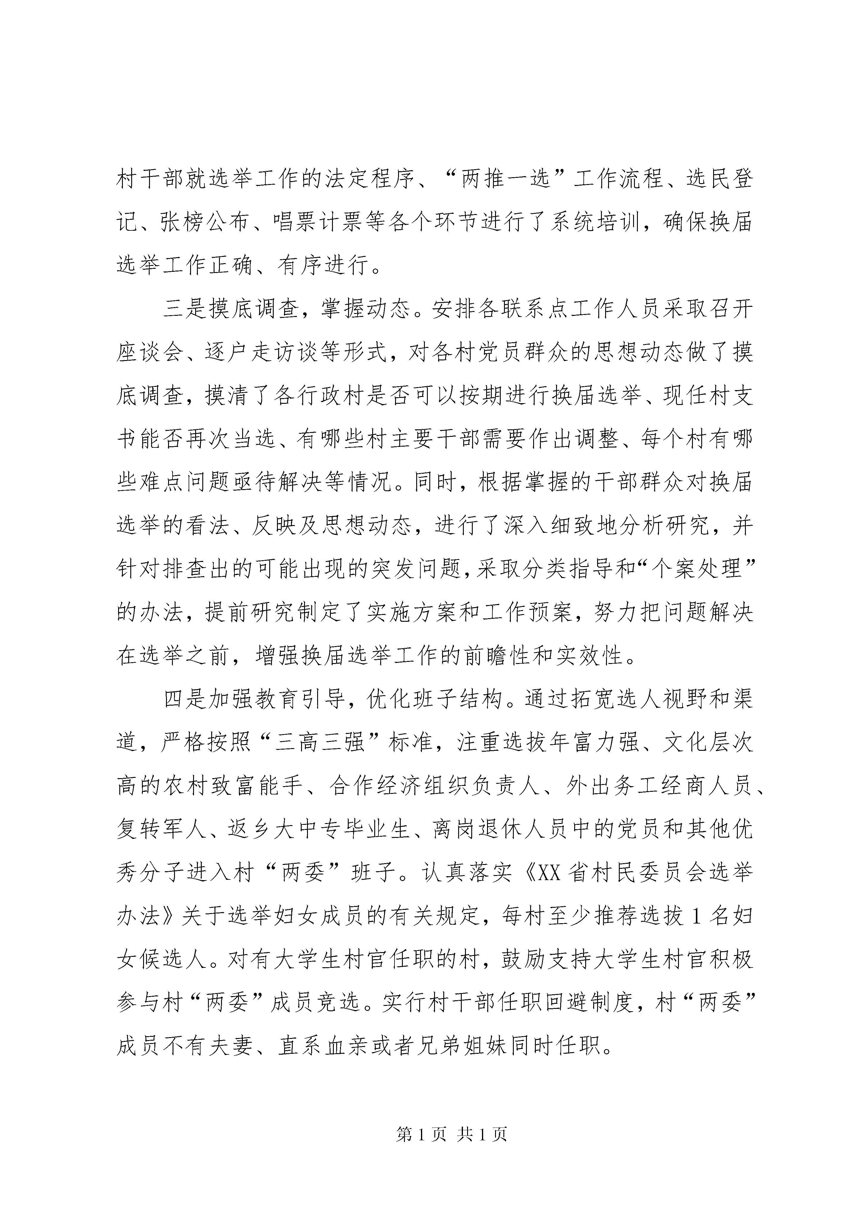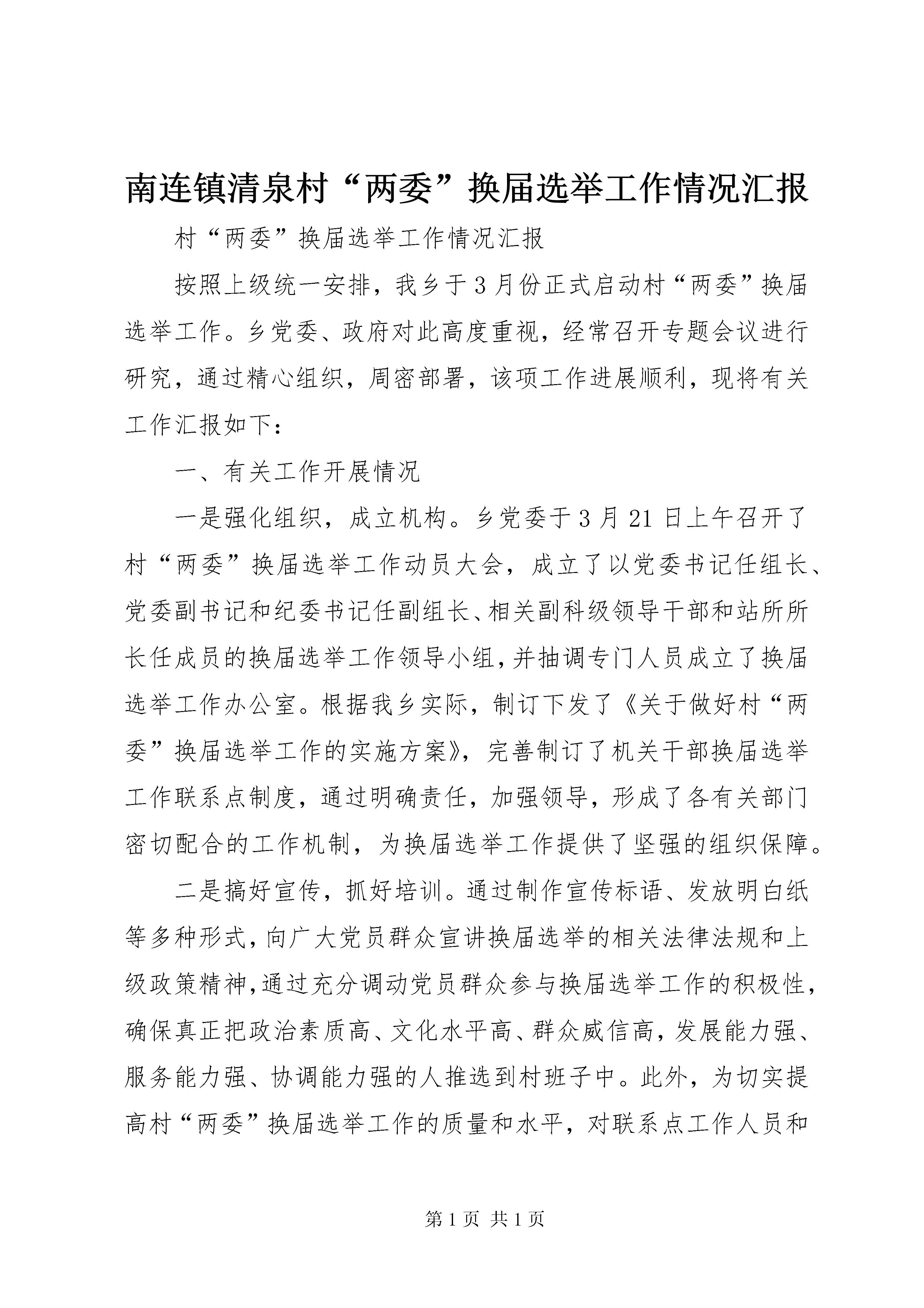 南连镇清泉村“两委”换届选举工作情况汇报村“两委”换届选举工作情况汇报按照上级统一安排,我乡于3月份正式启动村“两委”换届选举工作。乡党委、政府对此高度重视,经常召开专题会议进行研究,通过精心组织,周密部署,该项工作进展顺利,现将有关工作汇报如下:一、有关工作开展情况一是强化组织,成立机构。乡党委于3月21日上午召开了村“两委”换届选举工作动员大会,成立了以党委书记任组长、党委副书记和纪委书记任副组长、相关副科级领导干部和站所所长任成员的换届选举工作领导小组,并抽调专门人员成立了换届选举工作办公室。根据我乡实际,制订下发了《关于做好村“两委”换届选举工作的实施方案》,完善制订了机关干部换届选举工作联系点制度,通过明确责任,加强领导,形成了各有关部门密切配合的工作机制,为换届选举工作提供了坚强的组织保障。二是搞好宣传,抓好培训。通过制作宣传标语、发放明白纸等多种形式,向广大党员群众宣讲换届选举的相关法律法规和上级政策精神,通过充分调动党员群众参与换届选举工作的积极性,确保真正把政治素质高、文化水平高、群众威信高,发展能力强、服务能力强、协调能力强的人推选到村班子中。此外,为切实提高村“两委”换届选举工作的质量和水平,对联系点工作人员和村干部就选举工作的法定程序、“两推一选”工作流程、选民登记、张榜公布、唱票计票等各个环节进行了系统培训,确保换届选举工作正确、有序进行。三是摸底调查,掌握动态。安排各联系点工作人员采取召开座谈会、逐户走访谈等形式,对各村党员群众的思想动态做了摸底调查,摸清了各行政村是否可以按期进行换届选举、现任村支书能否再次当选、有哪些村主要干部需要作出调整、每个村有哪些难点问题亟待解决等情况。同时,根据掌握的干部群众对换届选举的看法、反映及思想动态,进行了深入细致地分析研究,并针对排查出的可能出现的突发问题,采取分类指导和“个案处理”的办法,提前研究制定了实施方案和工作预案,努力把问题解决在选举之前,增强换届选举工作的前瞻性和实效性。四是加强教育引导,优化班子结构。通过拓宽选人视野和渠道,严格按照“三高三强”标准,注重选拔年富力强、文化层次高的农村致富能手、合作经济组织负责人、外出务工经商人员、复转军人、返乡大中专毕业生、离岗退休人员中的党员和其他优秀分子进入村“两委”班子。认真落实《XX省村民委员会选举办法》关于选举妇女成员的有关规定,每村至少推荐选拔1名妇女候选人。对有大学生村官任职的村,鼓励支持大学生村官积极参与村“两委”成员竞选。实行村干部任职回避制度,村“两委”成员不有夫妻、直系血亲或者兄弟姐妹同时任职。五是严肃纪律,抓好稳定。专门制订印发了《关于严肃纪律确保村“两委”换届选举工作顺利进行的通知》,进一步明确了对违法违规行为进行认定、查处的具体程序和责任部门,切实加大了对违法违规行为的打击力度,对换届选举中的违法违规行为特别是贿选行为,做到发现一起、严查一起,始终保持打击不法行为的高压态势。公布了举报电话,安排专门人员认真做好群众举报和来信来访受理工作,对群众举报和来信来访换届选举中问题的,及时受理和核实,最大限度地增加和谐因素,维护社会稳定。六是换届工作稳步推进。从3月24日到4月2日,我们集中进行了村委会换届选举委员会的推选和支部委员的“两推”工作,并于4月3日进行了各村选举委员会的培训,对各村的换届情况做到全面掌握,为整个换届工作的顺利进行打下了基础。二、下步工作计划在下步的村两委换届中,我们严把政策,严格程序,按照党委研究的时间节点,有计划、有步骤的稳步实施,确保换届圆满成功。党支部换届的选举工作计划本周完成,村委会的选举工作计划在4月25日到5月31日集中进行,目前各村正在召开选举委员会成员会议,确定选举日,进行选民登记。
