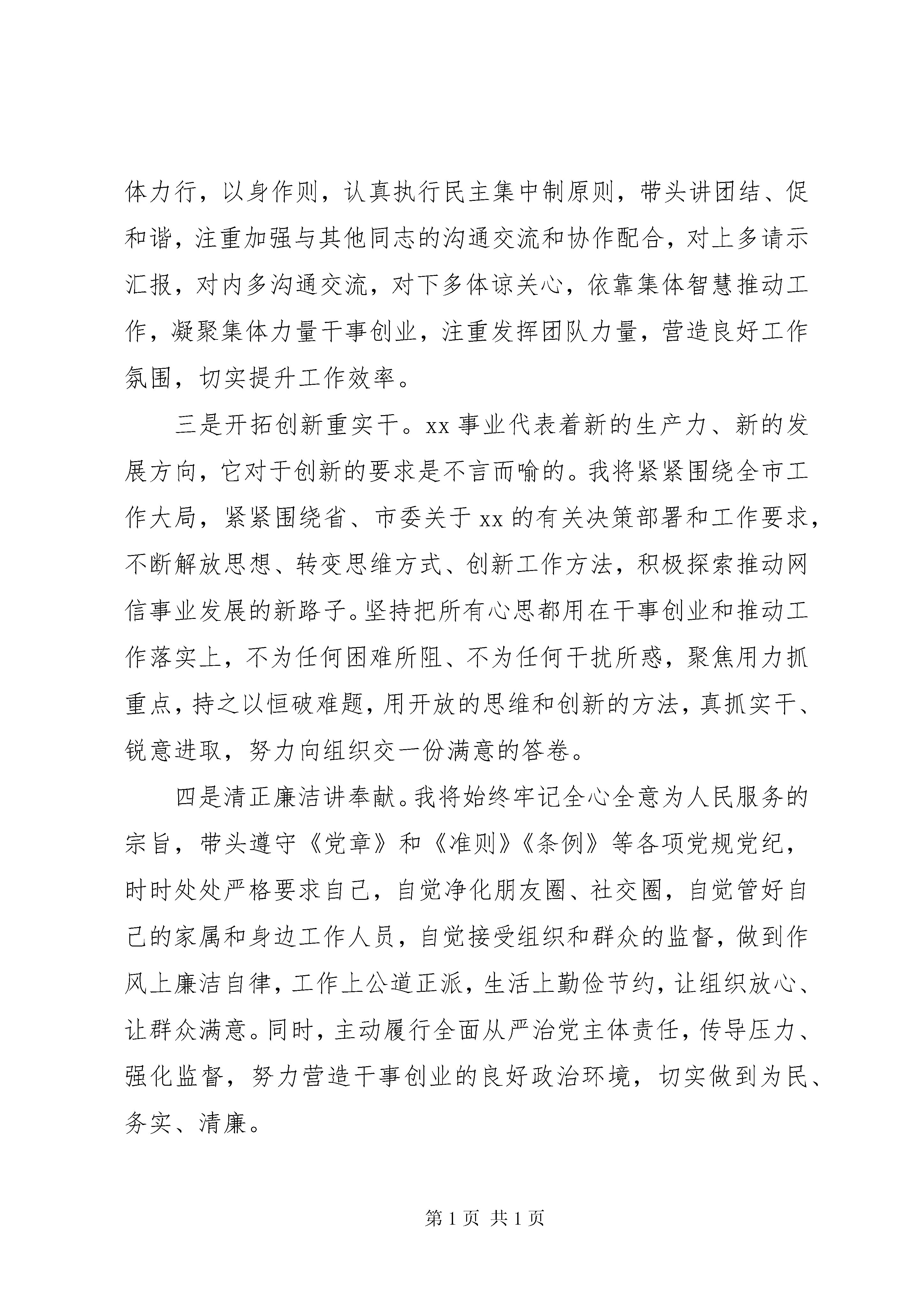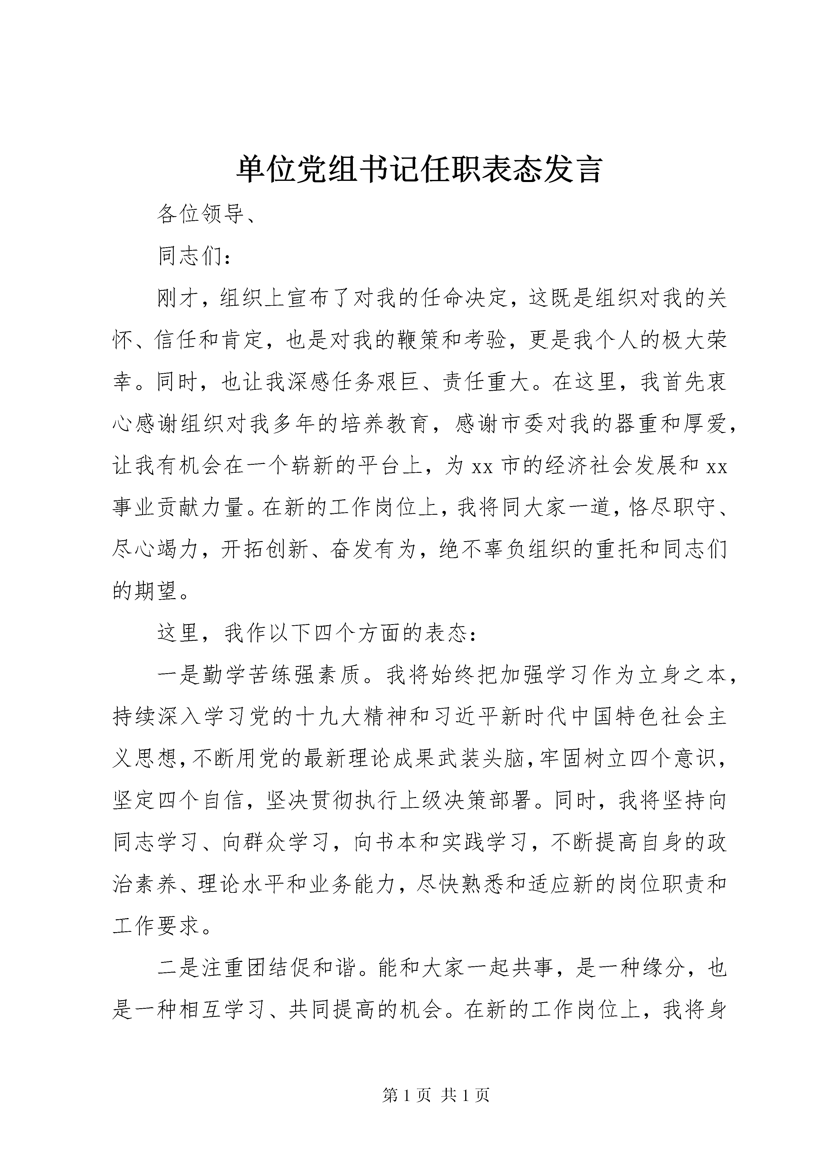 单位党组书记任职表态发言各位领导、同志们:刚才,组织上宣布了对我的任命决定,这既是组织对我的关怀、信任和肯定,也是对我的鞭策和考验,更是我个人的极大荣幸。同时,也让我深感任务艰巨、责任重大。在这里,我首先衷心感谢组织对我多年的培养教育,感谢市委对我的器重和厚爱,让我有机会在一个崭新的平台上,为xx市的经济社会发展和xx事业贡献力量。在新的工作岗位上,我将同大家一道,恪尽职守、尽心竭力,开拓创新、奋发有为,绝不辜负组织的重托和同志们的期望。这里,我作以下四个方面的表态:一是勤学苦练强素质。我将始终把加强学习作为立身之本,持续深入学习党的十九大精神和习近平新时代中国特色社会主义思想,不断用党的最新理论成果武装头脑,牢固树立四个意识,坚定四个自信,坚决贯彻执行上级决策部署。同时,我将坚持向同志学习、向群众学习,向书本和实践学习,不断提高自身的政治素养、理论水平和业务能力,尽快熟悉和适应新的岗位职责和工作要求。二是注重团结促和谐。能和大家一起共事,是一种缘分,也是一种相互学习、共同提高的机会。在新的工作岗位上,我将身体力行,以身作则,认真执行民主集中制原则,带头讲团结、促和谐,注重加强与其他同志的沟通交流和协作配合,对上多请示汇报,对内多沟通交流,对下多体谅关心,依靠集体智慧推动工作,凝聚集体力量干事创业,注重发挥团队力量,营造良好工作氛围,切实提升工作效率。三是开拓创新重实干。xx事业代表着新的生产力、新的发展方向,它对于创新的要求是不言而喻的。我将紧紧围绕全市工作大局,紧紧围绕省、市委关于xx的有关决策部署和工作要求,不断解放思想、转变思维方式、创新工作方法,积极探索推动网信事业发展的新路子。坚持把所有心思都用在干事创业和推动工作落实上,不为任何困难所阻、不为任何干扰所惑,聚焦用力抓重点,持之以恒破难题,用开放的思维和创新的方法,真抓实干、锐意进取,努力向组织交一份满意的答卷。四是清正廉洁讲奉献。我将始终牢记全心全意为人民服务的宗旨,带头遵守《党章》和《准则》《条例》等各项党规党纪,时时处处严格要求自己,自觉净化朋友圈、社交圈,自觉管好自己的家属和身边工作人员,自觉接受组织和群众的监督,做到作风上廉洁自律,工作上公道正派,生活上勤俭节约,让组织放心、让群众满意。同时,主动履行全面从严治党主体责任,传导压力、强化监督,努力营造干事创业的良好政治环境,切实做到为民、务实、清廉。总之,在新的工作岗位上,我将在市委的坚强领导下,与同志们一起,同心同德、开拓进取、勤恳工作,努力为xx事业和全市经济社会发展做出自己应有的贡献。谢谢大家。