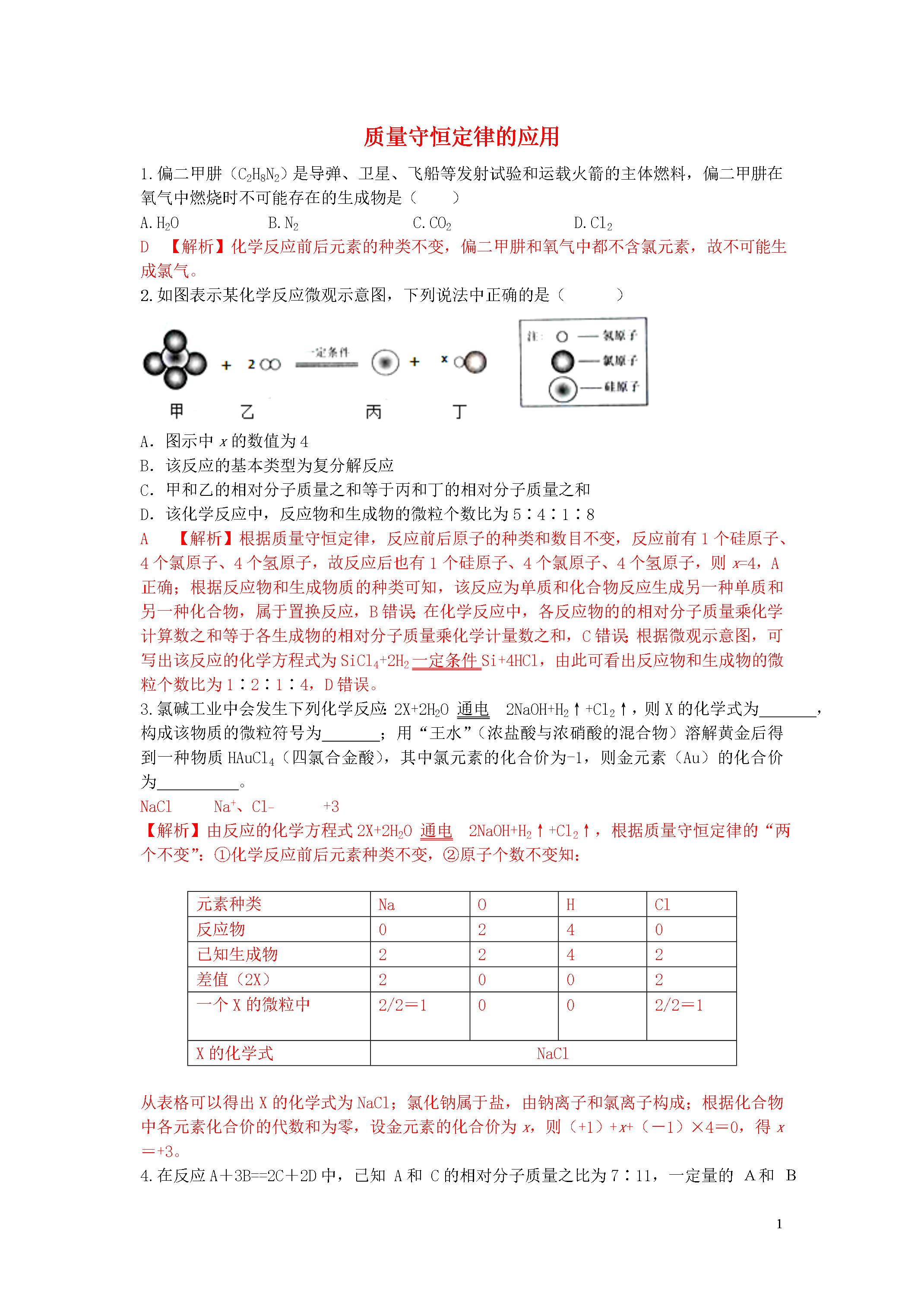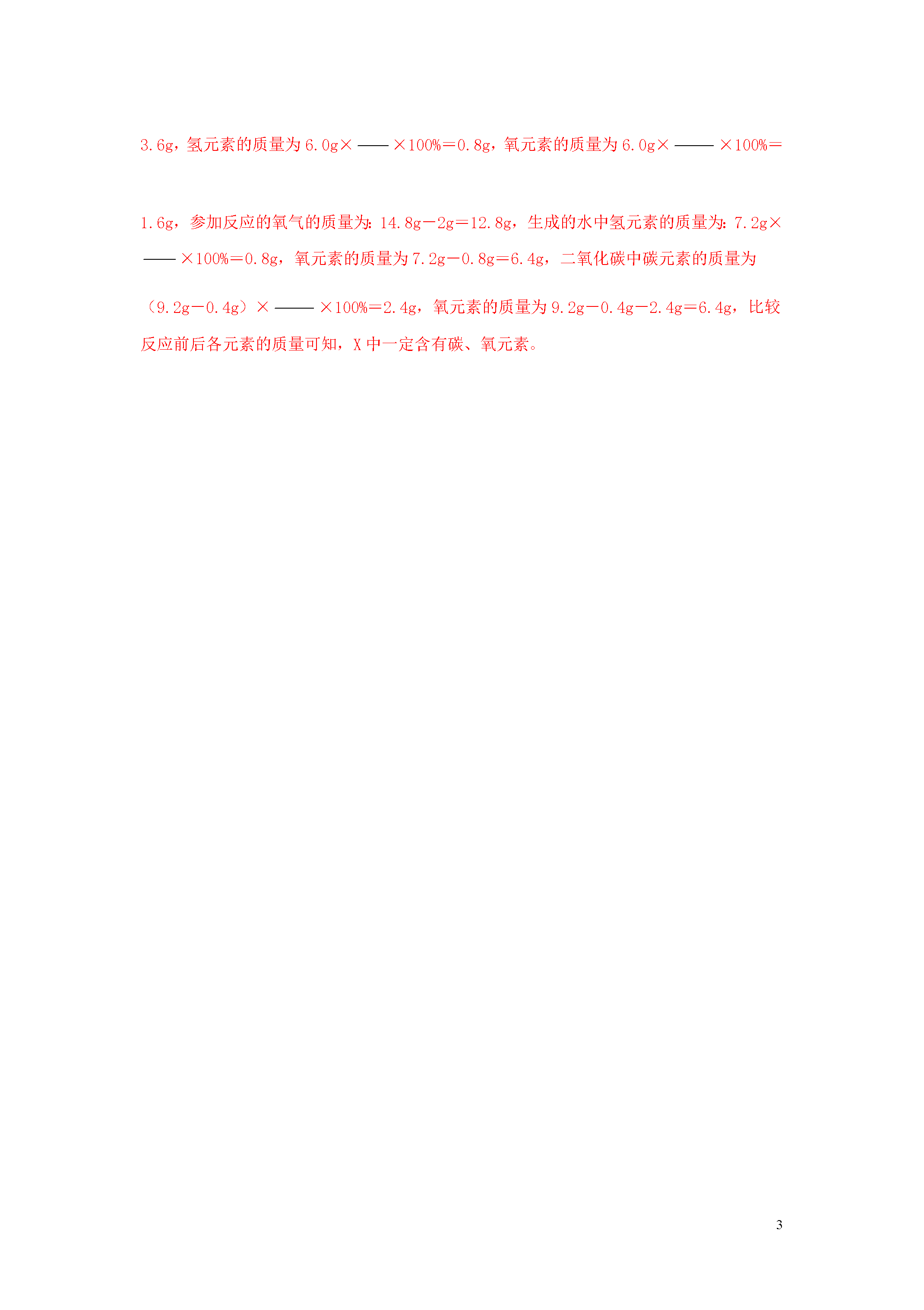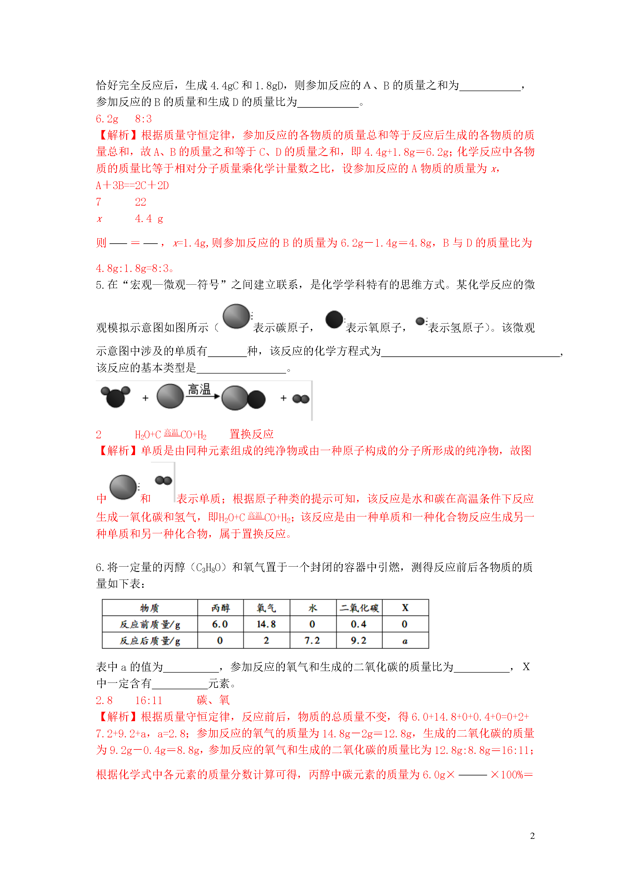 3质量守恒定律的应用偏二甲肼(C2H8N2)是导弹、卫星、飞船等发射试验和运载火箭的主体燃料,偏二甲肼在氧气中燃烧时不可能存在的生成物是()A.H2OB.N2C.CO2D.Cl2D【解析】化学反应前后元素的种类不变,偏二甲肼和氧气中都不含氯元素,故不可能生成氯气。2.如图表示某化学反应微观示意图,下列说法中正确的是()A.图示中x的数值为4B.该反应的基本类型为复分解反应C.甲和乙的相对分子质量之和等于丙和丁的相对分子质量之和D.该化学反应中,反应物和生成物的微粒个数比为5∶4∶1∶8A【解析】根据质量守恒定律,反应前后原子的种类和数目不变,反应前有1个硅原子、4个氯原子、4个氢原子,故反应后也有1个硅原子、4个氯原子、4个氢原子,则x=4,A正确;根据反应物和生成物质的种类可知,该反应为单质和化合物反应生成另一种单质和另一种化合物,属于置换反应,B错误;在化学反应中,各反应物的的相对分子质量乘化学计算数之和等于各生成物的相对分子质量乘化学计量数之和,C错误;根据微观示意图,可写出该反应的化学方程式为SiCl4+2H2一定条件Si+4HCl,由此可看出反应物和生成物的微粒个数比为1∶2∶1∶4,D错误。氯碱工业中会发生下列化学反应:2X+2H2O通电2NaOH+H2↑+Cl2↑,则X的化学式为,构成该物质的微粒符号为;用“王水”(浓盐酸与浓硝酸的混合物)溶解黄金后得到一种物质HAuCl4(四氯合金酸),其中氯元素的化合价为-1,则金元素(Au)的化合价为。NaClNa+、Cl_+3【解析】由反应的化学方程式2X+2H2O通电2NaOH+H2↑+Cl2↑,根据质量守恒定律的“两个不变”:①化学反应前后元素种类不变,②原子个数不变知:元素种类NaOHCl反应物0240已知生成物2242差值(2X)2002一个X的微粒中2/2=1002/2=1X的化学式NaCl从表格可以得出X的化学式为NaCl;氯化钠属于盐,由钠离子和氯离子构成;根据化合物中各元素化合价的代数和为零,设金元素的化合价为x,则(+1)+x+(-1)×4=0,得x=+3。4.在反应A+3B==2C+2D中,已知A和C的相对分子质量之比为7∶11,一定量的A和B恰好完全反应后,生成4.4gC和1.8gD,则参加反应的A、B的质量之和为,参加反应的B的质量和生成D的质量比为。6.2g8:3【解析】根据质量守恒定律,参加反应的各物质的质量总和等于反应后生成的各物质的质量总和,故A、B的质量之和等于C、D的质量之和,即4.4g+1.8g=6.2g;化学反应中各物质的质量比等于相对分子质量乘化学计量数之比,设参加反应的A物质的质量为x,A+3B==2C+2D722x4.4g则=,x=1.4g,则参加反应的B的质量为6.2g-1.4g=4.8g,B与D的质量比为4.8g:1.8g=8:3。5.在“宏观—微观—符号”之间建立联系,是化学学科特有的思维方式。某化学反应的微观模拟示意图如图所示(表示碳原子,表示氧原子,表示氢原子)。该微观示意图中涉及的单质有种,该反应的化学方程式为,该反应的基本类型是。2H2O+C高温CO+H2置换反应【解析】单质是由同种元素组成的纯净物或由一种原子构成的分子所形成的纯净物,故图中和表示单质;根据原子种类的提示可知,该反应是水和碳在高温条件下反应生成一氧化碳和氢气,即H2O+C高温CO+H2;该反应是由一种单质和一种化合物反应生成另一种单质和另一种化合物,属于置换反应。6.将一定量的丙醇(C3H8O)和氧气置于一个封闭的容器中引燃,测得反应前后各物质的质量如下表:表中a的值为,参加反应的氧气和生成的二氧化碳的质量比为,X中一定含有元素。2.816:11碳、氧【解析】根据质量守恒定律,反应前后,物质的总质量不变,得6.0+14.8+0+0.4+0=0+2+7.2+9.2+a,a=2.8;参加反应的氧气的质量为14.8g-2g=12.8g,生成的二氧化碳的质量为9.2g-0.4g=8.8g,参加反应的氧气和生成的二氧化碳的质量比为12.8g:8.8g=16:11;根据化学式中各元素的质量分数计算可得,丙醇中碳元素的质量为6.0g××100%=3.6g,氢元素的质量为6.0g××100%=0.8g,氧元素的质量为6.0g××100%=1.6g,参加反应的氧气的质量为:14.8g-2g=12.8g,生成的水中氢元素的质量为:7.2g××100%=0.8g,氧元素的质量为7.2g-0.8g=6.4g,二氧化碳中碳元素的质量为(9.2g-0.4g)××100%=2.4g,氧元素的质量为9.2g-0.4g-2.4g=6.4g,比较反应前后各元素的质量可知,X中一定含有碳、氧元素。