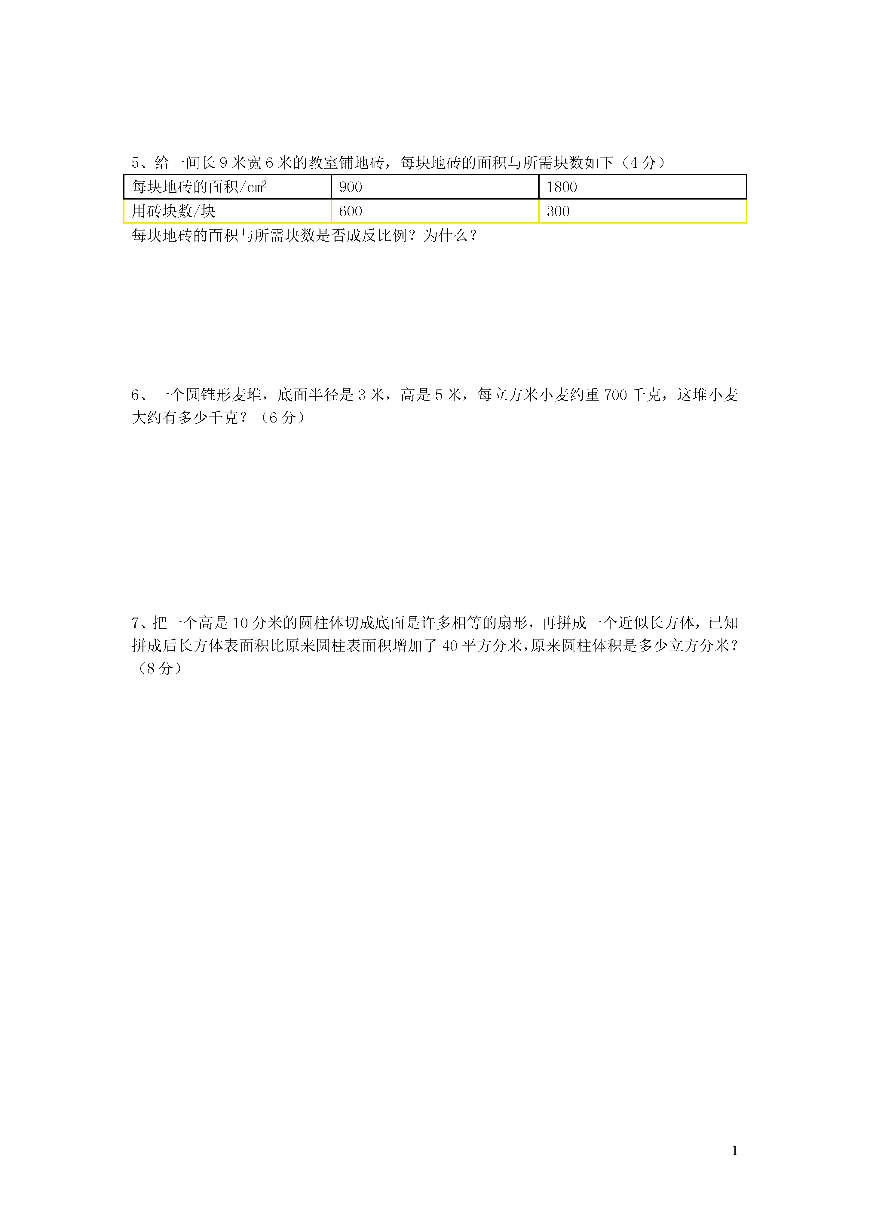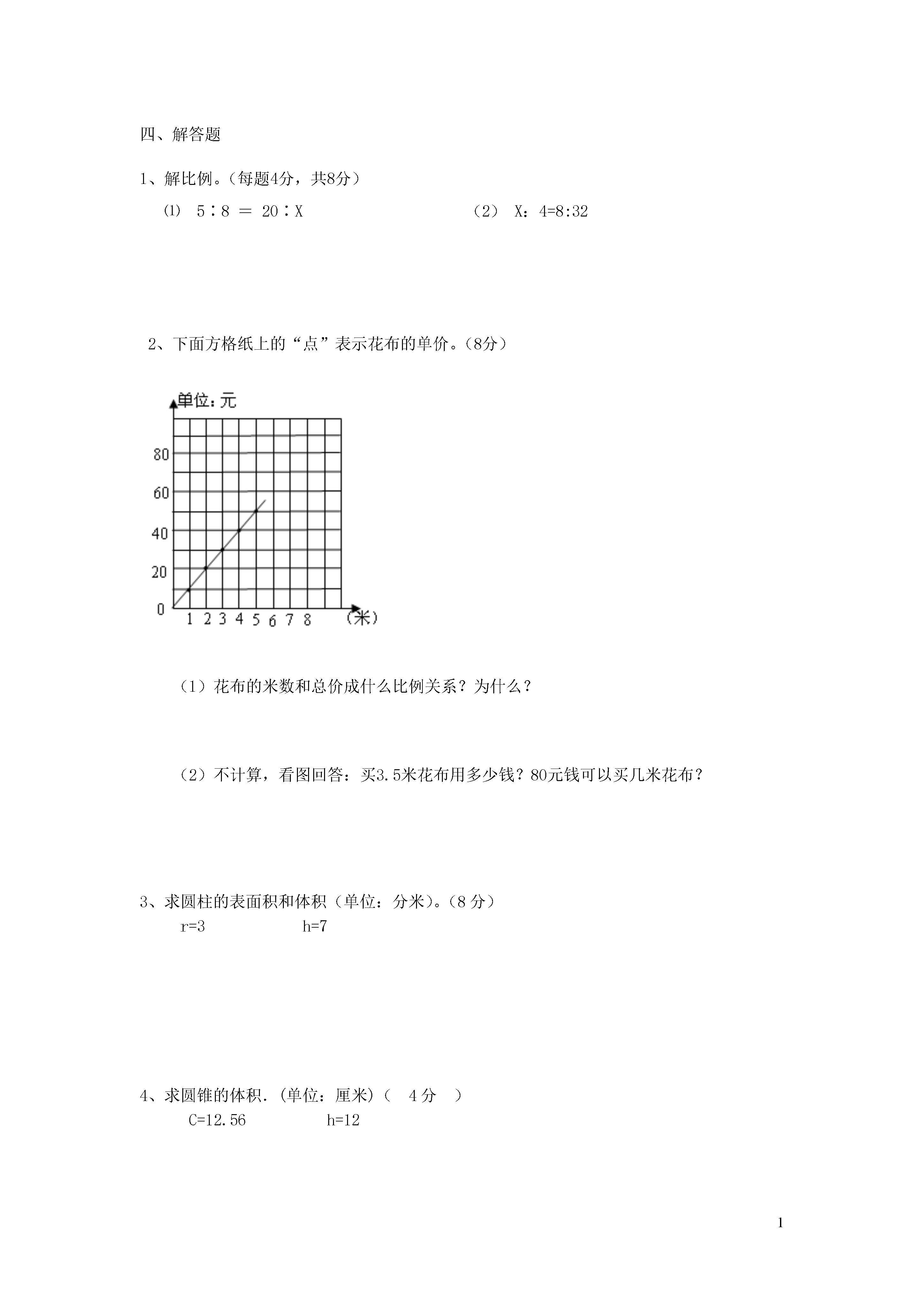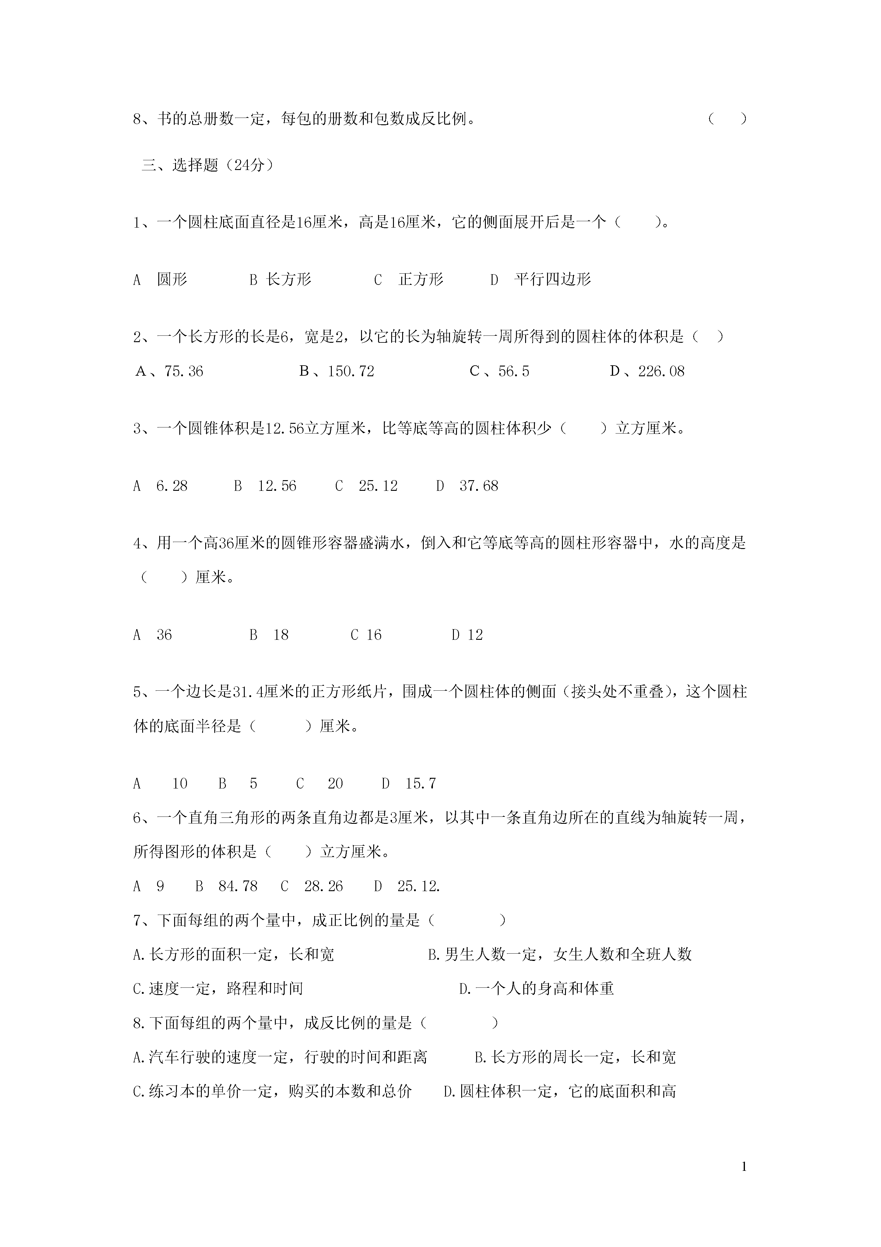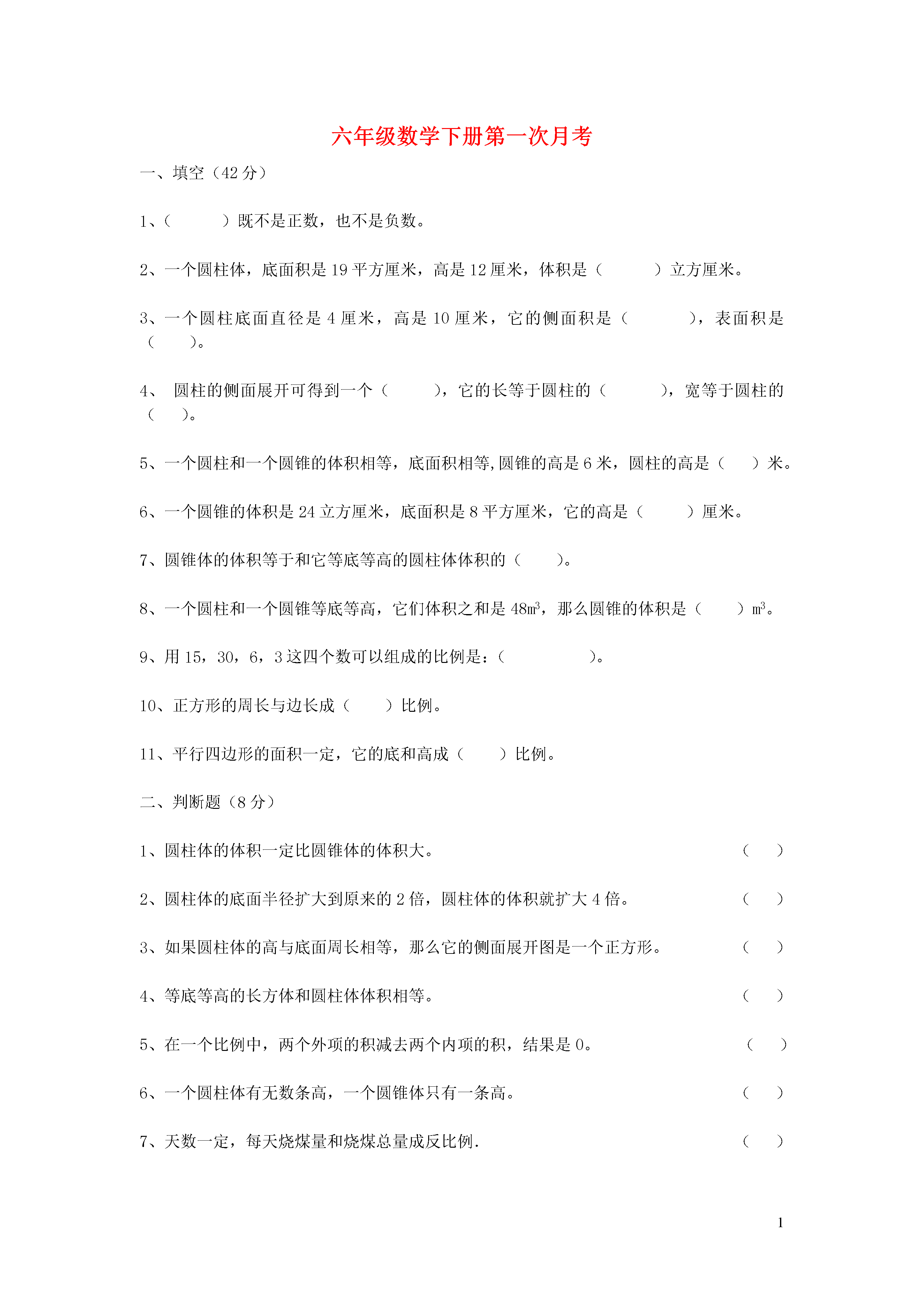 1六年级数学下册第一次月考填空(42分)1、()既不是正数,也不是负数。一个圆柱体,底面积是19平方厘米,高是12厘米,体积是()立方厘米。一个圆柱底面直径是4厘米,高是10厘米,它的侧面积是(),表面积是()。4、圆柱的侧面展开可得到一个(),它的长等于圆柱的(),宽等于圆柱的()。5、一个圆柱和一个圆锥的体积相等,底面积相等,圆锥的高是6米,圆柱的高是()米。一个圆锥的体积是24立方厘米,底面积是8平方厘米,它的高是()厘米。7、圆锥体的体积等于和它等底等高的圆柱体体积的()。一个圆柱和一个圆锥等底等高,它们体积之和是48m3,那么圆锥的体积是()m3。9、用15,30,6,3这四个数可以组成的比例是:()。正方形的周长与边长成()比例。平行四边形的面积一定,它的底和高成()比例。二、判断题(8分)1、圆柱体的体积一定比圆锥体的体积大。()2、圆柱体的底面半径扩大到原来的2倍,圆柱体的体积就扩大4倍。()3、如果圆柱体的高与底面周长相等,那么它的侧面展开图是一个正方形。()4、等底等高的长方体和圆柱体体积相等。()在一个比例中,两个外项的积减去两个内项的积,结果是0。()一个圆柱体有无数条高,一个圆锥体只有一条高。()天数一定,每天烧煤量和烧煤总量成反比例.()书的总册数一定,每包的册数和包数成反比例。()三、选择题(24分)1、一个圆柱底面直径是16厘米,高是16厘米,它的侧面展开后是一个()。A圆形B长方形C正方形D平行四边形2、一个长方形的长是6,宽是2,以它的长为轴旋转一周所得到的圆柱体的体积是()A、75.36B、150.72C、56.5D、226.083、一个圆锥体积是12.56立方厘米,比等底等高的圆柱体积少()立方厘米。A6.28B12.56C25.12D37.684、用一个高36厘米的圆锥形容器盛满水,倒入和它等底等高的圆柱形容器中,水的高度是()厘米。A36B18C16D125、一个边长是31.4厘米的正方形纸片,围成一个圆柱体的侧面(接头处不重叠),这个圆柱体的底面半径是()厘米。A10B5C20D15.7一个直角三角形的两条直角边都是3厘米,以其中一条直角边所在的直线为轴旋转一周,所得图形的体积是()立方厘米。A9B84.78C28.26D25.12.7、下面每组的两个量中,成正比例的量是()长方形的面积一定,长和宽B.男生人数一定,女生人数和全班人数C.速度一定,路程和时间D.一个人的身高和体重8.下面每组的两个量中,成反比例的量是()A.汽车行驶的速度一定,行驶的时间和距离B.长方形的周长一定,长和宽C.练习本的单价一定,购买的本数和总价D.圆柱体积一定,它的底面积和高四、解答题解比例。(每题4分,共8分)⑴5∶8=20∶X(2)X:4=8:322、下面方格纸上的“点”表示花布的单价。(8分)(1)花布的米数和总价成什么比例关系?为什么?(2)不计算,看图回答:买3.5米花布用多少钱?80元钱可以买几米花布?3、求圆柱的表面积和体积(单位:分米)。(8分)r=3h=74、求圆锥的体积.(单位:厘米)(4分)C=12.56h=125、给一间长9米宽6米的教室铺地砖,每块地砖的面积与所需块数如下(4分)每块地砖的面积/cm29001800用砖块数/块600300每块地砖的面积与所需块数是否成反比例?为什么?6、一个圆锥形麦堆,底面半径是3米,高是5米,每立方米小麦约重700千克,这堆小麦大约有多少千克?(6分)7、把一个高是10分米的圆柱体切成底面是许多相等的扇形,再拼成一个近似长方体,已知拼成后长方体表面积比原来圆柱表面积增加了40平方分米,原来圆柱体积是多少立方分米?(8分)