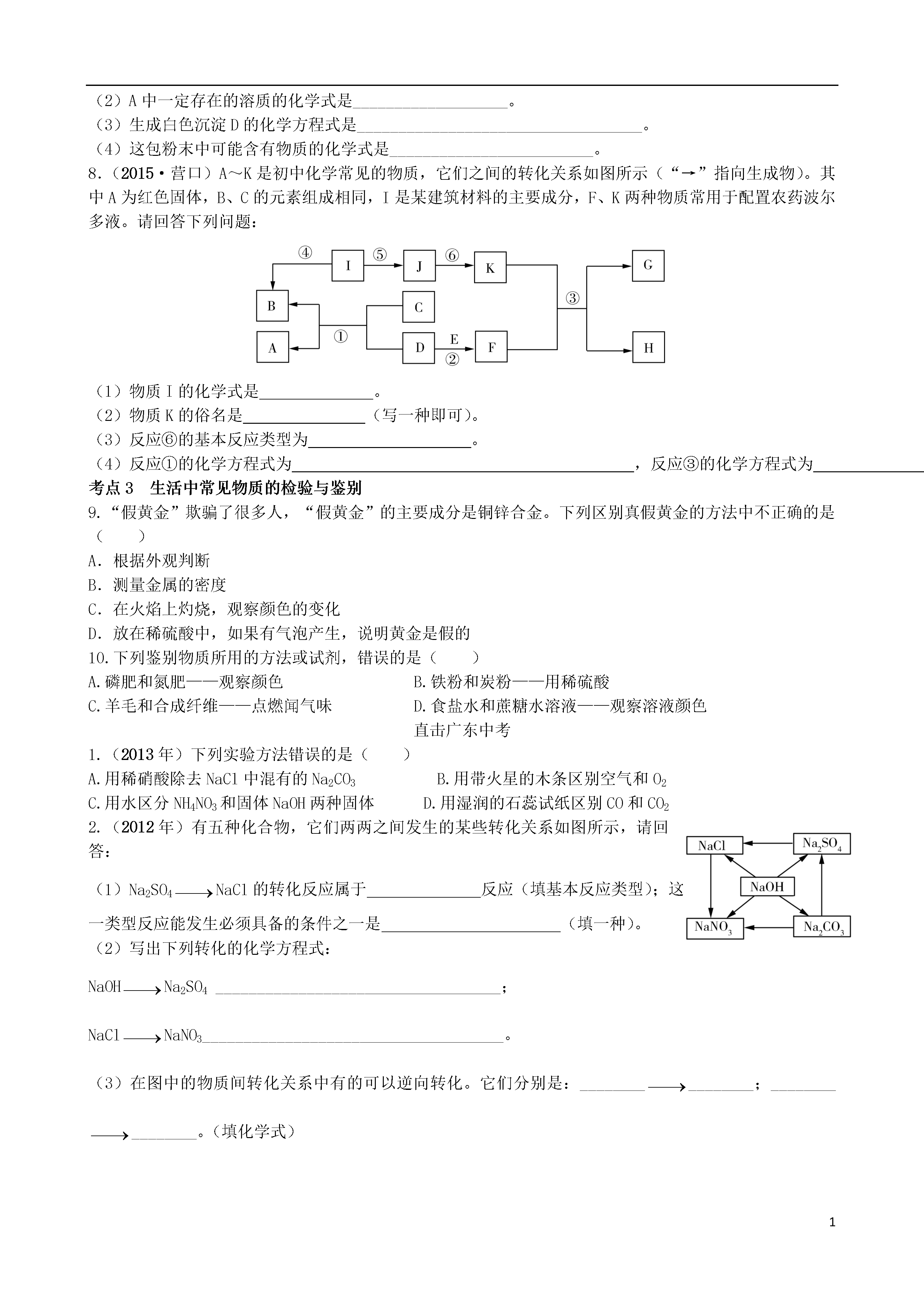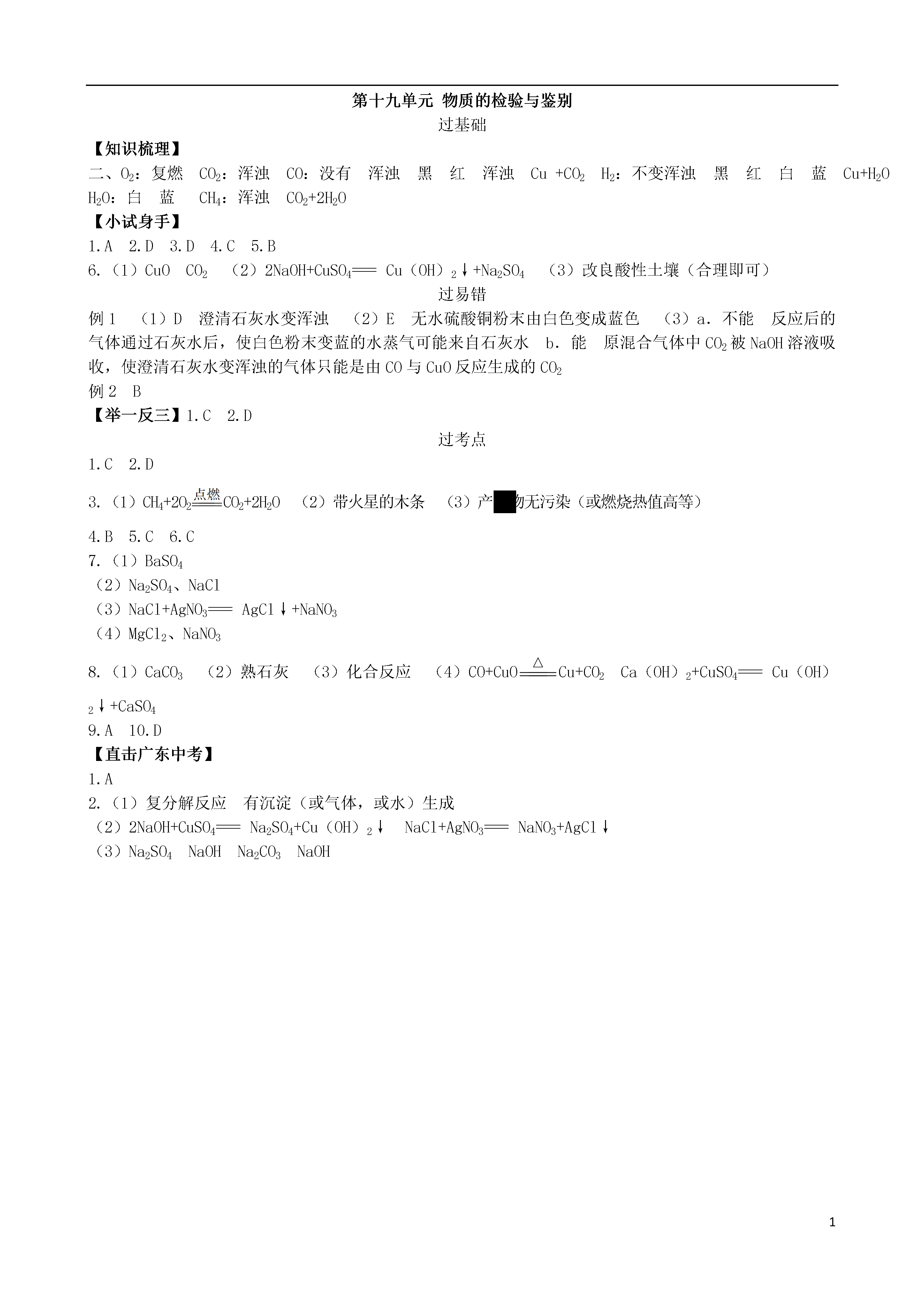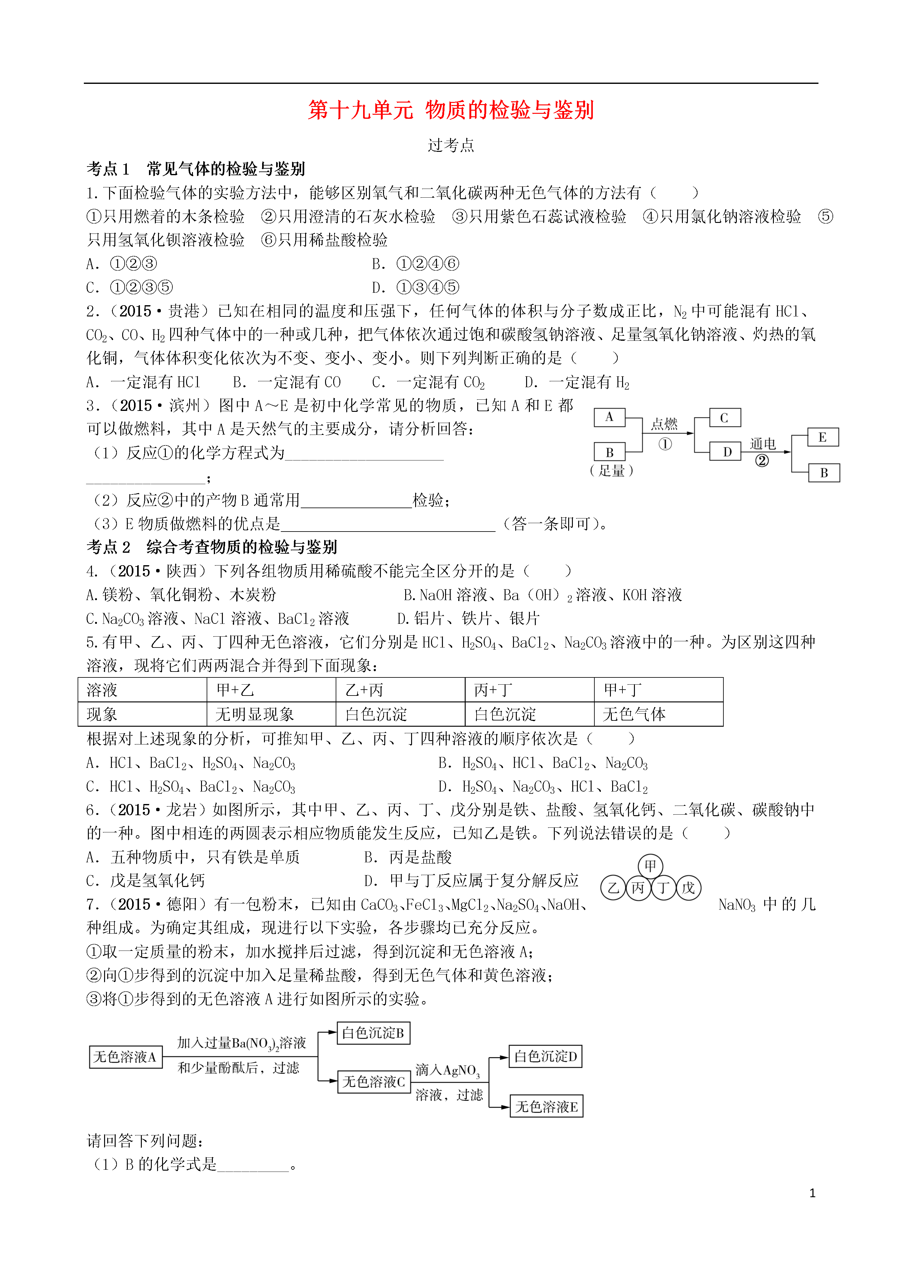 1第十九单元物质的检验与鉴别过考点考点1常见气体的检验与鉴别1.下面检验气体的实验方法中,能够区别氧气和二氧化碳两种无色气体的方法有()①只用燃着的木条检验②只用澄清的石灰水检验③只用紫色石蕊试液检验④只用氯化钠溶液检验⑤只用氢氧化钡溶液检验⑥只用稀盐酸检验A.①②③B.①②④⑥C.①②③⑤D.①③④⑤2.(2015·贵港)已知在相同的温度和压强下,任何气体的体积与分子数成正比,N2中可能混有HCl、CO2、CO、H2四种气体中的一种或几种,把气体依次通过饱和碳酸氢钠溶液、足量氢氧化钠溶液、灼热的氧化铜,气体体积变化依次为不变、变小、变小。则下列判断正确的是()A.一定混有HClB.一定混有COC.一定混有CO2D.一定混有H23.(2015·滨州)图中A~E是初中化学常见的物质,已知A和E都可以做燃料,其中A是天然气的主要成分,请分析回答:反应①的化学方程式为___________________________________;(2)反应②中的产物B通常用检验;(3)E物质做燃料的优点是(答一条即可)。考点2综合考查物质的检验与鉴别4.(2015·陕西)下列各组物质用稀硫酸不能完全区分开的是()A.镁粉、氧化铜粉、木炭粉B.NaOH溶液、Ba(OH)2溶液、KOH溶液C.Na2CO3溶液、NaCl溶液、BaCl2溶液D.铝片、铁片、银片5.有甲、乙、丙、丁四种无色溶液,它们分别是HCl、H2SO4、BaCl2、Na2CO3溶液中的一种。为区别这四种溶液,现将它们两两混合并得到下面现象:溶液甲+乙乙+丙丙+丁甲+丁现象无明显现象白色沉淀白色沉淀无色气体根据对上述现象的分析,可推知甲、乙、丙、丁四种溶液的顺序依次是()A.HCl、BaCl2、H2SO4、Na2CO3B.H2SO4、HCl、BaCl2、Na2CO3C.HCl、H2SO4、BaCl2、Na2CO3D.H2SO4、Na2CO3、HCl、BaCl26.(2015·龙岩)如图所示,其中甲、乙、丙、丁、戊分别是铁、盐酸、氢氧化钙、二氧化碳、碳酸钠中的一种。图中相连的两圆表示相应物质能发生反应,已知乙是铁。下列说法错误的是()A.五种物质中,只有铁是单质B.丙是盐酸C.戊是氢氧化钙D.甲与丁反应属于复分解反应7.(2015·德阳)有一包粉末,已知由CaCO3、FeCl3、MgCl2、Na2SO4、NaOH、NaNO3中的几种组成。为确定其组成,现进行以下实验,各步骤均已充分反应。①取一定质量的粉末,加水搅拌后过滤,得到沉淀和无色溶液A;②向①步得到的沉淀中加入足量稀盐酸,得到无色气体和黄色溶液;③将①步得到的无色溶液A进行如图所示的实验。请回答下列问题:(1)B的化学式是_________。(2)A中一定存在的溶质的化学式是___________________。(3)生成白色沉淀D的化学方程式是___________________________________。(4)这包粉末中可能含有物质的化学式是_________________________。8.(2015·营口)A~K是初中化学常见的物质,它们之间的转化关系如图所示(“→”指向生成物)。其中A为红色固体,B、C的元素组成相同,I是某建筑材料的主要成分,F、K两种物质常用于配置农药波尔多液。请回答下列问题:(1)物质I的化学式是。(2)物质K的俗名是(写一种即可)。(3)反应⑥的基本反应类型为。(4)反应①的化学方程式为,反应③的化学方程式为。考点3生活中常见物质的检验与鉴别9.“假黄金”欺骗了很多人,“假黄金”的主要成分是铜锌合金。下列区别真假黄金的方法中不正确的是()A.根据外观判断B.测量金属的密度C.在火焰上灼烧,观察颜色的变化D.放在稀硫酸中,如果有气泡产生,说明黄金是假的10.下列鉴别物质所用的方法或试剂,错误的是()A.磷肥和氮肥——观察颜色B.铁粉和炭粉——用稀硫酸C.羊毛和合成纤维——点燃闻气味D.食盐水和蔗糖水溶液——观察溶液颜色直击广东中考1.(2013年)下列实验方法错误的是()A.用稀硝酸除去NaCl中混有的Na2CO3B.用带火星的木条区别空气和O2C.用水区分NH4NO3和固体NaOH两种固体D.用湿润的石蕊试纸区别CO和CO22.(2012年)有五种化合物,它们两两之间发生的某些转化关系如图所示,请回答:(1)Na2SO4NaCl的转化反应属于反应(填基本反应类型);这一类型反应能发生必须具备的条件之一是(填一种)。(2)写出下列转化的化学方程式:NaOHNa2SO4___________________________________;NaClNa