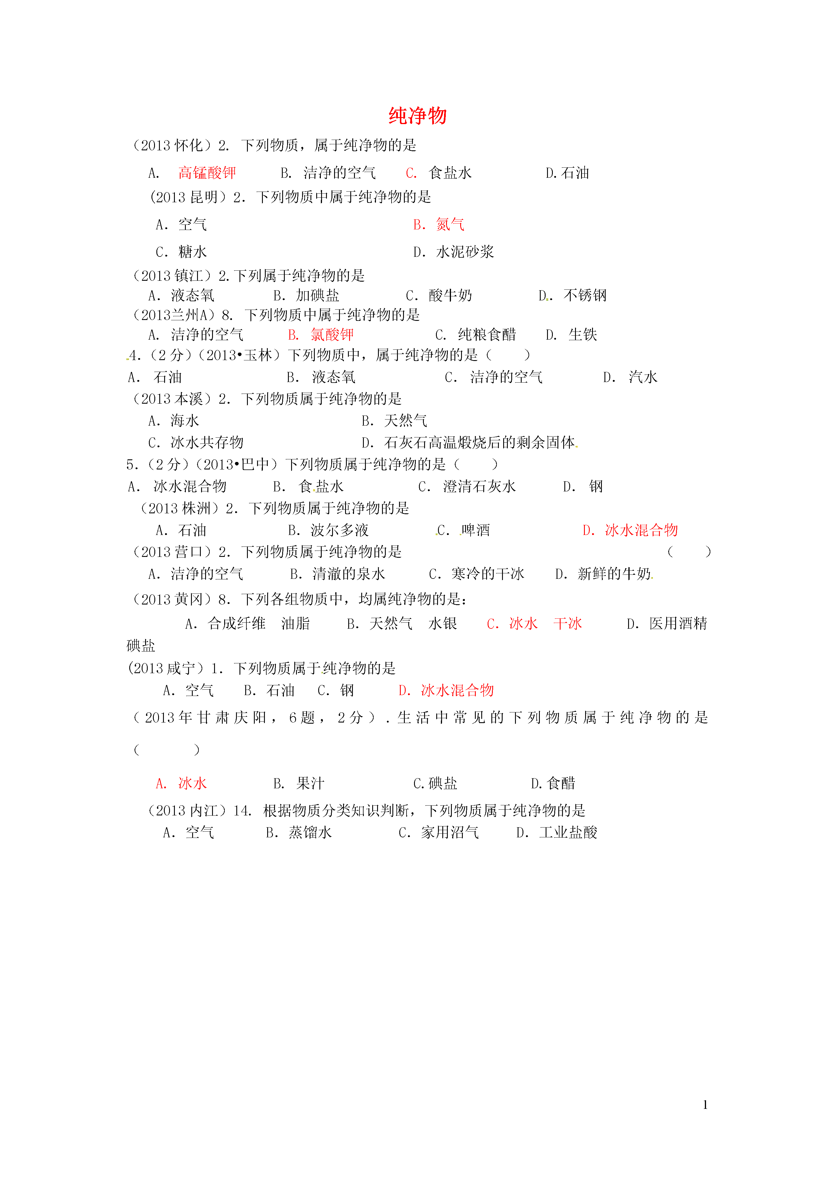 试题-云南-2016_云南省广南县篆角乡初级中学校2013年中考化学试题汇编 1 物质的构成和变化 考点3 物质的分类 2纯净物.doc