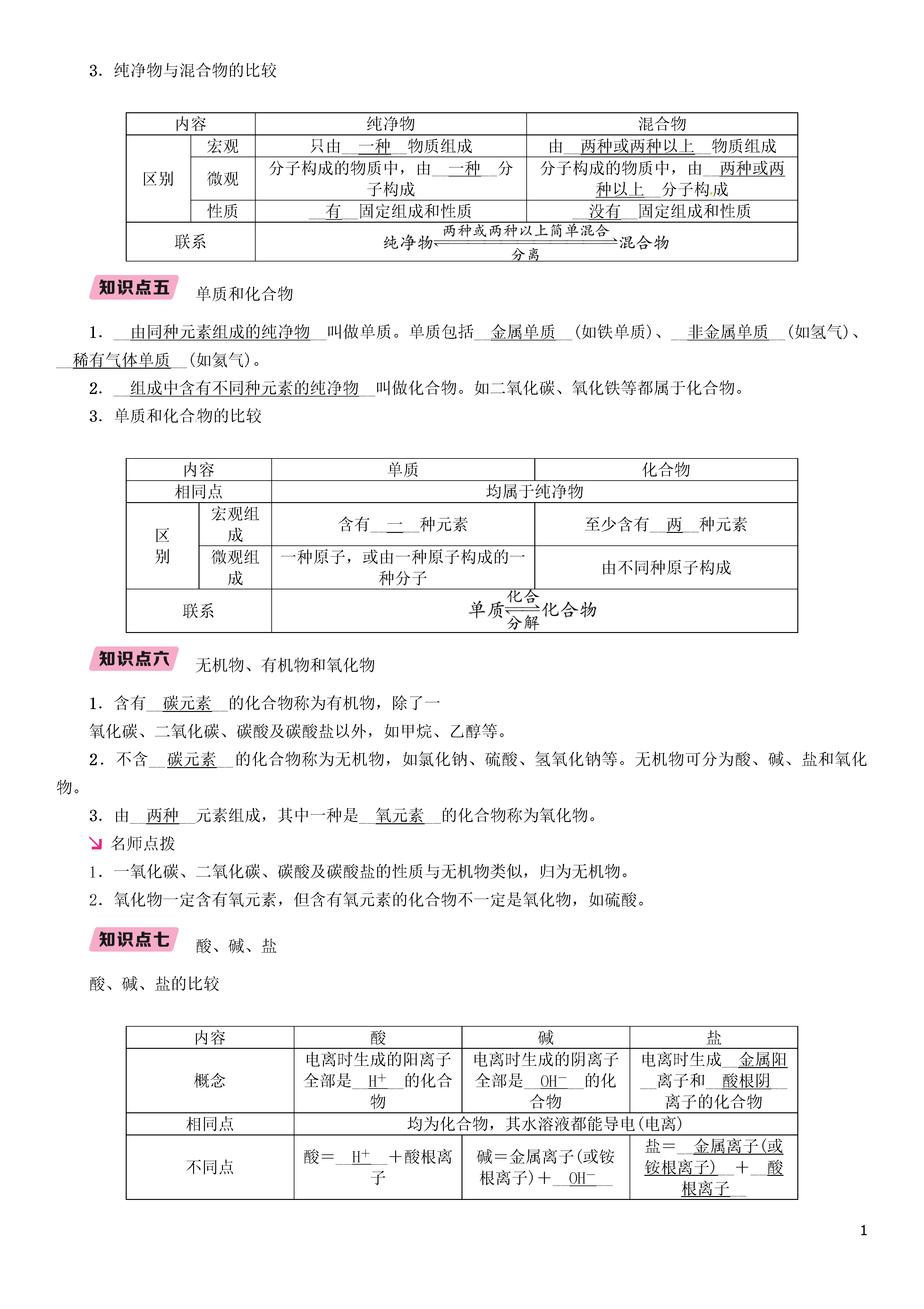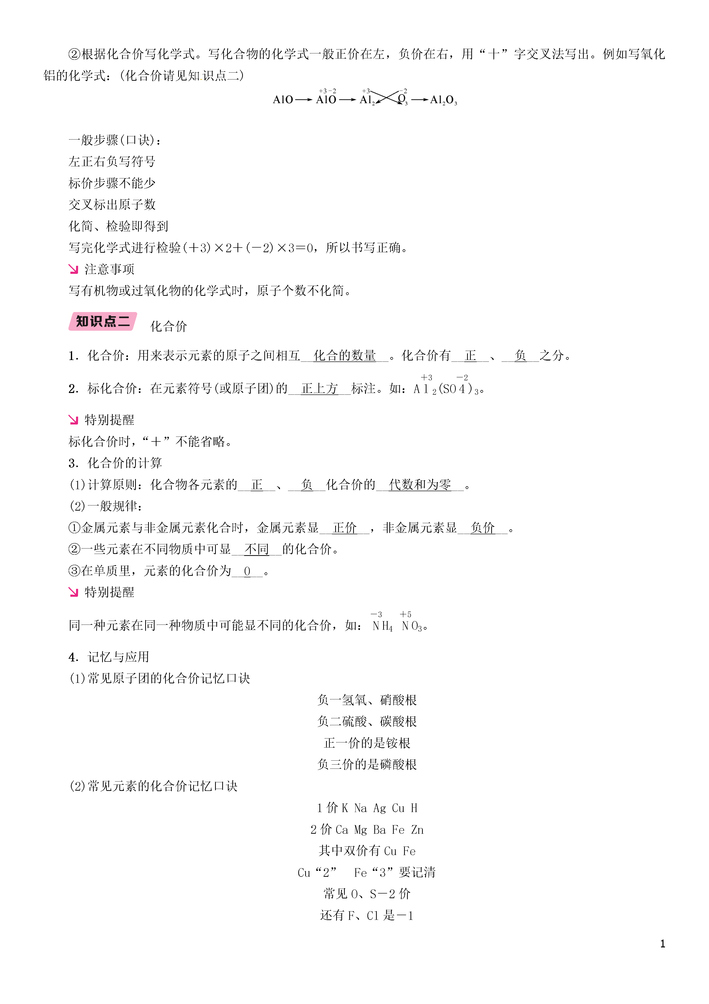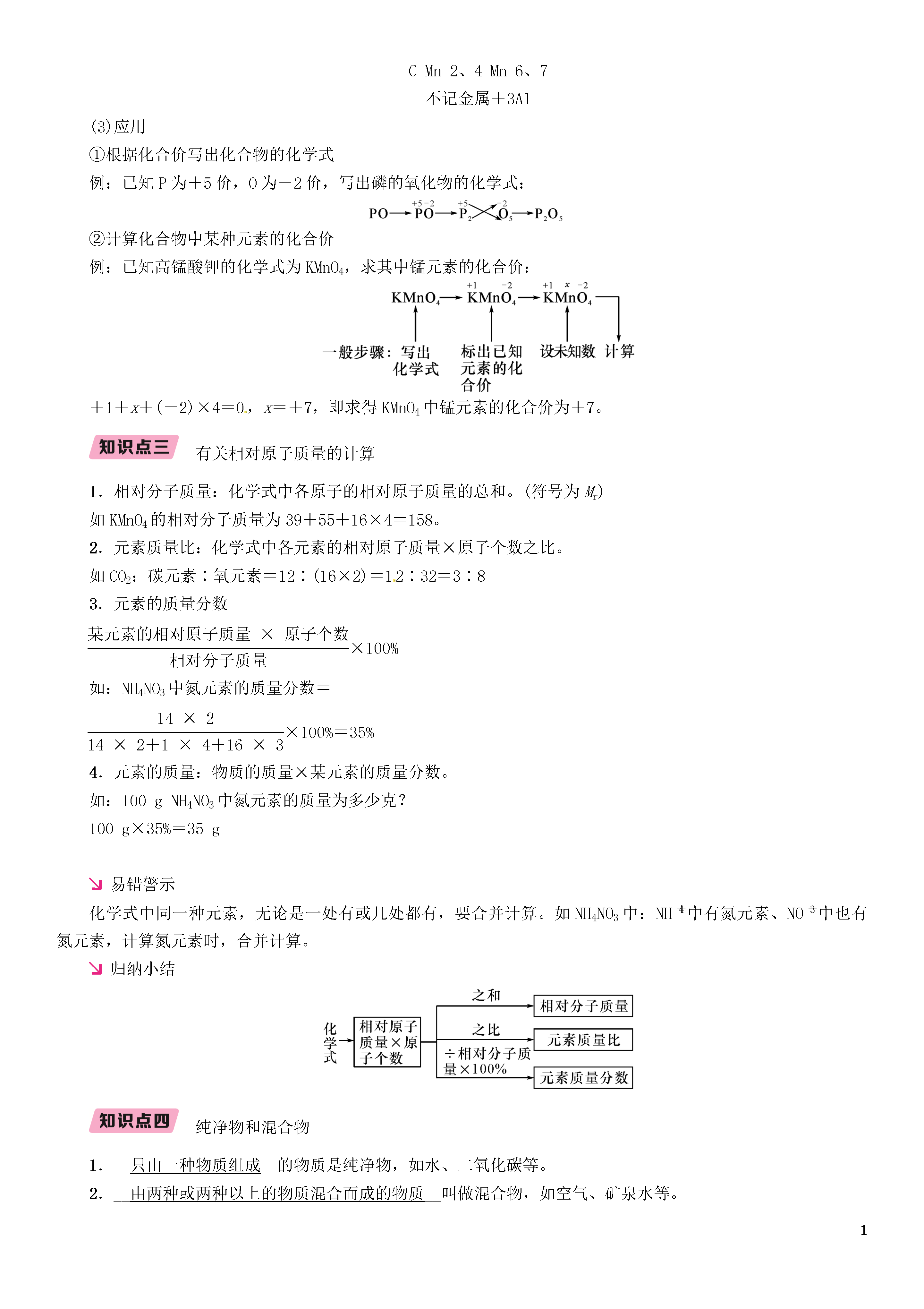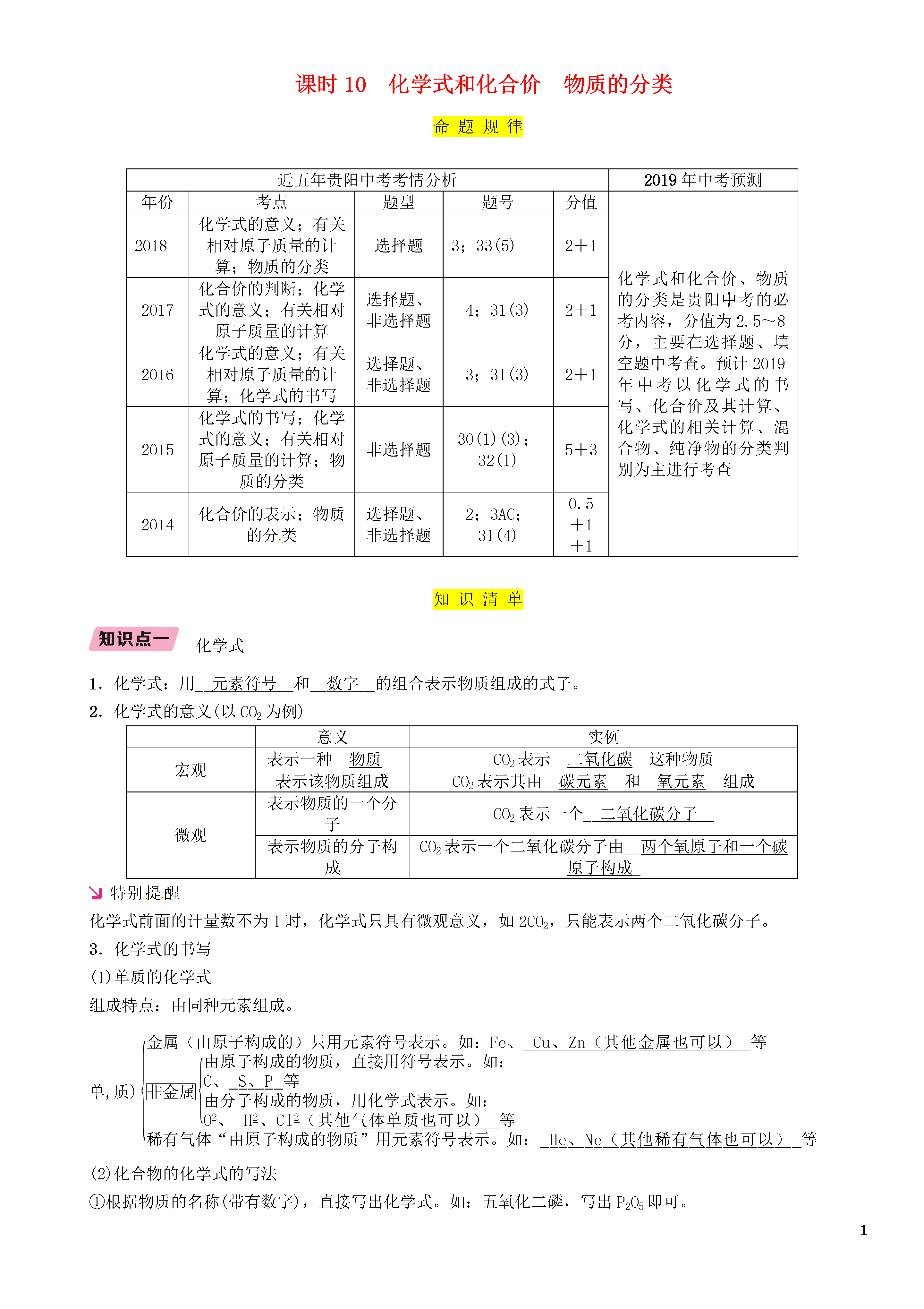 1课时10化学式和化合价物质的分类命题规律近五年贵阳中考考情分析2019年中考预测年份考点题型题号分值化学式和化合价、物质的分类是贵阳中考的必考内容,分值为2.5~8分,主要在选择题、填空题中考查。预计2019年中考以化学式的书写、化合价及其计算、化学式的相关计算、混合物、纯净物的分类判别为主进行考查2018化学式的意义;有关相对原子质量的计算;物质的分类选择题3;33(5)2+12017化合价的判断;化学式的意义;有关相对原子质量的计算选择题、非选择题4;31(3)2+12016化学式的意义;有关相对原子质量的计算;化学式的书写选择题、非选择题3;31(3)2+12015化学式的书写;化学式的意义;有关相对原子质量的计算;物质的分类非选择题30(1)(3);32(1)5+32014化合价的表示;物质的分类选择题、非选择题2;3AC;31(4)0.5+1+1知识清单化学式1.化学式:用__元素符号__和__数字__的组合表示物质组成的式子。2.化学式的意义(以CO2为例)意义实例宏观表示一种__物质__CO2表示__二氧化碳__这种物质表示该物质组成CO2表示其由__碳元素__和__氧元素__组成微观表示物质的一个分子CO2表示一个__二氧化碳分子__表示物质的分子构成CO2表示一个二氧化碳分子由__两个氧原子和一个碳原子构成_特别提醒化学式前面的计量数不为1时,化学式只具有微观意义,如2CO2,只能表示两个二氧化碳分子。3.化学式的书写(1)单质的化学式组成特点:由同种元素组成。单,质)eq\b\lc\{(\a\vs4\al\co1(\a\vs4\al(金属(由原子构成的)只用元素符号表示。如:Fe、Cu、Zn(其他金属也可以)等,\x(非金属)\b\lc\{(\a\vs4\al\co1(由原子构成的物质,直接用符号表示。如:,C、S、P等,由分子构成的物质,用化学式表示。如:,O2、H2、Cl2(其他气体单质也可以)等)),稀有气体“由原子构成的物质”用元素符号表示。如:He、Ne(其他稀有气体也可以)等)))(2)化合物的化学式的写法①根据物质的名称(带有数字),直接写出化学式。如:五氧化二磷,写出P2O5即可。②根据化合价写化学式。写化合物的化学式一般正价在左,负价在右,用“十”字交叉法写出。例如写氧化铝的化学式:(化合价请见知识点二)一般步骤(口诀):左正右负写符号标价步骤不能少交叉标出原子数化简、检验即得到写完化学式进行检验(+3)×2+(-2)×3=0,所以书写正确。注意事项写有机物或过氧化物的化学式时,原子个数不化简。化合价1.化合价:用来表示元素的原子之间相互__化合的数量__。化合价有__正__、__负__之分。2.标化合价:在元素符号(或原子团)的__正上方__标注。如:Aeq\o(l,\s\up6(+3))2(SOeq\o(4,\s\up6(-2)))3。特别提醒标化合价时,“+”不能省略。3.化合价的计算(1)计算原则:化合物各元素的__正__、__负__化合价的__代数和为零__。(2)一般规律:①金属元素与非金属元素化合时,金属元素显__正价__,非金属元素显__负价__。②一些元素在不同物质中可显__不同__的化合价。③在单质里,元素的化合价为__0__。特别提醒同一种元素在同一种物质中可能显不同的化合价,如:eq\o(N,\s\up6(-3))H4eq\o(N,\s\up6(+5))O3。4.记忆与应用(1)常见原子团的化合价记忆口诀负一氢氧、硝酸根负二硫酸、碳酸根正一价的是铵根负三价的是磷酸根(2)常见元素的化合价记忆口诀1价KNaAgCuH2价CaMgBaFeZn其中双价有CuFeCu“2”Fe“3”要记清常见O、S-2价还有F、Cl是-1CMn2、4Mn6、7不记金属+3Al(3)应用①根据化合价写出化合物的化学式例:已知P为+5价,O为-2价,写出磷的氧化物的化学式:②计算化合物中某种元素的化合价例:已知高锰酸钾的化学式为KMnO4,求其中锰元素的化合价:+1+x+(-2)×4=0,x=+7,即求得KMnO4中锰元素的化合价为+7。有关相对原子质量的计算1.相对分子质量:化学式中各原子的相对原子质量的总和。(符号为Mr)如KMnO4的相对分子质量为39+55+16×4=158。2.元素质量比:化学式中各元素的相对原子质量×原子个数之比。如CO2:碳元素∶氧元素=12∶(16×2)=12∶32=3∶83.元素的质量分数eq\f(某元素的相对原子质量×原子个数,相对分子质量)×100%如:NH4NO