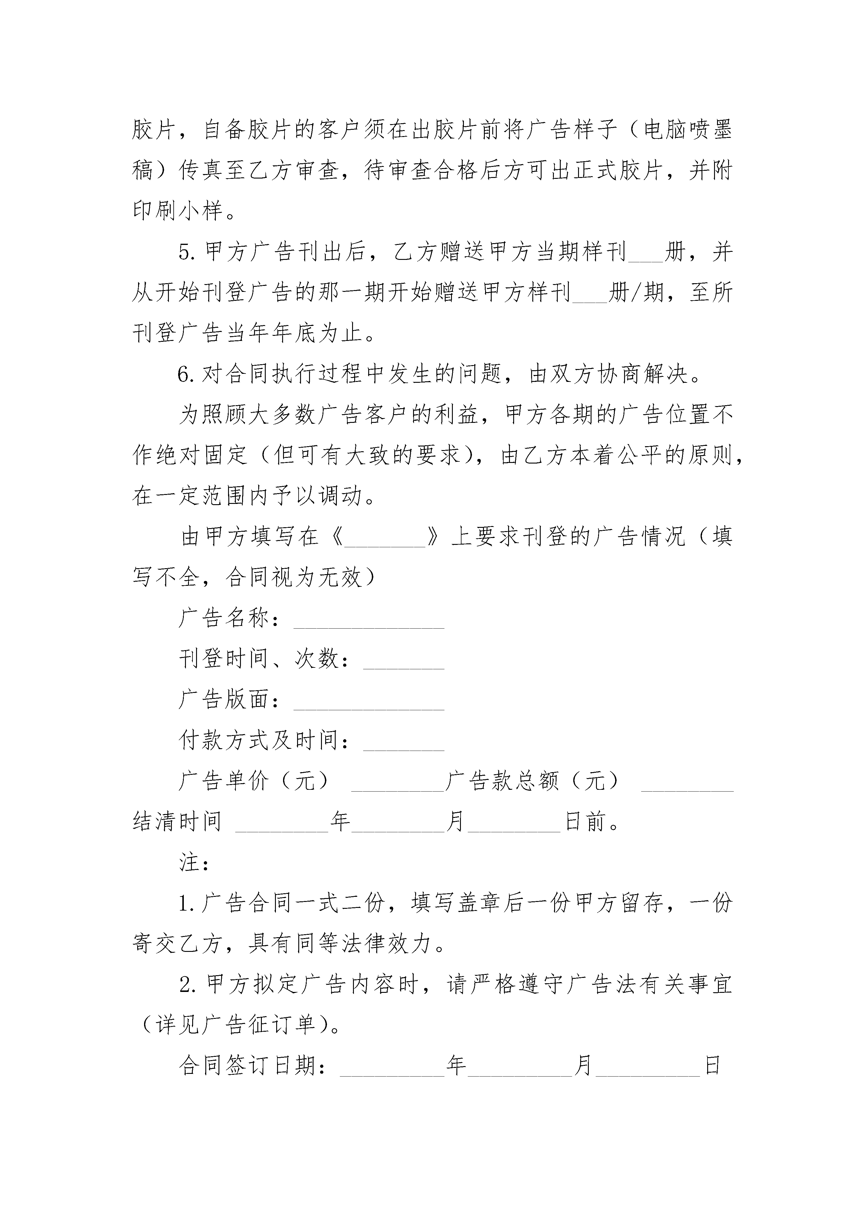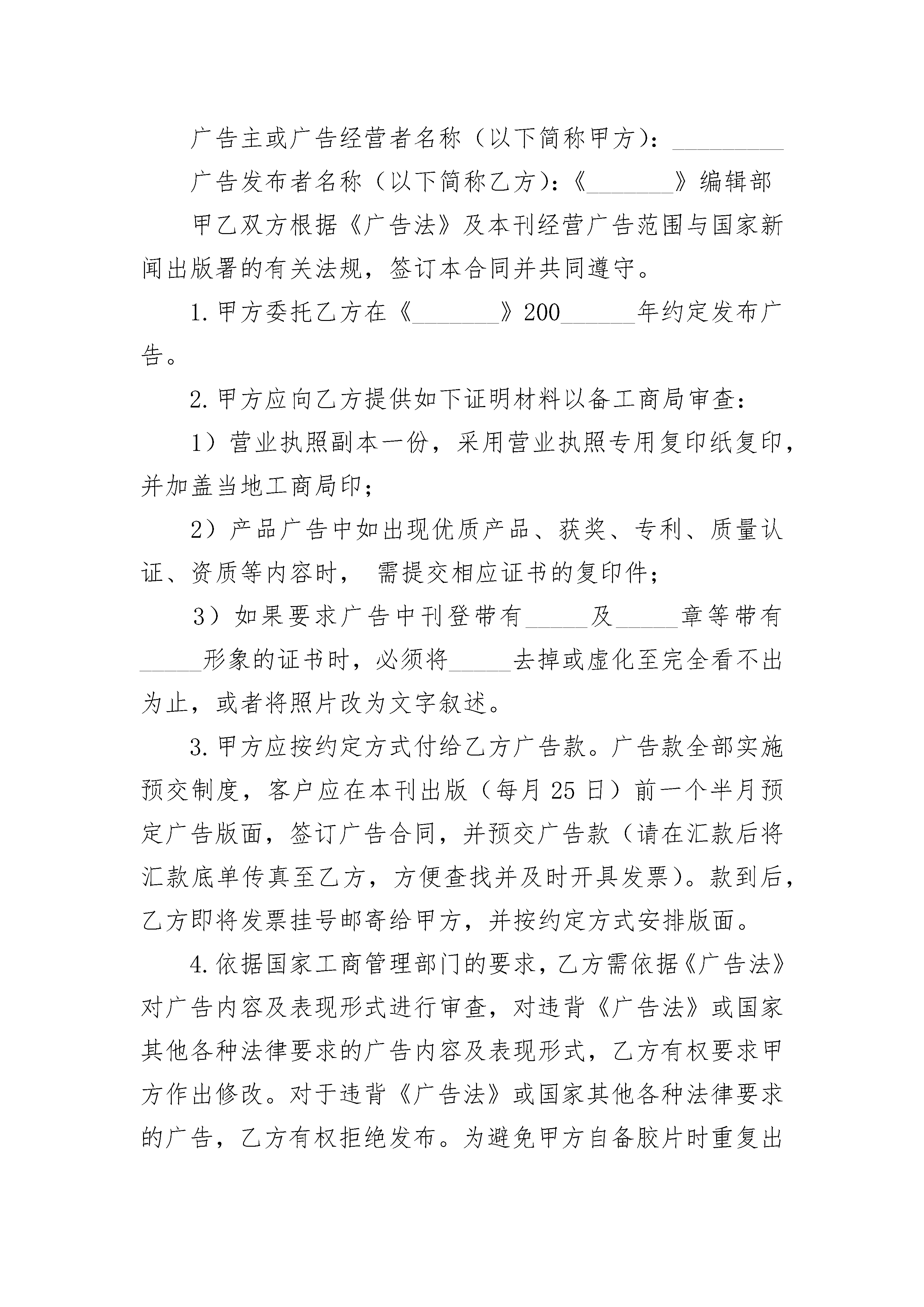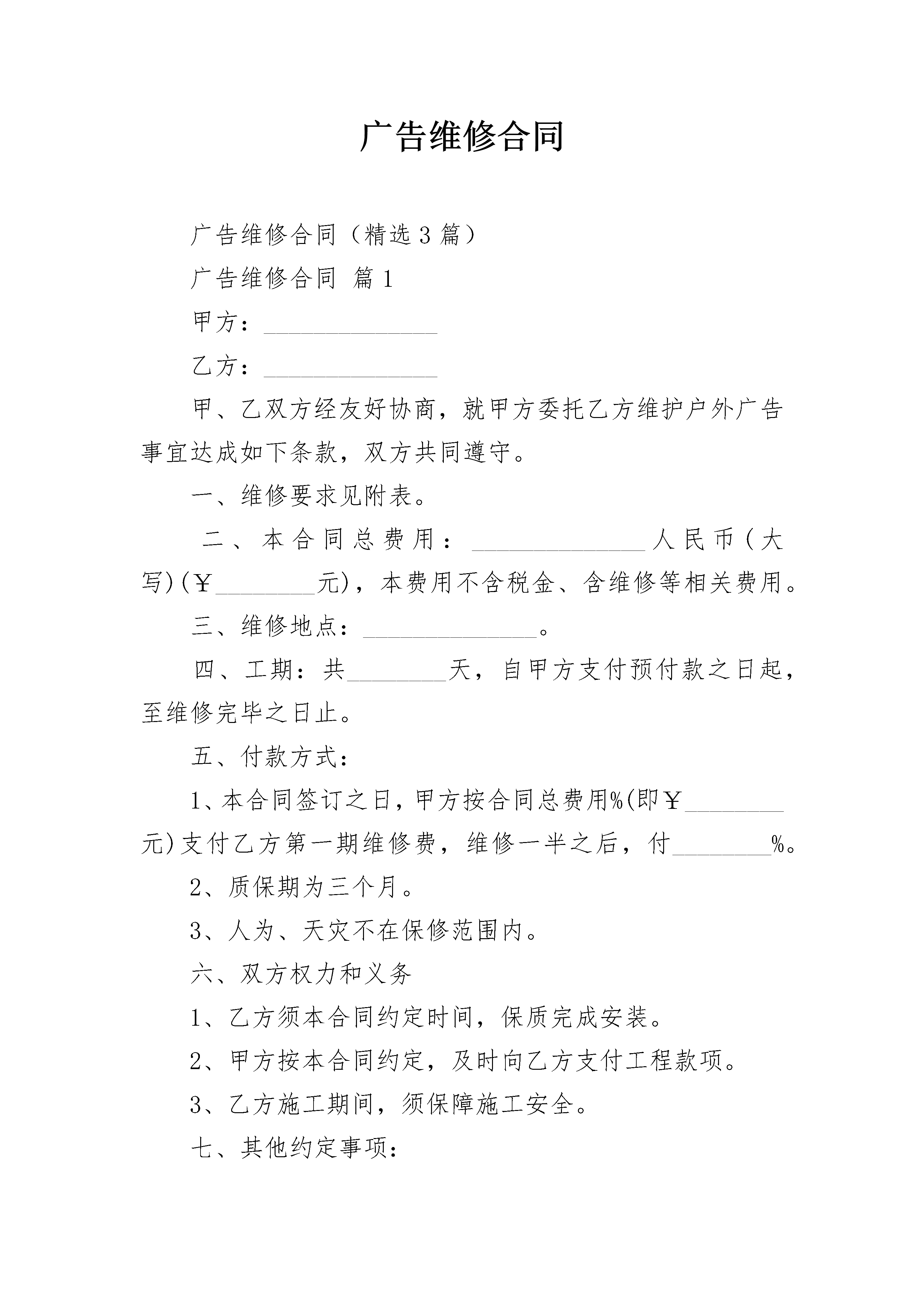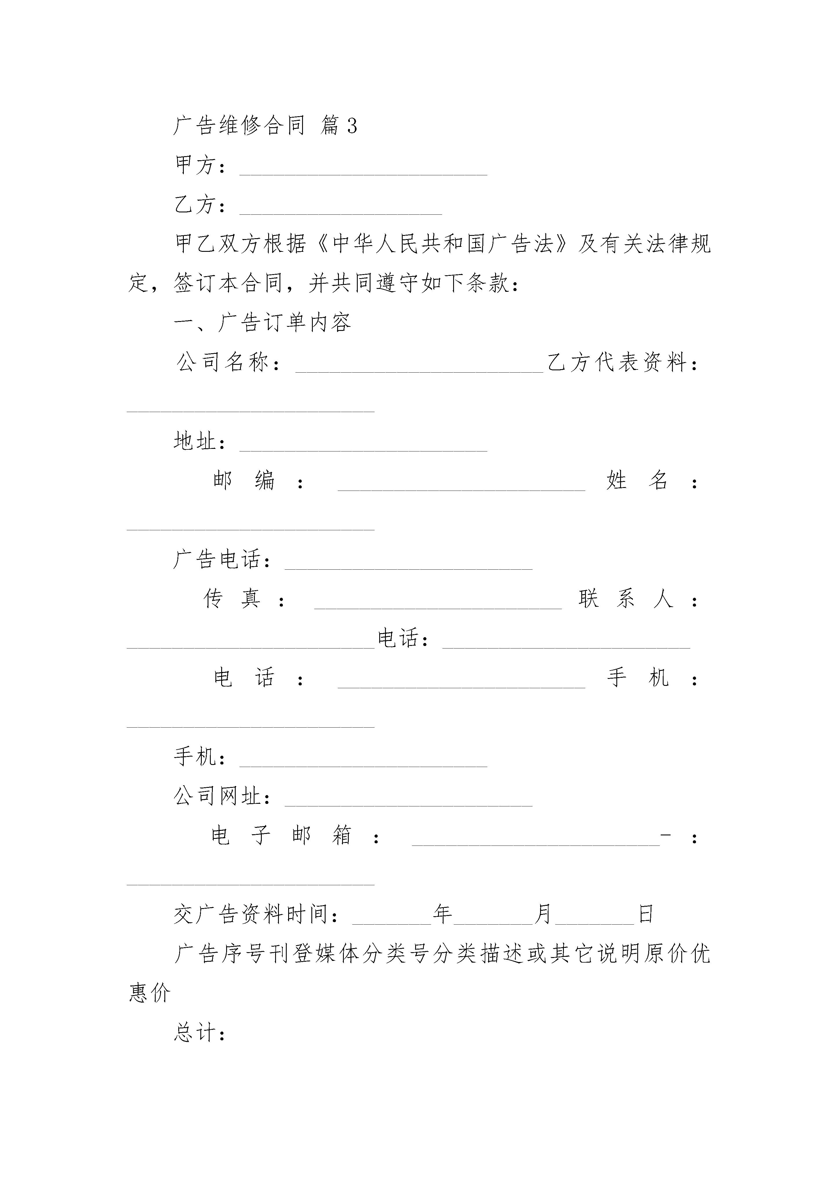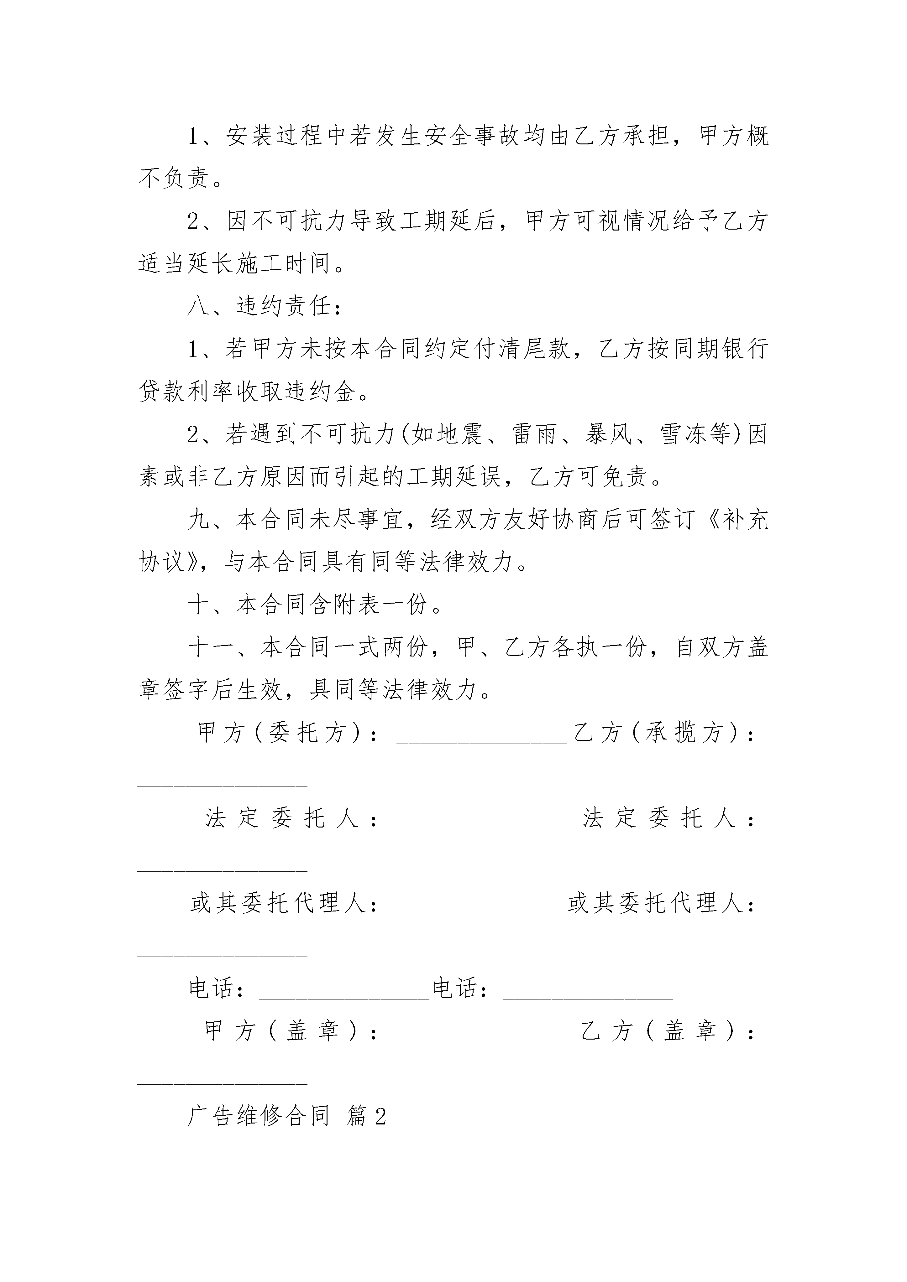 广告维修合同广告维修合同(精选3篇)广告维修合同篇1甲方:______________乙方:______________甲、乙双方经友好协商,就甲方委托乙方维护户外广告事宜达成如下条款,双方共同遵守。一、维修要求见附表。二、本合同总费用:______________人民币(大写)(¥________元),本费用不含税金、含维修等相关费用。三、维修地点:______________。四、工期:共________天,自甲方支付预付款之日起,至维修完毕之日止。五、付款方式:1、本合同签订之日,甲方按合同总费用%(即¥________元)支付乙方第一期维修费,维修一半之后,付________%。2、质保期为三个月。3、人为、天灾不在保修范围内。六、双方权力和义务1、乙方须本合同约定时间,保质完成安装。2、甲方按本合同约定,及时向乙方支付工程款项。3、乙方施工期间,须保障施工安全。七、其他约定事项:1、安装过程中若发生安全事故均由乙方承担,甲方概不负责。2、因不可抗力导致工期延后,甲方可视情况给予乙方适当延长施工时间。八、违约责任:1、若甲方未按本合同约定付清尾款,乙方按同期银行贷款利率收取违约金。2、若遇到不可抗力(如地震、雷雨、暴风、雪冻等)因素或非乙方原因而引起的工期延误,乙方可免责。九、本合同未尽事宜,经双方友好协商后可签订《补充协议》,与本合同具有同等法律效力。十、本合同含附表一份。十一、本合同一式两份,甲、乙方各执一份,自双方盖章签字后生效,具同等法律效力。甲方(委托方):______________乙方(承揽方):______________法定委托人:______________法定委托人:______________或其委托代理人:______________或其委托代理人:______________电话:______________电话:______________甲方(盖章):______________乙方(盖章):______________广告维修合同篇2广告主或广告经营者名称(以下简称甲方):_________广告发布者名称(以下简称乙方):《_______》编辑部甲乙双方根据《广告法》及本刊经营广告范围与国家新闻出版署的有关法规,签订本合同并共同遵守。1.甲方委托乙方在《_______》200______年约定发布广告。2.甲方应向乙方提供如下证明材料以备工商局审查:1)营业执照副本一份,采用营业执照专用复印纸复印,并加盖当地工商局印;2)产品广告中如出现优质产品、获奖、专利、质量认证、资质等内容时,需提交相应证书的复印件;3)如果要求广告中刊登带有_____及_____章等带有_____形象的证书时,必须将_____去掉或虚化至完全看不出为止,或者将照片改为文字叙述。3.甲方应按约定方式付给乙方广告款。广告款全部实施预交制度,客户应在本刊出版(每月25日)前一个半月预定广告版面,签订广告合同,并预交广告款(请在汇款后将汇款底单传真至乙方,方便查找并及时开具发票)。款到后,乙方即将发票挂号邮寄给甲方,并按约定方式安排版面。4.依据国家工商管理部门的要求,乙方需依据《广告法》对广告内容及表现形式进行审查,对违背《广告法》或国家其他各种法律要求的广告内容及表现形式,乙方有权要求甲方作出修改。对于违背《广告法》或国家其他各种法律要求的广告,乙方有权拒绝发布。为避免甲方自备胶片时重复出胶片,自备胶片的客户须在出胶片前将广告样子(电脑喷墨稿)传真至乙方审查,待审查合格后方可出正式胶片,并附印刷小样。5.甲方广告刊出后,乙方赠送甲方当期样刊___册,并从开始刊登广告的那一期开始赠送甲方样刊___册/期,至所刊登广告当年年底为止。6.对合同执行过程中发生的问题,由双方协商解决。为照顾大多数广告客户的利益,甲方各期的广告位置不作绝对固定(但可有大致的要求),由乙方本着公平的原则,在一定范围内予以调动。由甲方填写在《_______》上要求刊登的广告情况(填写不全,合同视为无效)广告名称:_____________刊登时间、次数:_______广告版面:_____________付款方式及时间:_______广告单价(元)________广告款总额(元)________结清时间________年________月________日前。注:1.广告合同一式二份,填写盖章后一份甲方留存,一份寄交乙方,具有同等法律效力。2.甲方拟定广告内容时,请严格遵守广告法有关事宜(详见广告征订单)。合同签订日期:_________年_________月_________日广告维修合同篇3甲方:______________________乙方:__________________甲乙双方根据《中华人民共和国广告法》及有关法律规定,签订本合