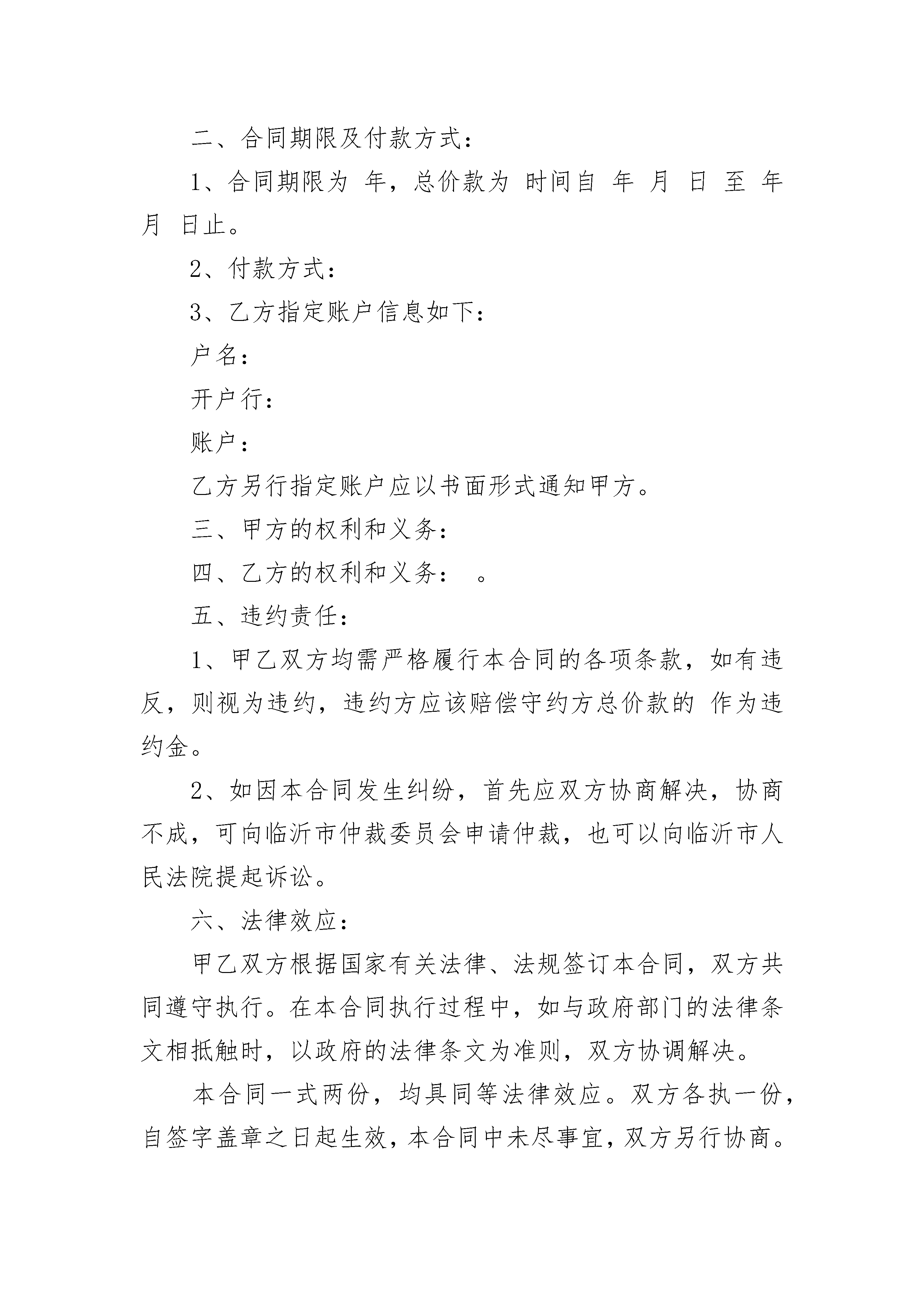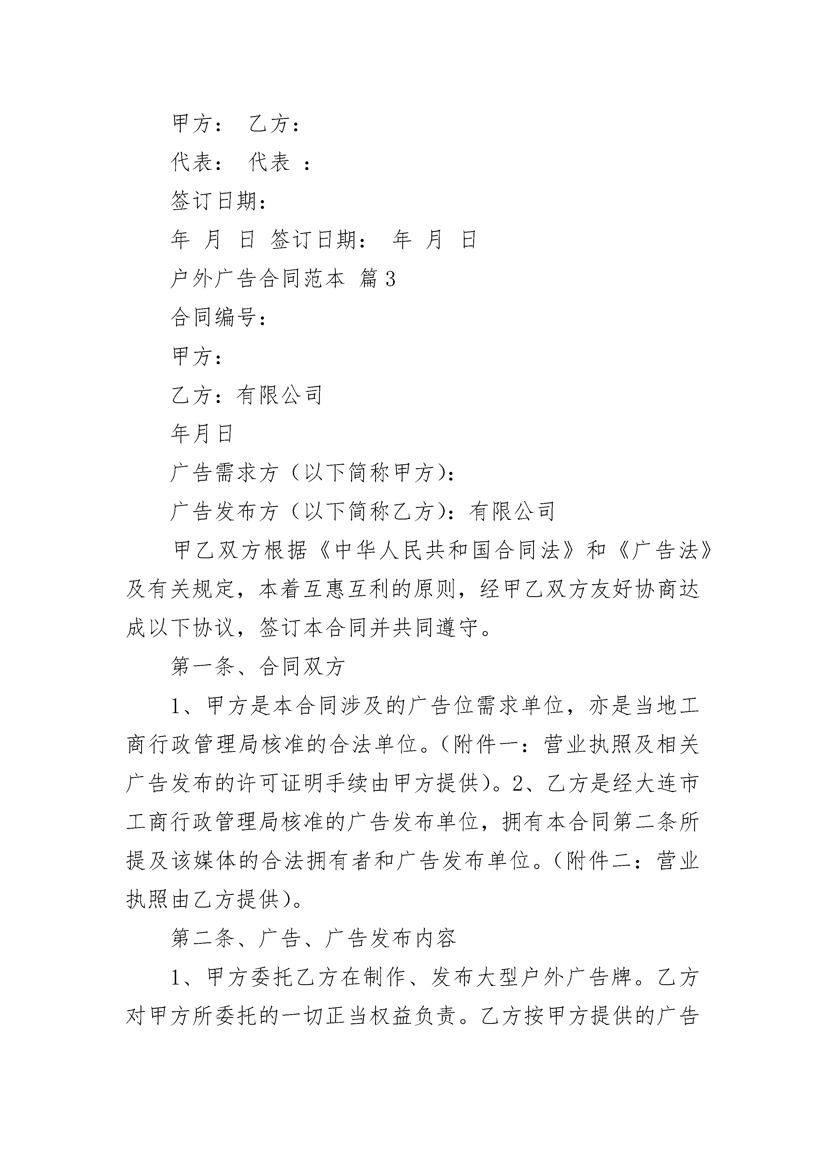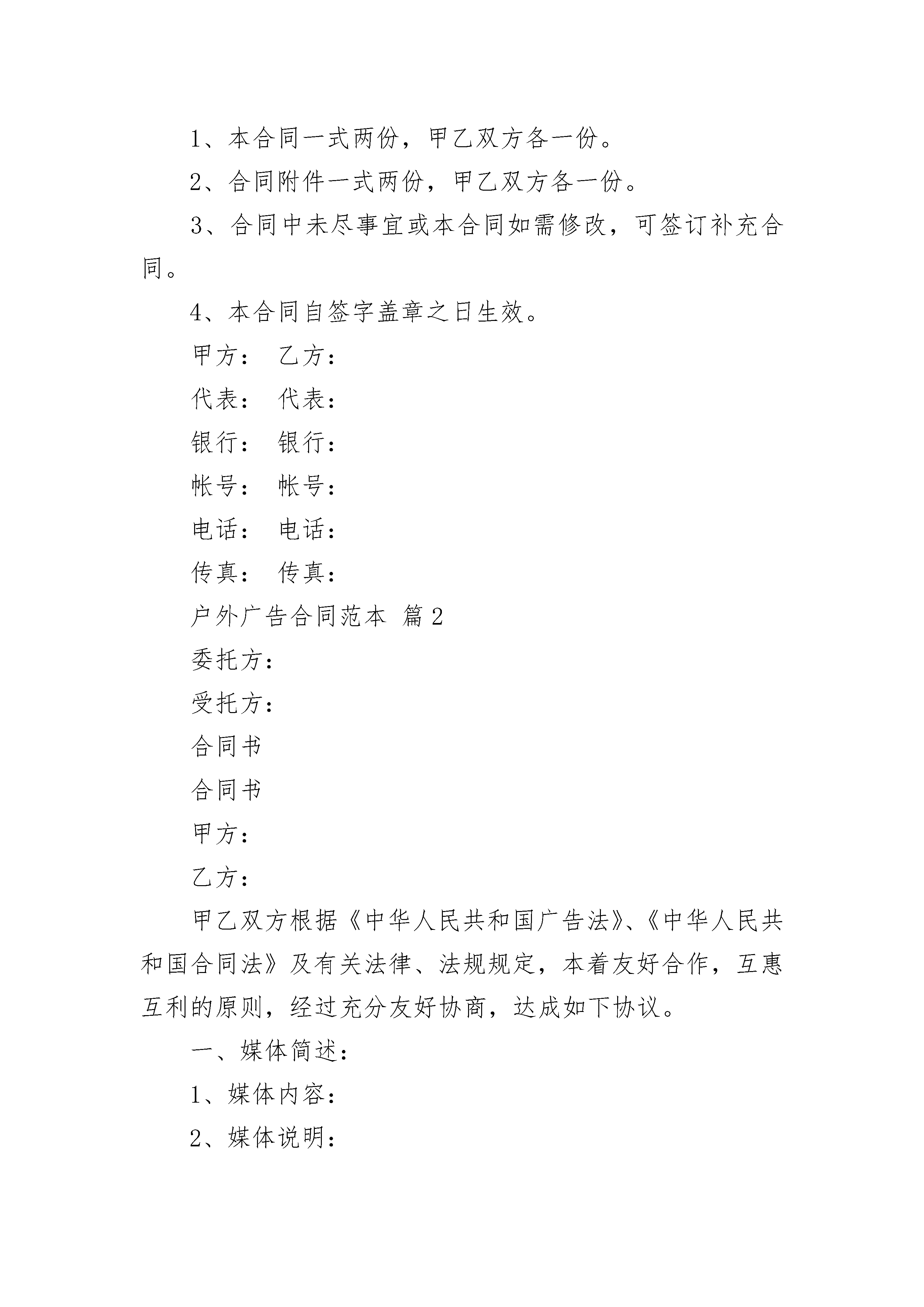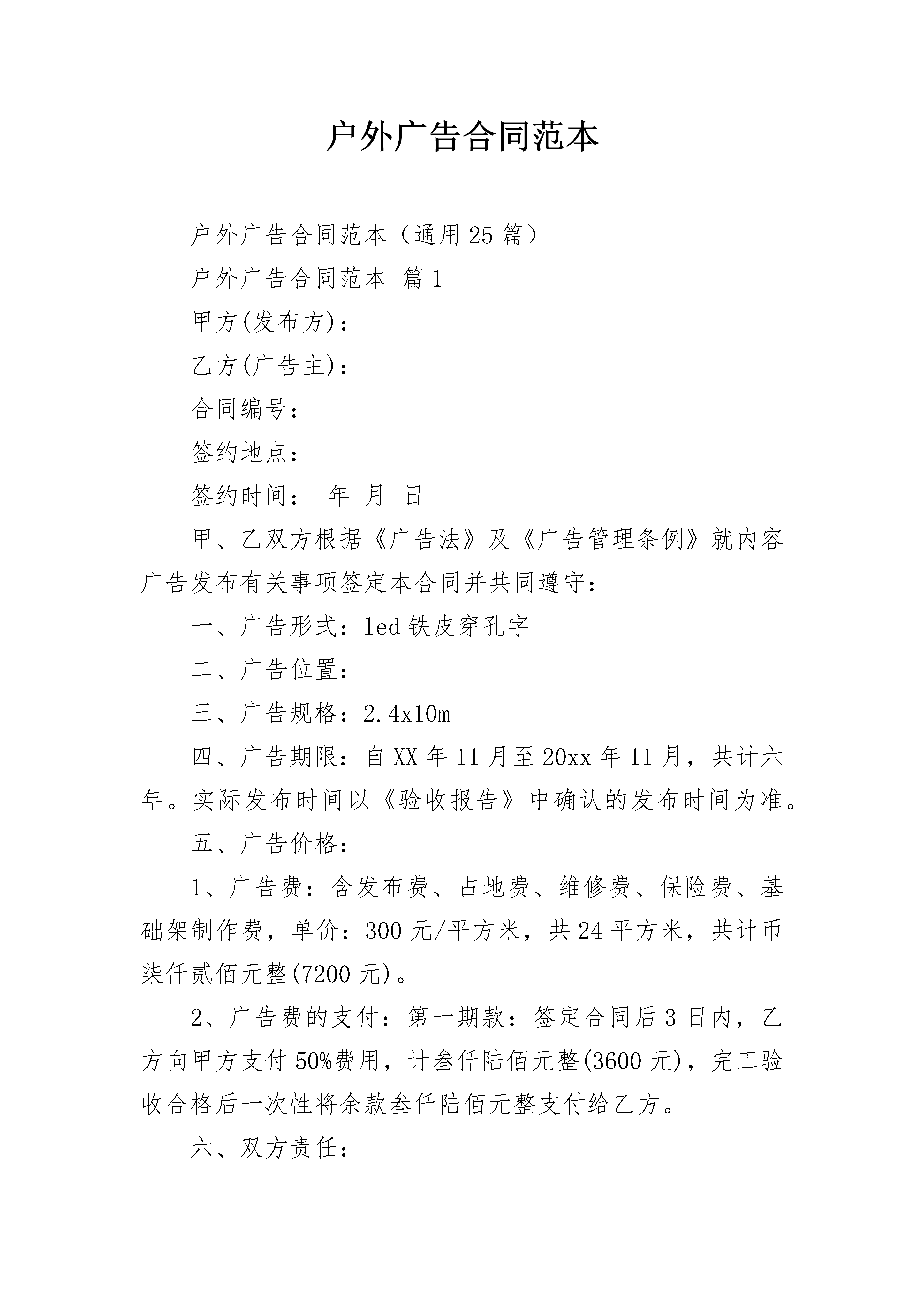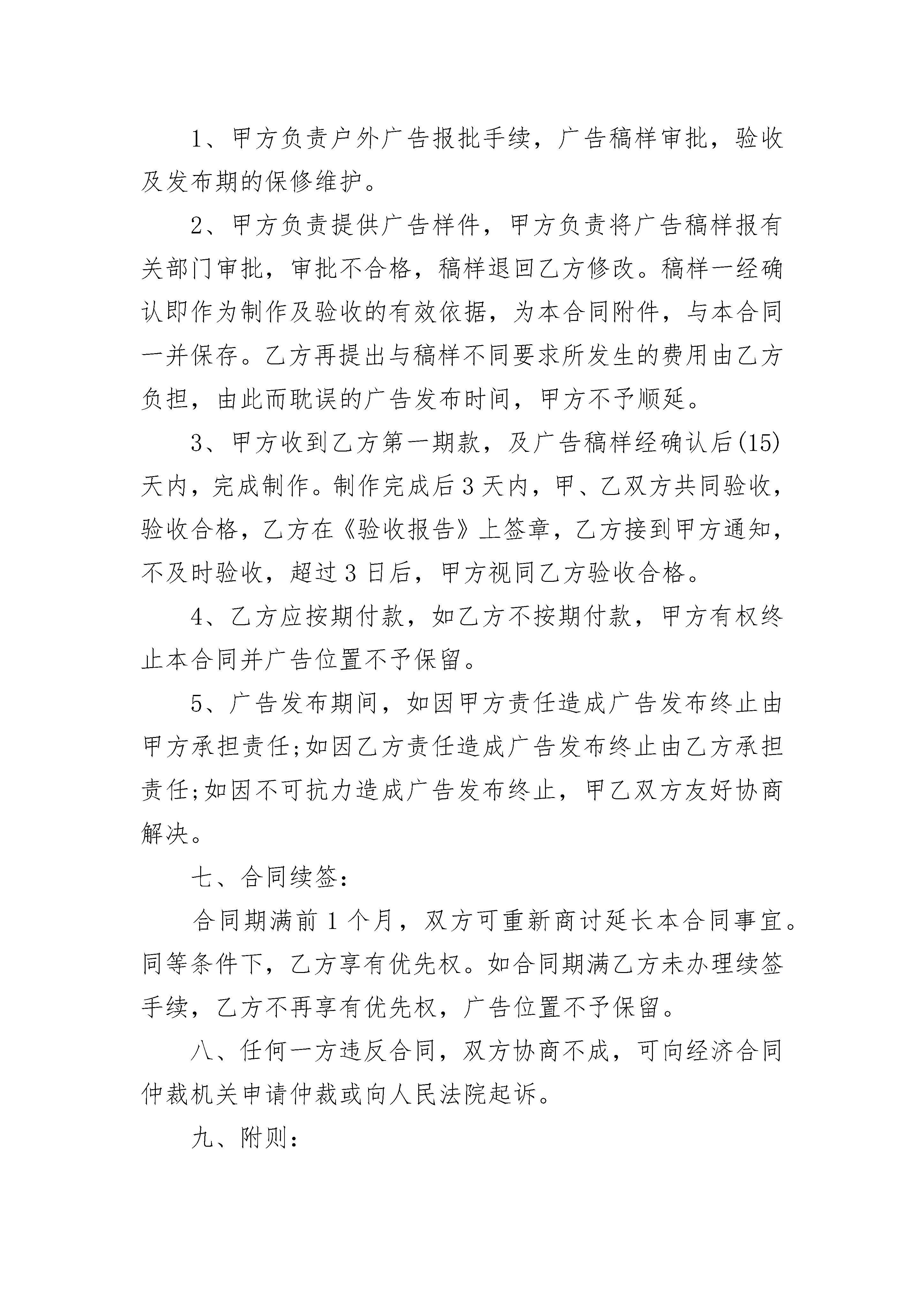 户外广告合同范本户外广告合同范本(通用25篇)户外广告合同范本篇1甲方(发布方):乙方(广告主):合同编号:签约地点:签约时间:年月日甲、乙双方根据《广告法》及《广告管理条例》就内容广告发布有关事项签定本合同并共同遵守:一、广告形式:led铁皮穿孔字二、广告位置:三、广告规格:2.4x10m四、广告期限:自XX年11月至20xx年11月,共计六年。实际发布时间以《验收报告》中确认的发布时间为准。五、广告价格:1、广告费:含发布费、占地费、维修费、保险费、基础架制作费,单价:300元/平方米,共24平方米,共计币柒仟贰佰元整(7200元)。2、广告费的支付:第一期款:签定合同后3日内,乙方向甲方支付50%费用,计叁仟陆佰元整(3600元),完工验收合格后一次性将余款叁仟陆佰元整支付给乙方。六、双方责任:1、甲方负责户外广告报批手续,广告稿样审批,验收及发布期的保修维护。2、甲方负责提供广告样件,甲方负责将广告稿样报有关部门审批,审批不合格,稿样退回乙方修改。稿样一经确认即作为制作及验收的有效依据,为本合同附件,与本合同一并保存。乙方再提出与稿样不同要求所发生的费用由乙方负担,由此而耽误的广告发布时间,甲方不予顺延。3、甲方收到乙方第一期款,及广告稿样经确认后(15)天内,完成制作。制作完成后3天内,甲、乙双方共同验收,验收合格,乙方在《验收报告》上签章,乙方接到甲方通知,不及时验收,超过3日后,甲方视同乙方验收合格。4、乙方应按期付款,如乙方不按期付款,甲方有权终止本合同并广告位置不予保留。5、广告发布期间,如因甲方责任造成广告发布终止由甲方承担责任;如因乙方责任造成广告发布终止由乙方承担责任;如因不可抗力造成广告发布终止,甲乙双方友好协商解决。七、合同续签:合同期满前1个月,双方可重新商讨延长本合同事宜。同等条件下,乙方享有优先权。如合同期满乙方未办理续签手续,乙方不再享有优先权,广告位置不予保留。八、任何一方违反合同,双方协商不成,可向经济合同仲裁机关申请仲裁或向人民法院起诉。九、附则:1、本合同一式两份,甲乙双方各一份。2、合同附件一式两份,甲乙双方各一份。3、合同中未尽事宜或本合同如需修改,可签订补充合同。4、本合同自签字盖章之日生效。甲方:乙方:代表:代表:银行:银行:帐号:帐号:电话:电话:传真:传真:户外广告合同范本篇2委托方:受托方:合同书合同书甲方:乙方:甲乙双方根据《中华人民共和国广告法》、《中华人民共和国合同法》及有关法律、法规规定,本着友好合作,互惠互利的原则,经过充分友好协商,达成如下协议。一、媒体简述:1、媒体内容:2、媒体说明:二、合同期限及付款方式:1、合同期限为年,总价款为时间自年月日至年月日止。2、付款方式:3、乙方指定账户信息如下:户名:开户行:账户:乙方另行指定账户应以书面形式通知甲方。三、甲方的权利和义务:四、乙方的权利和义务:。五、违约责任:1、甲乙双方均需严格履行本合同的各项条款,如有违反,则视为违约,违约方应该赔偿守约方总价款的作为违约金。2、如因本合同发生纠纷,首先应双方协商解决,协商不成,可向临沂市仲裁委员会申请仲裁,也可以向临沂市人民法院提起诉讼。六、法律效应:甲乙双方根据国家有关法律、法规签订本合同,双方共同遵守执行。在本合同执行过程中,如与政府部门的法律条文相抵触时,以政府的法律条文为准则,双方协调解决。本合同一式两份,均具同等法律效应。双方各执一份,自签字盖章之日起生效,本合同中未尽事宜,双方另行协商。甲方:乙方:代表:代表:签订日期:年月日签订日期:年月日户外广告合同范本篇3合同编号:甲方:乙方:有限公司年月日广告需求方(以下简称甲方):广告发布方(以下简称乙方):有限公司甲乙双方根据《中华人民共和国合同法》和《广告法》及有关规定,本着互惠互利的原则,经甲乙双方友好协商达成以下协议,签订本合同并共同遵守。第一条、合同双方1、甲方是本合同涉及的广告位需求单位,亦是当地工商行政管理局核准的合法单位。(附件一:营业执照及相关广告发布的许可证明手续由甲方提供)。2、乙方是经大连市工商行政管理局核准的广告发布单位,拥有本合同第二条所提及该媒体的合法拥有者和广告发布单位。(附件二:营业执照由乙方提供)。第二条、广告、广告发布内容1、甲方委托乙方在制作、发布大型户外广告牌。乙方对甲方所委托的一切正当权益负责。乙方按甲方提供的广告画面样稿数据(未经甲方同意,乙方不得改动广告样稿)负责办理相关部门等广告审批手续。2、发布地点:(附件三:该媒体的实景位置图,由乙方提供)3、发布时段:年月日至年月日。发布期为年,正式发布时段以实际发布时间为准。4、广告内容:以甲方提供、要求的广告画面为准。5、广告内容审查:甲方提供广告内容画面数据,由乙方负责提交当地管理部门审批确认。6、媒体制作材料: