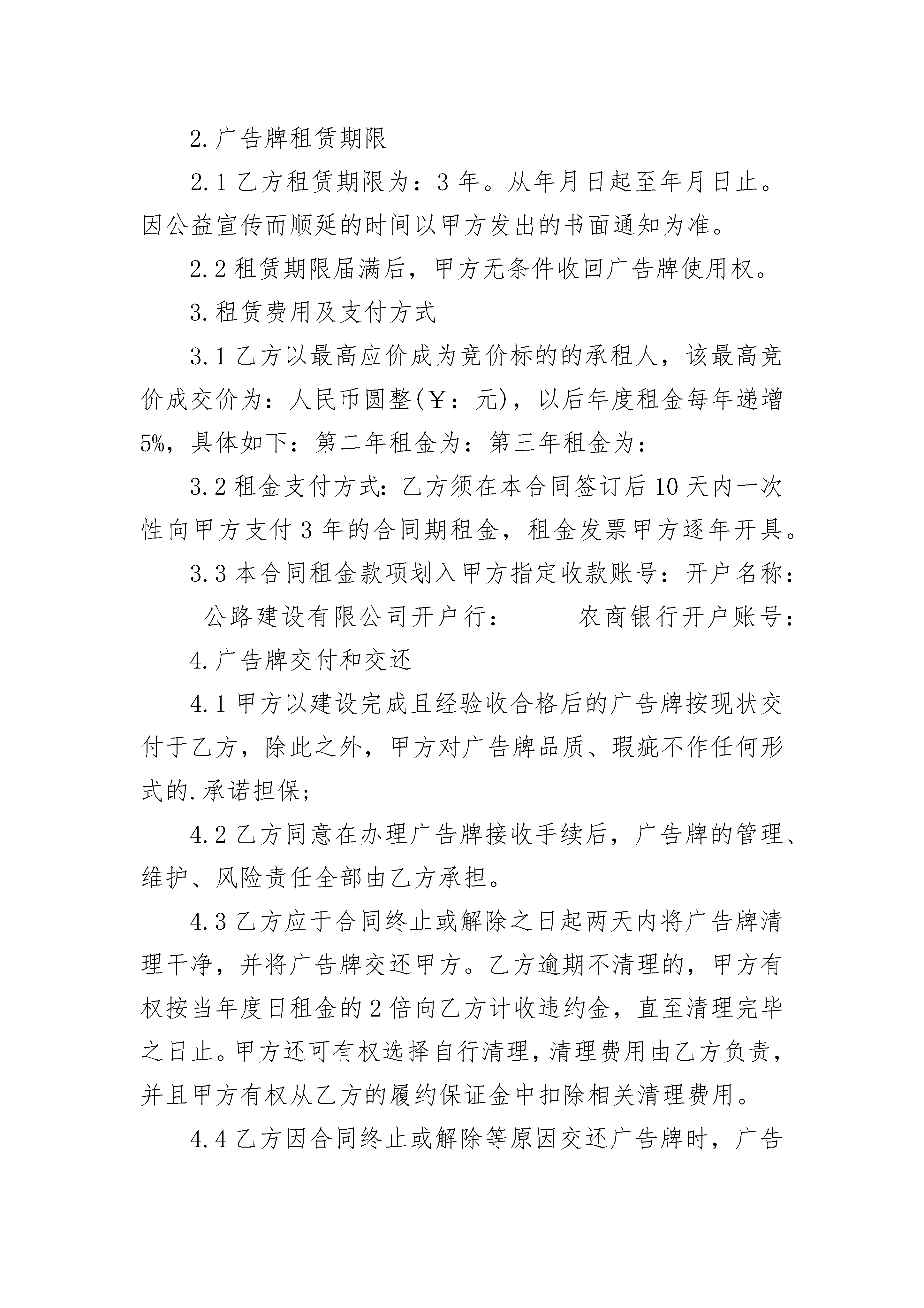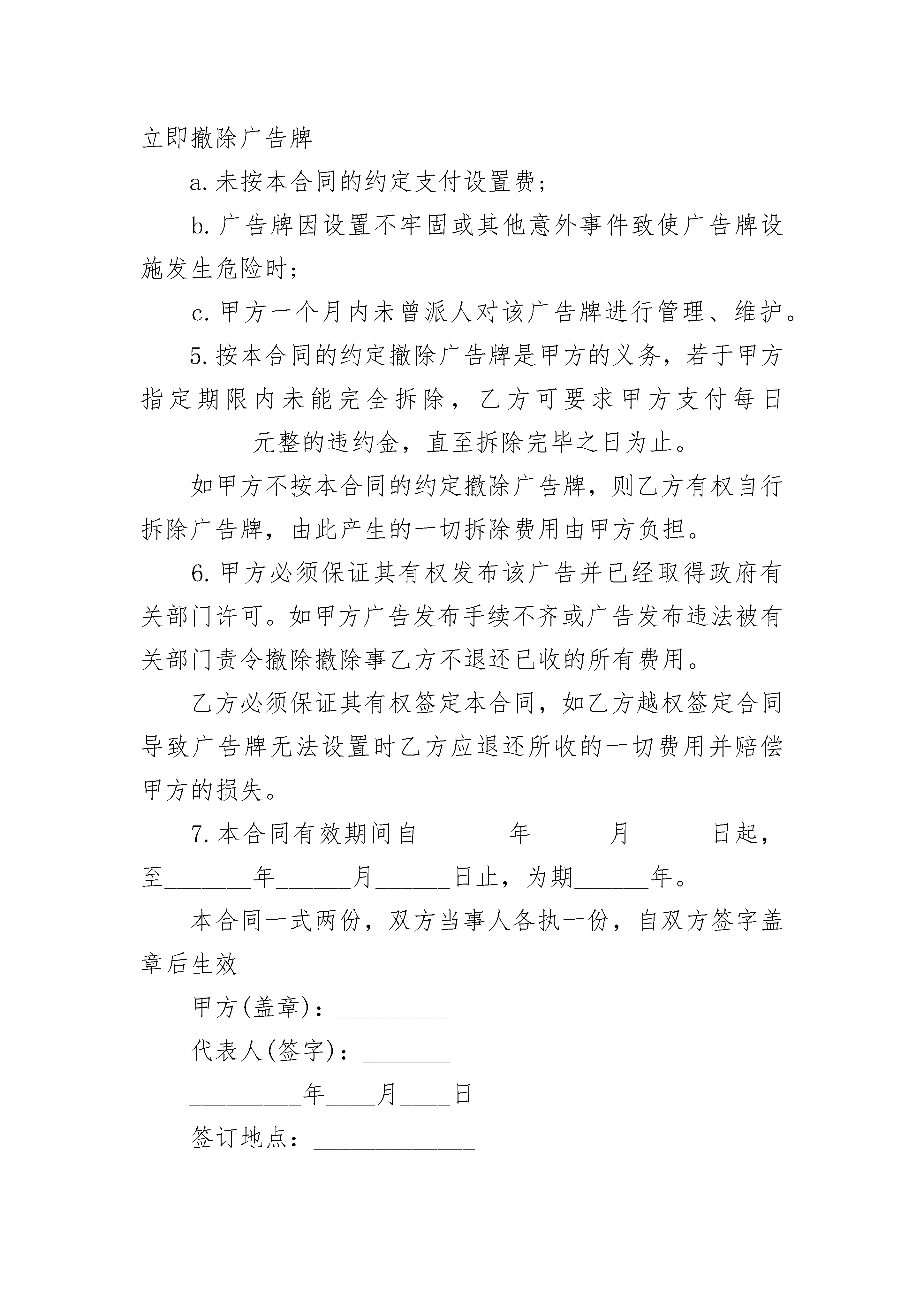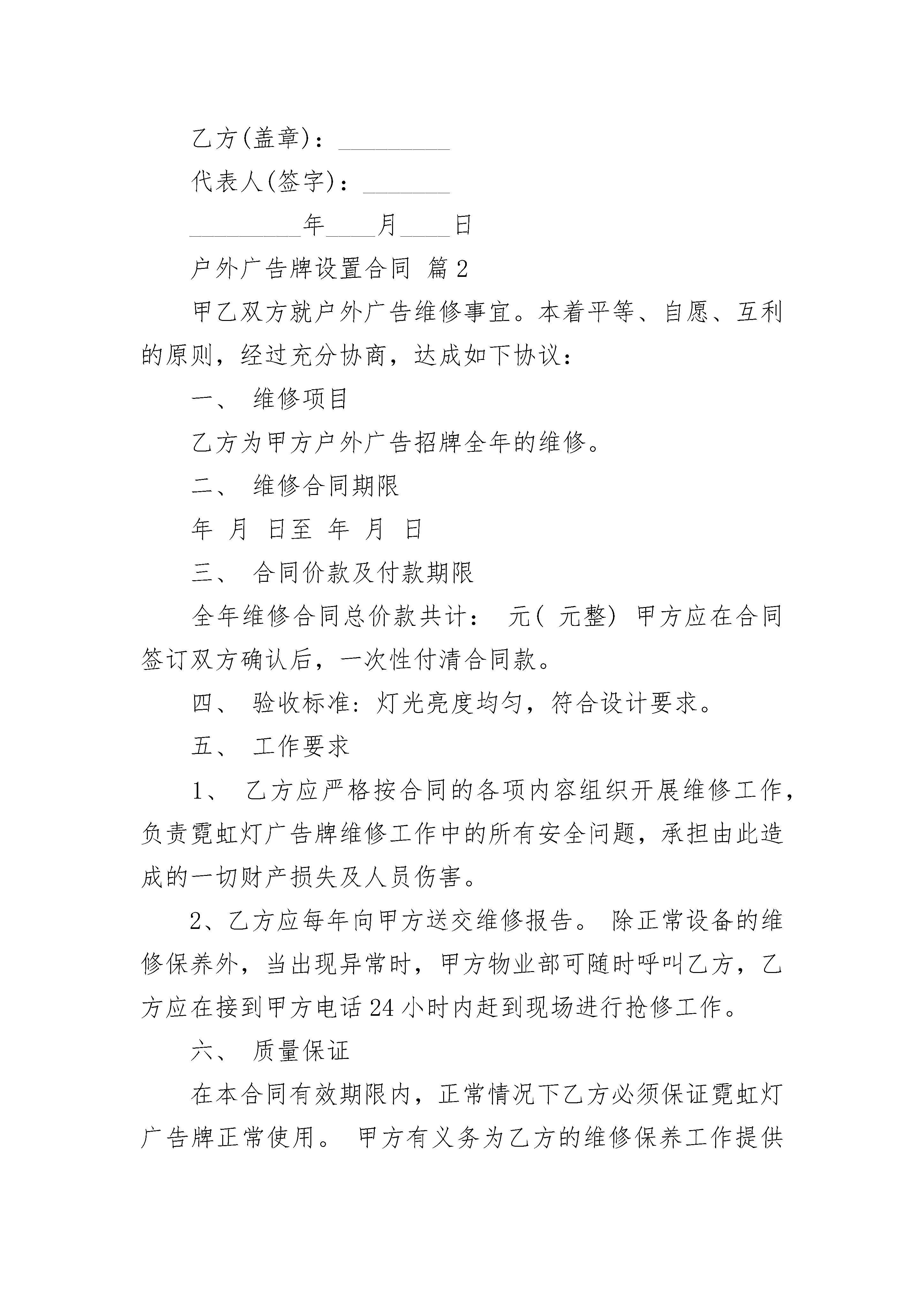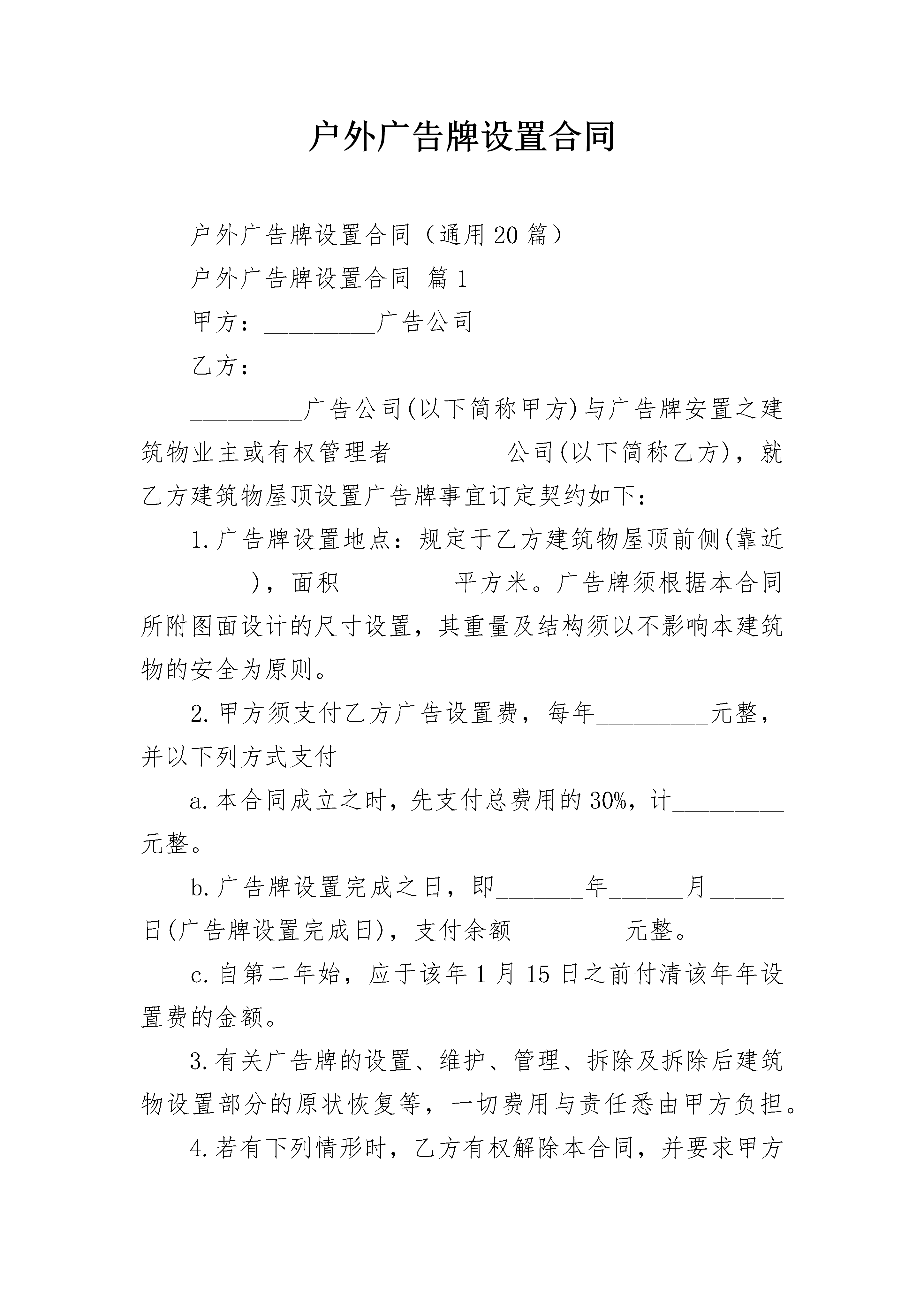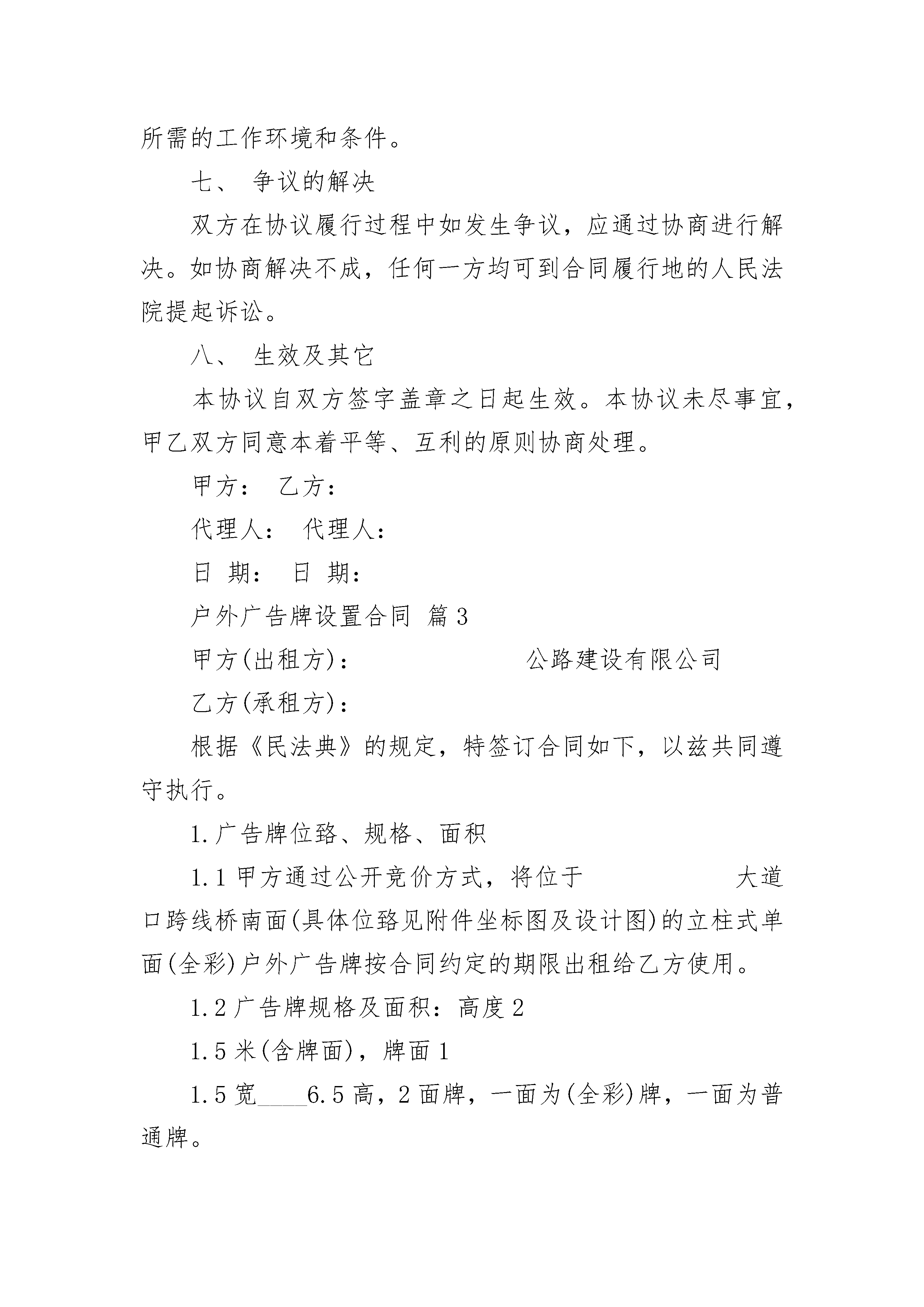 户外广告牌设置合同户外广告牌设置合同(通用20篇)户外广告牌设置合同篇1甲方:_________广告公司乙方:__________________________广告公司(以下简称甲方)与广告牌安置之建筑物业主或有权管理者_________公司(以下简称乙方),就乙方建筑物屋顶设置广告牌事宜订定契约如下:1.广告牌设置地点:规定于乙方建筑物屋顶前侧(靠近_________),面积_________平方米。广告牌须根据本合同所附图面设计的尺寸设置,其重量及结构须以不影响本建筑物的安全为原则。2.甲方须支付乙方广告设置费,每年_________元整,并以下列方式支付a.本合同成立之时,先支付总费用的30%,计_________元整。b.广告牌设置完成之日,即_______年______月______日(广告牌设置完成日),支付余额_________元整。c.自第二年始,应于该年1月15日之前付清该年年设置费的金额。3.有关广告牌的设置、维护、管理、拆除及拆除后建筑物设置部分的原状恢复等,一切费用与责任悉由甲方负担。4.若有下列情形时,乙方有权解除本合同,并要求甲方立即撤除广告牌a.未按本合同的约定支付设置费;b.广告牌因设置不牢固或其他意外事件致使广告牌设施发生危险时;c.甲方一个月内未曾派人对该广告牌进行管理、维护。5.按本合同的约定撤除广告牌是甲方的义务,若于甲方指定期限内未能完全拆除,乙方可要求甲方支付每日_________元整的违约金,直至拆除完毕之日为止。如甲方不按本合同的约定撤除广告牌,则乙方有权自行拆除广告牌,由此产生的一切拆除费用由甲方负担。6.甲方必须保证其有权发布该广告并已经取得政府有关部门许可。如甲方广告发布手续不齐或广告发布违法被有关部门责令撤除撤除事乙方不退还已收的所有费用。乙方必须保证其有权签定本合同,如乙方越权签定合同导致广告牌无法设置时乙方应退还所收的一切费用并赔偿甲方的损失。7.本合同有效期间自_______年______月______日起,至_______年______月______日止,为期______年。本合同一式两份,双方当事人各执一份,自双方签字盖章后生效甲方(盖章):_________代表人(签字):________________年____月____日签订地点:_____________乙方(盖章):_________代表人(签字):________________年____月____日户外广告牌设置合同篇2甲乙双方就户外广告维修事宜。本着平等、自愿、互利的原则,经过充分协商,达成如下协议:一、维修项目乙方为甲方户外广告招牌全年的维修。二、维修合同期限年月日至年月日三、合同价款及付款期限全年维修合同总价款共计:元(元整)甲方应在合同签订双方确认后,一次性付清合同款。四、验收标准:灯光亮度均匀,符合设计要求。五、工作要求1、乙方应严格按合同的各项内容组织开展维修工作,负责霓虹灯广告牌维修工作中的所有安全问题,承担由此造成的一切财产损失及人员伤害。2、乙方应每年向甲方送交维修报告。除正常设备的维修保养外,当出现异常时,甲方物业部可随时呼叫乙方,乙方应在接到甲方电话24小时内赶到现场进行抢修工作。六、质量保证在本合同有效期限内,正常情况下乙方必须保证霓虹灯广告牌正常使用。甲方有义务为乙方的维修保养工作提供所需的工作环境和条件。七、争议的解决双方在协议履行过程中如发生争议,应通过协商进行解决。如协商解决不成,任何一方均可到合同履行地的人民法院提起诉讼。八、生效及其它本协议自双方签字盖章之日起生效。本协议未尽事宜,甲乙双方同意本着平等、互利的原则协商处理。甲方:乙方:代理人:代理人:日期:日期:户外广告牌设置合同篇3甲方(出租方):公路建设有限公司乙方(承租方):根据《民法典》的规定,特签订合同如下,以兹共同遵守执行。1.广告牌位臵、规格、面积1.1甲方通过公开竞价方式,将位于大道口跨线桥南面(具体位臵见附件坐标图及设计图)的立柱式单面(全彩)户外广告牌按合同约定的期限出租给乙方使用。1.2广告牌规格及面积:高度21.5米(含牌面),牌面11.5宽____6.5高,2面牌,一面为(全彩)牌,一面为普通牌。2.广告牌租赁期限2.1乙方租赁期限为:3年。从年月日起至年月日止。因公益宣传而顺延的时间以甲方发出的书面通知为准。2.2租赁期限届满后,甲方无条件收回广告牌使用权。3.租赁费用及支付方式3.1乙方以最高应价成为竞价标的的承租人,该最高竞价成交价为:人民币圆整(¥:元),以后年度租金每年递增5%,具体如下:第二年租金为:第三年租金为:3.2租金支付方式:乙方须在本合同签订后10天内一次性向甲方支付3年的合同期租金,租金发票甲方逐年开具。3.3本合同租金款项划入甲方指定收