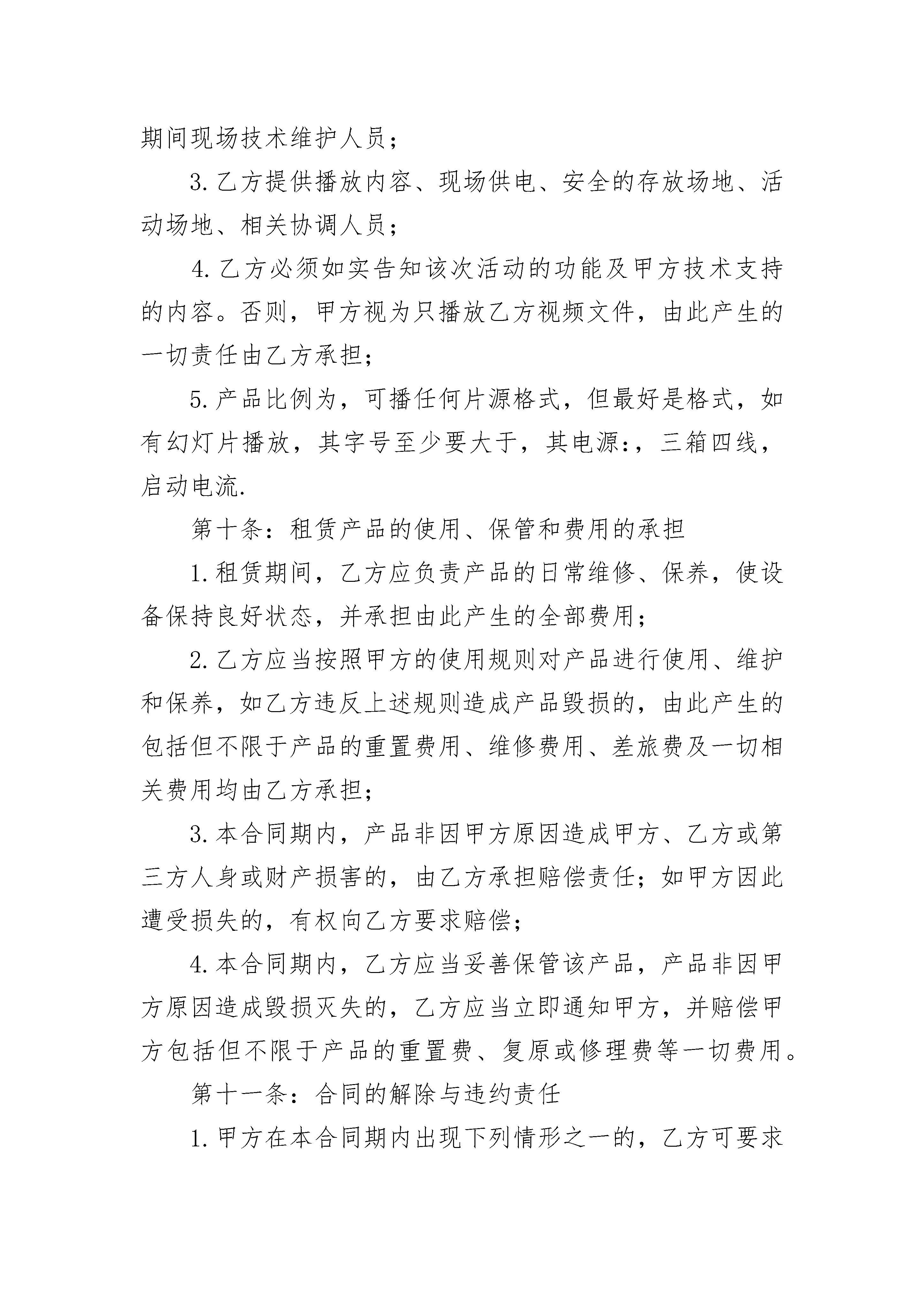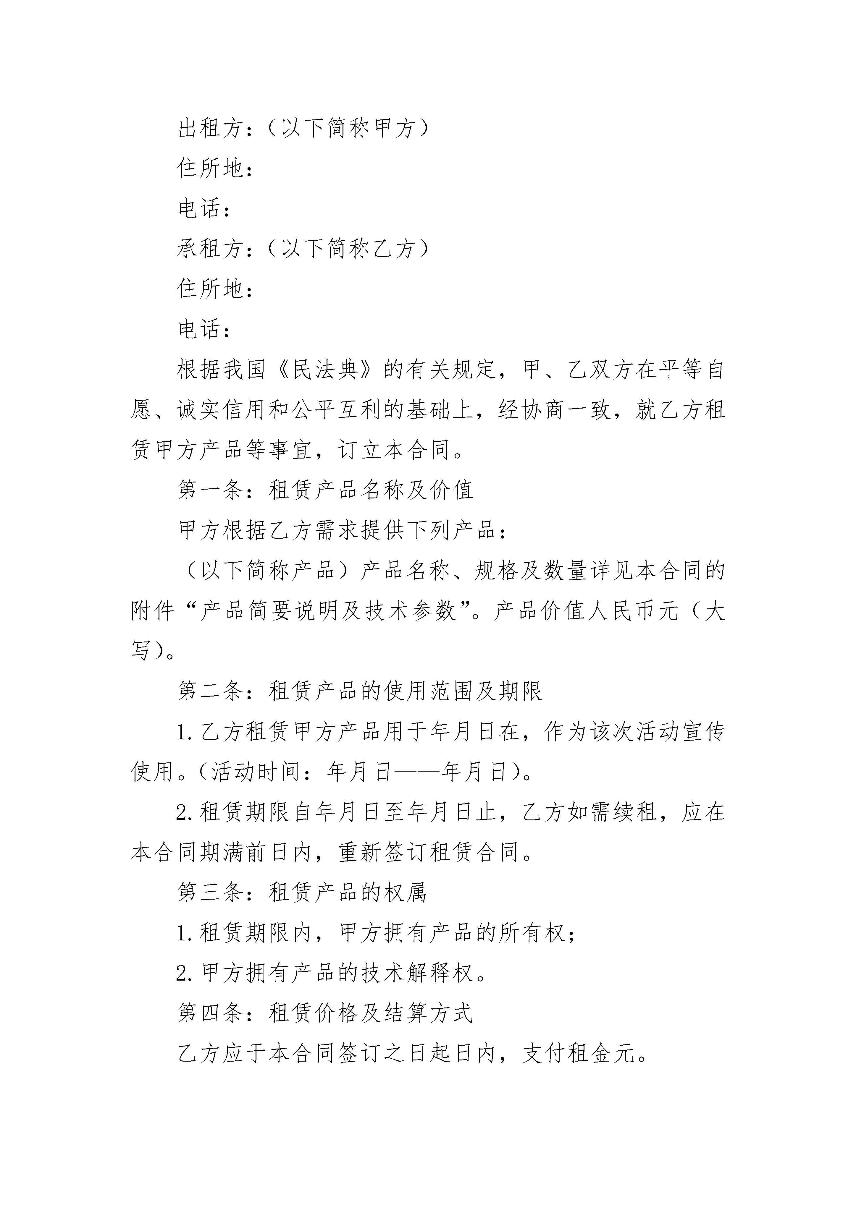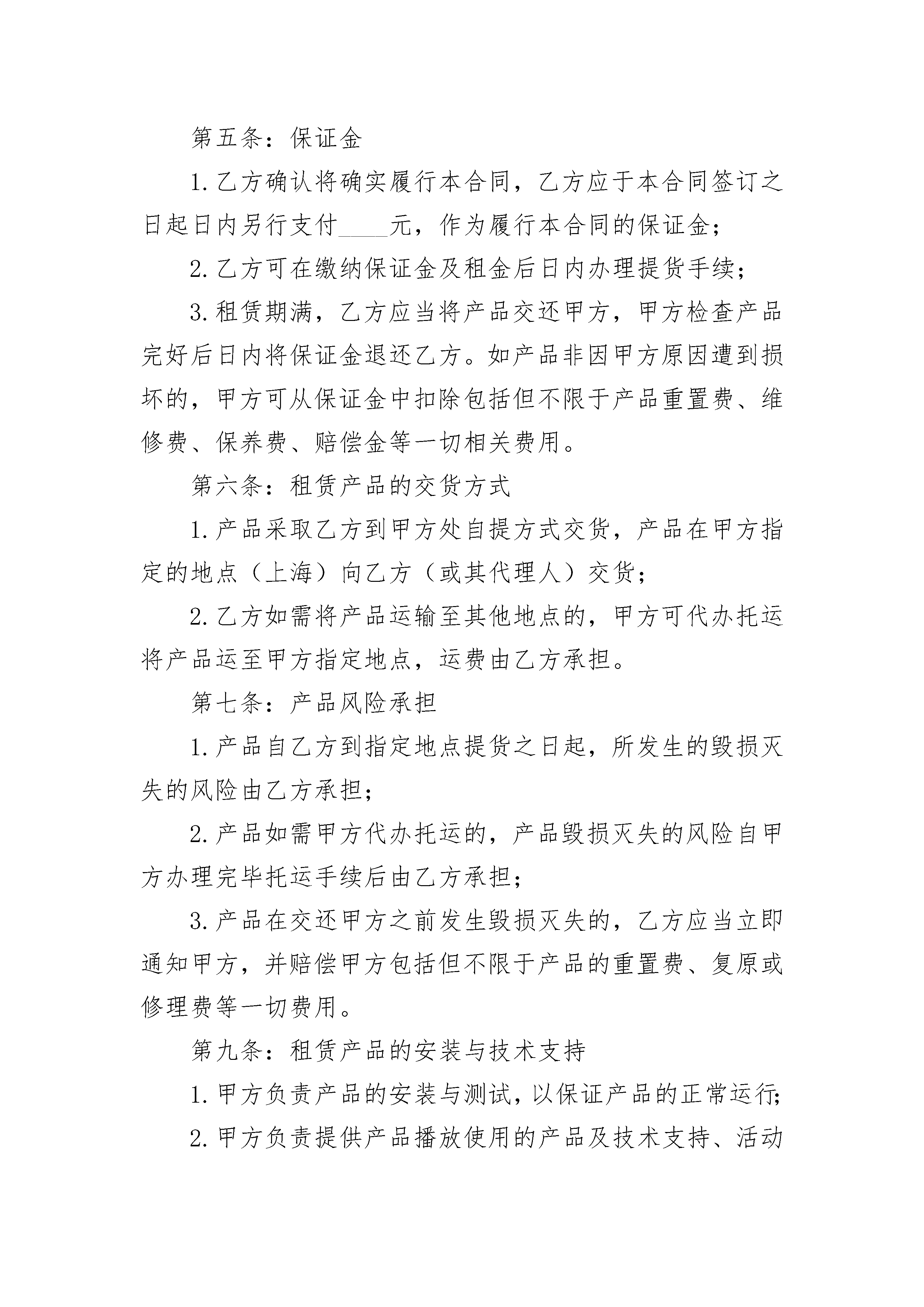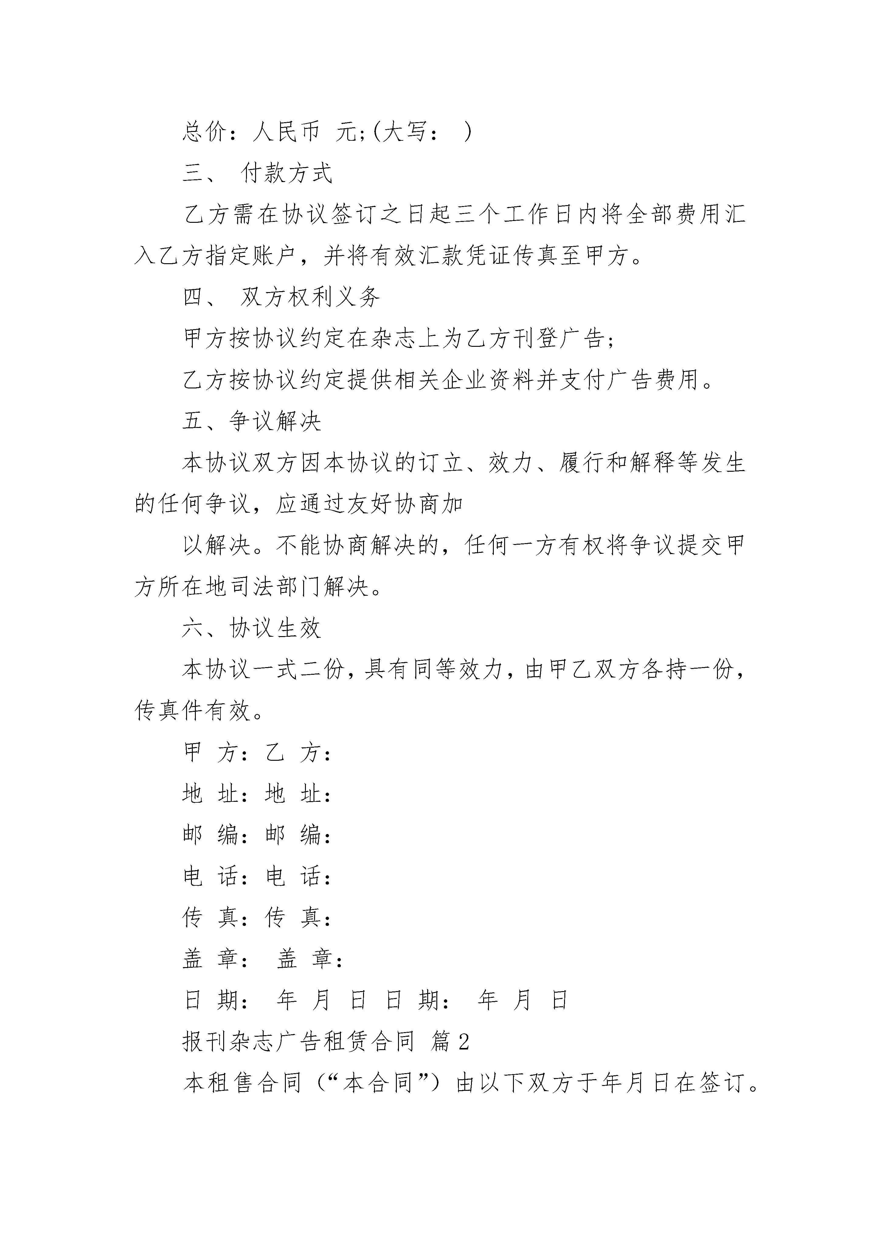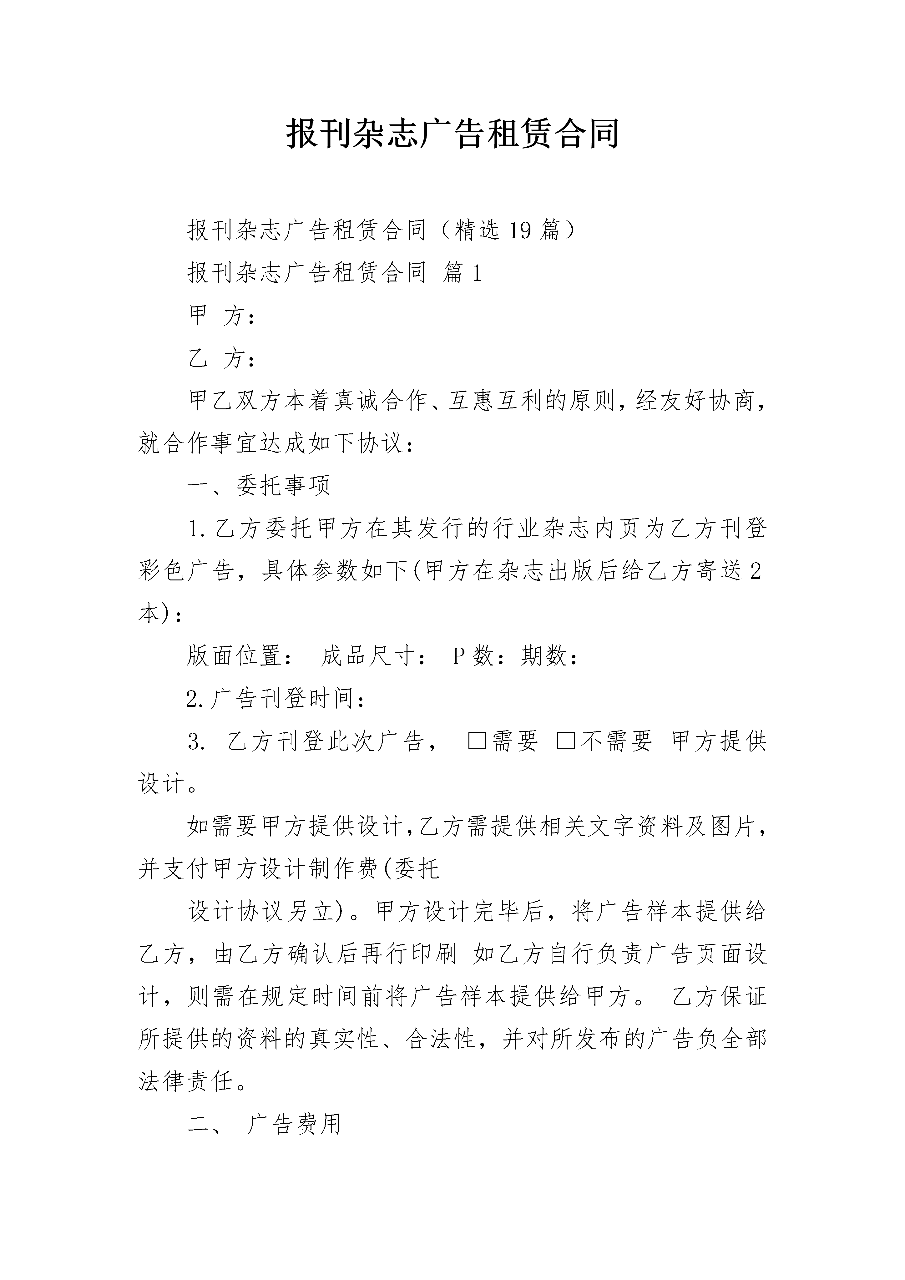 报刊杂志广告租赁合同报刊杂志广告租赁合同(精选19篇)报刊杂志广告租赁合同篇1甲方:乙方:甲乙双方本着真诚合作、互惠互利的原则,经友好协商,就合作事宜达成如下协议:一、委托事项1.乙方委托甲方在其发行的行业杂志内页为乙方刊登彩色广告,具体参数如下(甲方在杂志出版后给乙方寄送2本):版面位置:成品尺寸:P数:期数:2.广告刊登时间:3.乙方刊登此次广告,□需要□不需要甲方提供设计。如需要甲方提供设计,乙方需提供相关文字资料及图片,并支付甲方设计制作费(委托设计协议另立)。甲方设计完毕后,将广告样本提供给乙方,由乙方确认后再行印刷如乙方自行负责广告页面设计,则需在规定时间前将广告样本提供给甲方。乙方保证所提供的资料的真实性、合法性,并对所发布的广告负全部法律责任。二、广告费用总价:人民币元;(大写:)三、付款方式乙方需在协议签订之日起三个工作日内将全部费用汇入乙方指定账户,并将有效汇款凭证传真至甲方。四、双方权利义务甲方按协议约定在杂志上为乙方刊登广告;乙方按协议约定提供相关企业资料并支付广告费用。五、争议解决本协议双方因本协议的订立、效力、履行和解释等发生的任何争议,应通过友好协商加以解决。不能协商解决的,任何一方有权将争议提交甲方所在地司法部门解决。六、协议生效本协议一式二份,具有同等效力,由甲乙双方各持一份,传真件有效。甲方:乙方:地址:地址:邮编:邮编:电话:电话:传真:传真:盖章:盖章:日期:年月日日期:年月日报刊杂志广告租赁合同篇2本租售合同(“本合同”)由以下双方于年月日在签订。出租方:(以下简称甲方)住所地:电话:承租方:(以下简称乙方)住所地:电话:根据我国《民法典》的有关规定,甲、乙双方在平等自愿、诚实信用和公平互利的基础上,经协商一致,就乙方租赁甲方产品等事宜,订立本合同。第一条:租赁产品名称及价值甲方根据乙方需求提供下列产品:(以下简称产品)产品名称、规格及数量详见本合同的附件“产品简要说明及技术参数”。产品价值人民币元(大写)。第二条:租赁产品的使用范围及期限1.乙方租赁甲方产品用于年月日在,作为该次活动宣传使用。(活动时间:年月日——年月日)。2.租赁期限自年月日至年月日止,乙方如需续租,应在本合同期满前日内,重新签订租赁合同。第三条:租赁产品的权属1.租赁期限内,甲方拥有产品的所有权;2.甲方拥有产品的技术解释权。第四条:租赁价格及结算方式乙方应于本合同签订之日起日内,支付租金元。第五条:保证金1.乙方确认将确实履行本合同,乙方应于本合同签订之日起日内另行支付____元,作为履行本合同的保证金;2.乙方可在缴纳保证金及租金后日内办理提货手续;3.租赁期满,乙方应当将产品交还甲方,甲方检查产品完好后日内将保证金退还乙方。如产品非因甲方原因遭到损坏的,甲方可从保证金中扣除包括但不限于产品重置费、维修费、保养费、赔偿金等一切相关费用。第六条:租赁产品的交货方式1.产品采取乙方到甲方处自提方式交货,产品在甲方指定的地点(上海)向乙方(或其代理人)交货;2.乙方如需将产品运输至其他地点的,甲方可代办托运将产品运至甲方指定地点,运费由乙方承担。第七条:产品风险承担1.产品自乙方到指定地点提货之日起,所发生的毁损灭失的风险由乙方承担;2.产品如需甲方代办托运的,产品毁损灭失的风险自甲方办理完毕托运手续后由乙方承担;3.产品在交还甲方之前发生毁损灭失的,乙方应当立即通知甲方,并赔偿甲方包括但不限于产品的重置费、复原或修理费等一切费用。第九条:租赁产品的安装与技术支持1.甲方负责产品的安装与测试,以保证产品的正常运行;2.甲方负责提供产品播放使用的产品及技术支持、活动期间现场技术维护人员;3.乙方提供播放内容、现场供电、安全的存放场地、活动场地、相关协调人员;4.乙方必须如实告知该次活动的功能及甲方技术支持的内容。否则,甲方视为只播放乙方视频文件,由此产生的一切责任由乙方承担;5.产品比例为,可播任何片源格式,但最好是格式,如有幻灯片播放,其字号至少要大于,其电源:,三箱四线,启动电流.第十条:租赁产品的使用、保管和费用的承担1.租赁期间,乙方应负责产品的日常维修、保养,使设备保持良好状态,并承担由此产生的全部费用;2.乙方应当按照甲方的使用规则对产品进行使用、维护和保养,如乙方违反上述规则造成产品毁损的,由此产生的包括但不限于产品的重置费用、维修费用、差旅费及一切相关费用均由乙方承担;3.本合同期内,产品非因甲方原因造成甲方、乙方或第三方人身或财产损害的,由乙方承担赔偿责任;如甲方因此遭受损失的,有权向乙方要求赔偿;4.本合同期内,乙方应当妥善保管该产品,产品非因甲方原因造成毁损灭失的,乙方应当立即通知甲方,并赔偿甲方包括但不限于产品的重置费、复原或修理费等一切费用。第十一条:合同的解除与违约责任1.甲方在本合同