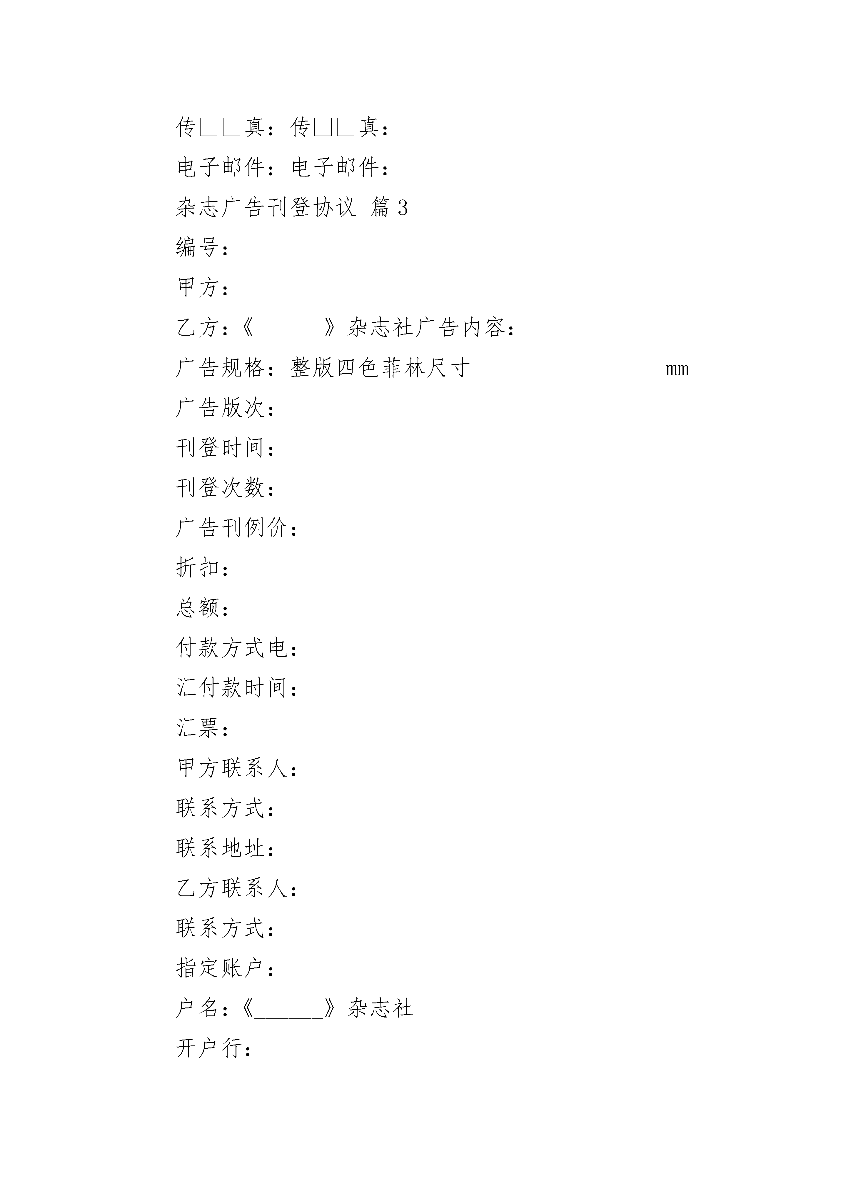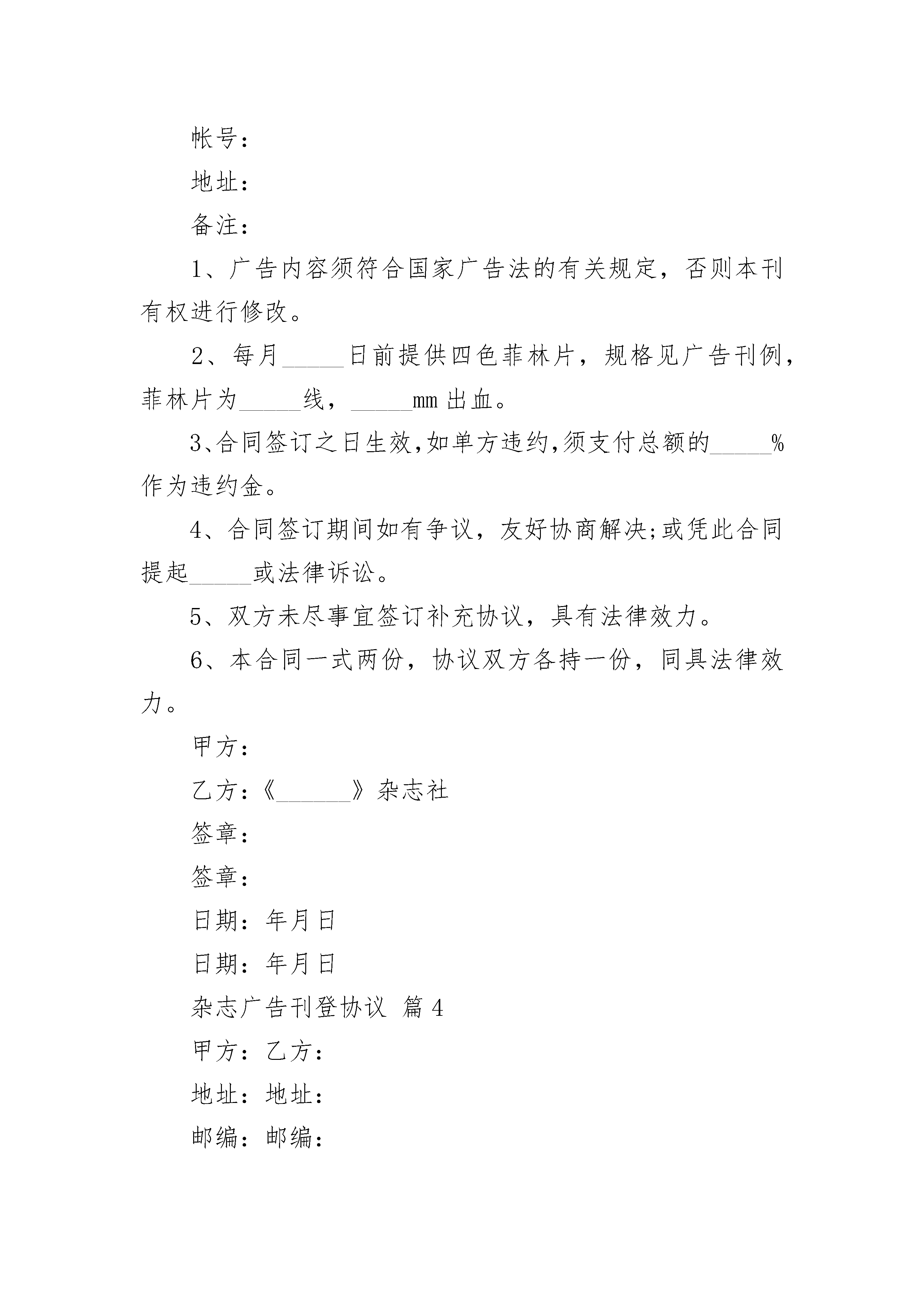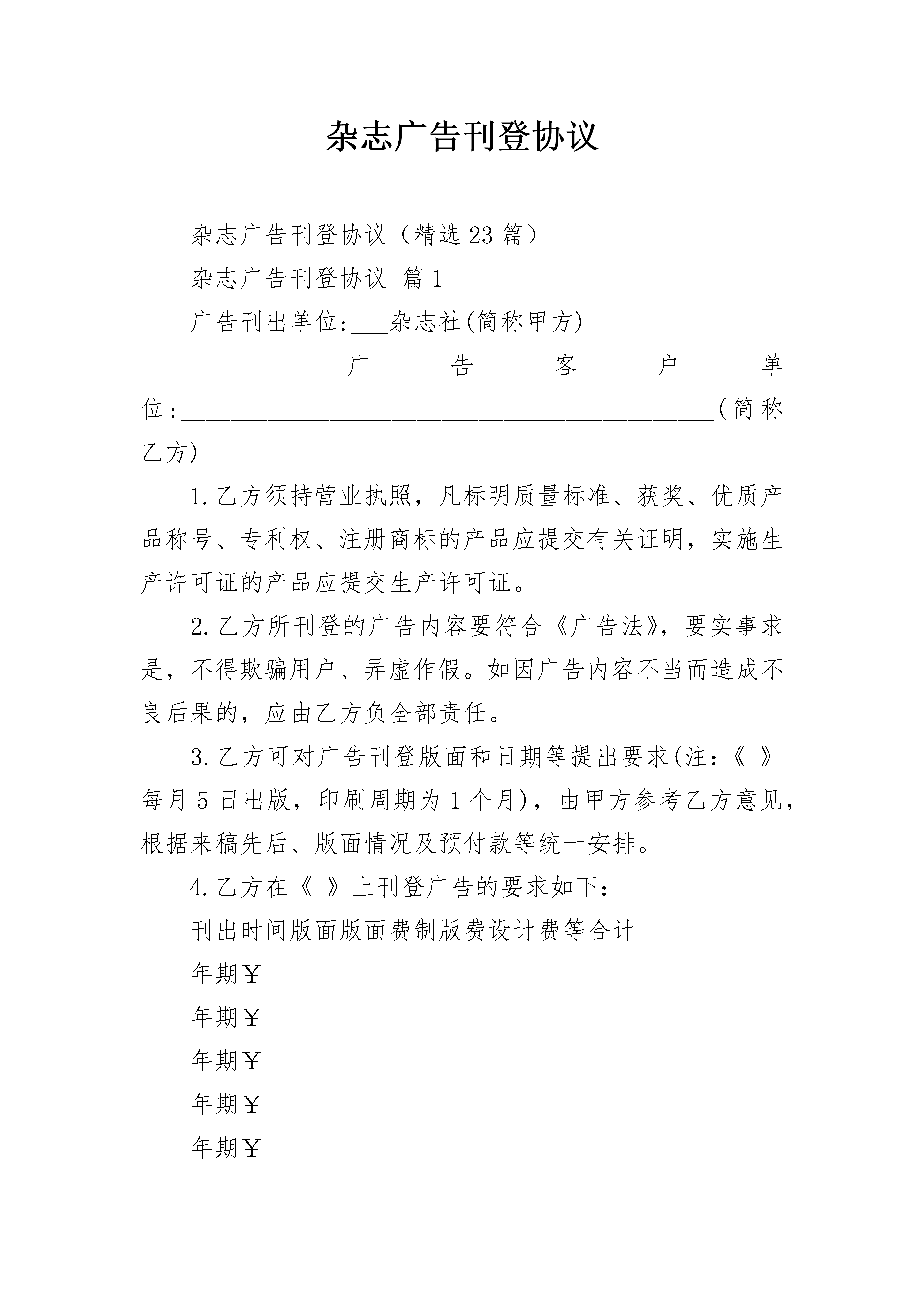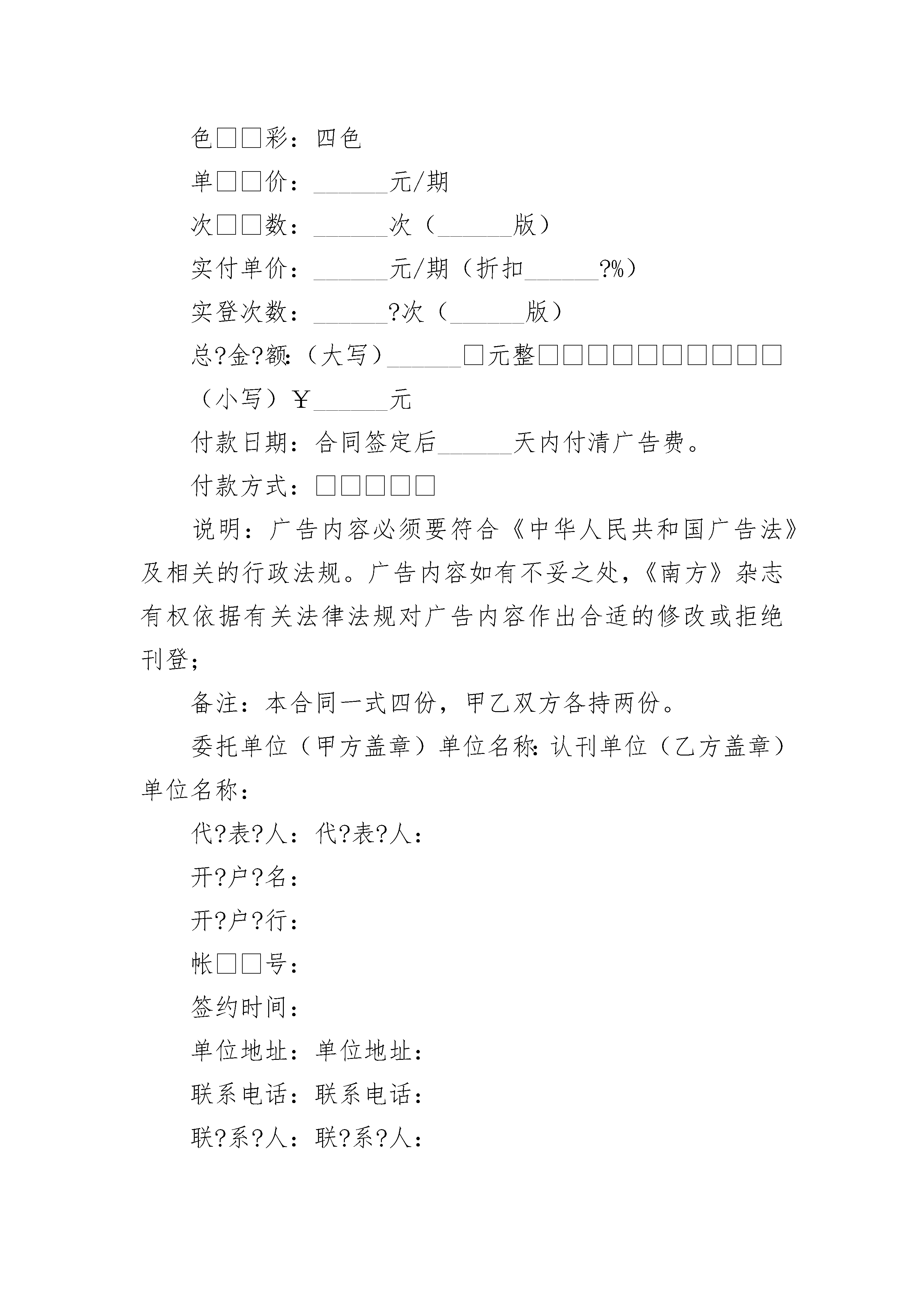杂志广告刊登协议杂志广告刊登协议(精选23篇)杂志广告刊登协议篇1广告刊出单位:___杂志社(简称甲方)广告客户单位:___________________________________________(简称乙方)1.乙方须持营业执照,凡标明质量标准、获奖、优质产品称号、专利权、注册商标的产品应提交有关证明,实施生产许可证的产品应提交生产许可证。2.乙方所刊登的广告内容要符合《广告法》,要实事求是,不得欺骗用户、弄虚作假。如因广告内容不当而造成不良后果的,应由乙方负全部责任。3.乙方可对广告刊登版面和日期等提出要求(注:《》每月5日出版,印刷周期为1个月),由甲方参考乙方意见,根据来稿先后、版面情况及预付款等统一安排。4.乙方在《》上刊登广告的要求如下:刊出时间版面版面费制版费设计费等合计年期¥年期¥年期¥年期¥年期¥总计(大写)拾万千百拾元整(人民币)¥5.广告刊出后,如发生影响效果的差错系原稿的错误,由乙方负责;系甲方差错,甲方负责用文字更正一次,但不予重登广告,原已刊出的广告,费用照收。6.广告设计、摄影、发排制版后,如乙方要求变更合同,则须付相应的设计费、摄影费、制版费以及赔偿有关损失。7.乙方在签订合同后,应及时付广告费。甲方将优先安排已有合同单、刊登资料和已付清广告费的客户。8.本合同一式肆份,甲乙双方各执贰份。甲方单位乙方单位:联系人:联系人:电话电话:传真传真:开户行:帐号:年月杂志广告刊登协议篇2广告合同(杂志上刊登)(样式七)合同编号:________________客户名称:主题内容:规格:______版,______(mm)版页:刊登日期:______年第______期色彩:四色单价:______元/期次数:______次(______版)实付单价:______元/期(折扣______?%)实登次数:______?次(______版)总?金?额:(大写)______元整(小写)¥______元付款日期:合同签定后______天内付清广告费。付款方式:说明:广告内容必须要符合《中华人民共和国广告法》及相关的行政法规。广告内容如有不妥之处,《南方》杂志有权依据有关法律法规对广告内容作出合适的修改或拒绝刊登;备注:本合同一式四份,甲乙双方各持两份。委托单位(甲方盖章)单位名称:认刊单位(乙方盖章)单位名称:代?表?人:代?表?人:开?户?名:开?户?行:帐号:签约时间:单位地址:单位地址:联系电话:联系电话:联?系?人:联?系?人:传真:传真:电子邮件:电子邮件:杂志广告刊登协议篇3编号:甲方:乙方:《______》杂志社广告内容:广告规格:整版四色菲林尺寸_________________mm广告版次:刊登时间:刊登次数:广告刊例价:折扣:总额:付款方式电:汇付款时间:汇票:甲方联系人:联系方式:联系地址:乙方联系人:联系方式:指定账户:户名:《______》杂志社开户行:帐号:地址:备注:1、广告内容须符合国家广告法的有关规定,否则本刊有权进行修改。2、每月_____日前提供四色菲林片,规格见广告刊例,菲林片为_____线,_____mm出血。3、合同签订之日生效,如单方违约,须支付总额的_____%作为违约金。4、合同签订期间如有争议,友好协商解决;或凭此合同提起_____或法律诉讼。5、双方未尽事宜签订补充协议,具有法律效力。6、本合同一式两份,协议双方各持一份,同具法律效力。甲方:乙方:《______》杂志社签章:签章:日期:年月日日期:年月日杂志广告刊登协议篇4甲方:乙方:地址:地址:邮编:邮编:甲乙双方依据《中华人民共和国广告法》,经双方协商,甲方委托乙方刊登年月~年月广告,签订如下合同,共同遵守。一、广告媒体选择代码:二、广告合同内容1、广告名称:刊登面积单价次数合计金额2、交稿时间预刊时间预刊版位设计费制版费加印费3、总计金额付款日期4、选择刊登媒体:5、备注:三、双方的责任和义务1、本合同生效后,甲方根据本合同广告内容总计金额付给乙方广告费。2、广告合同正式签订后未能如约刊出,乙方须于一个月内将甲方广告稿件及广告款退回。3、广告刊出如出现与原稿不符的重要差错,乙方负责对错误部分免费刊登一次正确内容。4、甲方在刊登日期7天以内要求撤回广告,需交纳20%手续费,如已制版,不得撤稿,刊户需照付广告费。四、违约及纠纷的处理与合同生效:1、如发生合同纠纷,报请当地工商局经济合同仲裁委员会裁决或诉由法院判决。2、本合同自签订之日起生效,本合同一式四份,乙方持三份,具有同等法律效力。负责人签字:经办人签字:双方签订日期:年月日杂志广告刊登协议篇5广告刊出单位:____________杂志社(简称甲方)广告客户单位:__________