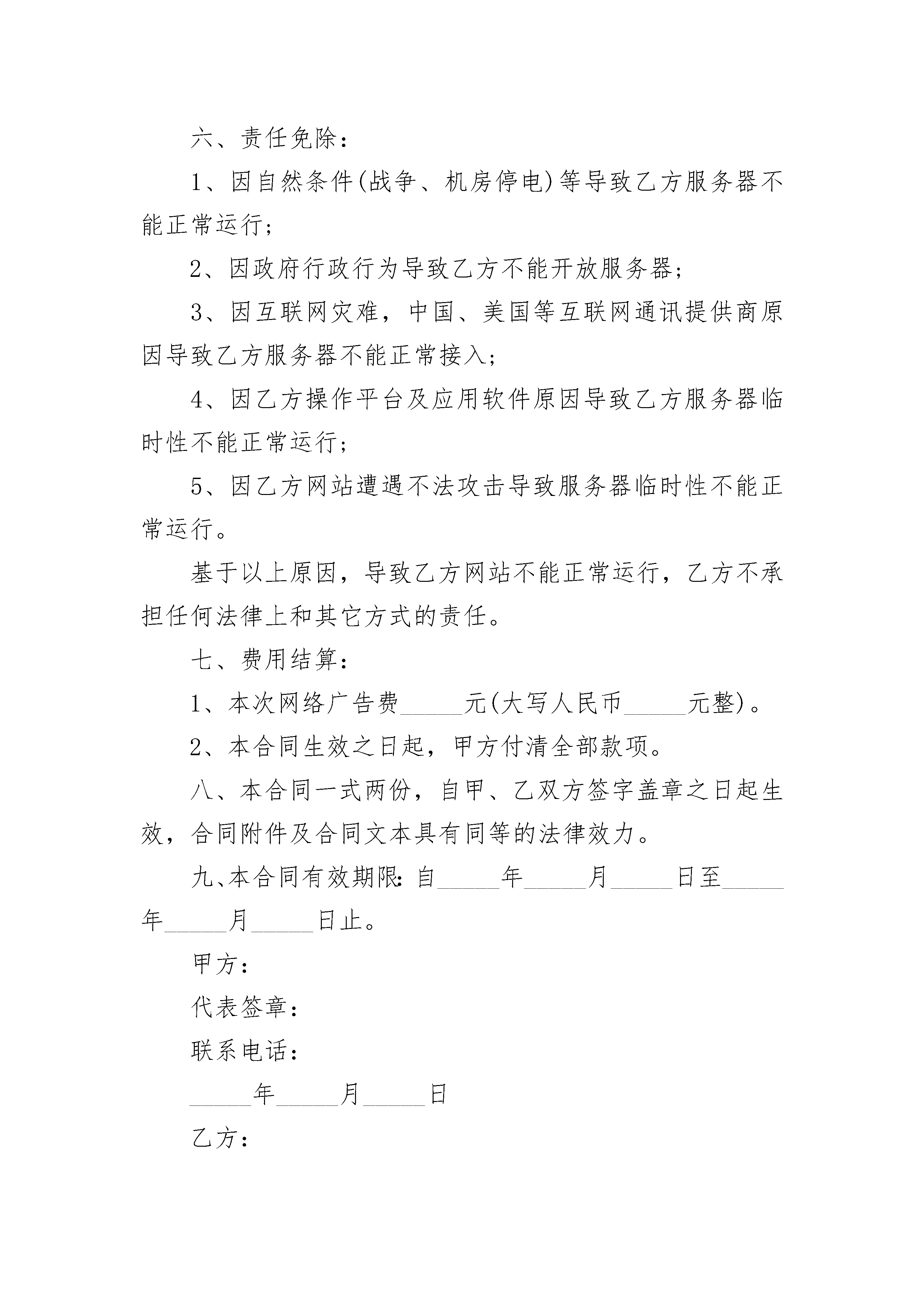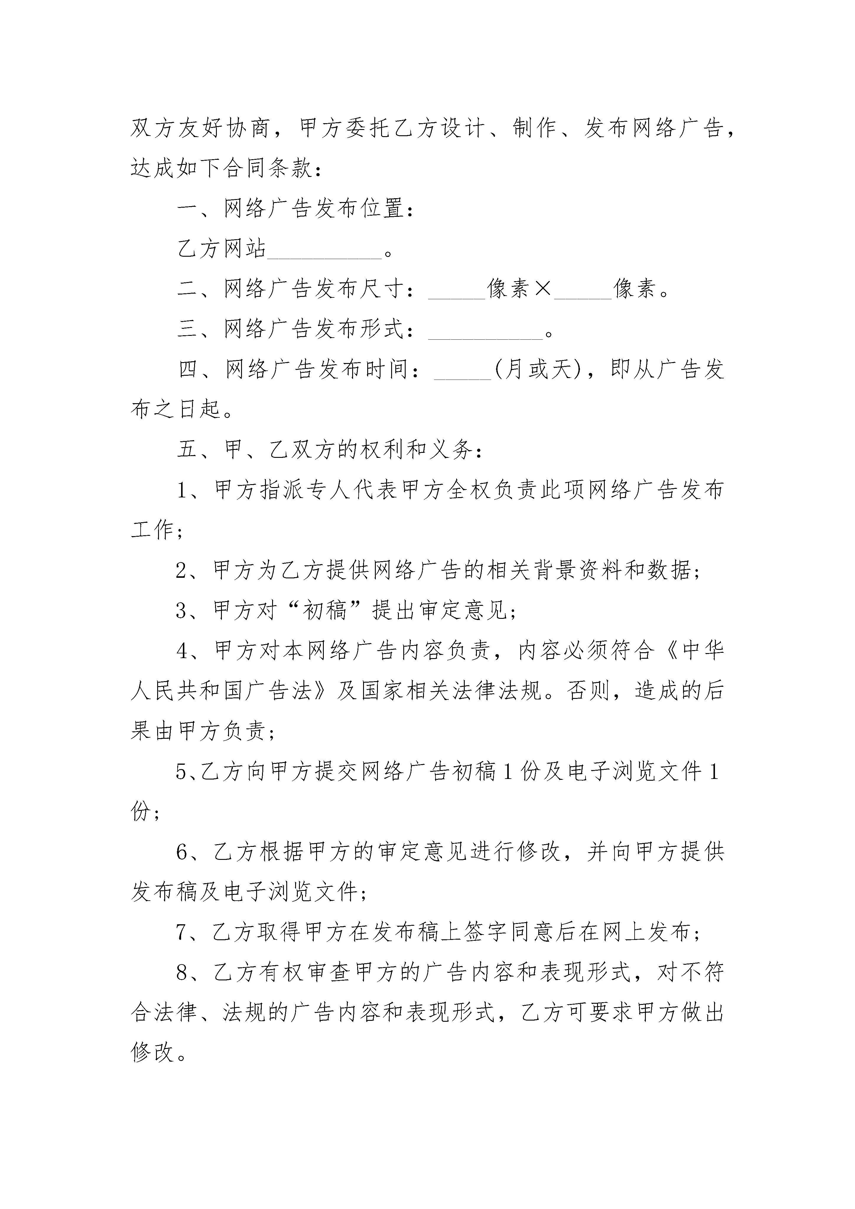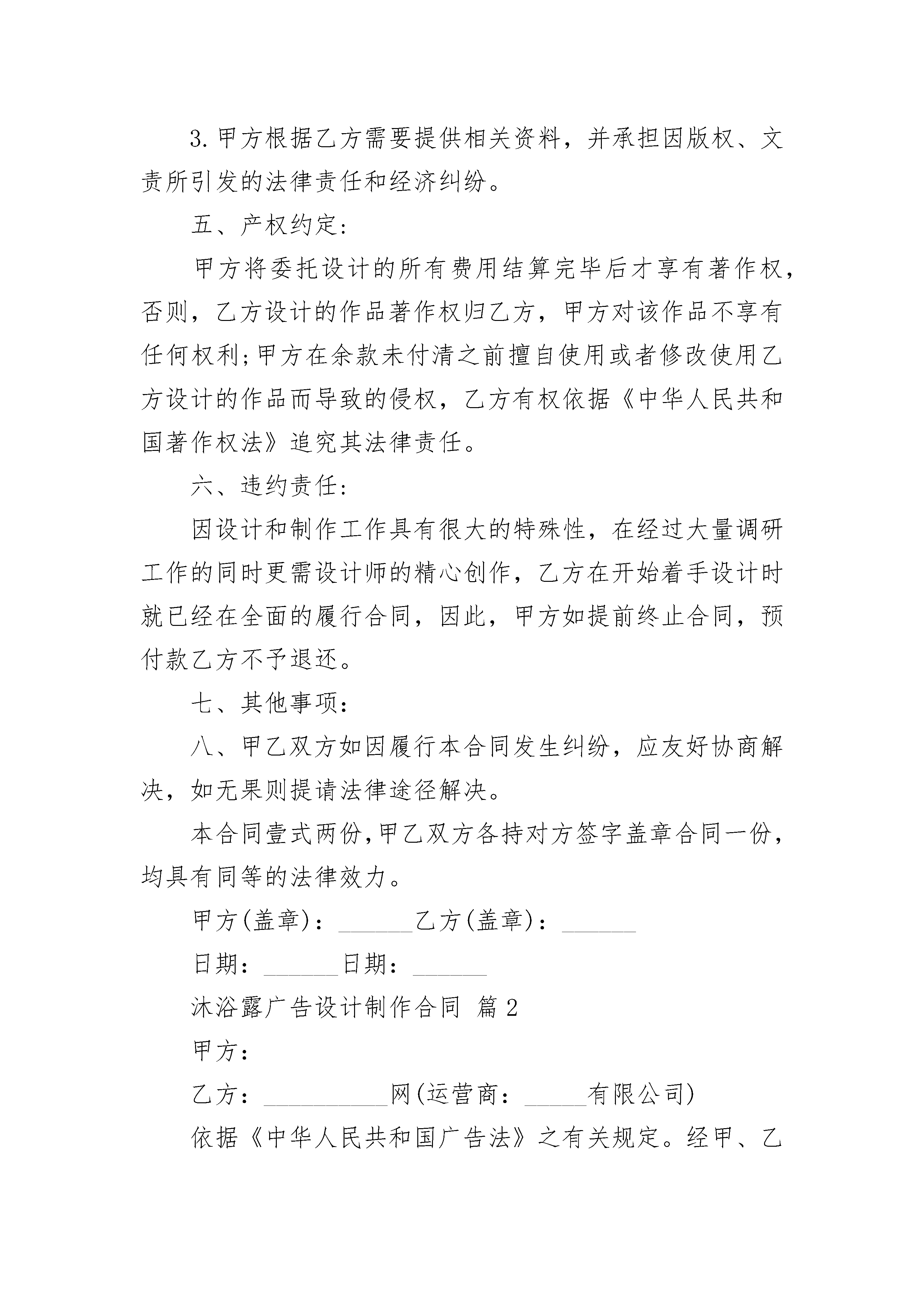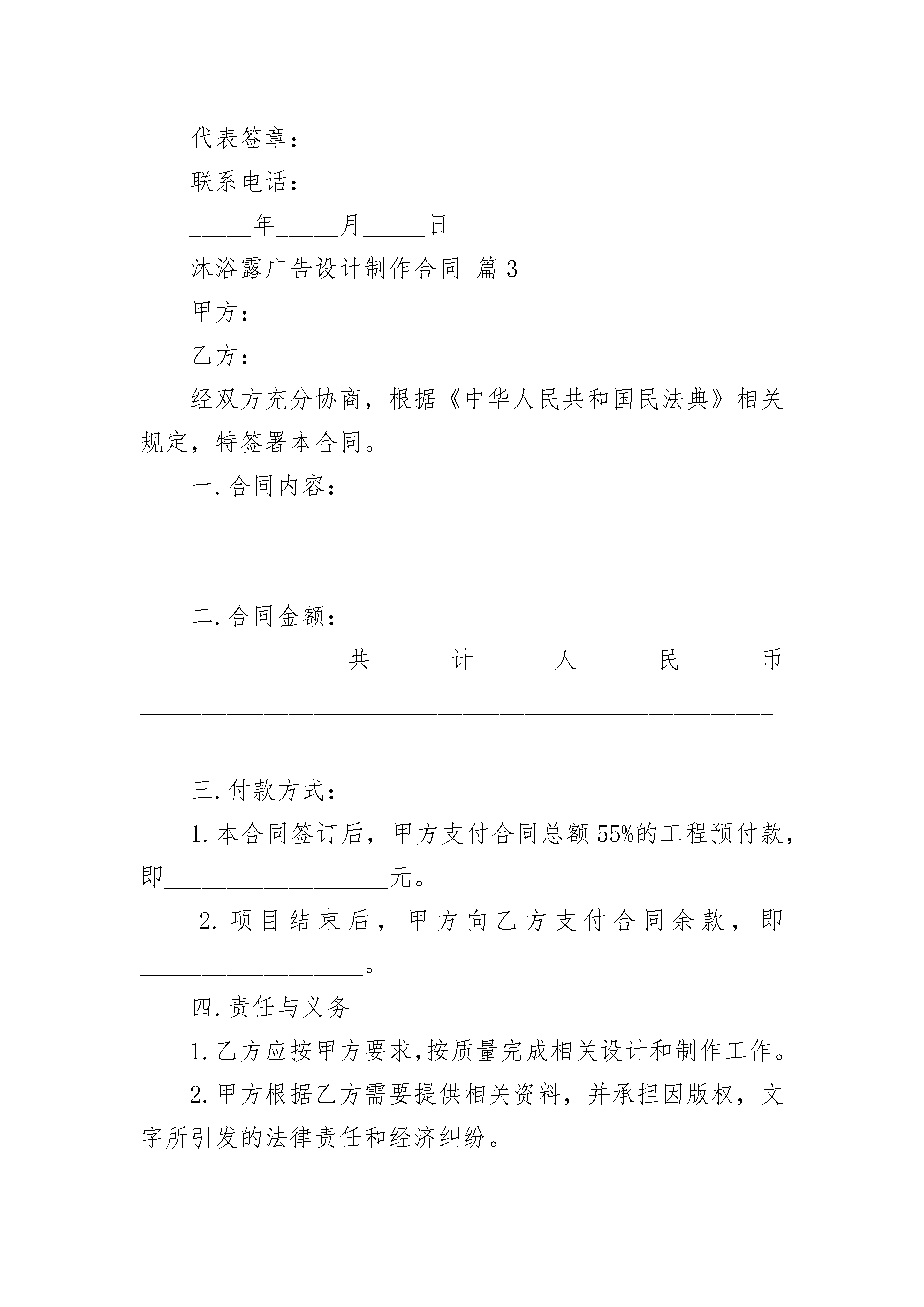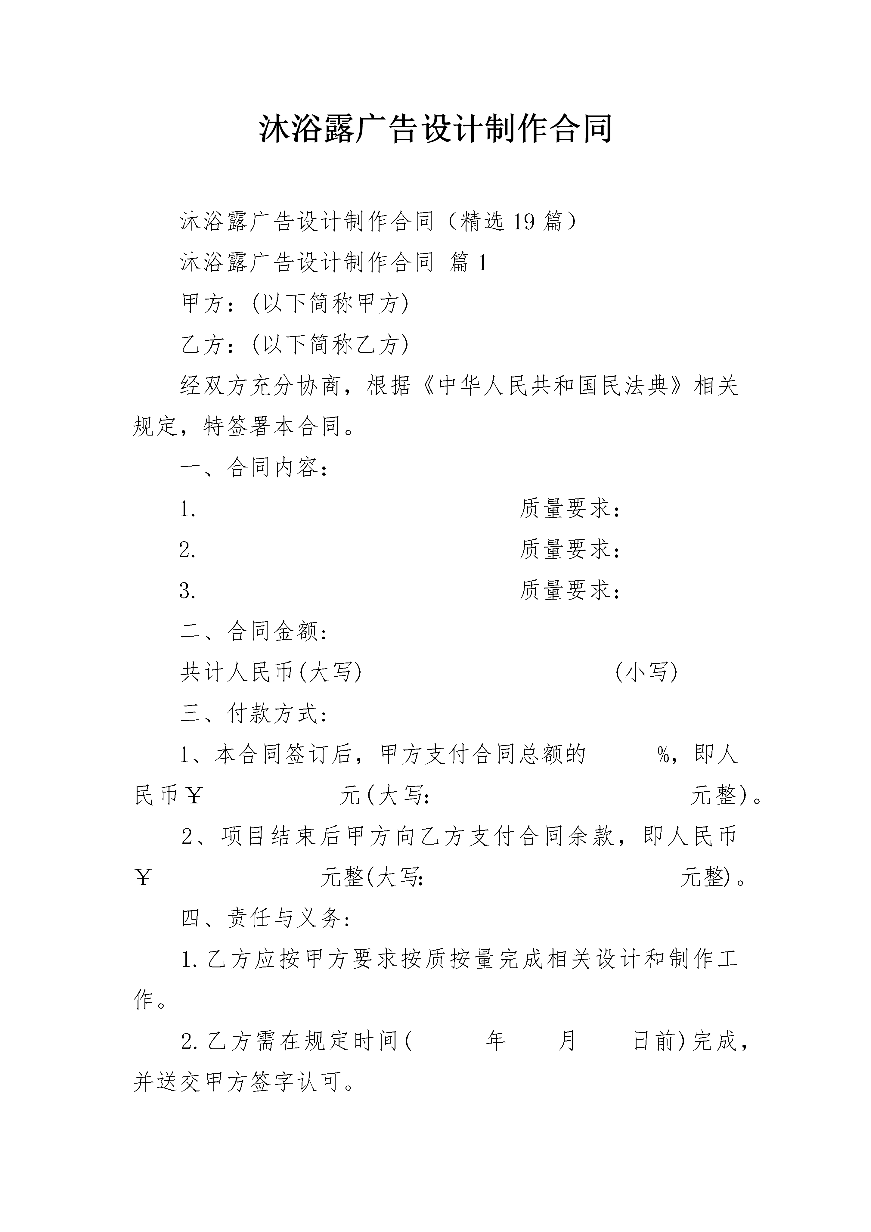 沐浴露广告设计制作合同沐浴露广告设计制作合同(精选19篇)沐浴露广告设计制作合同篇1甲方:(以下简称甲方)乙方:(以下简称乙方)经双方充分协商,根据《中华人民共和国民法典》相关规定,特签署本合同。一、合同内容:1.___________________________质量要求:2.___________________________质量要求:3.___________________________质量要求:二、合同金额:共计人民币(大写)_____________________(小写)三、付款方式:1、本合同签订后,甲方支付合同总额的______%,即人民币¥___________元(大写:_____________________元整)。2、项目结束后甲方向乙方支付合同余款,即人民币¥______________元整(大写:_____________________元整)。四、责任与义务:1.乙方应按甲方要求按质按量完成相关设计和制作工作。2.乙方需在规定时间(______年____月____日前)完成,并送交甲方签字认可。3.甲方根据乙方需要提供相关资料,并承担因版权、文责所引发的法律责任和经济纠纷。五、产权约定:甲方将委托设计的所有费用结算完毕后才享有著作权,否则,乙方设计的作品著作权归乙方,甲方对该作品不享有任何权利;甲方在余款未付清之前擅自使用或者修改使用乙方设计的作品而导致的侵权,乙方有权依据《中华人民共和国著作权法》追究其法律责任。六、违约责任:因设计和制作工作具有很大的特殊性,在经过大量调研工作的同时更需设计师的精心创作,乙方在开始着手设计时就已经在全面的履行合同,因此,甲方如提前终止合同,预付款乙方不予退还。七、其他事项:八、甲乙双方如因履行本合同发生纠纷,应友好协商解决,如无果则提请法律途径解决。本合同壹式两份,甲乙双方各持对方签字盖章合同一份,均具有同等的法律效力。甲方(盖章):______乙方(盖章):______日期:______日期:______沐浴露广告设计制作合同篇2甲方:乙方:__________网(运营商:_____有限公司)依据《中华人民共和国广告法》之有关规定。经甲、乙双方友好协商,甲方委托乙方设计、制作、发布网络广告,达成如下合同条款:一、网络广告发布位置:乙方网站__________。二、网络广告发布尺寸:_____像素×_____像素。三、网络广告发布形式:__________。四、网络广告发布时间:_____(月或天),即从广告发布之日起。五、甲、乙双方的权利和义务:1、甲方指派专人代表甲方全权负责此项网络广告发布工作;2、甲方为乙方提供网络广告的相关背景资料和数据;3、甲方对“初稿”提出审定意见;4、甲方对本网络广告内容负责,内容必须符合《中华人民共和国广告法》及国家相关法律法规。否则,造成的后果由甲方负责;5、乙方向甲方提交网络广告初稿1份及电子浏览文件1份;6、乙方根据甲方的审定意见进行修改,并向甲方提供发布稿及电子浏览文件;7、乙方取得甲方在发布稿上签字同意后在网上发布;8、乙方有权审查甲方的广告内容和表现形式,对不符合法律、法规的广告内容和表现形式,乙方可要求甲方做出修改。六、责任免除:1、因自然条件(战争、机房停电)等导致乙方服务器不能正常运行;2、因政府行政行为导致乙方不能开放服务器;3、因互联网灾难,中国、美国等互联网通讯提供商原因导致乙方服务器不能正常接入;4、因乙方操作平台及应用软件原因导致乙方服务器临时性不能正常运行;5、因乙方网站遭遇不法攻击导致服务器临时性不能正常运行。基于以上原因,导致乙方网站不能正常运行,乙方不承担任何法律上和其它方式的责任。七、费用结算:1、本次网络广告费_____元(大写人民币_____元整)。2、本合同生效之日起,甲方付清全部款项。八、本合同一式两份,自甲、乙双方签字盖章之日起生效,合同附件及合同文本具有同等的法律效力。九、本合同有效期限:自_____年_____月_____日至_____年_____月_____日止。甲方:代表签章:联系电话:_____年_____月_____日乙方:代表签章:联系电话:_____年_____月_____日沐浴露广告设计制作合同篇3甲方:乙方:经双方充分协商,根据《中华人民共和国民法典》相关规定,特签署本合同。一.合同内容:____________________________________________________________________________________二.合同金额:共计人民币__________________________________________________________________三.付款方式:1.本合同签订后,甲方支付合同