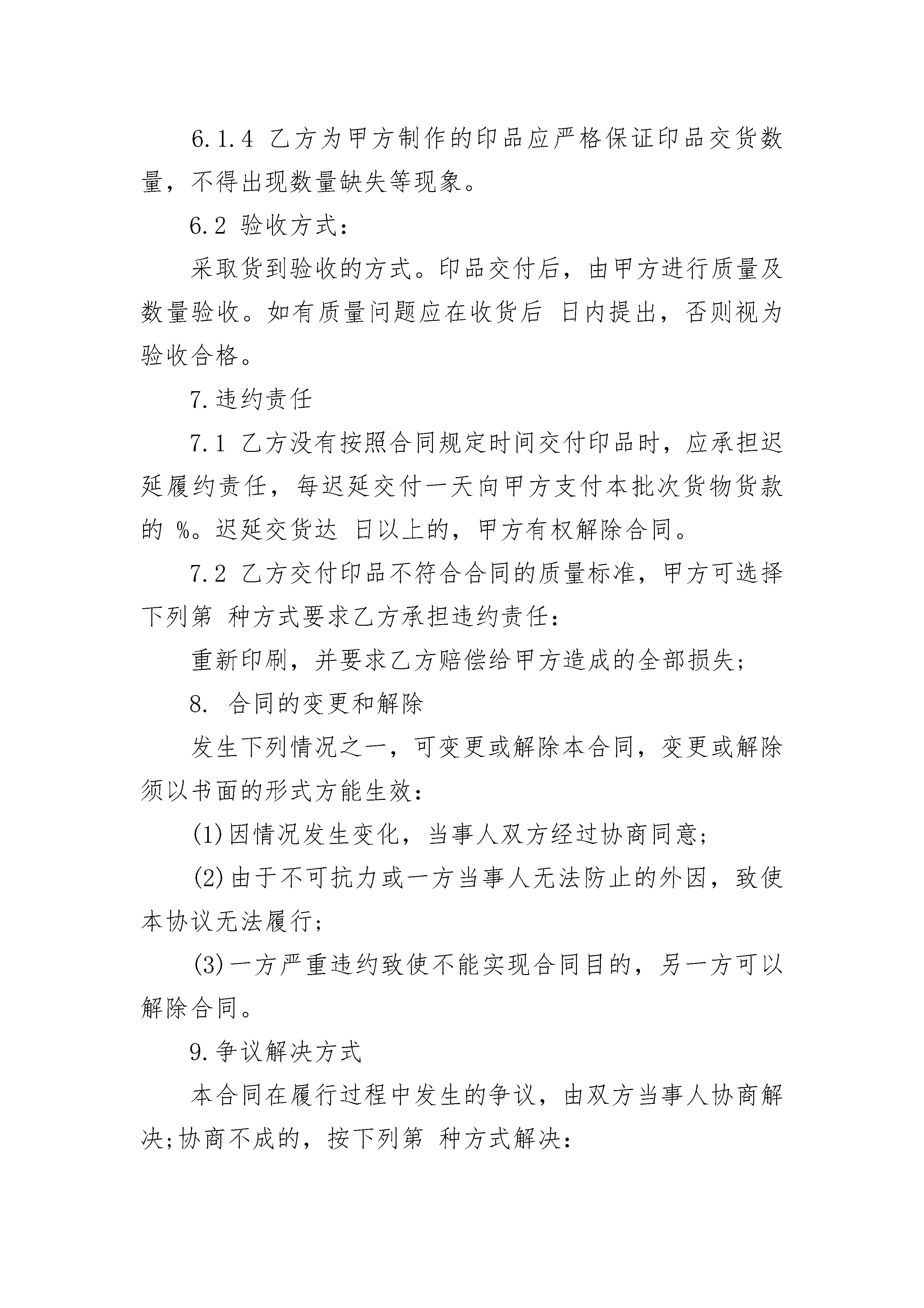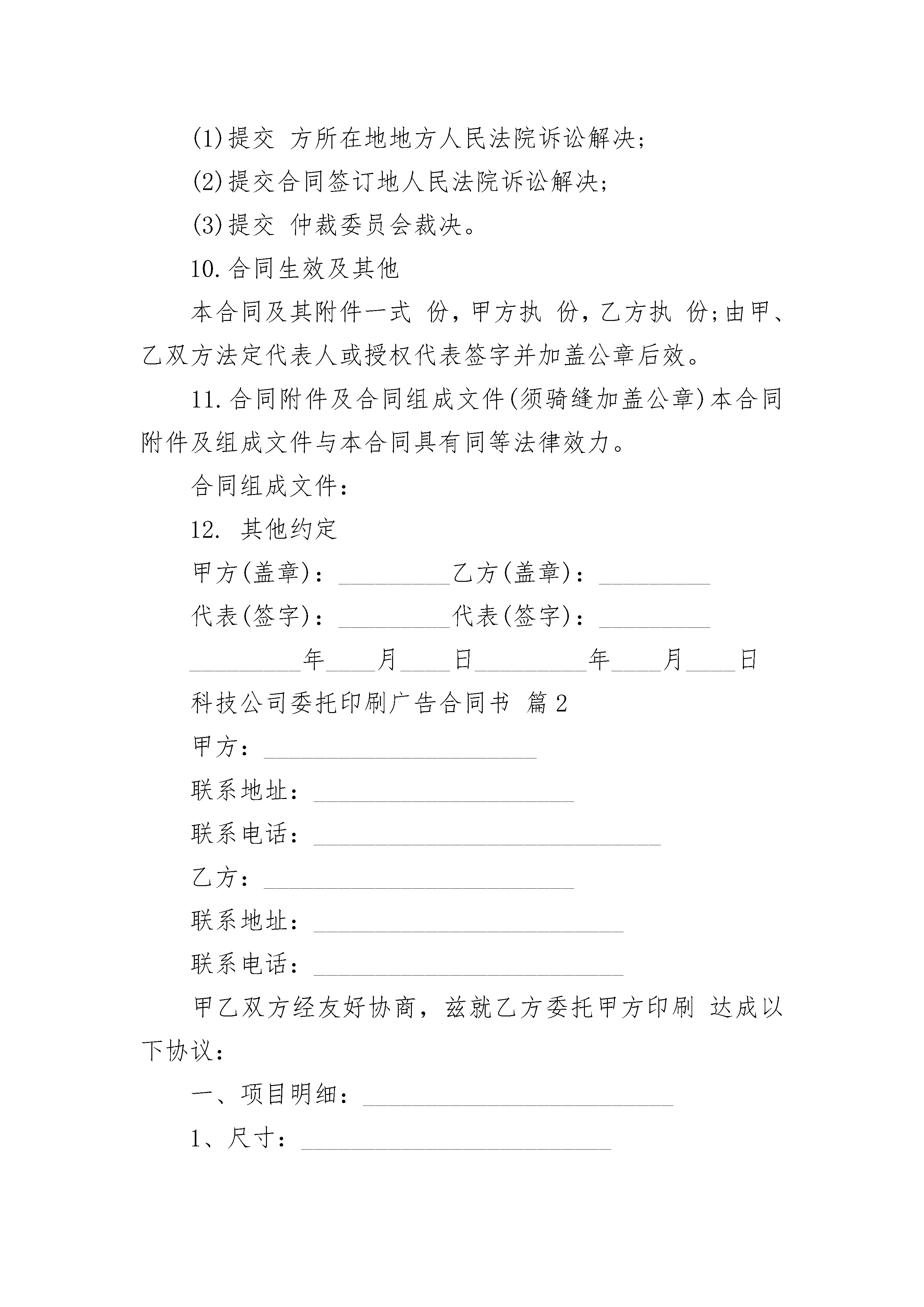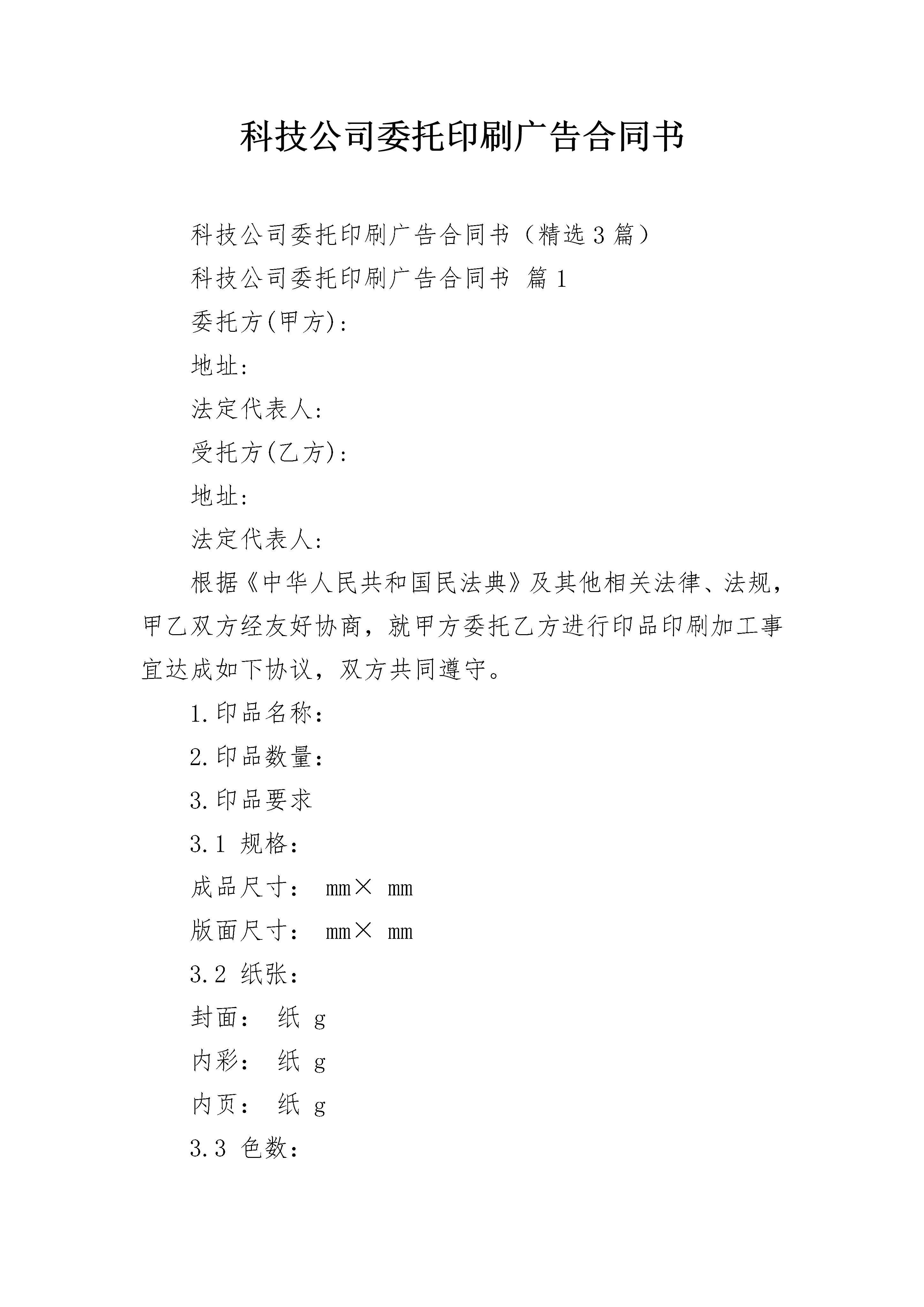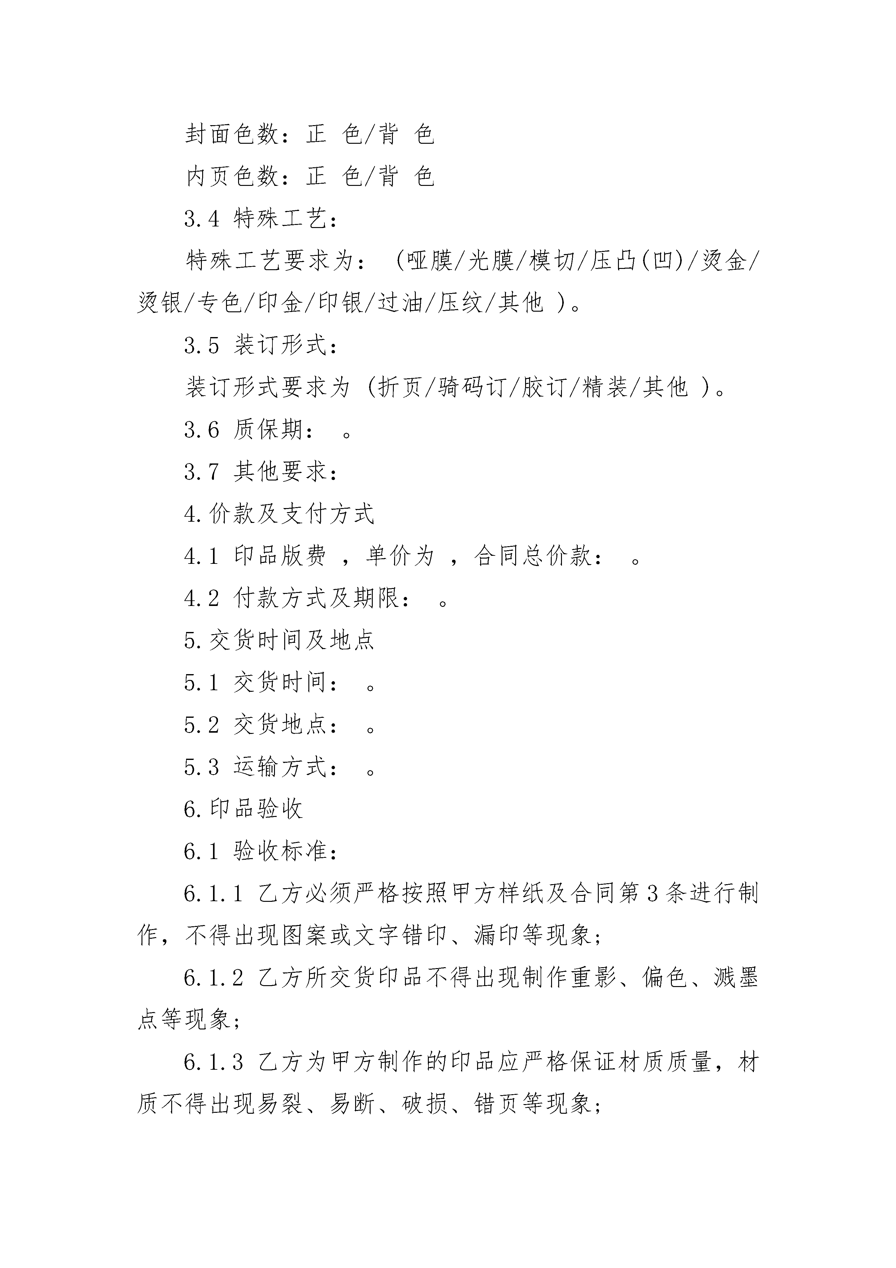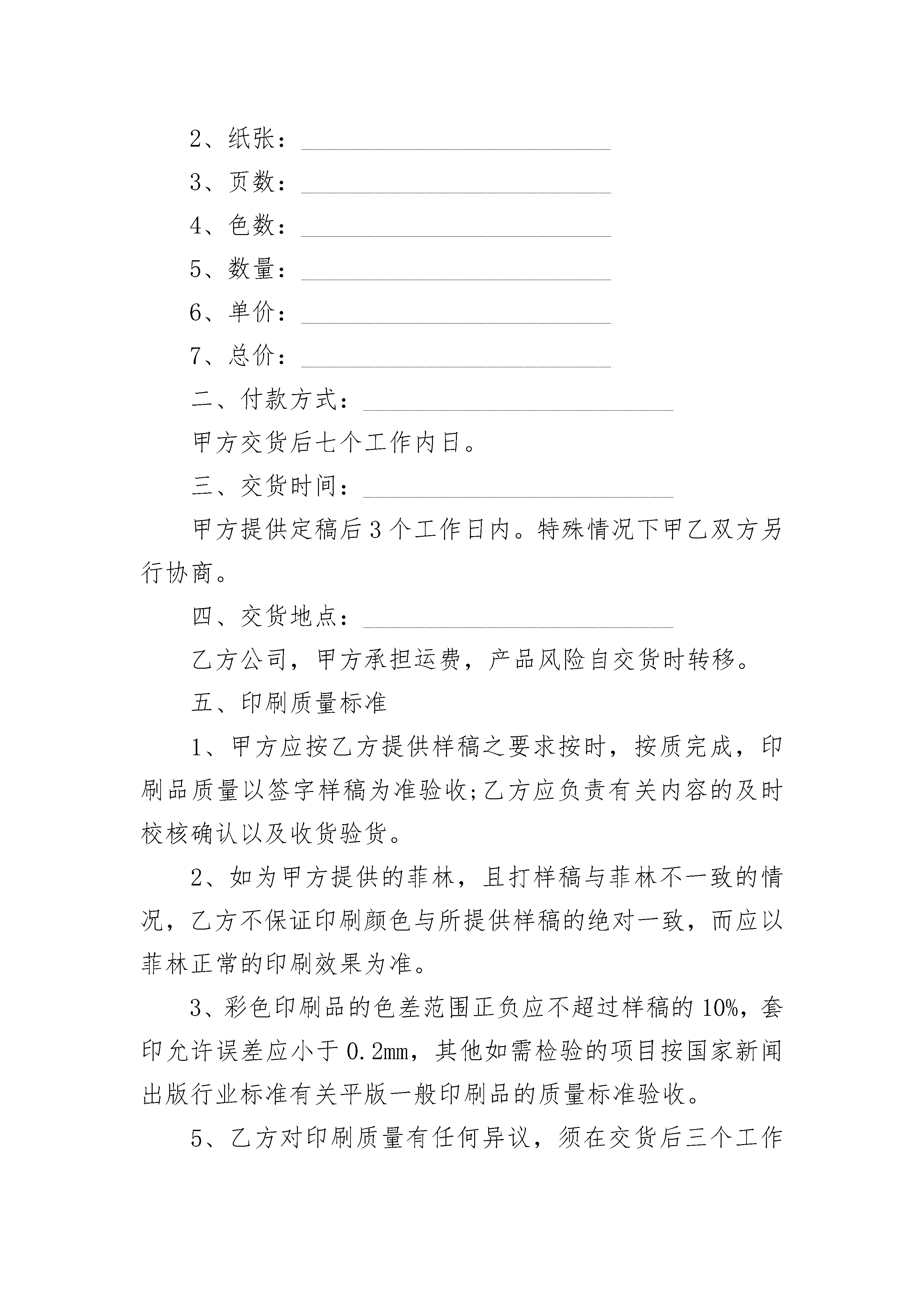 科技公司委托印刷广告合同书科技公司委托印刷广告合同书(精选3篇)科技公司委托印刷广告合同书篇1委托方(甲方):地址:法定代表人:受托方(乙方):地址:法定代表人:根据《中华人民共和国民法典》及其他相关法律、法规,甲乙双方经友好协商,就甲方委托乙方进行印品印刷加工事宜达成如下协议,双方共同遵守。1.印品名称:2.印品数量:3.印品要求3.1规格:成品尺寸:mm×mm版面尺寸:mm×mm3.2纸张:封面:纸g内彩:纸g内页:纸g3.3色数:封面色数:正色/背色内页色数:正色/背色3.4特殊工艺:特殊工艺要求为:(哑膜/光膜/模切/压凸(凹)/烫金/烫银/专色/印金/印银/过油/压纹/其他)。3.5装订形式:装订形式要求为(折页/骑码订/胶订/精装/其他)。3.6质保期:。3.7其他要求:4.价款及支付方式4.1印品版费,单价为,合同总价款:。4.2付款方式及期限:。5.交货时间及地点5.1交货时间:。5.2交货地点:。5.3运输方式:。6.印品验收6.1验收标准:6.1.1乙方必须严格按照甲方样纸及合同第3条进行制作,不得出现图案或文字错印、漏印等现象;6.1.2乙方所交货印品不得出现制作重影、偏色、溅墨点等现象;6.1.3乙方为甲方制作的印品应严格保证材质质量,材质不得出现易裂、易断、破损、错页等现象;6.1.4乙方为甲方制作的印品应严格保证印品交货数量,不得出现数量缺失等现象。6.2验收方式:采取货到验收的方式。印品交付后,由甲方进行质量及数量验收。如有质量问题应在收货后日内提出,否则视为验收合格。7.违约责任7.1乙方没有按照合同规定时间交付印品时,应承担迟延履约责任,每迟延交付一天向甲方支付本批次货物货款的%。迟延交货达日以上的,甲方有权解除合同。7.2乙方交付印品不符合合同的质量标准,甲方可选择下列第种方式要求乙方承担违约责任:重新印刷,并要求乙方赔偿给甲方造成的全部损失;8.合同的变更和解除发生下列情况之一,可变更或解除本合同,变更或解除须以书面的形式方能生效:(1)因情况发生变化,当事人双方经过协商同意;(2)由于不可抗力或一方当事人无法防止的外因,致使本协议无法履行;(3)一方严重违约致使不能实现合同目的,另一方可以解除合同。9.争议解决方式本合同在履行过程中发生的争议,由双方当事人协商解决;协商不成的,按下列第种方式解决:(1)提交方所在地地方人民法院诉讼解决;(2)提交合同签订地人民法院诉讼解决;(3)提交仲裁委员会裁决。10.合同生效及其他本合同及其附件一式份,甲方执份,乙方执份;由甲、乙双方法定代表人或授权代表签字并加盖公章后效。11.合同附件及合同组成文件(须骑缝加盖公章)本合同附件及组成文件与本合同具有同等法律效力。合同组成文件:12.其他约定甲方(盖章):_________乙方(盖章):_________代表(签字):_________代表(签字):__________________年____月____日_________年____月____日科技公司委托印刷广告合同书篇2甲方:______________________联系地址:_____________________联系电话:____________________________乙方:_________________________联系地址:_________________________联系电话:_________________________甲乙双方经友好协商,兹就乙方委托甲方印刷达成以下协议:一、项目明细:_________________________1、尺寸:_________________________2、纸张:_________________________3、页数:_________________________4、色数:_________________________5、数量:_________________________6、单价:_________________________7、总价:_________________________二、付款方式:_________________________甲方交货后七个工作内日。三、交货时间:_________________________甲方提供定稿后3个工作日内。特殊情况下甲乙双方另行协商。四、交货地点:_________________________乙方公司,甲方承担运费,产品风险自交货时转移。五、印刷质量标准1、甲方应按乙方提供样稿之要求按时,按质完成,印刷品质量以签字样稿为准验收;乙方应负责有关内容的及时校核确认以及收货验货。2、如为甲方提供的菲林,且打样稿与菲林不一致的情况,乙方不保证印刷颜色与所提供样稿的绝对一致,而应以菲林正常的印