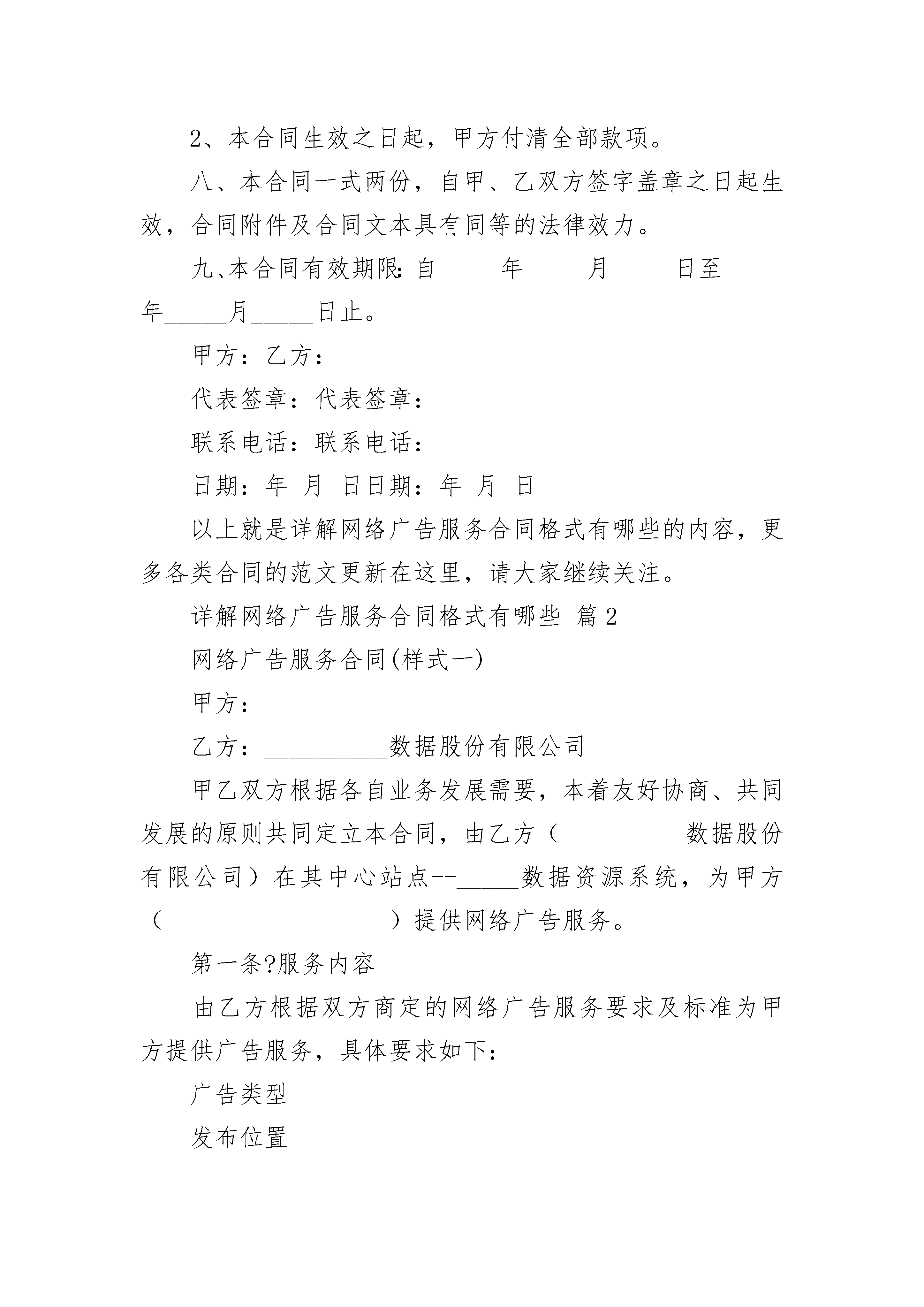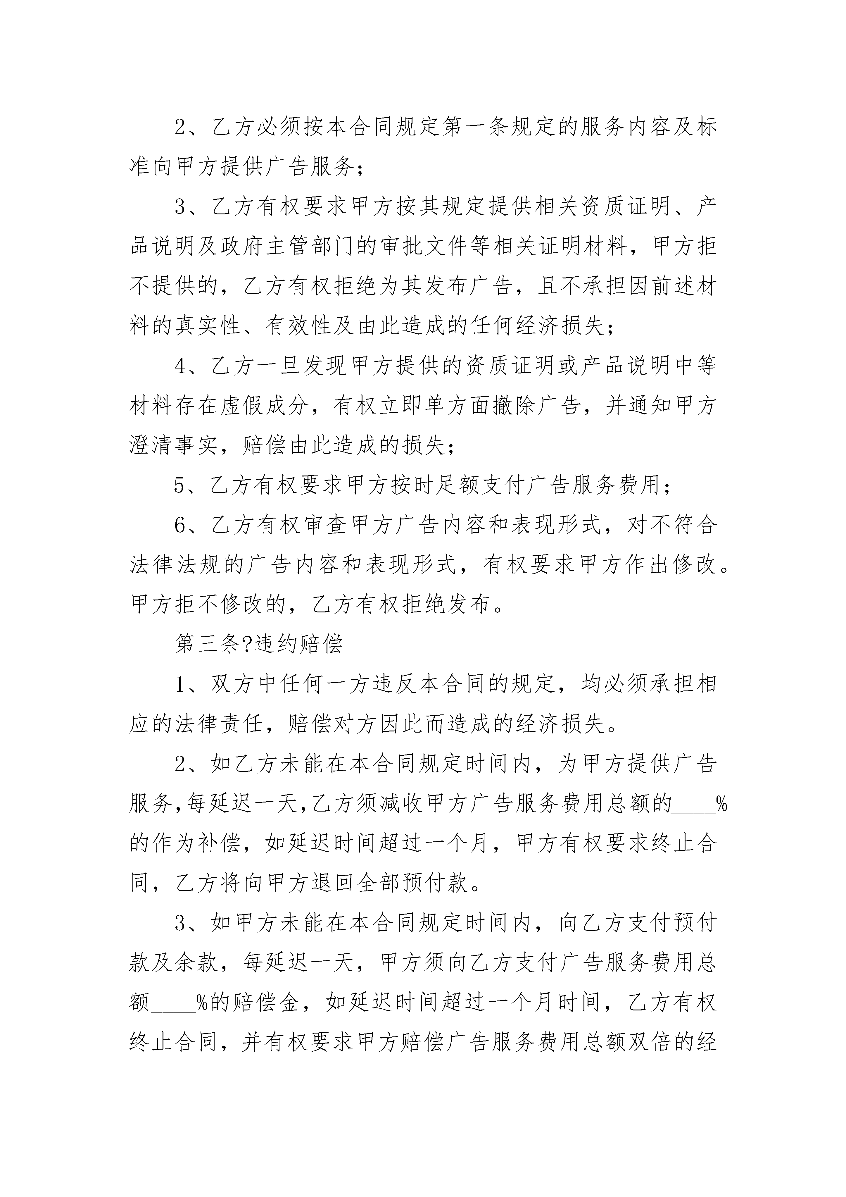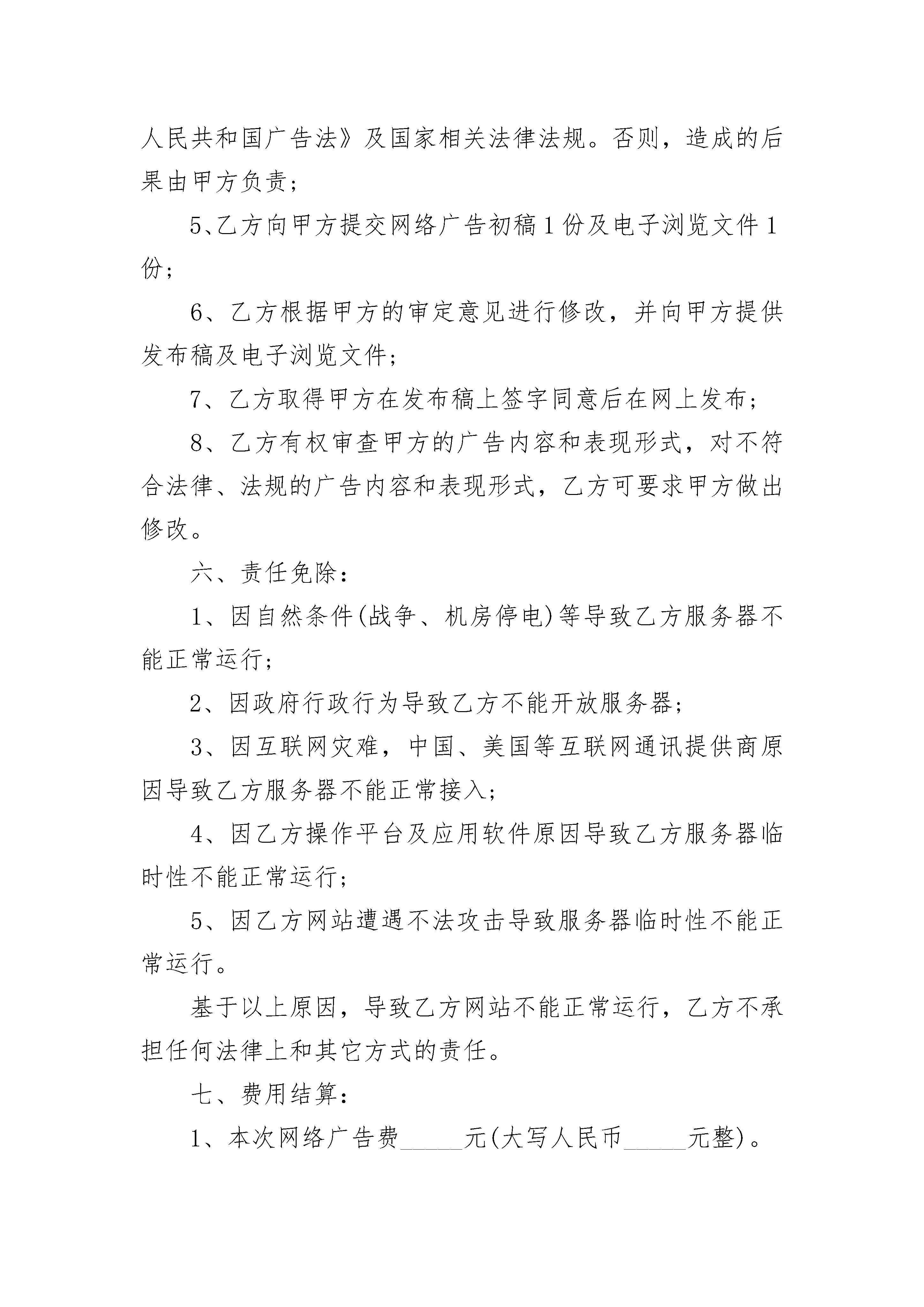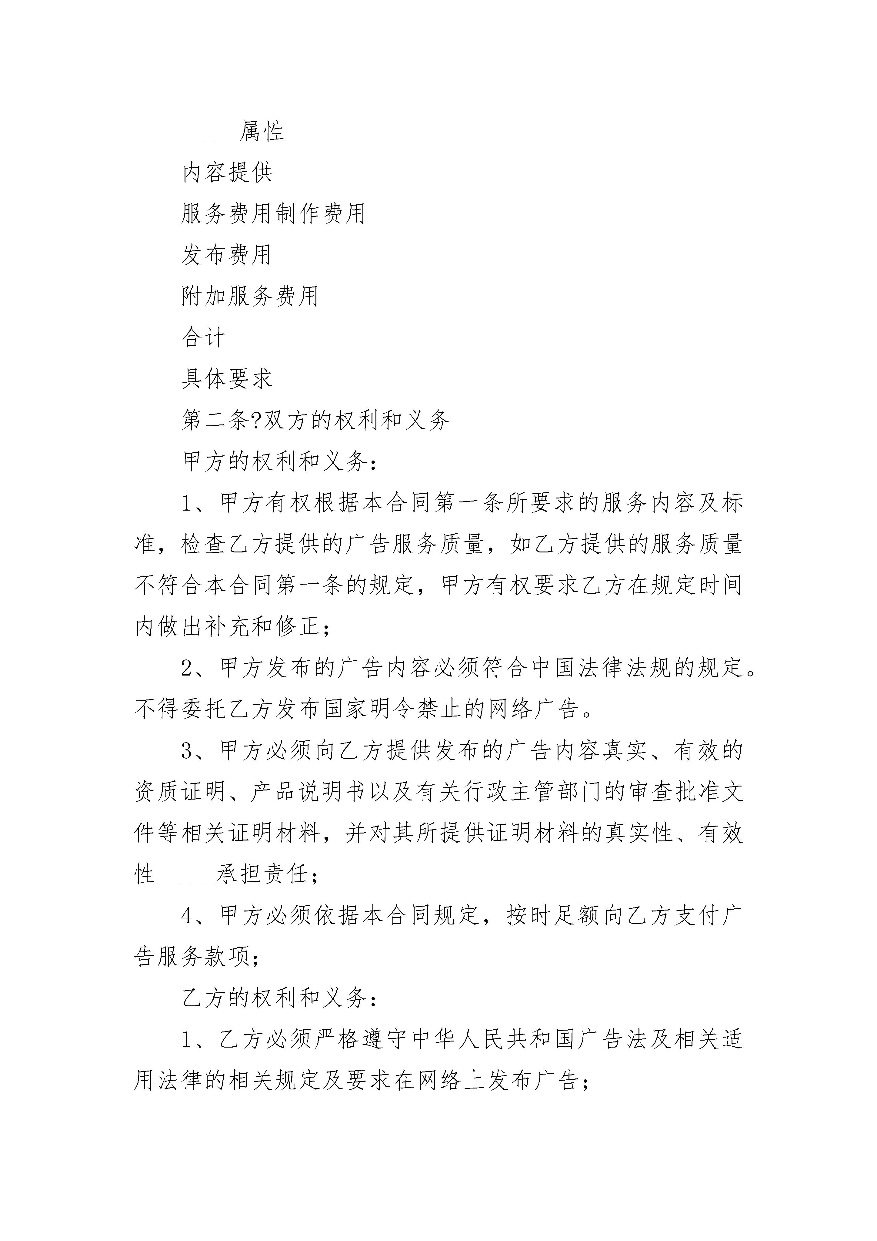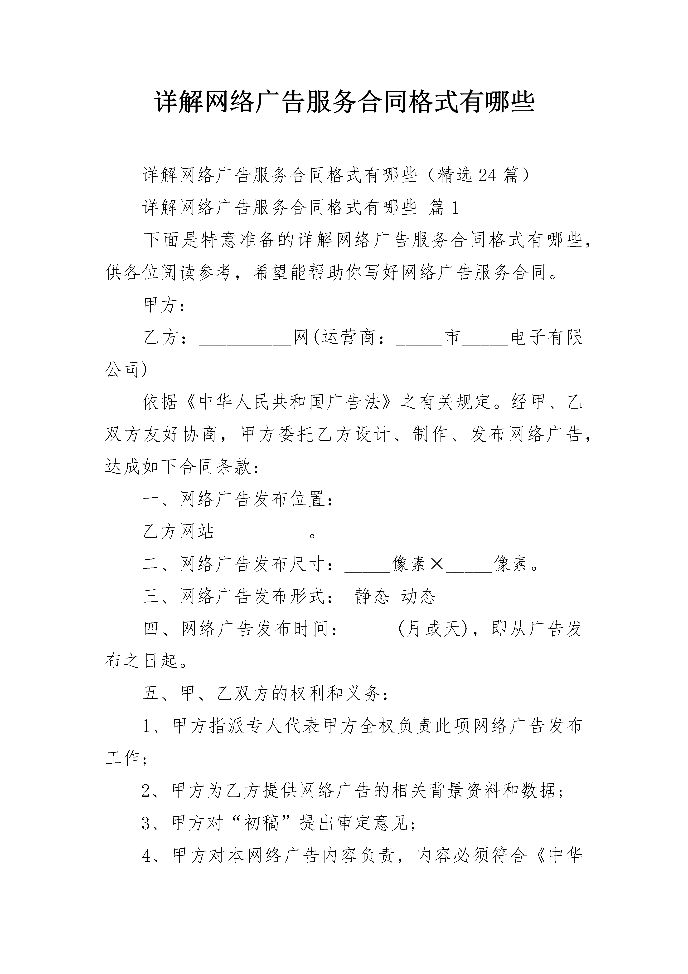 详解网络广告服务合同格式有哪些详解网络广告服务合同格式有哪些(精选24篇)详解网络广告服务合同格式有哪些篇1下面是特意准备的详解网络广告服务合同格式有哪些,供各位阅读参考,希望能帮助你写好网络广告服务合同。甲方:乙方:__________网(运营商:_____市_____电子有限公司)依据《中华人民共和国广告法》之有关规定。经甲、乙双方友好协商,甲方委托乙方设计、制作、发布网络广告,达成如下合同条款:一、网络广告发布位置:乙方网站__________。二、网络广告发布尺寸:_____像素×_____像素。三、网络广告发布形式:静态动态四、网络广告发布时间:_____(月或天),即从广告发布之日起。五、甲、乙双方的权利和义务:1、甲方指派专人代表甲方全权负责此项网络广告发布工作;2、甲方为乙方提供网络广告的相关背景资料和数据;3、甲方对“初稿”提出审定意见;4、甲方对本网络广告内容负责,内容必须符合《中华人民共和国广告法》及国家相关法律法规。否则,造成的后果由甲方负责;5、乙方向甲方提交网络广告初稿1份及电子浏览文件1份;6、乙方根据甲方的审定意见进行修改,并向甲方提供发布稿及电子浏览文件;7、乙方取得甲方在发布稿上签字同意后在网上发布;8、乙方有权审查甲方的广告内容和表现形式,对不符合法律、法规的广告内容和表现形式,乙方可要求甲方做出修改。六、责任免除:1、因自然条件(战争、机房停电)等导致乙方服务器不能正常运行;2、因政府行政行为导致乙方不能开放服务器;3、因互联网灾难,中国、美国等互联网通讯提供商原因导致乙方服务器不能正常接入;4、因乙方操作平台及应用软件原因导致乙方服务器临时性不能正常运行;5、因乙方网站遭遇不法攻击导致服务器临时性不能正常运行。基于以上原因,导致乙方网站不能正常运行,乙方不承担任何法律上和其它方式的责任。七、费用结算:1、本次网络广告费_____元(大写人民币_____元整)。2、本合同生效之日起,甲方付清全部款项。八、本合同一式两份,自甲、乙双方签字盖章之日起生效,合同附件及合同文本具有同等的法律效力。九、本合同有效期限:自_____年_____月_____日至_____年_____月_____日止。甲方:乙方:代表签章:代表签章:联系电话:联系电话:日期:年月日日期:年月日以上就是详解网络广告服务合同格式有哪些的内容,更多各类合同的范文更新在这里,请大家继续关注。详解网络广告服务合同格式有哪些篇2网络广告服务合同(样式一)甲方:乙方:__________数据股份有限公司甲乙双方根据各自业务发展需要,本着友好协商、共同发展的原则共同定立本合同,由乙方(__________数据股份有限公司)在其中心站点--_____数据资源系统,为甲方(__________________)提供网络广告服务。第一条?服务内容由乙方根据双方商定的网络广告服务要求及标准为甲方提供广告服务,具体要求如下:广告类型发布位置_____属性内容提供服务费用制作费用发布费用附加服务费用合计具体要求第二条?双方的权利和义务甲方的权利和义务:1、甲方有权根据本合同第一条所要求的服务内容及标准,检查乙方提供的广告服务质量,如乙方提供的服务质量不符合本合同第一条的规定,甲方有权要求乙方在规定时间内做出补充和修正;2、甲方发布的广告内容必须符合中国法律法规的规定。不得委托乙方发布国家明令禁止的网络广告。3、甲方必须向乙方提供发布的广告内容真实、有效的资质证明、产品说明书以及有关行政主管部门的审查批准文件等相关证明材料,并对其所提供证明材料的真实性、有效性_____承担责任;4、甲方必须依据本合同规定,按时足额向乙方支付广告服务款项;乙方的权利和义务:1、乙方必须严格遵守中华人民共和国广告法及相关适用法律的相关规定及要求在网络上发布广告;2、乙方必须按本合同规定第一条规定的服务内容及标准向甲方提供广告服务;3、乙方有权要求甲方按其规定提供相关资质证明、产品说明及政府主管部门的审批文件等相关证明材料,甲方拒不提供的,乙方有权拒绝为其发布广告,且不承担因前述材料的真实性、有效性及由此造成的任何经济损失;4、乙方一旦发现甲方提供的资质证明或产品说明中等材料存在虚假成分,有权立即单方面撤除广告,并通知甲方澄清事实,赔偿由此造成的损失;5、乙方有权要求甲方按时足额支付广告服务费用;6、乙方有权审查甲方广告内容和表现形式,对不符合法律法规的广告内容和表现形式,有权要求甲方作出修改。甲方拒不修改的,乙方有权拒绝发布。第三条?违约赔偿1、双方中任何一方违反本合同的规定,均必须承担相应的法律责任,赔偿对方因此而造成的经济损失。2、如乙方未能在本合同规定时间内,为甲方提供广告服务,每延迟一天,乙方须减收甲方广告服务费用总额的____%的作为补偿,如延迟时间超过