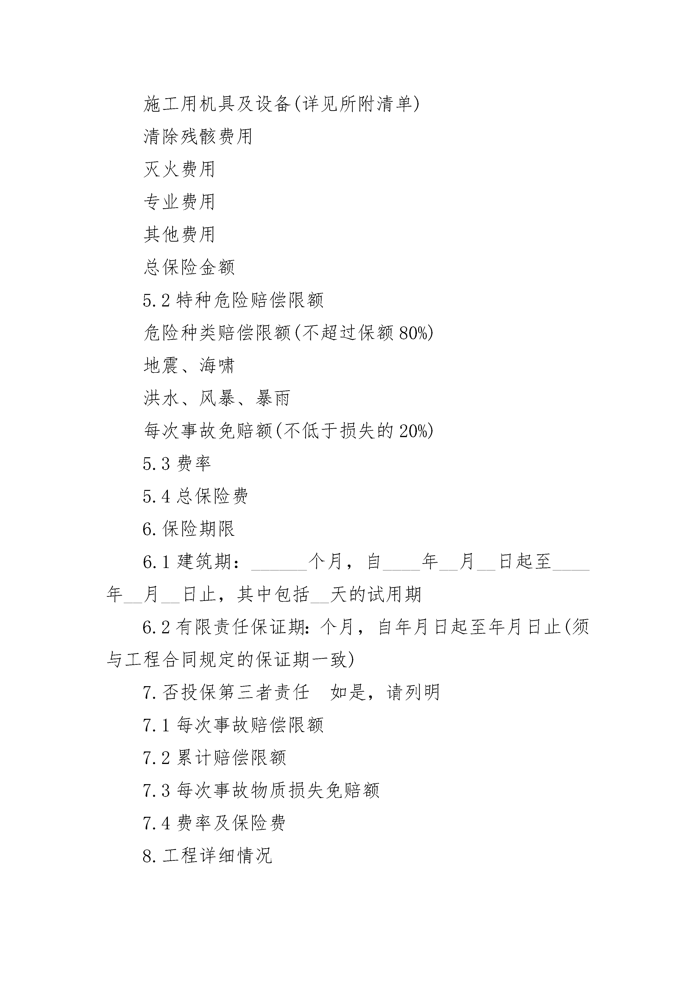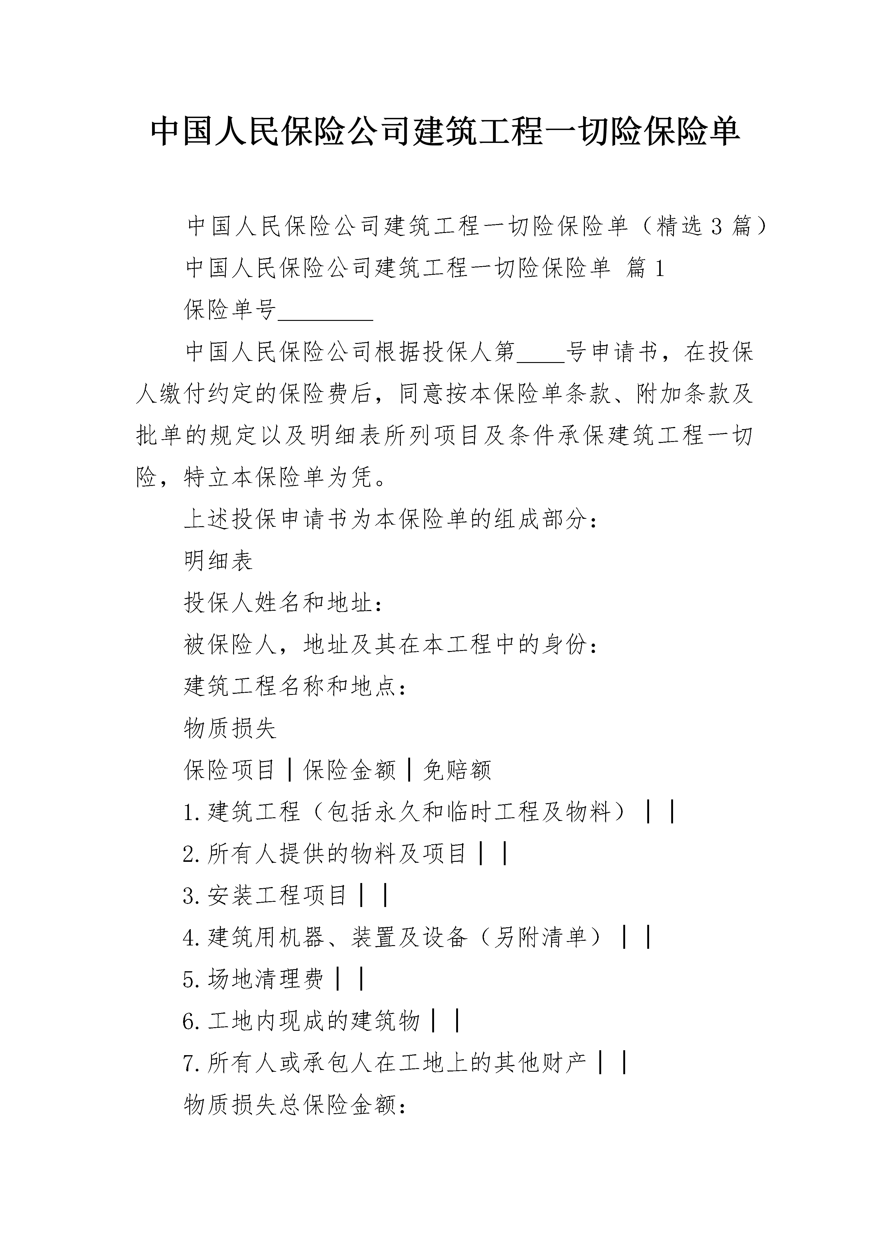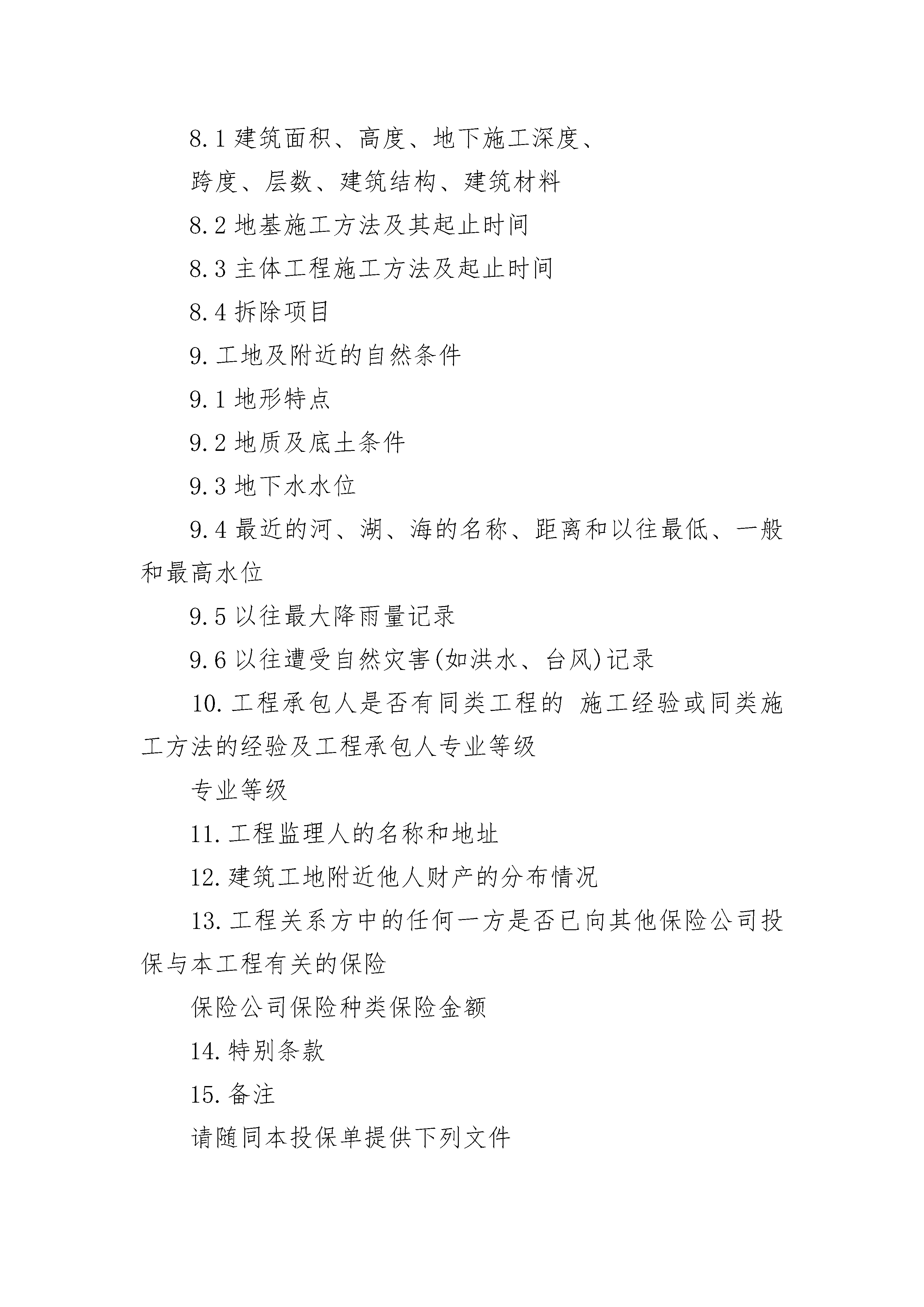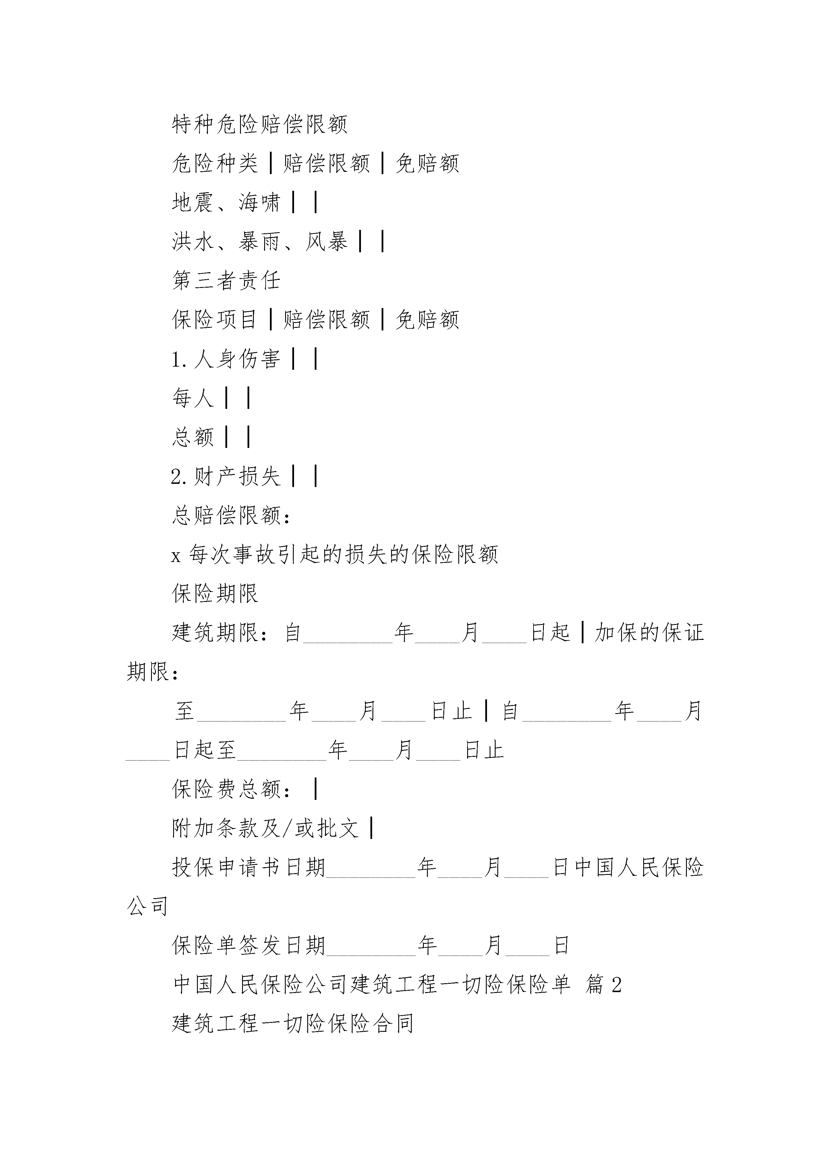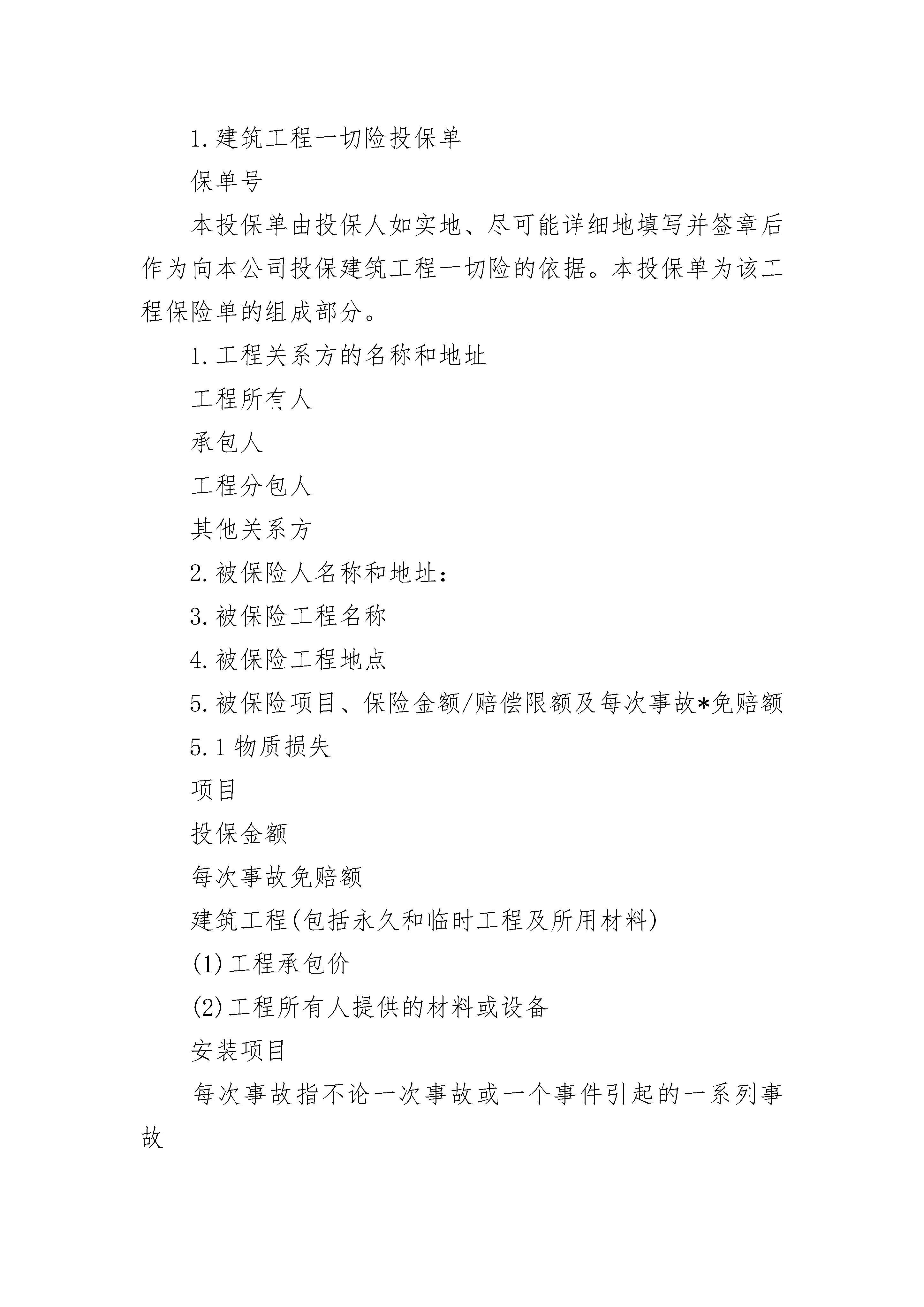 中国人民保险公司建筑工程一切险保险单中国人民保险公司建筑工程一切险保险单(精选3篇)中国人民保险公司建筑工程一切险保险单篇1保险单号____中国人民保险公司根据投保人第__号申请书,在投保人缴付约定的保险费后,同意按本保险单条款、附加条款及批单的规定以及明细表所列项目及条件承保建筑工程一切险,特立本保险单为凭。上述投保申请书为本保险单的组成部分:明细表投保人姓名和地址:被保险人,地址及其在本工程中的身份:建筑工程名称和地点:物质损失保险项目│保险金额│免赔额1.建筑工程(包括永久和临时工程及物料)││2.所有人提供的物料及项目││3.安装工程项目││4.建筑用机器、装置及设备(另附清单)││5.场地清理费││6.工地内现成的建筑物││7.所有人或承包人在工地上的其他财产││物质损失总保险金额:特种危险赔偿限额危险种类│赔偿限额│免赔额地震、海啸││洪水、暴雨、风暴││第三者责任保险项目│赔偿限额│免赔额1.人身伤害││每人││总额││2.财产损失││总赔偿限额:x每次事故引起的损失的保险限额保险期限建筑期限:自________年____月____日起│加保的保证期限:至________年____月____日止│自________年____月____日起至________年____月____日止保险费总额:│附加条款及/或批文│投保申请书日期________年____月____日中国人民保险公司保险单签发日期________年____月____日中国人民保险公司建筑工程一切险保险单篇2建筑工程一切险保险合同1.建筑工程一切险投保单保单号本投保单由投保人如实地、尽可能详细地填写并签章后作为向本公司投保建筑工程一切险的依据。本投保单为该工程保险单的组成部分。1.工程关系方的名称和地址工程所有人承包人工程分包人其他关系方2.被保险人名称和地址:3.被保险工程名称4.被保险工程地点5.被保险项目、保险金额/赔偿限额及每次事故*免赔额5.1物质损失项目投保金额每次事故免赔额建筑工程(包括永久和临时工程及所用材料)(1)工程承包价(2)工程所有人提供的材料或设备安装项目每次事故指不论一次事故或一个事件引起的一系列事故施工用机具及设备(详见所附清单)清除残骸费用灭火费用专业费用其他费用总保险金额5.2特种危险赔偿限额危险种类赔偿限额(不超过保额80%)地震、海啸洪水、风暴、暴雨每次事故免赔额(不低于损失的20%)5.3费率5.4总保险费6.保险期限6.1建筑期:______个月,自____年__月__日起至____年__月__日止,其中包括__天的试用期6.2有限责任保证期:个月,自年月日起至年月日止(须与工程合同规定的保证期一致)7.否投保第三者责任如是,请列明7.1每次事故赔偿限额7.2累计赔偿限额7.3每次事故物质损失免赔额7.4费率及保险费8.工程详细情况8.1建筑面积、高度、地下施工深度、跨度、层数、建筑结构、建筑材料8.2地基施工方法及其起止时间8.3主体工程施工方法及起止时间8.4拆除项目9.工地及附近的自然条件9.1地形特点9.2地质及底土条件9.3地下水水位9.4最近的河、湖、海的名称、距离和以往最低、一般和最高水位9.5以往最大降雨量记录9.6以往遭受自然灾害(如洪水、台风)记录10.工程承包人是否有同类工程的施工经验或同类施工方法的经验及工程承包人专业等级专业等级11.工程监理人的名称和地址12.建筑工地附近他人财产的分布情况13.工程关系方中的任何一方是否已向其他保险公司投保与本工程有关的保险保险公司保险种类保险金额14.特别条款15.备注请随同本投保单提供下列文件(1)工程合同(2)承保金额明细表(3)工程设计书(4)工程进度表(5)工程地质报告(6)工地概图投保人及被保险人兹声明所填上述内容属实,对贵公司就安装工程一切险条款及附加内容(包括责任免除部分)的说明已经了解,同意按照该条款和附加内容投保安装工程一切险。投保人及被保险人(签章)__________________________电话______________地址_________________________________日期___________________以下内容由保险公司填写经办人及日期___________________________核保人及日期____________________2.中国太平洋保险公司安装工程一切险条款一、第一部分物质损失(一)责任范围1.在本保险期限内,若本保险单明细表中分项列明的保险财产在列明的工地范围内,因本保险单除外责任以外的任何自然灾害或意外事故造成的物质损坏或灭失(以下简称“损失”),本公司按本保险单的规定负责赔偿。2.对经本保险单列明的因发生上述损失所产生的有关费用,本公司亦可负责赔偿。3.