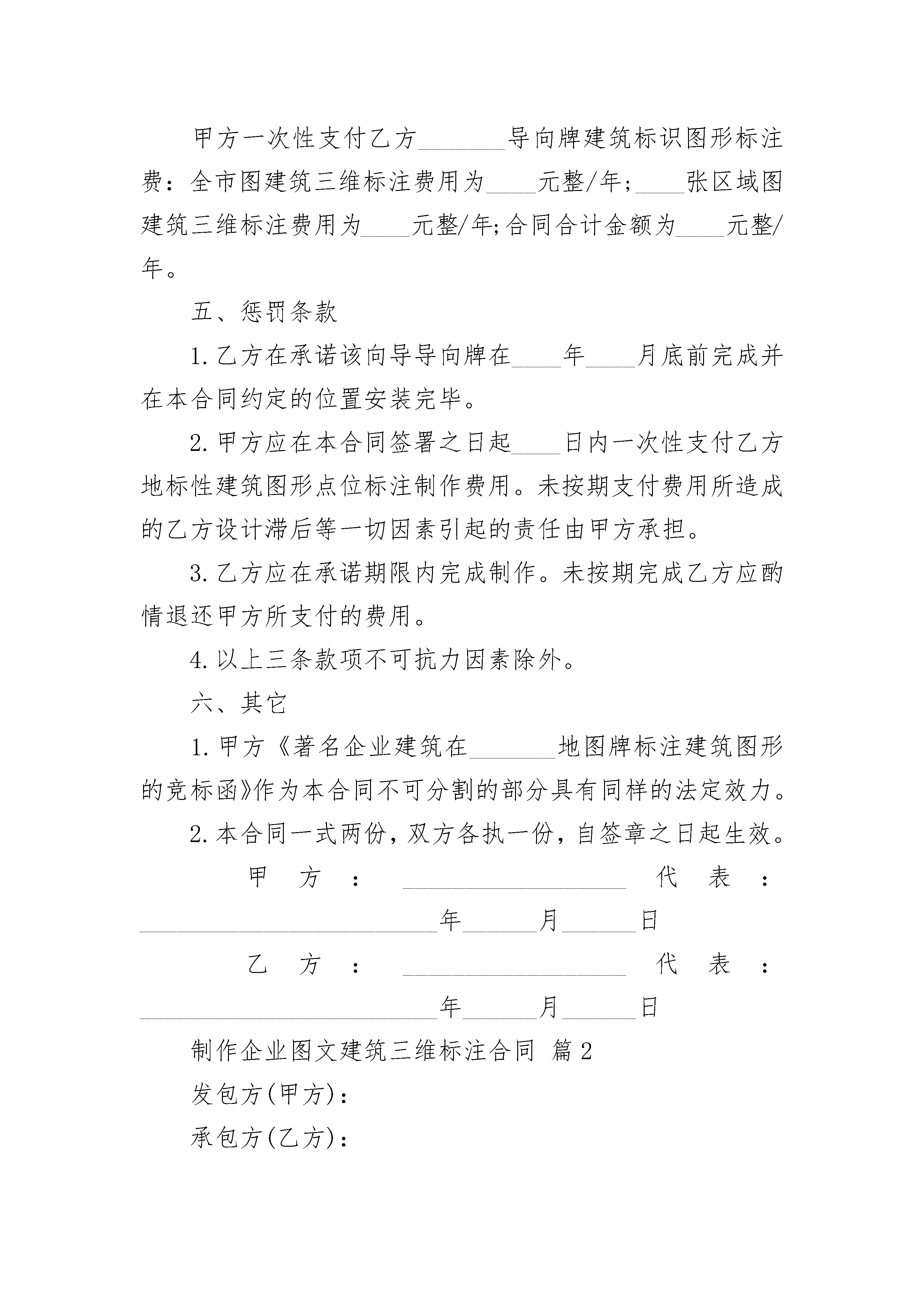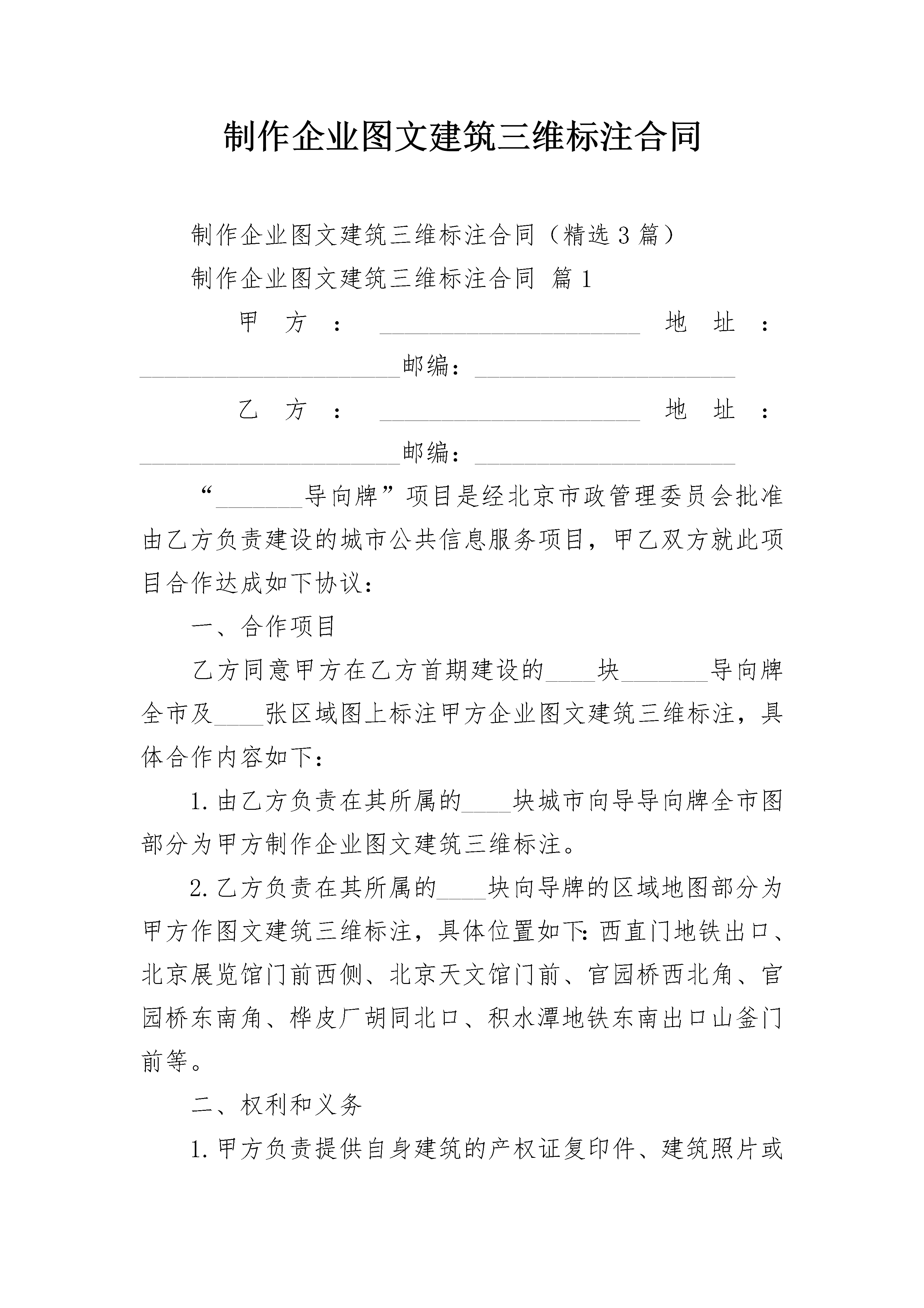 制作企业图文建筑三维标注合同制作企业图文建筑三维标注合同(精选3篇)制作企业图文建筑三维标注合同篇1甲方:_____________________地址:_____________________邮编:_____________________乙方:_____________________地址:_____________________邮编:_____________________“_______导向牌”项目是经北京市政管理委员会批准由乙方负责建设的城市公共信息服务项目,甲乙双方就此项目合作达成如下协议:一、合作项目乙方同意甲方在乙方首期建设的____块_______导向牌全市及____张区域图上标注甲方企业图文建筑三维标注,具体合作内容如下:1.由乙方负责在其所属的____块城市向导导向牌全市图部分为甲方制作企业图文建筑三维标注。2.乙方负责在其所属的____块向导牌的区域地图部分为甲方作图文建筑三维标注,具体位置如下:西直门地铁出口、北京展览馆门前西侧、北京天文馆门前、官园桥西北角、官园桥东南角、桦皮厂胡同北口、积水潭地铁东南出口山釜门前等。二、权利和义务1.甲方负责提供自身建筑的产权证复印件、建筑照片或建筑图片、工商营业执照复印件等相关资料作为参加_______导向牌的点位标注的重要审核资料保存。2.甲方支付在_______导向牌上的部分区域地图标注所需费用。3.乙方负责执行_______导向牌的建设,负责为甲方设计制作甲方自身企业建筑图形,并将甲方认定后的企业图形设计方案以电子文档的`形式赠送给甲方,以便甲方留作它用。4.乙方负责在___________块导向牌中甲方选择的____块区域图中以立体三维图形标注的形式标注甲方企业的建筑图形。5.乙方负责_______导向牌每年的建设、经营、维护和安全工作。6.甲方享有乙方承诺的甲方建筑图形在乙方_______导向牌中的全市图及____块区域地图中标注时间为____年。在____年中如果甲方信息发生变更,乙方免费为其更换。7.甲方有权监督审核乙方的____块_______导向牌建设中地图标注企业图形情况。8.甲乙双方的合作价格不得向第三方公布。三、制作标准甲乙双方合作所涉及的地图的具体规格、样式、摆放位置的具体标准参照乙方提供的《著名企业建筑在_______地图牌标注建筑图形的竞标函》的相关数据。四、费用支付甲方一次性支付乙方_______导向牌建筑标识图形标注费:全市图建筑三维标注费用为____元整/年;____张区域图建筑三维标注费用为____元整/年;合同合计金额为____元整/年。五、惩罚条款1.乙方在承诺该向导导向牌在____年____月底前完成并在本合同约定的位置安装完毕。2.甲方应在本合同签署之日起____日内一次性支付乙方地标性建筑图形点位标注制作费用。未按期支付费用所造成的乙方设计滞后等一切因素引起的责任由甲方承担。3.乙方应在承诺期限内完成制作。未按期完成乙方应酌情退还甲方所支付的费用。4.以上三条款项不可抗力因素除外。六、其它1.甲方《著名企业建筑在_______地图牌标注建筑图形的竞标函》作为本合同不可分割的部分具有同样的法定效力。2.本合同一式两份,双方各执一份,自签章之日起生效。甲方:__________________代表:________________________年______月______日乙方:__________________代表:________________________年______月______日制作企业图文建筑三维标注合同篇2发包方(甲方):承包方(乙方):根据《中华人民共和国经济合同法》和《建筑安装工程承包方合同条例》的规定,在平等、自愿的基础上,结合甲、乙双方及本工程的具体情况,经双方协商一致,达成如下合同条款,双方共同遵守。一、工程概况1、工程名称:三亚半岭温泉度假酒店项目BL-02-06地块42#-52#别墅2、工程地址:3、承包范围:室内木基层制作4、承包方式:具体工程内容及部位均以甲方签字认可的施工图、实施方案及书面通知为准。5、工期:开工日期为,完工日期为:6、工程质量:合格。7、工程单价:详见《工程单价表》。二、甲方工作1、开工前三天,向乙方提供确认的施工图纸及相关施工资料,并向乙方进行安全、文明、技术交底,向乙方提供施工所需水、电的搭接点。2、为乙方办理现场所需的出入证、工作证等相关证件和登记手续。3、对班组进行管理、监督、指挥、负责施工现场各单位、部门、班组间的协调配合工作。4、合同当月进度款审批完成后,定期按工程进度及工作量发放进度款。5、项目部定期举行例会,协调解决施工现场问题。三、乙方工作1、理解施工图纸及施工技术方法,有不明白的地方请示现场项目部管理人员。2、自行配置施工所用的手