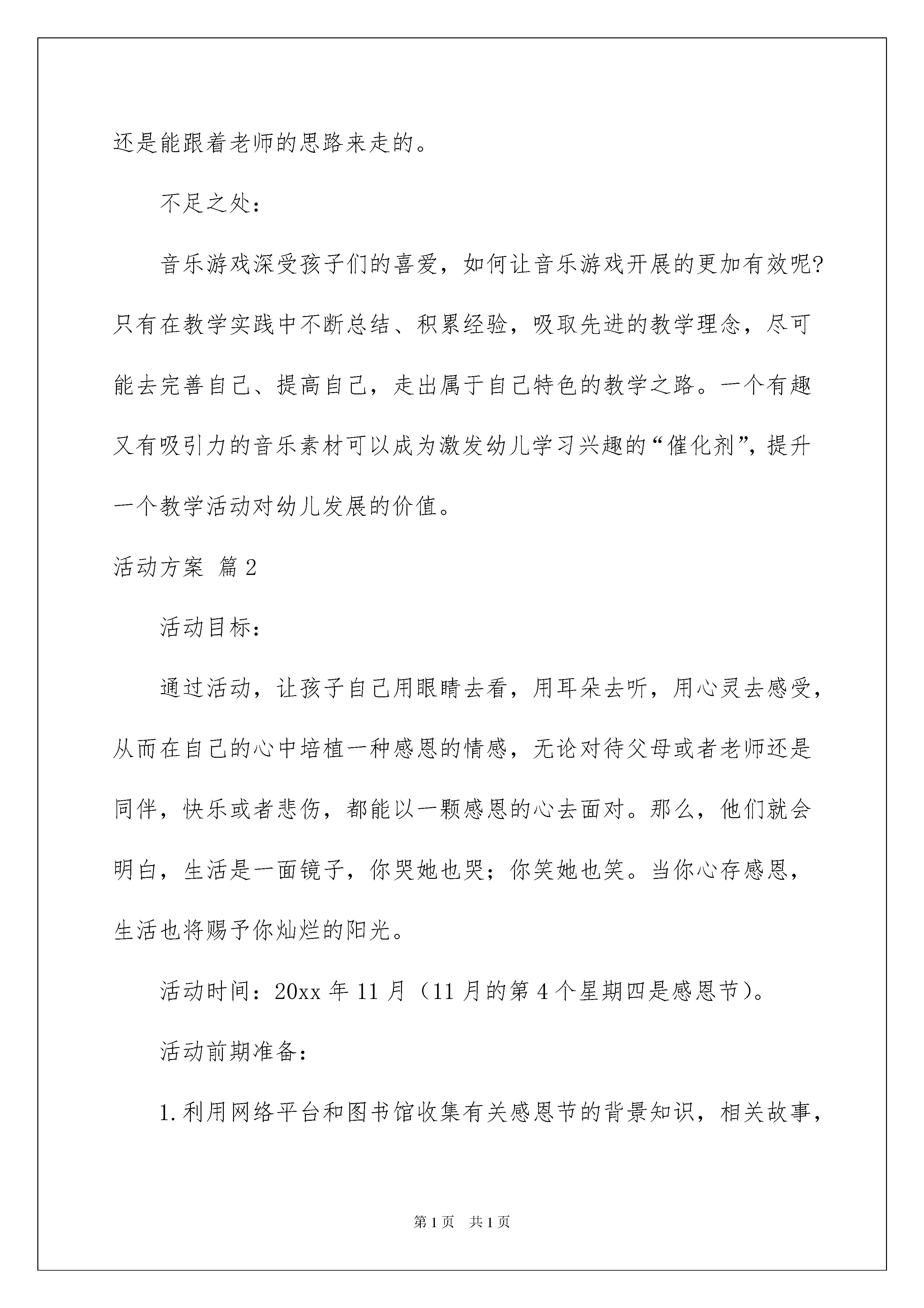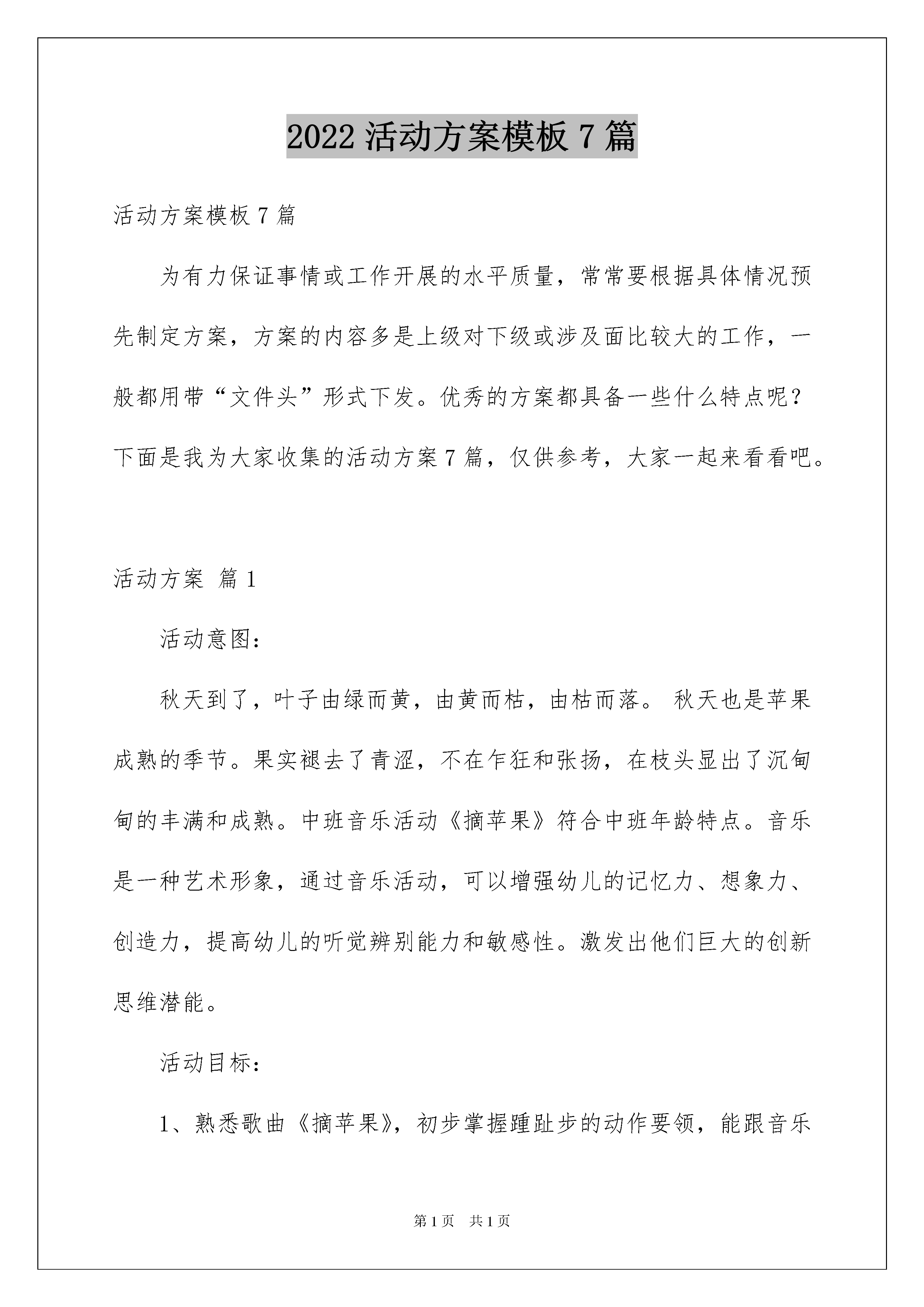 2022活动方案模板7篇活动方案模板7篇为有力保证事情或工作开展的水平质量,常常要根据具体情况预先制定方案,方案的内容多是上级对下级或涉及面比较大的工作,一般都用带“文件头”形式下发。优秀的方案都具备一些什么特点呢?下面是我为大家收集的活动方案7篇,仅供参考,大家一起来看看吧。活动方案篇1活动意图:秋天到了,叶子由绿而黄,由黄而枯,由枯而落。秋天也是苹果成熟的季节。果实褪去了青涩,不在乍狂和张扬,在枝头显出了沉甸甸的丰满和成熟。中班音乐活动《摘苹果》符合中班年龄特点。音乐是一种艺术形象,通过音乐活动,可以增强幼儿的记忆力、想象力、创造力,提高幼儿的听觉辨别能力和敏感性。激发出他们巨大的创新思维潜能。活动目标:1、熟悉歌曲《摘苹果》,初步掌握踵趾步的动作要领,能跟音乐较合拍地做摘果子及踵趾步的动作。2、在唱唱跳跳中表现秋收的愉快心情。3、在感受歌曲的基础上,理解歌曲意境。4、培养幼儿的音乐节奏感,发展幼儿的表现力。5、乐意参加音乐活动,体验音乐活动中的快乐。活动准备:1、《摘果子》的音乐。2、前期经验准备:熟悉歌曲《摘苹果》。活动过程:一、活动导入1、听音乐排座、练声。2、听音乐《摘苹果》,体验歌曲旋律,激发幼儿学习兴趣。导入语:今天老师带来了一段音乐,请小朋友听一听,拍一拍。这段音乐听上去感觉怎样?(欢快)这段音乐告诉我们一件高兴的事情,秋天到了,小朋友在果园里欢快地摘果子呢!谁知道果子是怎么摘的呢?二、学习摘果子的动作。1、幼儿交流。(幼儿边说边做摘果子的动作,师幼一起学一学动作)2、学习摘果子的动作,教师哼唱。A、提示:手指张开并稍稍弯曲作握苹果状,手臂向上手腕转动一次B、引导幼儿不同方位摘一摘。C、这里的果子摘完了,前面还有的果子可以怎么摘呢?3、学习踵趾步的动作。“可以跑过去摘,怎么跑呢?”,教师示范。提问:老师是怎样去的?让幼儿说出脚的动作。(脚跟,脚尖,跑跑跑。)教师小结:像这种脚跟、脚尖、跑跑跑的动作叫踵趾小跑步,它是舞蹈动作里的舞步的一种。4、分步练习踵趾步。我们一起来学一学:脚跟、脚尖、跑跑跑。5、幼儿听音乐手脚配合练习摘苹果动作。6、完整学跳:《摘苹果》1、教师边唱边示范跳一遍。2、幼儿边唱边学。3、师生共同跳《摘苹果》。A、创设情境:现在背起我们的小竹篓,去摘果子吧!B、教师:让我们听着欢快的音乐去摘苹果好吗?放松活动:竹篓里的果子摘得满满的,心里觉得怎么样?我们就带着愉快的心情吧果子送到仓库里吧。活动反思:本次活动题材选择恰当。该乐曲旋律欢快活泼,节奏鲜明,动作感较强,符合了中班幼儿的年龄特点和欣赏需要。活动的整体感觉是自然流畅、轻松活泼的。整个活动我营造了一个有情、有趣的'音乐“情境”,让孩子们玩在其中、乐在其中,在感受音乐快乐的同时还发展了音乐的智慧和素养。整个活动环节是由浅入深、层层递进的。总体来说目标清晰,层次分明,孩子们能在游戏中感受歌曲轻松、活泼的情绪,并运用肢体动作表现。在活动中,我充分调动了孩子们的积极性,在轻松愉快的情景游戏中进行活动,活动开展的较顺利,大部分幼儿还是能跟着老师的思路来走的。不足之处:音乐游戏深受孩子们的喜爱,如何让音乐游戏开展的更加有效呢?只有在教学实践中不断总结、积累经验,吸取先进的教学理念,尽可能去完善自己、提高自己,走出属于自己特色的教学之路。一个有趣又有吸引力的音乐素材可以成为激发幼儿学习兴趣的“催化剂”,提升一个教学活动对幼儿发展的价值。活动方案篇2活动目标:通过活动,让孩子自己用眼睛去看,用耳朵去听,用心灵去感受,从而在自己的心中培植一种感恩的情感,无论对待父母或者老师还是同伴,快乐或者悲伤,都能以一颗感恩的心去面对。那么,他们就会明白,生活是一面镜子,你哭她也哭;你笑她也笑。当你心存感恩,生活也将赐予你灿烂的阳光。活动时间:20xx年11月(11月的第4个星期四是感恩节)。活动前期准备:1.利用网络平台和图书馆收集有关感恩节的背景知识,相关故事,歌曲征集等。2.准备“黄丝带”,用于征集“感恩箴言”。3.《感恩的心》手语版演员的到位(教师和幼儿)。活动安排:各班主要围绕几个“一”展开活动。1.说一篇《感恩的心》故事。2.采访一个身边的人3.画一幅感恩的画4.学唱一首感恩的歌5.写一段祝福,将感激铭记心中。温馨提示:1、周四10点30全体50组集中操场进行“感恩的心”手语表演活动。2、周四放学前将感恩箴言张贴在审美部入口处3、各班根据班级实际情况借鉴感恩节推荐活动活动方案篇3今年3月27日,是第22个全国中小学生安全教育日。主题是“普及安全知识,确保生命安全”。根据上级要求,为进一步推进我校创建“平安学