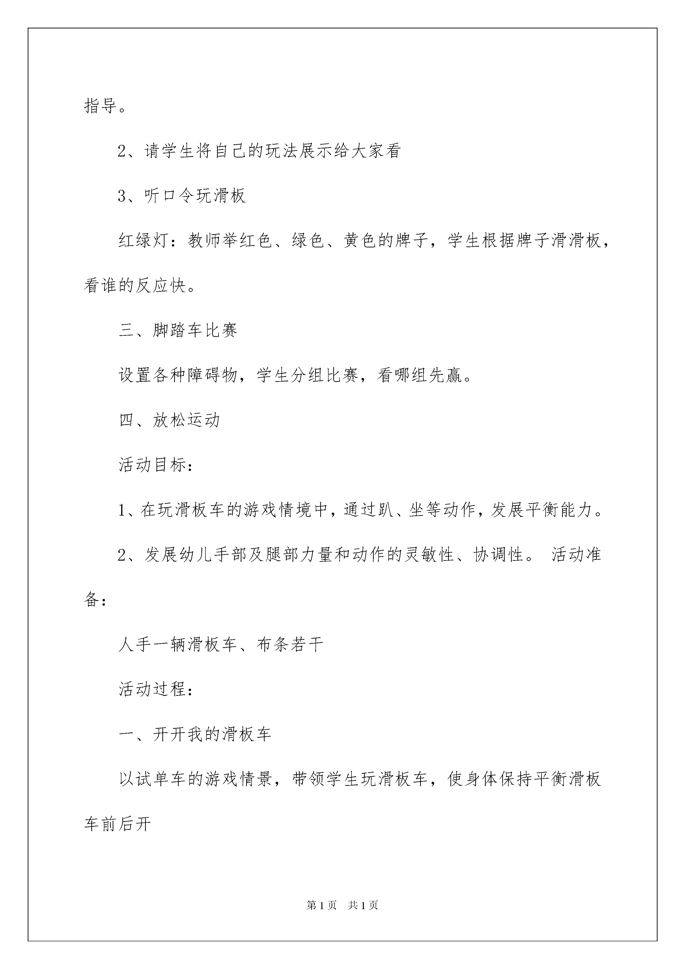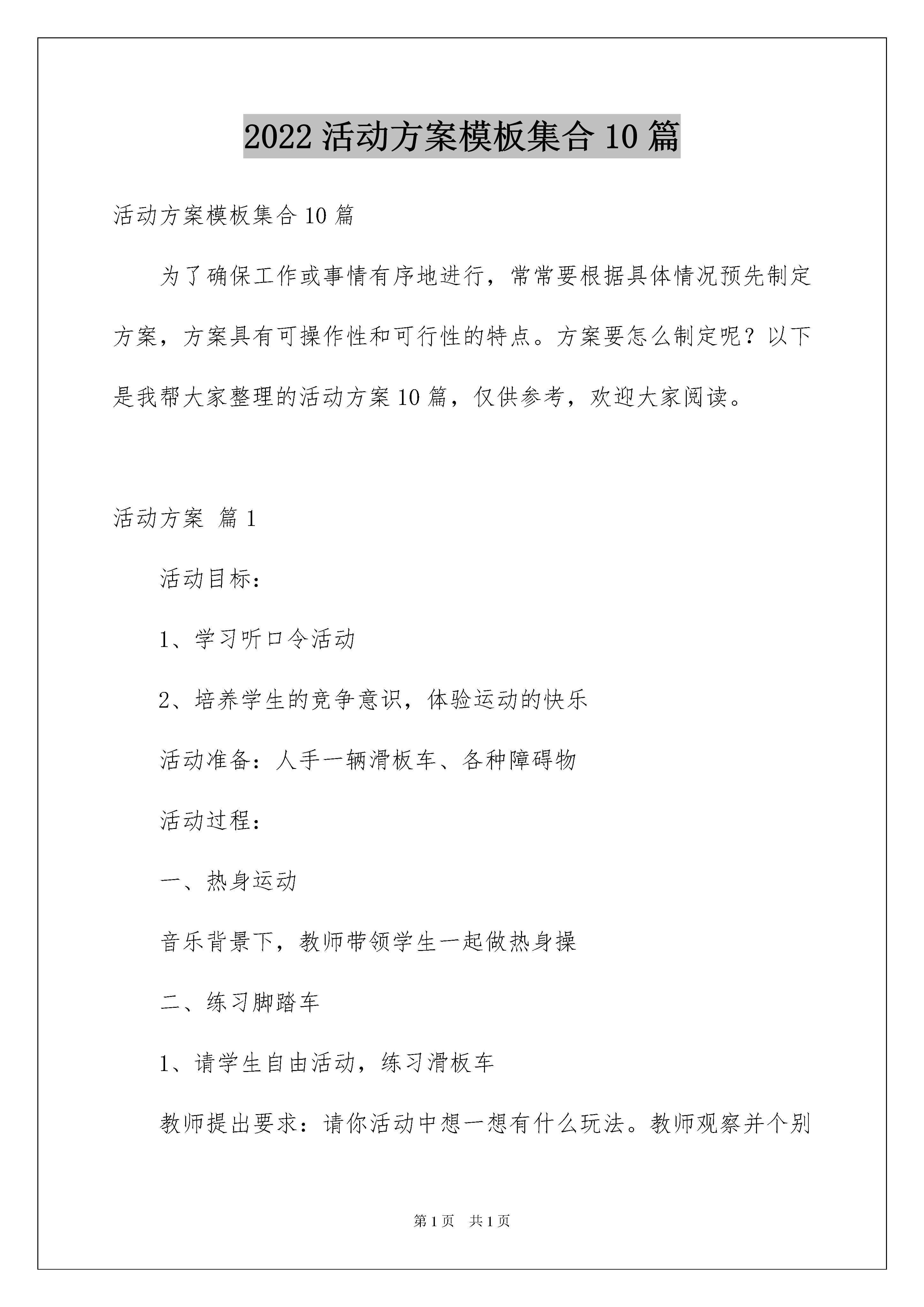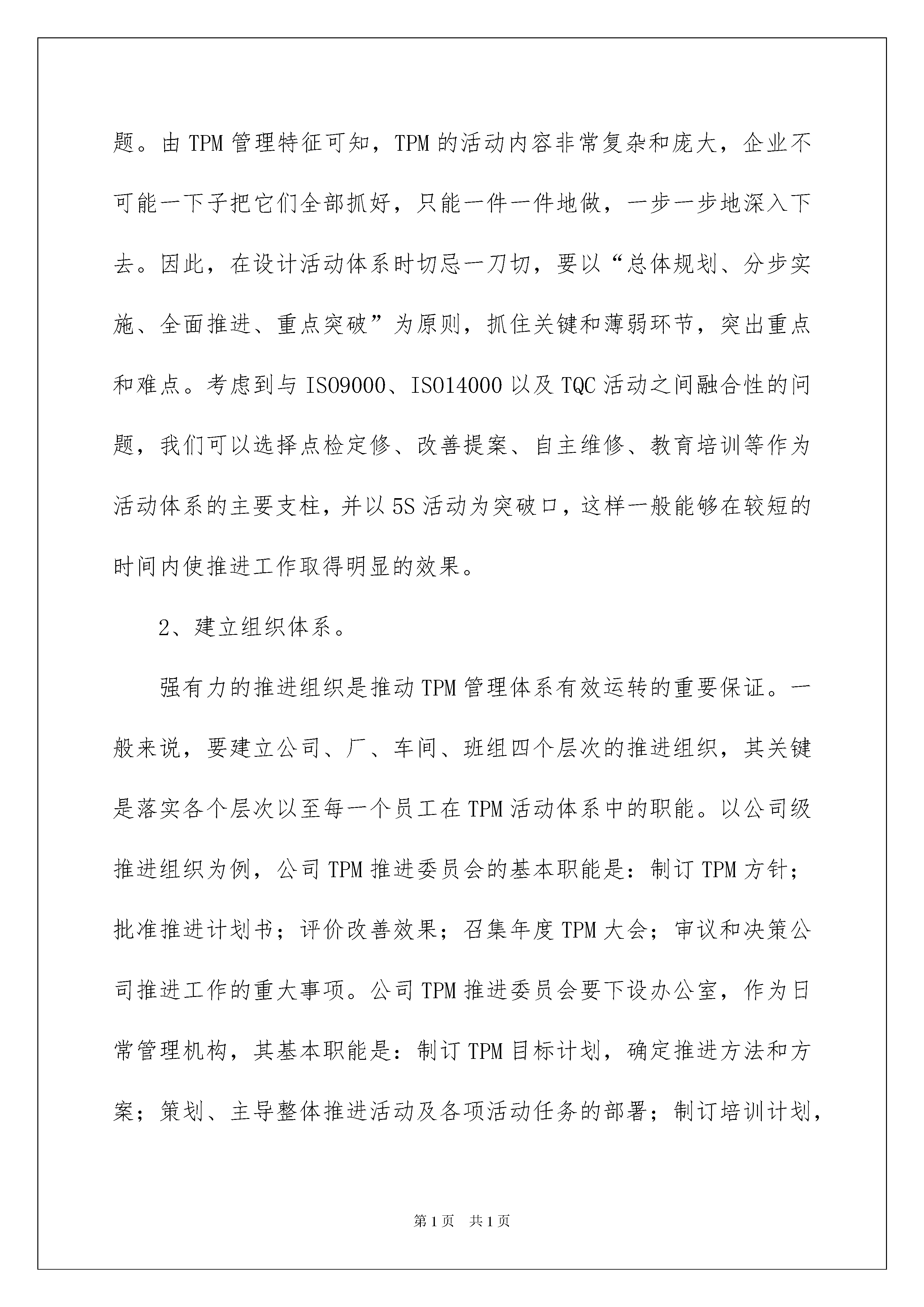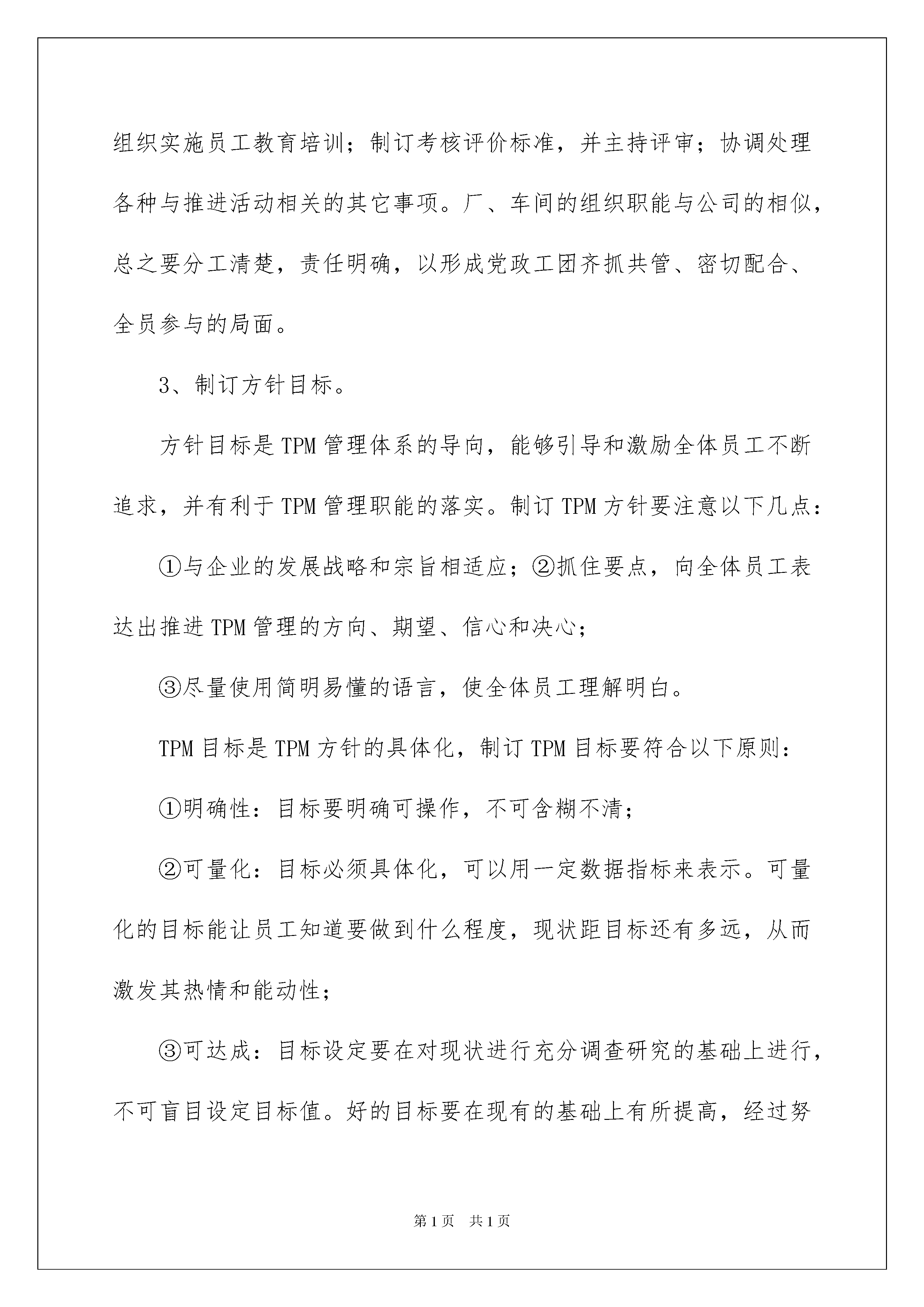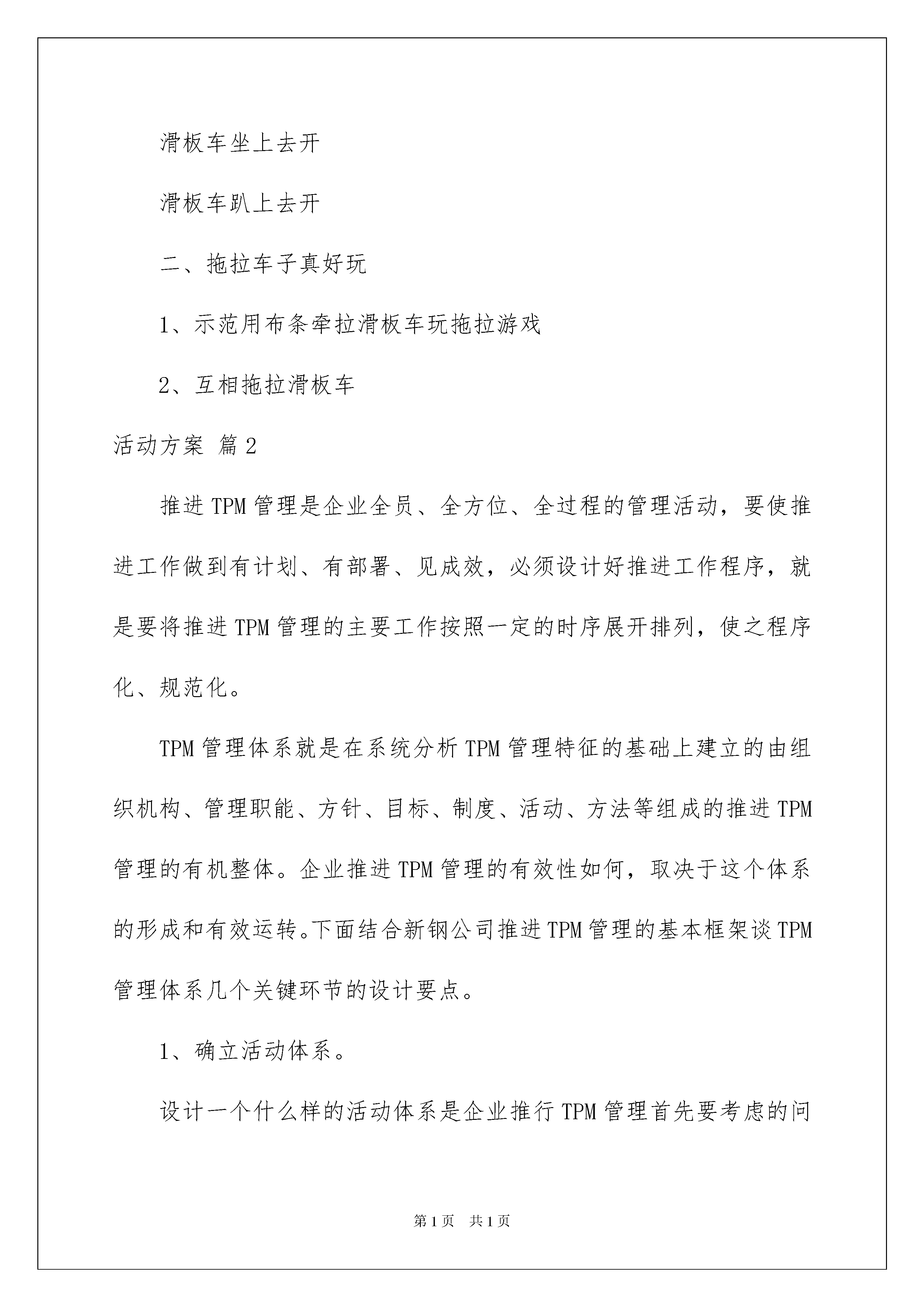 2022活动方案模板集合10篇活动方案模板集合10篇为了确保工作或事情有序地进行,常常要根据具体情况预先制定方案,方案具有可操作性和可行性的特点。方案要怎么制定呢?以下是我帮大家整理的活动方案10篇,仅供参考,欢迎大家阅读。活动方案篇1活动目标:1、学习听口令活动2、培养学生的竞争意识,体验运动的快乐活动准备:人手一辆滑板车、各种障碍物活动过程:一、热身运动音乐背景下,教师带领学生一起做热身操二、练习脚踏车1、请学生自由活动,练习滑板车教师提出要求:请你活动中想一想有什么玩法。教师观察并个别指导。2、请学生将自己的玩法展示给大家看3、听口令玩滑板红绿灯:教师举红色、绿色、黄色的牌子,学生根据牌子滑滑板,看谁的反应快。三、脚踏车比赛设置各种障碍物,学生分组比赛,看哪组先赢。四、放松运动活动目标:1、在玩滑板车的游戏情境中,通过趴、坐等动作,发展平衡能力。2、发展幼儿手部及腿部力量和动作的灵敏性、协调性。活动准备:人手一辆滑板车、布条若干活动过程:一、开开我的滑板车以试单车的游戏情景,带领学生玩滑板车,使身体保持平衡滑板车前后开滑板车坐上去开滑板车趴上去开二、拖拉车子真好玩1、示范用布条牵拉滑板车玩拖拉游戏2、互相拖拉滑板车活动方案篇2推进TPM管理是企业全员、全方位、全过程的管理活动,要使推进工作做到有计划、有部署、见成效,必须设计好推进工作程序,就是要将推进TPM管理的主要工作按照一定的时序展开排列,使之程序化、规范化。TPM管理体系就是在系统分析TPM管理特征的基础上建立的由组织机构、管理职能、方针、目标、制度、活动、方法等组成的推进TPM管理的有机整体。企业推进TPM管理的有效性如何,取决于这个体系的形成和有效运转。下面结合新钢公司推进TPM管理的基本框架谈TPM管理体系几个关键环节的设计要点。1、确立活动体系。设计一个什么样的活动体系是企业推行TPM管理首先要考虑的问题。由TPM管理特征可知,TPM的活动内容非常复杂和庞大,企业不可能一下子把它们全部抓好,只能一件一件地做,一步一步地深入下去。因此,在设计活动体系时切忌一刀切,要以“总体规划、分步实施、全面推进、重点突破”为原则,抓住关键和薄弱环节,突出重点和难点。考虑到与ISO9000、ISO14000以及TQC活动之间融合性的问题,我们可以选择点检定修、改善提案、自主维修、教育培训等作为活动体系的主要支柱,并以5S活动为突破口,这样一般能够在较短的时间内使推进工作取得明显的效果。2、建立组织体系。强有力的推进组织是推动TPM管理体系有效运转的重要保证。一般来说,要建立公司、厂、车间、班组四个层次的推进组织,其关键是落实各个层次以至每一个员工在TPM活动体系中的职能。以公司级推进组织为例,公司TPM推进委员会的基本职能是:制订TPM方针;批准推进计划书;评价改善效果;召集年度TPM大会;审议和决策公司推进工作的重大事项。公司TPM推进委员会要下设办公室,作为日常管理机构,其基本职能是:制订TPM目标计划,确定推进方法和方案;策划、主导整体推进活动及各项活动任务的部署;制订培训计划,组织实施员工教育培训;制订考核评价标准,并主持评审;协调处理各种与推进活动相关的其它事项。厂、车间的组织职能与公司的相似,总之要分工清楚,责任明确,以形成党政工团齐抓共管、密切配合、全员参与的局面。3、制订方针目标。方针目标是TPM管理体系的导向,能够引导和激励全体员工不断追求,并有利于TPM管理职能的落实。制订TPM方针要注意以下几点:①与企业的发展战略和宗旨相适应;②抓住要点,向全体员工表达出推进TPM管理的方向、期望、信心和决心;③尽量使用简明易懂的语言,使全体员工理解明白。TPM目标是TPM方针的具体化,制订TPM目标要符合以下原则:①明确性:目标要明确可操作,不可含糊不清;②可量化:目标必须具体化,可以用一定数据指标来表示。可量化的目标能让员工知道要做到什么程度,现状距目标还有多远,从而激发其热情和能动性;③可达成:目标设定要在对现状进行充分调查研究的基础上进行,不可盲目设定目标值。好的目标要在现有的基础上有所提高,经过努力是可以达到的。脱离实际过高的目标,会让员工失去斗志和信心。太低的目标,则失去了激励的意义和提高水平的机会;④时限性:目标必须明确在什么时候完成,这样就会给实施者一定的压力,保证整体进度。有时限要求的目标,对考核评价也会有所帮助。4、健全制度体系。就是要制订和不断完善推进TPM管理的各项规章制度、标准和管理办法,形成规范化的文件系统,使推进TPM管理的各项活动和各个环节有章可循、有法可依。如对设备的清洁、点检、