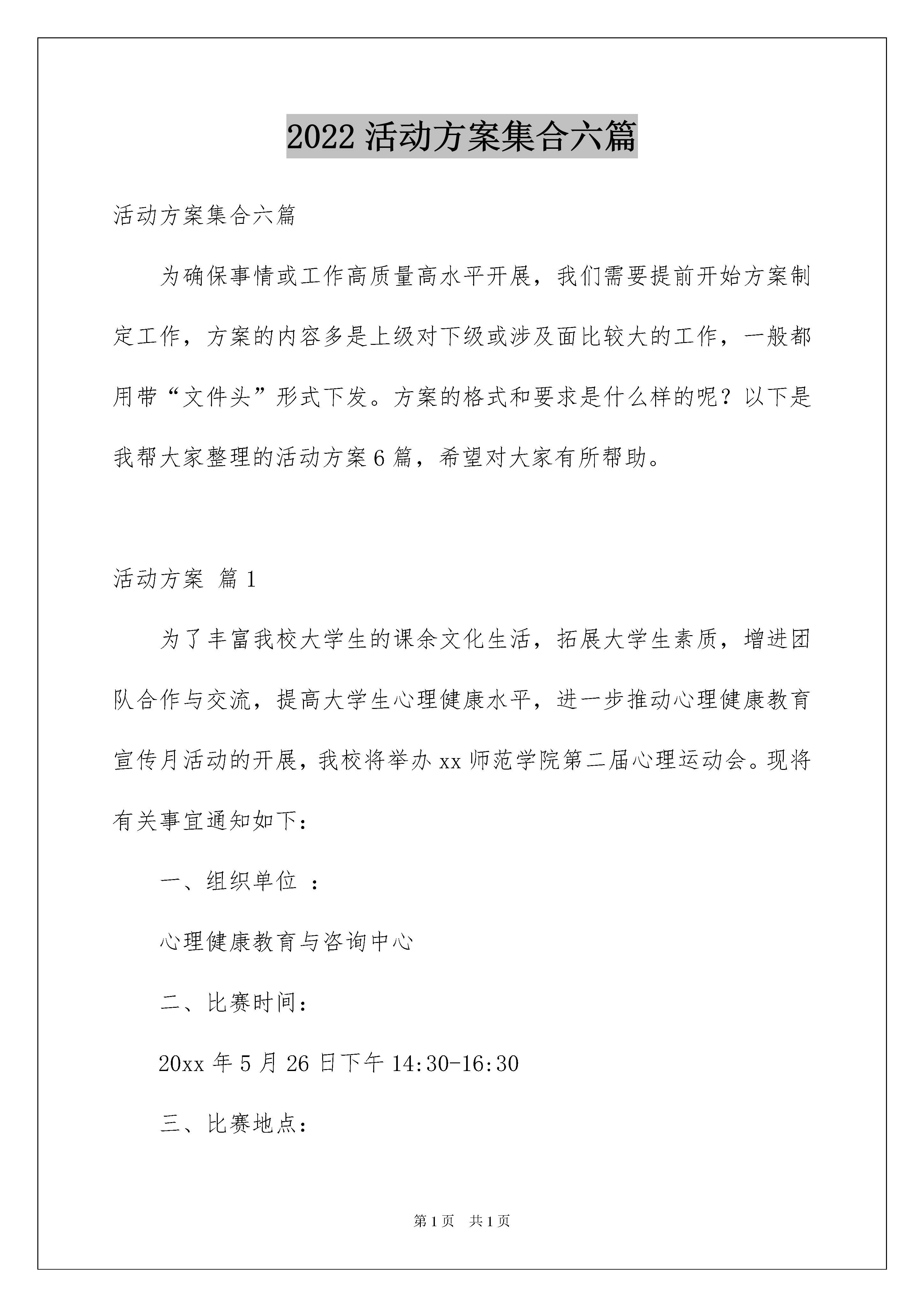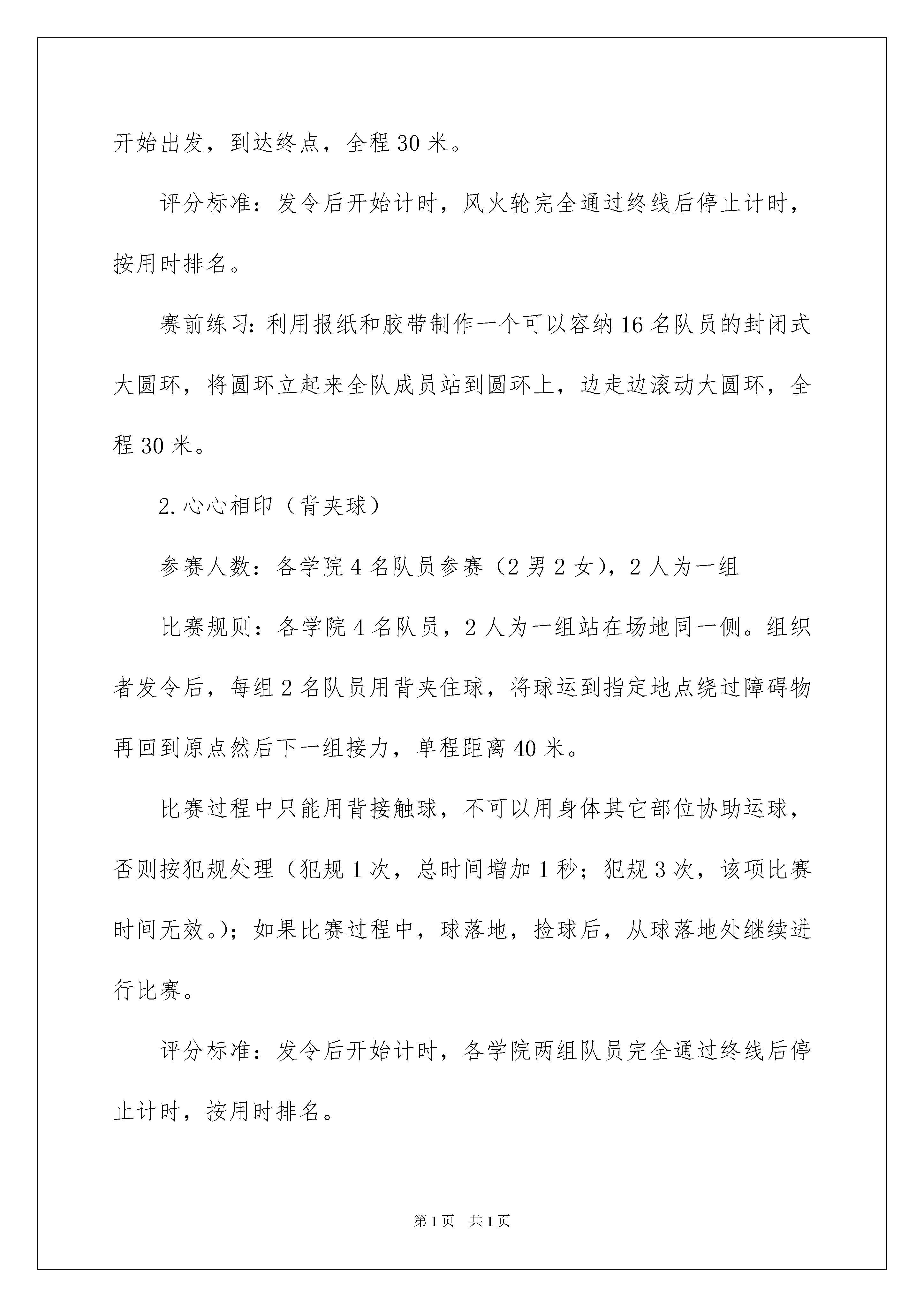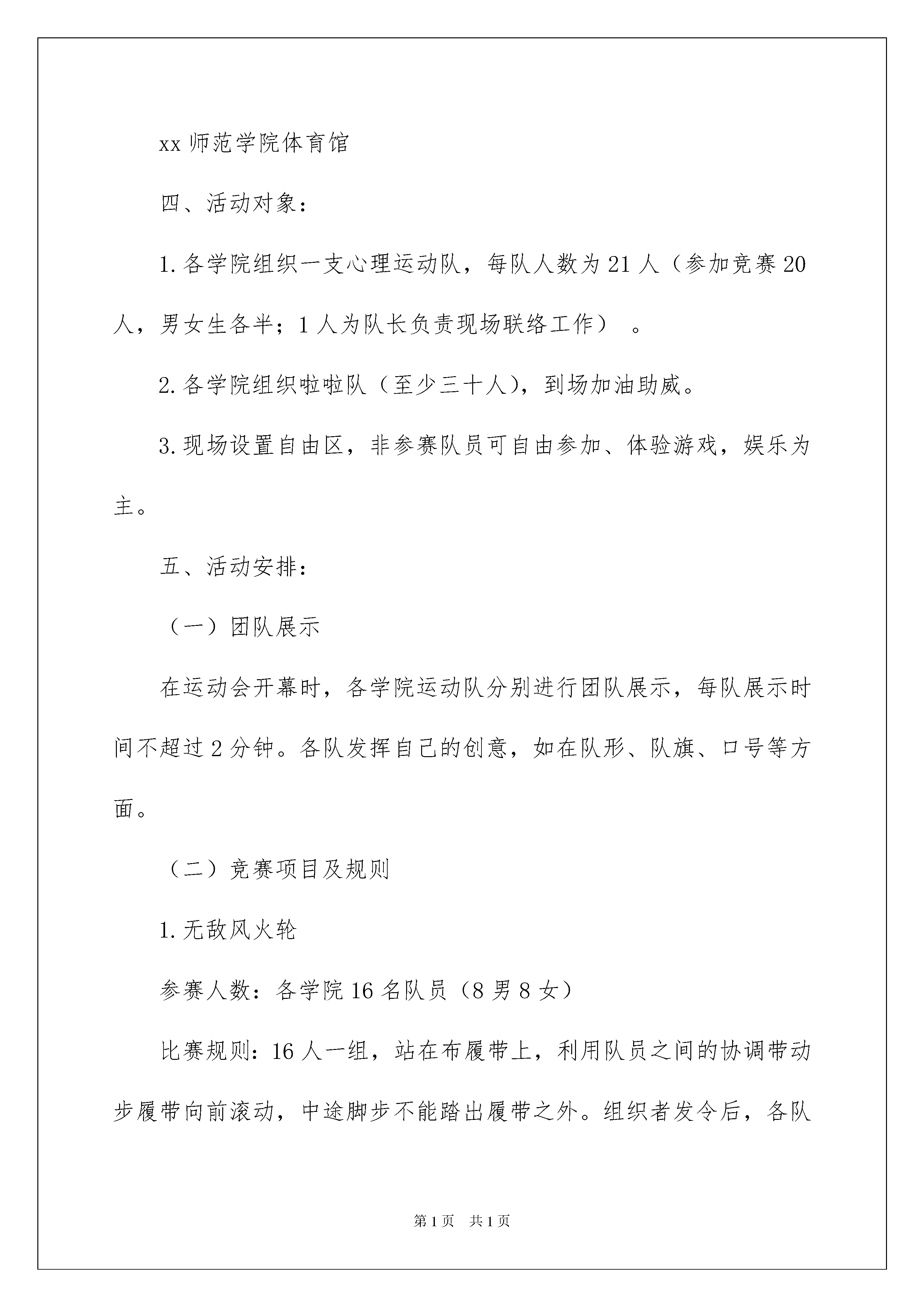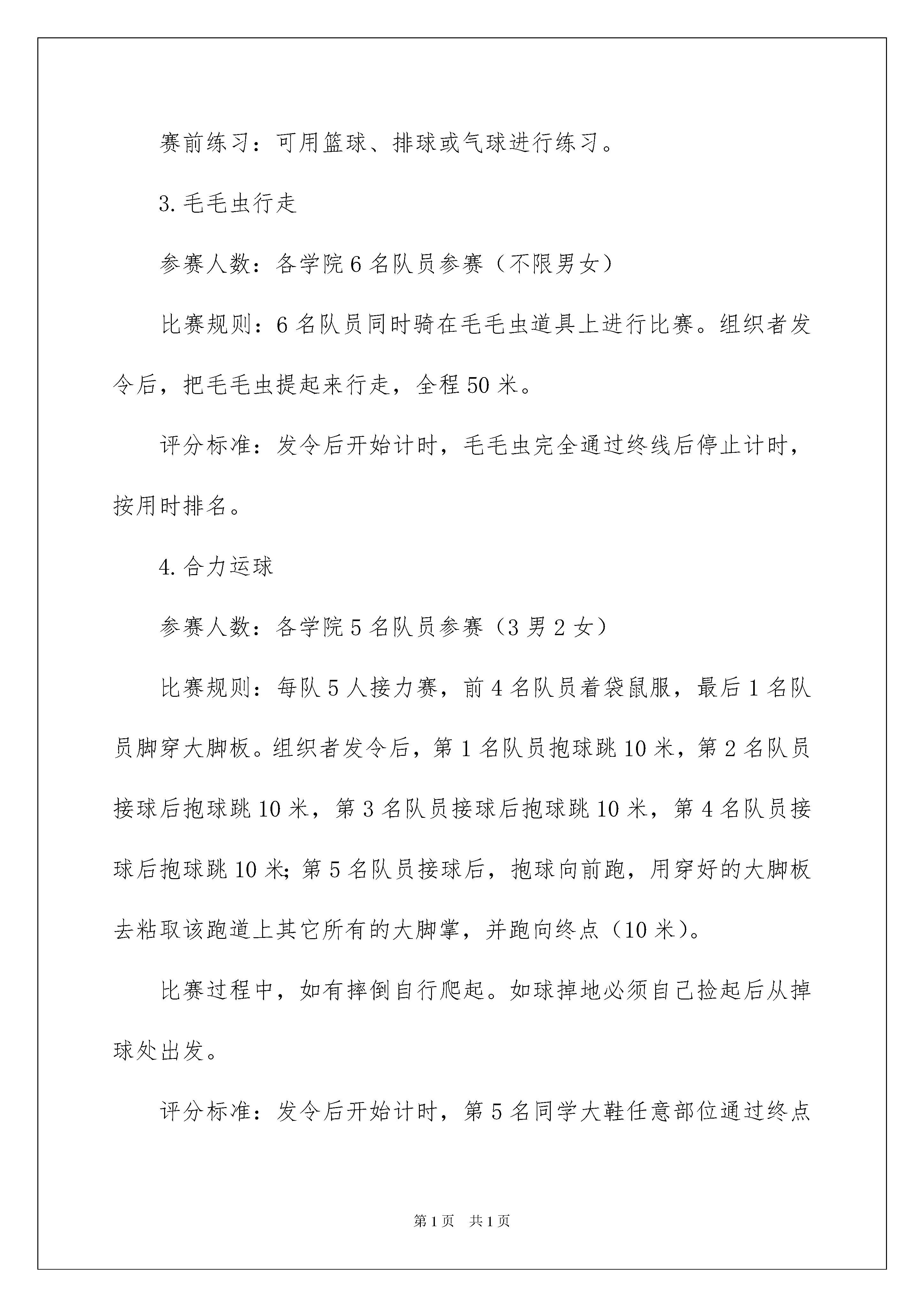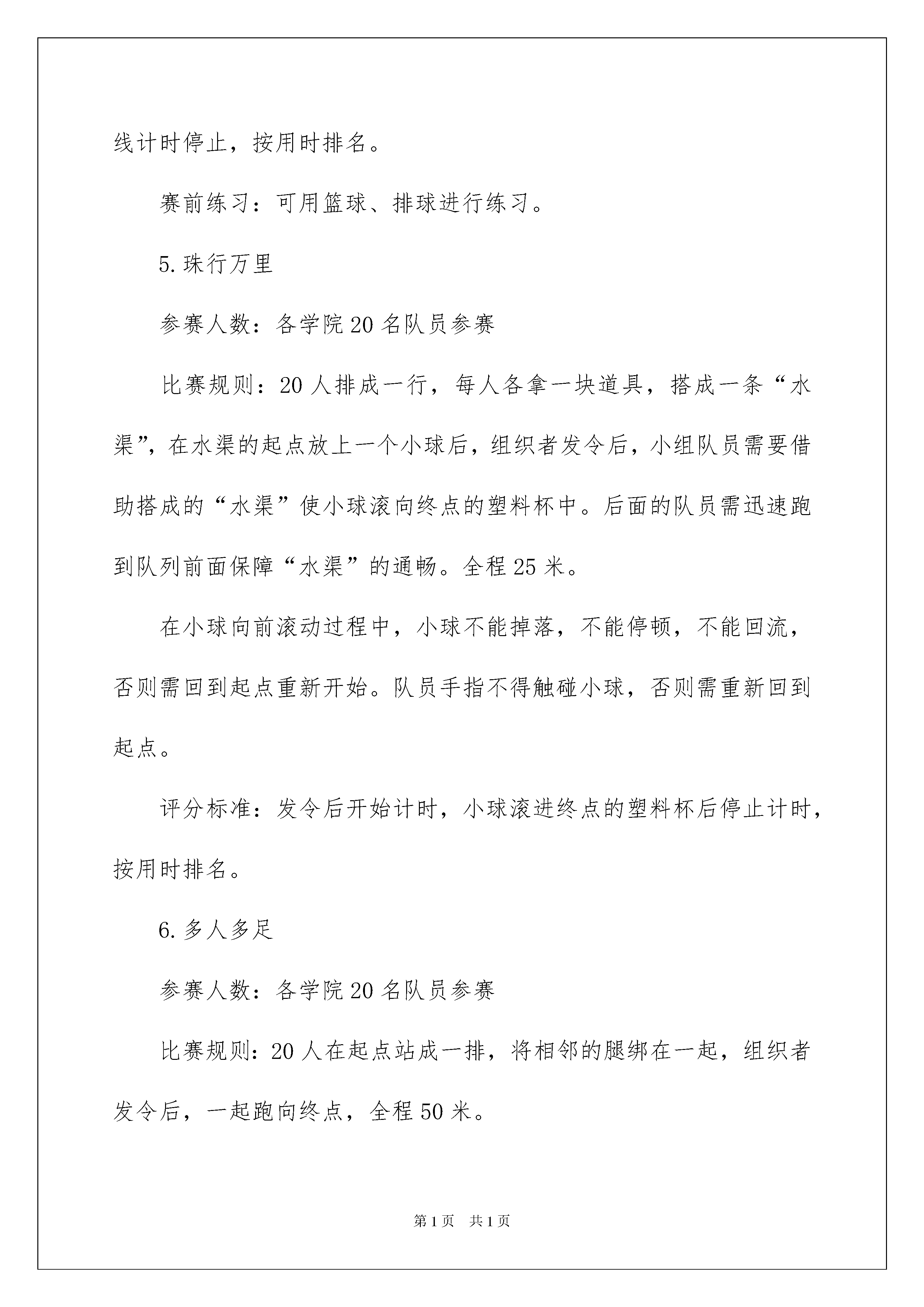 2022活动方案集合六篇活动方案集合六篇为确保事情或工作高质量高水平开展,我们需要提前开始方案制定工作,方案的内容多是上级对下级或涉及面比较大的工作,一般都用带“文件头”形式下发。方案的格式和要求是什么样的呢?以下是我帮大家整理的活动方案6篇,希望对大家有所帮助。活动方案篇1为了丰富我校大学生的课余文化生活,拓展大学生素质,增进团队合作与交流,提高大学生心理健康水平,进一步推动心理健康教育宣传月活动的开展,我校将举办xx师范学院第二届心理运动会。现将有关事宜通知如下:一、组织单位:心理健康教育与咨询中心二、比赛时间:20xx年5月26日下午14:30-16:30三、比赛地点:xx师范学院体育馆四、活动对象:1.各学院组织一支心理运动队,每队人数为21人(参加竞赛20人,男女生各半;1人为队长负责现场联络工作)。2.各学院组织啦啦队(至少三十人),到场加油助威。3.现场设置自由区,非参赛队员可自由参加、体验游戏,娱乐为主。五、活动安排:(一)团队展示在运动会开幕时,各学院运动队分别进行团队展示,每队展示时间不超过2分钟。各队发挥自己的创意,如在队形、队旗、口号等方面。(二)竞赛项目及规则1.无敌风火轮参赛人数:各学院16名队员(8男8女)比赛规则:16人一组,站在布履带上,利用队员之间的协调带动步履带向前滚动,中途脚步不能踏出履带之外。组织者发令后,各队开始出发,到达终点,全程30米。评分标准:发令后开始计时,风火轮完全通过终线后停止计时,按用时排名。赛前练习:利用报纸和胶带制作一个可以容纳16名队员的封闭式大圆环,将圆环立起来全队成员站到圆环上,边走边滚动大圆环,全程30米。2.心心相印(背夹球)参赛人数:各学院4名队员参赛(2男2女),2人为一组比赛规则:各学院4名队员,2人为一组站在场地同一侧。组织者发令后,每组2名队员用背夹住球,将球运到指定地点绕过障碍物再回到原点然后下一组接力,单程距离40米。比赛过程中只能用背接触球,不可以用身体其它部位协助运球,否则按犯规处理(犯规1次,总时间增加1秒;犯规3次,该项比赛时间无效。);如果比赛过程中,球落地,捡球后,从球落地处继续进行比赛。评分标准:发令后开始计时,各学院两组队员完全通过终线后停止计时,按用时排名。赛前练习:可用篮球、排球或气球进行练习。3.毛毛虫行走参赛人数:各学院6名队员参赛(不限男女)比赛规则:6名队员同时骑在毛毛虫道具上进行比赛。组织者发令后,把毛毛虫提起来行走,全程50米。评分标准:发令后开始计时,毛毛虫完全通过终线后停止计时,按用时排名。4.合力运球参赛人数:各学院5名队员参赛(3男2女)比赛规则:每队5人接力赛,前4名队员着袋鼠服,最后1名队员脚穿大脚板。组织者发令后,第1名队员抱球跳10米,第2名队员接球后抱球跳10米,第3名队员接球后抱球跳10米,第4名队员接球后抱球跳10米;第5名队员接球后,抱球向前跑,用穿好的大脚板去粘取该跑道上其它所有的大脚掌,并跑向终点(10米)。比赛过程中,如有摔倒自行爬起。如球掉地必须自己捡起后从掉球处出发。评分标准:发令后开始计时,第5名同学大鞋任意部位通过终点线计时停止,按用时排名。赛前练习:可用篮球、排球进行练习。5.珠行万里参赛人数:各学院20名队员参赛比赛规则:20人排成一行,每人各拿一块道具,搭成一条“水渠”,在水渠的起点放上一个小球后,组织者发令后,小组队员需要借助搭成的“水渠”使小球滚向终点的塑料杯中。后面的队员需迅速跑到队列前面保障“水渠”的通畅。全程25米。在小球向前滚动过程中,小球不能掉落,不能停顿,不能回流,否则需回到起点重新开始。队员手指不得触碰小球,否则需重新回到起点。评分标准:发令后开始计时,小球滚进终点的塑料杯后停止计时,按用时排名。6.多人多足参赛人数:各学院20名队员参赛比赛规则:20人在起点站成一排,将相邻的腿绑在一起,组织者发令后,一起跑向终点,全程50米。比赛过程中,要求队列不能松散,出现断裂现象时,各队要及时调整,否则取消比赛资格。评分标准:按每队总时长排名。赛前练习:可用绳子绑腿进行练习,注意安全。六、报名方式:下载报名表(见下表)并认真填写,5月8日前将加盖学院公章的报名表及电子版报名表交至心理健康教育与咨询中心(逸夫楼A213办公室),逾期视为自动弃权。活动方案篇2一、活动目标:通过这次活动,能让学生学习安全知识,掌握一些安全常识,增强学生安全意识,逐步提高学生的素质和能力,三年级中队活动方案。教育学生注意安全,珍惜生命,提高安全意识。二、活动形式:全班朗诵三字经、舞蹈、武术、英语故事等。三、活动过程:(一)中队长