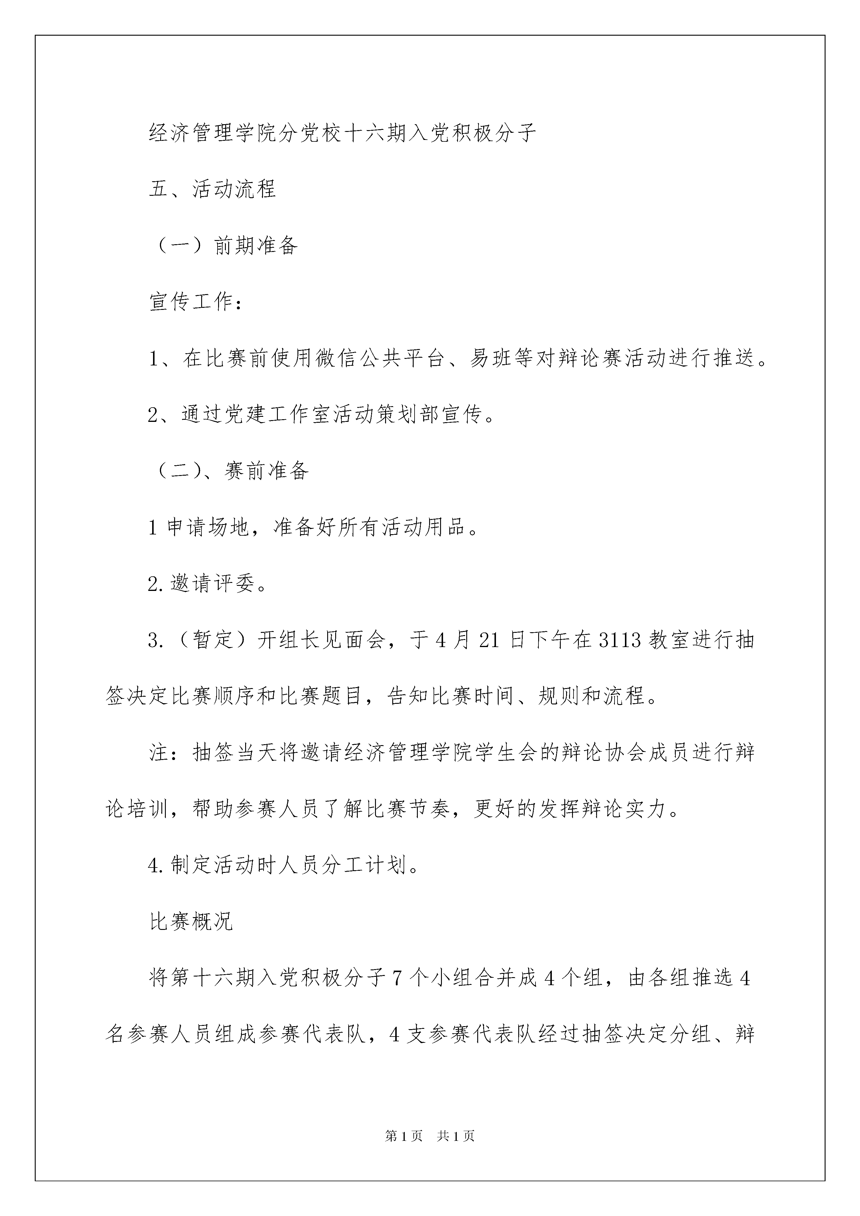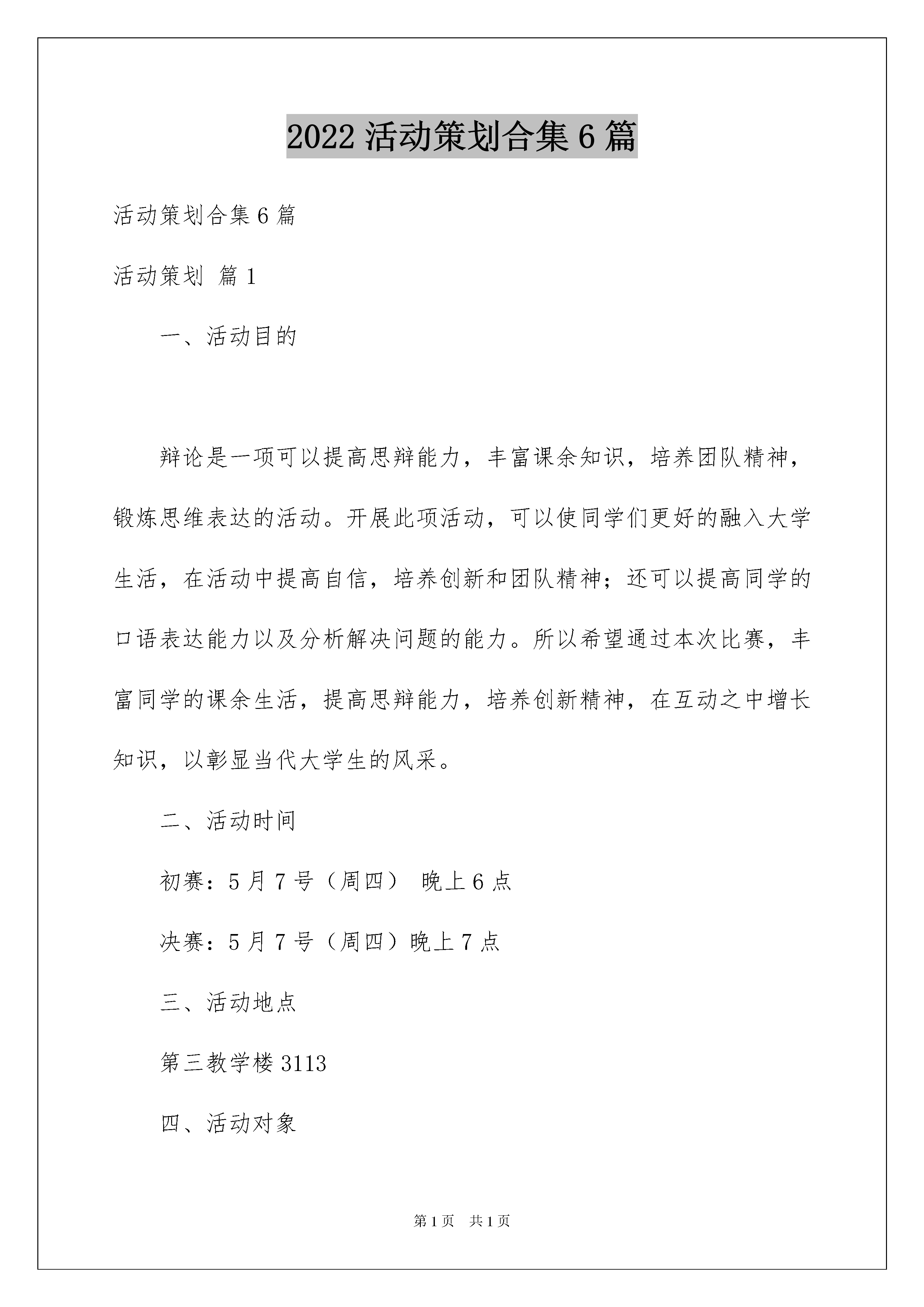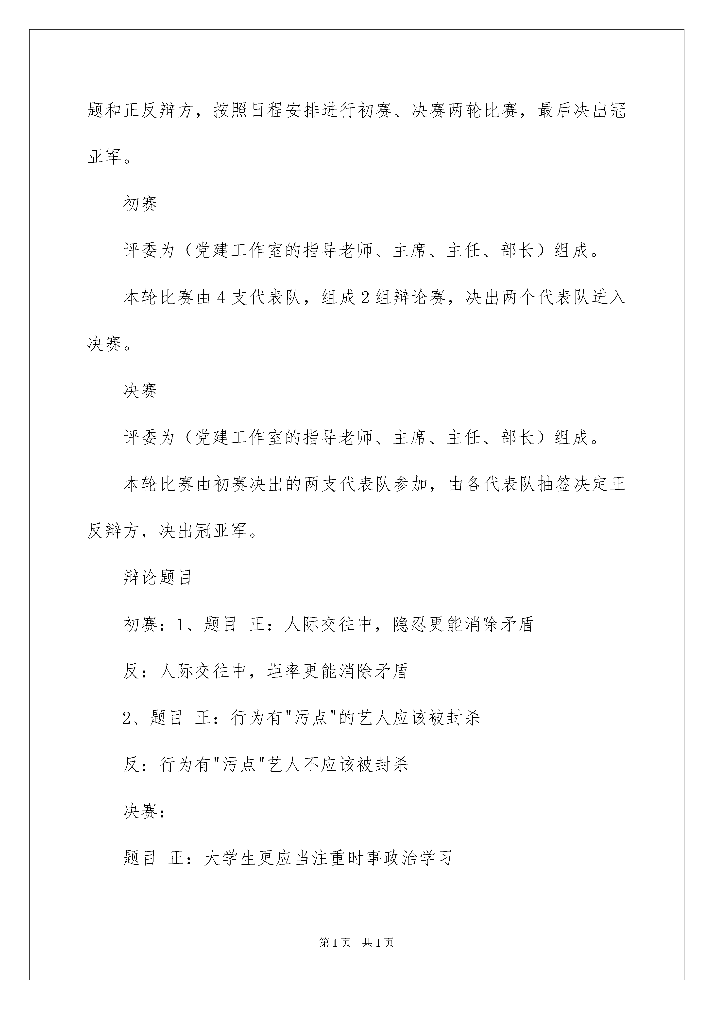 2022活动策划合集6篇活动策划合集6篇活动策划篇1一、活动目的辩论是一项可以提高思辩能力,丰富课余知识,培养团队精神,锻炼思维表达的活动。开展此项活动,可以使同学们更好的融入大学生活,在活动中提高自信,培养创新和团队精神;还可以提高同学的口语表达能力以及分析解决问题的能力。所以希望通过本次比赛,丰富同学的课余生活,提高思辩能力,培养创新精神,在互动之中增长知识,以彰显当代大学生的风采。二、活动时间初赛:5月7号(周四)晚上6点决赛:5月7号(周四)晚上7点三、活动地点第三教学楼3113四、活动对象经济管理学院分党校十六期入党积极分子五、活动流程(一)前期准备宣传工作:1、在比赛前使用微信公共平台、易班等对辩论赛活动进行推送。2、通过党建工作室活动策划部宣传。(二)、赛前准备1申请场地,准备好所有活动用品。2.邀请评委。3.(暂定)开组长见面会,于4月21日下午在3113教室进行抽签决定比赛顺序和比赛题目,告知比赛时间、规则和流程。注:抽签当天将邀请经济管理学院学生会的辩论协会成员进行辩论培训,帮助参赛人员了解比赛节奏,更好的发挥辩论实力。4.制定活动时人员分工计划。比赛概况将第十六期入党积极分子7个小组合并成4个组,由各组推选4名参赛人员组成参赛代表队,4支参赛代表队经过抽签决定分组、辩题和正反辩方,按照日程安排进行初赛、决赛两轮比赛,最后决出冠亚军。初赛评委为(党建工作室的指导老师、主席、主任、部长)组成。本轮比赛由4支代表队,组成2组辩论赛,决出两个代表队进入决赛。决赛评委为(党建工作室的指导老师、主席、主任、部长)组成。本轮比赛由初赛决出的两支代表队参加,由各代表队抽签决定正反辩方,决出冠亚军。辩论题目初赛:1、题目正:人际交往中,隐忍更能消除矛盾反:人际交往中,坦率更能消除矛盾2、题目正:行为有"污点"的艺人应该被封杀反:行为有"污点"艺人不应该被封杀决赛:题目正:大学生更应当注重时事政治学习反:大学生更应当注重专业课程学习比赛流程一、参赛队员开始辩论(一)开篇陈词(二)攻辩(三)自由辩论(四)总结陈词二、评委综合裁决三、评委点评比赛须知1.辩手:正方4人反方4人(各组一支4人代表队,男女均须有参赛人员)2.计分人员分别在各队的对面,用黄牌或红牌进行时间的提示。并设有"计时器"进行提示。如时间已到,辩手必须停止发言,否则酌情扣分。3.在辩论过程中,选手可以参考事先准备好的资料(如卡片等),但是不得照读资料时间连续10秒钟。否则将酌情扣除团体分和个人分。4.每场比赛各队队员须统一服装,具体由各队自行决定。(初赛时参赛队伍着正装有加分,进入决赛的参赛队伍必须统一着正装以示对评委的尊敬)5.各参赛队务必在比赛开始前半小时内到达赛场,以便于组织者对赛事的统一安排,使各场比赛准备工作能够顺利进行。6.胜负判定(1)评委的打分相加取平均值,即为该队最后得分,参赛两队中得分居高的一队取胜(2)如果两队得分相同,则由评判团另行投票,决定胜负评分依据1.团体部分(1)审题:对所持立场能从逻辑、理论、事实等对层次、多角度理解,论据充足,推理关系明晰,对本方的难点有较好的处理方法;(2)论证:论证有说服力,论据充分,推理过程合乎逻辑,事实引用得当;(3)辩驳:提问能抓住对方的要害,问题简单明了。在规定的时间内没有提出问题或是提问不清,提问不当,应适当扣分。同时能正面回答对方的问题能否难人以有理有据的感觉。不回答,不正面回答或者答非所问相应扣分;(4)配合:有团队精神,能相互支持,论辩衔接流畅,自由辩论时发言错落有致。问答形成一个有机整体,给对方有力打击;(5)语言:普通话标准,语言流畅,用词得当,口齿清楚,语速适中,尊重对方辩友,尊重评委,尊重观众,表演得当,落落大方,且有幽默感。2.个人部分(1)论:陈词是否流畅,说理是否透彻,逻辑性是否强,引用事例是否得当;(2)辩:提问时机是否合适,回答是否中肯,()反驳是否有力,有理,反应是否机敏,用语是否得体。辩论赛细则(一)开篇陈词正方一辩发言(立论)(3分钟)反方一辩发言(立论)(3分钟)(注:每方队员在用时剩余30秒时,计时员以一次短促铃声提醒,时间用完时,以钟声终止发言。)(二)攻辩1、正方二辩向反方二辩提问;反方二辩向正方二辩提问。(每一轮攻辩阶段为1分30秒,攻方每次提问不得超过10秒,每轮必须提出三个以上的问题。辩方每次回答不得超过20秒。用时满时,以钟声终止发言,若攻辩双方尚未完成提问或回答,不作扣分处理。)2、正方三辩向反方三辩提问;反方三辩向正方三辩提问。(每一轮攻辩阶段为1分30秒,攻方每次提问不得超过10秒,每轮必须