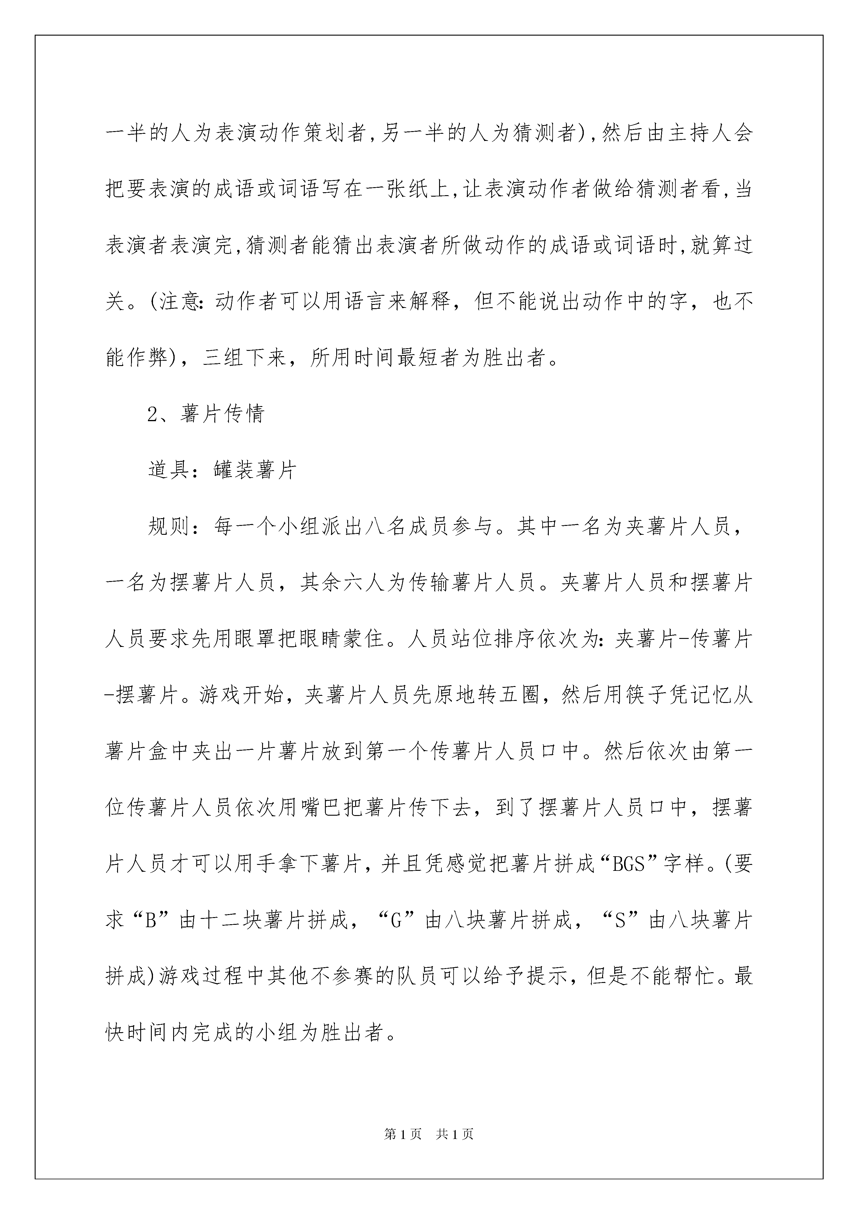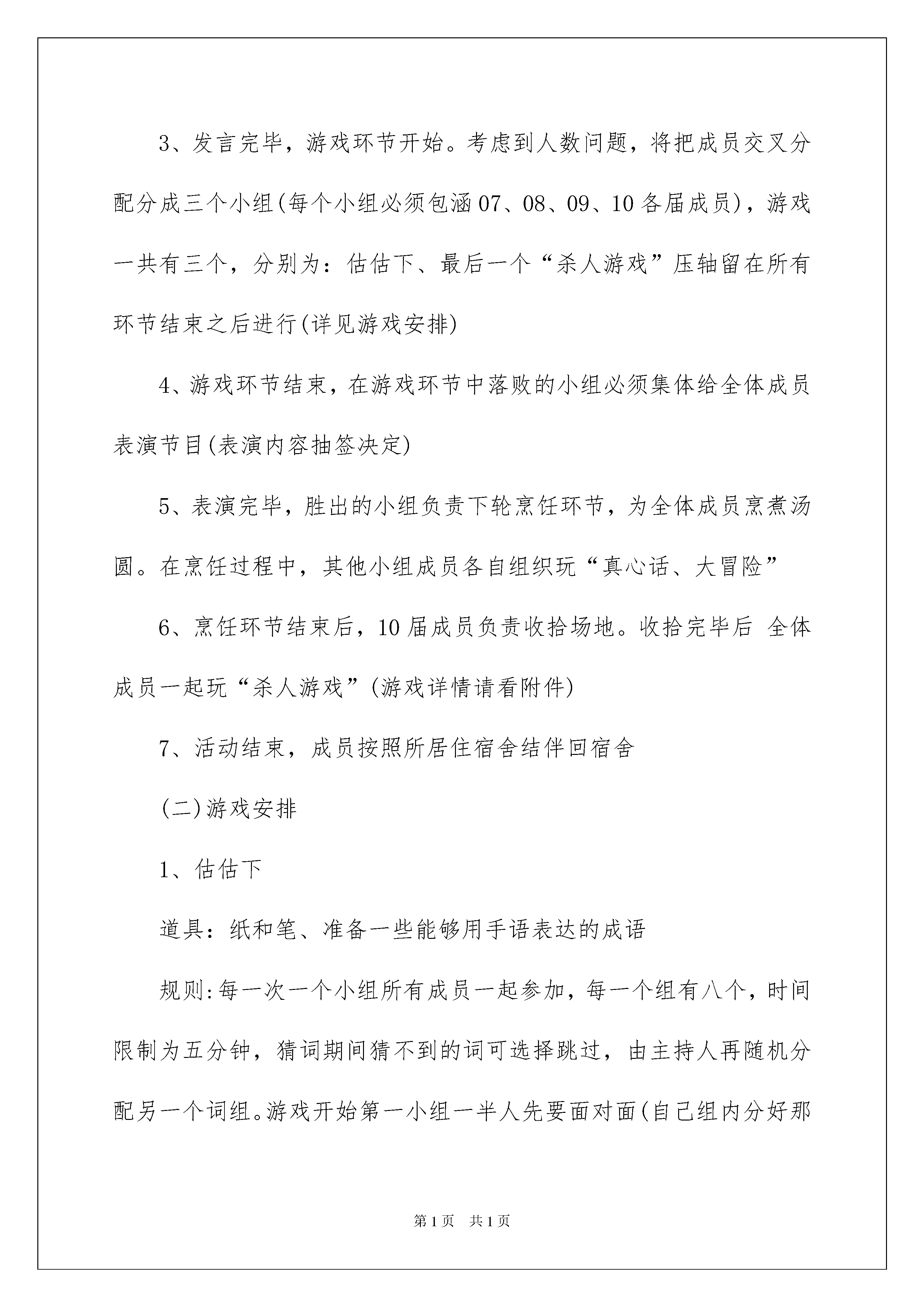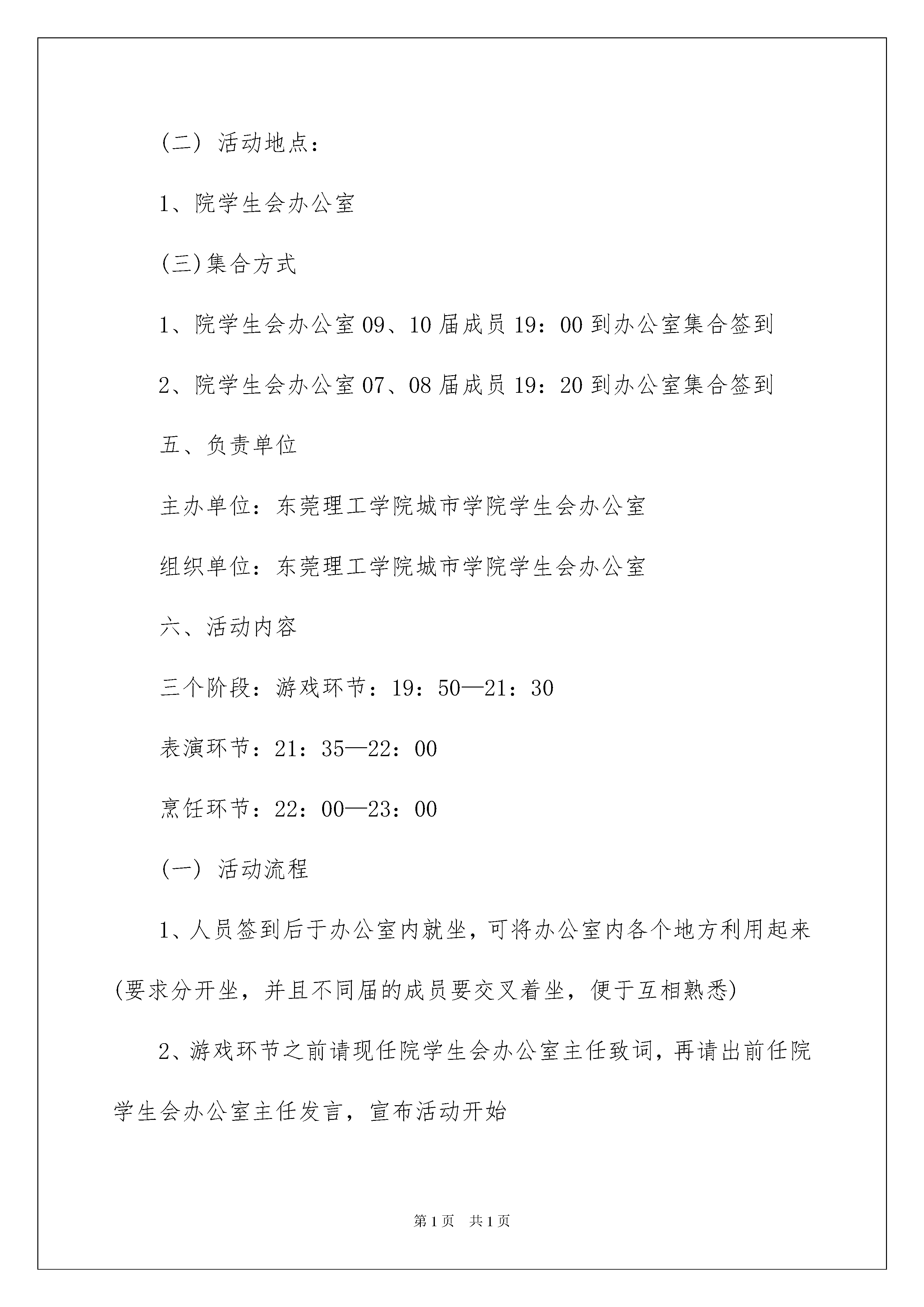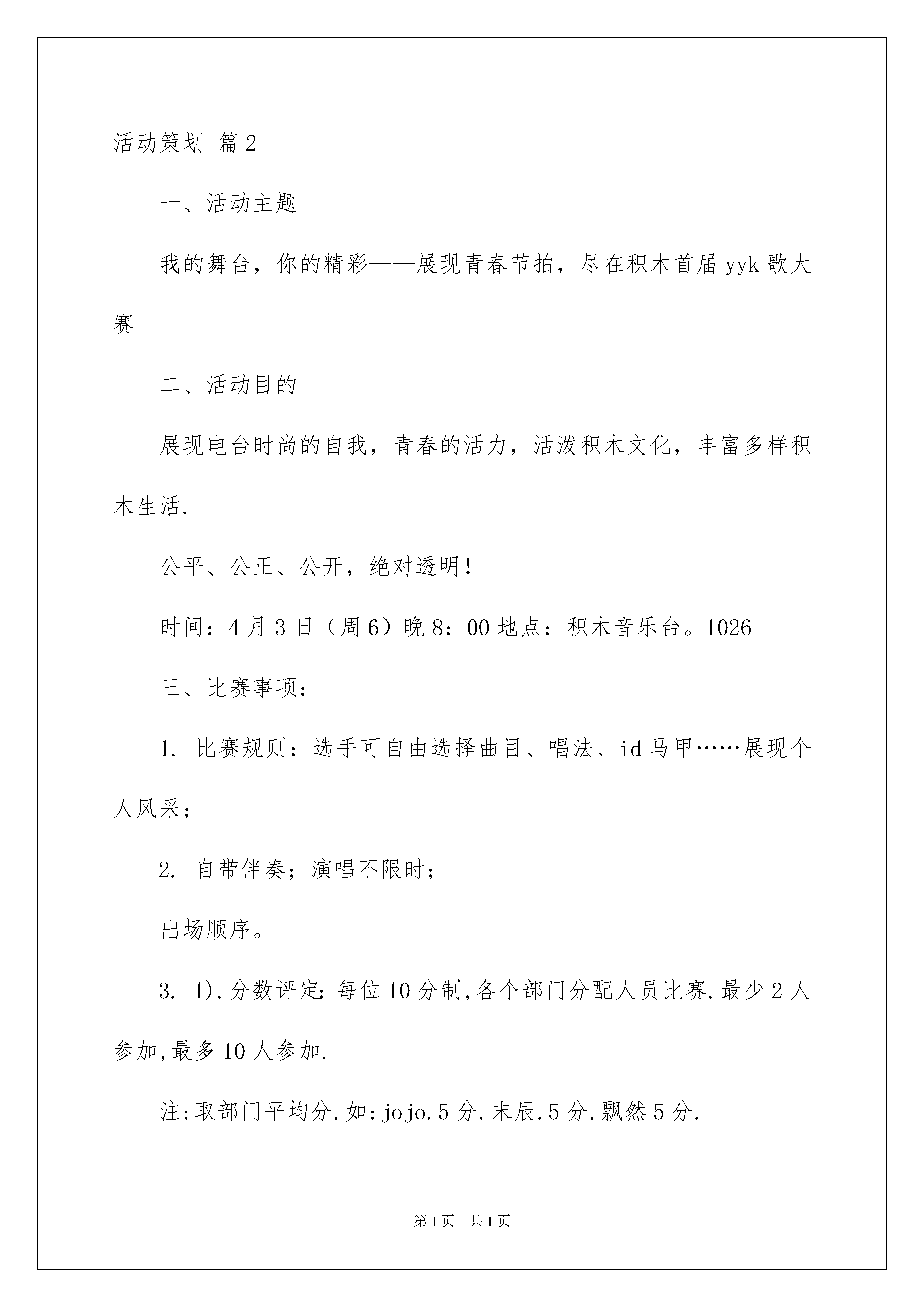 2022活动策划范文八篇活动策划范文八篇活动策划篇1一、活动主题:欢迎圣诞,温情小办二、活动意义本次活动以“欢迎圣诞,温情小办”为主题,主要针对院学生会办公室07、08届成员因为学业与其他因素的关系较少与09、10届成员接触。且适逢佳节,许多同学因为留校的关系,比较少机会与同学、朋友共度佳节,借此联谊活动既可以在庆祝节日的同时又能够促进07、08、09、10各届成员间的交流,增进成员间的感情,同时可以让大家拥有一个欢乐的晚上。使院学生会办公室变得更加和谐,更加温馨。与此同时,也可以给每位成员留下深刻的回忆。三、参与对象:院学生会办公室07、08、09、10届成员四、活动安排:(一)活动时间:20xx年12月24日(星期五)19:30—23:00(院学生会办公室)(二)活动地点:1、院学生会办公室(三)集合方式1、院学生会办公室09、10届成员19:00到办公室集合签到2、院学生会办公室07、08届成员19:20到办公室集合签到五、负责单位主办单位:东莞理工学院城市学院学生会办公室组织单位:东莞理工学院城市学院学生会办公室六、活动内容三个阶段:游戏环节:19:50—21:30表演环节:21:35—22:00烹饪环节:22:00—23:00(一)活动流程1、人员签到后于办公室内就坐,可将办公室内各个地方利用起来(要求分开坐,并且不同届的成员要交叉着坐,便于互相熟悉)2、游戏环节之前请现任院学生会办公室主任致词,再请出前任院学生会办公室主任发言,宣布活动开始3、发言完毕,游戏环节开始。考虑到人数问题,将把成员交叉分配分成三个小组(每个小组必须包涵07、08、09、10各届成员),游戏一共有三个,分别为:估估下、最后一个“杀人游戏”压轴留在所有环节结束之后进行(详见游戏安排)4、游戏环节结束,在游戏环节中落败的小组必须集体给全体成员表演节目(表演内容抽签决定)5、表演完毕,胜出的小组负责下轮烹饪环节,为全体成员烹煮汤圆。在烹饪过程中,其他小组成员各自组织玩“真心话、大冒险”6、烹饪环节结束后,10届成员负责收拾场地。收拾完毕后全体成员一起玩“杀人游戏”(游戏详情请看附件)7、活动结束,成员按照所居住宿舍结伴回宿舍(二)游戏安排1、估估下道具:纸和笔、准备一些能够用手语表达的成语规则:每一次一个小组所有成员一起参加,每一个组有八个,时间限制为五分钟,猜词期间猜不到的词可选择跳过,由主持人再随机分配另一个词组。游戏开始第一小组一半人先要面对面(自己组内分好那一半的人为表演动作策划者,另一半的人为猜测者),然后由主持人会把要表演的成语或词语写在一张纸上,让表演动作者做给猜测者看,当表演者表演完,猜测者能猜出表演者所做动作的成语或词语时,就算过关。(注意:动作者可以用语言来解释,但不能说出动作中的字,也不能作弊),三组下来,所用时间最短者为胜出者。2、薯片传情道具:罐装薯片规则:每一个小组派出八名成员参与。其中一名为夹薯片人员,一名为摆薯片人员,其余六人为传输薯片人员。夹薯片人员和摆薯片人员要求先用眼罩把眼睛蒙住。人员站位排序依次为:夹薯片-传薯片-摆薯片。游戏开始,夹薯片人员先原地转五圈,然后用筷子凭记忆从薯片盒中夹出一片薯片放到第一个传薯片人员口中。然后依次由第一位传薯片人员依次用嘴巴把薯片传下去,到了摆薯片人员口中,摆薯片人员才可以用手拿下薯片,并且凭感觉把薯片拼成“BGS”字样。(要求“B”由十二块薯片拼成,“G”由八块薯片拼成,“S”由八块薯片拼成)游戏过程中其他不参赛的队员可以给予提示,但是不能帮忙。最快时间内完成的小组为胜出者。活动策划篇2一、活动主题我的舞台,你的精彩——展现青春节拍,尽在积木首届yyk歌大赛二、活动目的展现电台时尚的自我,青春的活力,活泼积木文化,丰富多样积木生活.公平、公正、公开,绝对透明!时间:4月3日(周6)晚8:00地点:积木音乐台。1026三、比赛事项:1.比赛规则:选手可自由选择曲目、唱法、id马甲……展现个人风采;2.自带伴奏;演唱不限时;出场顺序。3.1).分数评定:每位10分制,各个部门分配人员比赛.最少2人参加,最多10人参加.注:取部门平均分.如:jojo.5分.末辰.5分.飘然5分.主播部3人参加,则-主播部最后得分.5+5+5=15.15/3=5(分).主播部最后的平均分为5.微微.9分.剧终.3分.编导部2人参加,则-编导部最后得分.3+9=12.12/2=6.(分)编导部最后平均分为6.(创新包括:对原歌的改词改调;自弹自唱;原创歌曲;其他形式的创新)2)评委组成:(3位),泡末,xx,xx。4.奖项设置:只颁发一等奖特别奖