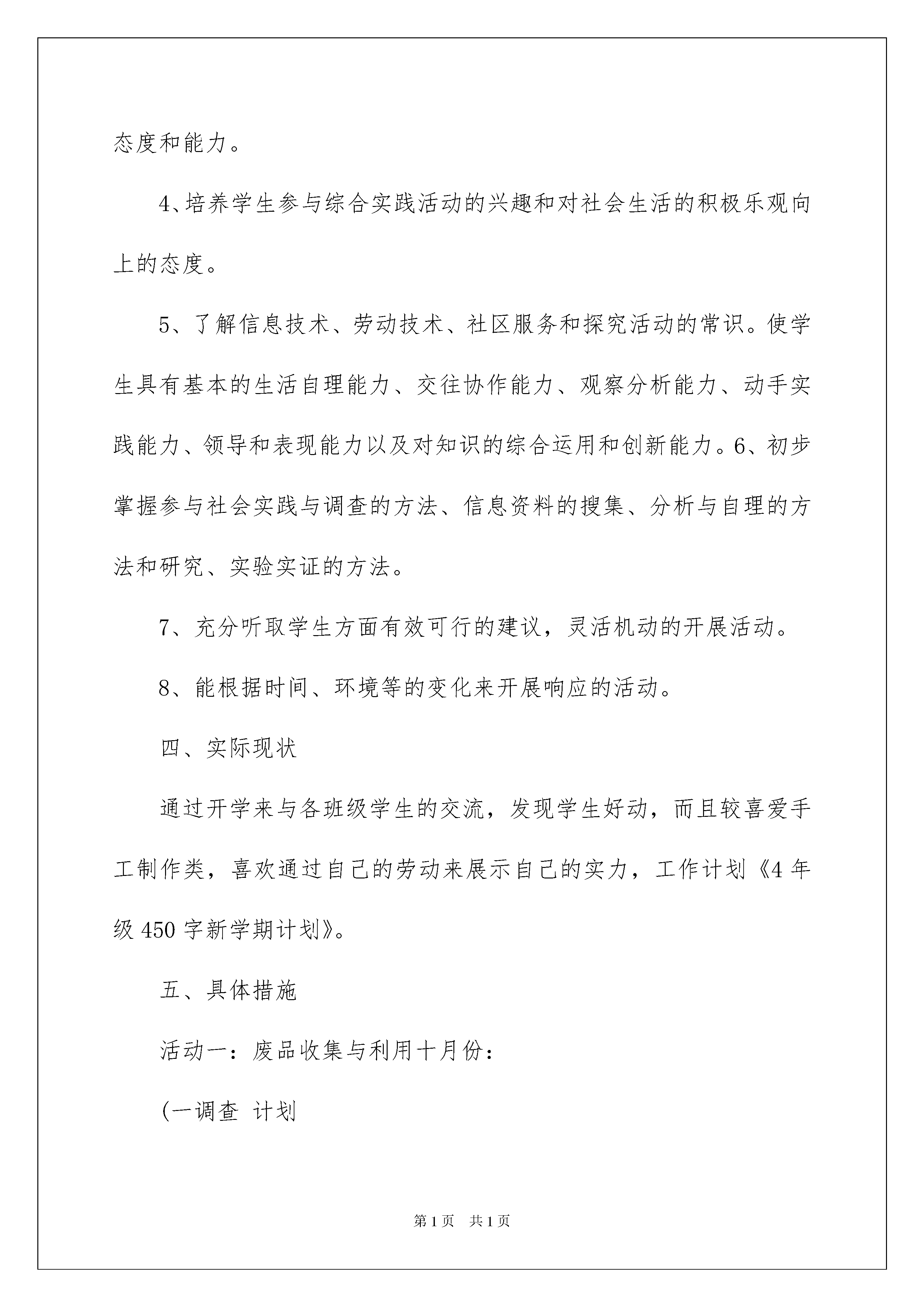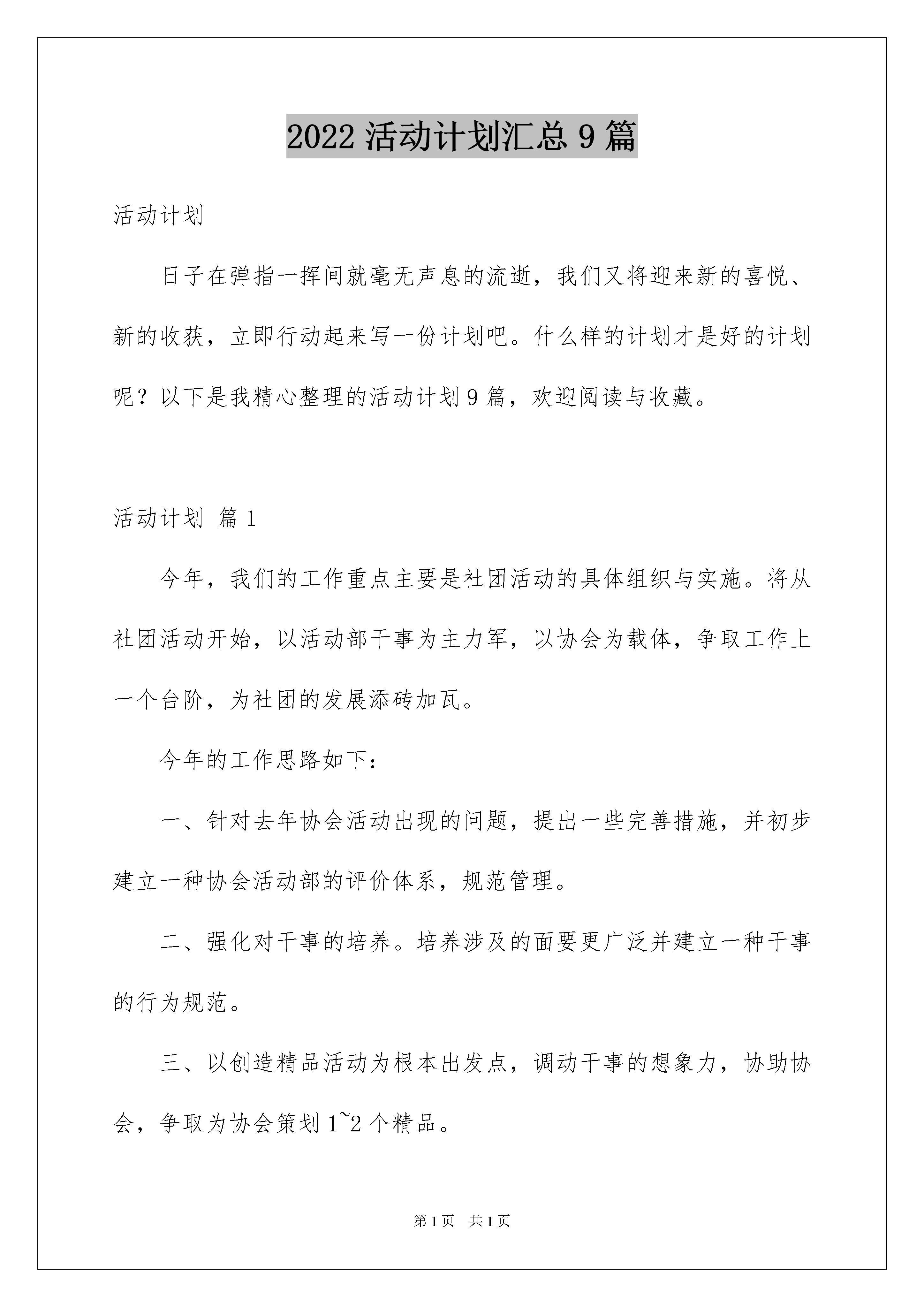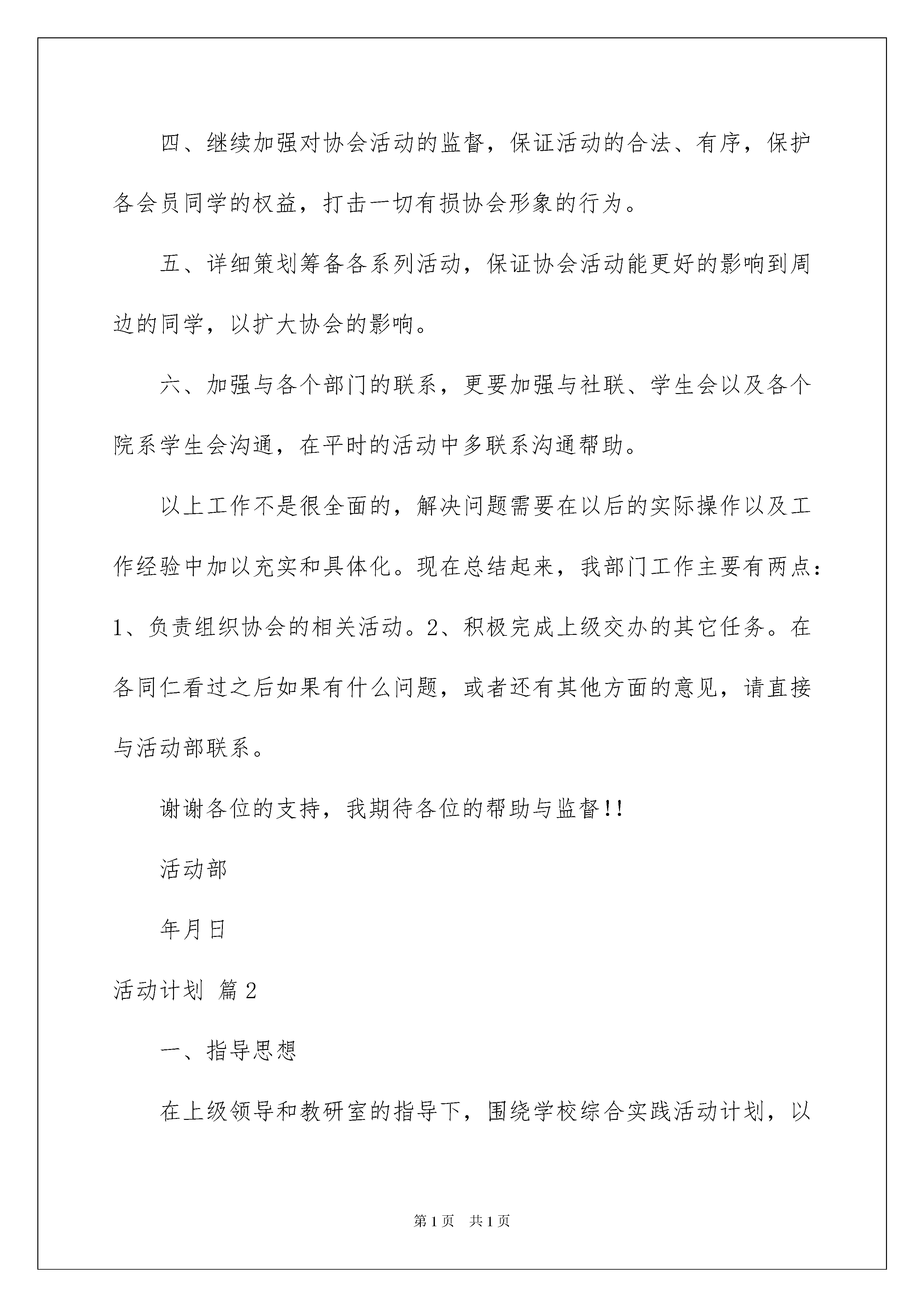 2022活动计划汇总9篇活动计划日子在弹指一挥间就毫无声息的流逝,我们又将迎来新的喜悦、新的收获,立即行动起来写一份计划吧。什么样的计划才是好的计划呢?以下是我精心整理的活动计划9篇,欢迎阅读与收藏。活动计划篇1今年,我们的工作重点主要是社团活动的具体组织与实施。将从社团活动开始,以活动部干事为主力军,以协会为载体,争取工作上一个台阶,为社团的发展添砖加瓦。今年的工作思路如下:一、针对去年协会活动出现的问题,提出一些完善措施,并初步建立一种协会活动部的评价体系,规范管理。二、强化对干事的培养。培养涉及的面要更广泛并建立一种干事的行为规范。三、以创造精品活动为根本出发点,调动干事的想象力,协助协会,争取为协会策划1~2个精品。四、继续加强对协会活动的监督,保证活动的合法、有序,保护各会员同学的权益,打击一切有损协会形象的行为。五、详细策划筹备各系列活动,保证协会活动能更好的影响到周边的同学,以扩大协会的影响。六、加强与各个部门的联系,更要加强与社联、学生会以及各个院系学生会沟通,在平时的活动中多联系沟通帮助。以上工作不是很全面的,解决问题需要在以后的实际操作以及工作经验中加以充实和具体化。现在总结起来,我部门工作主要有两点:1、负责组织协会的相关活动。2、积极完成上级交办的其它任务。在各同仁看过之后如果有什么问题,或者还有其他方面的意见,请直接与活动部联系。谢谢各位的支持,我期待各位的帮助与监督!!活动部年月日活动计划篇2一、指导思想在上级领导和教研室的指导下,围绕学校综合实践活动计划,以《基础教育改革纲要》关于综合实践的综述,进一步学习新课程标准,明确综合实践活动课程的实施目标,继续将理论与实践结合起来,让学生亲历运用知识,解决问题的过程;获得深切的体验,产生积极的情感;激发研究科学的欲望,培养创新精神和实践能力,提高发现问题和解决问题的能力;增强团队合作意识,从而进一步加强人际交往的能力,4年级450字新学期计划。二、活动目的1培养学生对生活的积极态度和对知识的综合运用能力,使他们具备基本的生活自理能力交往合作能力观察分析能力动手操作能力。2使学生初步掌握参与社会实践的方法,信息资料的搜索,分析和处理的方法,以及研究探索,实验验证的方法。3使学生形成合作分享积极进取的个性品质,成为创造新生活的小主人。三、具体目标1、培养学生的劳动意识和劳动能力。2、培养学生勤俭节约的良好习惯及陶冶学生的亲情意识。3、形成从自己周边生活中主动发现问题并独立自主地解决问题的态度和能力。4、培养学生参与综合实践活动的兴趣和对社会生活的积极乐观向上的态度。5、了解信息技术、劳动技术、社区服务和探究活动的常识。使学生具有基本的生活自理能力、交往协作能力、观察分析能力、动手实践能力、领导和表现能力以及对知识的综合运用和创新能力。6、初步掌握参与社会实践与调查的方法、信息资料的搜集、分析与自理的方法和研究、实验实证的方法。7、充分听取学生方面有效可行的建议,灵活机动的开展活动。8、能根据时间、环境等的变化来开展响应的活动。四、实际现状通过开学来与各班级学生的交流,发现学生好动,而且较喜爱手工制作类,喜欢通过自己的劳动来展示自己的实力,工作计划《4年级450字新学期计划》。五、具体措施活动一:废品收集与利用十月份:(一调查计划1、学生根据各自兴趣、习惯自由组合成小组。评选最能干的小组长。2、组内进行市场调查。3、观察组长的能力,以便以后的活动开展。4、组内制订计划,了解废品回收与利用的知识。拜师学艺老师、家长、社区老人等。书报、网上等找资料(要求计划有粗、细。可以组内设想。(二动手做一做老师根据需要给学生提供必要的帮助。小学四年级新学期计划小学四年级新学期计划。每周组内小结。进行阶段性评比。对价值性的问题要有原始资料存档。十一月份:(一1中途评价老师注意对活动方向作适当引导,对一些创举性的给以特别关注。2制作与整理。加工整理成型。(二特色活动:布置实践活动成果展。动手做做比比。说一说自己的收获。谈一谈自己有什么设想。活动二:安全伴我行20xx年12月20xx年1月份:1.搜集整理交通事故的案例、为保证学生交通安全所施行的有关措施。2.信息反馈,交流讨论。3.了解大人们对小学生交通安全问题的认识和看法。4.了解我们生活中的交通现状。5.有关交通法规的学习和认识,和有关交通警示语等。6.同学们对交通安全的认识7.做好手抄报。8.多种形式展现活动成果。二:小学四年级综合实践计划一、指导思想综合实践活动课是我国当前课程改革中提出的一种新的课程形态,其内容主要包括信息技术教育、研究性学习、社区服务和社会实践以及