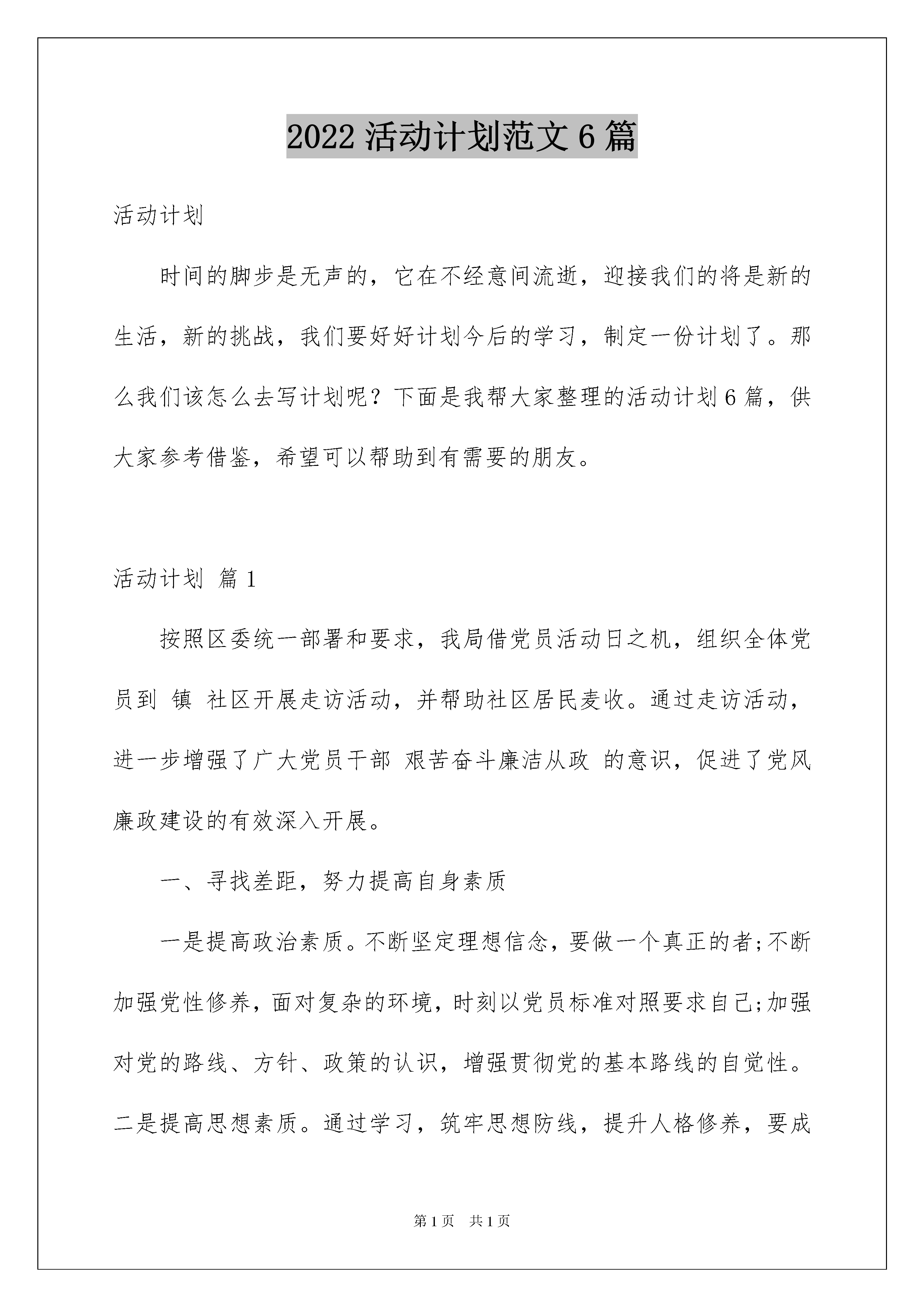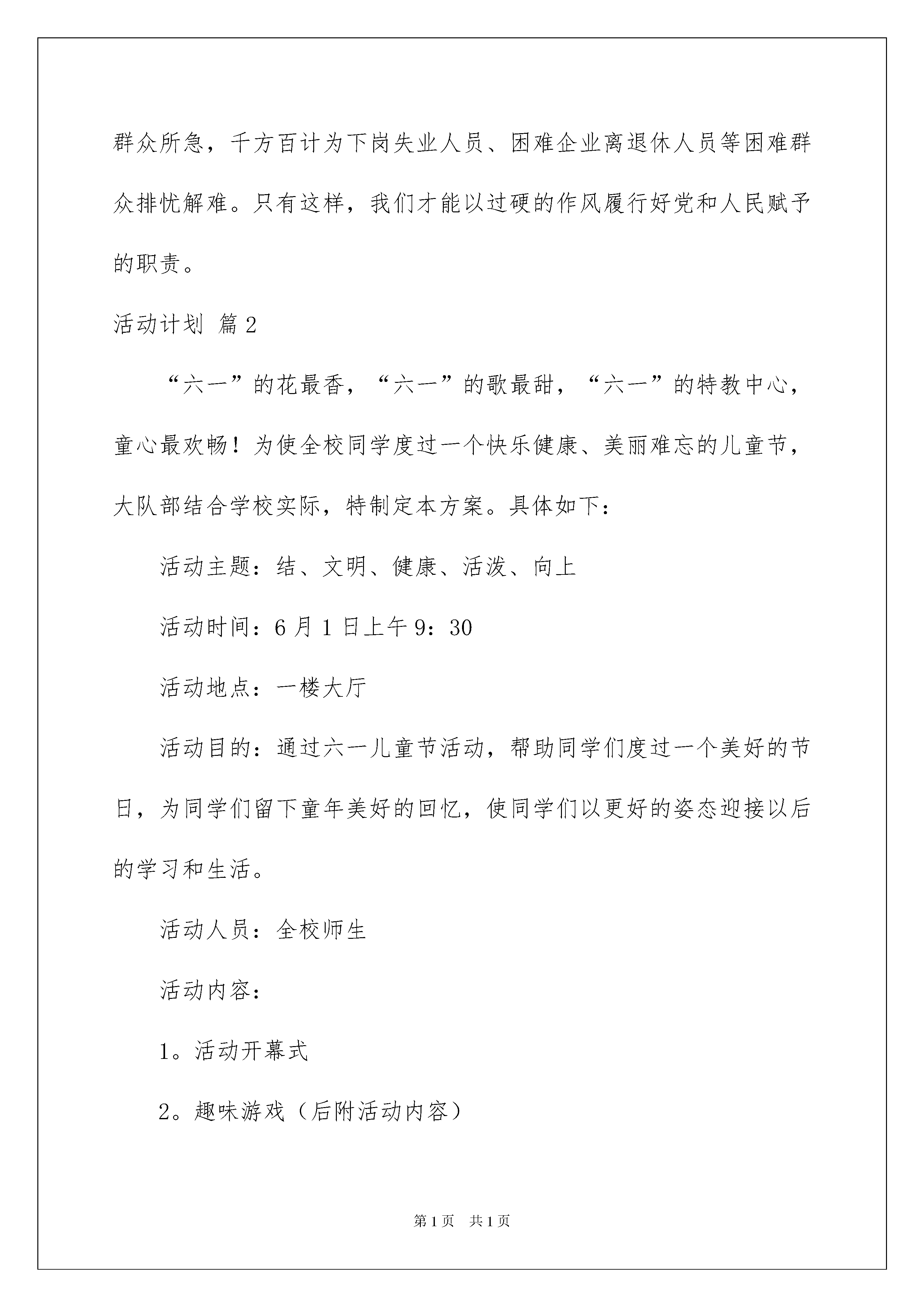 2022活动计划范文6篇活动计划时间的脚步是无声的,它在不经意间流逝,迎接我们的将是新的生活,新的挑战,我们要好好计划今后的学习,制定一份计划了。那么我们该怎么去写计划呢?下面是我帮大家整理的活动计划6篇,供大家参考借鉴,希望可以帮助到有需要的朋友。活动计划篇1按照区委统一部署和要求,我局借党员活动日之机,组织全体党员到镇社区开展走访活动,并帮助社区居民麦收。通过走访活动,进一步增强了广大党员干部艰苦奋斗廉洁从政的意识,促进了党风廉政建设的有效深入开展。一、寻找差距,努力提高自身素质一是提高政治素质。不断坚定理想信念,要做一个真正的者;不断加强党性修养,面对复杂的环境,时刻以党员标准对照要求自己;加强对党的路线、方针、政策的认识,增强贯彻党的基本路线的自觉性。二是提高思想素质。通过学习,筑牢思想防线,提升人格修养,要成为一个道德高尚的人。三是提高作风素质。要始终坚持实事求是的工作原则,一切从实际出发,不断开拓创新,与是俱进,研究新情况,解决新问题,养成艰苦朴素、勤俭节约的工作作风。四是提高廉政意识。要进一步严于律已,勿以恶小而为之,勿以善小而不为。二、艰苦奋斗,大力弘扬清正廉洁要加强干部自身的党性修养,做到常修为政之德、常思贪欲之害、常怀律己之心,自觉抵制各种诱惑。要时刻不忘以共产党员的标准严格要求自己,以党的优良传统和作风勉励自己,时时处处牢记党的性质和宗旨,一言一行都要维护党的形象和威信,以共产党员的先进本色和优良作风,用自己高尚的品德和人格力量去感召人、凝聚人。要严格遵守领导干部廉洁从政的各项规定,时刻警惕权力、金钱的诱惑,防止手中的权力商品化。要按照有关规定管好自己的配偶、子女和身边工作人员,不利用职权为他们谋取利益,做到公道正派、不循私情。要牢记两个务必,厉行勤俭节约,反对铺张浪费。三、振奋精神,全力做好本职工作劳动保障工作直接面对职工、面对百姓、面对企业,涉及广大职工群众的切身利益,领导高度重视,群众热切期望,社会广泛关注。我们的政策制定是否能体现广大人民群众的根本利益,在具体落实中是否能让群众满意,发现问题后是否能及时纠正,不仅关系到党和政府的形象,关系到同人民群众的血肉联系。因此工作中应坚持做到:一要用心想事,切实树立立党为公、执政为民的根本理念,着力于体制机制改革完善。要在促进充分就业、加强职业培训、强化社会费征缴、探索建立新型农村社会保险制度、发挥基层平台作用等方面,不断研究新思路,探索新,开辟新途径,推动新实践,力争取得新成效。二要用心谋事,大力弘扬求真务实的作风,积极开展前瞻性研究。认真按照坚持科学发展、构建和谐社会的要求,科学认识和把握新时期就业和社会保障问题的特点和规律,把握好改革力度和社会可接受度的平衡点,出实招、办实事、求实效,研究出针对性、操作性和创新性更强的,进一步指导、推动工作。三要用心谋事,带着对人民群众的深厚感情,帮助解决群众尤其是困难群众的生产生活问题。我们工作中接触到的每一个就业岗位、每一笔社会保险金、每一份、每一次投诉电话、每一封信访函件,都关系到群众的基本生活、切身利益。一定要始终坚持把群众利益特别是困难群众生产生活中的实际困难摆在突出位置,满腔热情,脚踏实地,深入群众,想群众所想,急群众所急,千方百计为下岗失业人员、困难企业离退休人员等困难群众排忧解难。只有这样,我们才能以过硬的作风履行好党和人民赋予的职责。活动计划篇2“六一”的花最香,“六一”的歌最甜,“六一”的特教中心,童心最欢畅!为使全校同学度过一个快乐健康、美丽难忘的儿童节,大队部结合学校实际,特制定本方案。具体如下:活动主题:结、文明、健康、活泼、向上活动时间:6月1日上午9:30活动地点:一楼大厅活动目的:通过六一儿童节活动,帮助同学们度过一个美好的节日,为同学们留下童年美好的回忆,使同学们以更好的姿态迎接以后的学习和生活。活动人员:全校师生活动内容:1。活动开幕式2。趣味游戏(后附活动内容)3。庆“六一”文艺活动(后附节目单)活动过程:(一)文艺活动以班级为单位演出各班准备的文艺节目(二)趣味游戏1。蒙眼敲西瓜规则:⑴每班派出3名选手,用事先准备好的纱布蒙住眼睛,确定看不到外面的任何东西。西瓜距离起点5米⑵比赛者手持气锤在专人的保护下原地转10圈然后自行摸索敲地上的篮球⑶比赛时间2分钟超出时间则为输记0分敲中一次加1分⑷比赛时禁止对比赛者进行干扰、提示等措施。2。心心相印(背夹球)规则:⑴每班派6名队员参赛,背夹一篮球,步调一致向前走,比赛距离20米;⑵向前走时,双手必须在前方,不能碰到球,否则一次罚2秒;⑶进行接力时,接力方必须在线内完成接力活动;⑷比赛