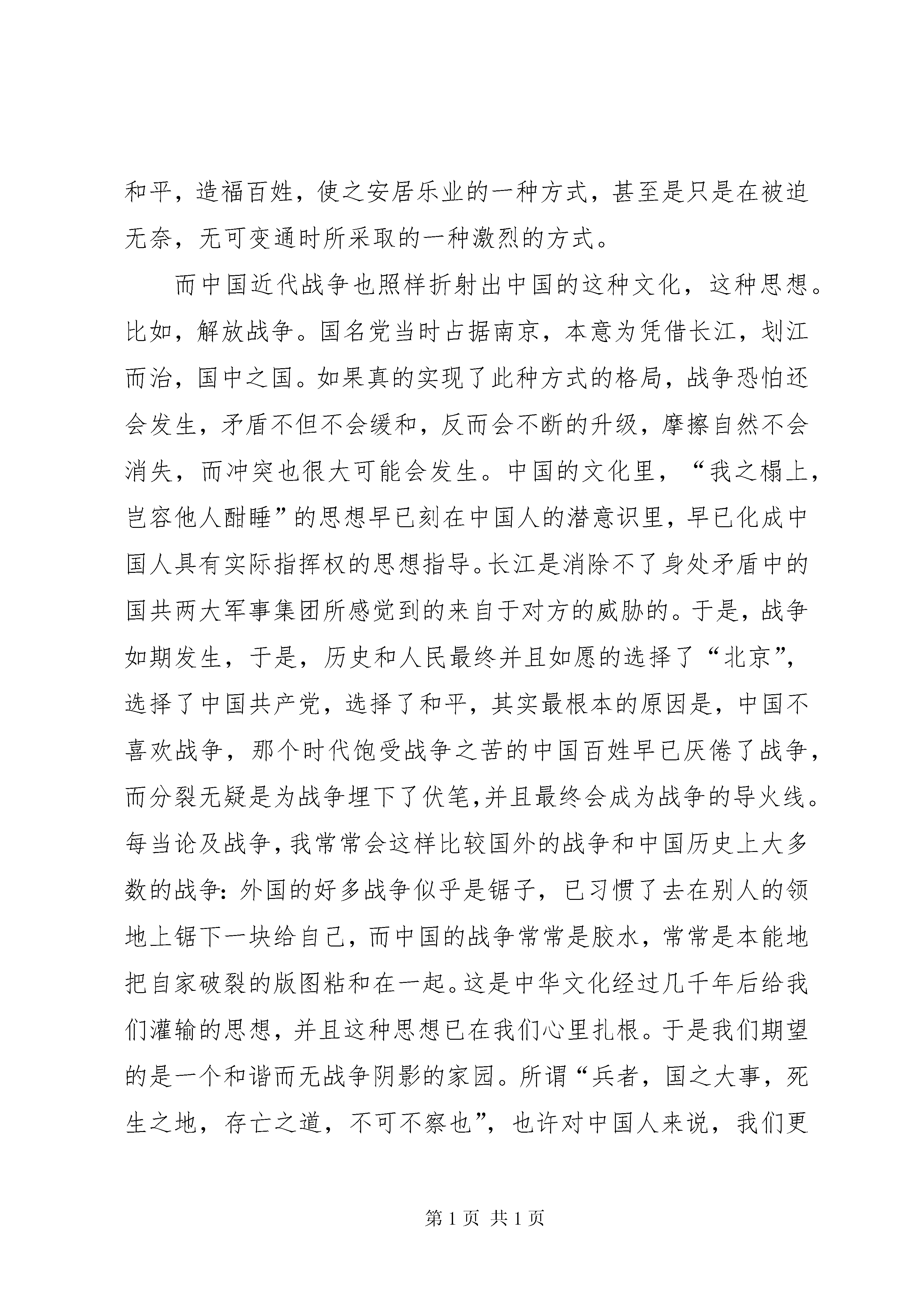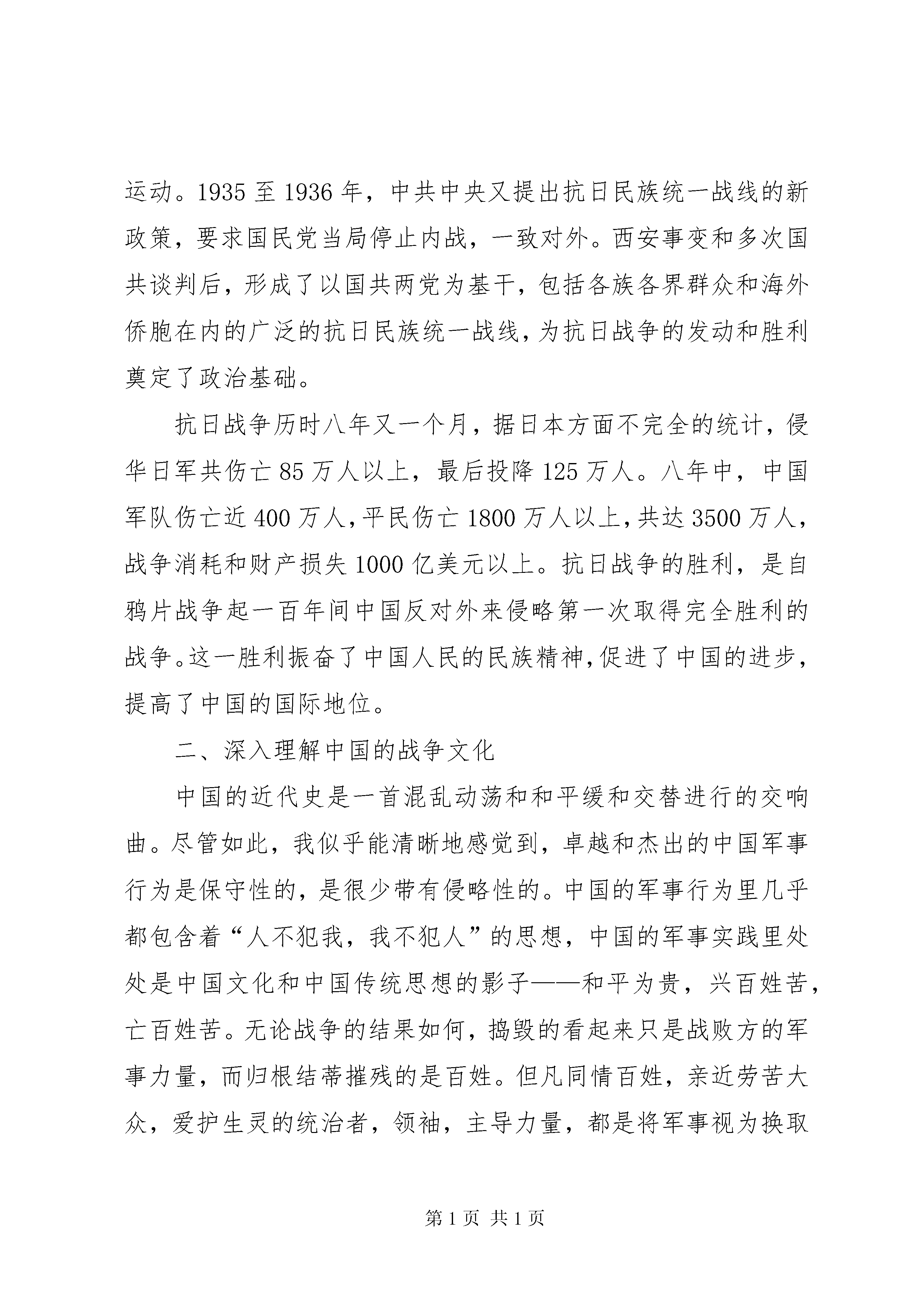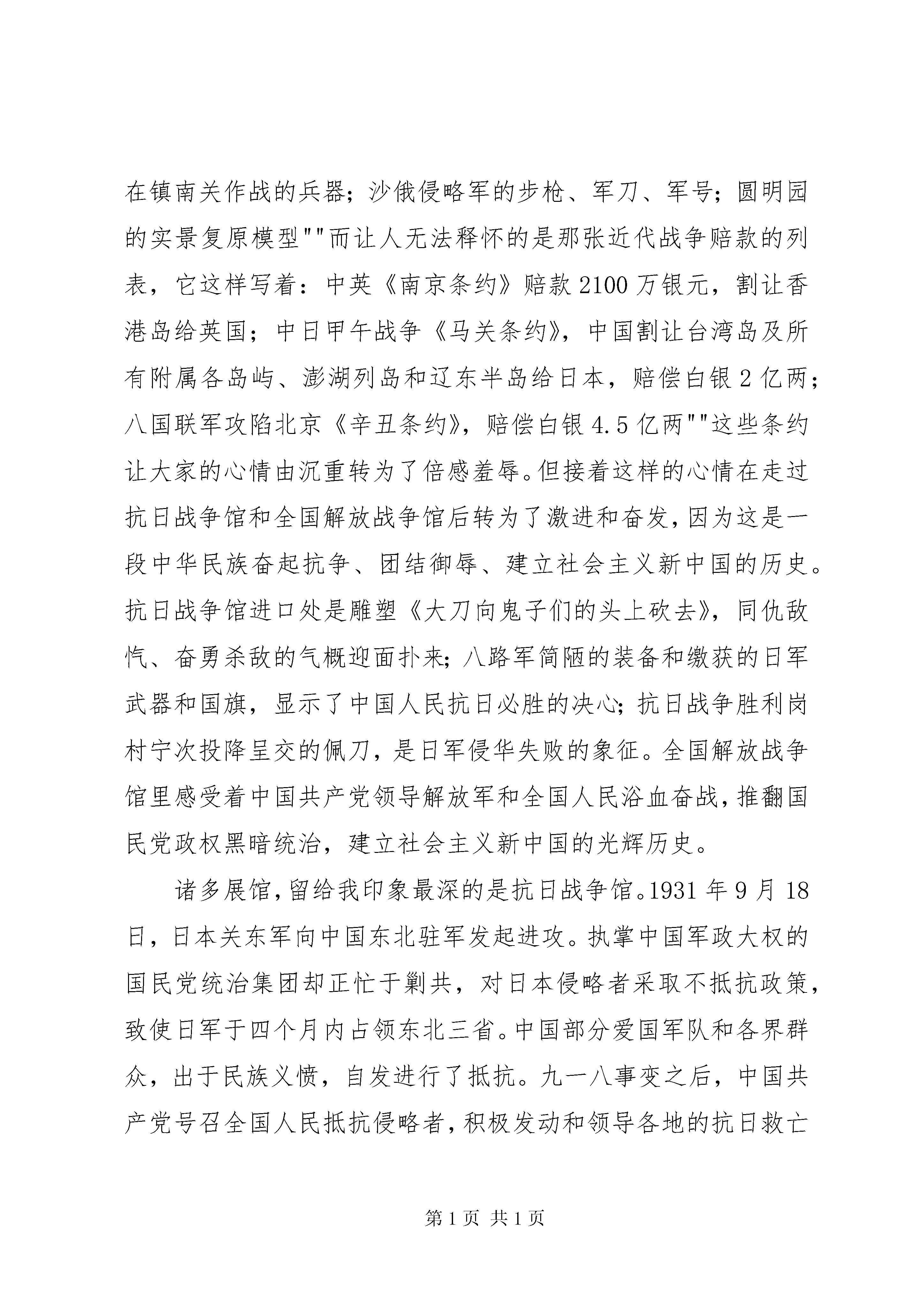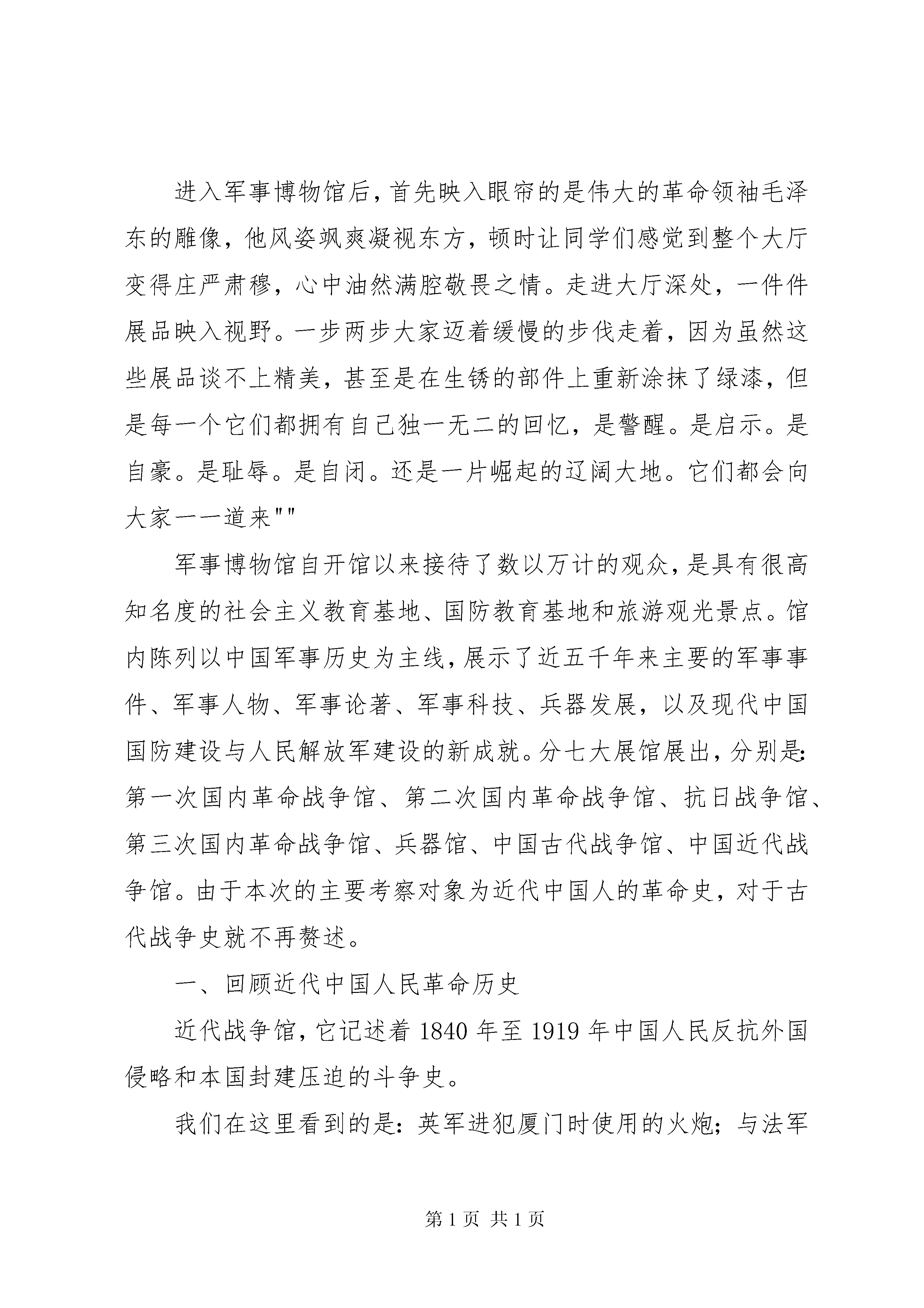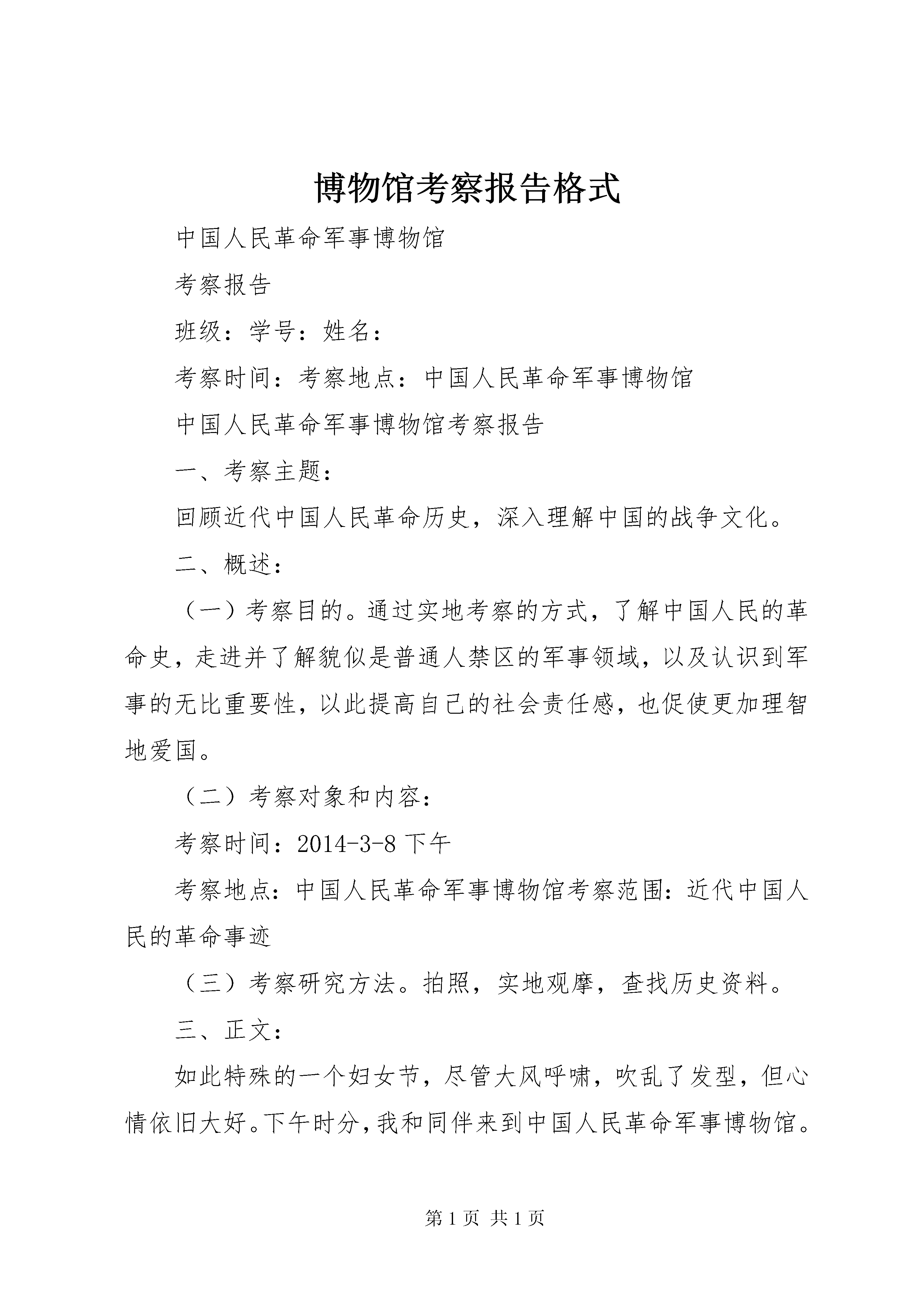 博物馆考察报告格式中国人民革命军事博物馆考察报告班级:学号:姓名:考察时间:考察地点:中国人民革命军事博物馆中国人民革命军事博物馆考察报告一、考察主题:回顾近代中国人民革命历史,深入理解中国的战争文化。二、概述:(一)考察目的。通过实地考察的方式,了解中国人民的革命史,走进并了解貌似是普通人禁区的军事领域,以及认识到军事的无比重要性,以此提高自己的社会责任感,也促使更加理智地爱国。(二)考察对象和内容:考察时间:2014-3-8下午考察地点:中国人民革命军事博物馆考察范围:近代中国人民的革命事迹(三)考察研究方法。拍照,实地观摩,查找历史资料。三、正文:如此特殊的一个妇女节,尽管大风呼啸,吹乱了发型,但心情依旧大好。下午时分,我和同伴来到中国人民革命军事博物馆。进入军事博物馆后,首先映入眼帘的是伟大的革命领袖毛泽东的雕像,他风姿飒爽凝视东方,顿时让同学们感觉到整个大厅变得庄严肃穆,心中油然满腔敬畏之情。走进大厅深处,一件件展品映入视野。一步两步大家迈着缓慢的步伐走着,因为虽然这些展品谈不上精美,甚至是在生锈的部件上重新涂抹了绿漆,但是每一个它们都拥有自己独一无二的回忆,是警醒。是启示。是自豪。是耻辱。是自闭。还是一片崛起的辽阔大地。它们都会向大家一一道来""军事博物馆自开馆以来接待了数以万计的观众,是具有很高知名度的社会主义教育基地、国防教育基地和旅游观光景点。馆内陈列以中国军事历史为主线,展示了近五千年来主要的军事事件、军事人物、军事论著、军事科技、兵器发展,以及现代中国国防建设与人民解放军建设的新成就。分七大展馆展出,分别是:第一次国内革命战争馆、第二次国内革命战争馆、抗日战争馆、第三次国内革命战争馆、兵器馆、中国古代战争馆、中国近代战争馆。由于本次的主要考察对象为近代中国人的革命史,对于古代战争史就不再赘述。一、回顾近代中国人民革命历史近代战争馆,它记述着1840年至1919年中国人民反抗外国侵略和本国封建压迫的斗争史。我们在这里看到的是:英军进犯厦门时使用的火炮;与法军在镇南关作战的兵器;沙俄侵略军的步枪、军刀、军号;圆明园的实景复原模型""而让人无法释怀的是那张近代战争赔款的列表,它这样写着:中英《南京条约》赔款2100万银元,割让香港岛给英国;中日甲午战争《马关条约》,中国割让台湾岛及所有附属各岛屿、澎湖列岛和辽东半岛给日本,赔偿白银2亿两;八国联军攻陷北京《辛丑条约》,赔偿白银4.5亿两""这些条约让大家的心情由沉重转为了倍感羞辱。但接着这样的心情在走过抗日战争馆和全国解放战争馆后转为了激进和奋发,因为这是一段中华民族奋起抗争、团结御辱、建立社会主义新中国的历史。抗日战争馆进口处是雕塑《大刀向鬼子们的头上砍去》,同仇敌忾、奋勇杀敌的气概迎面扑来;八路军简陋的装备和缴获的日军武器和国旗,显示了中国人民抗日必胜的决心;抗日战争胜利岗村宁次投降呈交的佩刀,是日军侵华失败的象征。全国解放战争馆里感受着中国共产党领导解放军和全国人民浴血奋战,推翻国民党政权黑暗统治,建立社会主义新中国的光辉历史。诸多展馆,留给我印象最深的是抗日战争馆。1931年9月18日,日本关东军向中国东北驻军发起进攻。执掌中国军政大权的国民党统治集团却正忙于剿共,对日本侵略者采取不抵抗政策,致使日军于四个月内占领东北三省。中国部分爱国军队和各界群众,出于民族义愤,自发进行了抵抗。九一八事变之后,中国共产党号召全国人民抵抗侵略者,积极发动和领导各地的抗日救亡运动。1935至1936年,中共中央又提出抗日民族统一战线的新政策,要求国民党当局停止内战,一致对外。西安事变和多次国共谈判后,形成了以国共两党为基干,包括各族各界群众和海外侨胞在内的广泛的抗日民族统一战线,为抗日战争的发动和胜利奠定了政治基础。抗日战争历时八年又一个月,据日本方面不完全的统计,侵华日军共伤亡85万人以上,最后投降125万人。八年中,中国军队伤亡近400万人,平民伤亡1800万人以上,共达3500万人,战争消耗和财产损失1000亿美元以上。抗日战争的胜利,是自鸦片战争起一百年间中国反对外来侵略第一次取得完全胜利的战争。这一胜利振奋了中国人民的民族精神,促进了中国的进步,提高了中国的国际地位。二、深入理解中国的战争文化中国的近代史是一首混乱动荡和和平缓和交替进行的交响曲。尽管如此,我似乎能清晰地感觉到,卓越和杰出的中国军事行为是保守性的,是很少带有侵略性的。中国的军事行为里几乎都包含着“人不犯我,我不犯人”的思想,中国的军事实践里处处是中国文化和中国传统思想的影子——和平为贵,兴百姓苦,亡百姓苦。无论战争的结果如何,捣毁的看起来只是战败方的军事力量,而归根结蒂摧残的是百姓。但凡同情百姓,亲近劳苦大众,爱护生灵的统治者,领袖,主导力量,都是将军事视为换取和平,造福