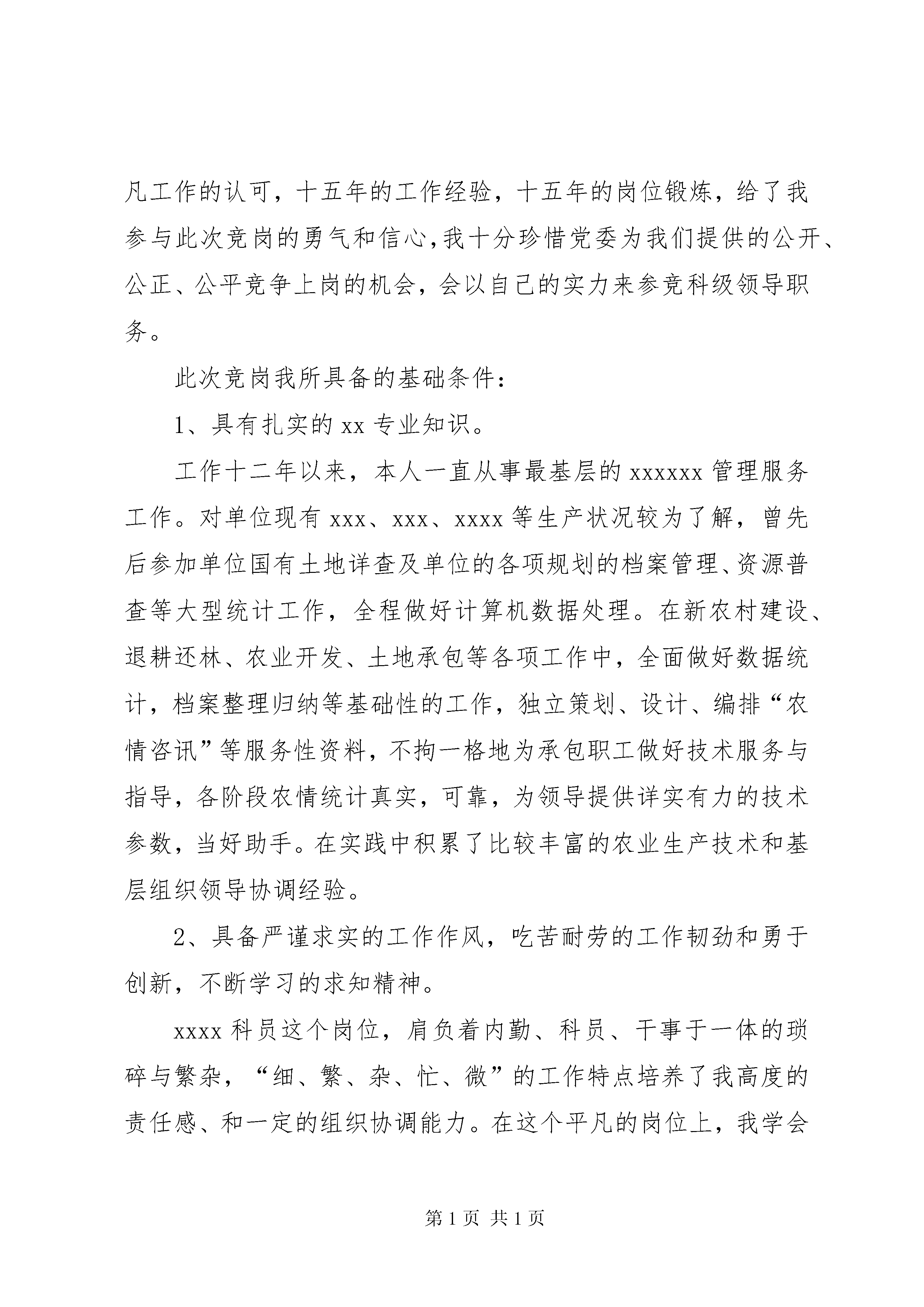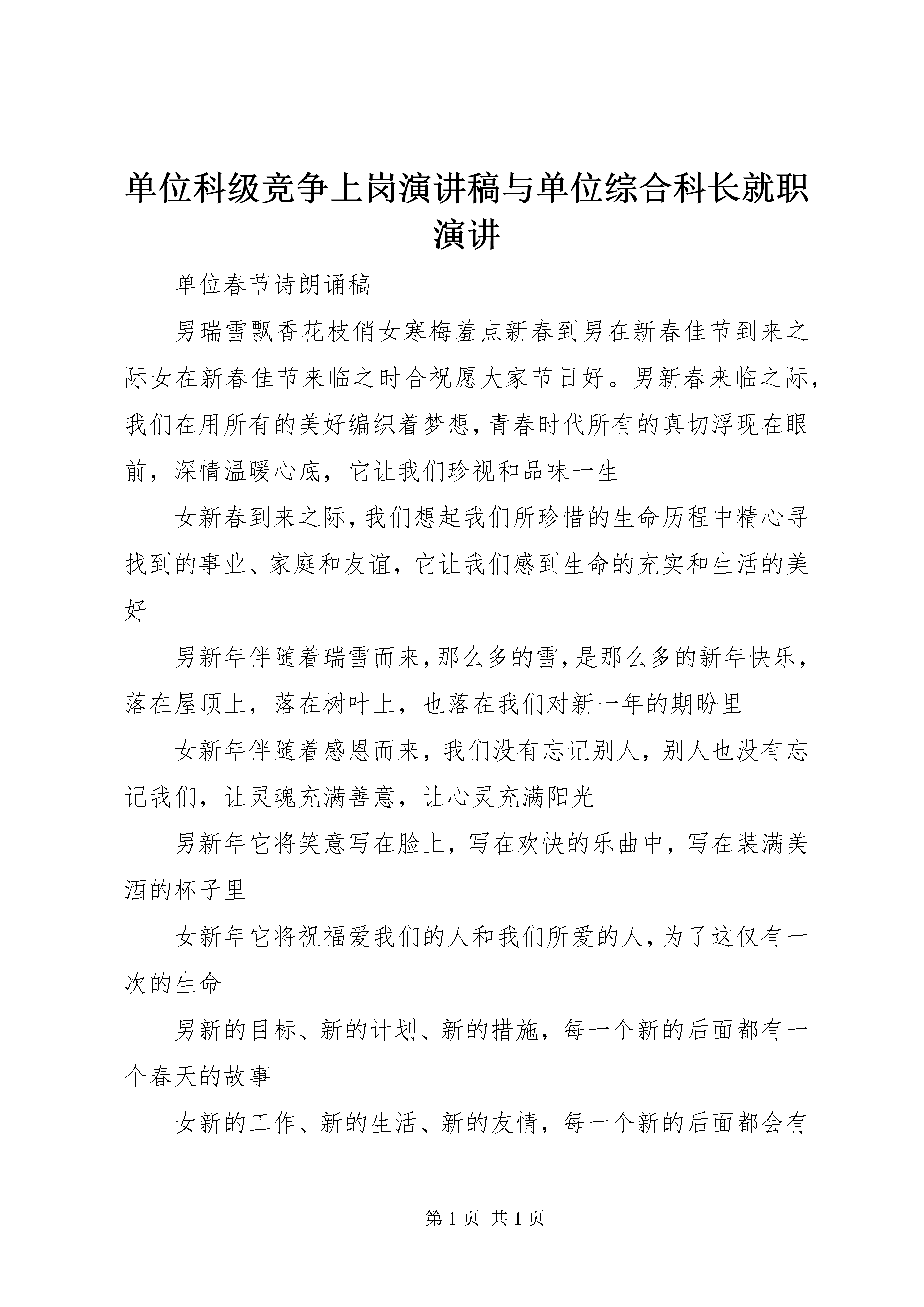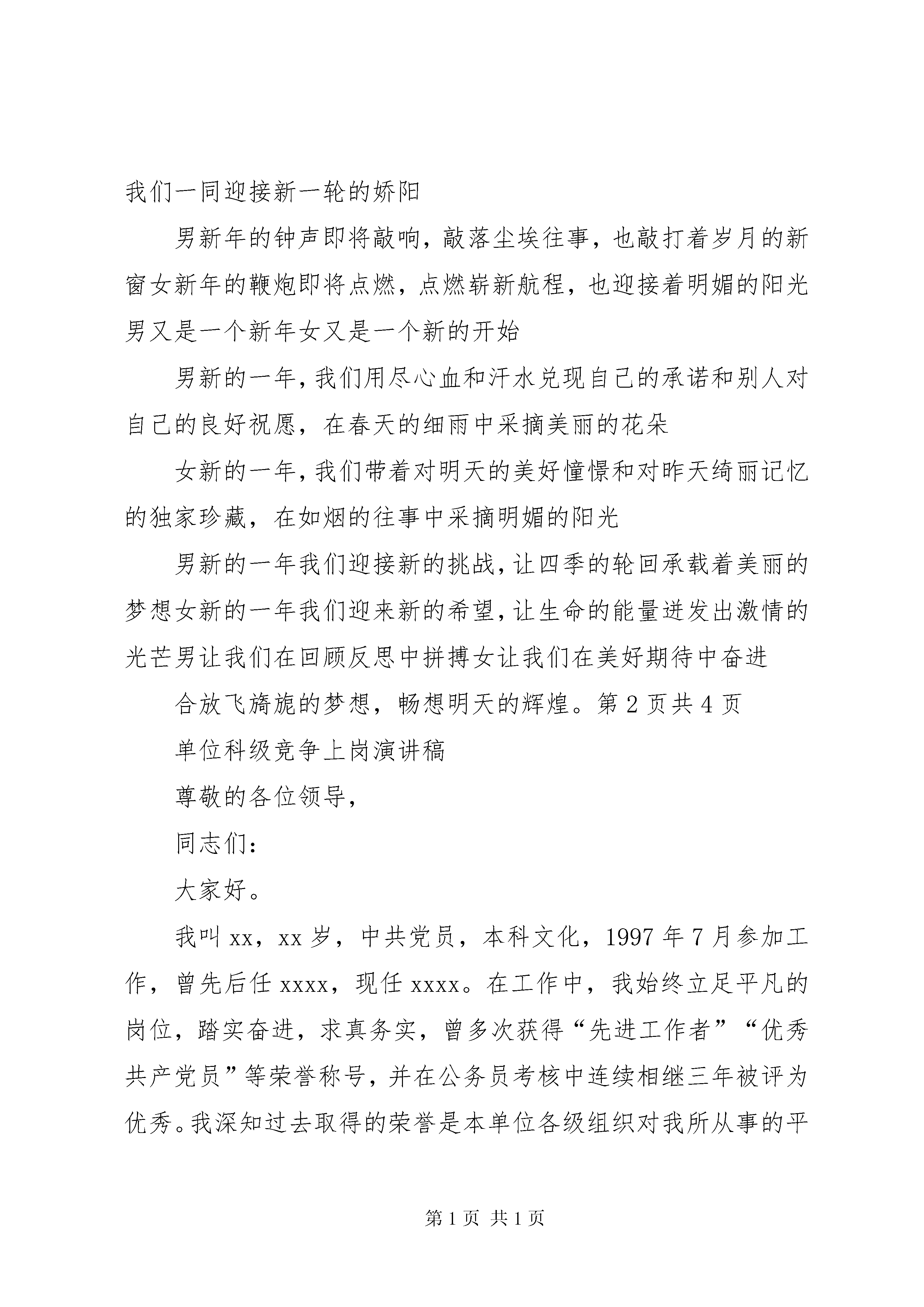 单位科级竞争上岗演讲稿与单位综合科长就职演讲单位春节诗朗诵稿男瑞雪飘香花枝俏女寒梅羞点新春到男在新春佳节到来之际女在新春佳节来临之时合祝愿大家节日好。男新春来临之际,我们在用所有的美好编织着梦想,青春时代所有的真切浮现在眼前,深情温暖心底,它让我们珍视和品味一生女新春到来之际,我们想起我们所珍惜的生命历程中精心寻找到的事业、家庭和友谊,它让我们感到生命的充实和生活的美好男新年伴随着瑞雪而来,那么多的雪,是那么多的新年快乐,落在屋顶上,落在树叶上,也落在我们对新一年的期盼里女新年伴随着感恩而来,我们没有忘记别人,别人也没有忘记我们,让灵魂充满善意,让心灵充满阳光男新年它将笑意写在脸上,写在欢快的乐曲中,写在装满美酒的杯子里女新年它将祝福爱我们的人和我们所爱的人,为了这仅有一次的生命男新的目标、新的计划、新的措施,每一个新的后面都有一个春天的故事女新的工作、新的生活、新的友情,每一个新的后面都会有一个秋天的传奇男新的微笑、新的风景、新的希望,每一个新的后面都有一片明朗的天空女从自身做起,每一件事都能让新年感到新鲜男从点滴做起,第一分钟都能让新年感受新颖女从现在做起,每一个人都能让新年感到新奇男亲爱的朋友,缘让你我相聚于温馨的家园,真诚的交流冲淡了陌生的情感,温暖的关爱慰藉了沉睡的心灵,时代的节奏引领了前行的航程女亲爱的朋友,或许因工作的压力和生活的沉重,我们没有太多的时间增进了解,但我们却用简单的问候表述着心声,用诚挚的关爱传递着温暖,用最美的真情架起桥梁男我们曾为一次心灵的碰撞而兴奋,我们曾为一句精彩的妙笔而惊叹,我们曾为一份醉人的欣喜而感动,我们曾为一次骄人的成绩而自豪女我们只有懂得欣赏,才能领略到百花的馨香,我们只有懂得珍爱,才能赢得到友谊的情长,我们只有历经风雨,才能在风口浪尖歌唱男当飞逝的时光轻轻滑过我们的指尖,带着水晶般透明的心,我们一同走进新一年的春天女当斩新的岁月轻轻走近我们的身旁,怀着新的希望和热情,我们一同迎接新一轮的娇阳男新年的钟声即将敲响,敲落尘埃往事,也敲打着岁月的新窗女新年的鞭炮即将点燃,点燃崭新航程,也迎接着明媚的阳光男又是一个新年女又是一个新的开始男新的一年,我们用尽心血和汗水兑现自己的承诺和别人对自己的良好祝愿,在春天的细雨中采摘美丽的花朵女新的一年,我们带着对明天的美好憧憬和对昨天绮丽记忆的独家珍藏,在如烟的往事中采摘明媚的阳光男新的一年我们迎接新的挑战,让四季的轮回承载着美丽的梦想女新的一年我们迎来新的希望,让生命的能量迸发出激情的光芒男让我们在回顾反思中拼搏女让我们在美好期待中奋进合放飞旖旎的梦想,畅想明天的辉煌。单位科级竞争上岗演讲稿尊敬的各位领导,同志们:大家好。我叫xx,xx岁,中共党员,本科文化,1997年7月参加工作,曾先后任xxxx,现任xxxx。在工作中,我始终立足平凡的岗位,踏实奋进,求真务实,曾多次获得“先进工作者”“优秀共产党员”等荣誉称号,并在公务员考核中连续相继三年被评为优秀。我深知过去取得的荣誉是本单位各级组织对我所从事的平凡工作的认可,十五年的工作经验,十五年的岗位锻炼,给了我参与此次竞岗的勇气和信心,我十分珍惜党委为我们提供的公开、公正、公平竞争上岗的机会,会以自己的实力来参竞科级领导职务。此次竞岗我所具备的基础条件:1、具有扎实的xx专业知识。工作十二年以来,本人一直从事最基层的xxxxxx管理服务工作。对单位现有xxx、xxx、xxxx等生产状况较为了解,曾先后参加单位国有土地详查及单位的各项规划的档案管理、资源普查等大型统计工作,全程做好计算机数据处理。在新农村建设、退耕还林、农业开发、土地承包等各项工作中,全面做好数据统计,档案整理归纳等基础性的工作,独立策划、设计、编排“农情咨讯”等服务性资料,不拘一格地为承包职工做好技术服务与指导,各阶段农情统计真实,可靠,为领导提供详实有力的技术参数,当好助手。在实践中积累了比较丰富的农业生产技术和基层组织领导协调经验。2、具备严谨求实的工作作风,吃苦耐劳的工作韧劲和勇于创新,不断学习的求知精神。xxxx科员这个岗位,肩负着内勤、科员、干事于一体的琐碎与繁杂,“细、繁、杂、忙、微”的工作特点培养了我高度的责任感、和一定的组织协调能力。在这个平凡的岗位上,我学会了站在全局的高度看待问题,学会了用综合的眼光观察和思考问题。在上情下达、下情上达、内外沟通、各方协调的过程中,我学会了统筹规划、综合协调,积极主动地为领导出主意、想办法,当好参谋,不断加强积累、提高自己。多年的工作实践,使我养成了勤于学习、不断进取和勇于接受新鲜事物的工作作风,部室文件的计算机处理得心应手。工作中,始终坚持严谨求实的作风,逐步了解和掌握工作方法与技巧,为部室领导当好“管家”。