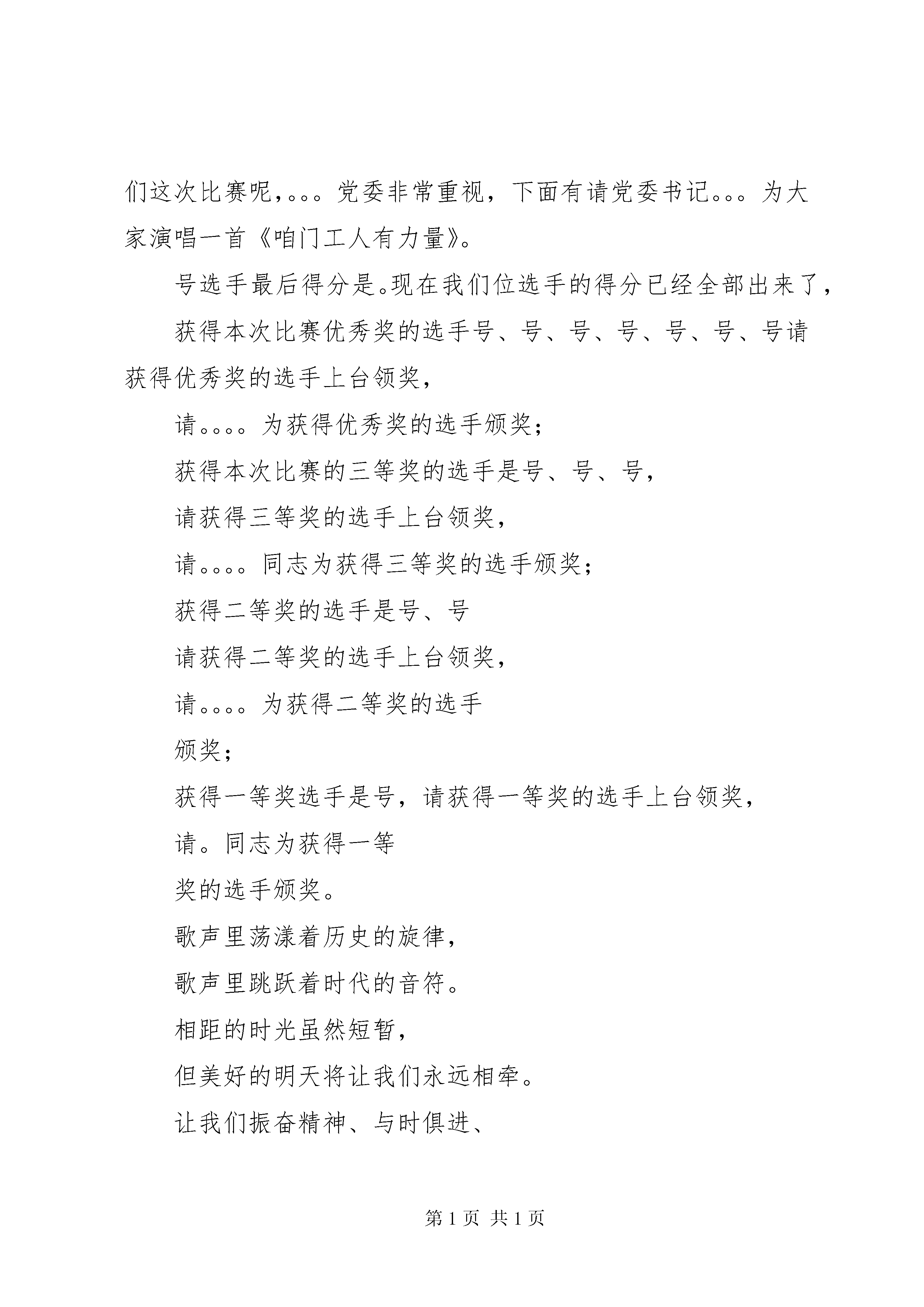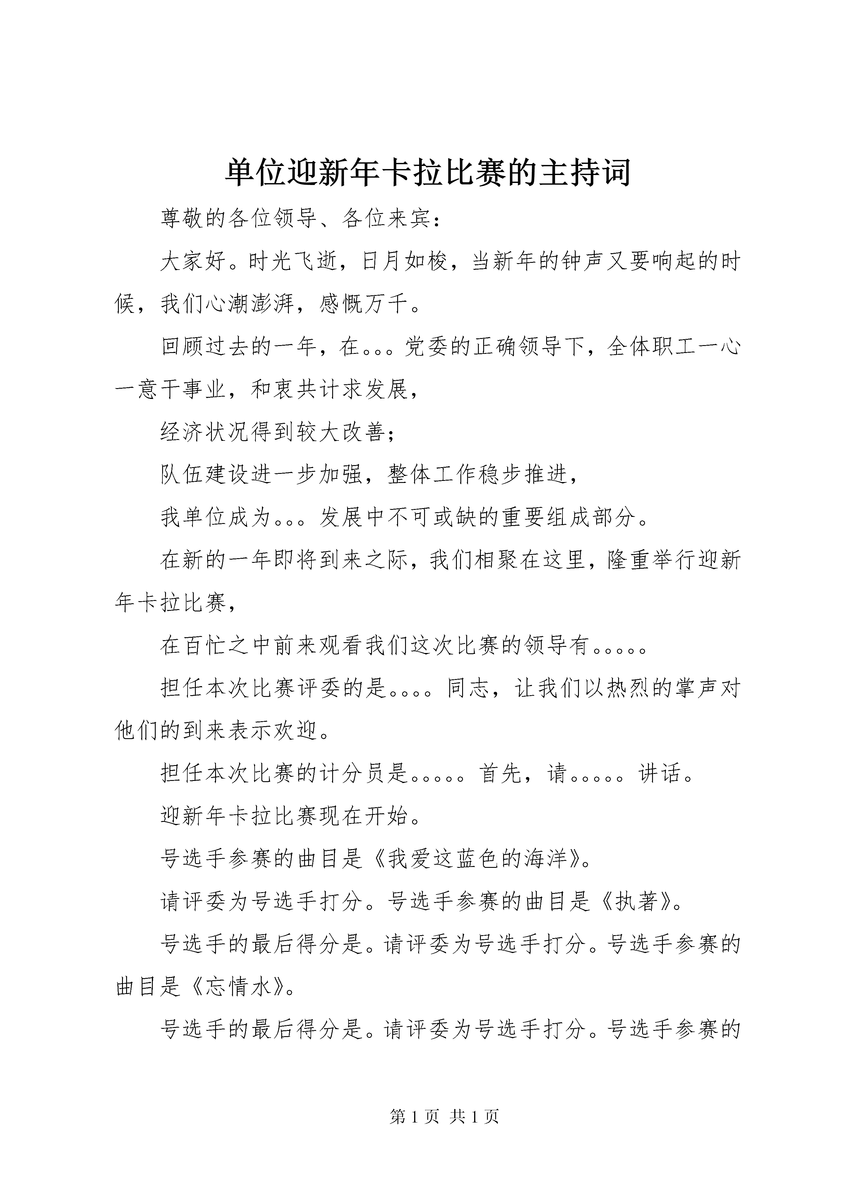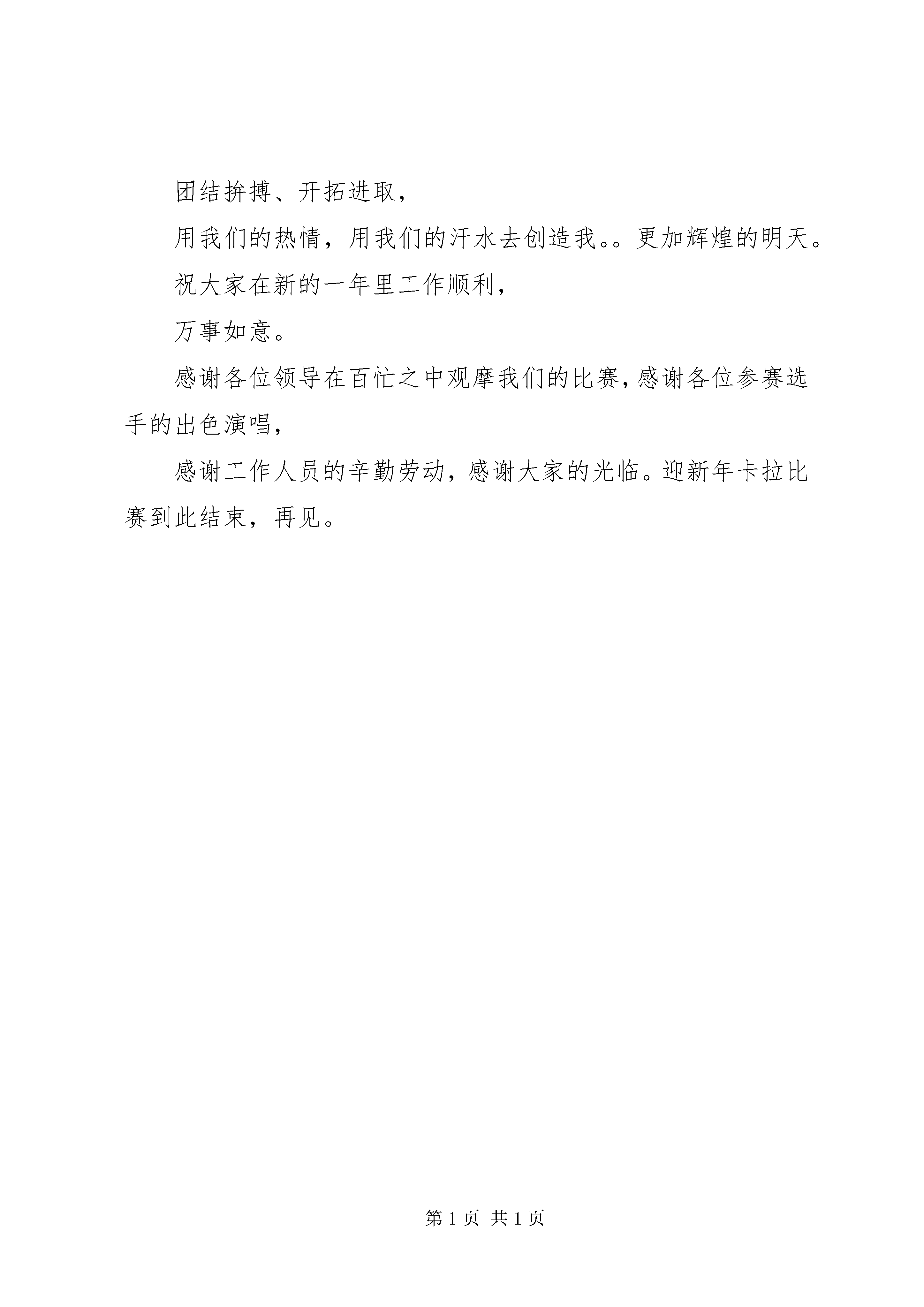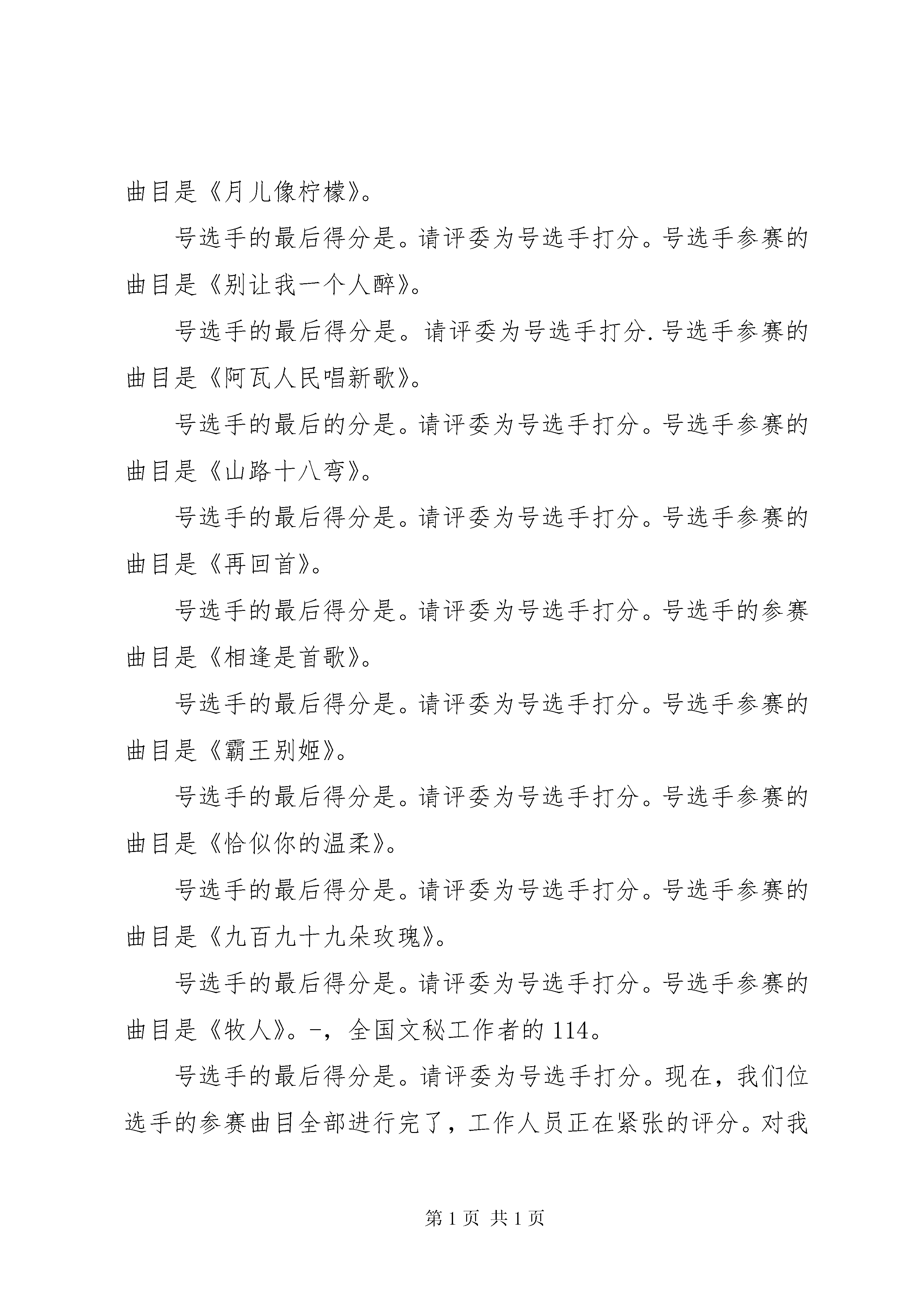 单位迎新年卡拉比赛的主持词尊敬的各位领导、各位来宾:大家好。时光飞逝,日月如梭,当新年的钟声又要响起的时候,我们心潮澎湃,感慨万千。回顾过去的一年,在。。。党委的正确领导下,全体职工一心一意干事业,和衷共计求发展,经济状况得到较大改善;队伍建设进一步加强,整体工作稳步推进,我单位成为。。。发展中不可或缺的重要组成部分。在新的一年即将到来之际,我们相聚在这里,隆重举行迎新年卡拉比赛,在百忙之中前来观看我们这次比赛的领导有。。。。。担任本次比赛评委的是。。。。同志,让我们以热烈的掌声对他们的到来表示欢迎。担任本次比赛的计分员是。。。。。首先,请。。。。。讲话。迎新年卡拉比赛现在开始。号选手参赛的曲目是《我爱这蓝色的海洋》。请评委为号选手打分。号选手参赛的曲目是《执著》。号选手的最后得分是。请评委为号选手打分。号选手参赛的曲目是《忘情水》。号选手的最后得分是。请评委为号选手打分。号选手参赛的曲目是《月儿像柠檬》。号选手的最后得分是。请评委为号选手打分。号选手参赛的曲目是《别让我一个人醉》。号选手的最后得分是。请评委为号选手打分.号选手参赛的曲目是《阿瓦人民唱新歌》。号选手的最后的分是。请评委为号选手打分。号选手参赛的曲目是《山路十八弯》。号选手的最后得分是。请评委为号选手打分。号选手参赛的曲目是《再回首》。号选手的最后得分是。请评委为号选手打分。号选手的参赛曲目是《相逢是首歌》。号选手的最后得分是。请评委为号选手打分。号选手参赛的曲目是《霸王别姬》。号选手的最后得分是。请评委为号选手打分。号选手参赛的曲目是《恰似你的温柔》。号选手的最后得分是。请评委为号选手打分。号选手参赛的曲目是《九百九十九朵玫瑰》。号选手的最后得分是。请评委为号选手打分。号选手参赛的曲目是《牧人》。-,全国文秘工作者的114。号选手的最后得分是。请评委为号选手打分。现在,我们位选手的参赛曲目全部进行完了,工作人员正在紧张的评分。对我们这次比赛呢,。。。党委非常重视,下面有请党委书记。。。为大家演唱一首《咱门工人有力量》。号选手最后得分是。现在我们位选手的得分已经全部出来了,获得本次比赛优秀奖的选手号、号、号、号、号、号、号请获得优秀奖的选手上台领奖,请。。。。为获得优秀奖的选手颁奖;获得本次比赛的三等奖的选手是号、号、号,请获得三等奖的选手上台领奖,请。。。。同志为获得三等奖的选手颁奖;获得二等奖的选手是号、号请获得二等奖的选手上台领奖,请。。。。为获得二等奖的选手颁奖;获得一等奖选手是号,请获得一等奖的选手上台领奖,请。同志为获得一等奖的选手颁奖。歌声里荡漾着历史的旋律,歌声里跳跃着时代的音符。相距的时光虽然短暂,但美好的明天将让我们永远相牵。让我们振奋精神、与时俱进、团结拚搏、开拓进取,用我们的热情,用我们的汗水去创造我。。更加辉煌的明天。祝大家在新的一年里工作顺利,万事如意。感谢各位领导在百忙之中观摩我们的比赛,感谢各位参赛选手的出色演唱,感谢工作人员的辛勤劳动,感谢大家的光临。迎新年卡拉比赛到此结束,再见。