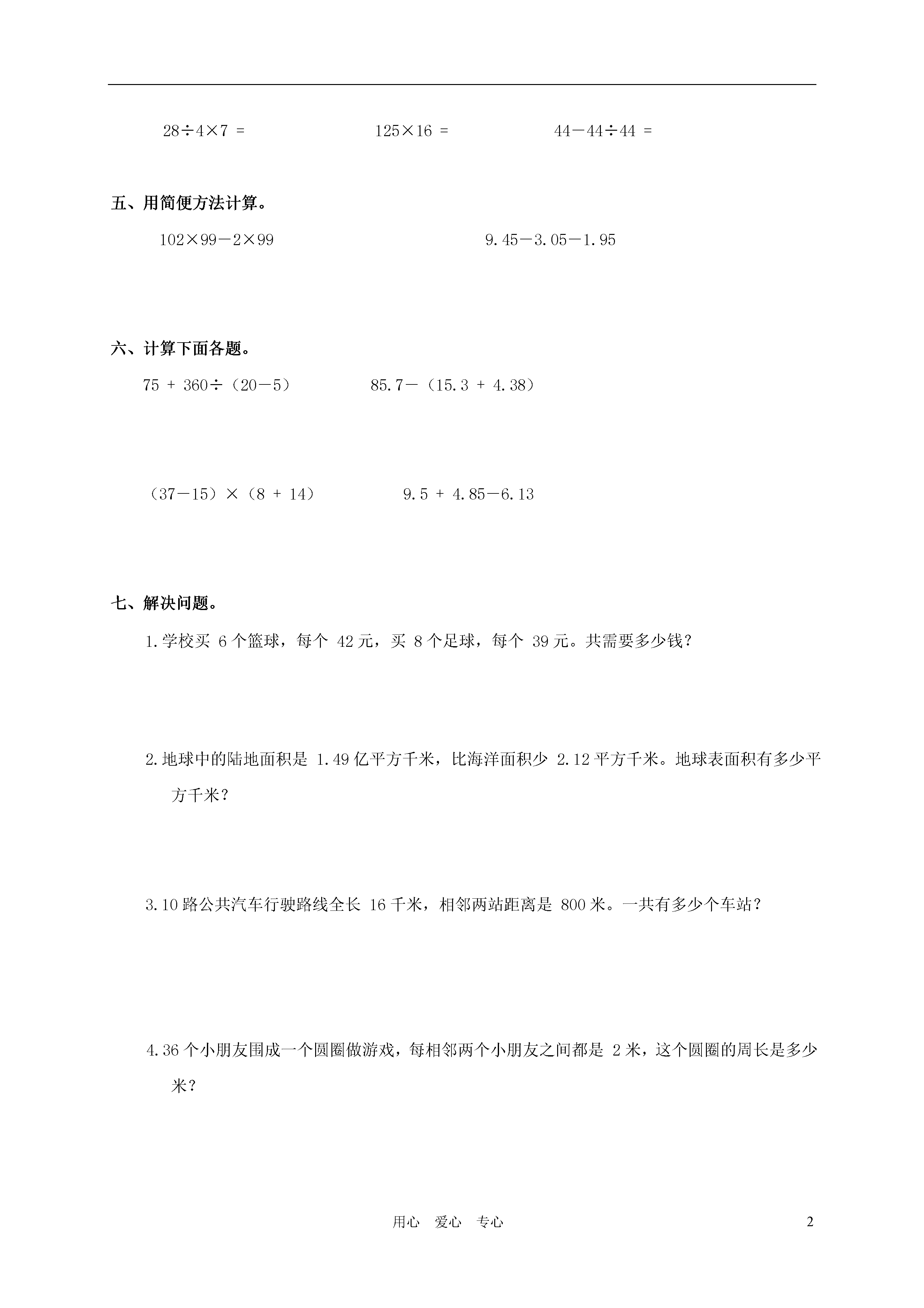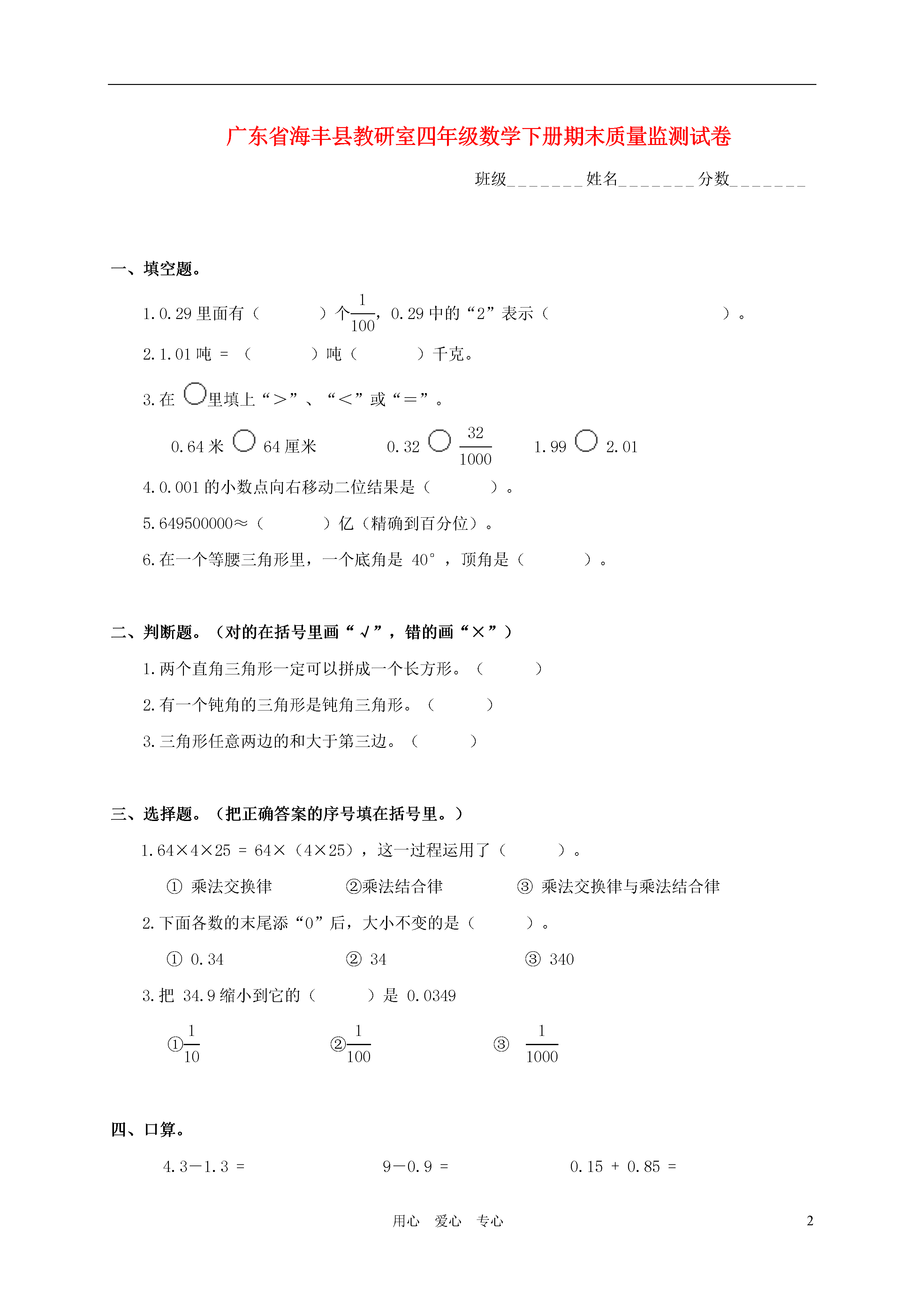 2用心爱心专心广东省海丰县教研室四年级数学下册期末质量监测试卷班级_______姓名_______分数_______一、填空题。1.0.29里面有()个eq\f(1,100),0.29中的“2”表示()。2.1.01吨=()吨()千克。3.在里填上“>”、“<”或“=”。0.64米64厘米0.32eq\f(32,1000)1.992.014.0.001的小数点向右移动二位结果是()。5.649500000≈()亿(精确到百分位)。6.在一个等腰三角形里,一个底角是40°,顶角是()。二、判断题。(对的在括号里画“√”,错的画“×”)1.两个直角三角形一定可以拼成一个长方形。()2.有一个钝角的三角形是钝角三角形。()3.三角形任意两边的和大于第三边。()三、选择题。(把正确答案的序号填在括号里。)1.64×4×25=64×(4×25),这一过程运用了()。①乘法交换律②乘法结合律③乘法交换律与乘法结合律2.下面各数的末尾添“0”后,大小不变的是()。①0.34②34③3403.把34.9缩小到它的()是0.0349①eq\f(1,10)②eq\f(1,100)③eq\f(1,1000)四、口算。4.3-1.3=9-0.9=0.15+0.85=28÷4×7=125×16=44-44÷44=五、用简便方法计算。102×99-2×999.45-3.05-1.95六、计算下面各题。75+360÷(20-5)85.7-(15.3+4.38)(37-15)×(8+14)9.5+4.85-6.13七、解决问题。1.学校买6个篮球,每个42元,买8个足球,每个39元。共需要多少钱?2.地球中的陆地面积是1.49亿平方千米,比海洋面积少2.12平方千米。地球表面积有多少平方千米?3.10路公共汽车行驶路线全长16千米,相邻两站距离是800米。一共有多少个车站?4.36个小朋友围成一个圆圈做游戏,每相邻两个小朋友之间都是2米,这个圆圈的周长是多少米?